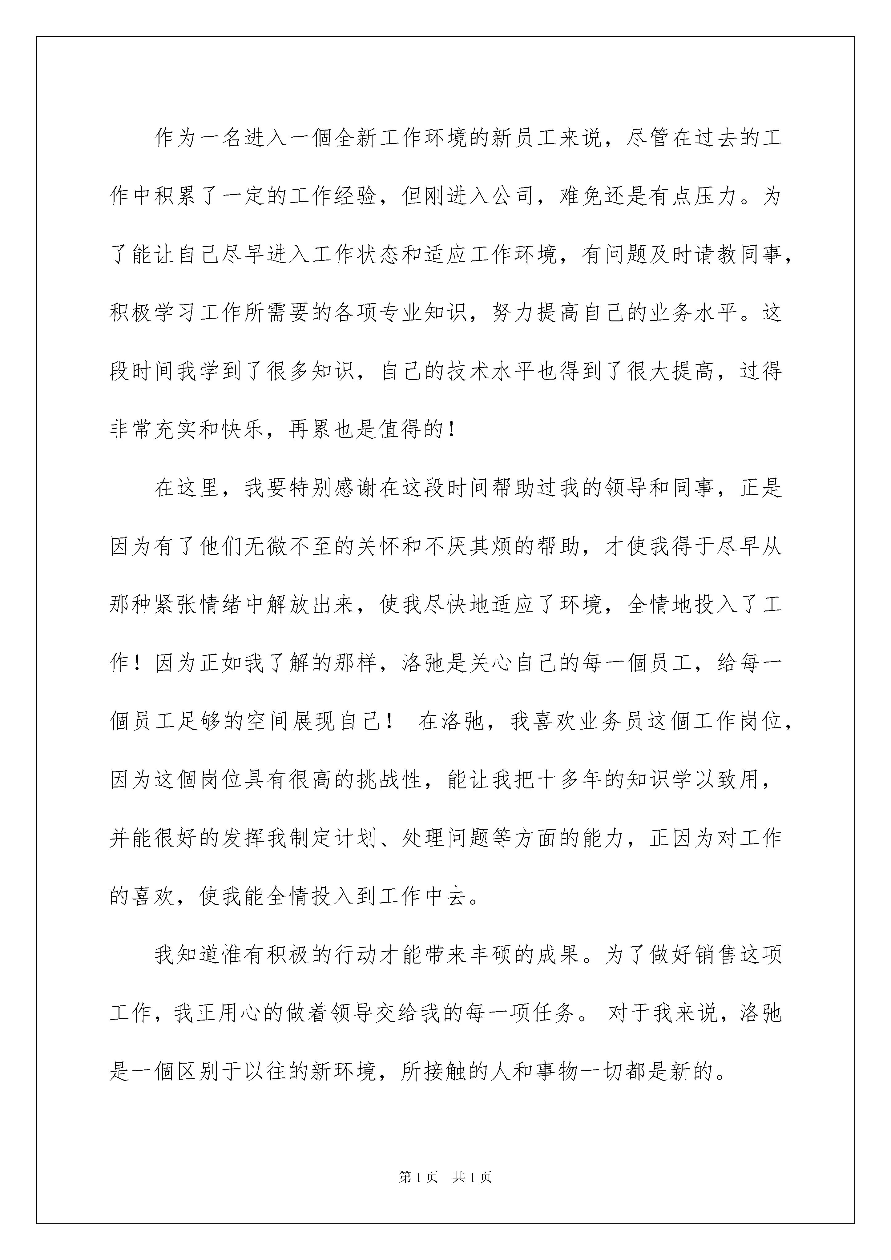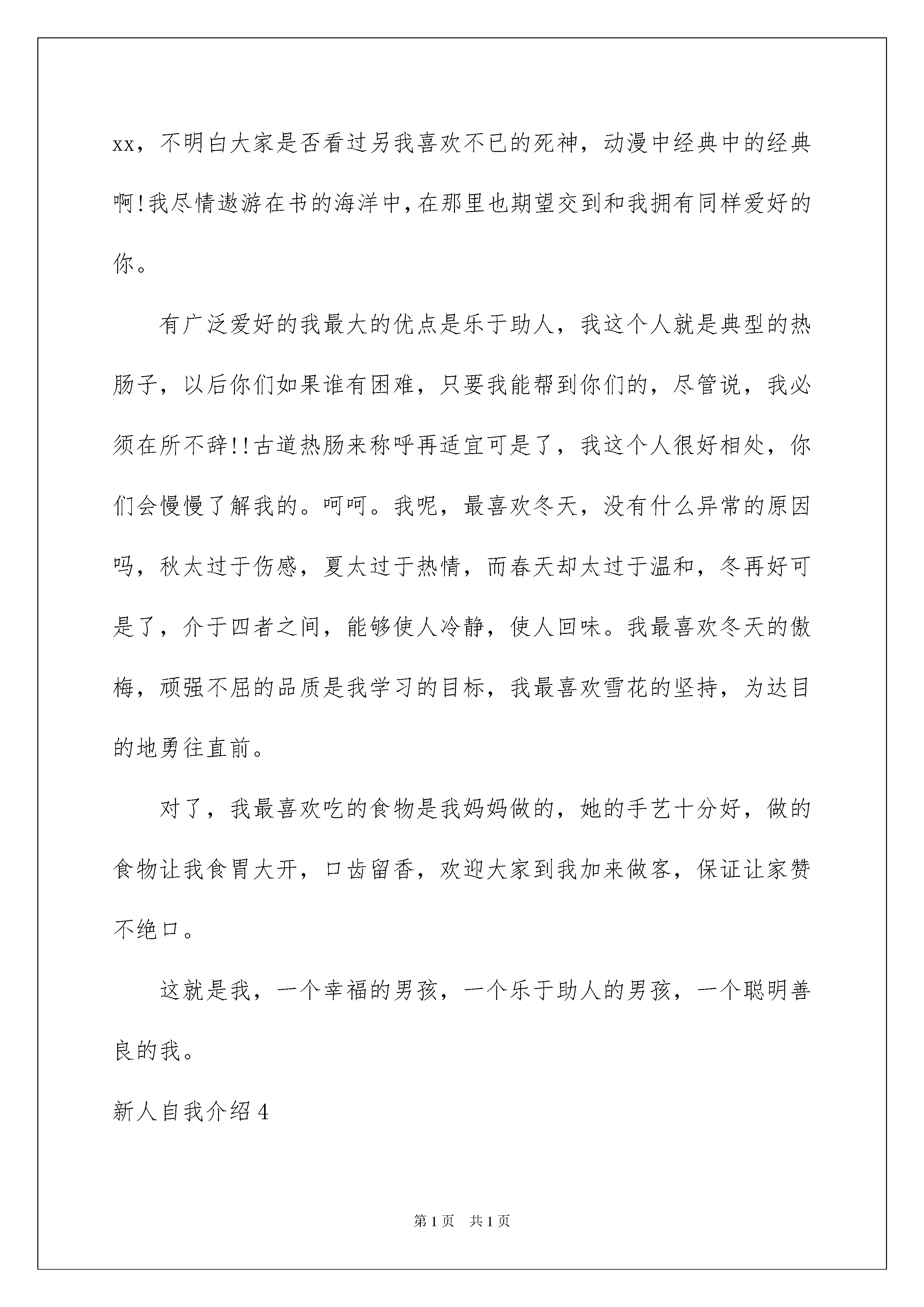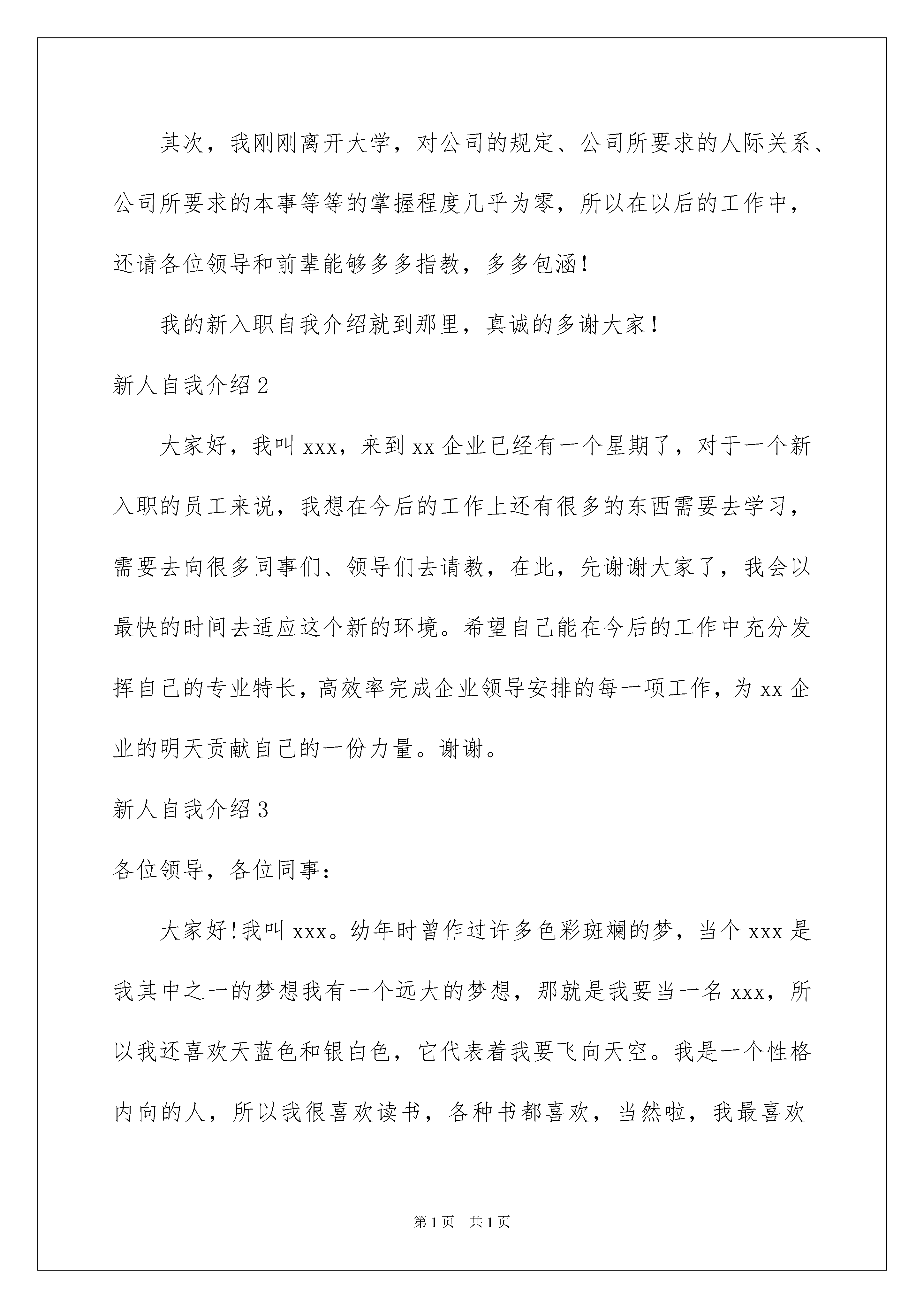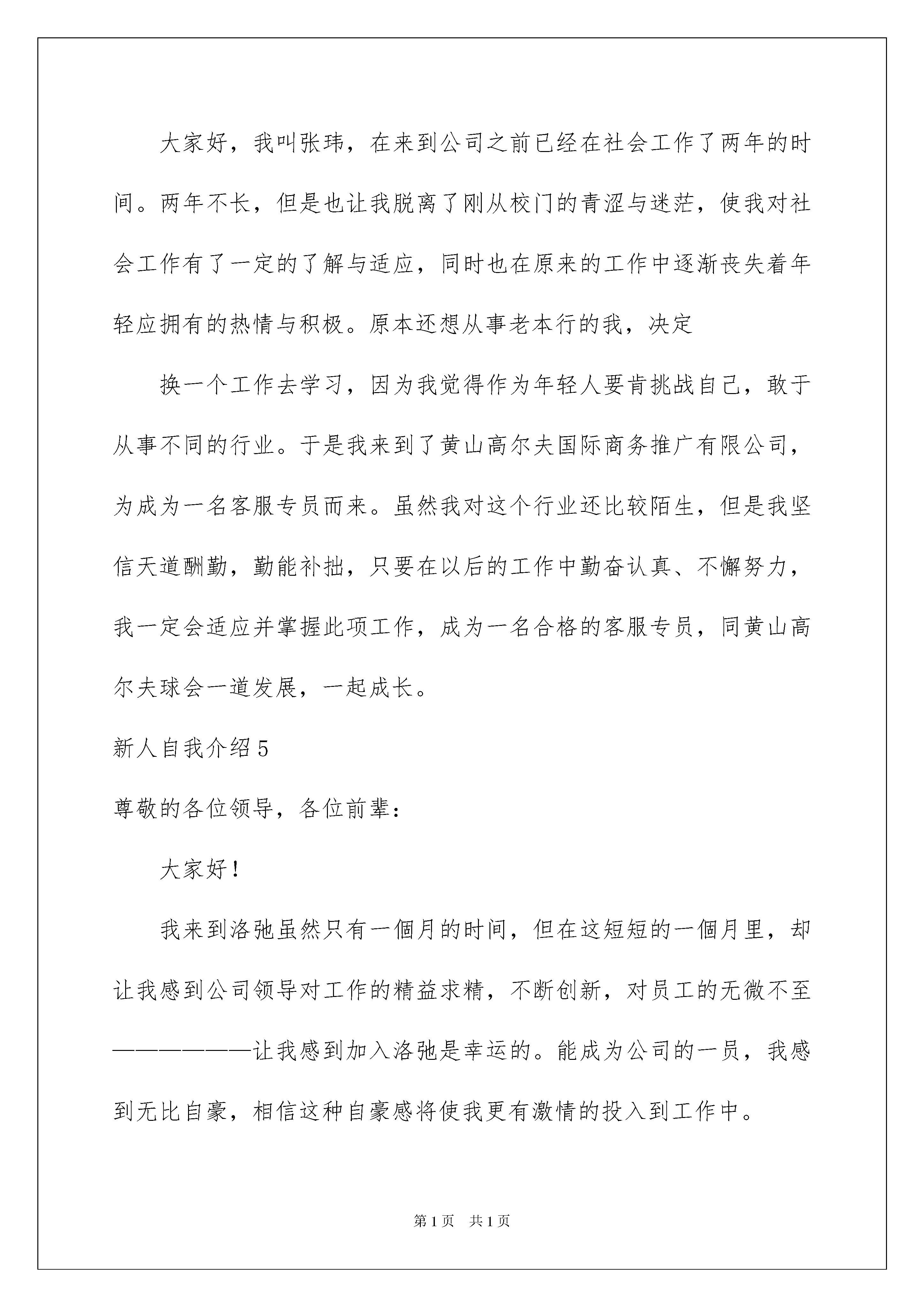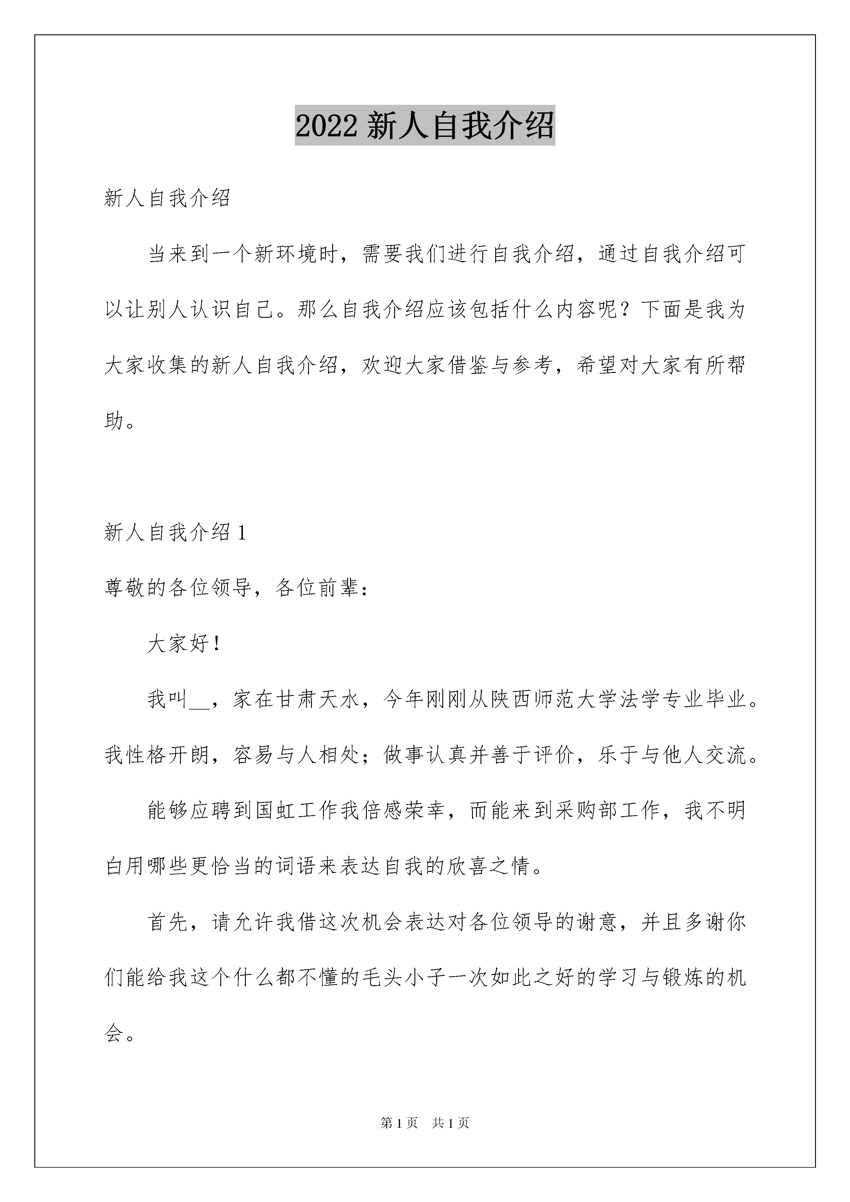 2022新人自我介绍新人自我介绍当来到一个新环境时,需要我们进行自我介绍,通过自我介绍可以让别人认识自己。那么自我介绍应该包括什么内容呢?下面是我为大家收集的新人自我介绍,欢迎大家借鉴与参考,希望对大家有所帮助。新人自我介绍1尊敬的各位领导,各位前辈:大家好!我叫__,家在甘肃天水,今年刚刚从陕西师范大学法学专业毕业。我性格开朗,容易与人相处;做事认真并善于评价,乐于与他人交流。能够应聘到国虹工作我倍感荣幸,而能来到采购部工作,我不明白用哪些更恰当的词语来表达自我的欣喜之情。首先,请允许我借这次机会表达对各位领导的谢意,并且多谢你们能给我这个什么都不懂的毛头小子一次如此之好的学习与锻炼的机会。其次,我刚刚离开大学,对公司的规定、公司所要求的人际关系、公司所要求的本事等等的掌握程度几乎为零,所以在以后的工作中,还请各位领导和前辈能够多多指教,多多包涵!我的新入职自我介绍就到那里,真诚的多谢大家!新人自我介绍2大家好,我叫xxx,来到xx企业已经有一个星期了,对于一个新入职的员工来说,我想在今后的工作上还有很多的东西需要去学习,需要去向很多同事们、领导们去请教,在此,先谢谢大家了,我会以最快的时间去适应这个新的环境。希望自己能在今后的工作中充分发挥自己的专业特长,高效率完成企业领导安排的每一项工作,为xx企业的明天贡献自己的一份力量。谢谢。新人自我介绍3各位领导,各位同事:大家好!我叫xxx。幼年时曾作过许多色彩斑斓的梦,当个xxx是我其中之一的梦想我有一个远大的梦想,那就是我要当一名xxx,所以我还喜欢天蓝色和银白色,它代表着我要飞向天空。我是一个性格内向的人,所以我很喜欢读书,各种书都喜欢,当然啦,我最喜欢xx,不明白大家是否看过另我喜欢不已的死神,动漫中经典中的经典啊!我尽情遨游在书的海洋中,在那里也期望交到和我拥有同样爱好的你。有广泛爱好的我最大的优点是乐于助人,我这个人就是典型的热肠子,以后你们如果谁有困难,只要我能帮到你们的,尽管说,我必须在所不辞!!古道热肠来称呼再适宜可是了,我这个人很好相处,你们会慢慢了解我的。呵呵。我呢,最喜欢冬天,没有什么异常的原因吗,秋太过于伤感,夏太过于热情,而春天却太过于温和,冬再好可是了,介于四者之间,能够使人冷静,使人回味。我最喜欢冬天的傲梅,顽强不屈的品质是我学习的目标,我最喜欢雪花的坚持,为达目的地勇往直前。对了,我最喜欢吃的食物是我妈妈做的,她的手艺十分好,做的食物让我食胃大开,口齿留香,欢迎大家到我加来做客,保证让家赞不绝口。这就是我,一个幸福的男孩,一个乐于助人的男孩,一个聪明善良的我。新人自我介绍4大家好,我叫张玮,在来到公司之前已经在社会工作了两年的时间。两年不长,但是也让我脱离了刚从校门的青涩与迷茫,使我对社会工作有了一定的了解与适应,同时也在原来的工作中逐渐丧失着年轻应拥有的热情与积极。原本还想从事老本行的我,决定换一个工作去学习,因为我觉得作为年轻人要肯挑战自己,敢于从事不同的行业。于是我来到了黄山高尔夫国际商务推广有限公司,为成为一名客服专员而来。虽然我对这个行业还比较陌生,但是我坚信天道酬勤,勤能补拙,只要在以后的工作中勤奋认真、不懈努力,我一定会适应并掌握此项工作,成为一名合格的客服专员,同黄山高尔夫球会一道发展,一起成长。新人自我介绍5尊敬的各位领导,各位前辈:大家好!我来到洛弛虽然只有一個月的时间,但在这短短的一個月里,却让我感到公司领导对工作的精益求精,不断创新,对员工的无微不至——————让我感到加入洛弛是幸运的。能成为公司的一员,我感到无比自豪,相信这种自豪感将使我更有激情的投入到工作中。作为一名进入一個全新工作环境的新员工来说,尽管在过去的工作中积累了一定的工作经验,但刚进入公司,难免还是有点压力。为了能让自己尽早进入工作状态和适应工作环境,有问题及时请教同事,积极学习工作所需要的各项专业知识,努力提高自己的业务水平。这段时间我学到了很多知识,自己的技术水平也得到了很大提高,过得非常充实和快乐,再累也是值得的!在这里,我要特别感谢在这段时间帮助过我的领导和同事,正是因为有了他们无微不至的关怀和不厌其烦的帮助,才使我得于尽早从那种紧张情绪中解放出来,使我尽快地适应了环境,全情地投入了工作!因为正如我了解的那样,洛弛是关心自己的每一個员工,给每一個员工足够的空间展现自己!在洛弛,我喜欢业务员这個工作岗位,因为这個岗位具有很高的挑战性,能让我把十多年的知识学以致用,并能很好的发挥我制定计划、处理问题等方面的能力,正因为对工作的喜欢,使我能全情投入到工作中去。我知道惟有积极的行动才能带来丰硕的成果。