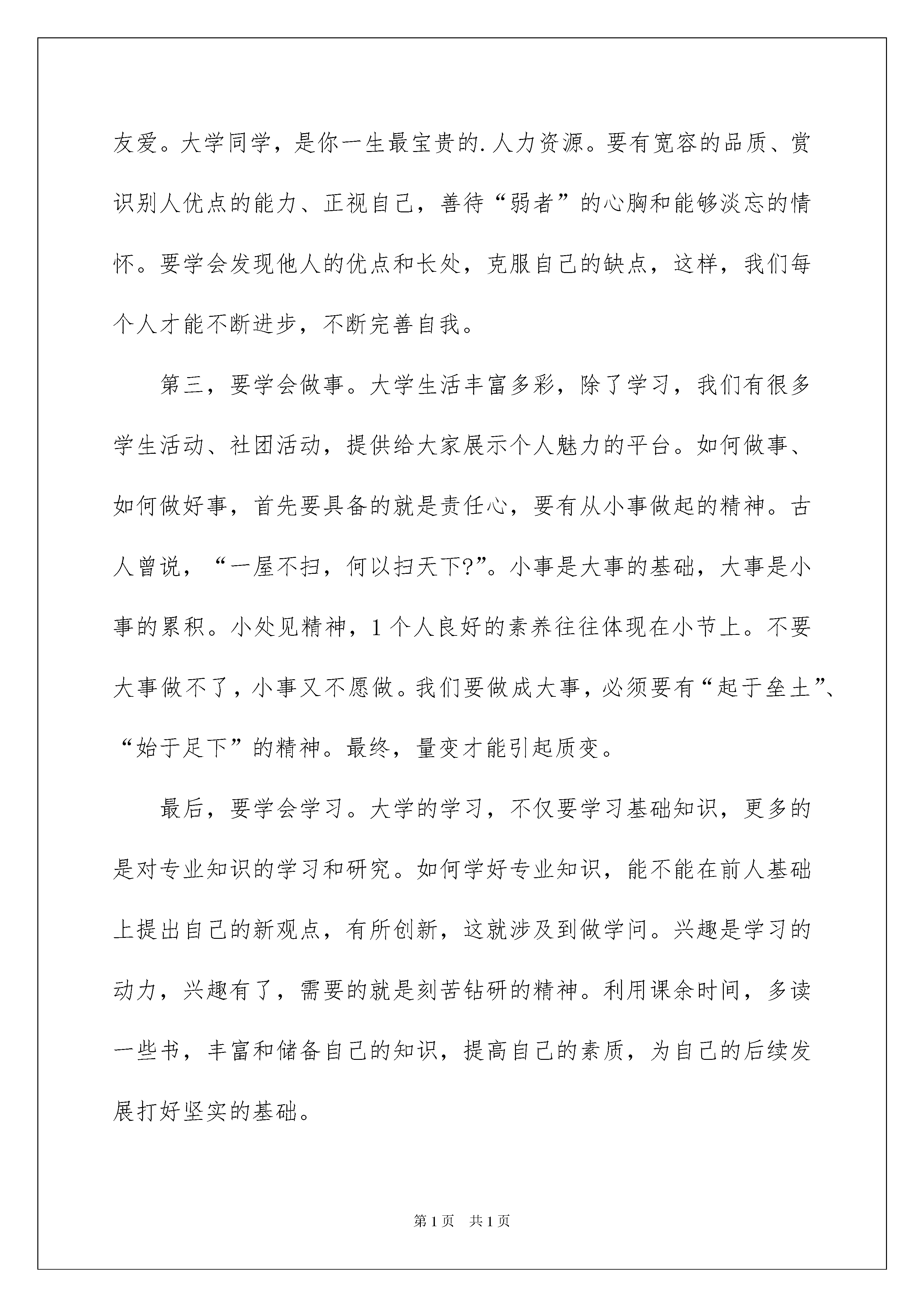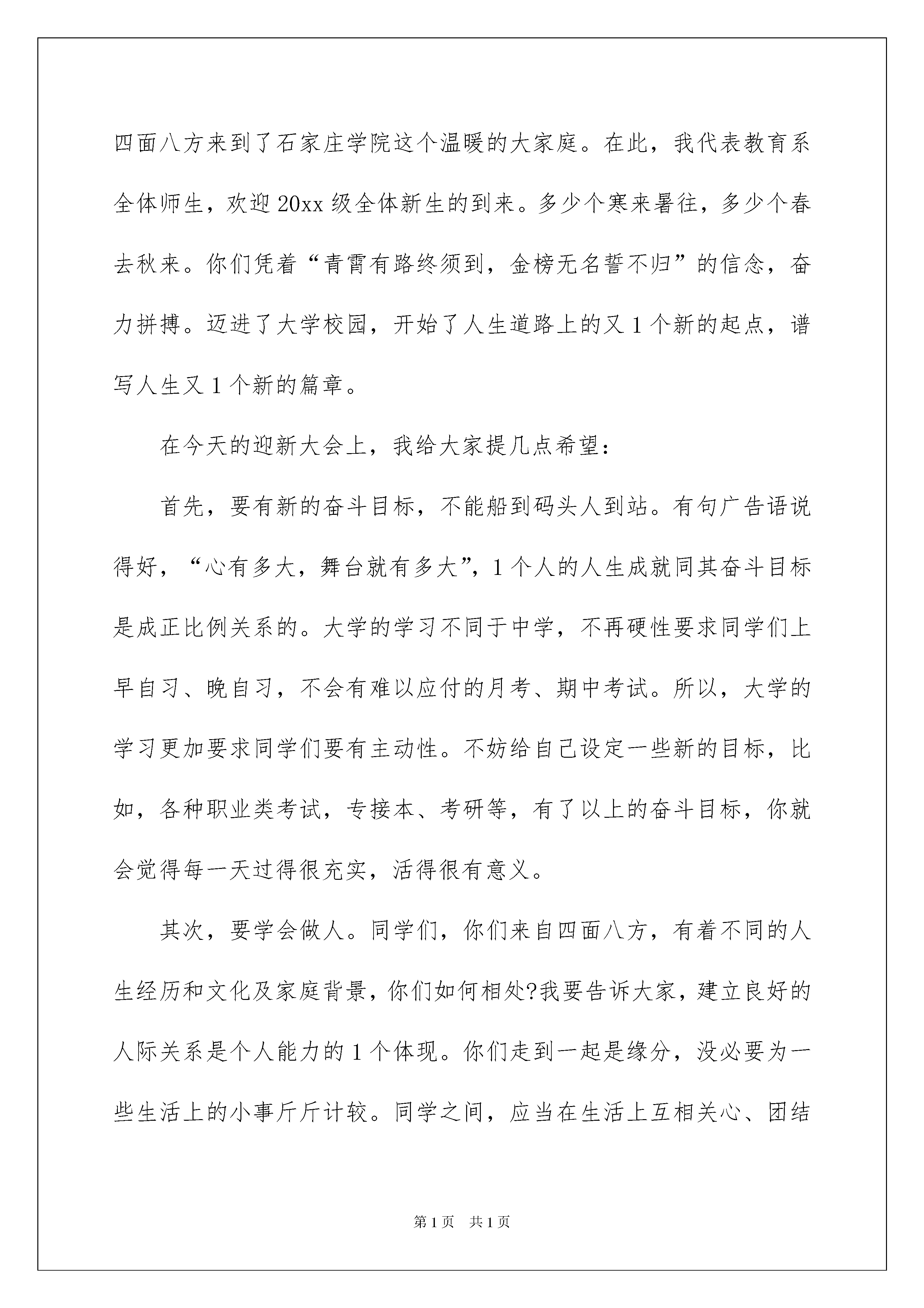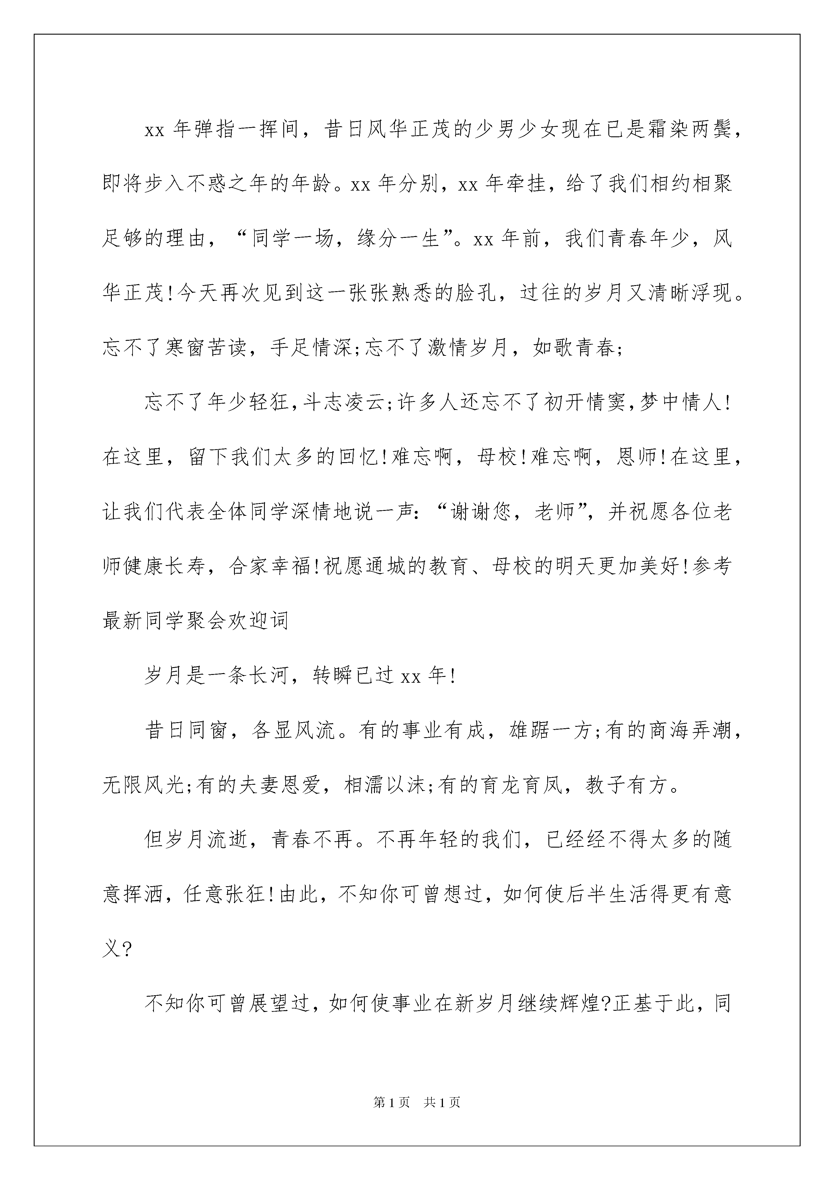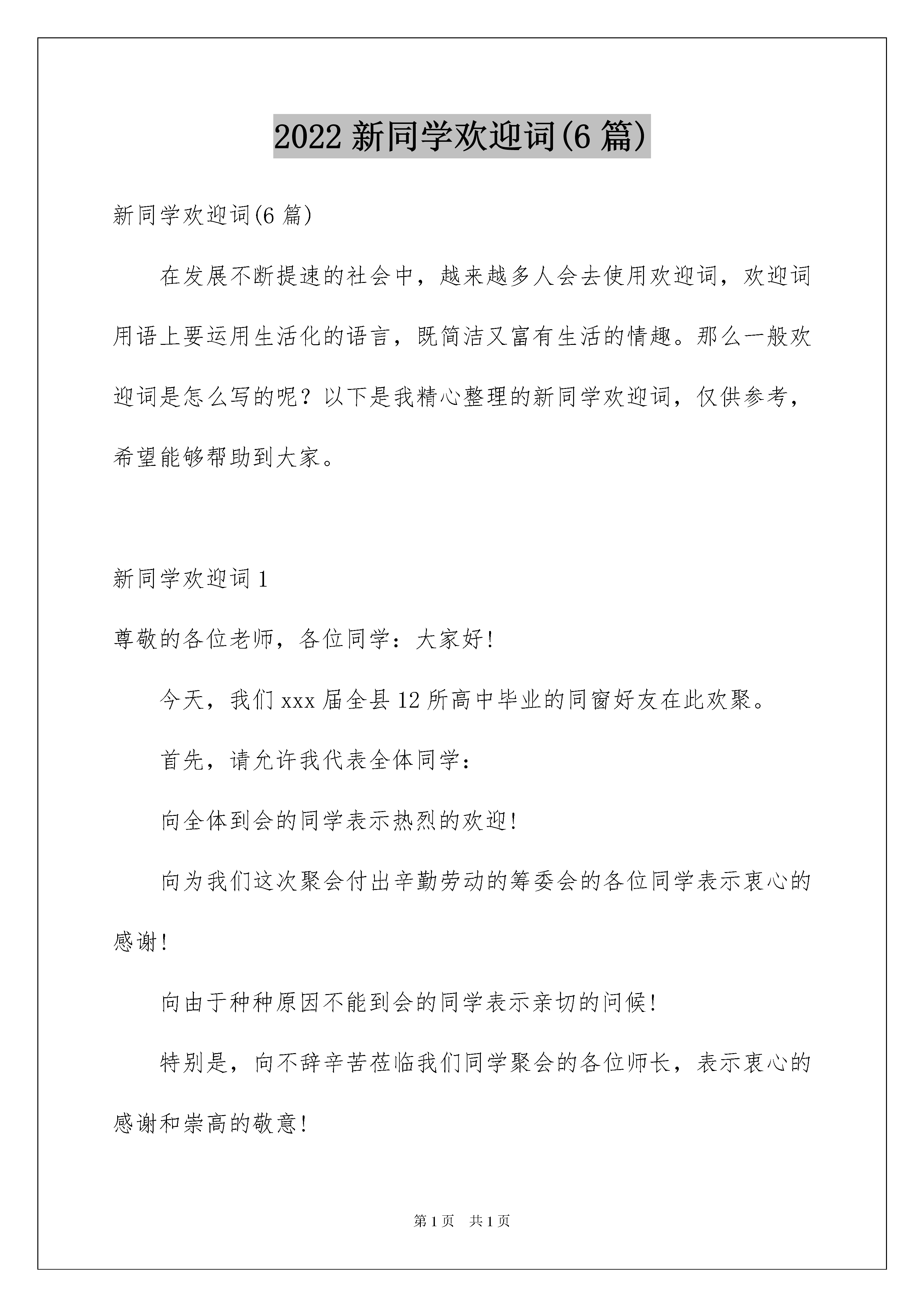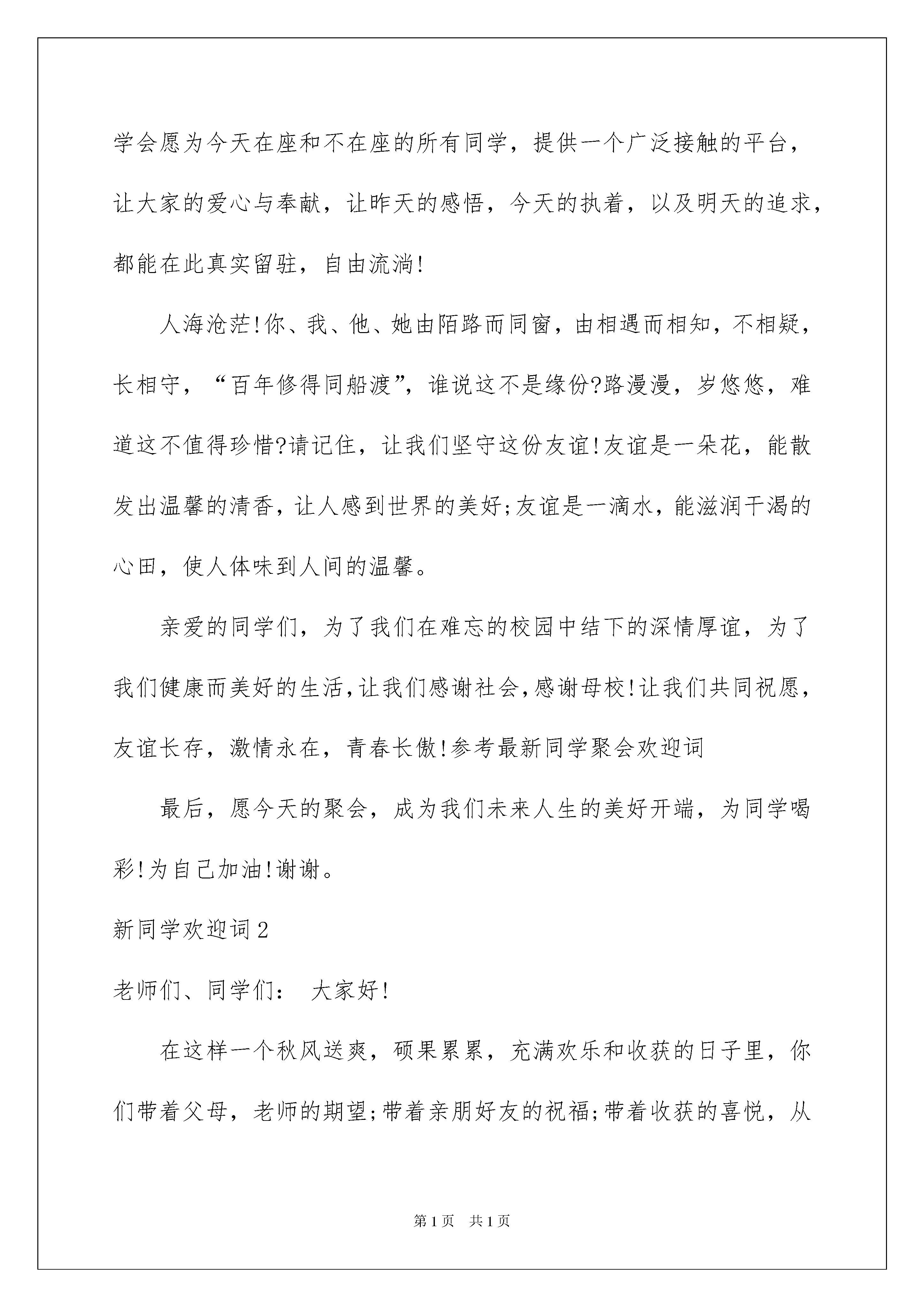 2022新同学欢迎词(6篇)新同学欢迎词(6篇)在发展不断提速的社会中,越来越多人会去使用欢迎词,欢迎词用语上要运用生活化的语言,既简洁又富有生活的情趣。那么一般欢迎词是怎么写的呢?以下是我精心整理的新同学欢迎词,仅供参考,希望能够帮助到大家。新同学欢迎词1尊敬的各位老师,各位同学:大家好!今天,我们xxx届全县12所高中毕业的同窗好友在此欢聚。首先,请允许我代表全体同学:向全体到会的同学表示热烈的欢迎!向为我们这次聚会付出辛勤劳动的筹委会的各位同学表示衷心的感谢!向由于种种原因不能到会的同学表示亲切的问候!特别是,向不辞辛苦莅临我们同学聚会的各位师长,表示衷心的感谢和崇高的敬意!xx年弹指一挥间,昔日风华正茂的少男少女现在已是霜染两鬓,即将步入不惑之年的年龄。xx年分别,xx年牵挂,给了我们相约相聚足够的理由,“同学一场,缘分一生”。xx年前,我们青春年少,风华正茂!今天再次见到这一张张熟悉的脸孔,过往的岁月又清晰浮现。忘不了寒窗苦读,手足情深;忘不了激情岁月,如歌青春;忘不了年少轻狂,斗志凌云;许多人还忘不了初开情窦,梦中情人!在这里,留下我们太多的回忆!难忘啊,母校!难忘啊,恩师!在这里,让我们代表全体同学深情地说一声:“谢谢您,老师”,并祝愿各位老师健康长寿,合家幸福!祝愿通城的教育、母校的明天更加美好!参考最新同学聚会欢迎词岁月是一条长河,转瞬已过xx年!昔日同窗,各显风流。有的事业有成,雄踞一方;有的商海弄潮,无限风光;有的夫妻恩爱,相濡以沫;有的育龙育凤,教子有方。但岁月流逝,青春不再。不再年轻的我们,已经经不得太多的随意挥洒,任意张狂!由此,不知你可曾想过,如何使后半生活得更有意义?不知你可曾展望过,如何使事业在新岁月继续辉煌?正基于此,同学会愿为今天在座和不在座的所有同学,提供一个广泛接触的平台,让大家的爱心与奉献,让昨天的感悟,今天的执着,以及明天的追求,都能在此真实留驻,自由流淌!人海沧茫!你、我、他、她由陌路而同窗,由相遇而相知,不相疑,长相守,“百年修得同船渡”,谁说这不是缘份?路漫漫,岁悠悠,难道这不值得珍惜?请记住,让我们坚守这份友谊!友谊是一朵花,能散发出温馨的清香,让人感到世界的美好;友谊是一滴水,能滋润干渴的心田,使人体味到人间的温馨。亲爱的同学们,为了我们在难忘的校园中结下的深情厚谊,为了我们健康而美好的生活,让我们感谢社会,感谢母校!让我们共同祝愿,友谊长存,激情永在,青春长傲!参考最新同学聚会欢迎词最后,愿今天的聚会,成为我们未来人生的美好开端,为同学喝彩!为自己加油!谢谢。新同学欢迎词2老师们、同学们:大家好!在这样一个秋风送爽,硕果累累,充满欢乐和收获的日子里,你们带着父母,老师的期望;带着亲朋好友的祝福;带着收获的喜悦,从四面八方来到了石家庄学院这个温暖的大家庭。在此,我代表教育系全体师生,欢迎20xx级全体新生的到来。多少个寒来暑往,多少个春去秋来。你们凭着“青霄有路终须到,金榜无名誓不归”的信念,奋力拼搏。迈进了大学校园,开始了人生道路上的又1个新的起点,谱写人生又1个新的篇章。在今天的迎新大会上,我给大家提几点希望:首先,要有新的奋斗目标,不能船到码头人到站。有句广告语说得好,“心有多大,舞台就有多大”,1个人的人生成就同其奋斗目标是成正比例关系的。大学的学习不同于中学,不再硬性要求同学们上早自习、晚自习,不会有难以应付的月考、期中考试。所以,大学的学习更加要求同学们要有主动性。不妨给自己设定一些新的目标,比如,各种职业类考试,专接本、考研等,有了以上的奋斗目标,你就会觉得每一天过得很充实,活得很有意义。其次,要学会做人。同学们,你们来自四面八方,有着不同的人生经历和文化及家庭背景,你们如何相处?我要告诉大家,建立良好的人际关系是个人能力的1个体现。你们走到一起是缘分,没必要为一些生活上的小事斤斤计较。同学之间,应当在生活上互相关心、团结友爱。大学同学,是你一生最宝贵的.人力资源。要有宽容的品质、赏识别人优点的能力、正视自己,善待“弱者”的心胸和能够淡忘的情怀。要学会发现他人的优点和长处,克服自己的缺点,这样,我们每个人才能不断进步,不断完善自我。第三,要学会做事。大学生活丰富多彩,除了学习,我们有很多学生活动、社团活动,提供给大家展示个人魅力的平台。如何做事、如何做好事,首先要具备的就是责任心,要有从小事做起的精神。古人曾说,“一屋不扫,何以扫天下?”。小事是大事的基础,大事是小事的累积。小处见精神,1个人良好的素养往往体现在小节上。不要大事做不了,小事又不愿做。我们要做成大事,必须要有“起于垒土”、“始于足下”的精