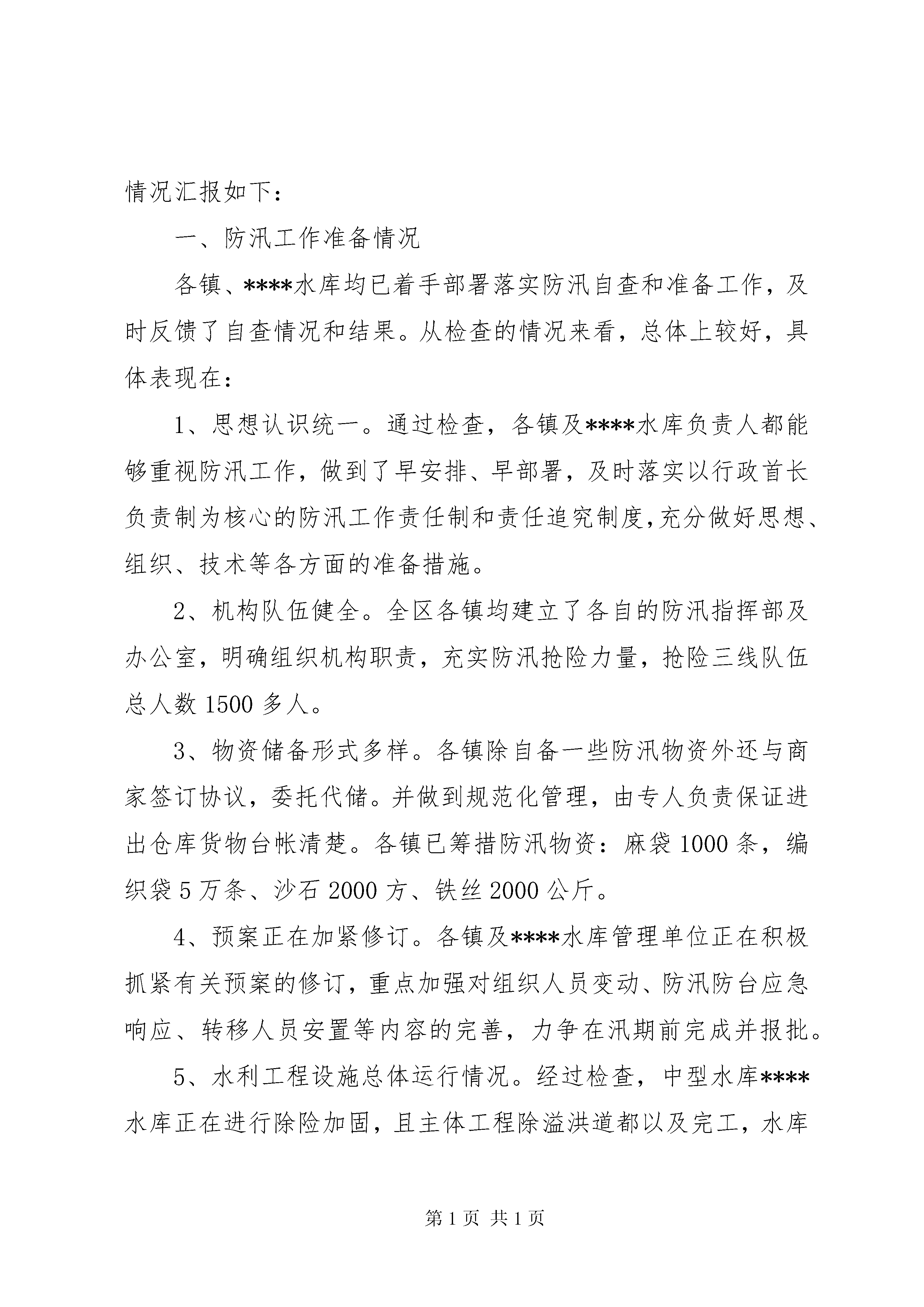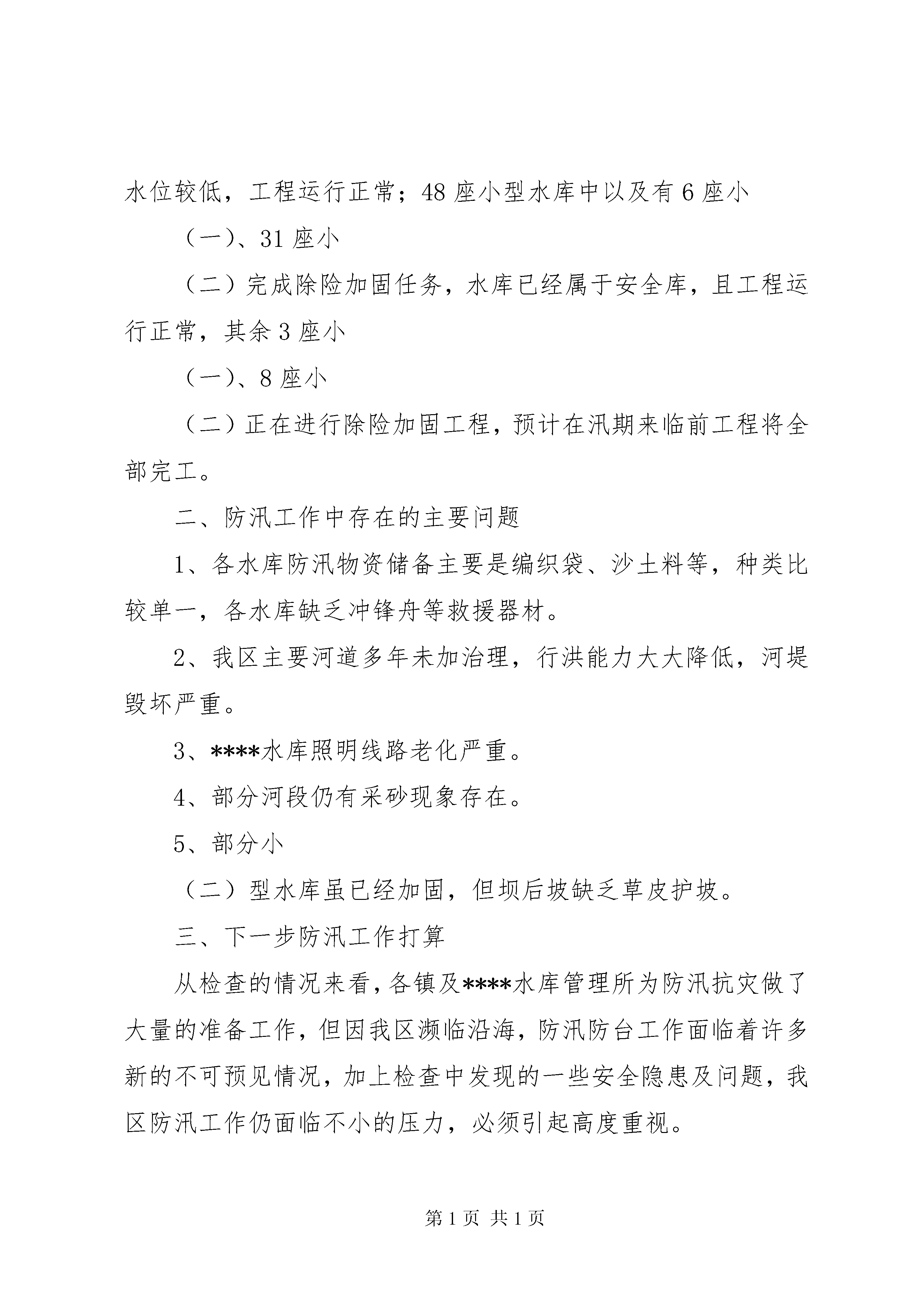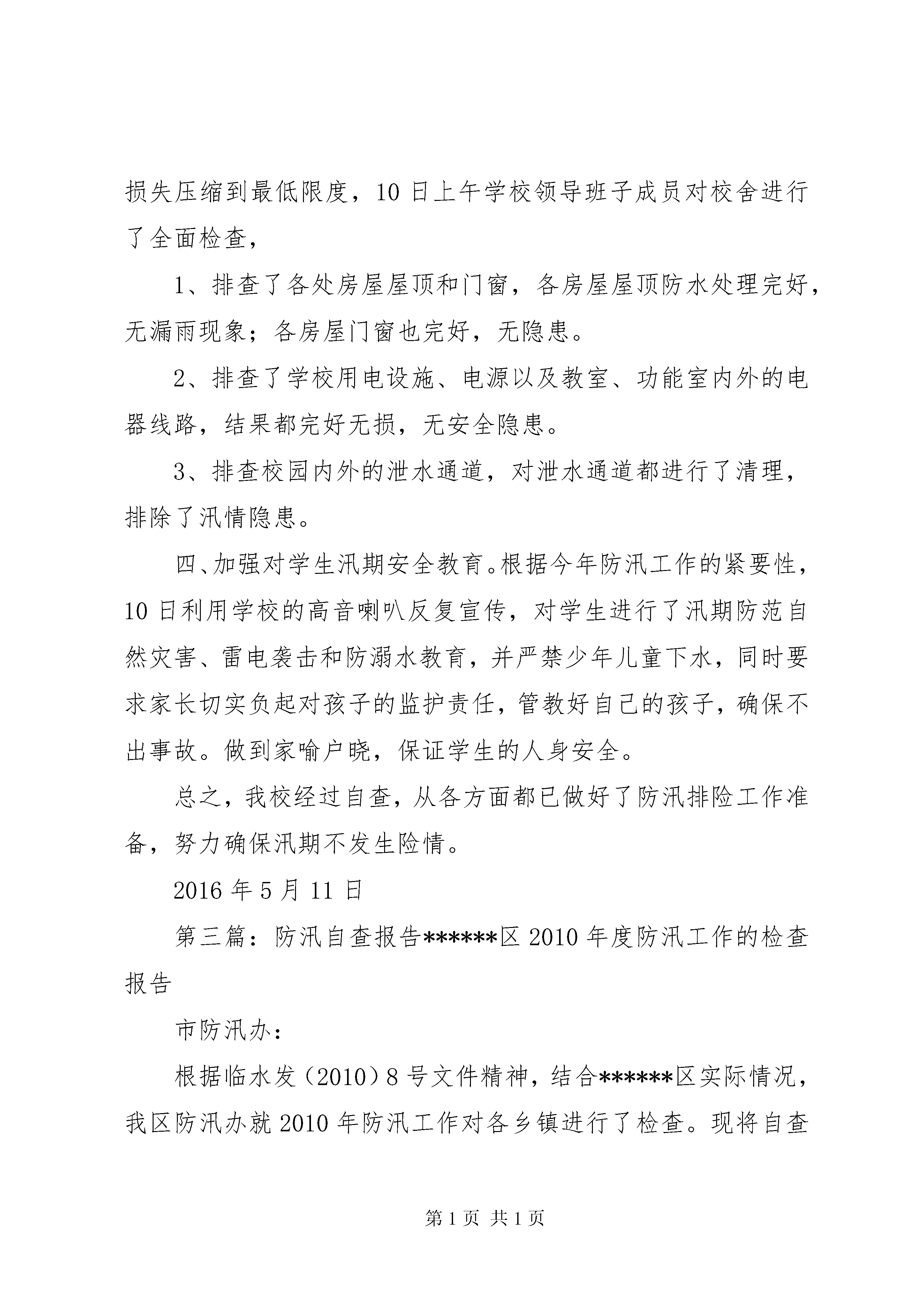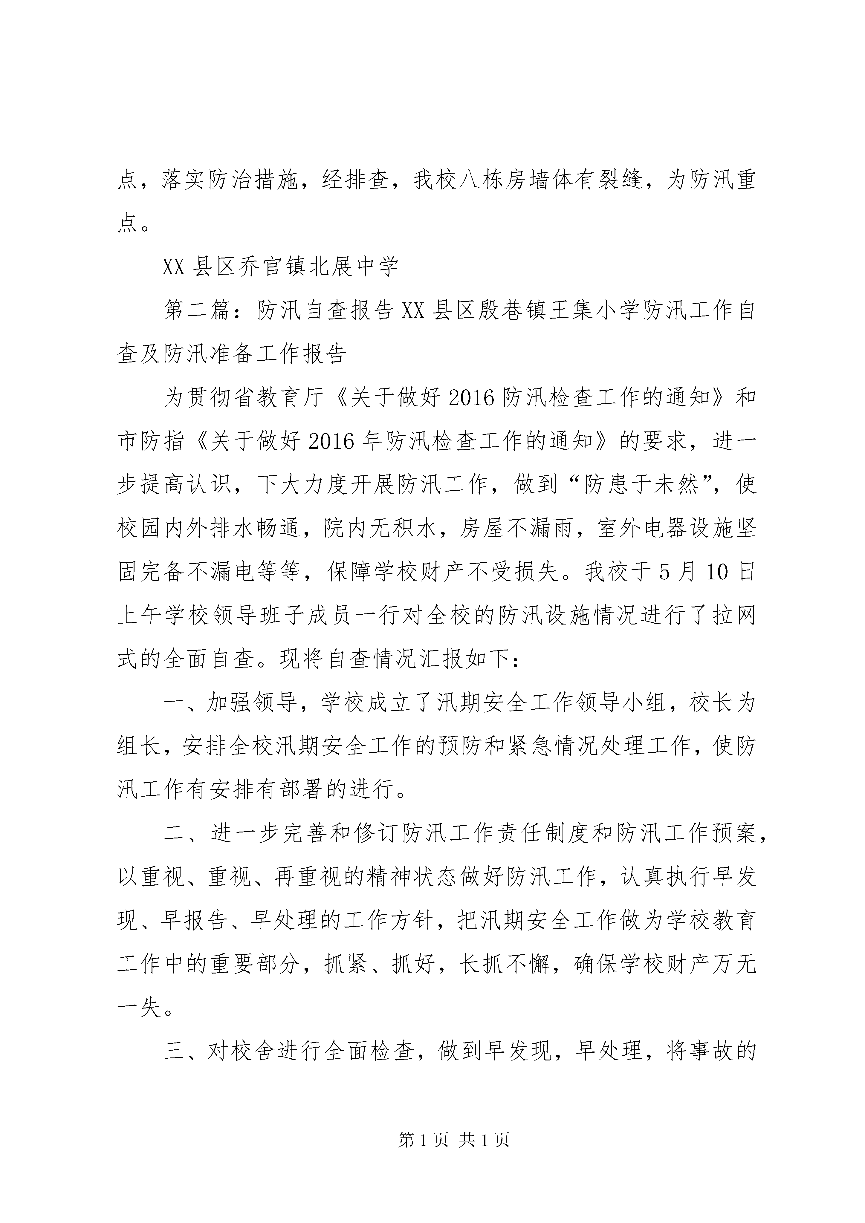 北展中学防汛自查报告一、指导思想以重视、再重视的精神状态做好今年防汛工作,认真执行早发现、早报告、早处理的工作方针,把汛期安全工作做为我校教育工作中的重要工作来抓,我们本着不漏一间房,不漏一架梁,务必做到做深、做细、做实,不留死角,决不能有侥幸心理和麻痹思想的原则进行仔细检查,确保师生的生命及学校财产安全。二、加强领导学校已经成立学校防汛安全领导小组,制定各项工作制度,明确责任。校长为组长,负责全面协调,统筹安排全校汛期安全工作的预防和紧急情况处理工作,各个小组各司其职,使防汛工作按部就班地进行。三、确保预警预报系统正常运转及时组织班主任深入各班开展抢险救灾宣传工作,通过座谈会形式向广大学生宣传《防洪法》等有关防汛防洪法律法规,增强水患意识,提高依法做好防汛工作的自觉性。加强硬件建设,加大对防汛工作的投入,目前我校防汛信息接收方式有:电话、电视、报刊、网络等。四、抓好汛前检查,汛期巡查,隐患排查工作。汛前检查、汛期巡查,隐患排查工作,是防汛工作的前提和基础,及早发现灾害隐患,及时将其纳入监控范围,找准防治重点,落实防治措施,经排查,我校八栋房墙体有裂缝,为防汛重点。XX县区乔官镇北展中学第二篇:防汛自查报告XX县区殷巷镇王集小学防汛工作自查及防汛准备工作报告为贯彻省教育厅《关于做好2016防汛检查工作的通知》和市防指《关于做好2016年防汛检查工作的通知》的要求,进一步提高认识,下大力度开展防汛工作,做到“防患于未然”,使校园内外排水畅通,院内无积水,房屋不漏雨,室外电器设施坚固完备不漏电等等,保障学校财产不受损失。我校于5月10日上午学校领导班子成员一行对全校的防汛设施情况进行了拉网式的全面自查。现将自查情况汇报如下:一、加强领导,学校成立了汛期安全工作领导小组,校长为组长,安排全校汛期安全工作的预防和紧急情况处理工作,使防汛工作有安排有部署的进行。二、进一步完善和修订防汛工作责任制度和防汛工作预案,以重视、重视、再重视的精神状态做好防汛工作,认真执行早发现、早报告、早处理的工作方针,把汛期安全工作做为学校教育工作中的重要部分,抓紧、抓好,长抓不懈,确保学校财产万无一失。三、对校舍进行全面检查,做到早发现,早处理,将事故的损失压缩到最低限度,10日上午学校领导班子成员对校舍进行了全面检查,1、排查了各处房屋屋顶和门窗,各房屋屋顶防水处理完好,无漏雨现象;各房屋门窗也完好,无隐患。2、排查了学校用电设施、电源以及教室、功能室内外的电器线路,结果都完好无损,无安全隐患。3、排查校园内外的泄水通道,对泄水通道都进行了清理,排除了汛情隐患。四、加强对学生汛期安全教育。根据今年防汛工作的紧要性,10日利用学校的高音喇叭反复宣传,对学生进行了汛期防范自然灾害、雷电袭击和防溺水教育,并严禁少年儿童下水,同时要求家长切实负起对孩子的监护责任,管教好自己的孩子,确保不出事故。做到家喻户晓,保证学生的人身安全。总之,我校经过自查,从各方面都已做好了防汛排险工作准备,努力确保汛期不发生险情。2016年5月11日第三篇:防汛自查报告******区2010年度防汛工作的检查报告市防汛办:根据临水发(2010)8号文件精神,结合******区实际情况,我区防汛办就2010年防汛工作对各乡镇进行了检查。现将自查情况汇报如下:一、防汛工作准备情况各镇、****水库均已着手部署落实防汛自查和准备工作,及时反馈了自查情况和结果。从检查的情况来看,总体上较好,具体表现在:1、思想认识统一。通过检查,各镇及****水库负责人都能够重视防汛工作,做到了早安排、早部署,及时落实以行政首长负责制为核心的防汛工作责任制和责任追究制度,充分做好思想、组织、技术等各方面的准备措施。2、机构队伍健全。全区各镇均建立了各自的防汛指挥部及办公室,明确组织机构职责,充实防汛抢险力量,抢险三线队伍总人数1500多人。3、物资储备形式多样。各镇除自备一些防汛物资外还与商家签订协议,委托代储。并做到规范化管理,由专人负责保证进出仓库货物台帐清楚。各镇已筹措防汛物资:麻袋1000条,编织袋5万条、沙石2000方、铁丝2000公斤。4、预案正在加紧修订。各镇及****水库管理单位正在积极抓紧有关预案的修订,重点加强对组织人员变动、防汛防台应急响应、转移人员安置等内容的完善,力争在汛期前完成并报批。5、水利工程设施总体运行情况。经过检查,中型水库****水库正在进行除险加固,且主体工程除溢洪道都以及完工,水库水位较低,工程运行正常;48座小型水库中以及有6座小(一)、31座小(二)完成除险加固任务,水库已经属于安全库,且工程运行正常,其余3座小(一)、8座小(二)正在进行除险加固工程,预计在汛期来临前工程将全部完工。二、防汛工作中存在的主要问题1、各水库防汛物资储备主要