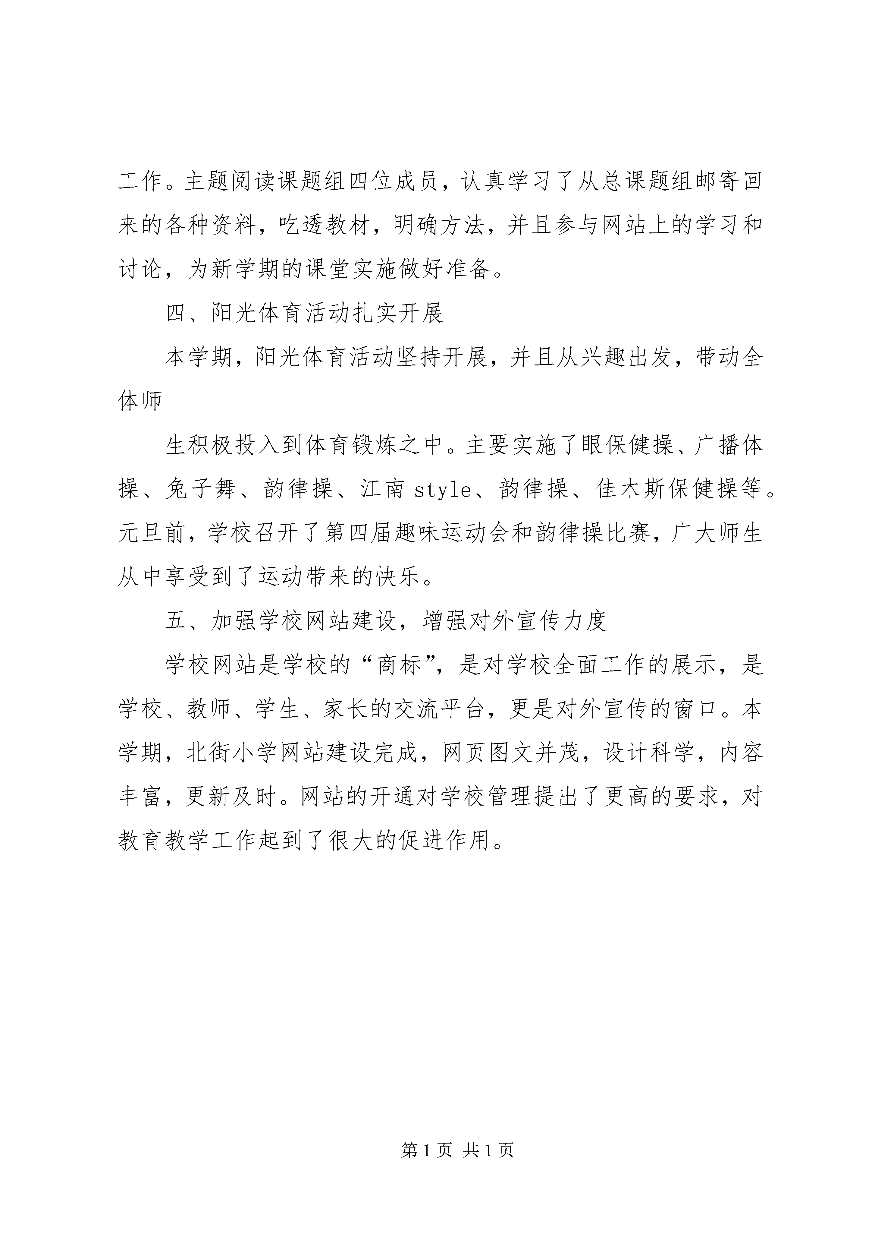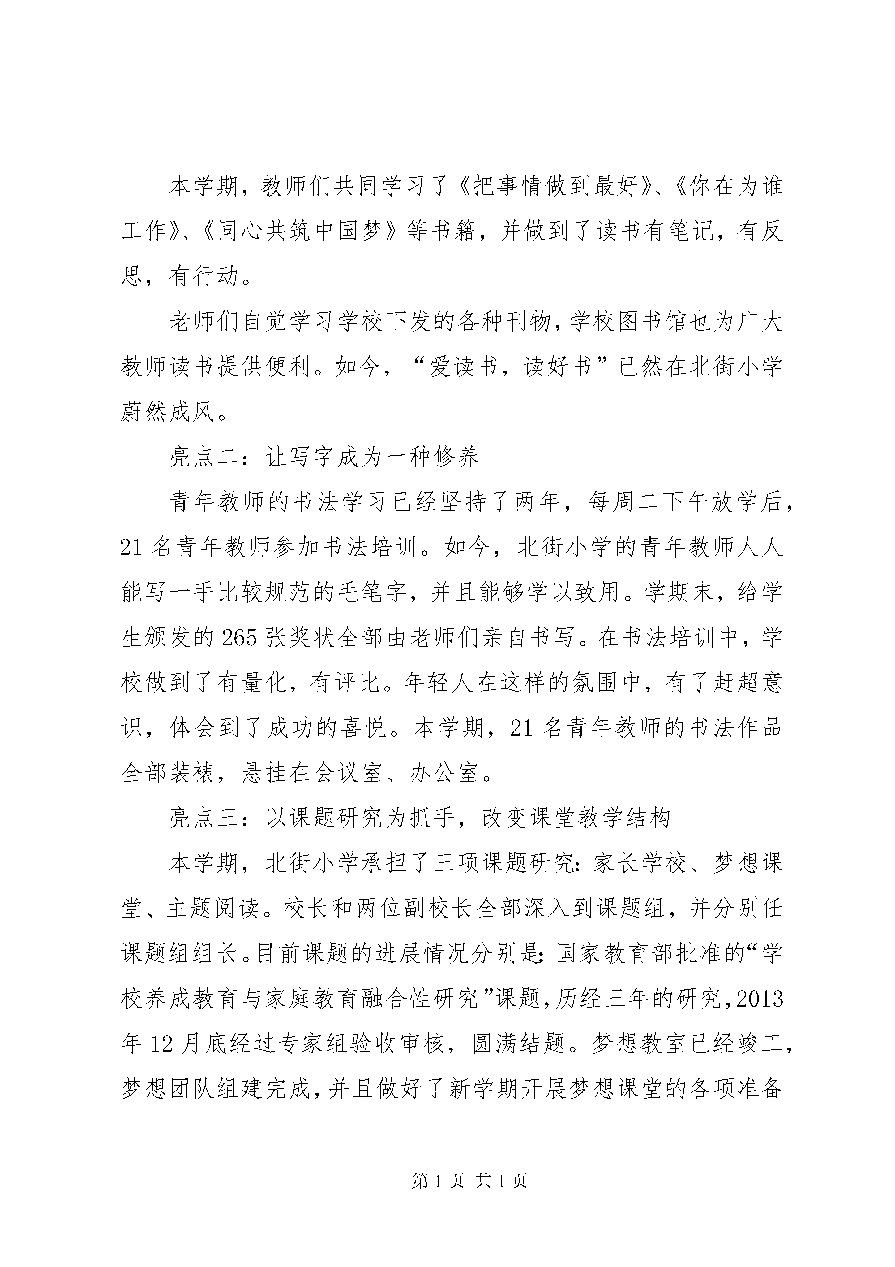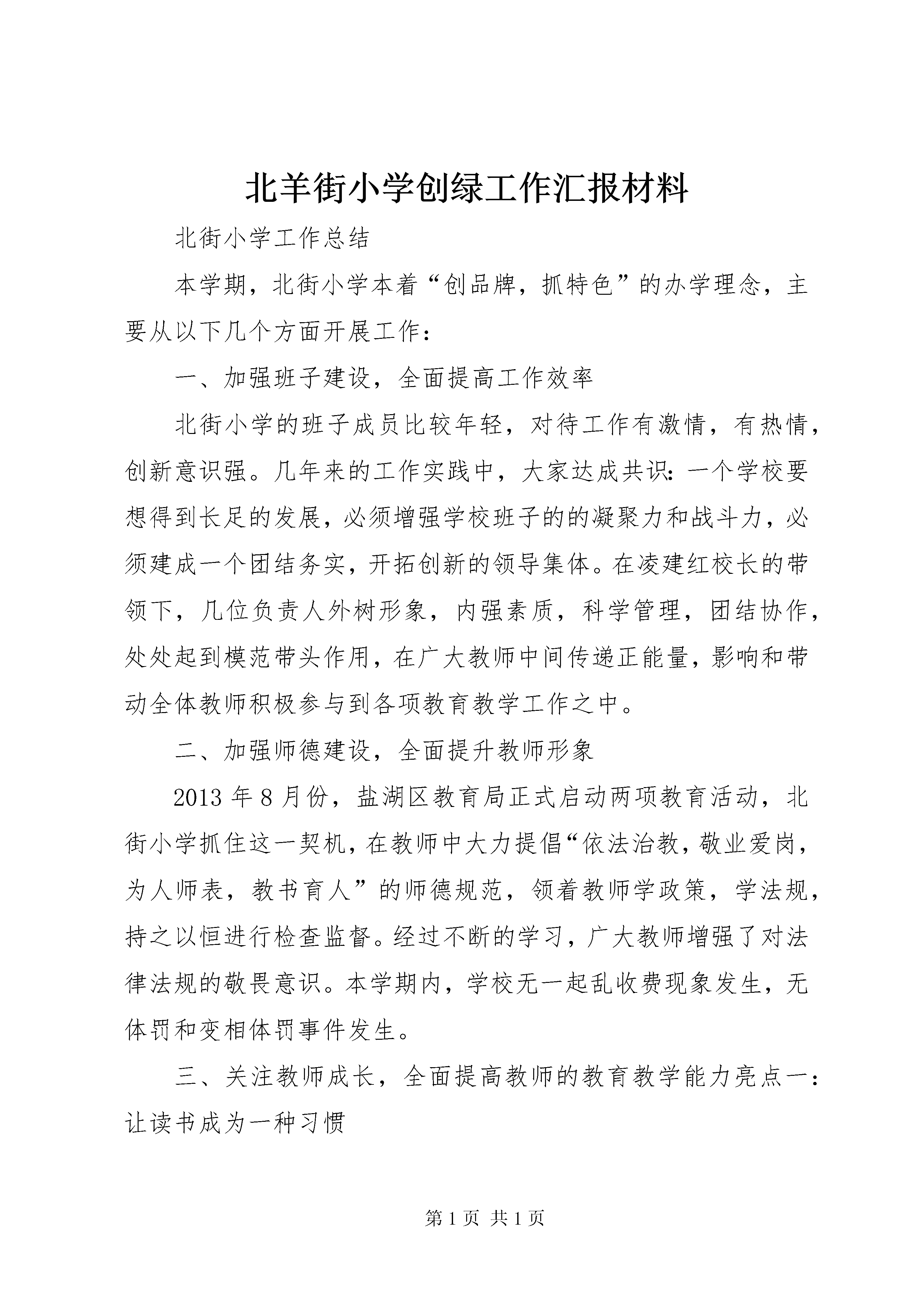 北羊街小学创绿工作汇报材料北街小学工作总结本学期,北街小学本着“创品牌,抓特色”的办学理念,主要从以下几个方面开展工作:一、加强班子建设,全面提高工作效率北街小学的班子成员比较年轻,对待工作有激情,有热情,创新意识强。几年来的工作实践中,大家达成共识:一个学校要想得到长足的发展,必须增强学校班子的的凝聚力和战斗力,必须建成一个团结务实,开拓创新的领导集体。在凌建红校长的带领下,几位负责人外树形象,内强素质,科学管理,团结协作,处处起到模范带头作用,在广大教师中间传递正能量,影响和带动全体教师积极参与到各项教育教学工作之中。二、加强师德建设,全面提升教师形象2013年8月份,盐湖区教育局正式启动两项教育活动,北街小学抓住这一契机,在教师中大力提倡“依法治教,敬业爱岗,为人师表,教书育人”的师德规范,领着教师学政策,学法规,持之以恒进行检查监督。经过不断的学习,广大教师增强了对法律法规的敬畏意识。本学期内,学校无一起乱收费现象发生,无体罚和变相体罚事件发生。三、关注教师成长,全面提高教师的教育教学能力亮点一:让读书成为一种习惯本学期,教师们共同学习了《把事情做到最好》、《你在为谁工作》、《同心共筑中国梦》等书籍,并做到了读书有笔记,有反思,有行动。老师们自觉学习学校下发的各种刊物,学校图书馆也为广大教师读书提供便利。如今,“爱读书,读好书”已然在北街小学蔚然成风。亮点二:让写字成为一种修养青年教师的书法学习已经坚持了两年,每周二下午放学后,21名青年教师参加书法培训。如今,北街小学的青年教师人人能写一手比较规范的毛笔字,并且能够学以致用。学期末,给学生颁发的265张奖状全部由老师们亲自书写。在书法培训中,学校做到了有量化,有评比。年轻人在这样的氛围中,有了赶超意识,体会到了成功的喜悦。本学期,21名青年教师的书法作品全部装裱,悬挂在会议室、办公室。亮点三:以课题研究为抓手,改变课堂教学结构本学期,北街小学承担了三项课题研究:家长学校、梦想课堂、主题阅读。校长和两位副校长全部深入到课题组,并分别任课题组组长。目前课题的进展情况分别是:国家教育部批准的“学校养成教育与家庭教育融合性研究”课题,历经三年的研究,2013年12月底经过专家组验收审核,圆满结题。梦想教室已经竣工,梦想团队组建完成,并且做好了新学期开展梦想课堂的各项准备工作。主题阅读课题组四位成员,认真学习了从总课题组邮寄回来的各种资料,吃透教材,明确方法,并且参与网站上的学习和讨论,为新学期的课堂实施做好准备。四、阳光体育活动扎实开展本学期,阳光体育活动坚持开展,并且从兴趣出发,带动全体师生积极投入到体育锻炼之中。主要实施了眼保健操、广播体操、兔子舞、韵律操、江南style、韵律操、佳木斯保健操等。元旦前,学校召开了第四届趣味运动会和韵律操比赛,广大师生从中享受到了运动带来的快乐。五、加强学校网站建设,增强对外宣传力度学校网站是学校的“商标”,是对学校全面工作的展示,是学校、教师、学生、家长的交流平台,更是对外宣传的窗口。本学期,北街小学网站建设完成,网页图文并茂,设计科学,内容丰富,更新及时。网站的开通对学校管理提出了更高的要求,对教育教学工作起到了很大的促进作用。
