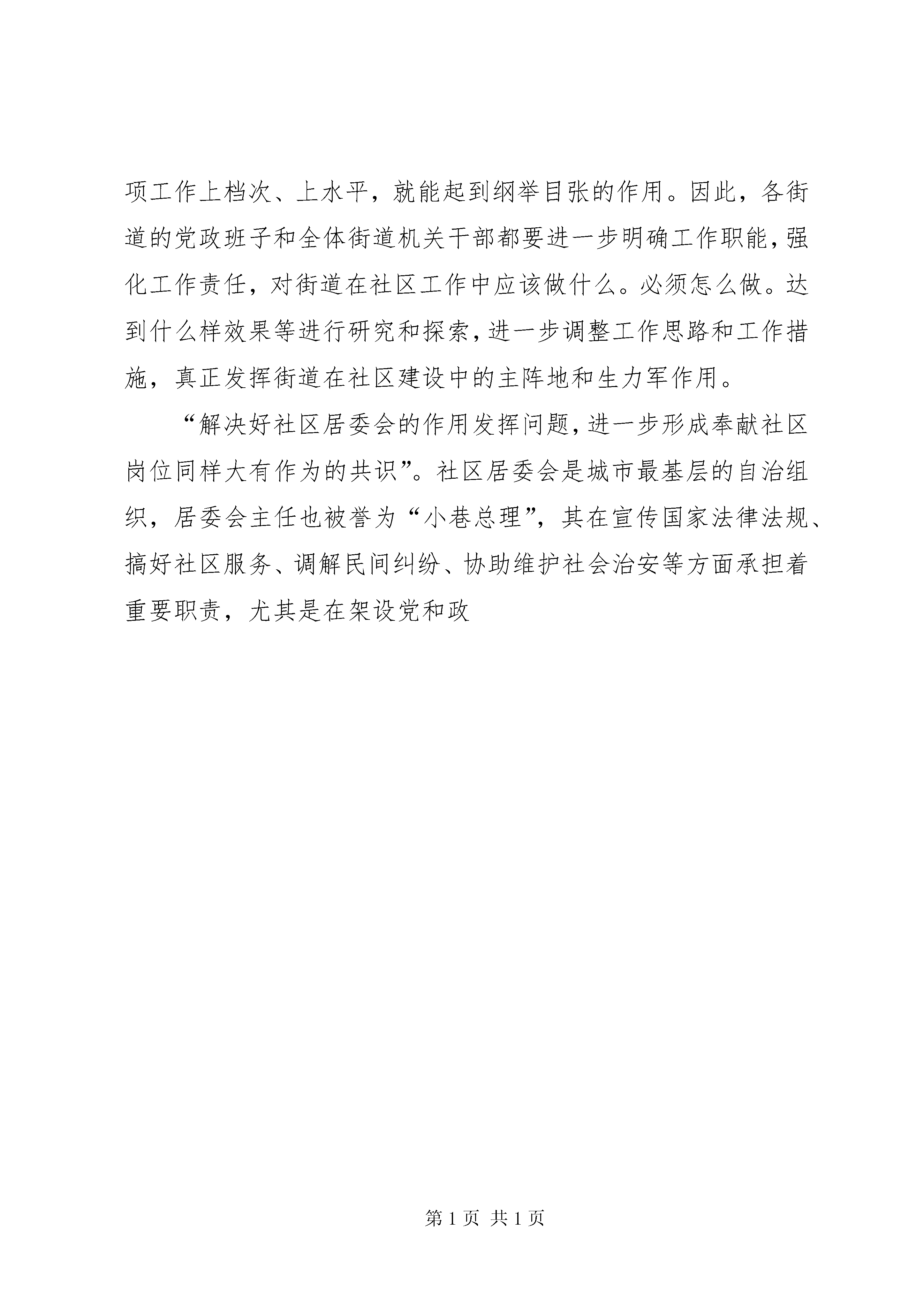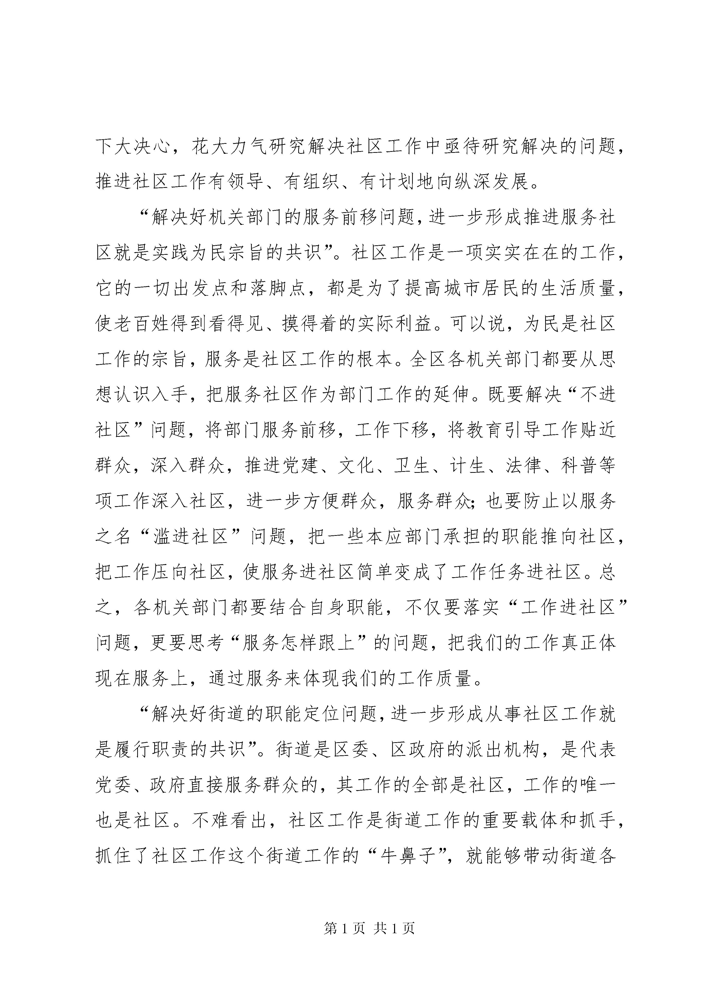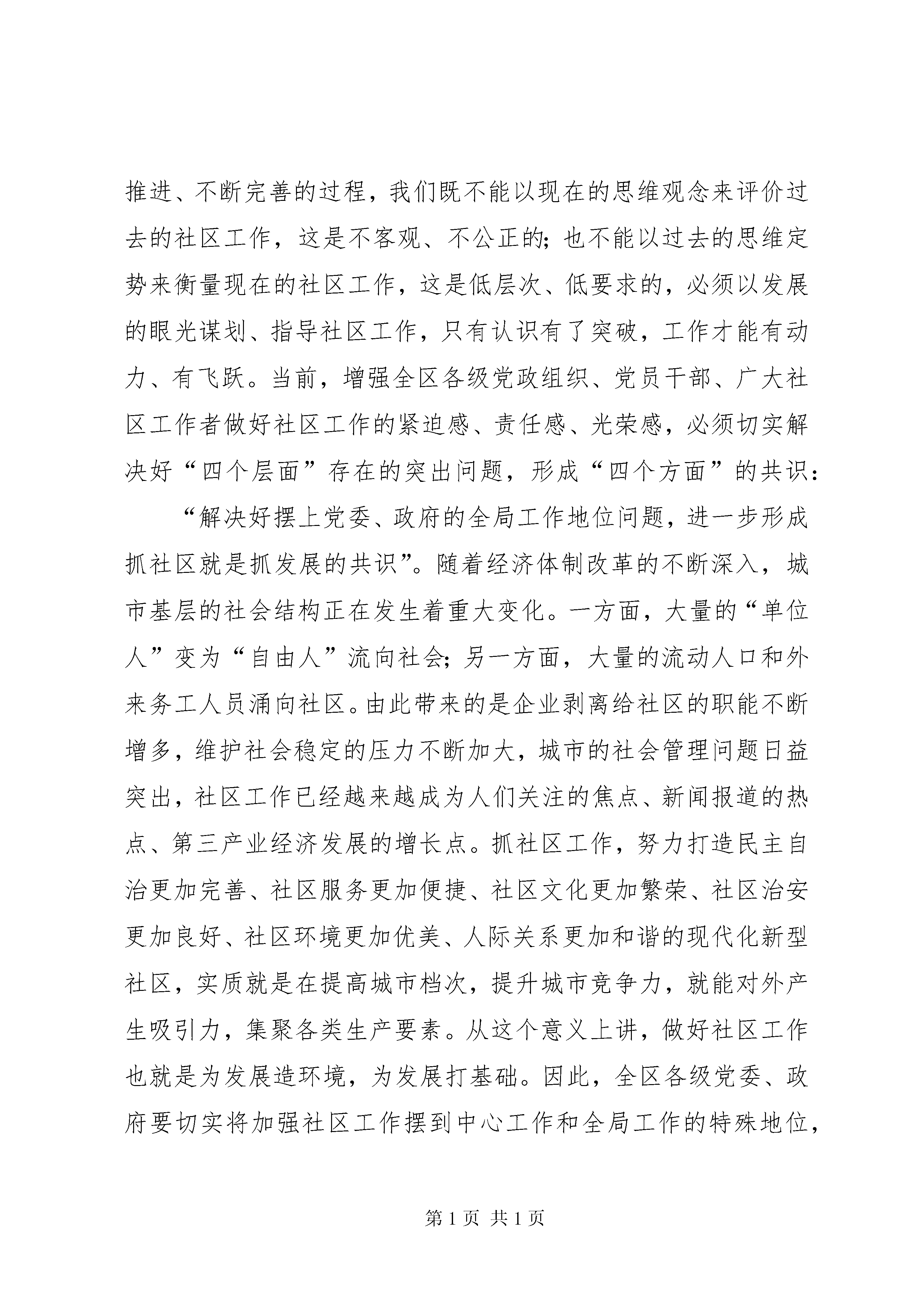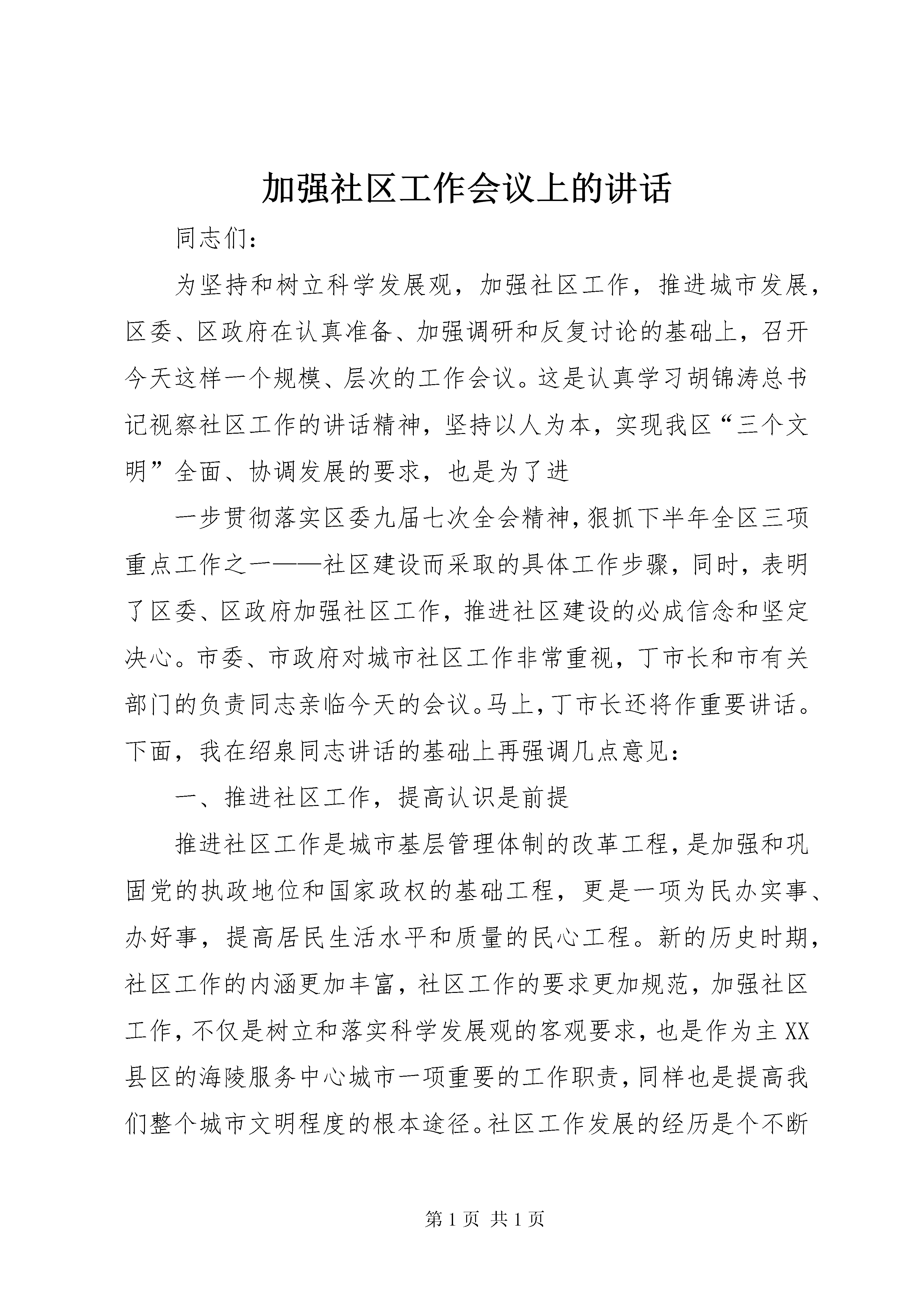 加强社区工作会议上的讲话同志们:为坚持和树立科学发展观,加强社区工作,推进城市发展,区委、区政府在认真准备、加强调研和反复讨论的基础上,召开今天这样一个规模、层次的工作会议。这是认真学习胡锦涛总书记视察社区工作的讲话精神,坚持以人为本,实现我区“三个文明”全面、协调发展的要求,也是为了进一步贯彻落实区委九届七次全会精神,狠抓下半年全区三项重点工作之一——社区建设而采取的具体工作步骤,同时,表明了区委、区政府加强社区工作,推进社区建设的必成信念和坚定决心。市委、市政府对城市社区工作非常重视,丁市长和市有关部门的负责同志亲临今天的会议。马上,丁市长还将作重要讲话。下面,我在绍泉同志讲话的基础上再强调几点意见:一、推进社区工作,提高认识是前提推进社区工作是城市基层管理体制的改革工程,是加强和巩固党的执政地位和国家政权的基础工程,更是一项为民办实事、办好事,提高居民生活水平和质量的民心工程。新的历史时期,社区工作的内涵更加丰富,社区工作的要求更加规范,加强社区工作,不仅是树立和落实科学发展观的客观要求,也是作为主XX县区的海陵服务中心城市一项重要的工作职责,同样也是提高我们整个城市文明程度的根本途径。社区工作发展的经历是个不断推进、不断完善的过程,我们既不能以现在的思维观念来评价过去的社区工作,这是不客观、不公正的;也不能以过去的思维定势来衡量现在的社区工作,这是低层次、低要求的,必须以发展的眼光谋划、指导社区工作,只有认识有了突破,工作才能有动力、有飞跃。当前,增强全区各级党政组织、党员干部、广大社区工作者做好社区工作的紧迫感、责任感、光荣感,必须切实解决好“四个层面”存在的突出问题,形成“四个方面”的共识:“解决好摆上党委、政府的全局工作地位问题,进一步形成抓社区就是抓发展的共识”。随着经济体制改革的不断深入,城市基层的社会结构正在发生着重大变化。一方面,大量的“单位人”变为“自由人”流向社会;另一方面,大量的流动人口和外来务工人员涌向社区。由此带来的是企业剥离给社区的职能不断增多,维护社会稳定的压力不断加大,城市的社会管理问题日益突出,社区工作已经越来越成为人们关注的焦点、新闻报道的热点、第三产业经济发展的增长点。抓社区工作,努力打造民主自治更加完善、社区服务更加便捷、社区文化更加繁荣、社区治安更加良好、社区环境更加优美、人际关系更加和谐的现代化新型社区,实质就是在提高城市档次,提升城市竞争力,就能对外产生吸引力,集聚各类生产要素。从这个意义上讲,做好社区工作也就是为发展造环境,为发展打基础。因此,全区各级党委、政府要切实将加强社区工作摆到中心工作和全局工作的特殊地位,下大决心,花大力气研究解决社区工作中亟待研究解决的问题,推进社区工作有领导、有组织、有计划地向纵深发展。“解决好机关部门的服务前移问题,进一步形成推进服务社区就是实践为民宗旨的共识”。社区工作是一项实实在在的工作,它的一切出发点和落脚点,都是为了提高城市居民的生活质量,使老百姓得到看得见、摸得着的实际利益。可以说,为民是社区工作的宗旨,服务是社区工作的根本。全区各机关部门都要从思想认识入手,把服务社区作为部门工作的延伸。既要解决“不进社区”问题,将部门服务前移,工作下移,将教育引导工作贴近群众,深入群众,推进党建、文化、卫生、计生、法律、科普等项工作深入社区,进一步方便群众,服务群众;也要防止以服务之名“滥进社区”问题,把一些本应部门承担的职能推向社区,把工作压向社区,使服务进社区简单变成了工作任务进社区。总之,各机关部门都要结合自身职能,不仅要落实“工作进社区”问题,更要思考“服务怎样跟上”的问题,把我们的工作真正体现在服务上,通过服务来体现我们的工作质量。“解决好街道的职能定位问题,进一步形成从事社区工作就是履行职责的共识”。街道是区委、区政府的派出机构,是代表党委、政府直接服务群众的,其工作的全部是社区,工作的唯一也是社区。不难看出,社区工作是街道工作的重要载体和抓手,抓住了社区工作这个街道工作的“牛鼻子”,就能够带动街道各项工作上档次、上水平,就能起到纲举目张的作用。因此,各街道的党政班子和全体街道机关干部都要进一步明确工作职能,强化工作责任,对街道在社区工作中应该做什么。必须怎么做。达到什么样效果等进行研究和探索,进一步调整工作思路和工作措施,真正发挥街道在社区建设中的主阵地和生力军作用。“解决好社区居委会的作用发挥问题,进一步形成奉献社区岗位同样大有作为的共识”。社区居委会是城市最基层的自治组织,居委会主任也被誉为“小巷总理”,其在宣传国家法律法规、搞好社区服务、调解民间纠纷、协助维护社会治安等方面承担着重要职责,尤其是在架设党和政