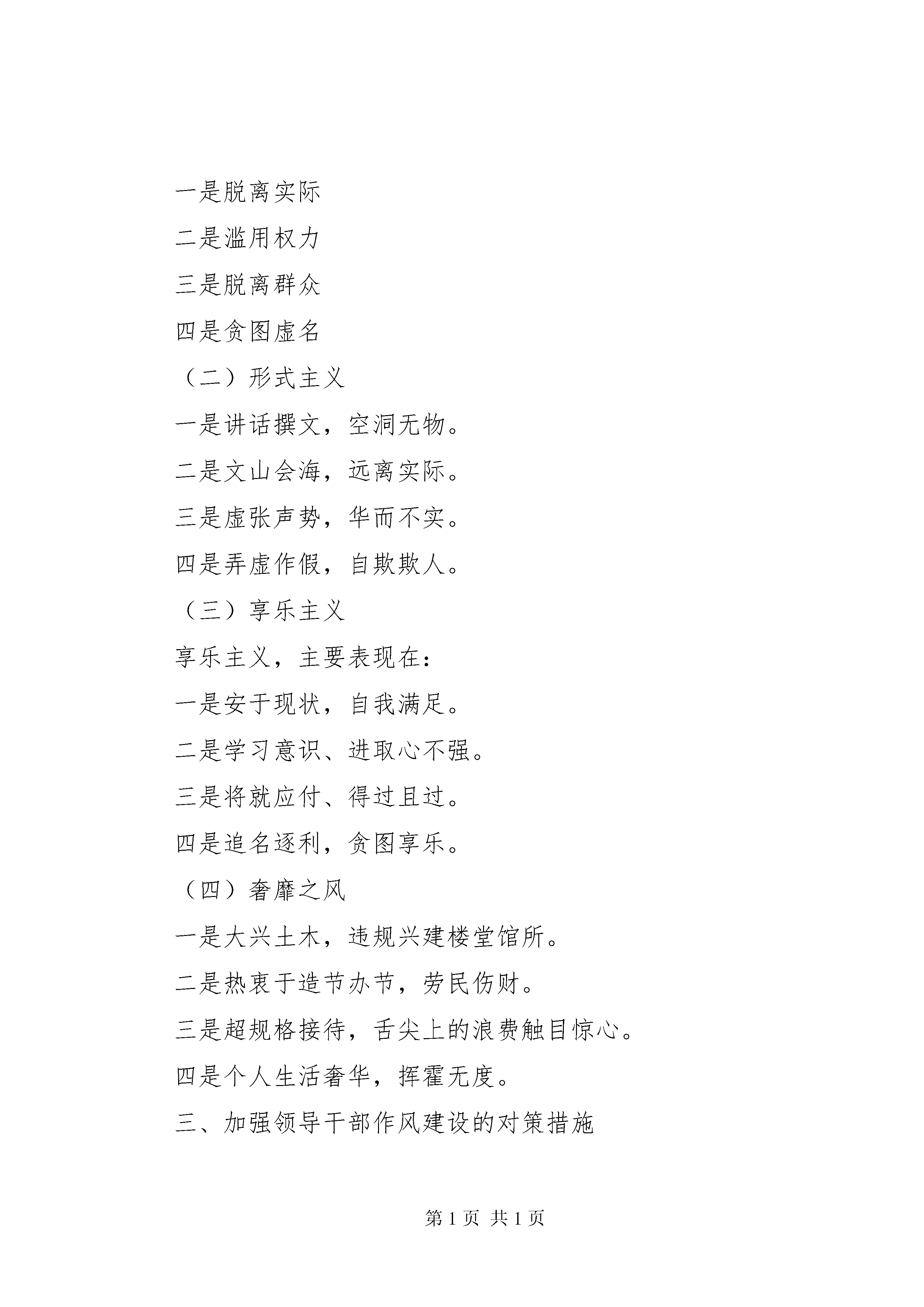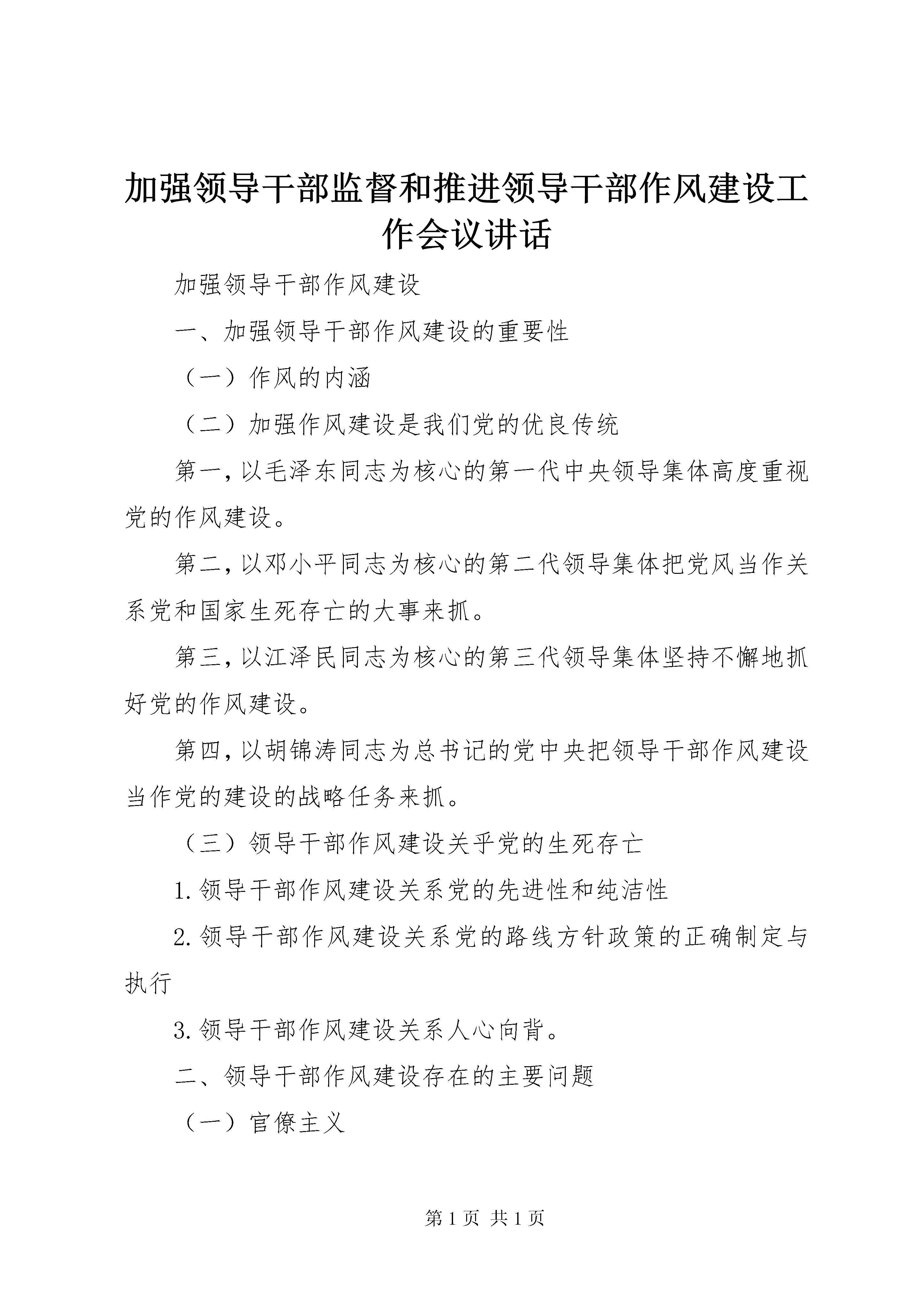 加强领导干部监督和推进领导干部作风建设工作会议讲话加强领导干部作风建设一、加强领导干部作风建设的重要性(一)作风的内涵(二)加强作风建设是我们党的优良传统第一,以毛泽东同志为核心的第一代中央领导集体高度重视党的作风建设。第二,以邓小平同志为核心的第二代领导集体把党风当作关系党和国家生死存亡的大事来抓。第三,以江泽民同志为核心的第三代领导集体坚持不懈地抓好党的作风建设。第四,以胡锦涛同志为总书记的党中央把领导干部作风建设当作党的建设的战略任务来抓。(三)领导干部作风建设关乎党的生死存亡1.领导干部作风建设关系党的先进性和纯洁性2.领导干部作风建设关系党的路线方针政策的正确制定与执行3.领导干部作风建设关系人心向背。二、领导干部作风建设存在的主要问题(一)官僚主义一是脱离实际二是滥用权力三是脱离群众四是贪图虚名(二)形式主义一是讲话撰文,空洞无物。二是文山会海,远离实际。三是虚张声势,华而不实。四是弄虚作假,自欺欺人。(三)享乐主义享乐主义,主要表现在:一是安于现状,自我满足。二是学习意识、进取心不强。三是将就应付、得过且过。四是追名逐利,贪图享乐。(四)奢靡之风一是大兴土木,违规兴建楼堂馆所。二是热衷于造节办节,劳民伤财。三是超规格接待,舌尖上的浪费触目惊心。四是个人生活奢华,挥霍无度。三、加强领导干部作风建设的对策措施(一)勤奋学习,学以致用一要培养勤奋学习的生活方式。第二,学习是领导干部增长才干,增强综合素质,做好各项工作的重要基础。第三,学习的目的全在于运用。一是在“务实”上下功夫。二是在“深入”上下功夫。三是在“管用”上下功夫。(二)心系群众,服务人民第一,牢固树立马克思主义的群众观点。第二,坚持从群众中来、到群众中去。一要深入群众,体察民情。二要了解民意,关注民生。三要化解矛盾,解决民忧。(三)艰苦奋斗,清正廉洁第一,崇尚简朴,厉行节约。第二,生活正派,情趣健康。看得穿。想得透。忍得住。放得下。第三,明辨是非,克己慎行。切实做到“四慎”:慎初;慎独;慎微;慎交。(四)真抓实改,建章立制第一,重拳整治,真抓实改。【真抓实改】一要高度重视、加强领导,精心组织、稳步推进。二要加强组织协调,充分发挥相关职能部门作用,强化制度执行刚性。三要加大惩戒力度,严肃查处违规违纪行为。第二,建章立制,建立长效机制。【建章立制】一要科学制衡权力二要严格进行监督三要形成正确导向四要完善考核办法