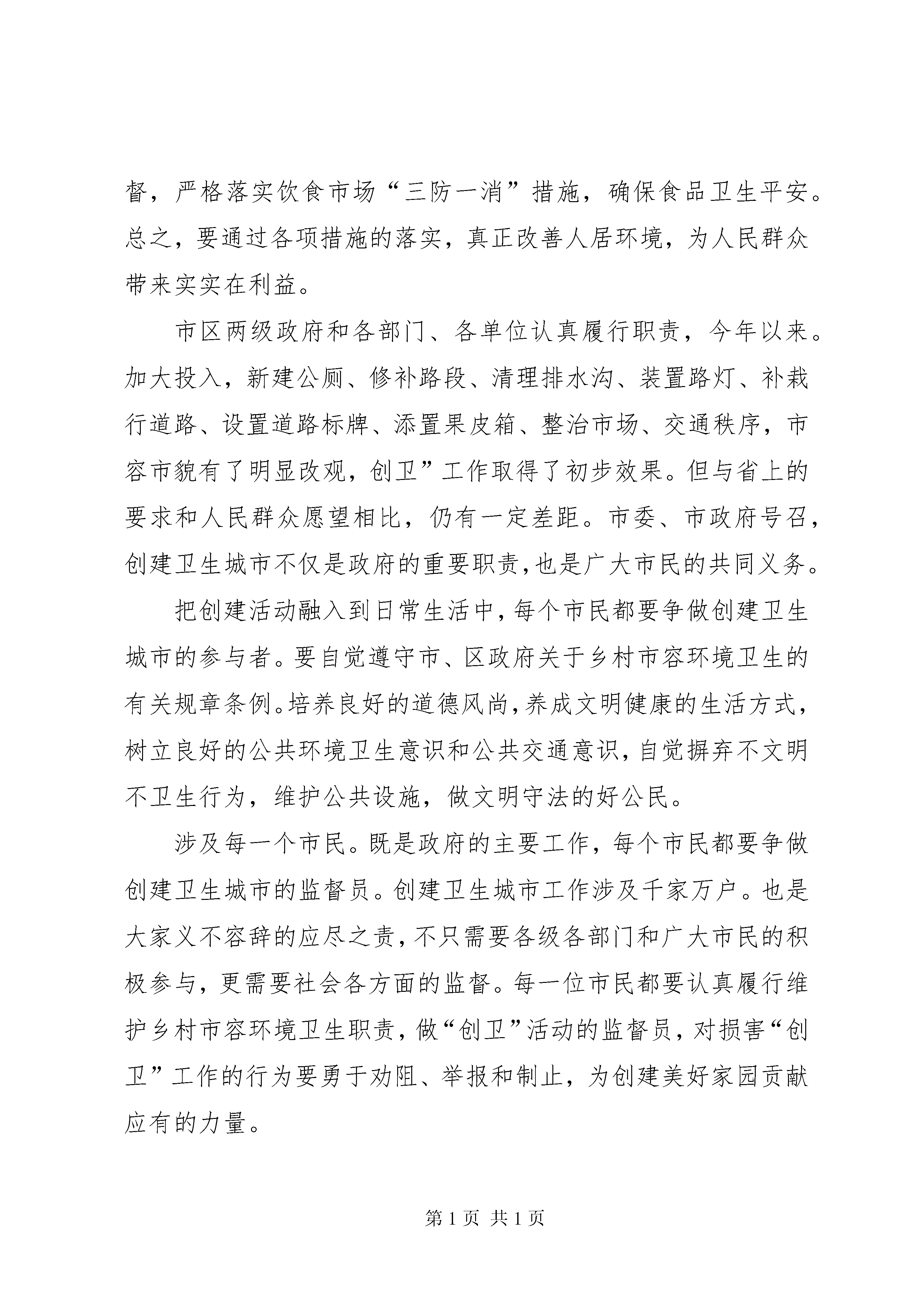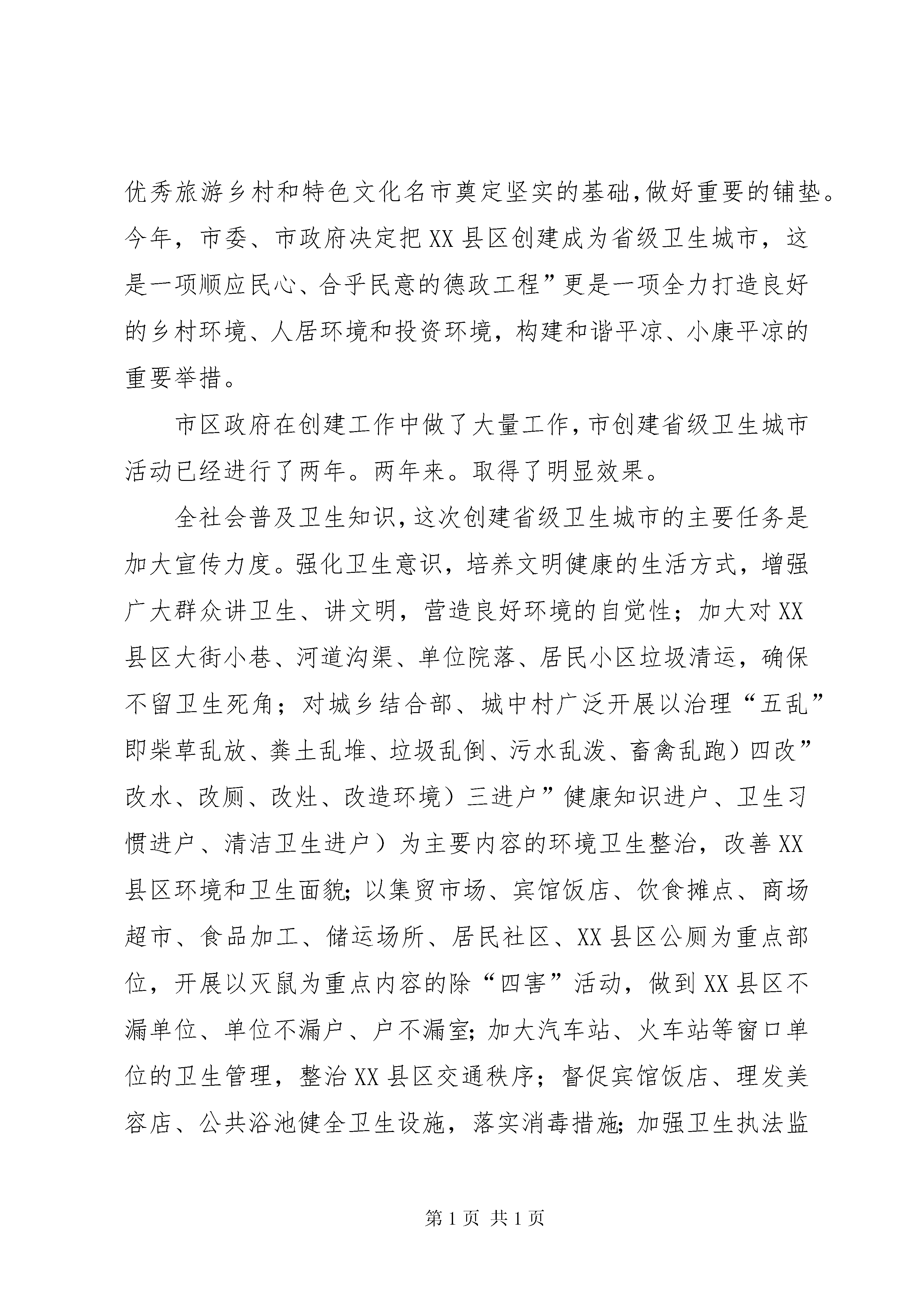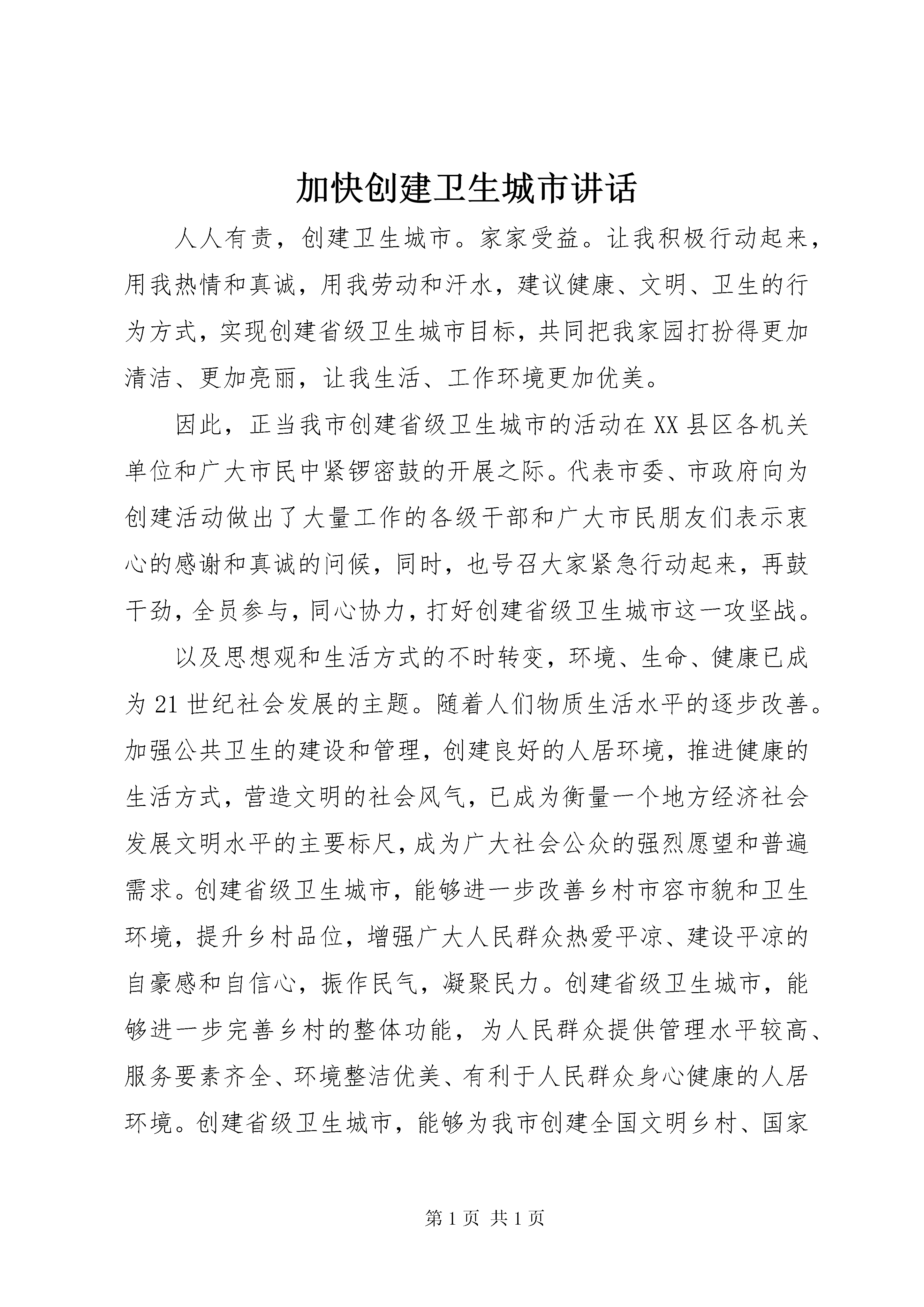加快创建卫生城市讲话人人有责,创建卫生城市。家家受益。让我积极行动起来,用我热情和真诚,用我劳动和汗水,建议健康、文明、卫生的行为方式,实现创建省级卫生城市目标,共同把我家园打扮得更加清洁、更加亮丽,让我生活、工作环境更加优美。因此,正当我市创建省级卫生城市的活动在XX县区各机关单位和广大市民中紧锣密鼓的开展之际。代表市委、市政府向为创建活动做出了大量工作的各级干部和广大市民朋友们表示衷心的感谢和真诚的问候,同时,也号召大家紧急行动起来,再鼓干劲,全员参与,同心协力,打好创建省级卫生城市这一攻坚战。以及思想观和生活方式的不时转变,环境、生命、健康已成为21世纪社会发展的主题。随着人们物质生活水平的逐步改善。加强公共卫生的建设和管理,创建良好的人居环境,推进健康的生活方式,营造文明的社会风气,已成为衡量一个地方经济社会发展文明水平的主要标尺,成为广大社会公众的强烈愿望和普遍需求。创建省级卫生城市,能够进一步改善乡村市容市貌和卫生环境,提升乡村品位,增强广大人民群众热爱平凉、建设平凉的自豪感和自信心,振作民气,凝聚民力。创建省级卫生城市,能够进一步完善乡村的整体功能,为人民群众提供管理水平较高、服务要素齐全、环境整洁优美、有利于人民群众身心健康的人居环境。创建省级卫生城市,能够为我市创建全国文明乡村、国家优秀旅游乡村和特色文化名市奠定坚实的基础,做好重要的铺垫。今年,市委、市政府决定把XX县区创建成为省级卫生城市,这是一项顺应民心、合乎民意的德政工程”更是一项全力打造良好的乡村环境、人居环境和投资环境,构建和谐平凉、小康平凉的重要举措。市区政府在创建工作中做了大量工作,市创建省级卫生城市活动已经进行了两年。两年来。取得了明显效果。全社会普及卫生知识,这次创建省级卫生城市的主要任务是加大宣传力度。强化卫生意识,培养文明健康的生活方式,增强广大群众讲卫生、讲文明,营造良好环境的自觉性;加大对XX县区大街小巷、河道沟渠、单位院落、居民小区垃圾清运,确保不留卫生死角;对城乡结合部、城中村广泛开展以治理“五乱”即柴草乱放、粪土乱堆、垃圾乱倒、污水乱泼、畜禽乱跑)四改”改水、改厕、改灶、改造环境)三进户”健康知识进户、卫生习惯进户、清洁卫生进户)为主要内容的环境卫生整治,改善XX县区环境和卫生面貌;以集贸市场、宾馆饭店、饮食摊点、商场超市、食品加工、储运场所、居民社区、XX县区公厕为重点部位,开展以灭鼠为重点内容的除“四害”活动,做到XX县区不漏单位、单位不漏户、户不漏室;加大汽车站、火车站等窗口单位的卫生管理,整治XX县区交通秩序;督促宾馆饭店、理发美容店、公共浴池健全卫生设施,落实消毒措施;加强卫生执法监督,严格落实饮食市场“三防一消”措施,确保食品卫生平安。总之,要通过各项措施的落实,真正改善人居环境,为人民群众带来实实在利益。市区两级政府和各部门、各单位认真履行职责,今年以来。加大投入,新建公厕、修补路段、清理排水沟、装置路灯、补栽行道路、设置道路标牌、添置果皮箱、整治市场、交通秩序,市容市貌有了明显改观,创卫”工作取得了初步效果。但与省上的要求和人民群众愿望相比,仍有一定差距。市委、市政府号召,创建卫生城市不仅是政府的重要职责,也是广大市民的共同义务。把创建活动融入到日常生活中,每个市民都要争做创建卫生城市的参与者。要自觉遵守市、区政府关于乡村市容环境卫生的有关规章条例。培养良好的道德风尚,养成文明健康的生活方式,树立良好的公共环境卫生意识和公共交通意识,自觉摒弃不文明不卫生行为,维护公共设施,做文明守法的好公民。涉及每一个市民。既是政府的主要工作,每个市民都要争做创建卫生城市的监督员。创建卫生城市工作涉及千家万户。也是大家义不容辞的应尽之责,不只需要各级各部门和广大市民的积极参与,更需要社会各方面的监督。每一位市民都要认真履行维护乡村市容环境卫生职责,做“创卫”活动的监督员,对损害“创卫”工作的行为要勇于劝阻、举报和制止,为创建美好家园贡献应有的力量。让文明卫生知识家喻户晓、老少皆知。要身体力行,每个市民都要争做文明行为的传达者。要积极宣传“创卫”工作的有关规定。从我做起,从身边小事做起,不乱扔果皮纸屑,不随地吐痰,以自己的模范行为带动身边的人,形成人人参与“创卫”个个为“创卫”出力的良好格局。