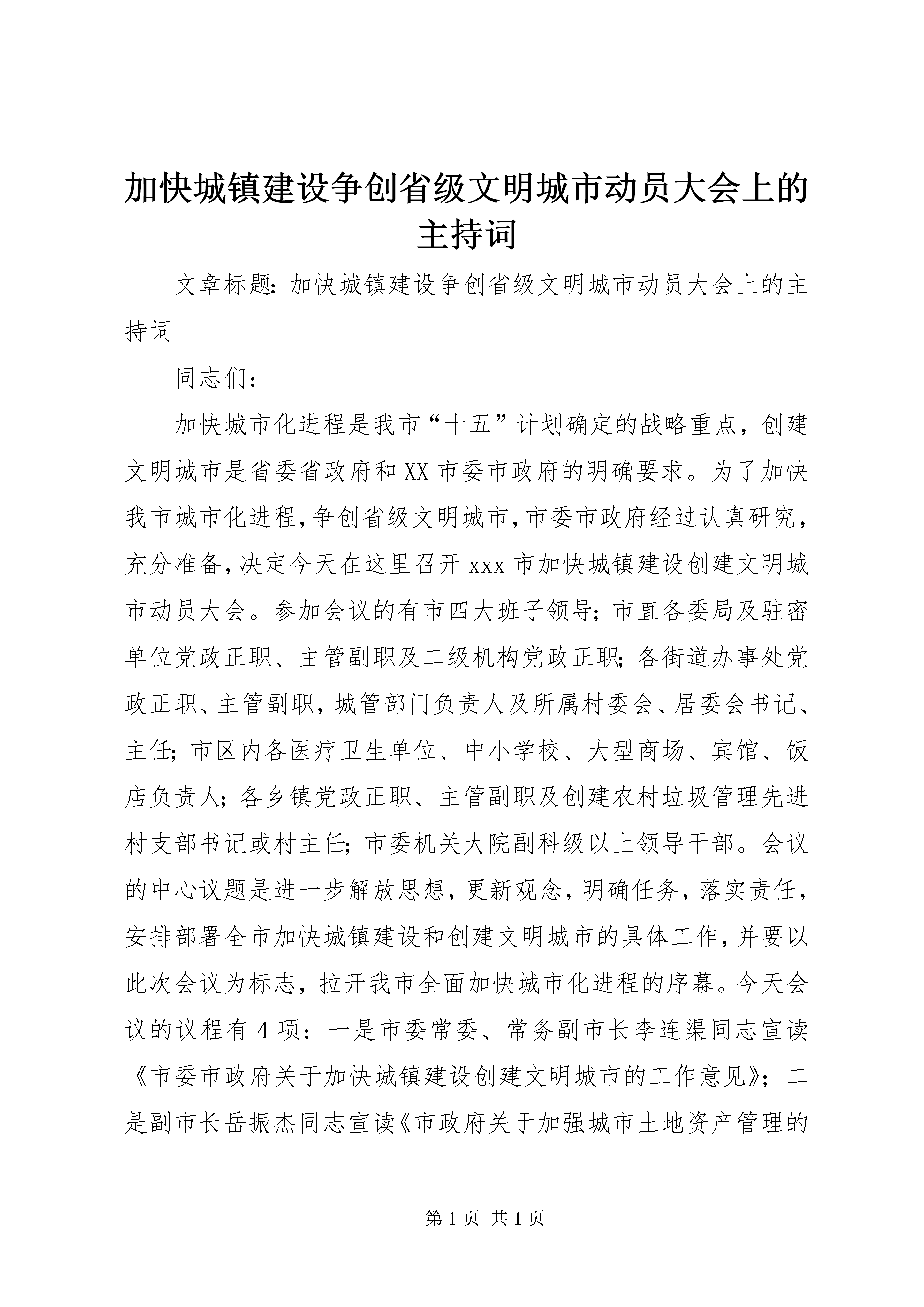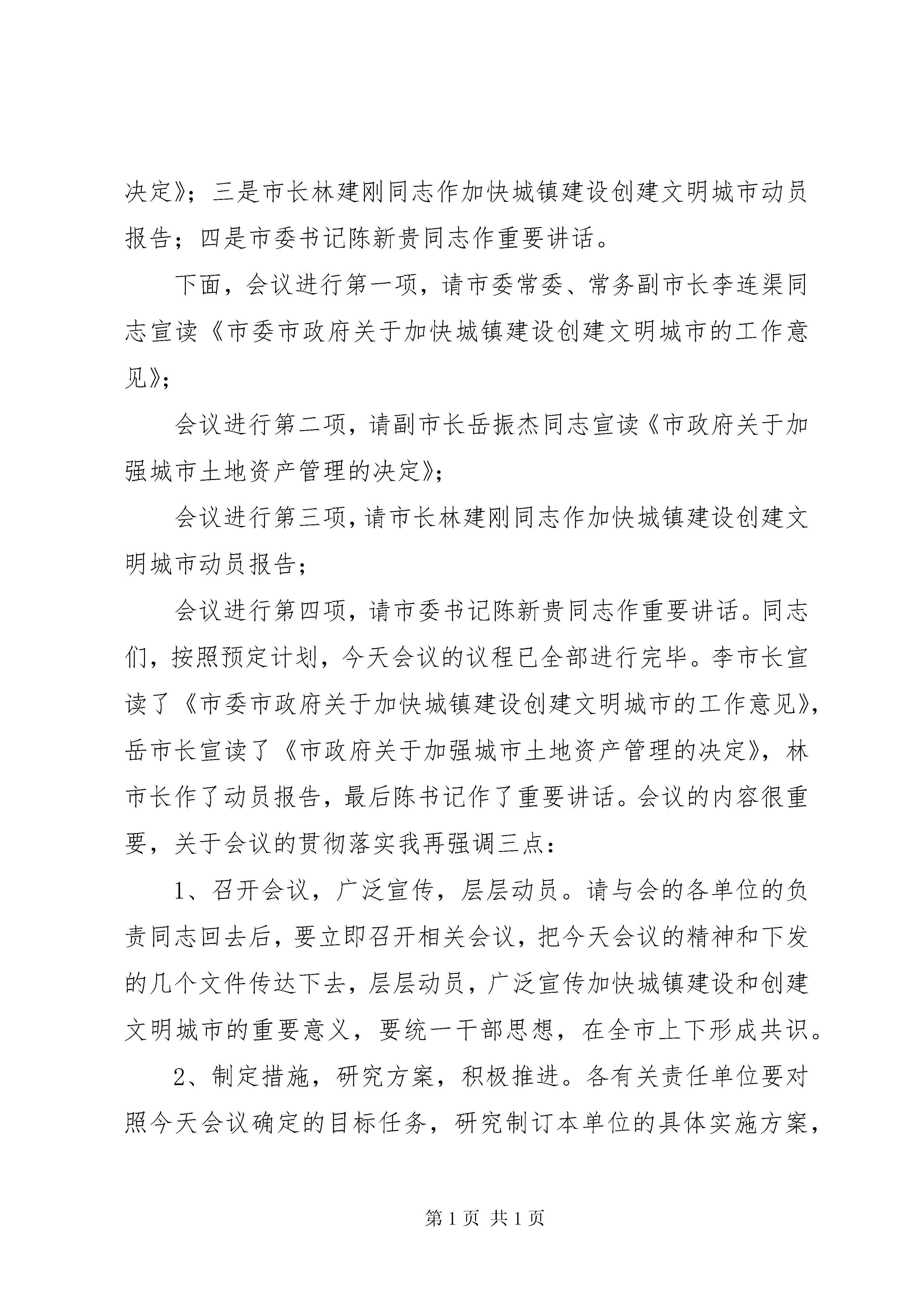 加快城镇建设争创省级文明城市动员大会上的主持词文章标题:加快城镇建设争创省级文明城市动员大会上的主持词同志们:加快城市化进程是我市“十五”计划确定的战略重点,创建文明城市是省委省政府和XX市委市政府的明确要求。为了加快我市城市化进程,争创省级文明城市,市委市政府经过认真研究,充分准备,决定今天在这里召开xxx市加快城镇建设创建文明城市动员大会。参加会议的有市四大班子领导;市直各委局及驻密单位党政正职、主管副职及二级机构党政正职;各街道办事处党政正职、主管副职,城管部门负责人及所属村委会、居委会书记、主任;市区内各医疗卫生单位、中小学校、大型商场、宾馆、饭店负责人;各乡镇党政正职、主管副职及创建农村垃圾管理先进村支部书记或村主任;市委机关大院副科级以上领导干部。会议的中心议题是进一步解放思想,更新观念,明确任务,落实责任,安排部署全市加快城镇建设和创建文明城市的具体工作,并要以此次会议为标志,拉开我市全面加快城市化进程的序幕。今天会议的议程有4项:一是市委常委、常务副市长李连渠同志宣读《市委市政府关于加快城镇建设创建文明城市的工作意见》;二是副市长岳振杰同志宣读《市政府关于加强城市土地资产管理的决定》;三是市长林建刚同志作加快城镇建设创建文明城市动员报告;四是市委书记陈新贵同志作重要讲话。下面,会议进行第一项,请市委常委、常务副市长李连渠同志宣读《市委市政府关于加快城镇建设创建文明城市的工作意见》;会议进行第二项,请副市长岳振杰同志宣读《市政府关于加强城市土地资产管理的决定》;会议进行第三项,请市长林建刚同志作加快城镇建设创建文明城市动员报告;会议进行第四项,请市委书记陈新贵同志作重要讲话。同志们,按照预定计划,今天会议的议程已全部进行完毕。李市长宣读了《市委市政府关于加快城镇建设创建文明城市的工作意见》,岳市长宣读了《市政府关于加强城市土地资产管理的决定》,林市长作了动员报告,最后陈书记作了重要讲话。会议的内容很重要,关于会议的贯彻落实我再强调三点:1、召开会议,广泛宣传,层层动员。请与会的各单位的负责同志回去后,要立即召开相关会议,把今天会议的精神和下发的几个文件传达下去,层层动员,广泛宣传加快城镇建设和创建文明城市的重要意义,要统一干部思想,在全市上下形成共识。2、制定措施,研究方案,积极推进。各有关责任单位要对照今天会议确定的目标任务,研究制订本单位的具体实施方案,并认真组织实施,确保今天会议确定的各项目标任务落到实处。3、4月10日前各单位要将会议的贯彻落实情况和如何实施的具体意见以书面形式报送市委督查室和市政府督查室。会议到此结束,散会。《加快城镇建设争创省级文明城市动员大会上的主持词》来源于文秘114网,欢迎阅读加快城镇建设争创省级文明城市动员大会上的主持词。
