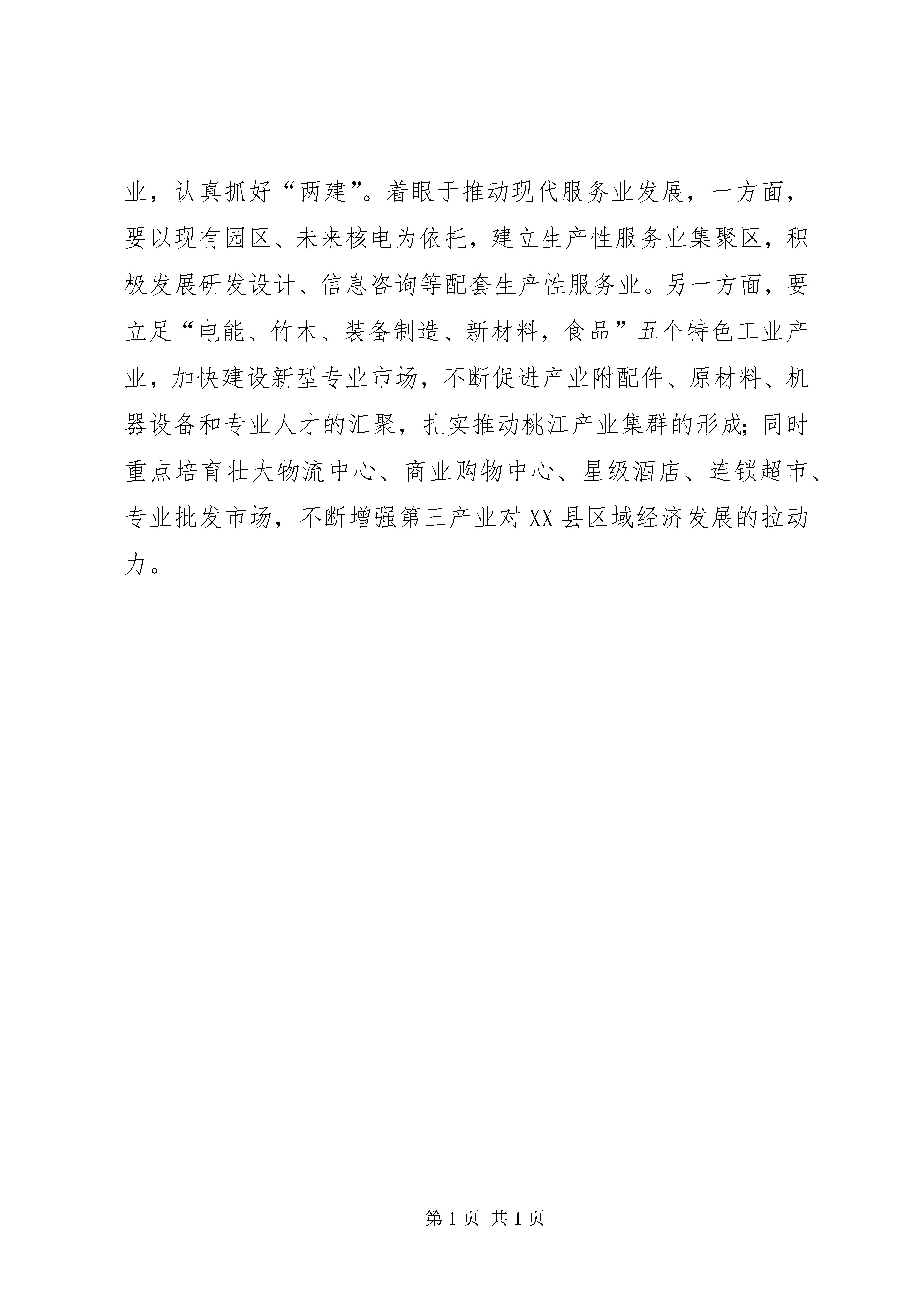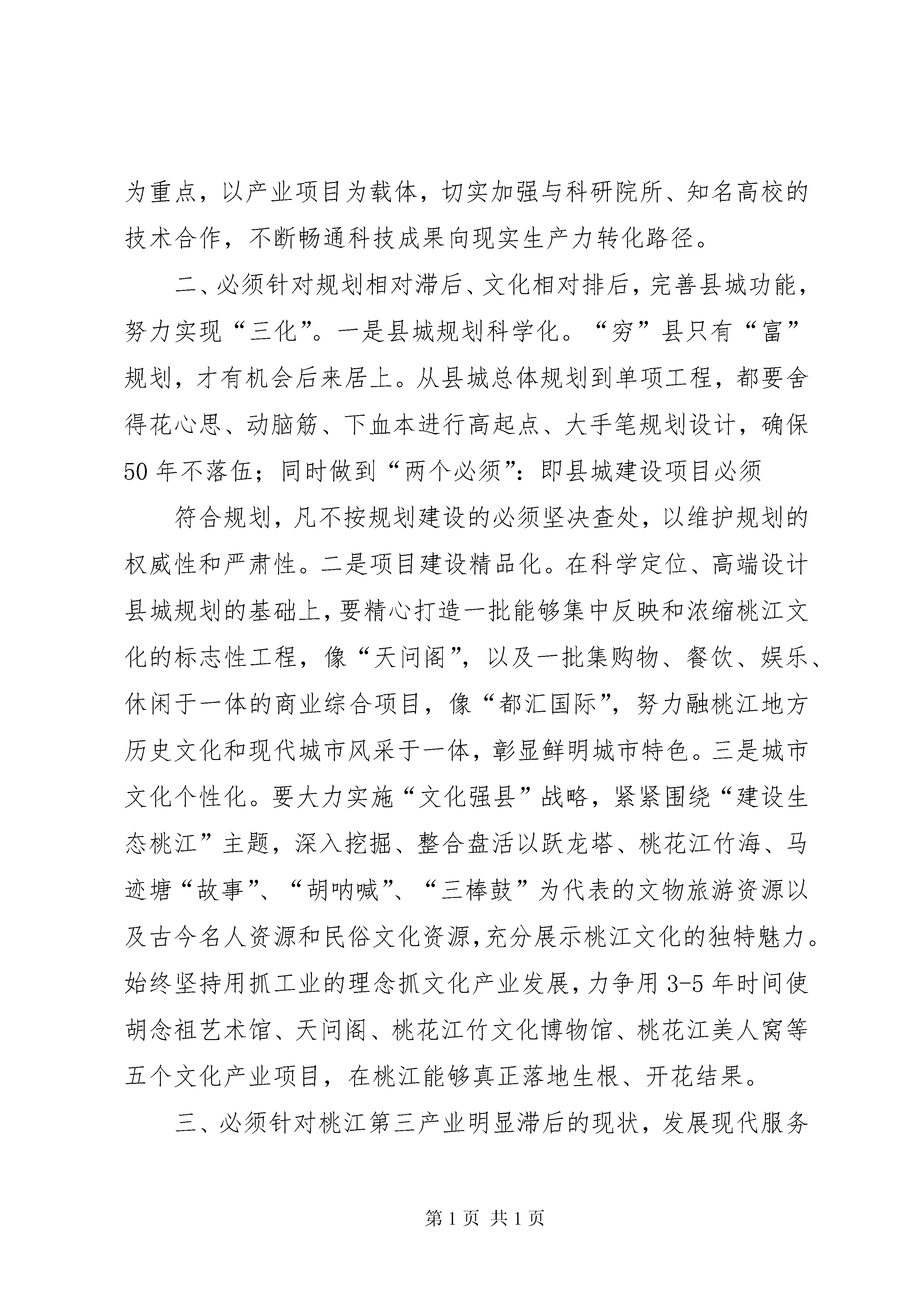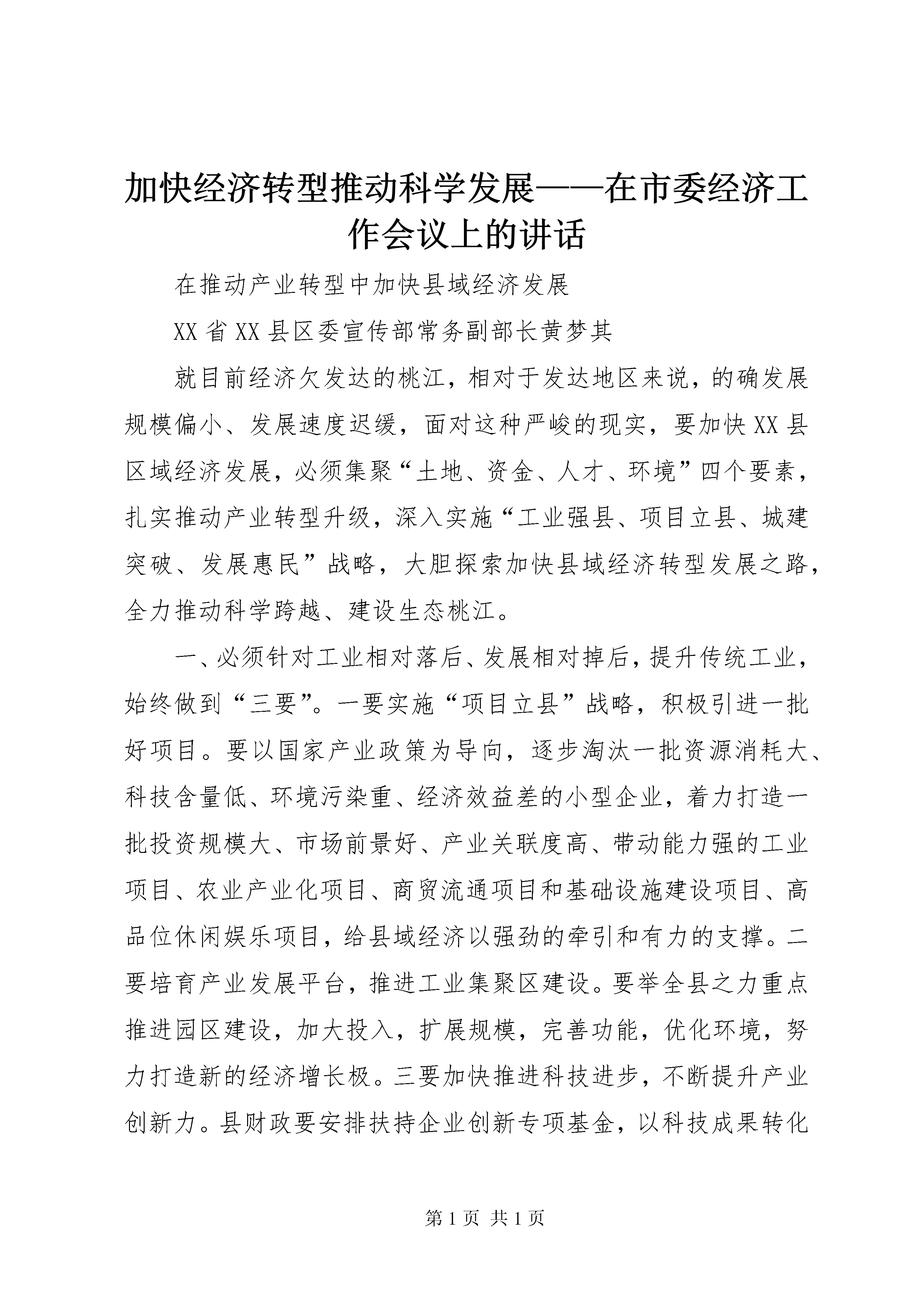 加快经济转型推动科学发展——在市委经济工作会议上的讲话在推动产业转型中加快县域经济发展XX省XX县区委宣传部常务副部长黄梦其就目前经济欠发达的桃江,相对于发达地区来说,的确发展规模偏小、发展速度迟缓,面对这种严峻的现实,要加快XX县区域经济发展,必须集聚“土地、资金、人才、环境”四个要素,扎实推动产业转型升级,深入实施“工业强县、项目立县、城建突破、发展惠民”战略,大胆探索加快县域经济转型发展之路,全力推动科学跨越、建设生态桃江。一、必须针对工业相对落后、发展相对掉后,提升传统工业,始终做到“三要”。一要实施“项目立县”战略,积极引进一批好项目。要以国家产业政策为导向,逐步淘汰一批资源消耗大、科技含量低、环境污染重、经济效益差的小型企业,着力打造一批投资规模大、市场前景好、产业关联度高、带动能力强的工业项目、农业产业化项目、商贸流通项目和基础设施建设项目、高品位休闲娱乐项目,给县域经济以强劲的牵引和有力的支撑。二要培育产业发展平台,推进工业集聚区建设。要举全县之力重点推进园区建设,加大投入,扩展规模,完善功能,优化环境,努力打造新的经济增长极。三要加快推进科技进步,不断提升产业创新力。县财政要安排扶持企业创新专项基金,以科技成果转化为重点,以产业项目为载体,切实加强与科研院所、知名高校的技术合作,不断畅通科技成果向现实生产力转化路径。二、必须针对规划相对滞后、文化相对排后,完善县城功能,努力实现“三化”。一是县城规划科学化。“穷”县只有“富”规划,才有机会后来居上。从县城总体规划到单项工程,都要舍得花心思、动脑筋、下血本进行高起点、大手笔规划设计,确保50年不落伍;同时做到“两个必须”:即县城建设项目必须符合规划,凡不按规划建设的必须坚决查处,以维护规划的权威性和严肃性。二是项目建设精品化。在科学定位、高端设计县城规划的基础上,要精心打造一批能够集中反映和浓缩桃江文化的标志性工程,像“天问阁”,以及一批集购物、餐饮、娱乐、休闲于一体的商业综合项目,像“都汇国际”,努力融桃江地方历史文化和现代城市风采于一体,彰显鲜明城市特色。三是城市文化个性化。要大力实施“文化强县”战略,紧紧围绕“建设生态桃江”主题,深入挖掘、整合盘活以跃龙塔、桃花江竹海、马迹塘“故事”、“胡呐喊”、“三棒鼓”为代表的文物旅游资源以及古今名人资源和民俗文化资源,充分展示桃江文化的独特魅力。始终坚持用抓工业的理念抓文化产业发展,力争用3-5年时间使胡念祖艺术馆、天问阁、桃花江竹文化博物馆、桃花江美人窝等五个文化产业项目,在桃江能够真正落地生根、开花结果。三、必须针对桃江第三产业明显滞后的现状,发展现代服务业,认真抓好“两建”。着眼于推动现代服务业发展,一方面,要以现有园区、未来核电为依托,建立生产性服务业集聚区,积极发展研发设计、信息咨询等配套生产性服务业。另一方面,要立足“电能、竹木、装备制造、新材料,食品”五个特色工业产业,加快建设新型专业市场,不断促进产业附配件、原材料、机器设备和专业人才的汇聚,扎实推动桃江产业集群的形成;同时重点培育壮大物流中心、商业购物中心、星级酒店、连锁超市、专业批发市场,不断增强第三产业对XX县区域经济发展的拉动力。