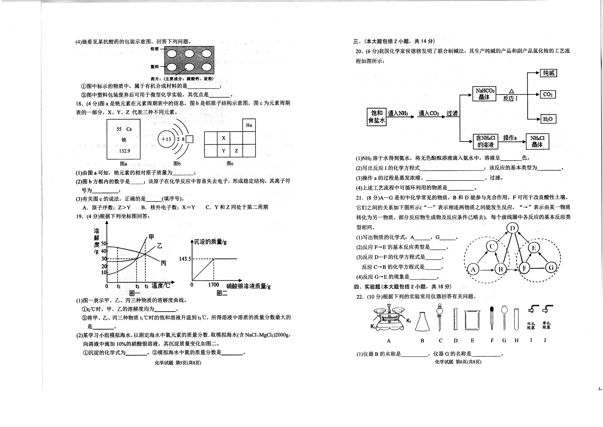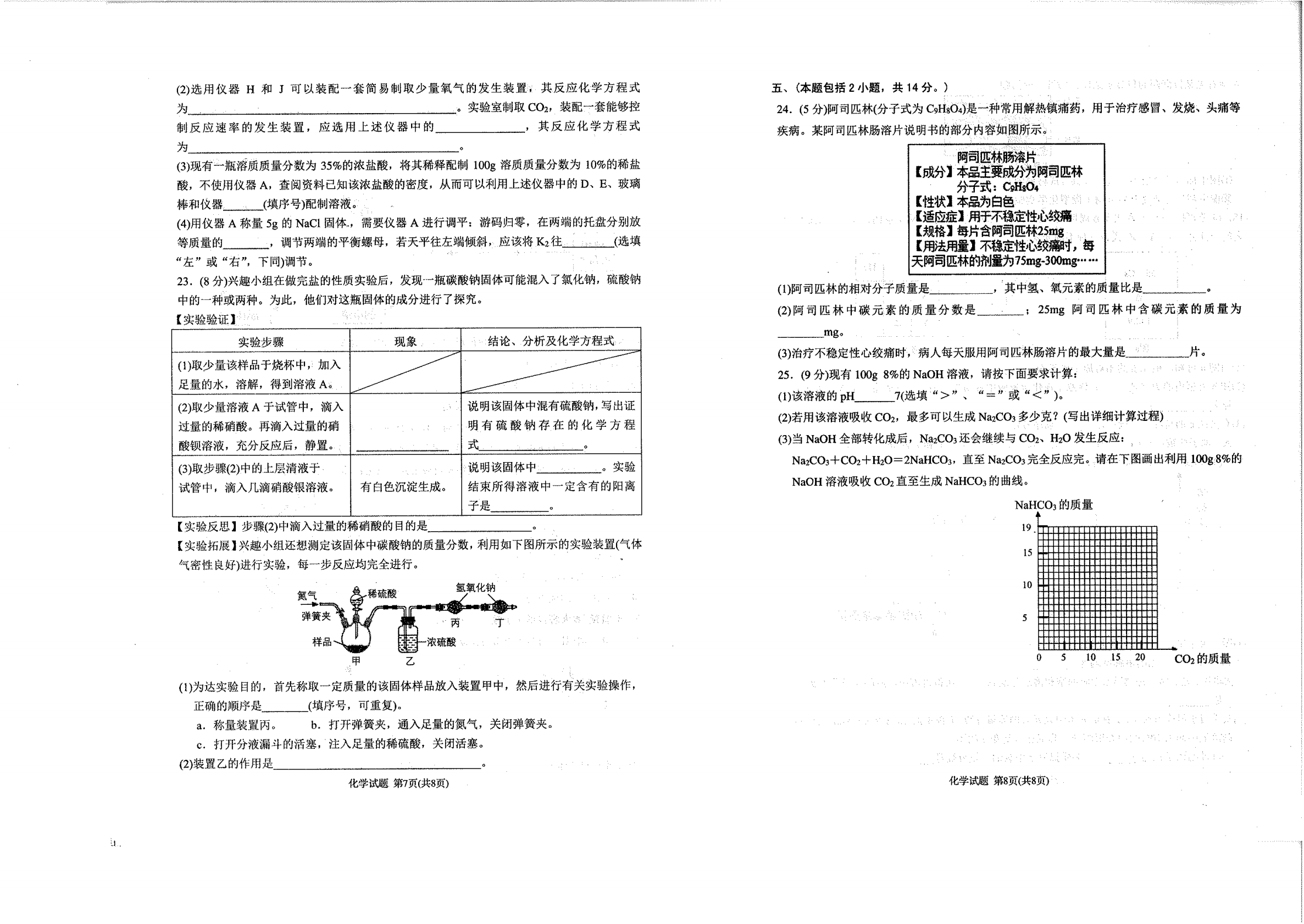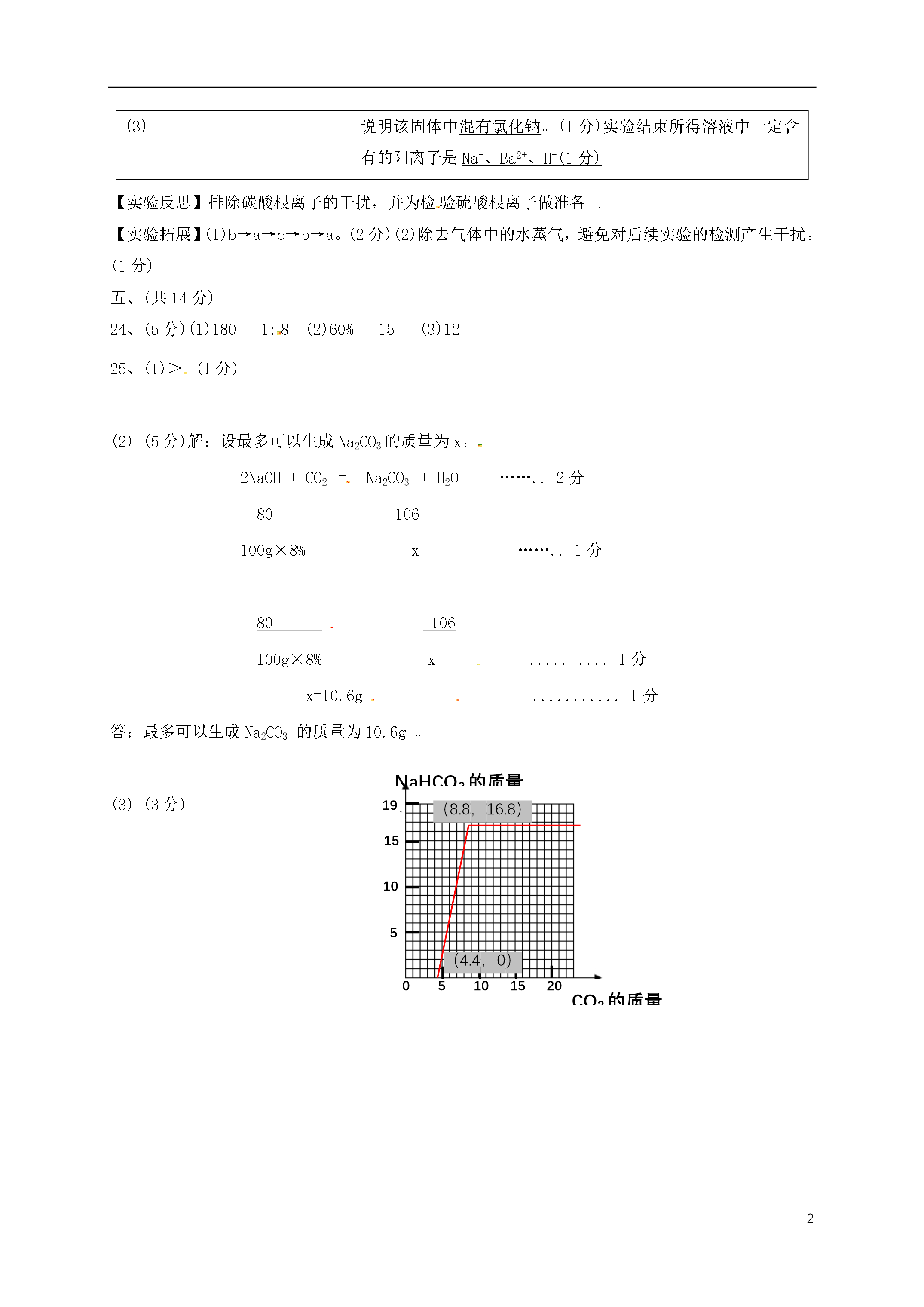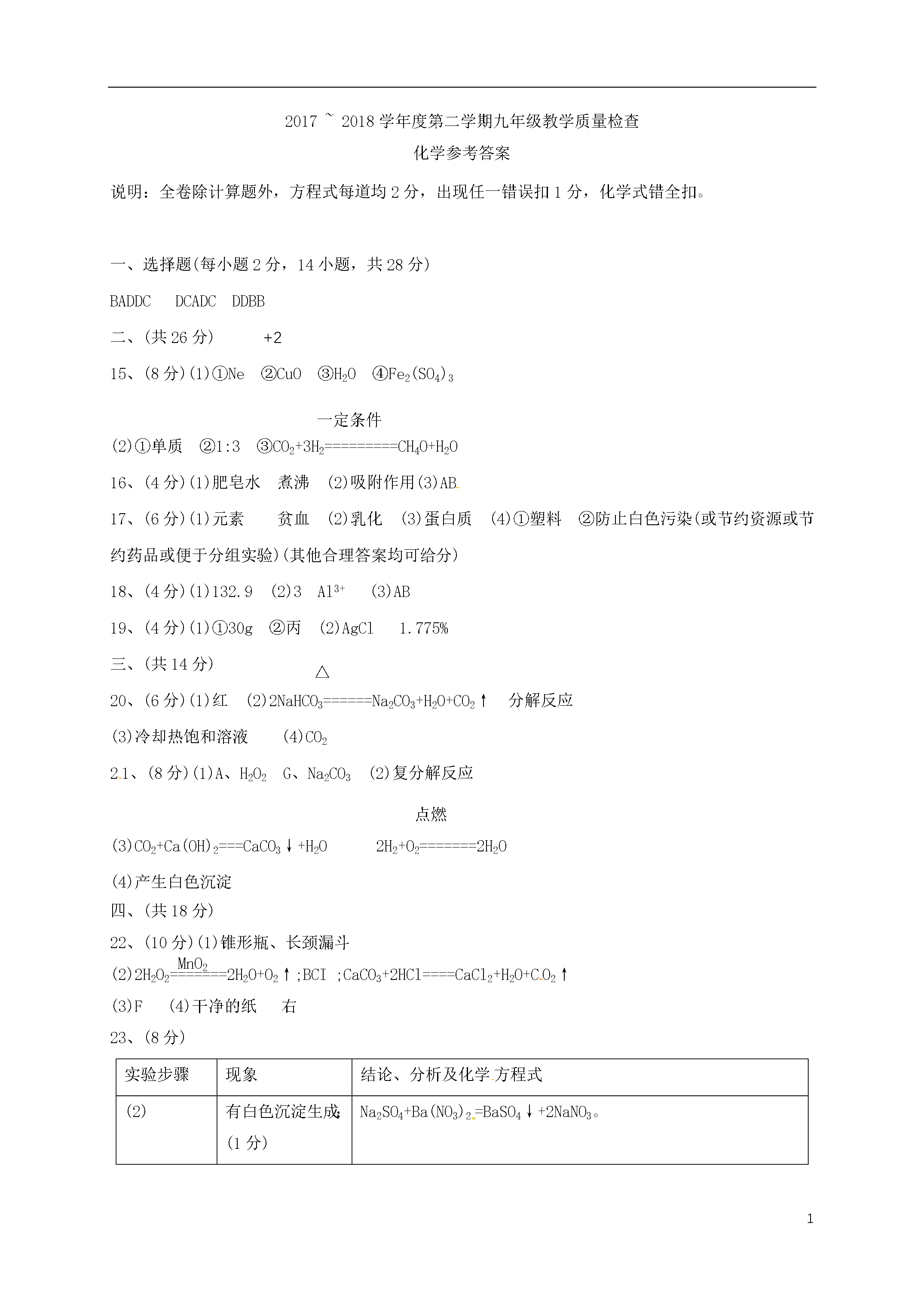22017~2018学年度第二学期九年级教学质量检查化学参考答案说明:全卷除计算题外,方程式每道均2分,出现任一错误扣1分,化学式错全扣。一、选择题(每小题2分,14小题,共28分)BADDCDCADCDDBB+2二、(共26分)15、(8分)(1)①Ne②CuO③H2O④Fe2(SO4)3一定条件(2)①单质②1:3③CO2+3H2=========CH4O+H2O16、(4分)(1)肥皂水煮沸(2)吸附作用(3)AB17、(6分)(1)元素贫血(2)乳化(3)蛋白质(4)①塑料②防止白色污染(或节约资源或节约药品或便于分组实验)(其他合理答案均可给分)18、(4分)(1)132.9(2)3Al3+(3)AB19、(4分)(1)①30g②丙(2)AgCl1.775%△三、(共14分)20、(6分)(1)红(2)2NaHCO3======Na2CO3+H2O+CO2↑分解反应(3)冷却热饱和溶液(4)CO221、(8分)(1)A、H2O2G、Na2CO3(2)复分解反应点燃(3)CO2+Ca(OH)2===CaCO3↓+H2O2H2+O2=======2H2O(4)产生白色沉淀四、(共18分)MnO222、(10分)(1)锥形瓶、长颈漏斗(2)2H2O2=======2H2O+O2↑;BCI;CaCO3+2HCl====CaCl2+H2O+CO2↑(3)F(4)干净的纸右23、(8分)实验步骤现象结论、分析及化学方程式(2)有白色沉淀生成;(1分)Na2SO4+Ba(NO3)2=BaSO4↓+2NaNO3。(3)说明该固体中混有氯化钠。(1分)实验结束所得溶液中一定含有的阳离子是Na+、Ba2+、H+(1分)【实验反思】排除碳酸根离子的干扰,并为检验硫酸根离子做准备。【实验拓展】(1)b→a→c→b→a。(2分)(2)除去气体中的水蒸气,避免对后续实验的检测产生干扰。(1分)五、(共14分)24、(5分)(1)1801:8(2)60%15(3)1225、(1)>(1分)(2)(5分)解:设最多可以生成Na2CO3的质量为x。2NaOH+CO2=Na2CO3+H2O……..2分80106100g×8%x……..1分80=106100g×8%x...........1分x=10.6g...........1分答:最多可以生成Na2CO3的质量为10.6g。191510505101520(8.8,16.8)(4.4,0)CO2的质量NaHCO3的质量(3)(3分)