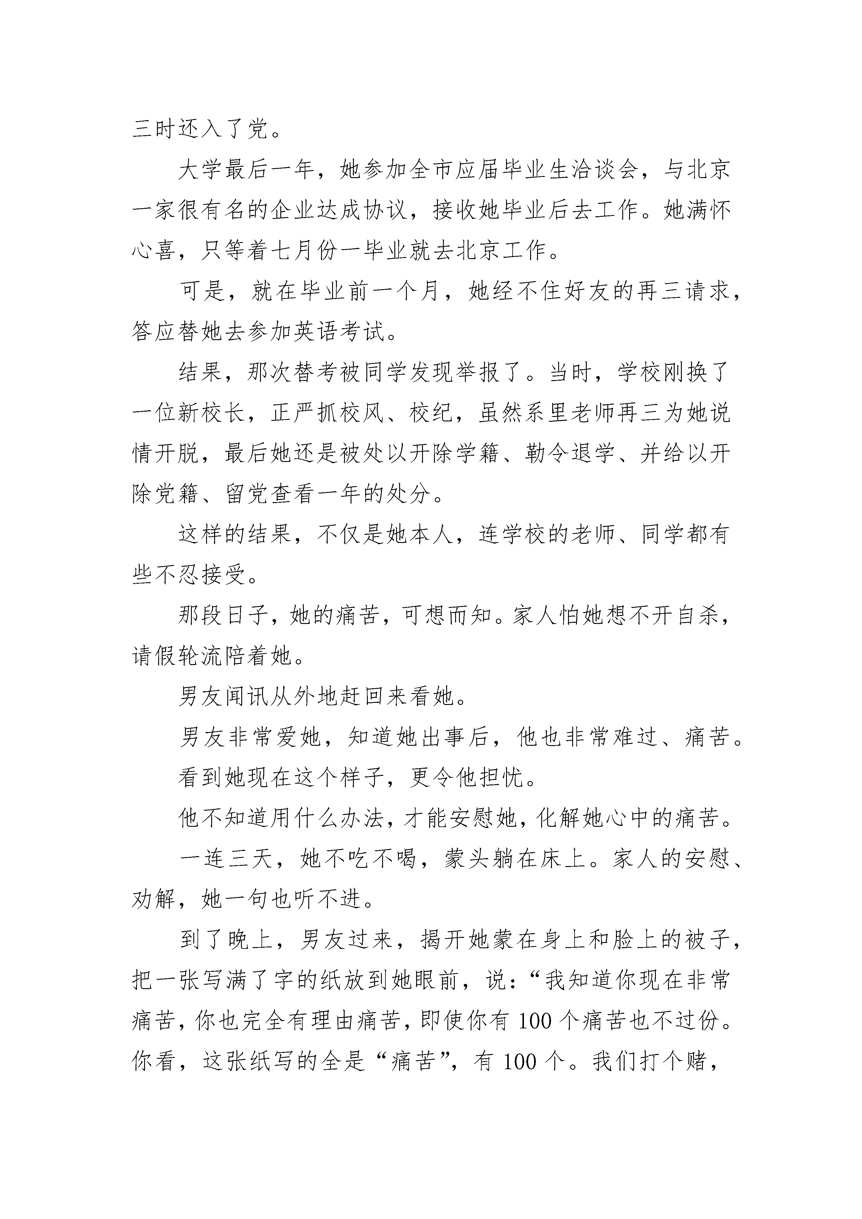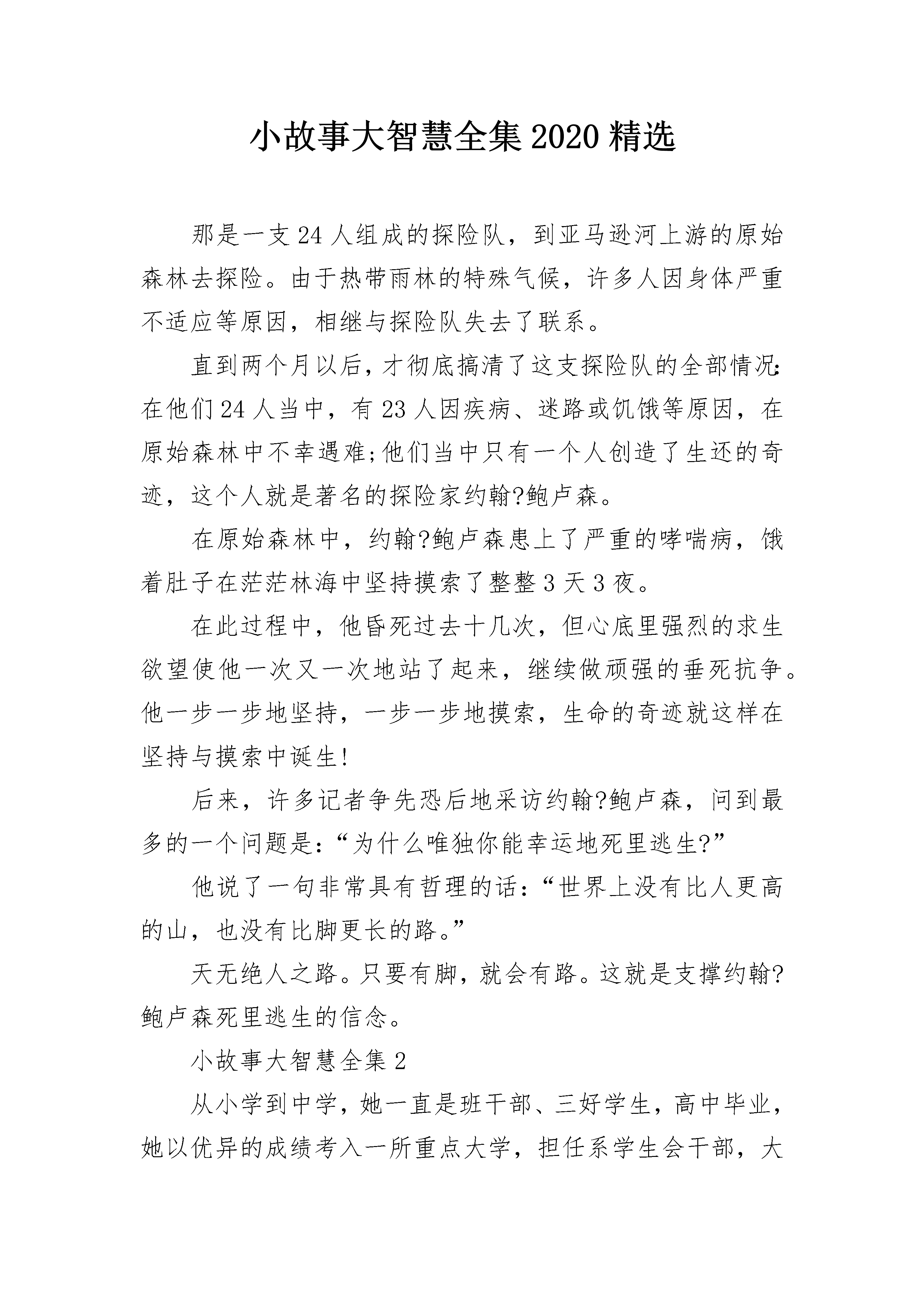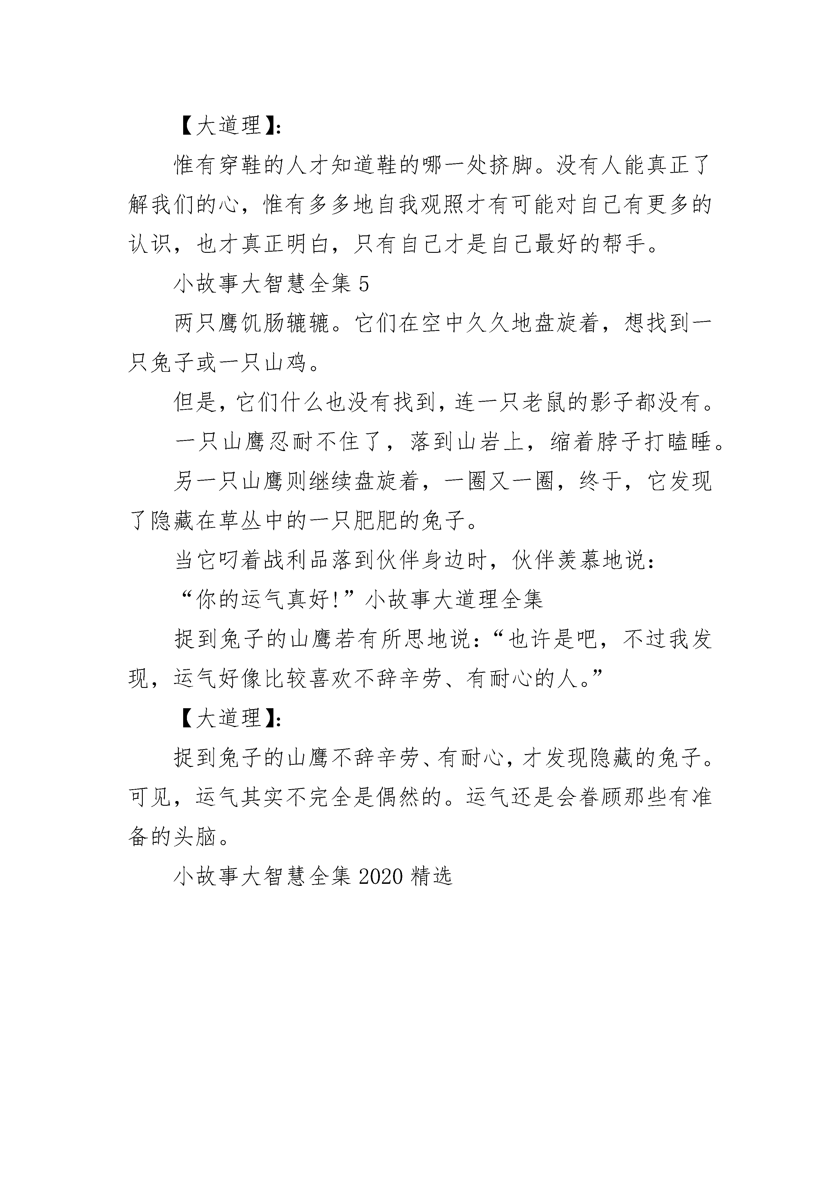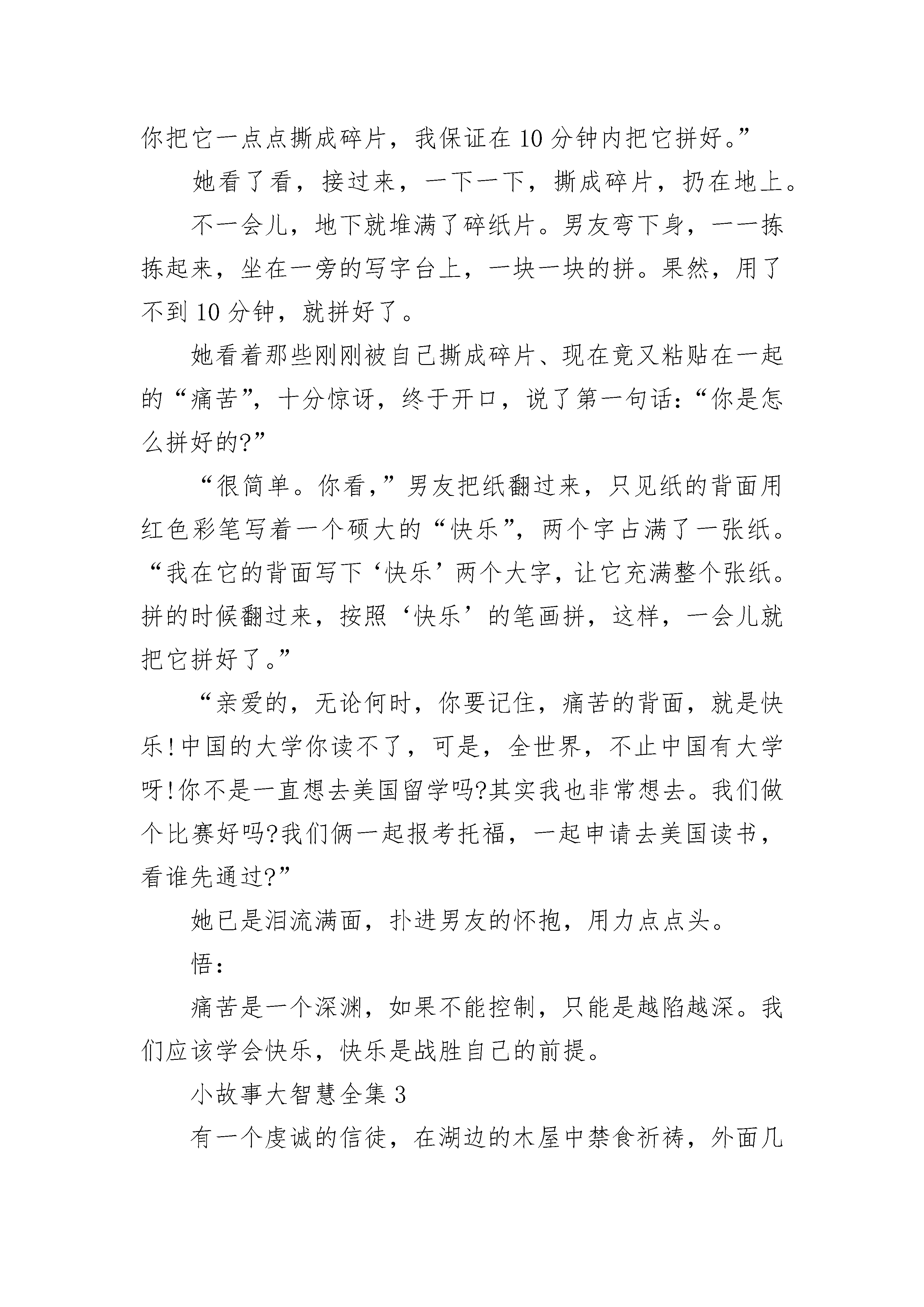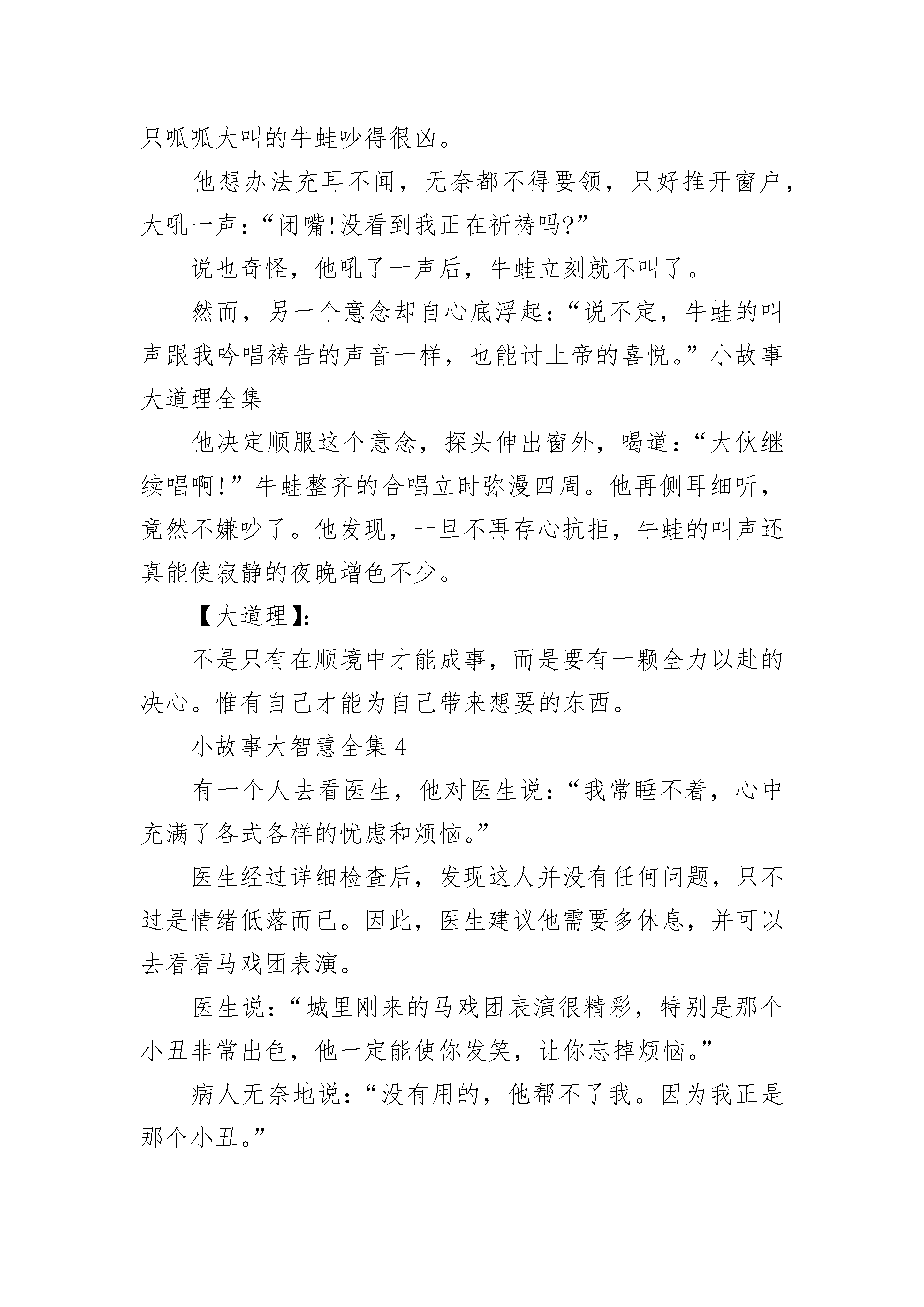 小故事大智慧全集2020精选那是一支24人组成的探险队,到亚马逊河上游的原始森林去探险。由于热带雨林的特殊气候,许多人因身体严重不适应等原因,相继与探险队失去了联系。直到两个月以后,才彻底搞清了这支探险队的全部情况:在他们24人当中,有23人因疾病、迷路或饥饿等原因,在原始森林中不幸遇难;他们当中只有一个人创造了生还的奇迹,这个人就是著名的探险家约翰?鲍卢森。在原始森林中,约翰?鲍卢森患上了严重的哮喘病,饿着肚子在茫茫林海中坚持摸索了整整3天3夜。在此过程中,他昏死过去十几次,但心底里强烈的求生欲望使他一次又一次地站了起来,继续做顽强的垂死抗争。他一步一步地坚持,一步一步地摸索,生命的奇迹就这样在坚持与摸索中诞生!后来,许多记者争先恐后地采访约翰?鲍卢森,问到最多的一个问题是:“为什么唯独你能幸运地死里逃生?”他说了一句非常具有哲理的话:“世界上没有比人更高的山,也没有比脚更长的路。”天无绝人之路。只要有脚,就会有路。这就是支撑约翰?鲍卢森死里逃生的信念。小故事大智慧全集2从小学到中学,她一直是班干部、三好学生,高中毕业,她以优异的成绩考入一所重点大学,担任系学生会干部,大三时还入了党。大学最后一年,她参加全市应届毕业生洽谈会,与北京一家很有名的企业达成协议,接收她毕业后去工作。她满怀心喜,只等着七月份一毕业就去北京工作。可是,就在毕业前一个月,她经不住好友的再三请求,答应替她去参加英语考试。结果,那次替考被同学发现举报了。当时,学校刚换了一位新校长,正严抓校风、校纪,虽然系里老师再三为她说情开脱,最后她还是被处以开除学籍、勒令退学、并给以开除党籍、留党查看一年的处分。这样的结果,不仅是她本人,连学校的老师、同学都有些不忍接受。那段日子,她的痛苦,可想而知。家人怕她想不开自杀,请假轮流陪着她。男友闻讯从外地赶回来看她。男友非常爱她,知道她出事后,他也非常难过、痛苦。看到她现在这个样子,更令他担忧。他不知道用什么办法,才能安慰她,化解她心中的痛苦。一连三天,她不吃不喝,蒙头躺在床上。家人的安慰、劝解,她一句也听不进。到了晚上,男友过来,揭开她蒙在身上和脸上的被子,把一张写满了字的纸放到她眼前,说:“我知道你现在非常痛苦,你也完全有理由痛苦,即使你有100个痛苦也不过份。你看,这张纸写的全是“痛苦”,有100个。我们打个赌,你把它一点点撕成碎片,我保证在10分钟内把它拼好。”她看了看,接过来,一下一下,撕成碎片,扔在地上。不一会儿,地下就堆满了碎纸片。男友弯下身,一一拣拣起来,坐在一旁的写字台上,一块一块的拼。果然,用了不到10分钟,就拼好了。她看着那些刚刚被自己撕成碎片、现在竟又粘贴在一起的“痛苦”,十分惊讶,终于开口,说了第一句话:“你是怎么拼好的?”“很简单。你看,”男友把纸翻过来,只见纸的背面用红色彩笔写着一个硕大的“快乐”,两个字占满了一张纸。“我在它的背面写下‘快乐’两个大字,让它充满整个张纸。拼的时候翻过来,按照‘快乐’的笔画拼,这样,一会儿就把它拼好了。”“亲爱的,无论何时,你要记住,痛苦的背面,就是快乐!中国的大学你读不了,可是,全世界,不止中国有大学呀!你不是一直想去美国留学吗?其实我也非常想去。我们做个比赛好吗?我们俩一起报考托福,一起申请去美国读书,看谁先通过?”她已是泪流满面,扑进男友的怀抱,用力点点头。悟:痛苦是一个深渊,如果不能控制,只能是越陷越深。我们应该学会快乐,快乐是战胜自己的前提。小故事大智慧全集3有一个虔诚的信徒,在湖边的木屋中禁食祈祷,外面几只呱呱大叫的牛蛙吵得很凶。他想办法充耳不闻,无奈都不得要领,只好推开窗户,大吼一声:“闭嘴!没看到我正在祈祷吗?”说也奇怪,他吼了一声后,牛蛙立刻就不叫了。然而,另一个意念却自心底浮起:“说不定,牛蛙的叫声跟我吟唱祷告的声音一样,也能讨上帝的喜悦。”小故事大道理全集他决定顺服这个意念,探头伸出窗外,喝道:“大伙继续唱啊!”牛蛙整齐的合唱立时弥漫四周。他再侧耳细听,竟然不嫌吵了。他发现,一旦不再存心抗拒,牛蛙的叫声还真能使寂静的夜晚增色不少。【大道理】:不是只有在顺境中才能成事,而是要有一颗全力以赴的决心。惟有自己才能为自己带来想要的东西。小故事大智慧全集4有一个人去看医生,他对医生说:“我常睡不着,心中充满了各式各样的忧虑和烦恼。”医生经过详细检查后,发现这人并没有任何问题,只不过是情绪低落而已。因此,医生建议他需要多休息,并可以去看看马戏团表演。医生说:“城里刚来的马戏团表演很精彩,特别是那个小丑非常出色,他一定能使你发笑,让你忘掉烦恼。”病人无奈地说:“没有用的,他帮不了我。因为我正是那个小丑。”【大道理】:惟有穿鞋的人才知道鞋的哪一处挤脚。没有人能真正了解我们的心,惟有多多地自我观照才有可能对自己有更多的认识,也才真正明白,只有自己才是自己最