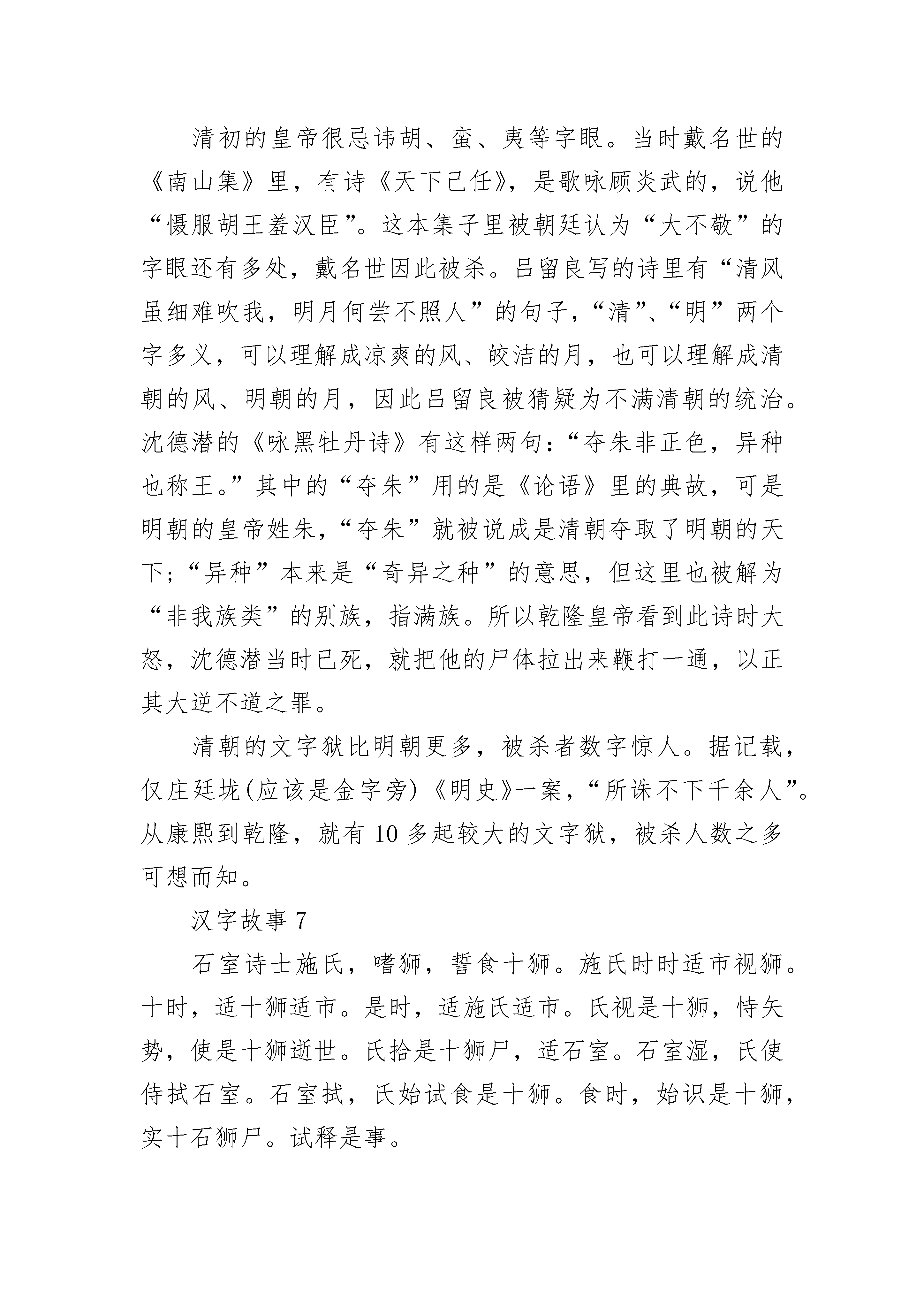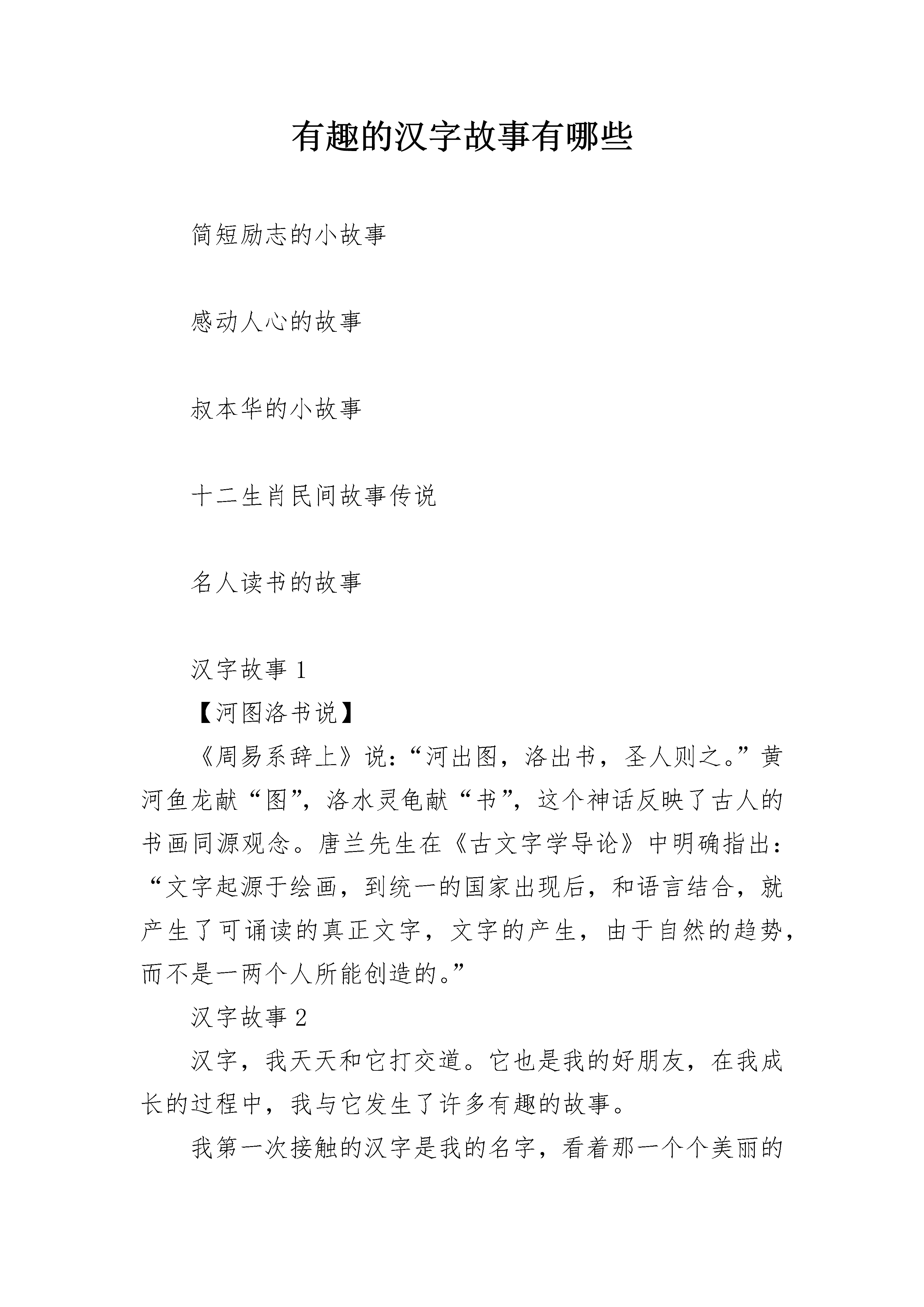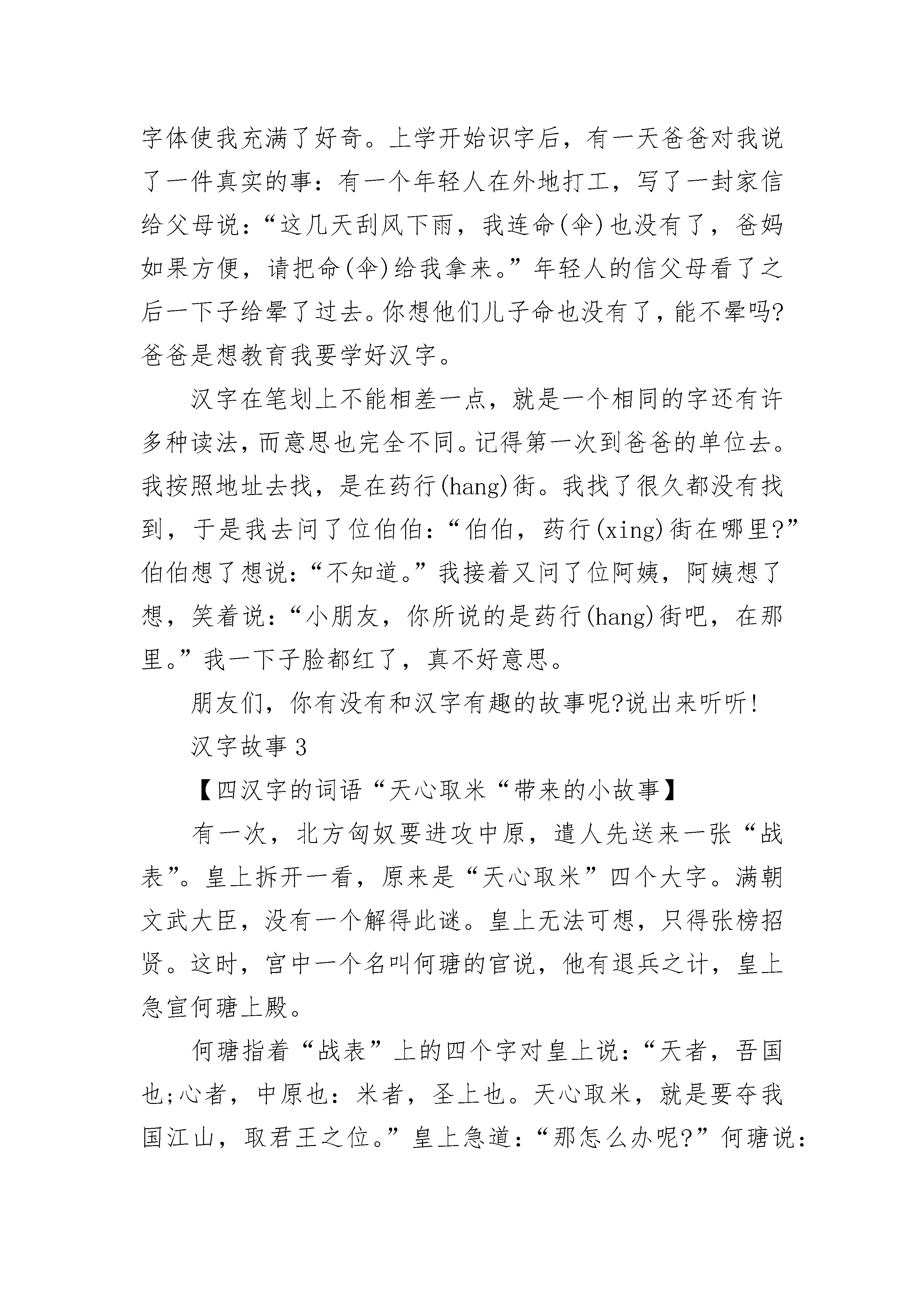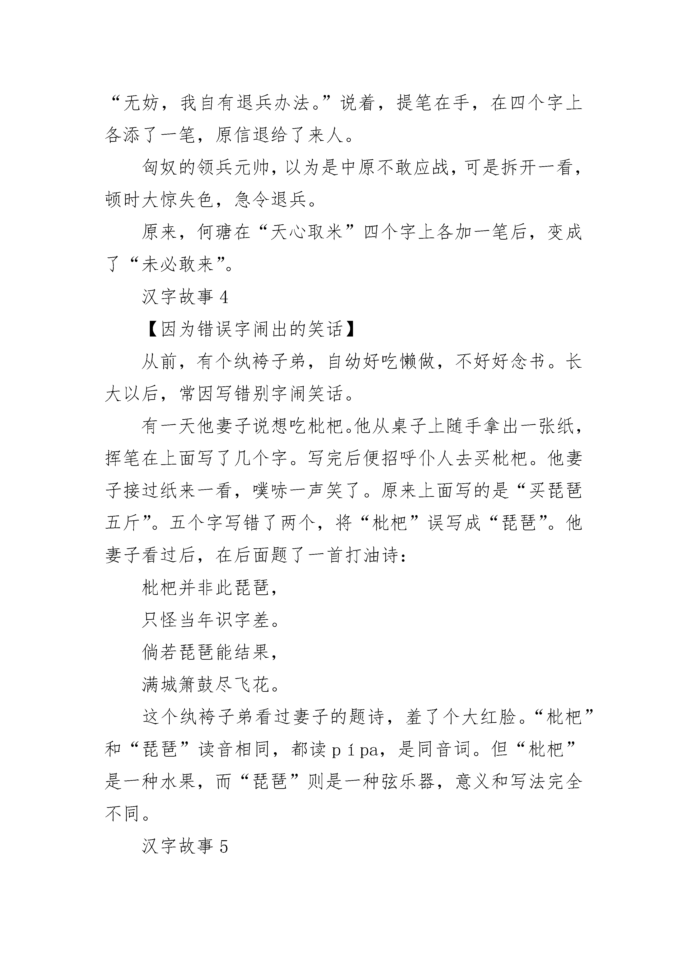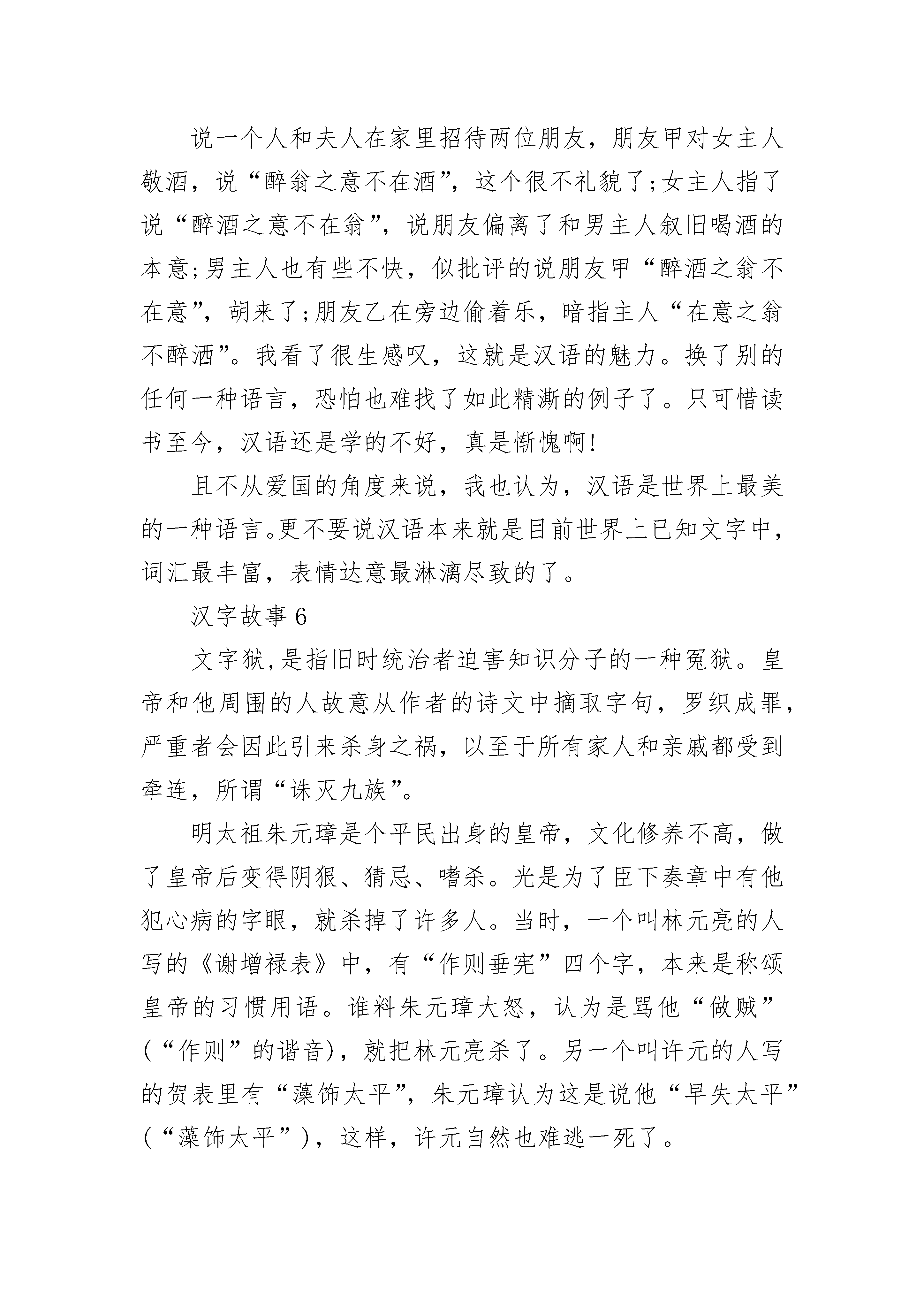 有趣的汉字故事有哪些简短励志的小故事感动人心的故事叔本华的小故事十二生肖民间故事传说名人读书的故事汉字故事1【河图洛书说】《周易系辞上》说:“河出图,洛出书,圣人则之。”黄河鱼龙献“图”,洛水灵龟献“书”,这个神话反映了古人的书画同源观念。唐兰先生在《古文字学导论》中明确指出:“文字起源于绘画,到统一的国家出现后,和语言结合,就产生了可诵读的真正文字,文字的产生,由于自然的趋势,而不是一两个人所能创造的。”汉字故事2汉字,我天天和它打交道。它也是我的好朋友,在我成长的过程中,我与它发生了许多有趣的故事。我第一次接触的汉字是我的名字,看着那一个个美丽的字体使我充满了好奇。上学开始识字后,有一天爸爸对我说了一件真实的事:有一个年轻人在外地打工,写了一封家信给父母说:“这几天刮风下雨,我连命(伞)也没有了,爸妈如果方便,请把命(伞)给我拿来。”年轻人的信父母看了之后一下子给晕了过去。你想他们儿子命也没有了,能不晕吗?爸爸是想教育我要学好汉字。汉字在笔划上不能相差一点,就是一个相同的字还有许多种读法,而意思也完全不同。记得第一次到爸爸的单位去。我按照地址去找,是在药行(hang)街。我找了很久都没有找到,于是我去问了位伯伯:“伯伯,药行(xing)街在哪里?”伯伯想了想说:“不知道。”我接着又问了位阿姨,阿姨想了想,笑着说:“小朋友,你所说的是药行(hang)街吧,在那里。”我一下子脸都红了,真不好意思。朋友们,你有没有和汉字有趣的故事呢?说出来听听!汉字故事3【四汉字的词语“天心取米“带来的小故事】有一次,北方匈奴要进攻中原,遣人先送来一张“战表”。皇上拆开一看,原来是“天心取米”四个大字。满朝文武大臣,没有一个解得此谜。皇上无法可想,只得张榜招贤。这时,宫中一个名叫何瑭的官说,他有退兵之计,皇上急宣何瑭上殿。何瑭指着“战表”上的四个字对皇上说:“天者,吾国也;心者,中原也:米者,圣上也。天心取米,就是要夺我国江山,取君王之位。”皇上急道:“那怎么办呢?”何瑭说:“无妨,我自有退兵办法。”说着,提笔在手,在四个字上各添了一笔,原信退给了来人。匈奴的领兵元帅,以为是中原不敢应战,可是拆开一看,顿时大惊失色,急令退兵。原来,何瑭在“天心取米”四个字上各加一笔后,变成了“未必敢来”。汉字故事4【因为错误字闹出的笑话】从前,有个纨袴子弟,自幼好吃懒做,不好好念书。长大以后,常因写错别字闹笑话。有一天他妻子说想吃枇杷。他从桌子上随手拿出一张纸,挥笔在上面写了几个字。写完后便招呼仆人去买枇杷。他妻子接过纸来一看,噗哧一声笑了。原来上面写的是“买琵琶五斤”。五个字写错了两个,将“枇杷”误写成“琵琶”。他妻子看过后,在后面题了一首打油诗:枇杷并非此琵琶,只怪当年识字差。倘若琵琶能结果,满城箫鼓尽飞花。这个纨袴子弟看过妻子的题诗,羞了个大红脸。“枇杷”和“琵琶”读音相同,都读pípa,是同音词。但“枇杷”是一种水果,而“琵琶”则是一种弦乐器,意义和写法完全不同。汉字故事5说一个人和夫人在家里招待两位朋友,朋友甲对女主人敬酒,说“醉翁之意不在酒”,这个很不礼貌了;女主人指了说“醉酒之意不在翁”,说朋友偏离了和男主人叙旧喝酒的本意;男主人也有些不快,似批评的说朋友甲“醉酒之翁不在意”,胡来了;朋友乙在旁边偷着乐,暗指主人“在意之翁不醉洒”。我看了很生感叹,这就是汉语的魅力。换了别的任何一种语言,恐怕也难找了如此精澌的例子了。只可惜读书至今,汉语还是学的不好,真是惭愧啊!且不从爱国的角度来说,我也认为,汉语是世界上最美的一种语言。更不要说汉语本来就是目前世界上已知文字中,词汇最丰富,表情达意最淋漓尽致的了。汉字故事6文字狱,是指旧时统治者迫害知识分子的一种冤狱。皇帝和他周围的人故意从作者的诗文中摘取字句,罗织成罪,严重者会因此引来杀身之祸,以至于所有家人和亲戚都受到牵连,所谓“诛灭九族”。明太祖朱元璋是个平民出身的皇帝,文化修养不高,做了皇帝后变得阴狠、猜忌、嗜杀。光是为了臣下奏章中有他犯心病的字眼,就杀掉了许多人。当时,一个叫林元亮的人写的《谢增禄表》中,有“作则垂宪”四个字,本来是称颂皇帝的习惯用语。谁料朱元璋大怒,认为是骂他“做贼”(“作则”的谐音),就把林元亮杀了。另一个叫许元的人写的贺表里有“藻饰太平”,朱元璋认为这是说他“早失太平”(“藻饰太平”),这样,许元自然也难逃一死了。清初的皇帝很忌讳胡、蛮、夷等字眼。当时戴名世的《南山集》里,有诗《天下己任》,是歌咏顾炎武的,说他“慑服胡王羞汉臣”。这本集子里被朝廷认为“大不敬”的字眼还有多处,戴名世因此被杀。吕留良写的诗里有“清风虽细难吹我,明月何尝不照人”的句子,“清”、“明”两个字多义,可以理解成凉爽的风、皎洁的月,也可以理解成清朝的风、明朝的月,因此吕留良被猜疑为不满清朝的统治。沈德潜的《