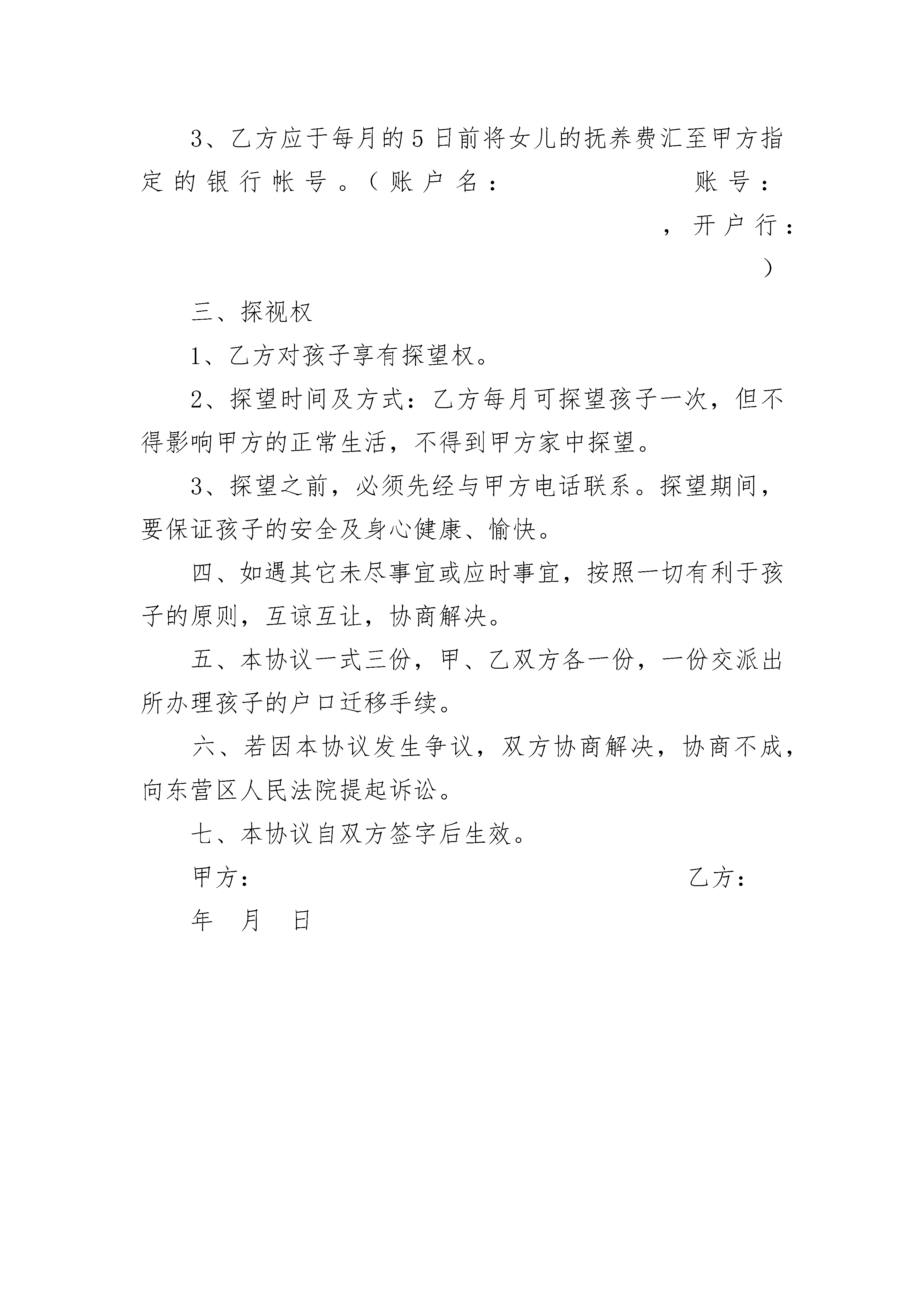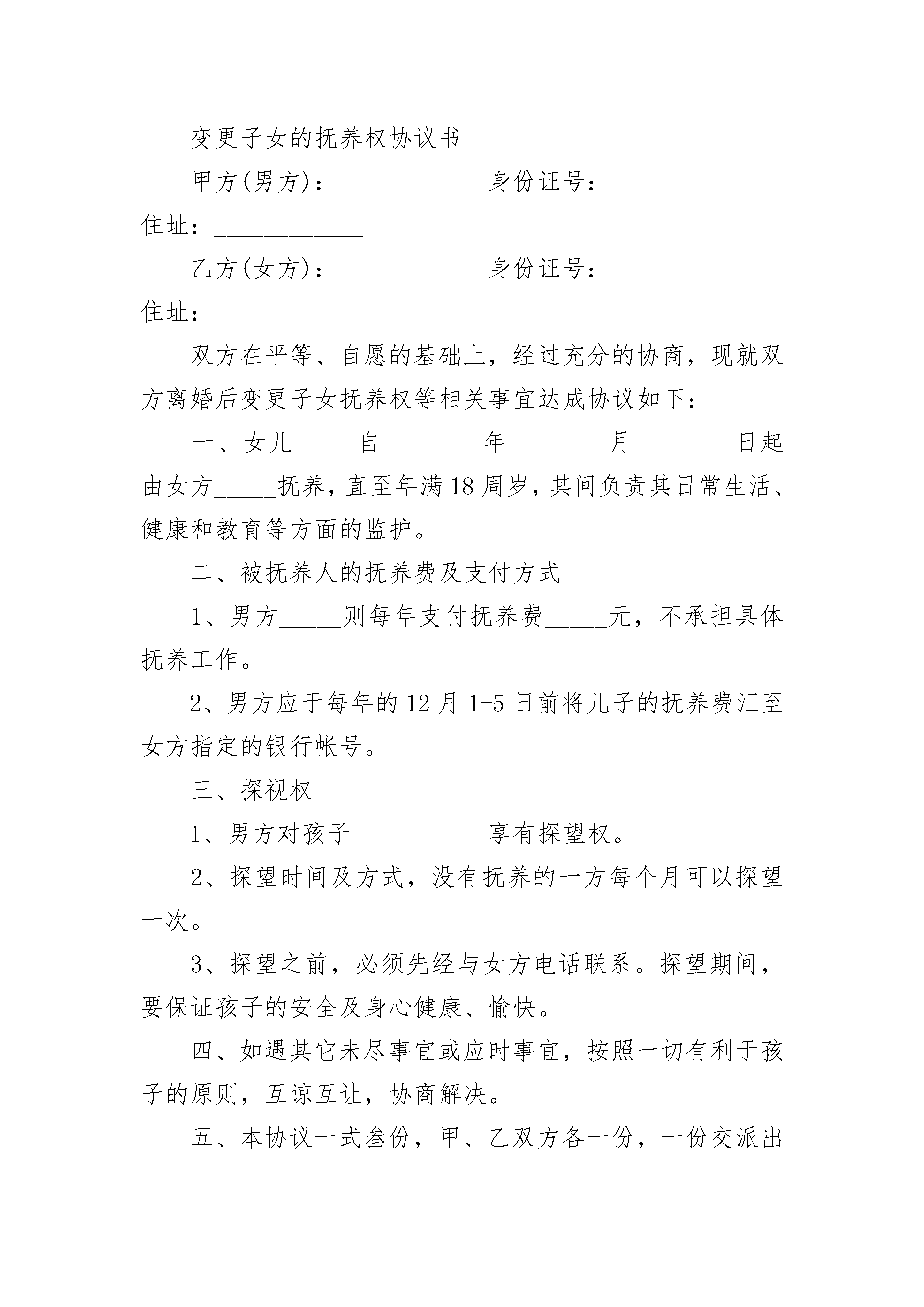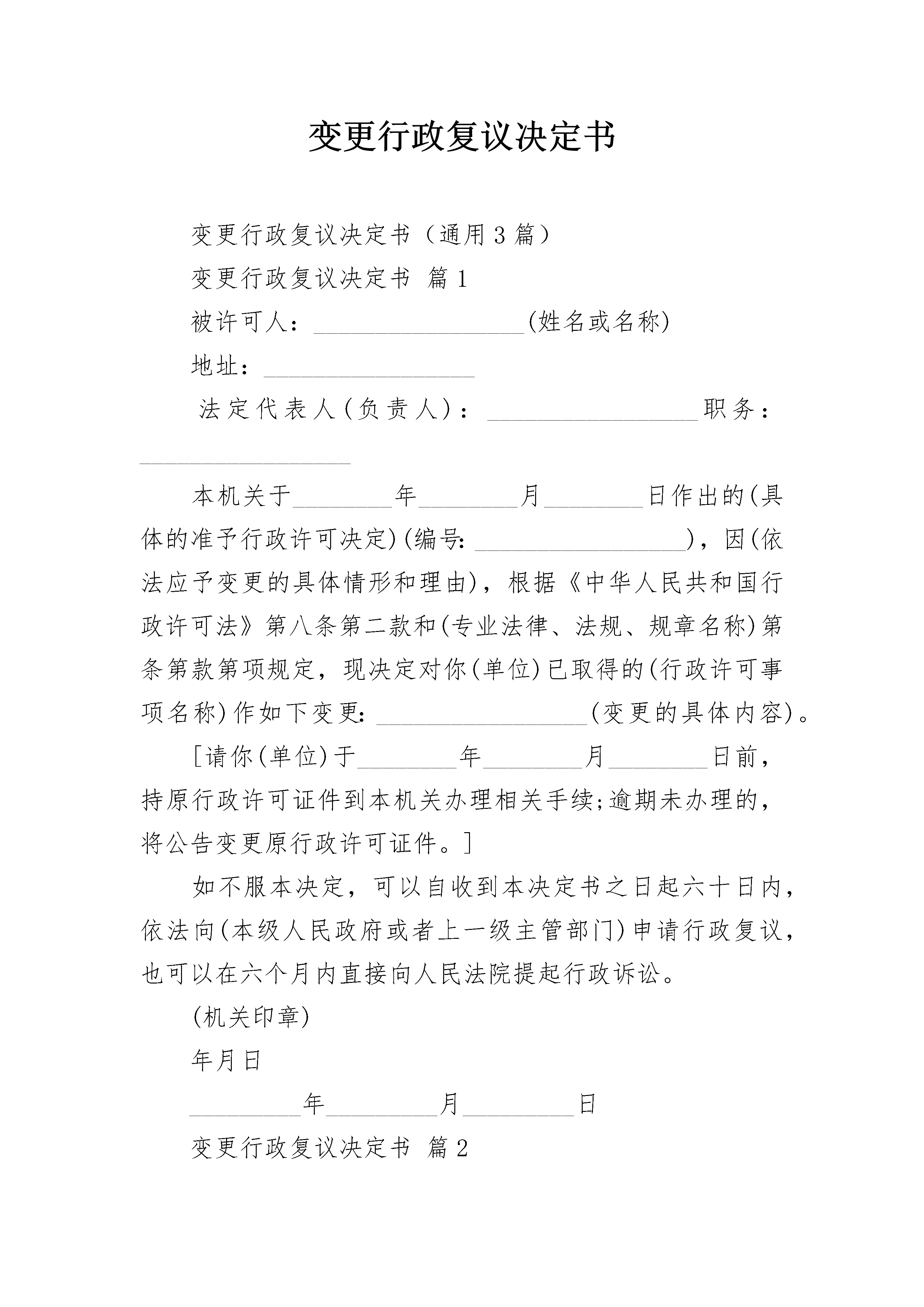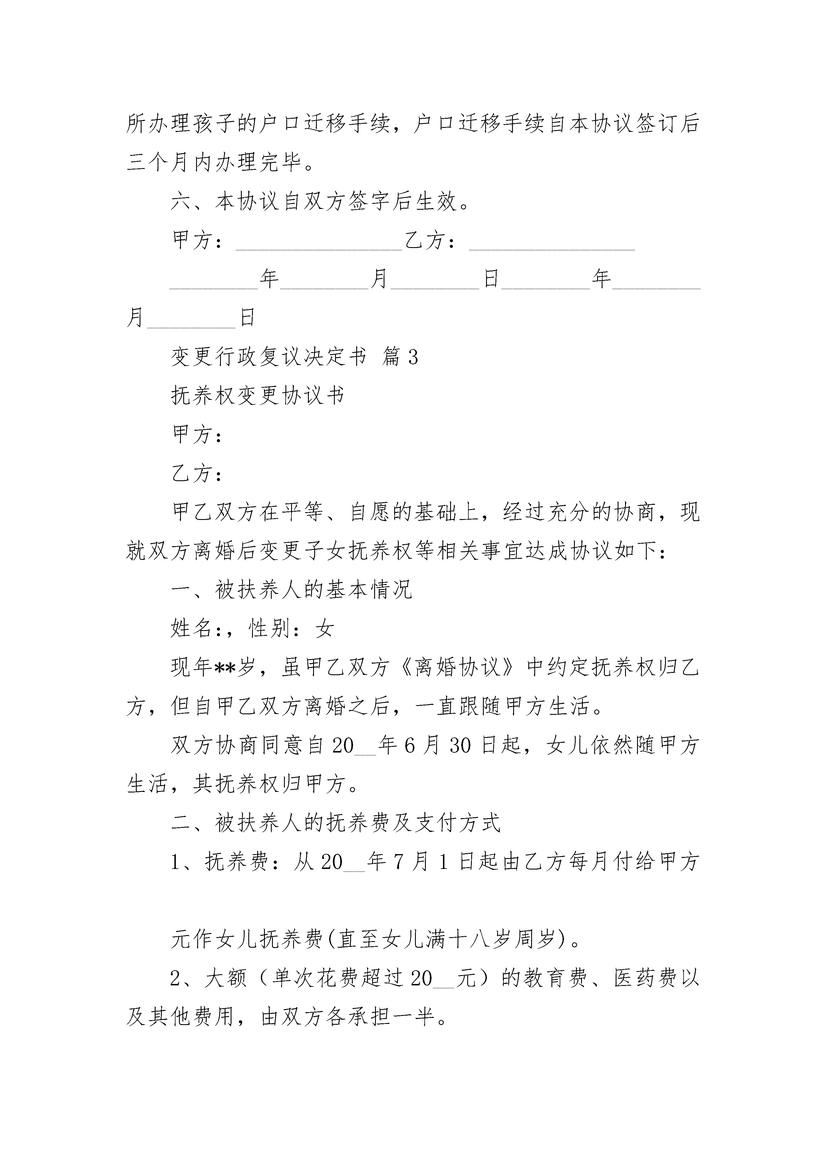 变更行政复议决定书变更行政复议决定书(通用3篇)变更行政复议决定书篇1被许可人:_________________(姓名或名称)地址:_________________法定代表人(负责人):_________________职务:_________________本机关于________年________月________日作出的(具体的准予行政许可决定)(编号:_________________),因(依法应予变更的具体情形和理由),根据《中华人民共和国行政许可法》第八条第二款和(专业法律、法规、规章名称)第条第款第项规定,现决定对你(单位)已取得的(行政许可事项名称)作如下变更:_________________(变更的具体内容)。[请你(单位)于________年________月________日前,持原行政许可证件到本机关办理相关手续;逾期未办理的,将公告变更原行政许可证件。]如不服本决定,可以自收到本决定书之日起六十日内,依法向(本级人民政府或者上一级主管部门)申请行政复议,也可以在六个月内直接向人民法院提起行政诉讼。(机关印章)年月日_________年_________月_________日变更行政复议决定书篇2变更子女的抚养权协议书甲方(男方):____________身份证号:______________住址:____________乙方(女方):____________身份证号:______________住址:____________双方在平等、自愿的基础上,经过充分的协商,现就双方离婚后变更子女抚养权等相关事宜达成协议如下:一、女儿_____自________年________月________日起由女方_____抚养,直至年满18周岁,其间负责其日常生活、健康和教育等方面的监护。二、被抚养人的抚养费及支付方式1、男方_____则每年支付抚养费_____元,不承担具体抚养工作。2、男方应于每年的12月1-5日前将儿子的抚养费汇至女方指定的银行帐号。三、探视权1、男方对孩子___________享有探望权。2、探望时间及方式,没有抚养的一方每个月可以探望一次。3、探望之前,必须先经与女方电话联系。探望期间,要保证孩子的安全及身心健康、愉快。四、如遇其它未尽事宜或应时事宜,按照一切有利于孩子的原则,互谅互让,协商解决。五、本协议一式叁份,甲、乙双方各一份,一份交派出所办理孩子的户口迁移手续,户口迁移手续自本协议签订后三个月内办理完毕。六、本协议自双方签字后生效。甲方:_______________乙方:_______________________年________月________日________年________月________日变更行政复议决定书篇3抚养权变更协议书甲方:乙方:甲乙双方在平等、自愿的基础上,经过充分的协商,现就双方离婚后变更子女抚养权等相关事宜达成协议如下:一、被扶养人的基本情况姓名:,性别:女现年**岁,虽甲乙双方《离婚协议》中约定抚养权归乙方,但自甲乙双方离婚之后,一直跟随甲方生活。双方协商同意自20__年6月30日起,女儿依然随甲方生活,其抚养权归甲方。二、被扶养人的抚养费及支付方式1、抚养费:从20__年7月1日起由乙方每月付给甲方元作女儿抚养费(直至女儿满十八岁周岁)。2、大额(单次花费超过20__元)的教育费、医药费以及其他费用,由双方各承担一半。3、乙方应于每月的5日前将女儿的抚养费汇至甲方指定的银行帐号。(账户名:账号:,开户行:)三、探视权1、乙方对孩子享有探望权。2、探望时间及方式:乙方每月可探望孩子一次,但不得影响甲方的正常生活,不得到甲方家中探望。3、探望之前,必须先经与甲方电话联系。探望期间,要保证孩子的安全及身心健康、愉快。四、如遇其它未尽事宜或应时事宜,按照一切有利于孩子的原则,互谅互让,协商解决。五、本协议一式三份,甲、乙双方各一份,一份交派出所办理孩子的户口迁移手续。六、若因本协议发生争议,双方协商解决,协商不成,向东营区人民法院提起诉讼。七、本协议自双方签字后生效。甲方:乙方:年月日
