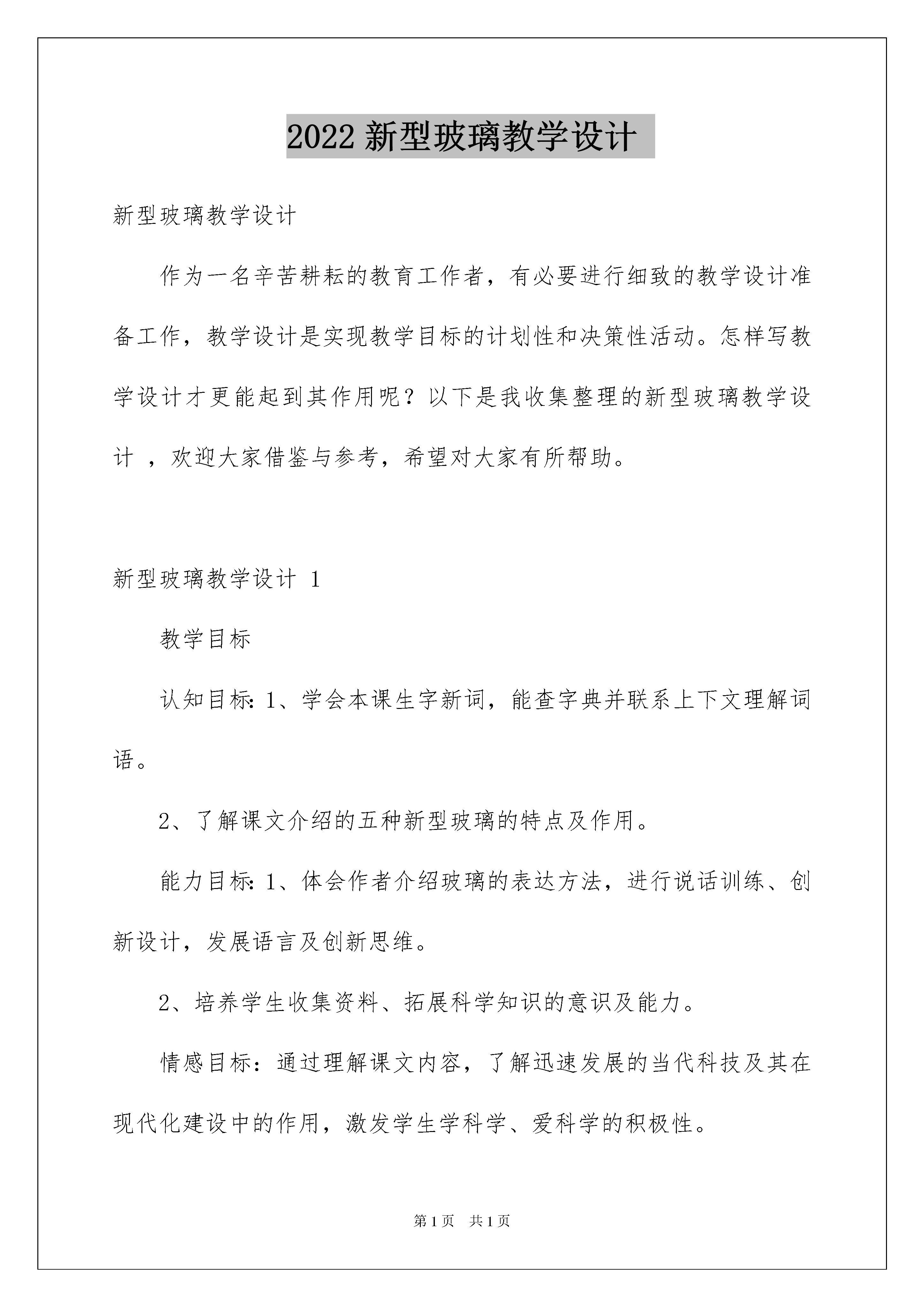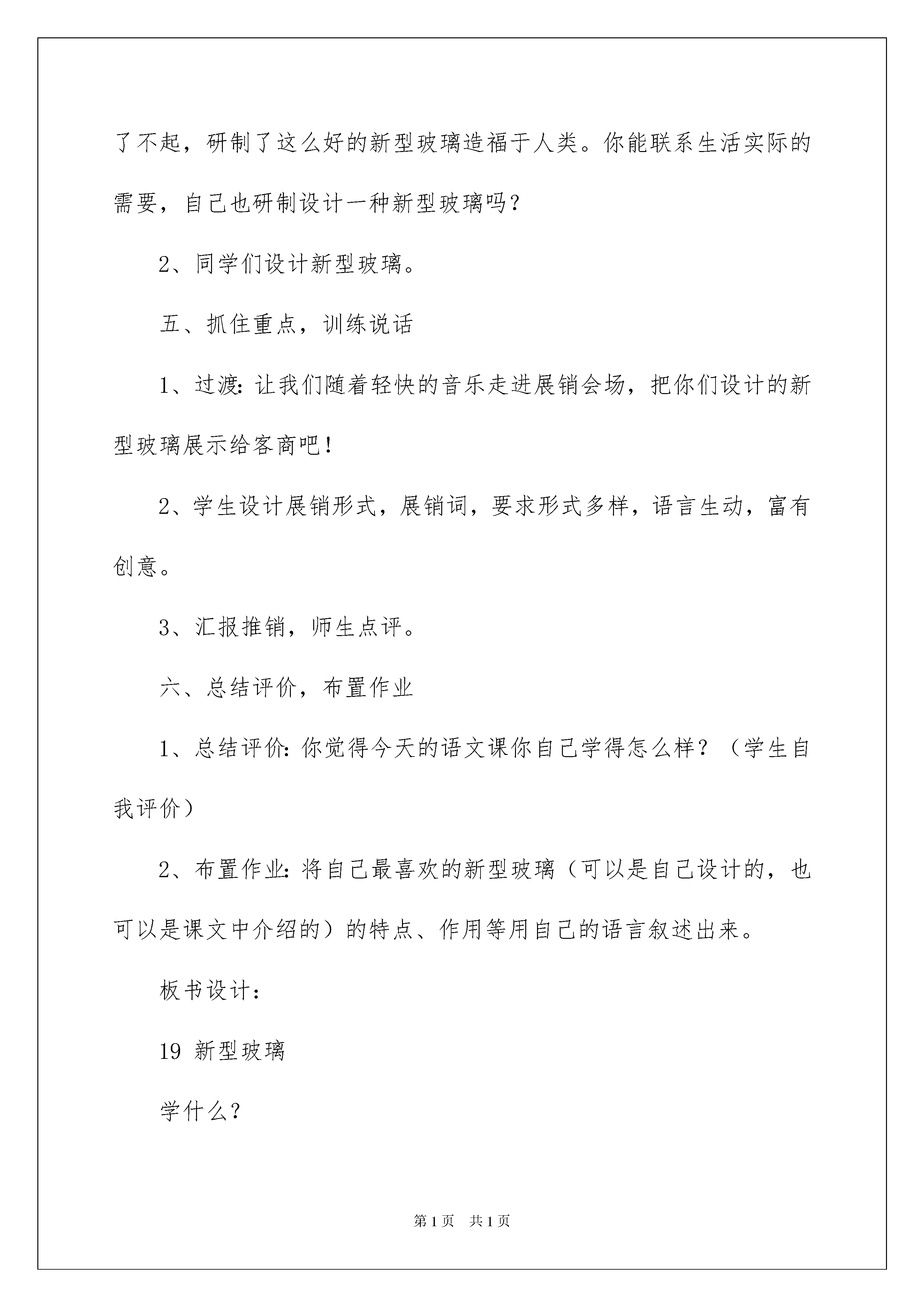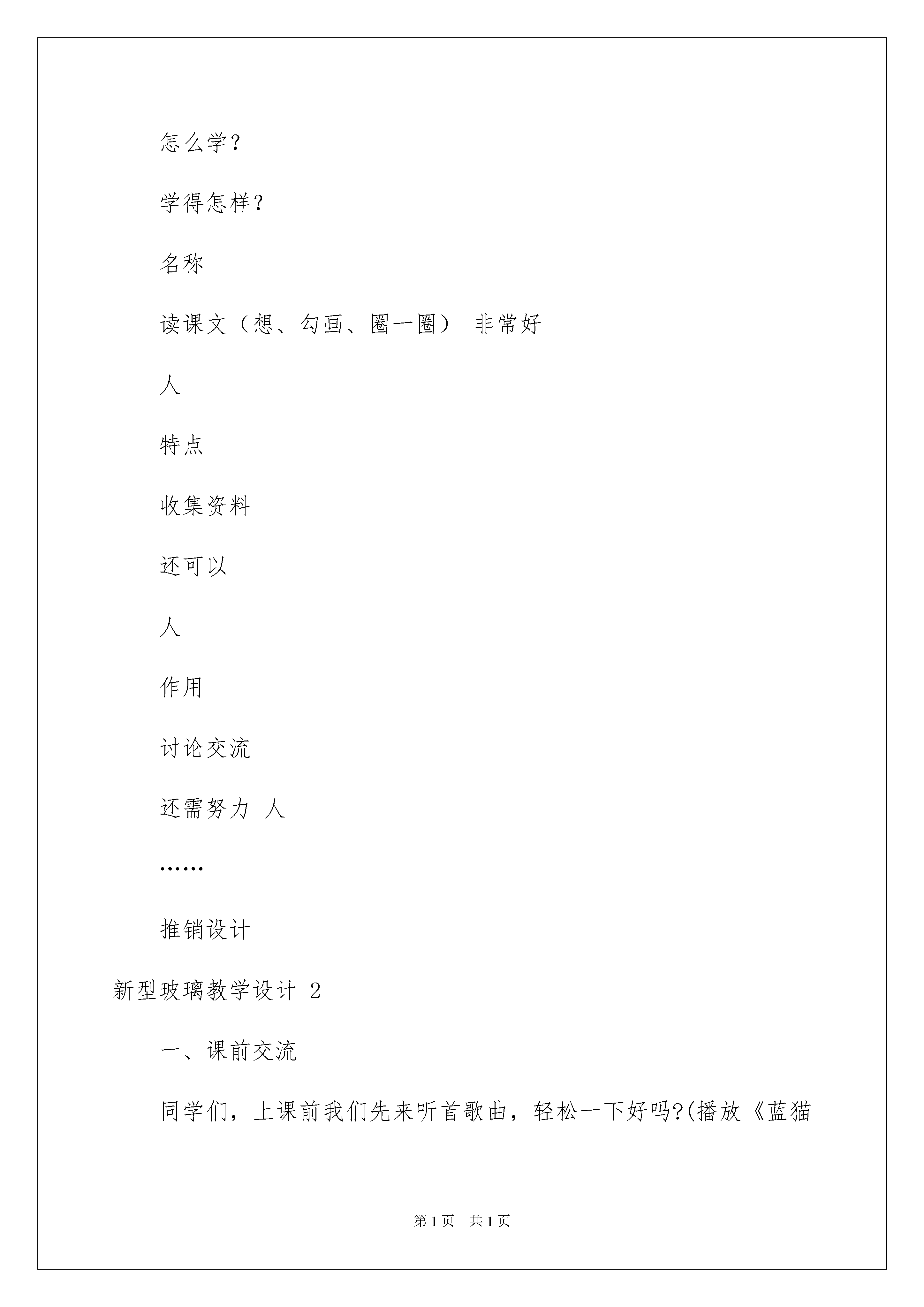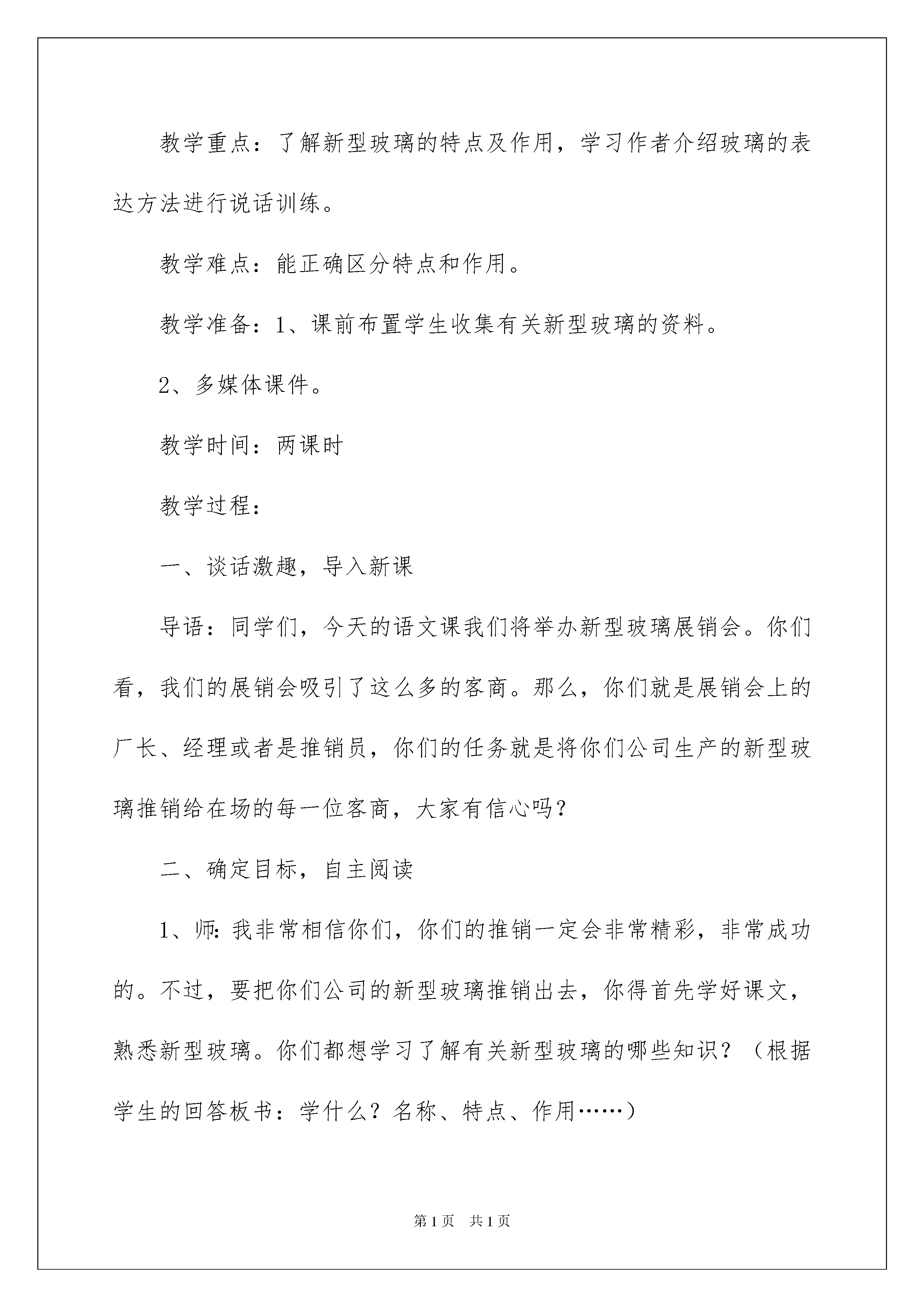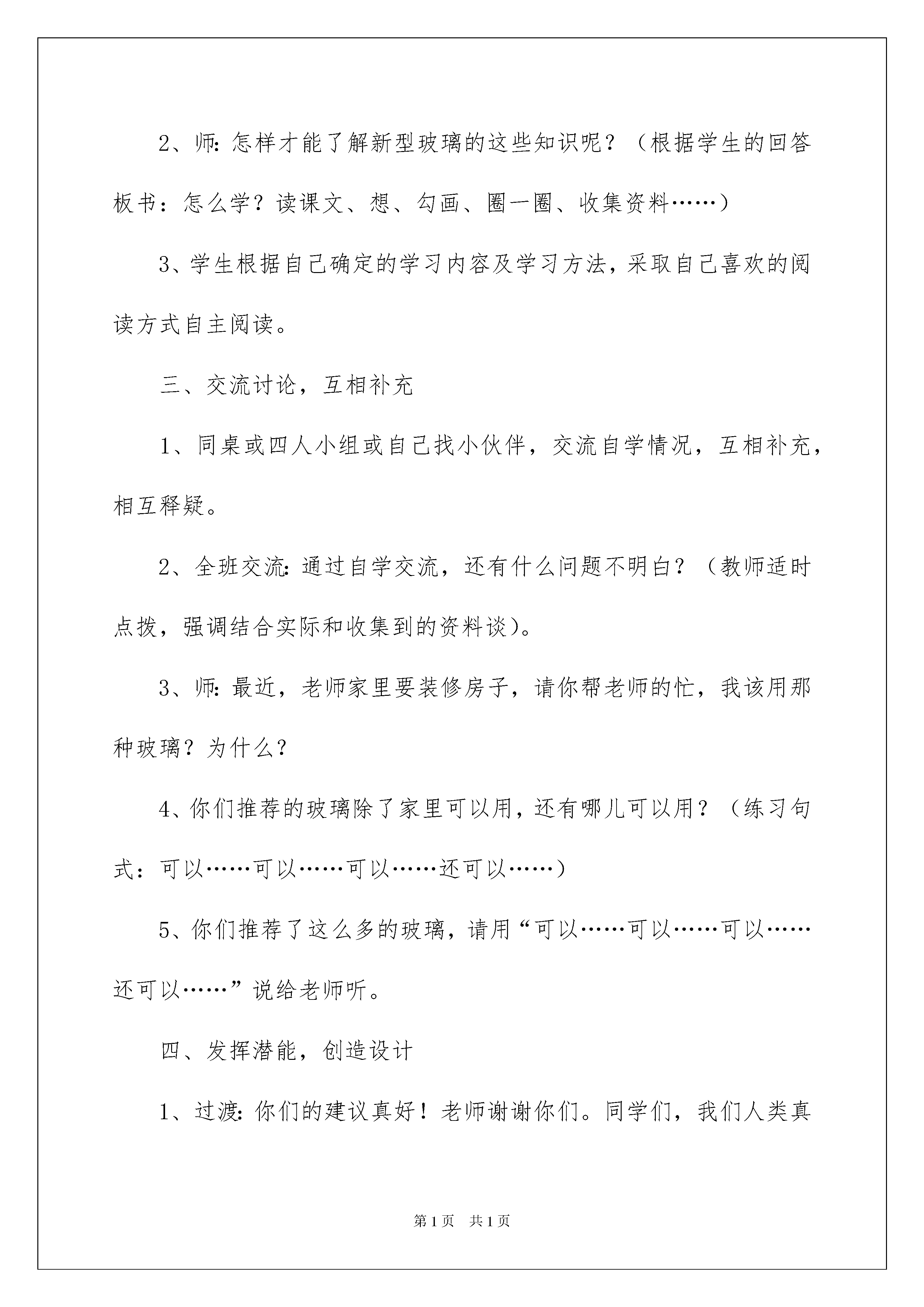 2022新型玻璃教学设计新型玻璃教学设计作为一名辛苦耕耘的教育工作者,有必要进行细致的教学设计准备工作,教学设计是实现教学目标的计划性和决策性活动。怎样写教学设计才更能起到其作用呢?以下是我收集整理的新型玻璃教学设计,欢迎大家借鉴与参考,希望对大家有所帮助。新型玻璃教学设计1教学目标认知目标:1、学会本课生字新词,能查字典并联系上下文理解词语。2、了解课文介绍的五种新型玻璃的特点及作用。能力目标:1、体会作者介绍玻璃的表达方法,进行说话训练、创新设计,发展语言及创新思维。2、培养学生收集资料、拓展科学知识的意识及能力。情感目标:通过理解课文内容,了解迅速发展的当代科技及其在现代化建设中的作用,激发学生学科学、爱科学的积极性。教学重点:了解新型玻璃的特点及作用,学习作者介绍玻璃的表达方法进行说话训练。教学难点:能正确区分特点和作用。教学准备:1、课前布置学生收集有关新型玻璃的资料。2、多媒体课件。教学时间:两课时教学过程:一、谈话激趣,导入新课导语:同学们,今天的语文课我们将举办新型玻璃展销会。你们看,我们的展销会吸引了这么多的客商。那么,你们就是展销会上的厂长、经理或者是推销员,你们的任务就是将你们公司生产的新型玻璃推销给在场的每一位客商,大家有信心吗?二、确定目标,自主阅读1、师:我非常相信你们,你们的推销一定会非常精彩,非常成功的。不过,要把你们公司的新型玻璃推销出去,你得首先学好课文,熟悉新型玻璃。你们都想学习了解有关新型玻璃的哪些知识?(根据学生的回答板书:学什么?名称、特点、作用……)2、师:怎样才能了解新型玻璃的这些知识呢?(根据学生的回答板书:怎么学?读课文、想、勾画、圈一圈、收集资料……)3、学生根据自己确定的学习内容及学习方法,采取自己喜欢的阅读方式自主阅读。三、交流讨论,互相补充1、同桌或四人小组或自己找小伙伴,交流自学情况,互相补充,相互释疑。2、全班交流:通过自学交流,还有什么问题不明白?(教师适时点拨,强调结合实际和收集到的资料谈)。3、师:最近,老师家里要装修房子,请你帮老师的忙,我该用那种玻璃?为什么?4、你们推荐的玻璃除了家里可以用,还有哪儿可以用?(练习句式:可以……可以……可以……还可以……)5、你们推荐了这么多的玻璃,请用“可以……可以……可以……还可以……”说给老师听。四、发挥潜能,创造设计1、过渡:你们的建议真好!老师谢谢你们。同学们,我们人类真了不起,研制了这么好的新型玻璃造福于人类。你能联系生活实际的需要,自己也研制设计一种新型玻璃吗?2、同学们设计新型玻璃。五、抓住重点,训练说话1、过渡:让我们随着轻快的音乐走进展销会场,把你们设计的新型玻璃展示给客商吧!2、学生设计展销形式,展销词,要求形式多样,语言生动,富有创意。3、汇报推销,师生点评。六、总结评价,布置作业1、总结评价:你觉得今天的语文课你自己学得怎么样?(学生自我评价)2、布置作业:将自己最喜欢的新型玻璃(可以是自己设计的,也可以是课文中介绍的)的特点、作用等用自己的语言叙述出来。板书设计:19新型玻璃学什么?怎么学?学得怎样?名称读课文(想、勾画、圈一圈)非常好人特点收集资料还可以人作用讨论交流还需努力人……推销设计新型玻璃教学设计2一、课前交流同学们,上课前我们先来听首歌曲,轻松一下好吗?(播放《蓝猫淘气三千问》的主题曲)同学们这首歌你听过吗?没错,刚才播放的就是《蓝猫淘气三千问》的主题曲,小朋友们,蓝猫告诉我们,只要你爱想、爱问、爱动脑,天地间奇妙的事情你会全明了。这节课上,就让我们学习蓝猫做个爱想、爱问、爱动脑的聪明孩子,好吗?二、激发兴趣1、提起玻璃,同学们都很熟悉,在我们的生活中玻璃随处可见,徐老师给你们带来了几张玻璃工艺品的图片,想请同学们一起欣赏,大家愿意吗?(师相机出示课件)2、这些玻璃制品多美啊!玻璃不仅可以美化我们的环境,还为我们的生活、工作带来意想不到的好处。三、导入主题最近,蓝猫科技创新公司研制出几种新型玻璃(板书)总经理蓝猫准备公开招聘新型玻璃的推销员,大家想不想参加呢?噢,这么多同学都想参加啊,那大家可要好好表现哦!不过,为了更好地推销这些玻璃,同学们首先得熟悉它们的特点和作用。让我们一起来朗读课文,同学们边读边想:课文向我们介绍了哪几种新型新型玻璃呢?(夹丝网防盗玻璃、夹丝玻璃、变色玻璃、吸热玻璃、吃音玻璃)四、学习课文同学们,这五种玻璃,你对哪种最感兴趣呢?(生回答)那我们就来学习这种玻璃好吗?老师这有些问题想想考考同学们,你们敢不敢接受挑战呢?那请同学们看上来(师出示课件)1、学生自由读文,想一想:这种玻璃有什么特点和作用呢?用波