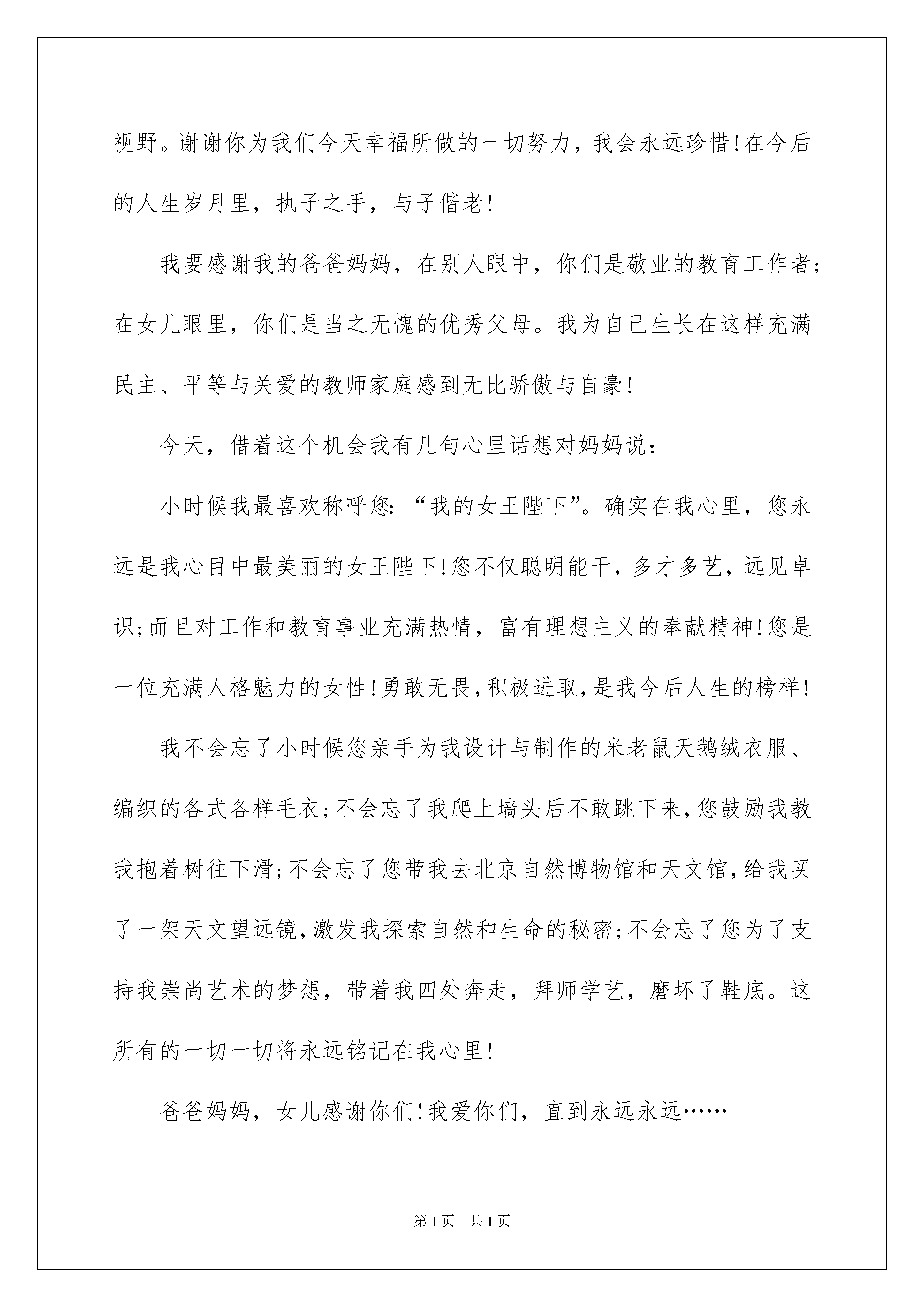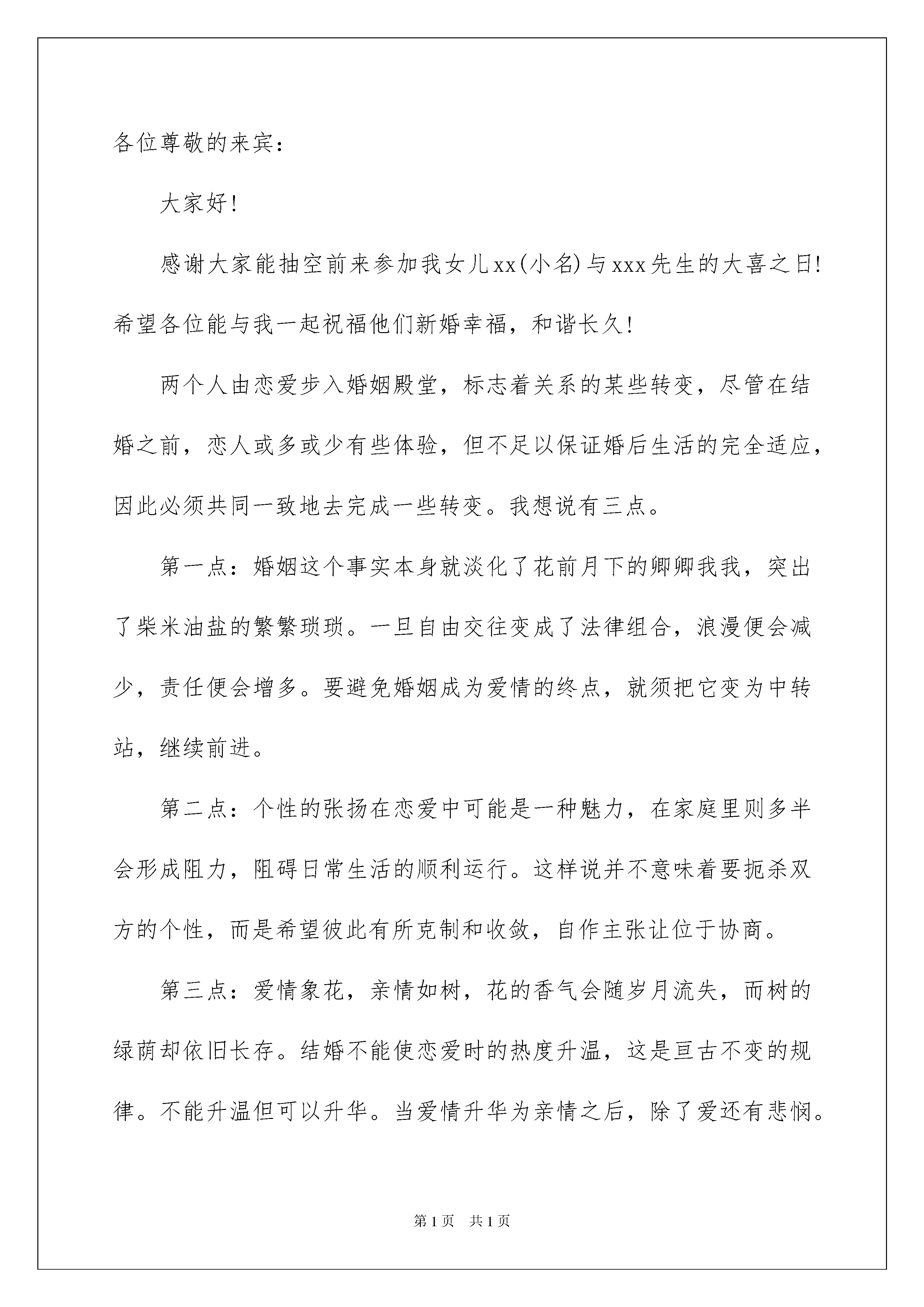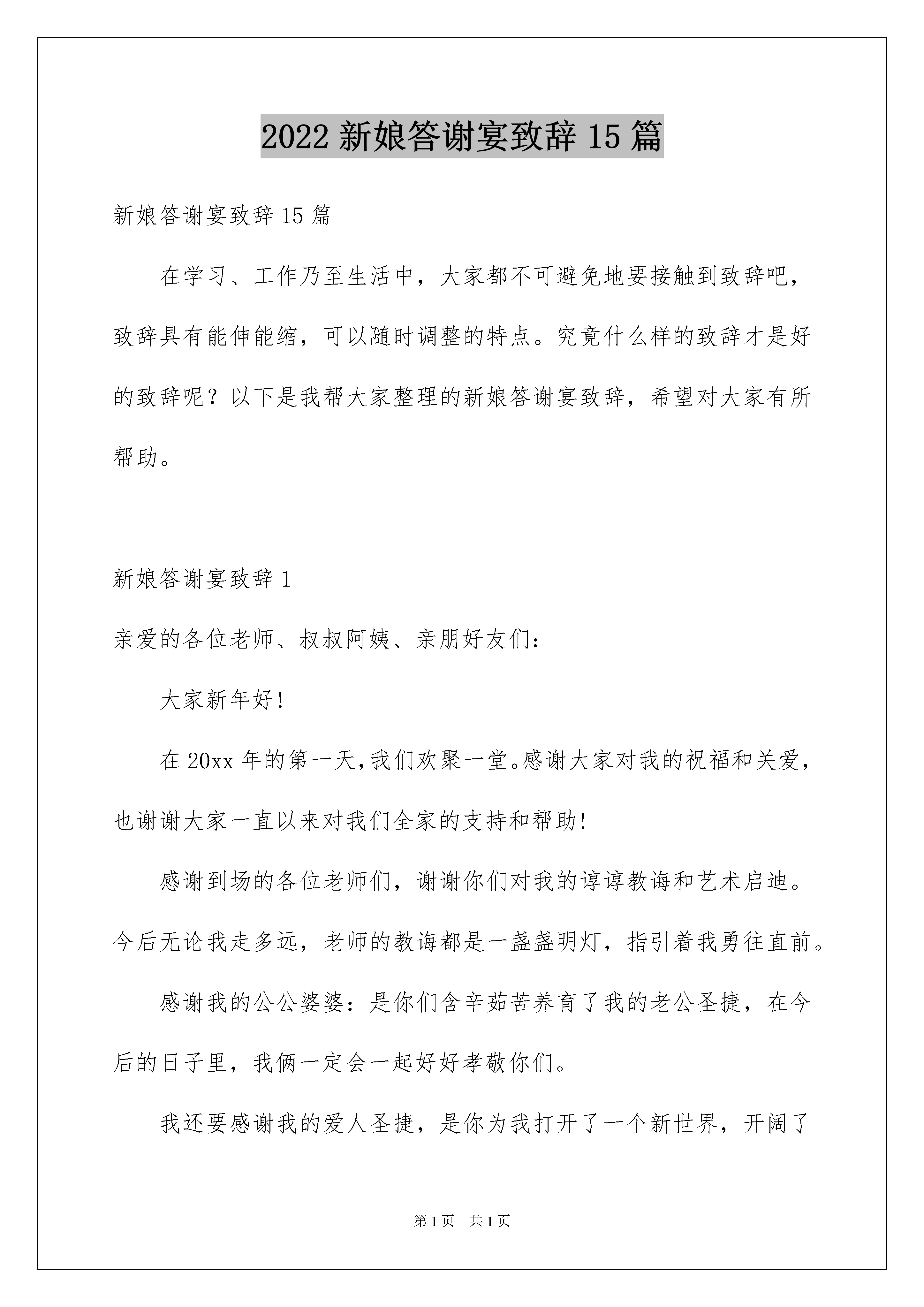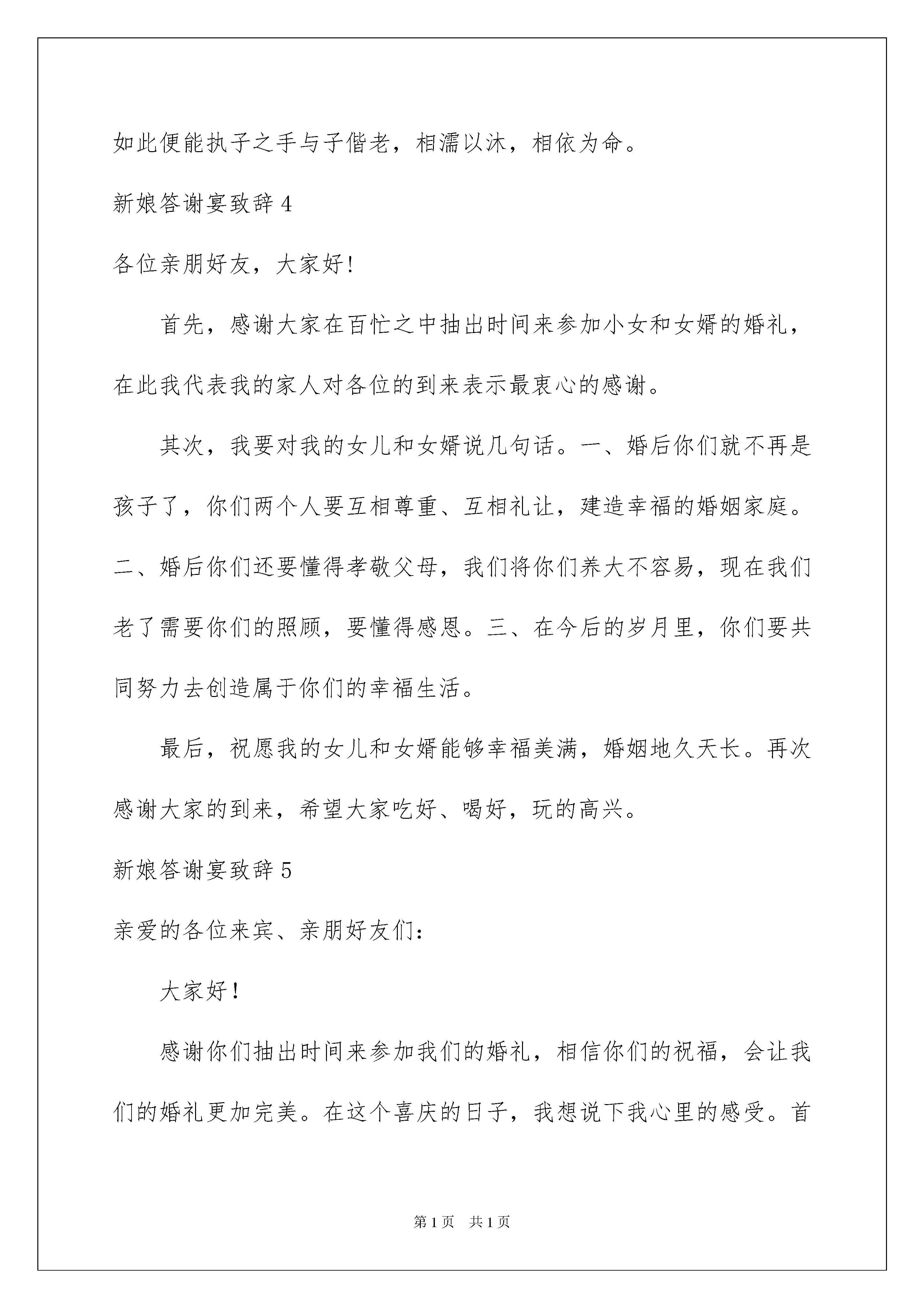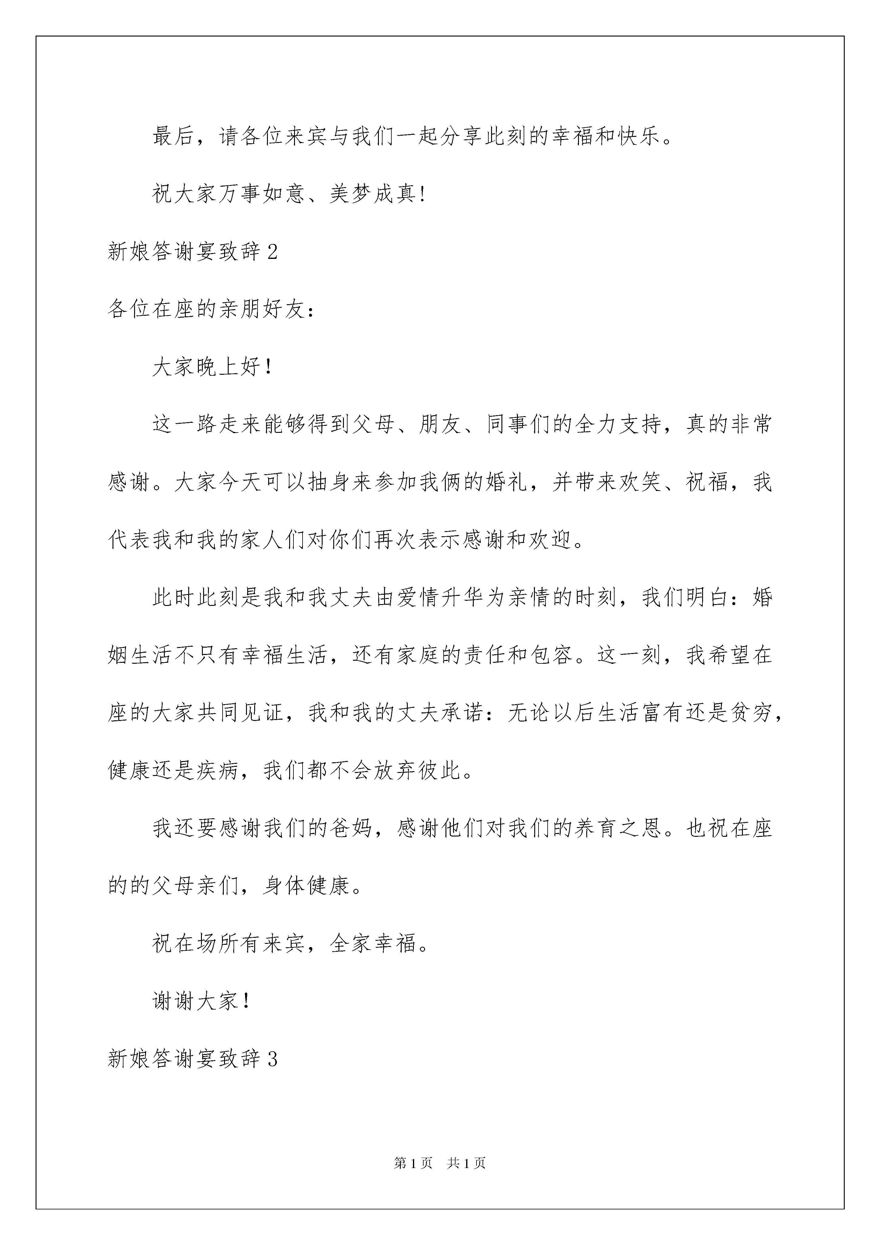2022新娘答谢宴致辞15篇新娘答谢宴致辞15篇在学习、工作乃至生活中,大家都不可避免地要接触到致辞吧,致辞具有能伸能缩,可以随时调整的特点。究竟什么样的致辞才是好的致辞呢?以下是我帮大家整理的新娘答谢宴致辞,希望对大家有所帮助。新娘答谢宴致辞1亲爱的各位老师、叔叔阿姨、亲朋好友们:大家新年好!在20xx年的第一天,我们欢聚一堂。感谢大家对我的祝福和关爱,也谢谢大家一直以来对我们全家的支持和帮助!感谢到场的各位老师们,谢谢你们对我的谆谆教诲和艺术启迪。今后无论我走多远,老师的教诲都是一盏盏明灯,指引着我勇往直前。感谢我的公公婆婆:是你们含辛茹苦养育了我的老公圣捷,在今后的日子里,我俩一定会一起好好孝敬你们。我还要感谢我的爱人圣捷,是你为我打开了一个新世界,开阔了视野。谢谢你为我们今天幸福所做的一切努力,我会永远珍惜!在今后的人生岁月里,执子之手,与子偕老!我要感谢我的爸爸妈妈,在别人眼中,你们是敬业的教育工作者;在女儿眼里,你们是当之无愧的优秀父母。我为自己生长在这样充满民主、平等与关爱的教师家庭感到无比骄傲与自豪!今天,借着这个机会我有几句心里话想对妈妈说:小时候我最喜欢称呼您:“我的女王陛下”。确实在我心里,您永远是我心目中最美丽的女王陛下!您不仅聪明能干,多才多艺,远见卓识;而且对工作和教育事业充满热情,富有理想主义的奉献精神!您是一位充满人格魅力的女性!勇敢无畏,积极进取,是我今后人生的榜样!我不会忘了小时候您亲手为我设计与制作的米老鼠天鹅绒衣服、编织的各式各样毛衣;不会忘了我爬上墙头后不敢跳下来,您鼓励我教我抱着树往下滑;不会忘了您带我去北京自然博物馆和天文馆,给我买了一架天文望远镜,激发我探索自然和生命的秘密;不会忘了您为了支持我崇尚艺术的梦想,带着我四处奔走,拜师学艺,磨坏了鞋底。这所有的一切一切将永远铭记在我心里!爸爸妈妈,女儿感谢你们!我爱你们,直到永远永远……最后,请各位来宾与我们一起分享此刻的幸福和快乐。祝大家万事如意、美梦成真!新娘答谢宴致辞2各位在座的亲朋好友:大家晚上好!这一路走来能够得到父母、朋友、同事们的全力支持,真的非常感谢。大家今天可以抽身来参加我俩的婚礼,并带来欢笑、祝福,我代表我和我的家人们对你们再次表示感谢和欢迎。此时此刻是我和我丈夫由爱情升华为亲情的时刻,我们明白:婚姻生活不只有幸福生活,还有家庭的责任和包容。这一刻,我希望在座的大家共同见证,我和我的丈夫承诺:无论以后生活富有还是贫穷,健康还是疾病,我们都不会放弃彼此。我还要感谢我们的爸妈,感谢他们对我们的养育之恩。也祝在座的的父母亲们,身体健康。祝在场所有来宾,全家幸福。谢谢大家!新娘答谢宴致辞3各位尊敬的来宾:大家好!感谢大家能抽空前来参加我女儿xx(小名)与xxx先生的大喜之日!希望各位能与我一起祝福他们新婚幸福,和谐长久!两个人由恋爱步入婚姻殿堂,标志着关系的某些转变,尽管在结婚之前,恋人或多或少有些体验,但不足以保证婚后生活的完全适应,因此必须共同一致地去完成一些转变。我想说有三点。第一点:婚姻这个事实本身就淡化了花前月下的卿卿我我,突出了柴米油盐的繁繁琐琐。一旦自由交往变成了法律组合,浪漫便会减少,责任便会增多。要避免婚姻成为爱情的终点,就须把它变为中转站,继续前进。第二点:个性的张扬在恋爱中可能是一种魅力,在家庭里则多半会形成阻力,阻碍日常生活的顺利运行。这样说并不意味着要扼杀双方的个性,而是希望彼此有所克制和收敛,自作主张让位于协商。第三点:爱情象花,亲情如树,花的香气会随岁月流失,而树的绿荫却依旧长存。结婚不能使恋爱时的热度升温,这是亘古不变的规律。不能升温但可以升华。当爱情升华为亲情之后,除了爱还有悲悯。如此便能执子之手与子偕老,相濡以沐,相依为命。新娘答谢宴致辞4各位亲朋好友,大家好!首先,感谢大家在百忙之中抽出时间来参加小女和女婿的婚礼,在此我代表我的家人对各位的到来表示最衷心的感谢。其次,我要对我的女儿和女婿说几句话。一、婚后你们就不再是孩子了,你们两个人要互相尊重、互相礼让,建造幸福的婚姻家庭。二、婚后你们还要懂得孝敬父母,我们将你们养大不容易,现在我们老了需要你们的照顾,要懂得感恩。三、在今后的岁月里,你们要共同努力去创造属于你们的幸福生活。最后,祝愿我的女儿和女婿能够幸福美满,婚姻地久天长。再次感谢大家的到来,希望大家吃好、喝好,玩的高兴。新娘答谢宴致辞5亲爱的各位来宾、亲朋好友们:大家好!感谢你们抽出时间来参加我们的婚礼,相信你们的祝福,会让我们的婚礼更加完美。在这个喜庆的日子,我想说下我心里的感受。首先,我要感谢我的父母,他们养育了我二十几年