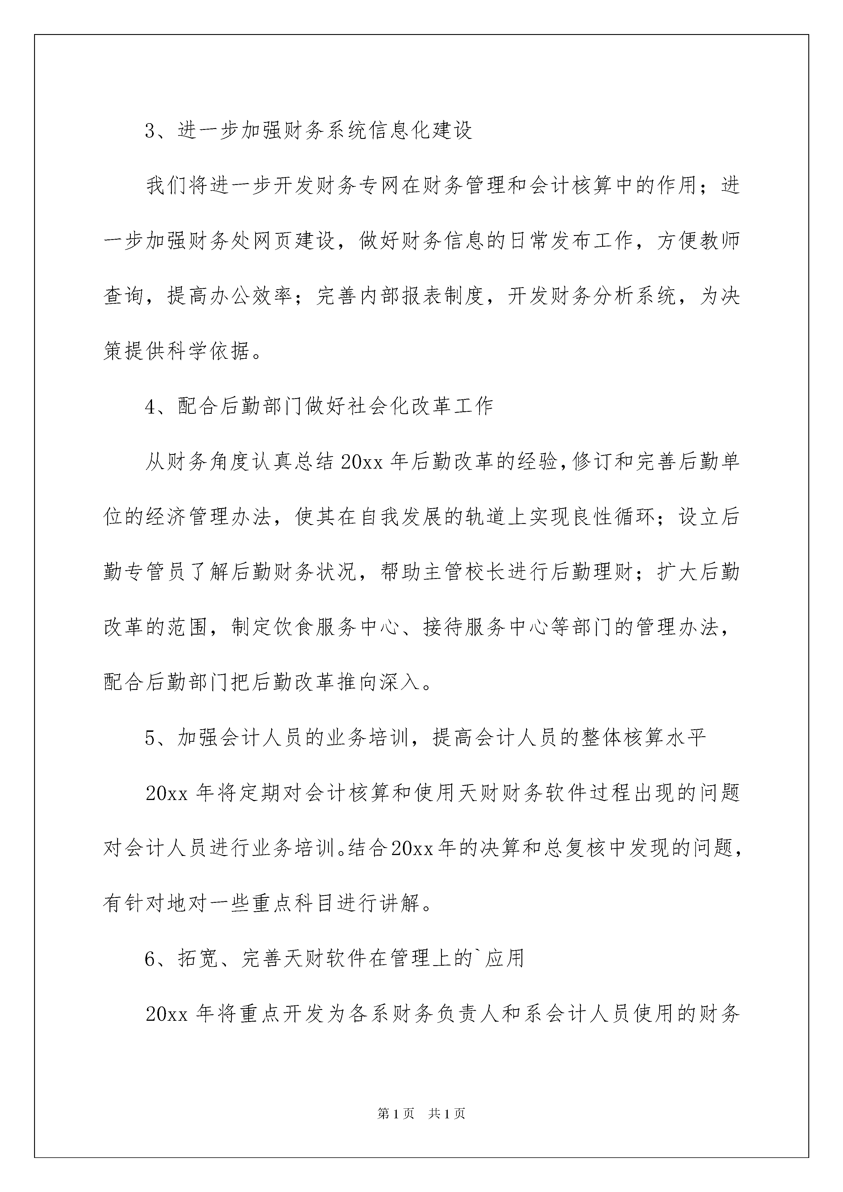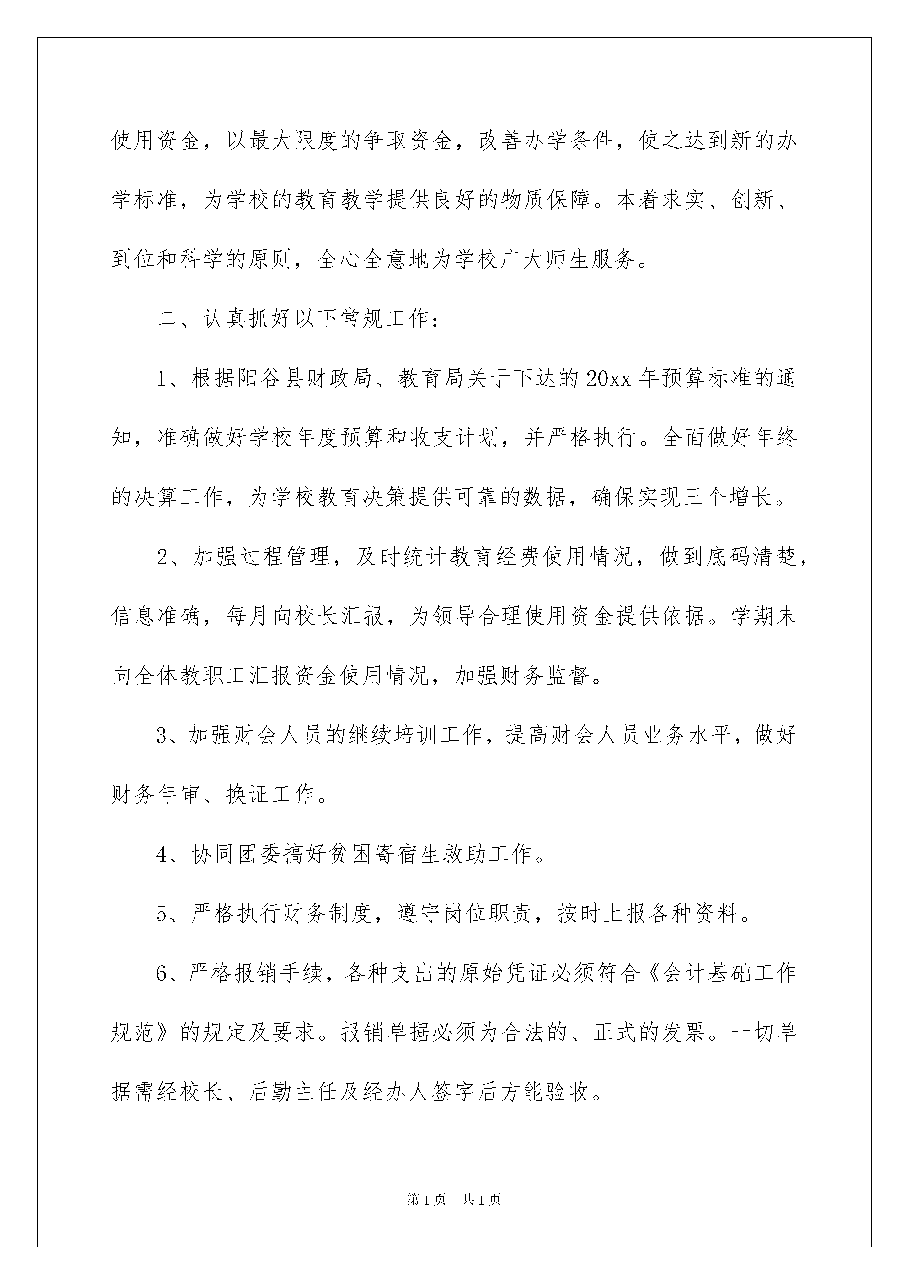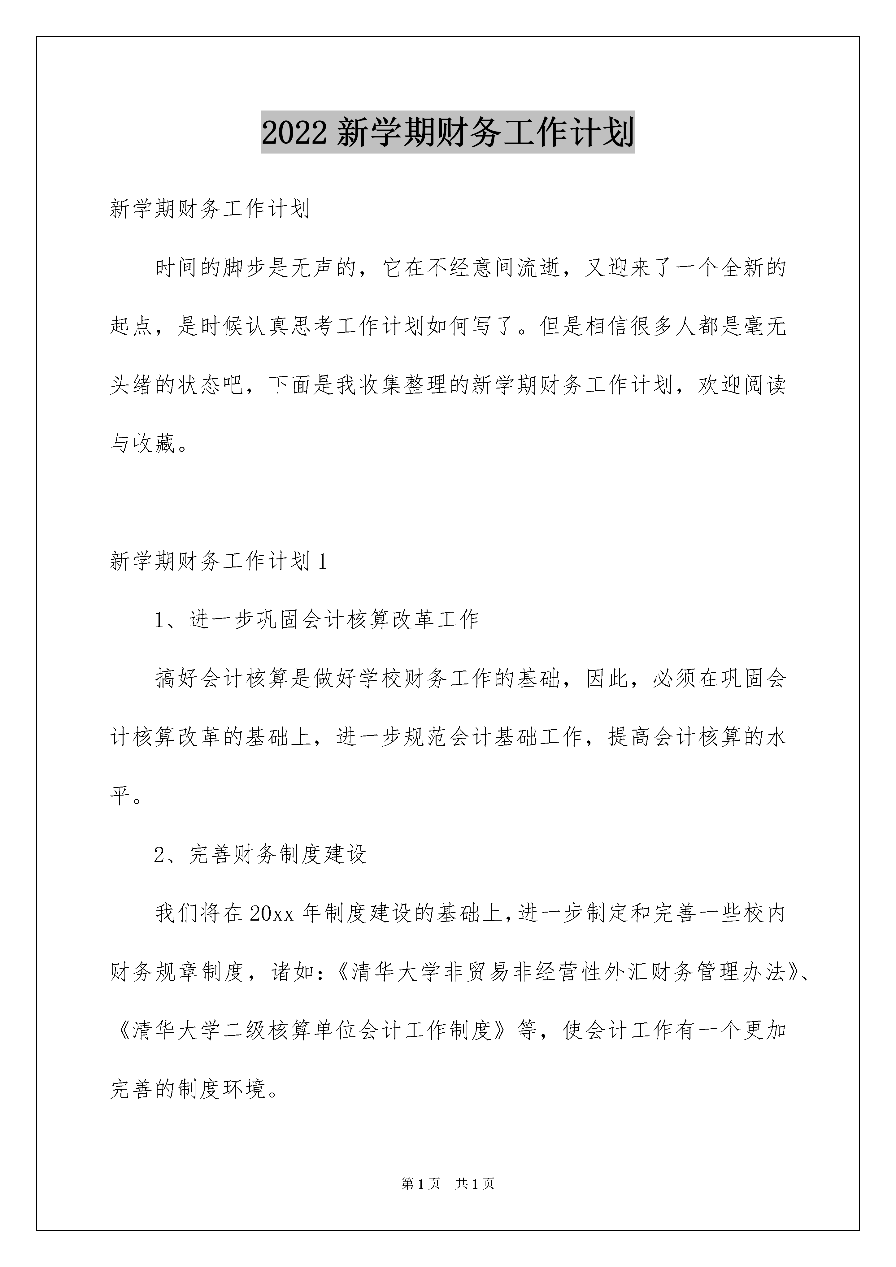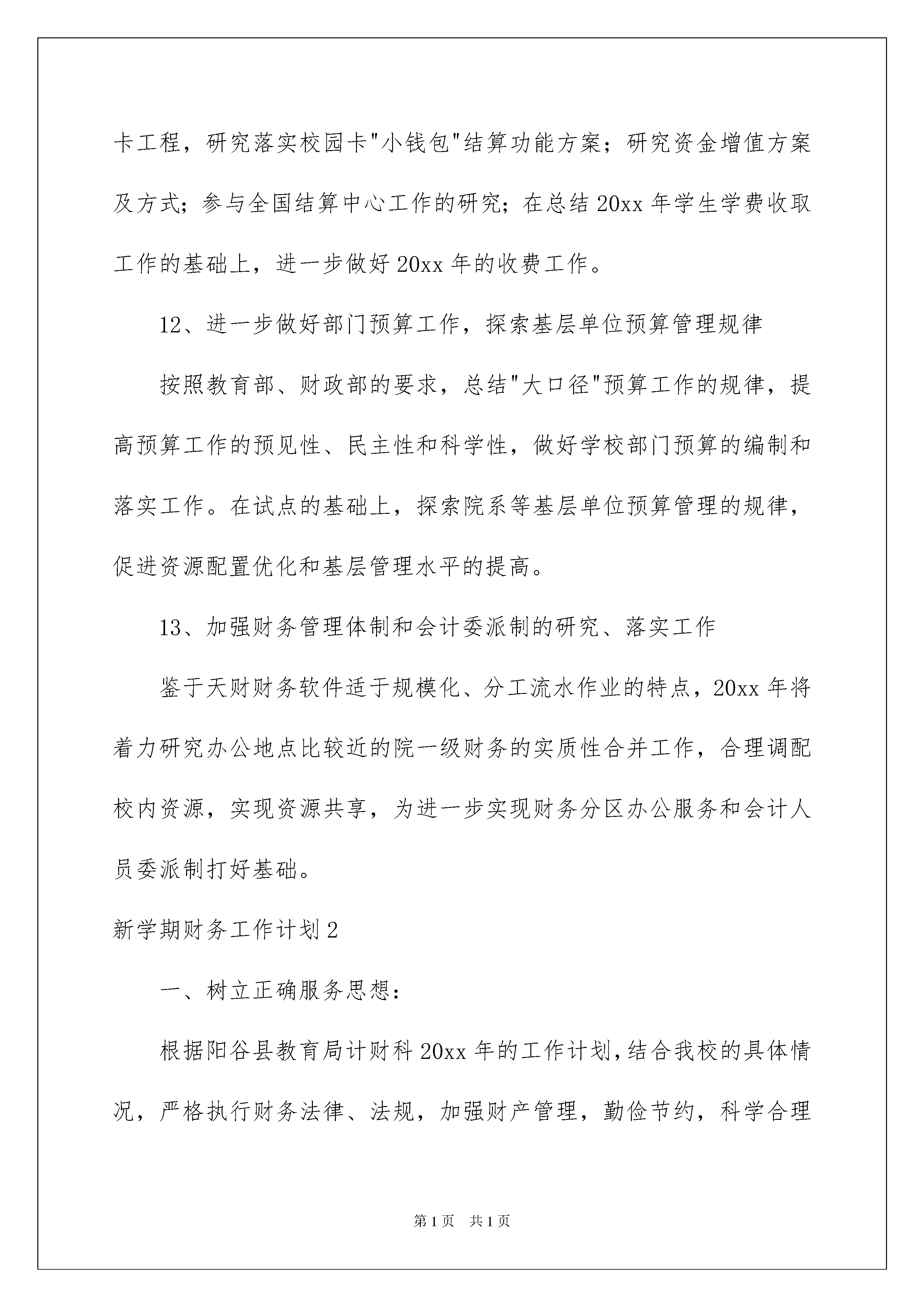 2022新学期财务工作计划新学期财务工作计划时间的脚步是无声的,它在不经意间流逝,又迎来了一个全新的起点,是时候认真思考工作计划如何写了。但是相信很多人都是毫无头绪的状态吧,下面是我收集整理的新学期财务工作计划,欢迎阅读与收藏。新学期财务工作计划11、进一步巩固会计核算改革工作搞好会计核算是做好学校财务工作的基础,因此,必须在巩固会计核算改革的基础上,进一步规范会计基础工作,提高会计核算的水平。2、完善财务制度建设我们将在20xx年制度建设的基础上,进一步制定和完善一些校内财务规章制度,诸如:《清华大学非贸易非经营性外汇财务管理办法》、《清华大学二级核算单位会计工作制度》等,使会计工作有一个更加完善的制度环境。3、进一步加强财务系统信息化建设我们将进一步开发财务专网在财务管理和会计核算中的作用;进一步加强财务处网页建设,做好财务信息的日常发布工作,方便教师查询,提高办公效率;完善内部报表制度,开发财务分析系统,为决策提供科学依据。4、配合后勤部门做好社会化改革工作从财务角度认真总结20xx年后勤改革的经验,修订和完善后勤单位的经济管理办法,使其在自我发展的轨道上实现良性循环;设立后勤专管员了解后勤财务状况,帮助主管校长进行后勤理财;扩大后勤改革的范围,制定饮食服务中心、接待服务中心等部门的管理办法,配合后勤部门把后勤改革推向深入。5、加强会计人员的业务培训,提高会计人员的整体核算水平20xx年将定期对会计核算和使用天财财务软件过程出现的问题对会计人员进行业务培训。结合20xx年的决算和总复核中发现的问题,有针对地对一些重点科目进行讲解。6、拓宽、完善天财软件在管理上的`应用20xx年将重点开发为各系财务负责人和系会计人员使用的财务报表分析系统以及开发离任审计的财务指标评价系统。7、管好、用好各种专项经费做好"211"工程的验收检查及财务文件的归档以及财务数据和财务统计分析工作。掌握"985"经费的使用计划(规划),加强平日管理、检查、分析和控制工作。8、清理会计档案库,开发票据管理软件对所有的会计档案进行整理、清查和分类,开发票据管理软件,加强票据的管理和监督。9、完成助学金一级核算工作在工资实现一级核算之后,完成助学金一级核算的动员、说服、组织、协调以及数据的采集、核算、岗位责任方面的工作,实现助学金的银行代发,从而提高助学金管理的运行效率。10、加强平安互助基金、住房公积金的管理及核算工作进一步加强平安互助基金的管理,落实财务处、校医院和工会三方面的责任,建立科学、现代化的平安互助基金管理体系。11、拓宽结算中心业务,实现金融创新恢复结算中心对公(主要指后勤资金)部分核算业务;配合校园卡工程,研究落实校园卡"小钱包"结算功能方案;研究资金增值方案及方式;参与全国结算中心工作的研究;在总结20xx年学生学费收取工作的基础上,进一步做好20xx年的收费工作。12、进一步做好部门预算工作,探索基层单位预算管理规律按照教育部、财政部的要求,总结"大口径"预算工作的规律,提高预算工作的预见性、民主性和科学性,做好学校部门预算的编制和落实工作。在试点的基础上,探索院系等基层单位预算管理的规律,促进资源配置优化和基层管理水平的提高。13、加强财务管理体制和会计委派制的研究、落实工作鉴于天财财务软件适于规模化、分工流水作业的特点,20xx年将着力研究办公地点比较近的院一级财务的实质性合并工作,合理调配校内资源,实现资源共享,为进一步实现财务分区办公服务和会计人员委派制打好基础。新学期财务工作计划2一、树立正确服务思想:根据阳谷县教育局计财科20xx年的工作计划,结合我校的具体情况,严格执行财务法律、法规,加强财产管理,勤俭节约,科学合理使用资金,以最大限度的争取资金,改善办学条件,使之达到新的办学标准,为学校的教育教学提供良好的物质保障。本着求实、创新、到位和科学的原则,全心全意地为学校广大师生服务。二、认真抓好以下常规工作:1、根据阳谷县财政局、教育局关于下达的20xx年预算标准的通知,准确做好学校年度预算和收支计划,并严格执行。全面做好年终的决算工作,为学校教育决策提供可靠的数据,确保实现三个增长。2、加强过程管理,及时统计教育经费使用情况,做到底码清楚,信息准确,每月向校长汇报,为领导合理使用资金提供依据。学期末向全体教职工汇报资金使用情况,加强财务监督。3、加强财会人员的继续培训工作,提高财会人员业务水平,做好财务年审、换证工作。4、协同团委搞好贫困寄宿生救助工作。5、严格执行财务制度,遵守岗位职责,按时上报各种资料。6、严格报销手续,各种支出的原始凭证必须符合《会计基础工作