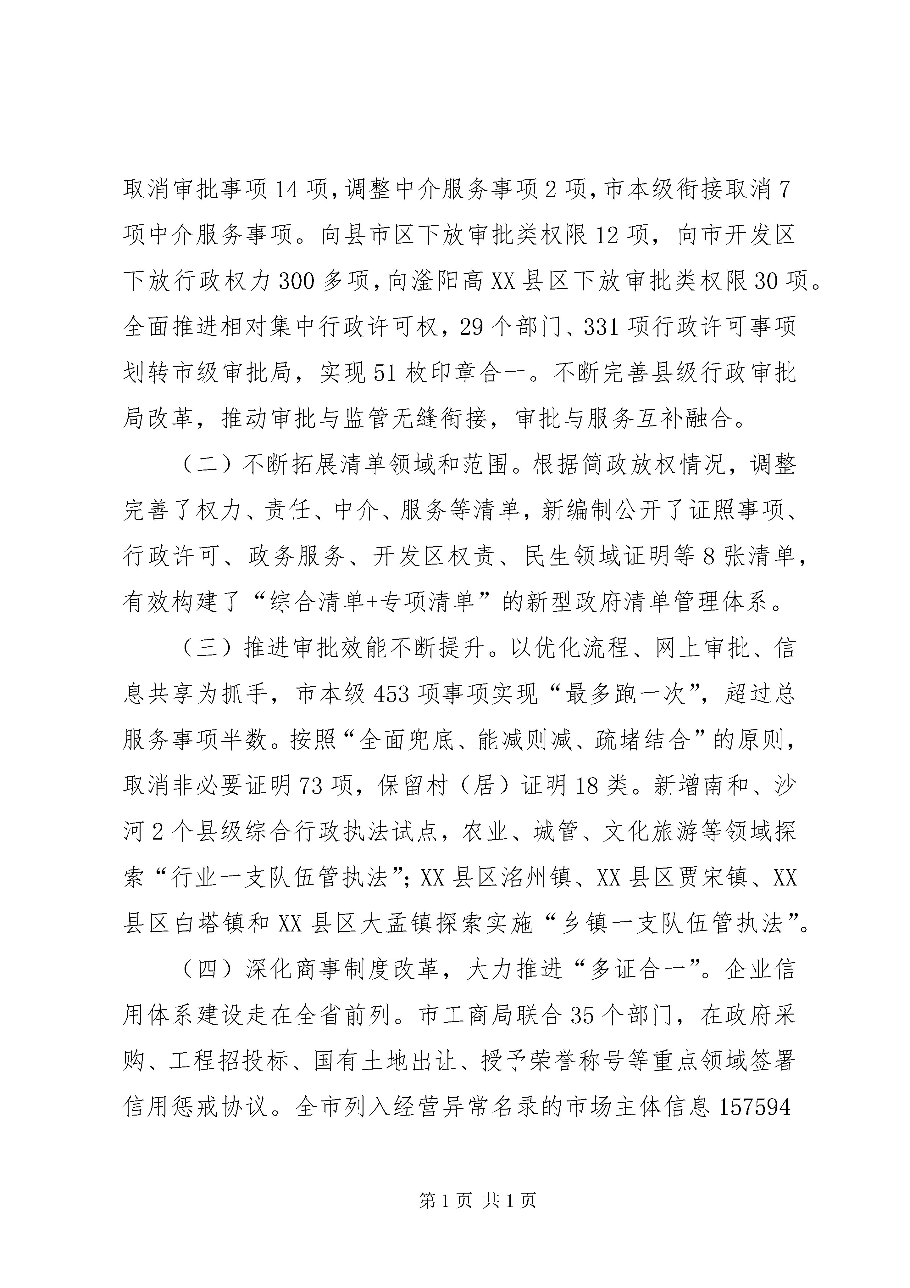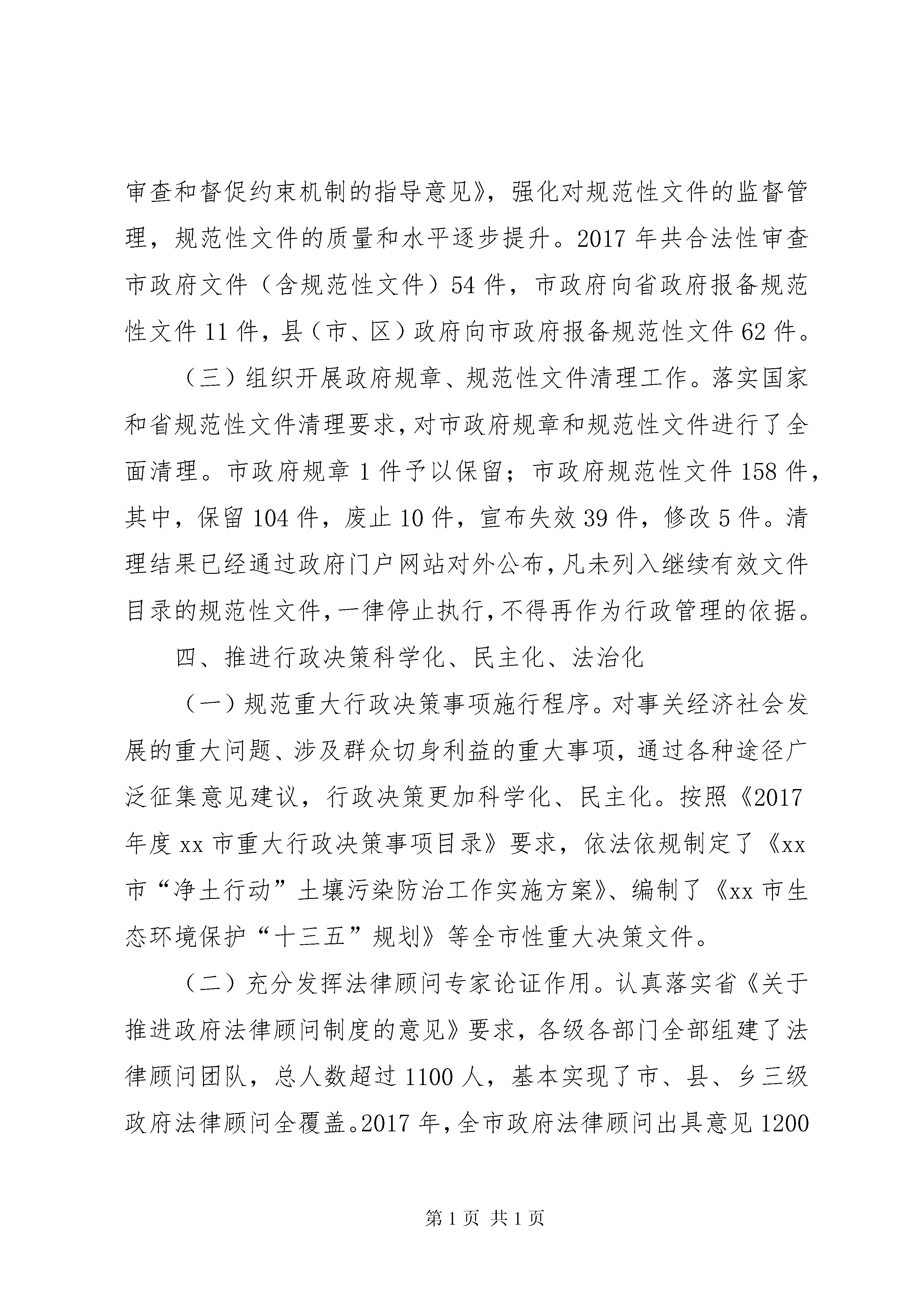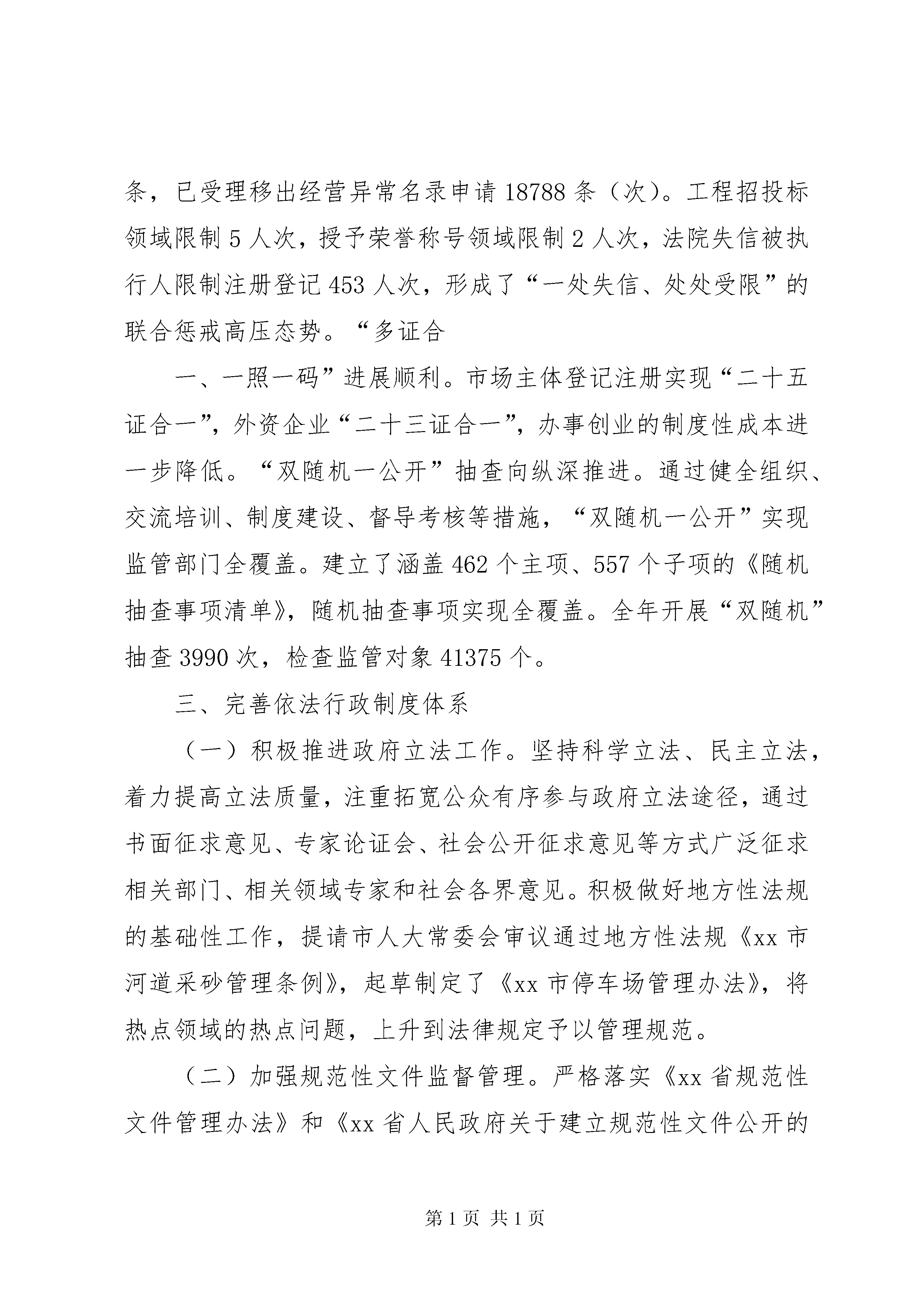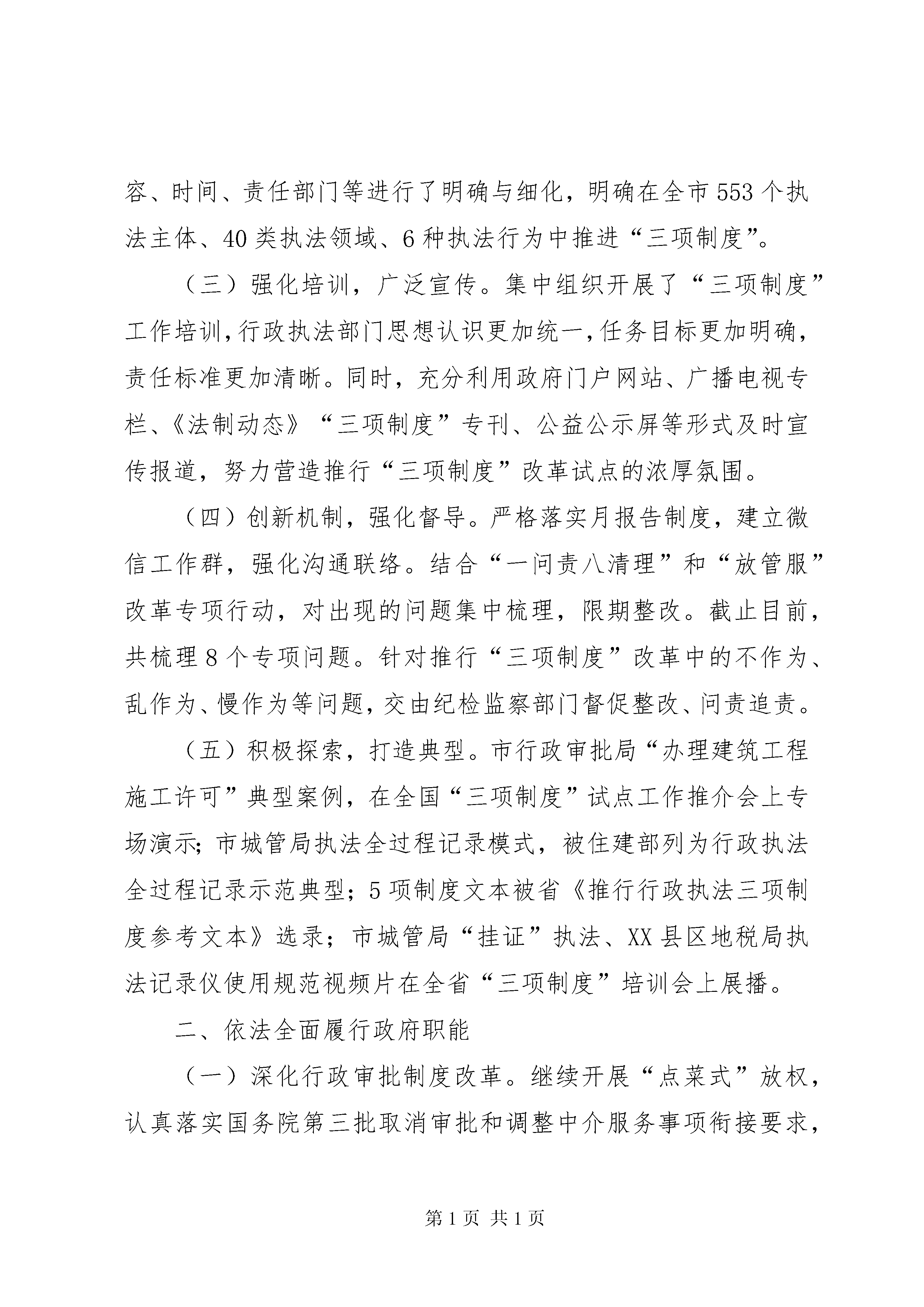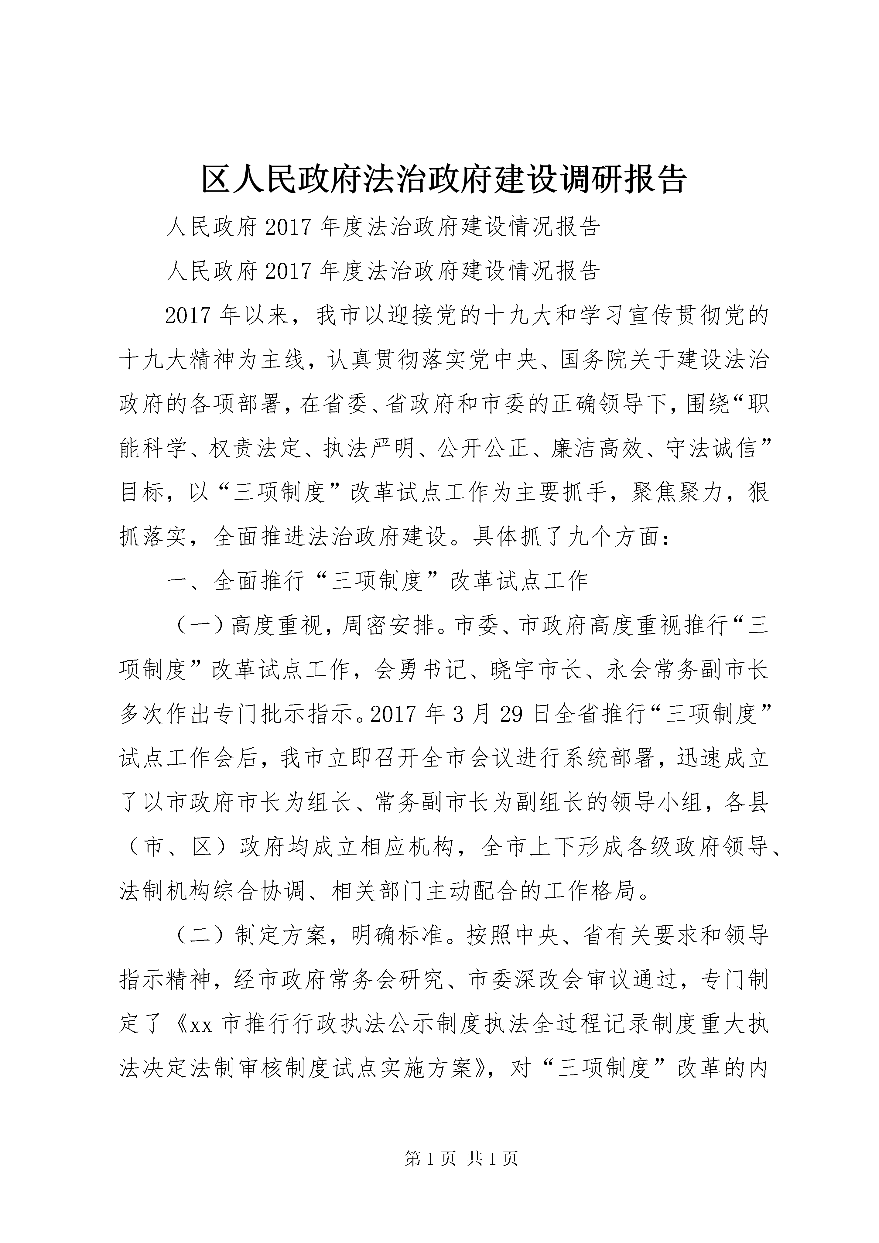 区人民政府法治政府建设调研报告人民政府2017年度法治政府建设情况报告人民政府2017年度法治政府建设情况报告2017年以来,我市以迎接党的十九大和学习宣传贯彻党的十九大精神为主线,认真贯彻落实党中央、国务院关于建设法治政府的各项部署,在省委、省政府和市委的正确领导下,围绕“职能科学、权责法定、执法严明、公开公正、廉洁高效、守法诚信”目标,以“三项制度”改革试点工作为主要抓手,聚焦聚力,狠抓落实,全面推进法治政府建设。具体抓了九个方面:一、全面推行“三项制度”改革试点工作(一)高度重视,周密安排。市委、市政府高度重视推行“三项制度”改革试点工作,会勇书记、晓宇市长、永会常务副市长多次作出专门批示指示。2017年3月29日全省推行“三项制度”试点工作会后,我市立即召开全市会议进行系统部署,迅速成立了以市政府市长为组长、常务副市长为副组长的领导小组,各县(市、区)政府均成立相应机构,全市上下形成各级政府领导、法制机构综合协调、相关部门主动配合的工作格局。(二)制定方案,明确标准。按照中央、省有关要求和领导指示精神,经市政府常务会研究、市委深改会审议通过,专门制定了《xx市推行行政执法公示制度执法全过程记录制度重大执法决定法制审核制度试点实施方案》,对“三项制度”改革的内容、时间、责任部门等进行了明确与细化,明确在全市553个执法主体、40类执法领域、6种执法行为中推进“三项制度”。(三)强化培训,广泛宣传。集中组织开展了“三项制度”工作培训,行政执法部门思想认识更加统一,任务目标更加明确,责任标准更加清晰。同时,充分利用政府门户网站、广播电视专栏、《法制动态》“三项制度”专刊、公益公示屏等形式及时宣传报道,努力营造推行“三项制度”改革试点的浓厚氛围。(四)创新机制,强化督导。严格落实月报告制度,建立微信工作群,强化沟通联络。结合“一问责八清理”和“放管服”改革专项行动,对出现的问题集中梳理,限期整改。截止目前,共梳理8个专项问题。针对推行“三项制度”改革中的不作为、乱作为、慢作为等问题,交由纪检监察部门督促整改、问责追责。(五)积极探索,打造典型。市行政审批局“办理建筑工程施工许可”典型案例,在全国“三项制度”试点工作推介会上专场演示;市城管局执法全过程记录模式,被住建部列为行政执法全过程记录示范典型;5项制度文本被省《推行行政执法三项制度参考文本》选录;市城管局“挂证”执法、XX县区地税局执法记录仪使用规范视频片在全省“三项制度”培训会上展播。二、依法全面履行政府职能(一)深化行政审批制度改革。继续开展“点菜式”放权,认真落实国务院第三批取消审批和调整中介服务事项衔接要求,取消审批事项14项,调整中介服务事项2项,市本级衔接取消7项中介服务事项。向县市区下放审批类权限12项,向市开发区下放行政权力300多项,向滏阳高XX县区下放审批类权限30项。全面推进相对集中行政许可权,29个部门、331项行政许可事项划转市级审批局,实现51枚印章合一。不断完善县级行政审批局改革,推动审批与监管无缝衔接,审批与服务互补融合。(二)不断拓展清单领域和范围。根据简政放权情况,调整完善了权力、责任、中介、服务等清单,新编制公开了证照事项、行政许可、政务服务、开发区权责、民生领域证明等8张清单,有效构建了“综合清单+专项清单”的新型政府清单管理体系。(三)推进审批效能不断提升。以优化流程、网上审批、信息共享为抓手,市本级453项事项实现“最多跑一次”,超过总服务事项半数。按照“全面兜底、能减则减、疏堵结合”的原则,取消非必要证明73项,保留村(居)证明18类。新增南和、沙河2个县级综合行政执法试点,农业、城管、文化旅游等领域探索“行业一支队伍管执法”;XX县区洺州镇、XX县区贾宋镇、XX县区白塔镇和XX县区大孟镇探索实施“乡镇一支队伍管执法”。(四)深化商事制度改革,大力推进“多证合一”。企业信用体系建设走在全省前列。市工商局联合35个部门,在政府采购、工程招投标、国有土地出让、授予荣誉称号等重点领域签署信用惩戒协议。全市列入经营异常名录的市场主体信息157594条,已受理移出经营异常名录申请18788条(次)。工程招投标领域限制5人次,授予荣誉称号领域限制2人次,法院失信被执行人限制注册登记453人次,形成了“一处失信、处处受限”的联合惩戒高压态势。“多证合一、一照一码”进展顺利。市场主体登记注册实现“二十五证合一”,外资企业“二十三证合一”,办事创业的制度性成本进一步降低。“双随机一公开”抽查向纵深推进。通过健全组织、交流培训、制度建设、督导考核等措施,“双随机一公开”实现监管部门全覆盖。建立了涵盖462个主项、557个子项的《随机抽查事项清单》,随机抽查事项实现全覆盖。全年开展“双随机”抽查3990次,检查监管对象41