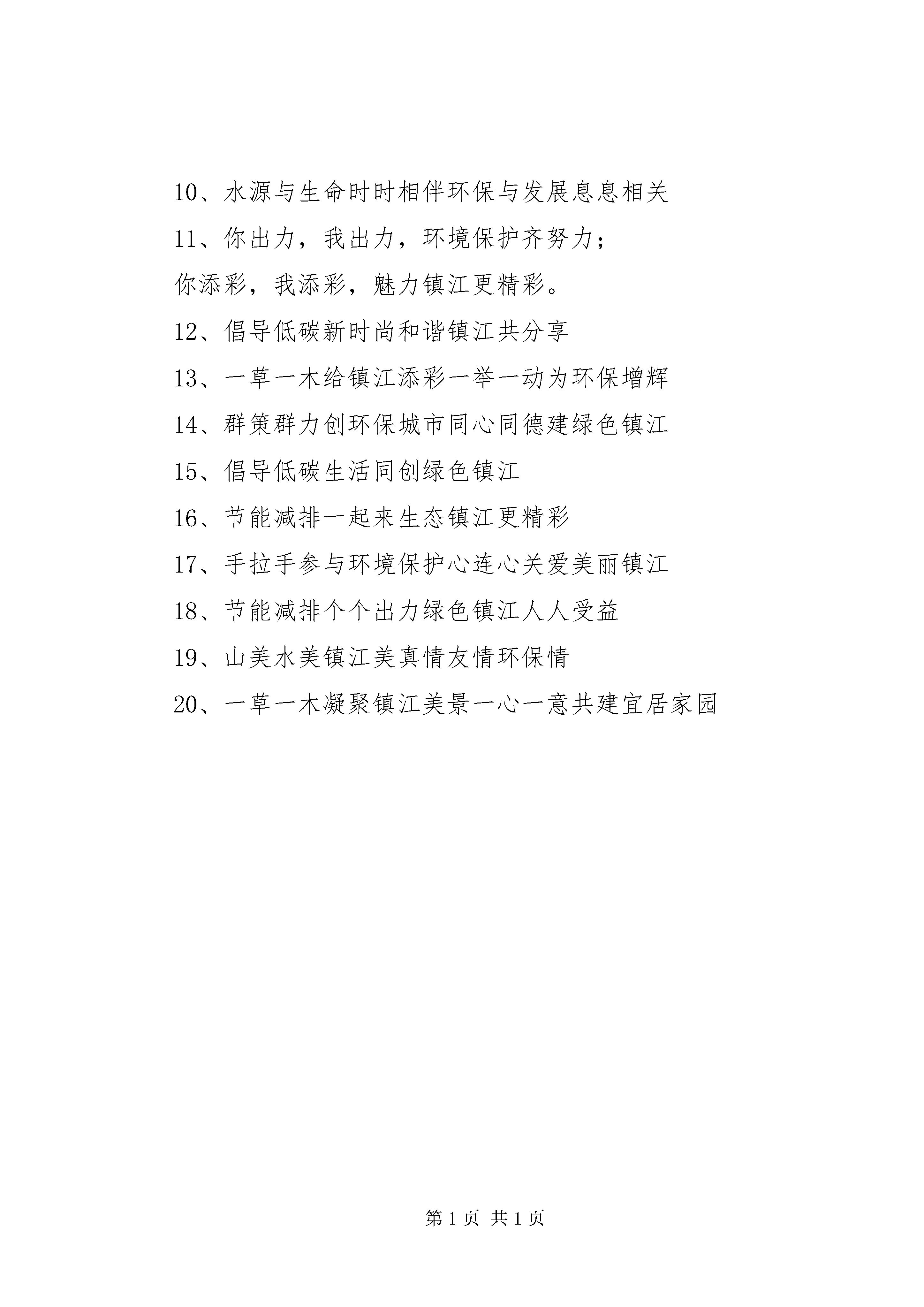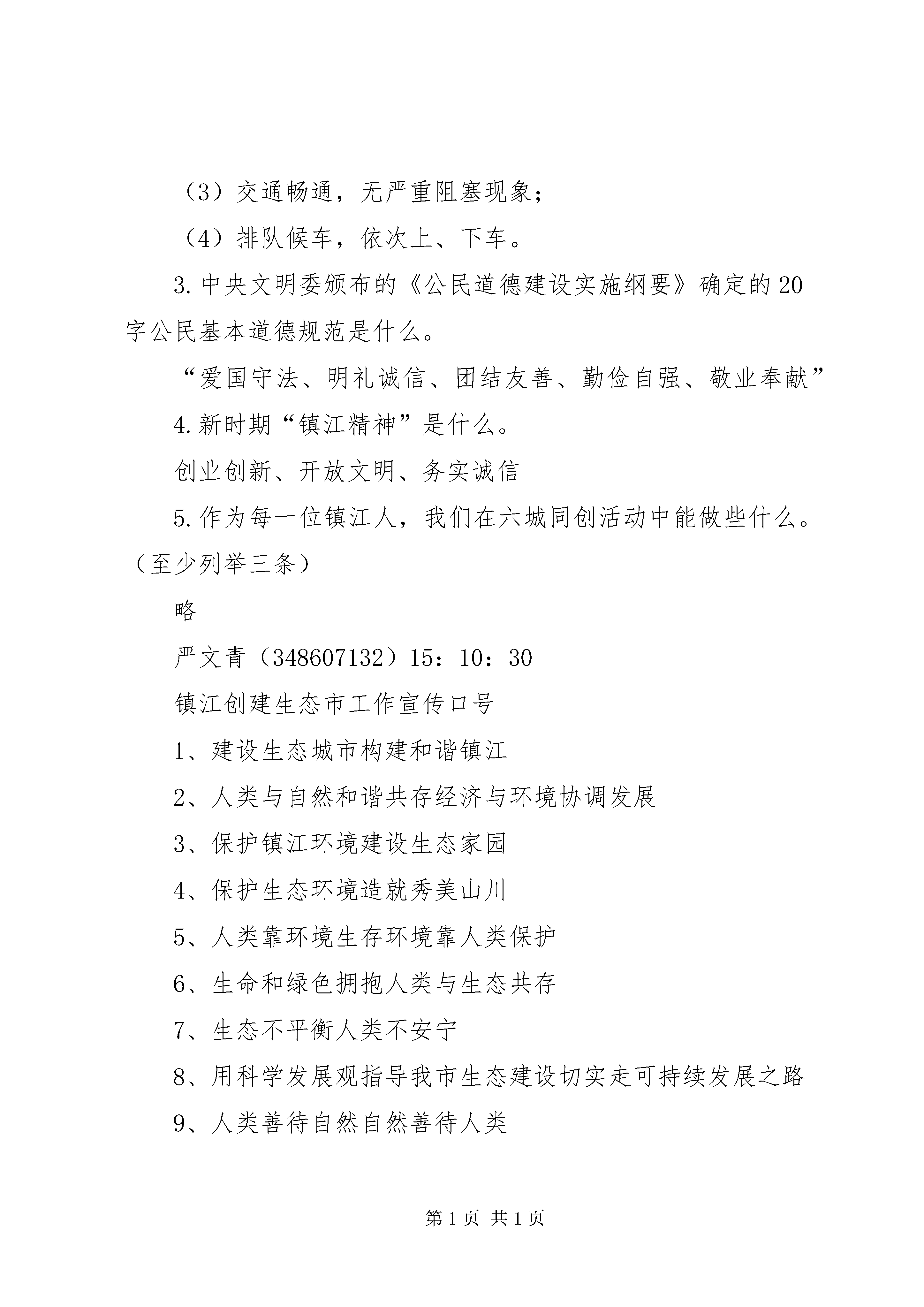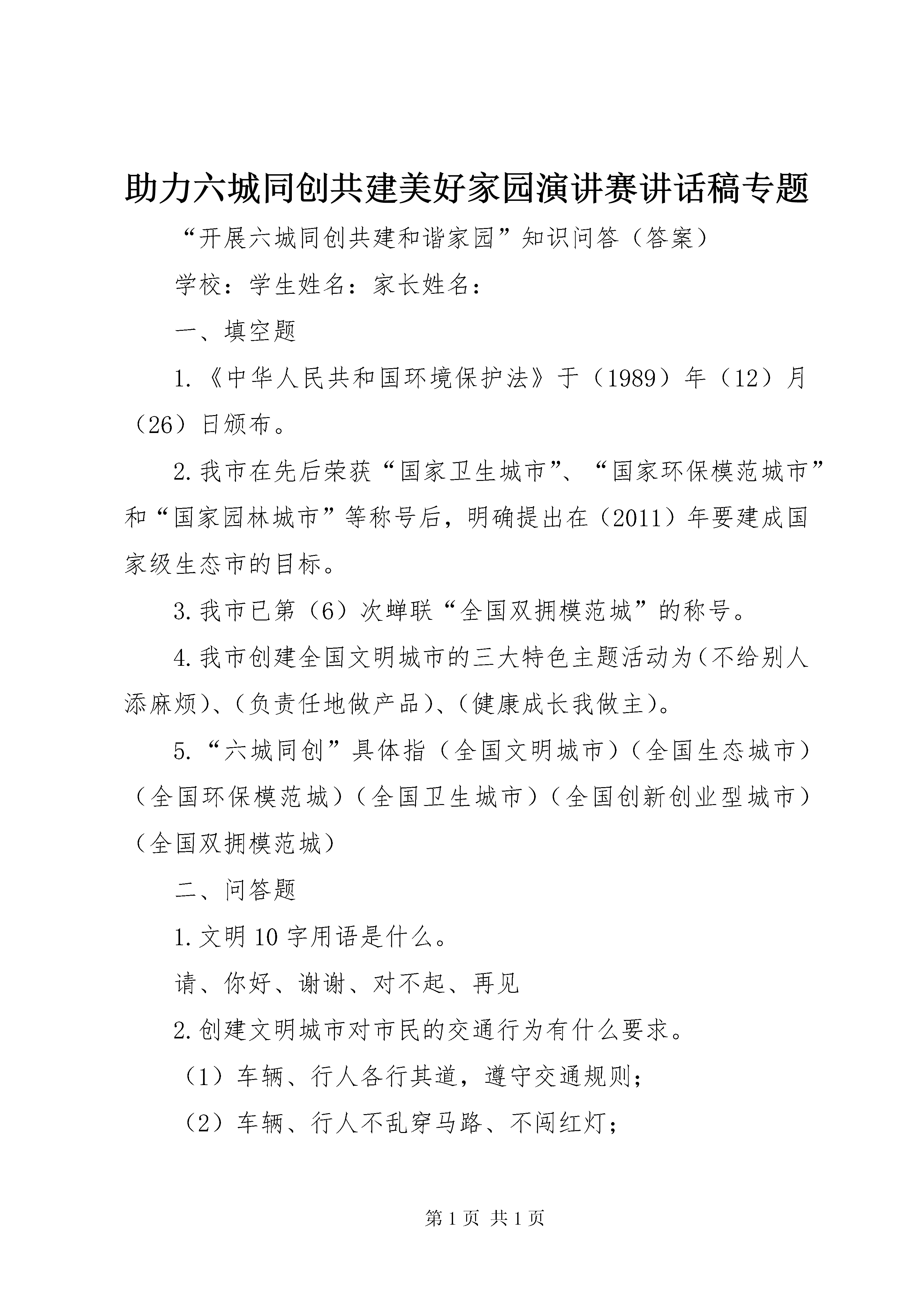 助力六城同创共建美好家园演讲赛讲话稿专题“开展六城同创共建和谐家园”知识问答(答案)学校:学生姓名:家长姓名:一、填空题1.《中华人民共和国环境保护法》于(1989)年(12)月(26)日颁布。2.我市在先后荣获“国家卫生城市”、“国家环保模范城市”和“国家园林城市”等称号后,明确提出在(2011)年要建成国家级生态市的目标。3.我市已第(6)次蝉联“全国双拥模范城”的称号。4.我市创建全国文明城市的三大特色主题活动为(不给别人添麻烦)、(负责任地做产品)、(健康成长我做主)。5.“六城同创”具体指(全国文明城市)(全国生态城市)(全国环保模范城)(全国卫生城市)(全国创新创业型城市)(全国双拥模范城)二、问答题1.文明10字用语是什么。请、你好、谢谢、对不起、再见2.创建文明城市对市民的交通行为有什么要求。(1)车辆、行人各行其道,遵守交通规则;(2)车辆、行人不乱穿马路、不闯红灯;(3)交通畅通,无严重阻塞现象;(4)排队候车,依次上、下车。3.中央文明委颁布的《公民道德建设实施纲要》确定的20字公民基本道德规范是什么。“爱国守法、明礼诚信、团结友善、勤俭自强、敬业奉献”4.新时期“镇江精神”是什么。创业创新、开放文明、务实诚信5.作为每一位镇江人,我们在六城同创活动中能做些什么。(至少列举三条)略严文青(348607132)15:10:30镇江创建生态市工作宣传口号1、建设生态城市构建和谐镇江2、人类与自然和谐共存经济与环境协调发展3、保护镇江环境建设生态家园4、保护生态环境造就秀美山川5、人类靠环境生存环境靠人类保护6、生命和绿色拥抱人类与生态共存7、生态不平衡人类不安宁8、用科学发展观指导我市生态建设切实走可持续发展之路9、人类善待自然自然善待人类10、水源与生命时时相伴环保与发展息息相关11、你出力,我出力,环境保护齐努力;你添彩,我添彩,魅力镇江更精彩。12、倡导低碳新时尚和谐镇江共分享13、一草一木给镇江添彩一举一动为环保增辉14、群策群力创环保城市同心同德建绿色镇江15、倡导低碳生活同创绿色镇江16、节能减排一起来生态镇江更精彩17、手拉手参与环境保护心连心关爱美丽镇江18、节能减排个个出力绿色镇江人人受益19、山美水美镇江美真情友情环保情20、一草一木凝聚镇江美景一心一意共建宜居家园