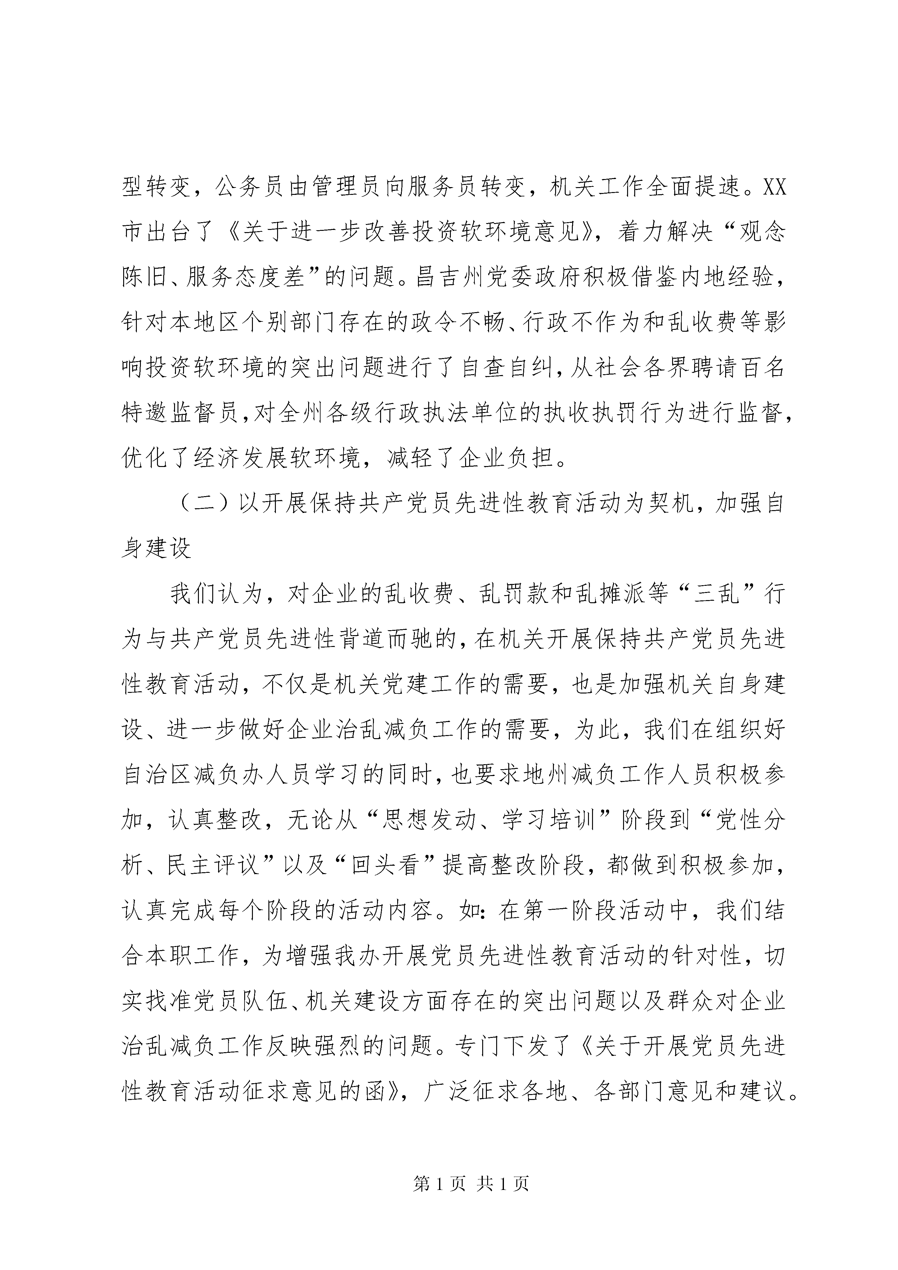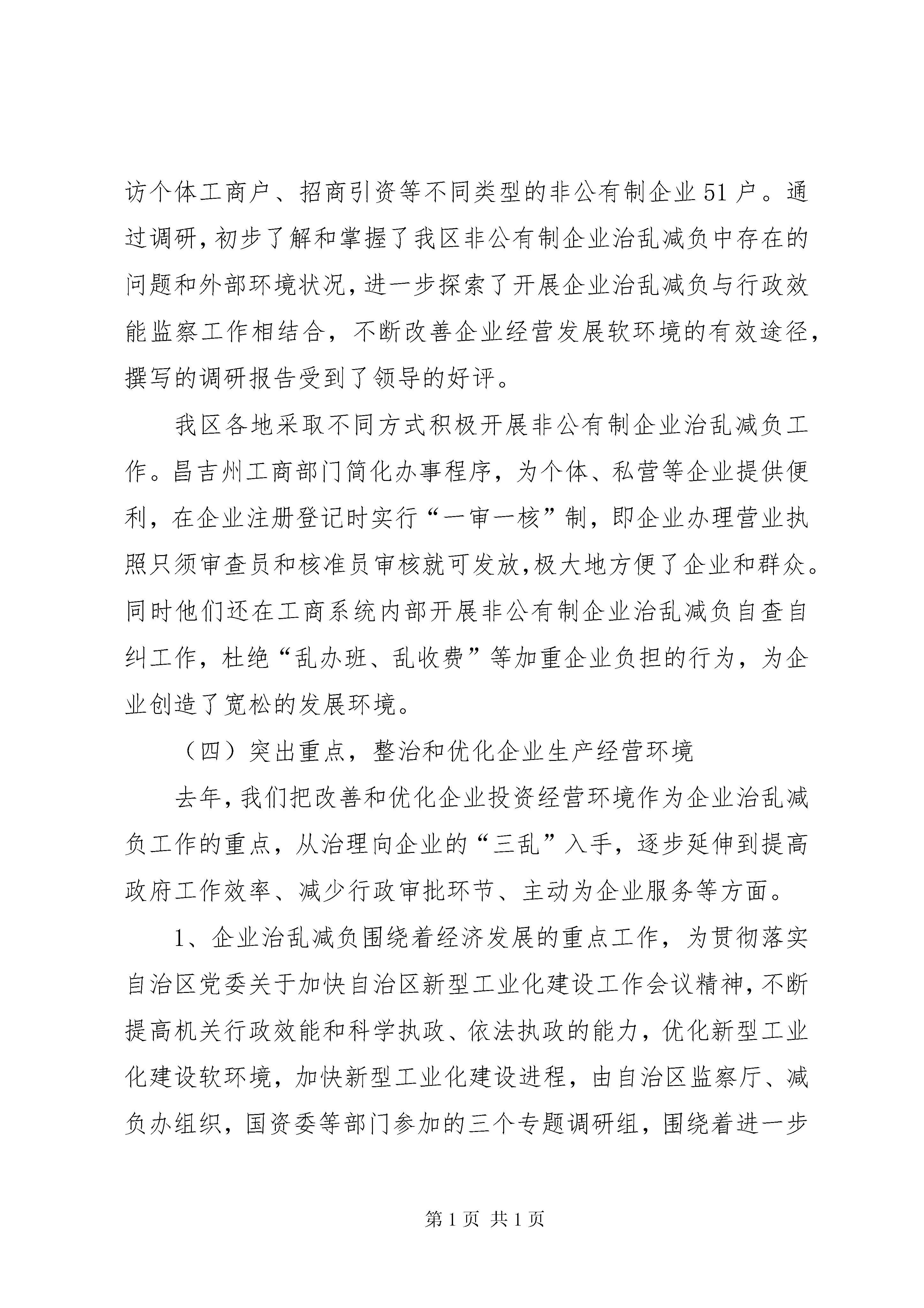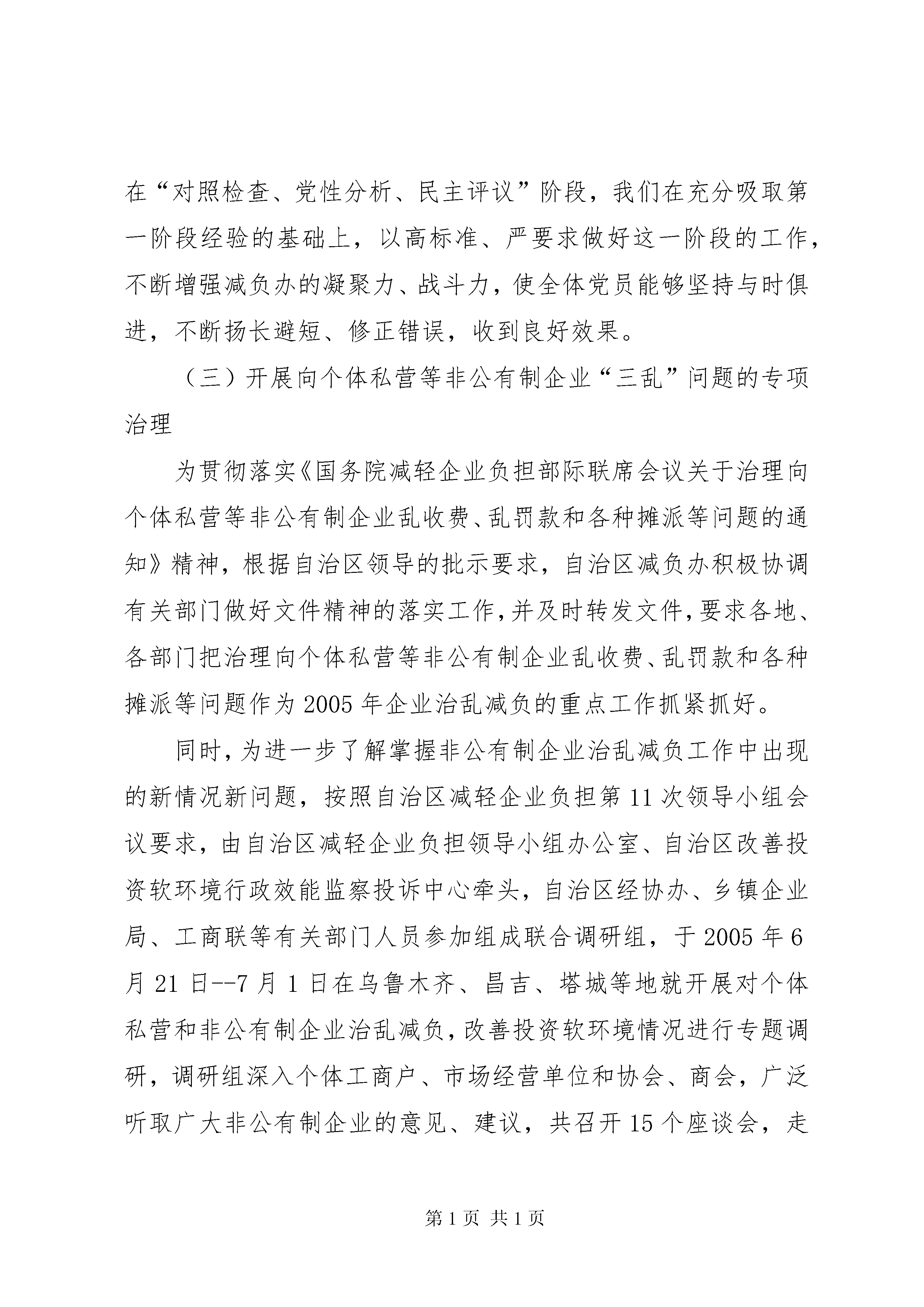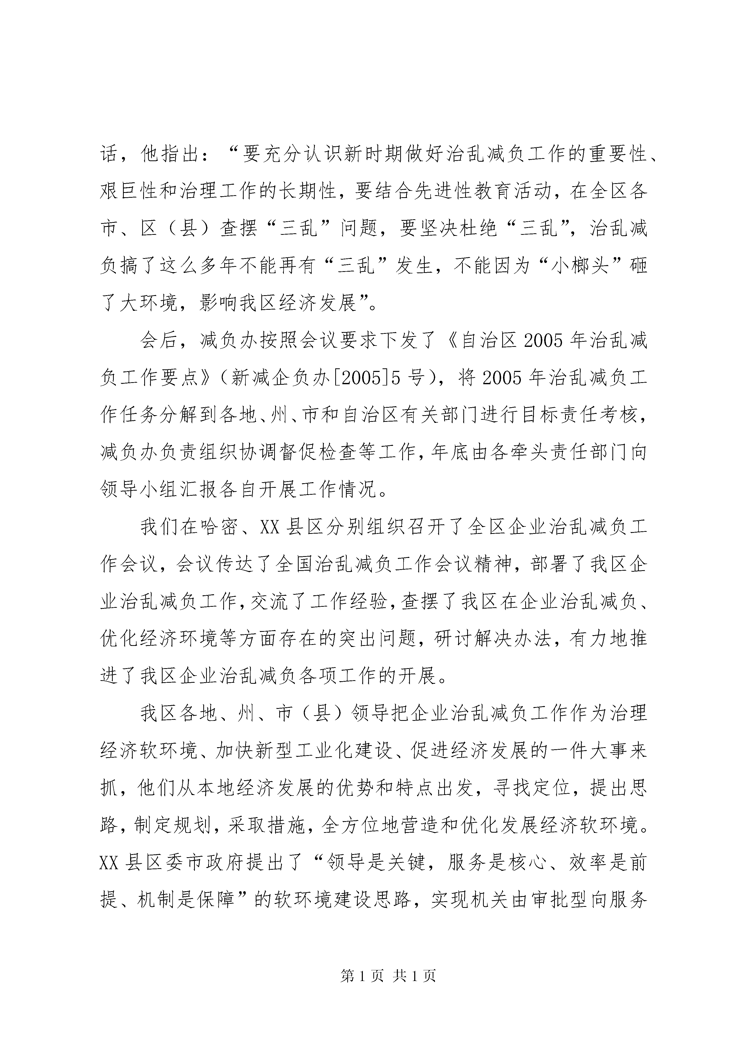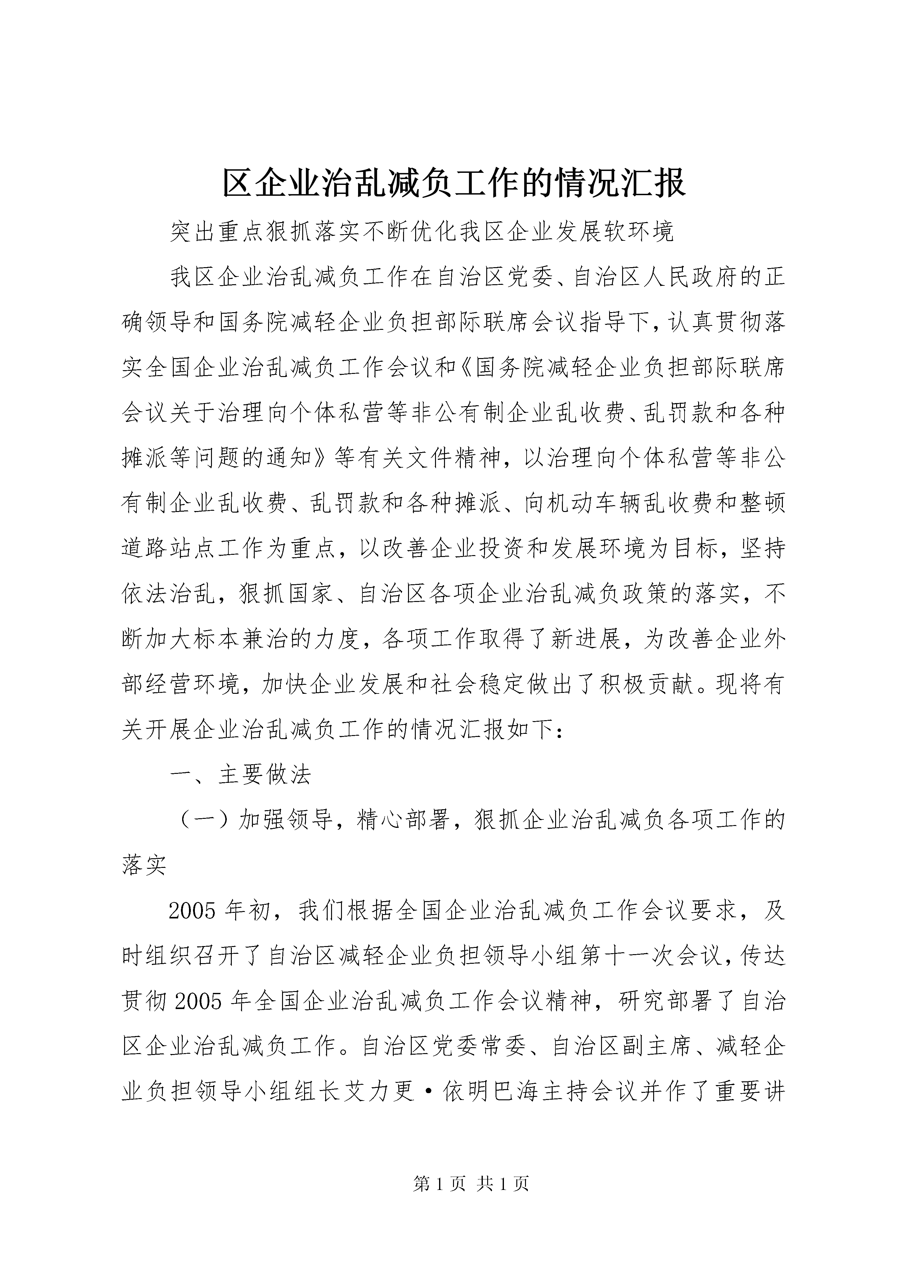 区企业治乱减负工作的情况汇报突出重点狠抓落实不断优化我区企业发展软环境我区企业治乱减负工作在自治区党委、自治区人民政府的正确领导和国务院减轻企业负担部际联席会议指导下,认真贯彻落实全国企业治乱减负工作会议和《国务院减轻企业负担部际联席会议关于治理向个体私营等非公有制企业乱收费、乱罚款和各种摊派等问题的通知》等有关文件精神,以治理向个体私营等非公有制企业乱收费、乱罚款和各种摊派、向机动车辆乱收费和整顿道路站点工作为重点,以改善企业投资和发展环境为目标,坚持依法治乱,狠抓国家、自治区各项企业治乱减负政策的落实,不断加大标本兼治的力度,各项工作取得了新进展,为改善企业外部经营环境,加快企业发展和社会稳定做出了积极贡献。现将有关开展企业治乱减负工作的情况汇报如下:一、主要做法(一)加强领导,精心部署,狠抓企业治乱减负各项工作的落实2005年初,我们根据全国企业治乱减负工作会议要求,及时组织召开了自治区减轻企业负担领导小组第十一次会议,传达贯彻2005年全国企业治乱减负工作会议精神,研究部署了自治区企业治乱减负工作。自治区党委常委、自治区副主席、减轻企业负担领导小组组长艾力更·依明巴海主持会议并作了重要讲话,他指出:“要充分认识新时期做好治乱减负工作的重要性、艰巨性和治理工作的长期性,要结合先进性教育活动,在全区各市、区(县)查摆“三乱”问题,要坚决杜绝“三乱”,治乱减负搞了这么多年不能再有“三乱”发生,不能因为“小榔头”砸了大环境,影响我区经济发展”。会后,减负办按照会议要求下发了《自治区2005年治乱减负工作要点》(新减企负办[2005]5号),将2005年治乱减负工作任务分解到各地、州、市和自治区有关部门进行目标责任考核,减负办负责组织协调督促检查等工作,年底由各牵头责任部门向领导小组汇报各自开展工作情况。我们在哈密、XX县区分别组织召开了全区企业治乱减负工作会议,会议传达了全国治乱减负工作会议精神,部署了我区企业治乱减负工作,交流了工作经验,查摆了我区在企业治乱减负、优化经济环境等方面存在的突出问题,研讨解决办法,有力地推进了我区企业治乱减负各项工作的开展。我区各地、州、市(县)领导把企业治乱减负工作作为治理经济软环境、加快新型工业化建设、促进经济发展的一件大事来抓,他们从本地经济发展的优势和特点出发,寻找定位,提出思路,制定规划,采取措施,全方位地营造和优化发展经济软环境。XX县区委市政府提出了“领导是关键,服务是核心、效率是前提、机制是保障”的软环境建设思路,实现机关由审批型向服务型转变,公务员由管理员向服务员转变,机关工作全面提速。XX市出台了《关于进一步改善投资软环境意见》,着力解决“观念陈旧、服务态度差”的问题。昌吉州党委政府积极借鉴内地经验,针对本地区个别部门存在的政令不畅、行政不作为和乱收费等影响投资软环境的突出问题进行了自查自纠,从社会各界聘请百名特邀监督员,对全州各级行政执法单位的执收执罚行为进行监督,优化了经济发展软环境,减轻了企业负担。(二)以开展保持共产党员先进性教育活动为契机,加强自身建设我们认为,对企业的乱收费、乱罚款和乱摊派等“三乱”行为与共产党员先进性背道而驰的,在机关开展保持共产党员先进性教育活动,不仅是机关党建工作的需要,也是加强机关自身建设、进一步做好企业治乱减负工作的需要,为此,我们在组织好自治区减负办人员学习的同时,也要求地州减负工作人员积极参加,认真整改,无论从“思想发动、学习培训”阶段到“党性分析、民主评议”以及“回头看”提高整改阶段,都做到积极参加,认真完成每个阶段的活动内容。如:在第一阶段活动中,我们结合本职工作,为增强我办开展党员先进性教育活动的针对性,切实找准党员队伍、机关建设方面存在的突出问题以及群众对企业治乱减负工作反映强烈的问题。专门下发了《关于开展党员先进性教育活动征求意见的函》,广泛征求各地、各部门意见和建议。在“对照检查、党性分析、民主评议”阶段,我们在充分吸取第一阶段经验的基础上,以高标准、严要求做好这一阶段的工作,不断增强减负办的凝聚力、战斗力,使全体党员能够坚持与时俱进,不断扬长避短、修正错误,收到良好效果。(三)开展向个体私营等非公有制企业“三乱”问题的专项治理为贯彻落实《国务院减轻企业负担部际联席会议关于治理向个体私营等非公有制企业乱收费、乱罚款和各种摊派等问题的通知》精神,根据自治区领导的批示要求,自治区减负办积极协调有关部门做好文件精神的落实工作,并及时转发文件,要求各地、各部门把治理向个体私营等非公有制企业乱收费、乱罚款和各种摊派等问题作为2005年企业治乱减负的重点工作抓紧抓好。同时,为进一步了解掌握非公有制企业治乱减负工作中出现的新情况新问题,按照自治区减轻企业负担第11次领导小组会议要求,由自治区减轻企业负担领导小组