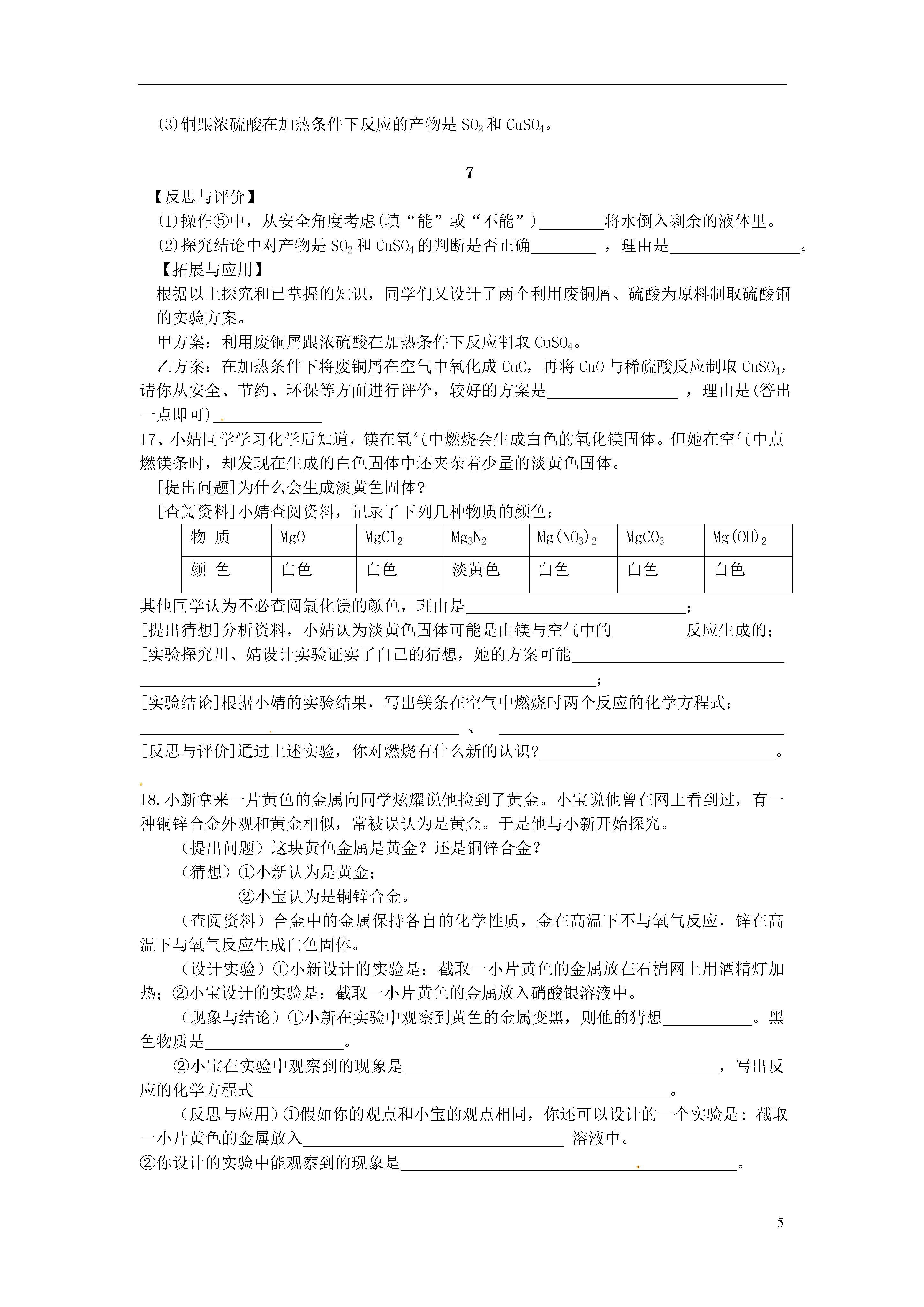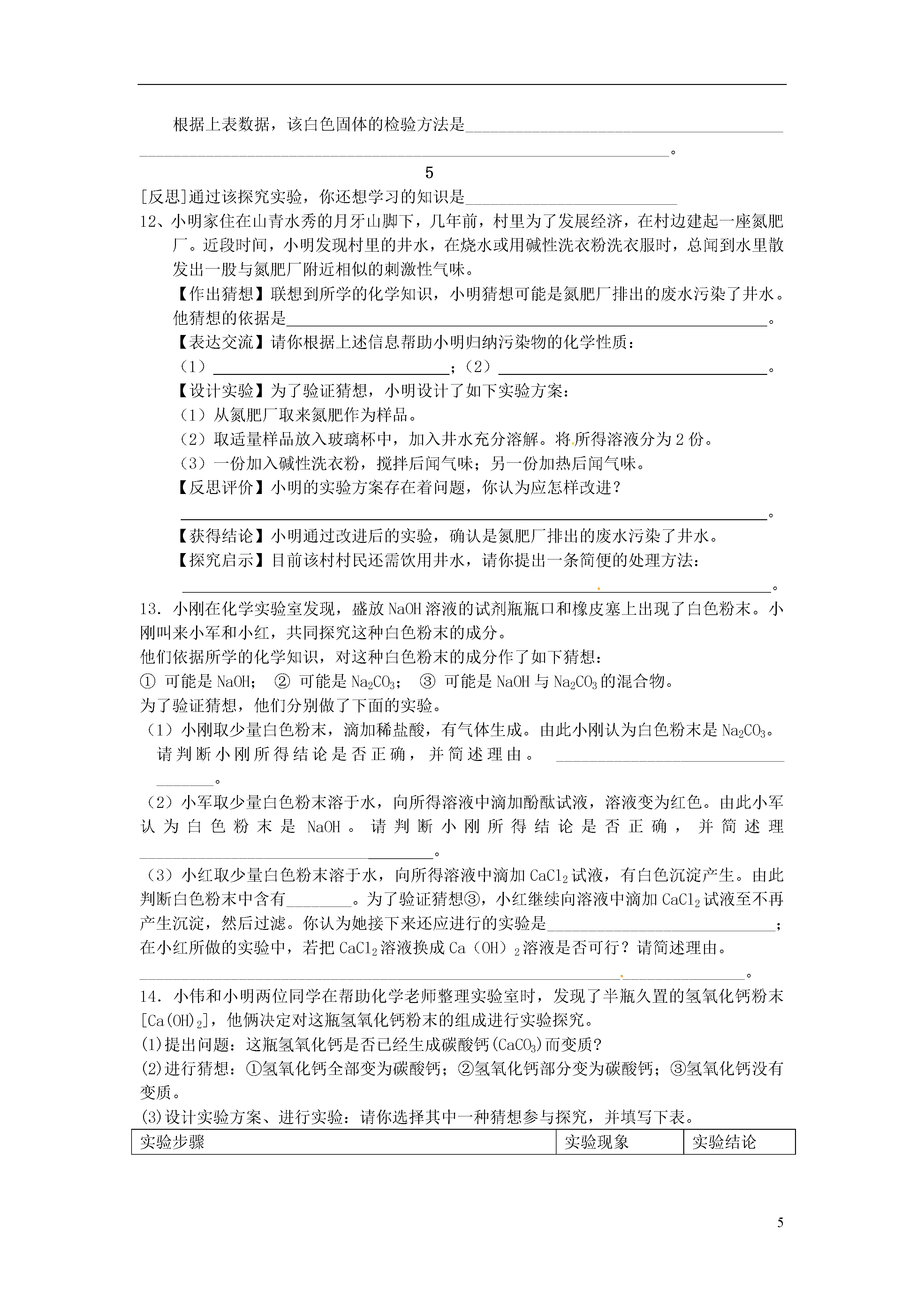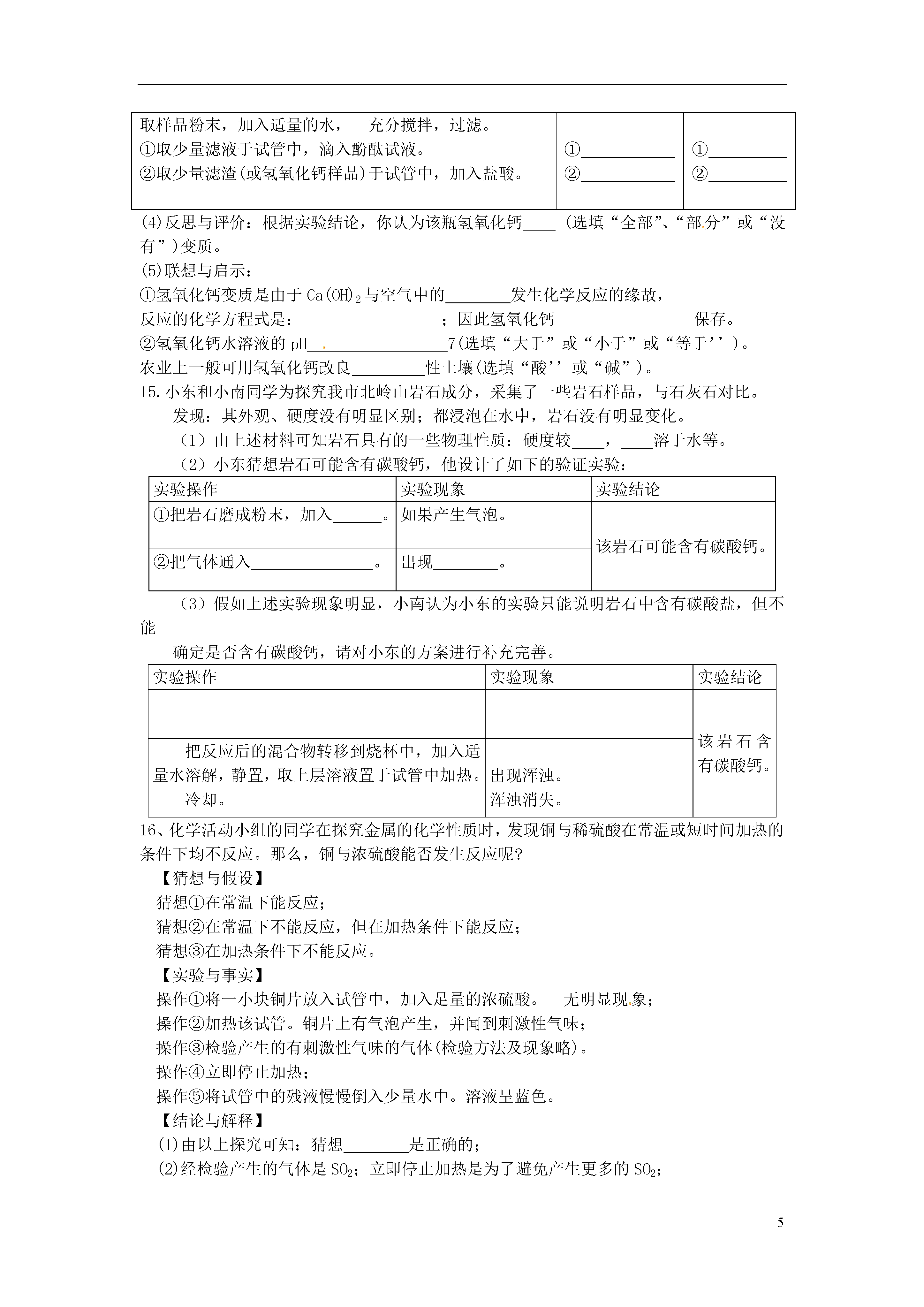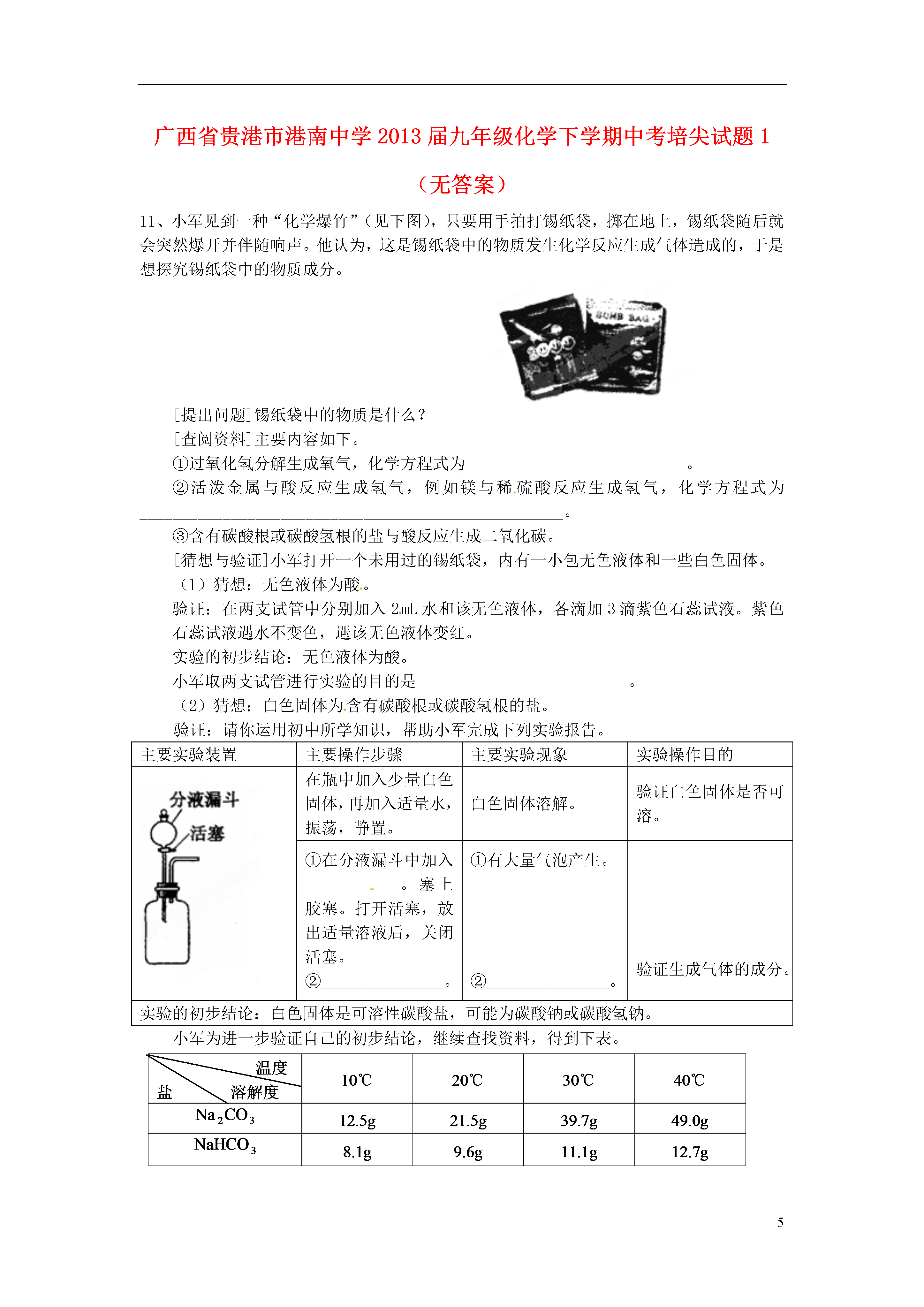 5广西省贵港市港南中学2013届九年级化学下学期中考培尖试题1(无答案)11、小军见到一种“化学爆竹”(见下图),只要用手拍打锡纸袋,掷在地上,锡纸袋随后就会突然爆开并伴随响声。他认为,这是锡纸袋中的物质发生化学反应生成气体造成的,于是想探究锡纸袋中的物质成分。[提出问题]锡纸袋中的物质是什么?[查阅资料]主要内容如下。①过氧化氢分解生成氧气,化学方程式为___________________________。②活泼金属与酸反应生成氢气,例如镁与稀硫酸反应生成氢气,化学方程式为____________________________________________________。③含有碳酸根或碳酸氢根的盐与酸反应生成二氧化碳。[猜想与验证]小军打开一个未用过的锡纸袋,内有一小包无色液体和一些白色固体。(l)猜想:无色液体为酸。验证:在两支试管中分别加入2mL水和该无色液体,各滴加3滴紫色石蕊试液。紫色石蕊试液遇水不变色,遇该无色液体变红。实验的初步结论:无色液体为酸。小军取两支试管进行实验的目的是__________________________。(2)猜想:白色固体为含有碳酸根或碳酸氢根的盐。验证:请你运用初中所学知识,帮助小军完成下列实验报告。主要实验装置主要操作步骤主要实验现象实验操作目的在瓶中加入少量白色固体,再加入适量水,振荡,静置。白色固体溶解。验证白色固体是否可溶。①在分液漏斗中加入___________。塞上胶塞。打开活塞,放出适量溶液后,关闭活塞。②_______________。①有大量气泡产生。②_______________。验证生成气体的成分。实验的初步结论:白色固体是可溶性碳酸盐,可能为碳酸钠或碳酸氢钠。小军为进一步验证自己的初步结论,继续查找资料,得到下表。根据上表数据,该白色固体的检验方法是________________________________________________________________________________________________________。5[反思]通过该探究实验,你还想学习的知识是__________________________12、小明家住在山青水秀的月牙山脚下,几年前,村里为了发展经济,在村边建起一座氮肥厂。近段时间,小明发现村里的井水,在烧水或用碱性洗衣粉洗衣服时,总闻到水里散发出一股与氮肥厂附近相似的刺激性气味。【作出猜想】联想到所学的化学知识,小明猜想可能是氮肥厂排出的废水污染了井水。他猜想的依据是。【表达交流】请你根据上述信息帮助小明归纳污染物的化学性质:(1);(2)。【设计实验】为了验证猜想,小明设计了如下实验方案:(1)从氮肥厂取来氮肥作为样品。(2)取适量样品放入玻璃杯中,加入井水充分溶解。将所得溶液分为2份。(3)一份加入碱性洗衣粉,搅拌后闻气味;另一份加热后闻气味。【反思评价】小明的实验方案存在着问题,你认为应怎样改进?。【获得结论】小明通过改进后的实验,确认是氮肥厂排出的废水污染了井水。【探究启示】目前该村村民还需饮用井水,请你提出一条简便的处理方法:。13.小刚在化学实验室发现,盛放NaOH溶液的试剂瓶瓶口和橡皮塞上出现了白色粉末。小刚叫来小军和小红,共同探究这种白色粉末的成分。他们依据所学的化学知识,对这种白色粉末的成分作了如下猜想:①可能是NaOH;②可能是Na2CO3;③可能是NaOH与Na2CO3的混合物。为了验证猜想,他们分别做了下面的实验。(1)小刚取少量白色粉末,滴加稀盐酸,有气体生成。由此小刚认为白色粉末是Na2CO3。请判断小刚所得结论是否正确,并简述理由。___________________________________。(2)小军取少量白色粉末溶于水,向所得溶液中滴加酚酞试液,溶液变为红色。由此小军认为白色粉末是NaOH。请判断小刚所得结论是否正确,并简述理____________________________。(3)小红取少量白色粉末溶于水,向所得溶液中滴加CaCl2试液,有白色沉淀产生。由此判断白色粉末中含有________。为了验证猜想③,小红继续向溶液中滴加CaCl2试液至不再产生沉淀,然后过滤。你认为她接下来还应进行的实验是____________________________;在小红所做的实验中,若把CaCl2溶液换成Ca(OH)2溶液是否可行?请简述理由。__________________________________________________________________________。14.小伟和小明两位同学在帮助化