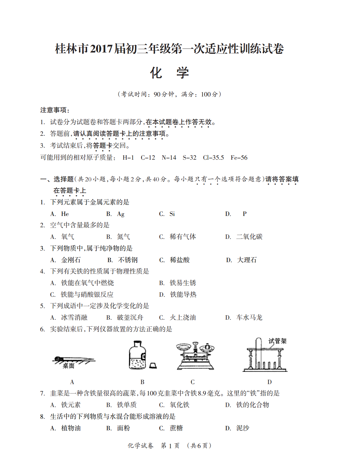 试题-广西-2017_广西桂林市2017届九年级化学下学期第一次适应性训练(中考模拟)试题(pdf).rar