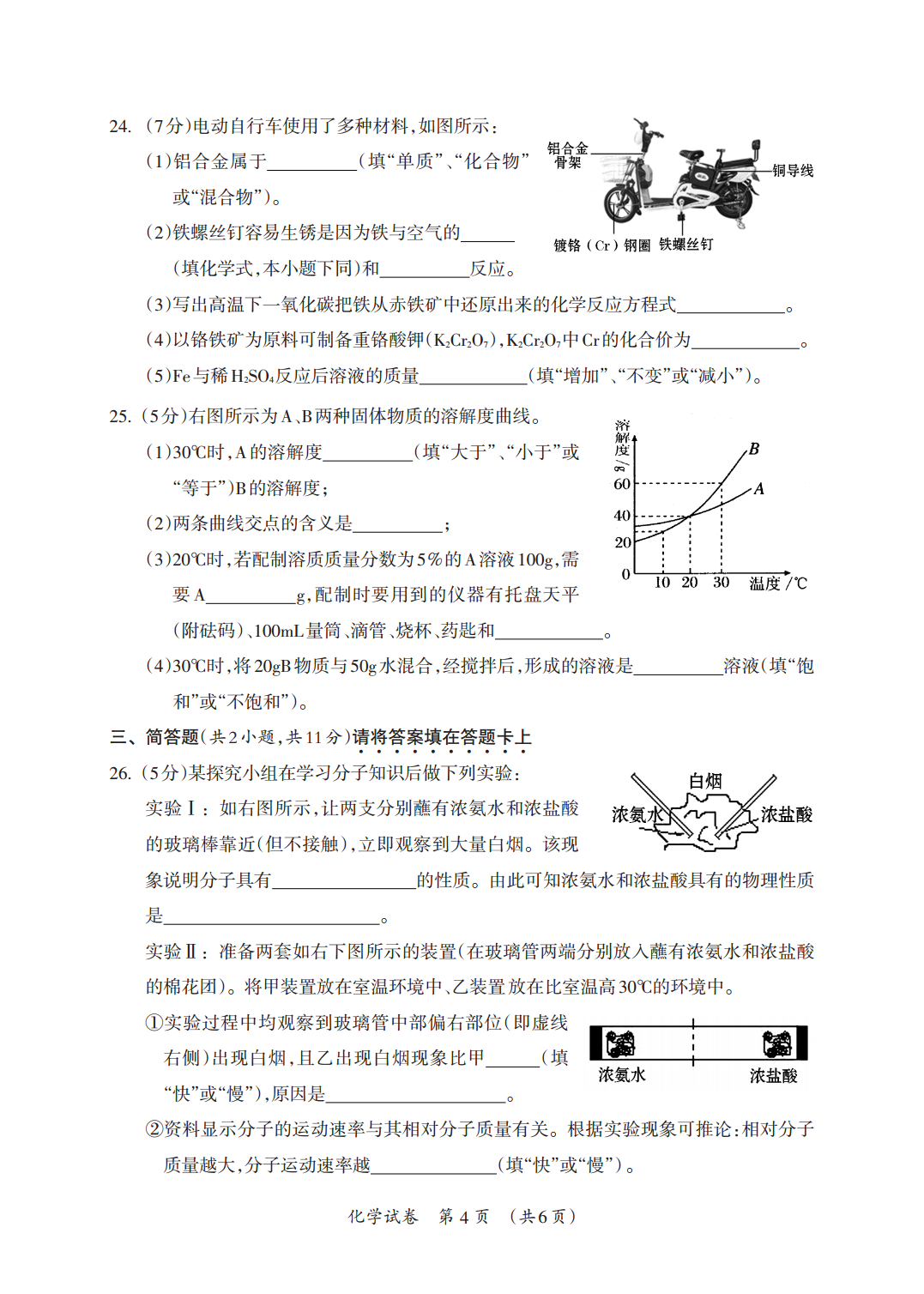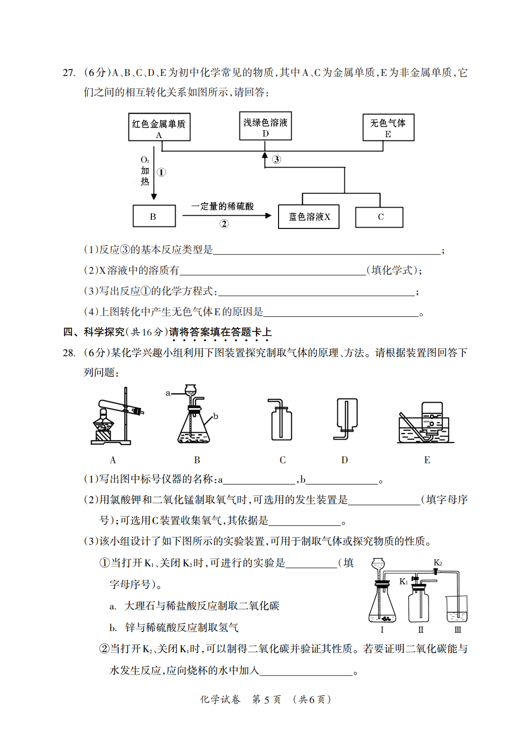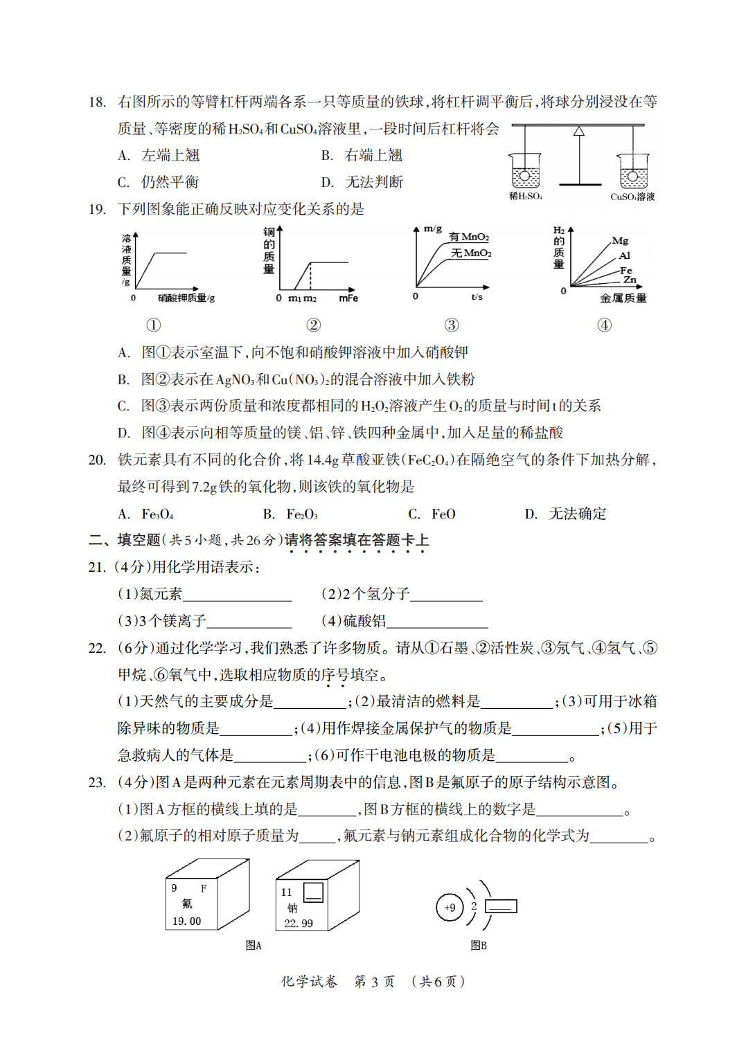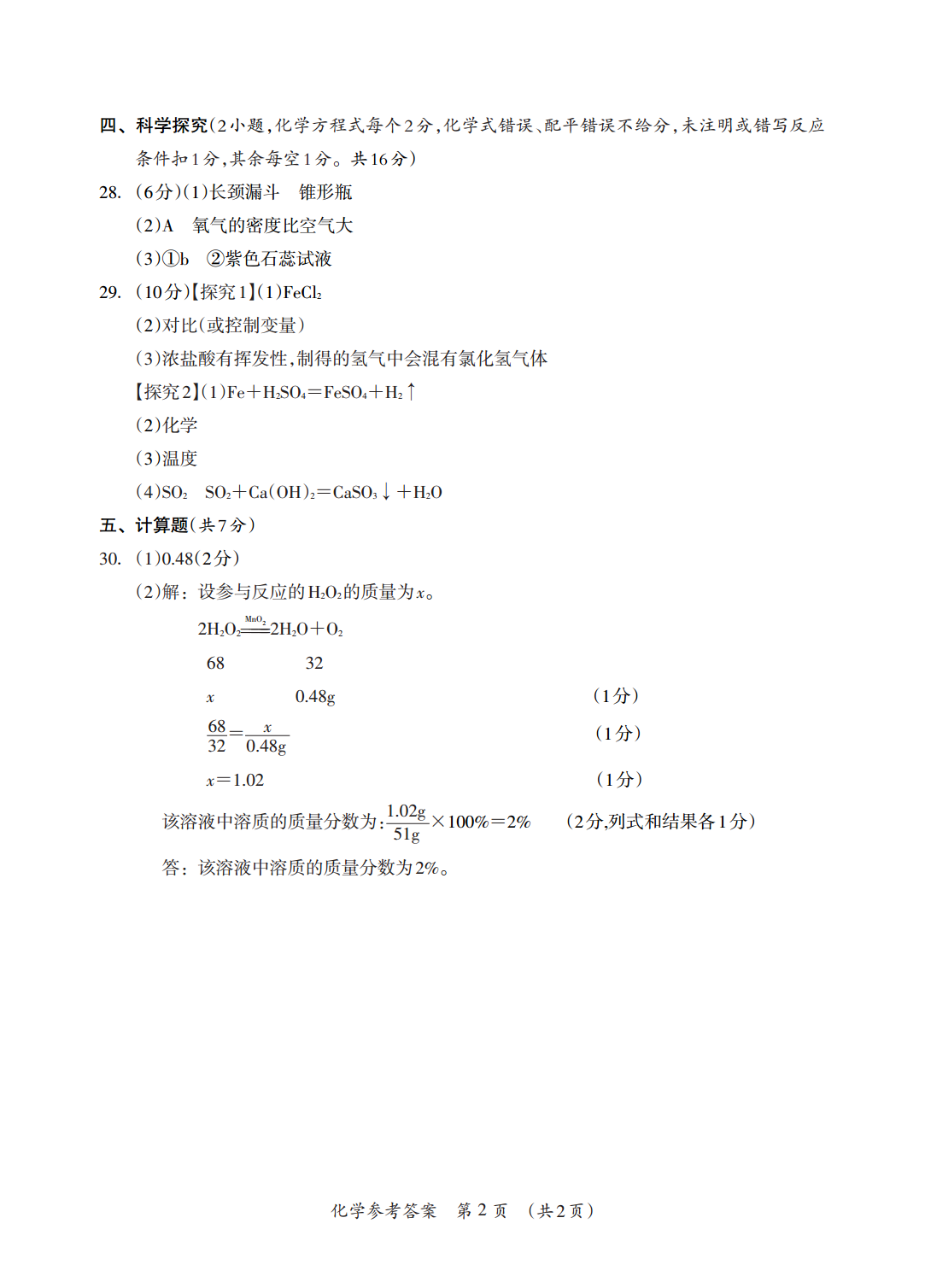 桂林市2017届初三年级第一次适应性训练参考答案及评分标准化学一、单项选择题(每小题2分,共40分。每小题只有一个正确答案,多选、错选均不得分)题号12345678910答案BBADCDACAD题号11121314151617181920答案BBCBDCAABC二、填空题(共5小题,化学方程式每个2分,化学式错误、配平错误不给分,未注明或错写反应条件扣1分,其余每空1分。共26分)2+21.(4分)(1)N(2)2H2(3)3Mg(4)Al(2SO4)322.(6分)(1)⑤(2)④(3)②(4)③(5)⑥(6)①23.(4分)(1)Na7(2)19.00NaF24.(7分)(1)混合物(2)O2H2O(不要求顺序)高温(3)Fe2O3+3CO====2Fe+3CO2(4)+6(5)增加25.(5分)(1)小于(2)20℃时,A、B两物质的溶解度相同(或20℃时,A、B两物质的溶解度均为40g)(3)5玻璃棒(4)不饱和三、简答题(共2小题,化学方程式每个2分,化学式错误、配平错误不给分,未注明或错写反应条件扣1分,27题(2)2分,其余每空1分。共11分)26.(5分)实验Ⅰ:不停地运动易挥发实验Ⅱ:①快温度越高,分子运动速率越快②慢27.(6分)(1)置换反应(2)CuSO4H2SO(42分,写对一个化学式得1分,但一对一错不给分)△(3)2Cu+O2==2CuO(4)过量的稀硫酸和单质铁发生了反应化学参考答案()四、科学探究(2小题,化学方程式每个2分,化学式错误、配平错误不给分,未注明或错写反应条件扣1分,其余每空1分。共16分)28.(6分)(1)长颈漏斗锥形瓶(2)A氧气的密度比空气大(3)①b②紫色石蕊试液29.(10分)【探究1】(1)FeCl2(2)对比(或控制变量)(3)浓盐酸有挥发性,制得的氢气中会混有氯化氢气体【探究2】(1)Fe+H2SO4=FeSO4+H2↑(2)化学(3)温度(4)SO2SO2+Ca(OH)2=CaSO3↓+H2O五、计算题(共7分)30.(1)0.48(2分)(2)解:设参与反应的H2O2的质量为x。MnO22H2O2=====2H2O+O26832x0.48g(1分)68=x(1分)320.48gx=1.02(1分)1.02g该溶液中溶质的质量分数为: 100%=2%(2分,列式和结果各1分)51g答:该溶液中溶质的质量分数为2%。化学参考答案()桂林市2017届初三年级第一次适应性训练试卷化学(考试时间:90分钟,满分:100分)注意事项:1.试卷分为试题卷和答题卡两部分,在本试题卷上作答无效。 2.答题前,请认真阅读答题卡上的注意事项。 3.考试结束后,将答题卡交回。 可能用到的相对原子质量:H-1C-12N-14S-32Cl-35.5Fe-56一、选择题(共20小题,每小题2分,共40分。每小题只有一个选项符合题意)请将答案填 在答题卡上 1.下列元素属于金属元素的是A.HeB.AgC.SiD.P2.空气中含量最多的是A.氧气B.氮气C.稀有气体D.二氧化碳3.下列物质中,属于纯净物的是A.金刚石B.不锈钢C.稀盐酸D.大理石4.下列有关铁的性质属于物理性质是A.铁能在氧气中燃烧B.铁易生锈C.铁能与硝酸银反应D.铁能导热5.下列成语中一定涉及化学变化的是A.冰雪消融B.破釜沉舟C.火上浇油D.车水马龙6.实验结束后,下列仪器放置的方法正确的是ABCD7.韭菜是一种含铁量很高的蔬菜,每100克韭菜中含铁8.9毫克。这里的“铁”指的是A.铁元素B.铁单质C.氧化铁D.铁的化合物8.生活中的下列物质与水混合能形成溶液的是A.植物油B.面粉C.蔗糖D.泥沙化学试卷()9.“吸烟有害健康”。烟草燃烧释放的物质中,能与血红蛋白结合引起人体中毒的是A.一氧化碳B.二氧化碳C.尼古丁D.焦油10.下列做法,与自来水的净化过程无关的是 A.沉降B.消毒C.吸附D.电解11.氧气由液态转化为气态的过程中,发生变化的是A.分子体积B.分子的间隔C.氧气的化学性质D.分子总数12.如图是电解水实验的示意图,下列说法符合事实的是A.图中表示的是H2B.该反应遵守质量守恒定律C.该实验说明水里有氢气和氧气D.负极与正极产生气体的质量比是2∶113.有一种以甲醇为原料的新型手机电池,其容量为锂电池的l0倍,可连续使用1个月。其
