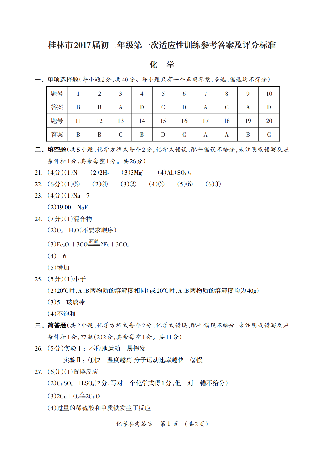 广西桂林市2017届九年级化学下学期第一次适应性训练(中考模拟)试题答案(pdf).pdf