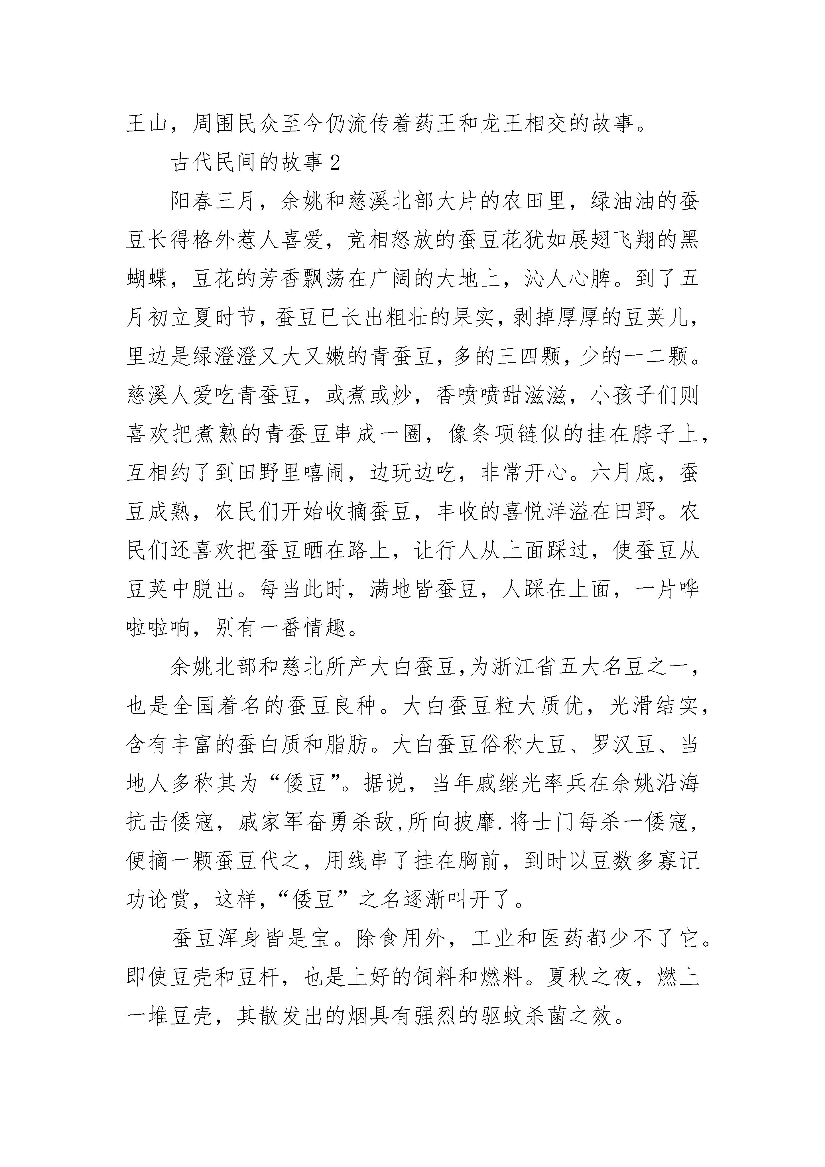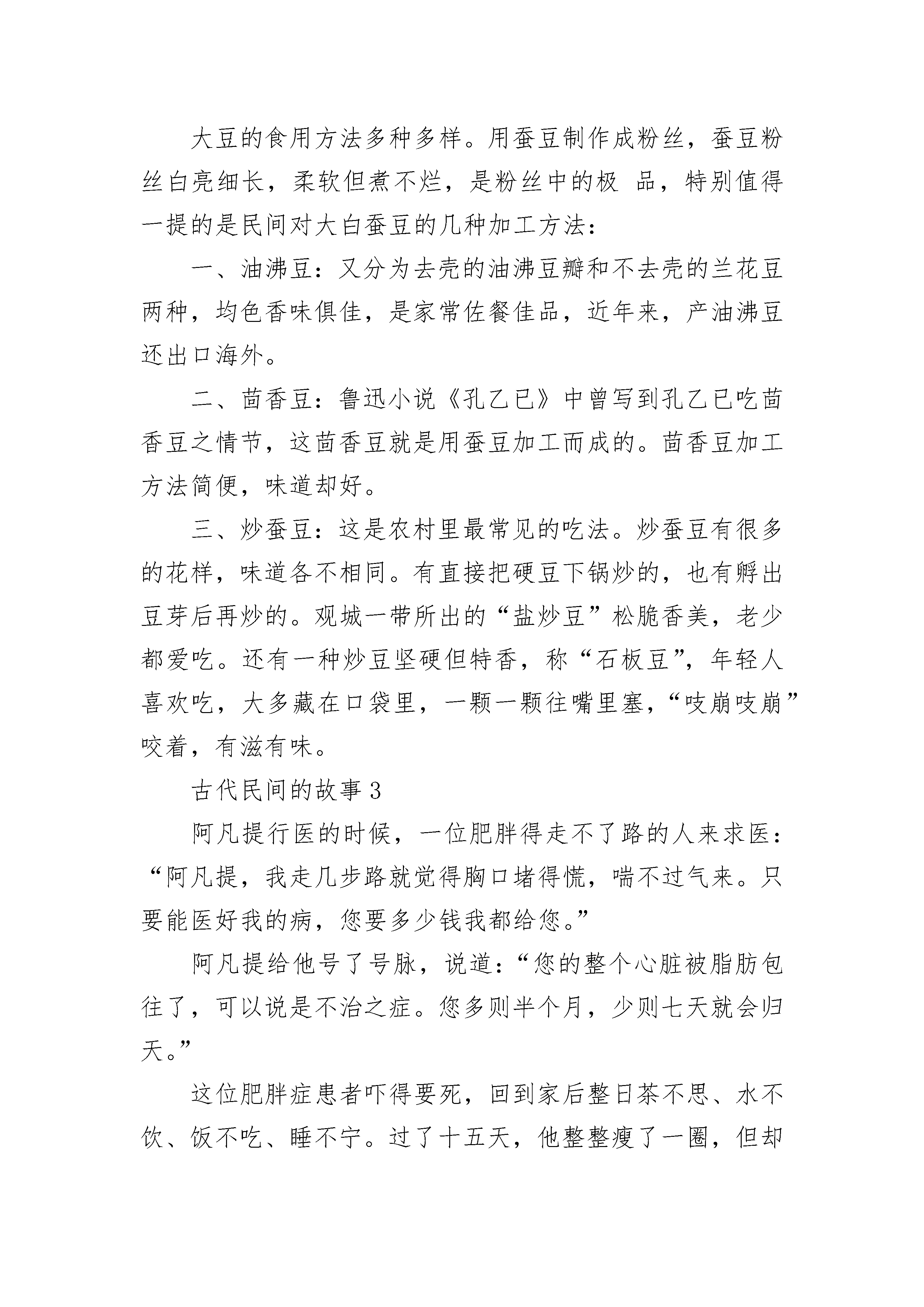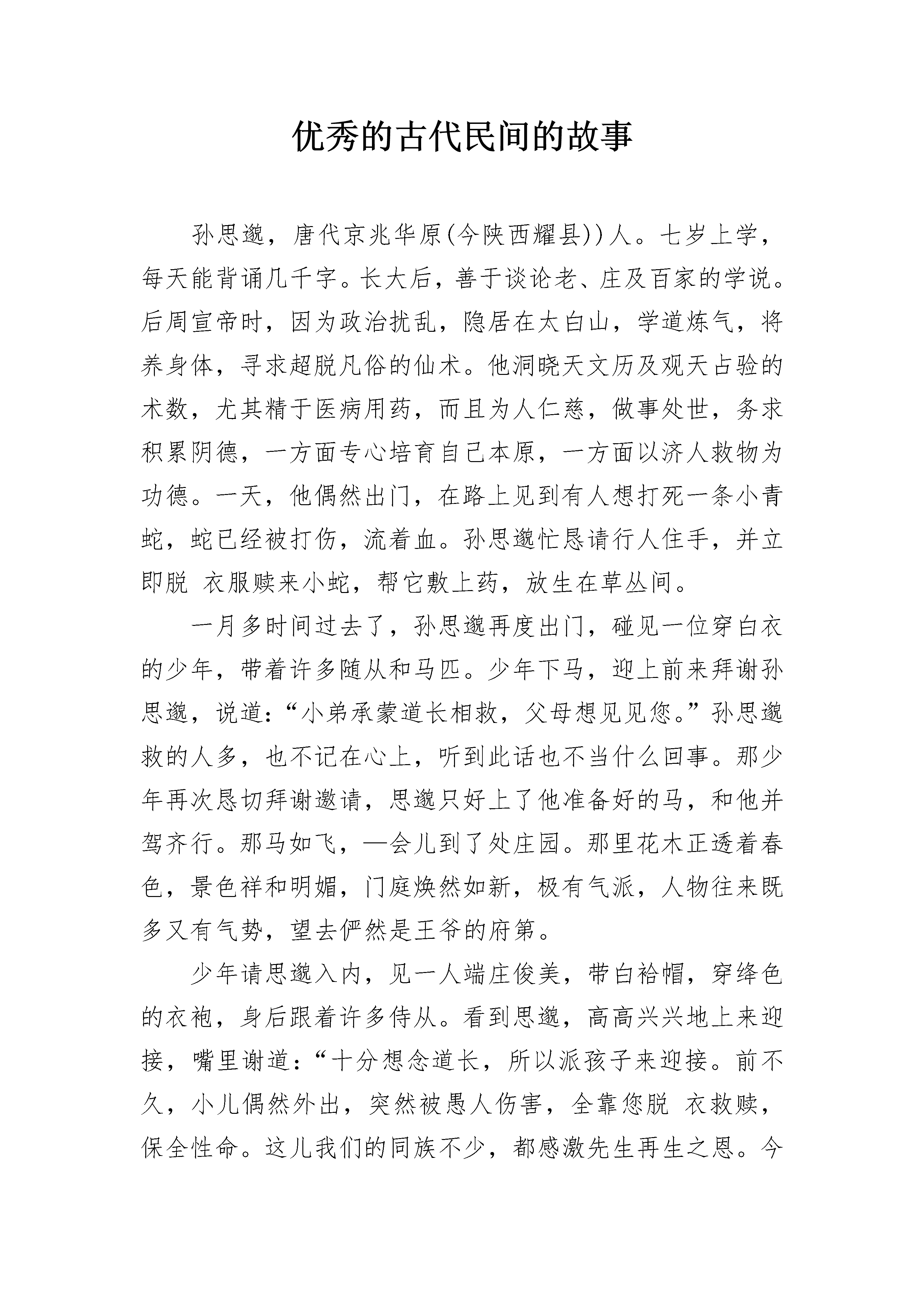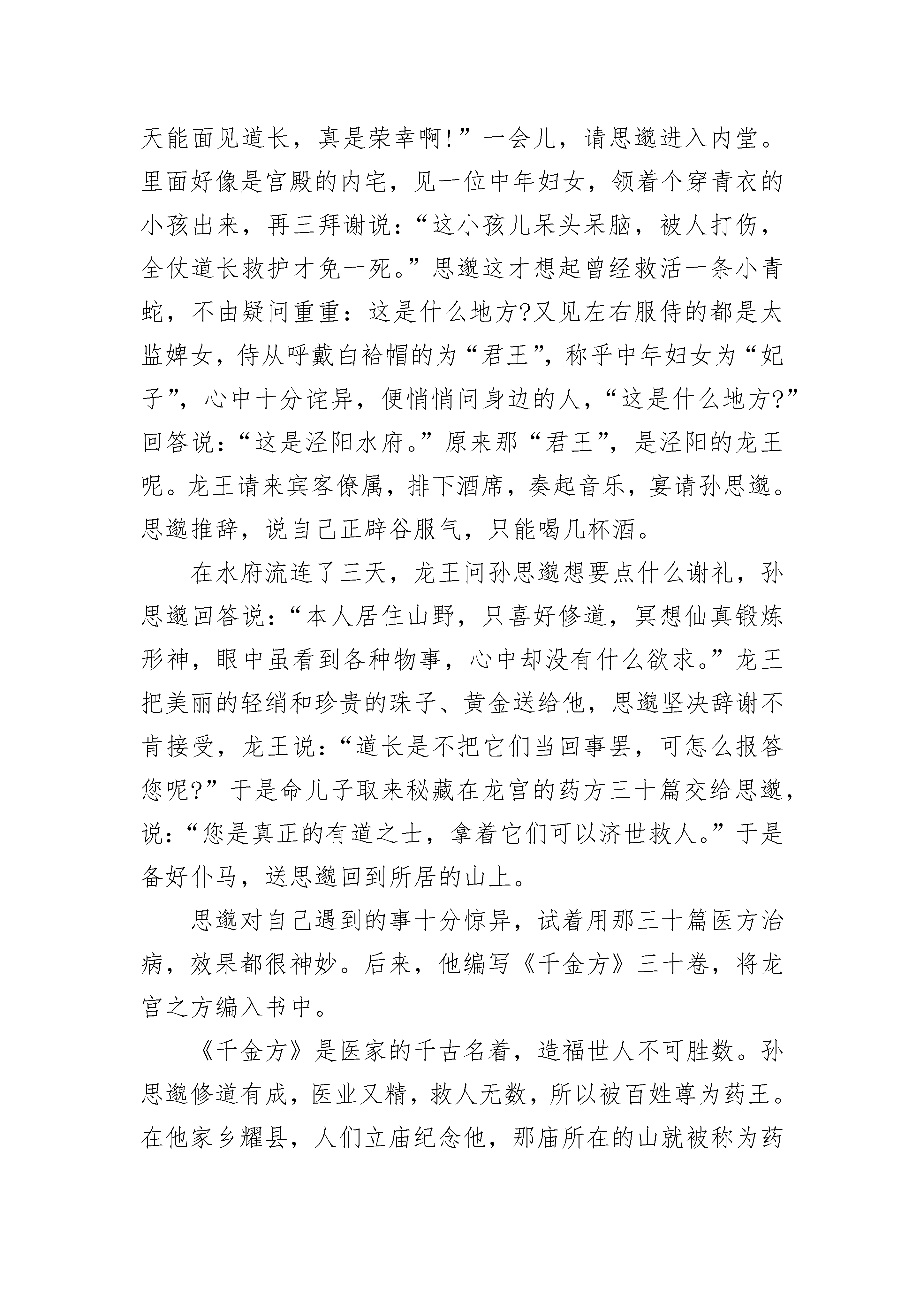 优秀的古代民间的故事孙思邈,唐代京兆华原(今陕西耀县))人。七岁上学,每天能背诵几千字。长大后,善于谈论老、庄及百家的学说。后周宣帝时,因为政治扰乱,隐居在太白山,学道炼气,将养身体,寻求超脱凡俗的仙术。他洞晓天文历及观天占验的术数,尤其精于医病用药,而且为人仁慈,做事处世,务求积累阴德,一方面专心培育自己本原,一方面以济人救物为功德。一天,他偶然出门,在路上见到有人想打死一条小青蛇,蛇已经被打伤,流着血。孙思邈忙恳请行人住手,并立即脱衣服赎来小蛇,帮它敷上药,放生在草丛间。一月多时间过去了,孙思邈再度出门,碰见一位穿白衣的少年,带着许多随从和马匹。少年下马,迎上前来拜谢孙思邈,说道:“小弟承蒙道长相救,父母想见见您。”孙思邈救的人多,也不记在心上,听到此话也不当什么回事。那少年再次恳切拜谢邀请,思邈只好上了他准备好的马,和他并驾齐行。那马如飞,—会儿到了处庄园。那里花木正透着春色,景色祥和明媚,门庭焕然如新,极有气派,人物往来既多又有气势,望去俨然是王爷的府第。少年请思邈入内,见一人端庄俊美,带白袷帽,穿绛色的衣袍,身后跟着许多侍从。看到思邈,高高兴兴地上来迎接,嘴里谢道:“十分想念道长,所以派孩子来迎接。前不久,小儿偶然外出,突然被愚人伤害,全靠您脱衣救赎,保全性命。这儿我们的同族不少,都感激先生再生之恩。今天能面见道长,真是荣幸啊!”一会儿,请思邈进入内堂。里面好像是宫殿的内宅,见一位中年妇女,领着个穿青衣的小孩出来,再三拜谢说:“这小孩儿呆头呆脑,被人打伤,全仗道长救护才免一死。”思邈这才想起曾经救活一条小青蛇,不由疑问重重:这是什么地方?又见左右服侍的都是太监婢女,侍从呼戴白袷帽的为“君王”,称乎中年妇女为“妃子”,心中十分诧异,便悄悄问身边的人,“这是什么地方?”回答说:“这是泾阳水府。”原来那“君王”,是泾阳的龙王呢。龙王请来宾客僚属,排下酒席,奏起音乐,宴请孙思邈。思邈推辞,说自己正辟谷服气,只能喝几杯酒。在水府流连了三天,龙王问孙思邈想要点什么谢礼,孙思邈回答说:“本人居住山野,只喜好修道,冥想仙真锻炼形神,眼中虽看到各种物事,心中却没有什么欲求。”龙王把美丽的轻绡和珍贵的珠子、黄金送给他,思邈坚决辞谢不肯接受,龙王说:“道长是不把它们当回事罢,可怎么报答您呢?”于是命儿子取来秘藏在龙宫的药方三十篇交给思邈,说:“您是真正的有道之士,拿着它们可以济世救人。”于是备好仆马,送思邈回到所居的山上。思邈对自己遇到的事十分惊异,试着用那三十篇医方治病,效果都很神妙。后来,他编写《千金方》三十卷,将龙宫之方编入书中。《千金方》是医家的千古名着,造福世人不可胜数。孙思邈修道有成,医业又精,救人无数,所以被百姓尊为药王。在他家乡耀县,人们立庙纪念他,那庙所在的山就被称为药王山,周围民众至今仍流传着药王和龙王相交的故事。古代民间的故事2阳春三月,余姚和慈溪北部大片的农田里,绿油油的蚕豆长得格外惹人喜爱,竞相怒放的蚕豆花犹如展翅飞翔的黑蝴蝶,豆花的芳香飘荡在广阔的大地上,沁人心脾。到了五月初立夏时节,蚕豆已长出粗壮的果实,剥掉厚厚的豆荚儿,里边是绿澄澄又大又嫩的青蚕豆,多的三四颗,少的一二颗。慈溪人爱吃青蚕豆,或煮或炒,香喷喷甜滋滋,小孩子们则喜欢把煮熟的青蚕豆串成一圈,像条项链似的挂在脖子上,互相约了到田野里嘻闹,边玩边吃,非常开心。六月底,蚕豆成熟,农民们开始收摘蚕豆,丰收的喜悦洋溢在田野。农民们还喜欢把蚕豆晒在路上,让行人从上面踩过,使蚕豆从豆荚中脱出。每当此时,满地皆蚕豆,人踩在上面,一片哗啦啦响,别有一番情趣。余姚北部和慈北所产大白蚕豆,为浙江省五大名豆之一,也是全国着名的蚕豆良种。大白蚕豆粒大质优,光滑结实,含有丰富的蚕白质和脂肪。大白蚕豆俗称大豆、罗汉豆、当地人多称其为“倭豆”。据说,当年戚继光率兵在余姚沿海抗击倭寇,戚家军奋勇杀敌,所向披靡.将士门每杀一倭寇,便摘一颗蚕豆代之,用线串了挂在胸前,到时以豆数多寡记功论赏,这样,“倭豆”之名逐渐叫开了。蚕豆浑身皆是宝。除食用外,工业和医药都少不了它。即使豆壳和豆杆,也是上好的饲料和燃料。夏秋之夜,燃上一堆豆壳,其散发出的烟具有强烈的驱蚊杀菌之效。大豆的食用方法多种多样。用蚕豆制作成粉丝,蚕豆粉丝白亮细长,柔软但煮不烂,是粉丝中的极品,特别值得一提的是民间对大白蚕豆的几种加工方法:一、油沸豆:又分为去壳的油沸豆瓣和不去壳的兰花豆两种,均色香味俱佳,是家常佐餐佳品,近年来,产油沸豆还出口海外。二、茴香豆:鲁迅小说《孔乙已》中曾写到孔乙已吃茴香豆之情节,这茴香豆就是用蚕豆加工而成的。茴香豆加工方法简便,味道却好。三、炒蚕豆:这是农村里最常见的吃法。炒蚕豆有很多的花样,味道各不相同。有直接把硬豆下锅炒的,也有孵出豆芽后再炒的。观城一带所出的“盐炒豆”松脆香美,老少都爱吃