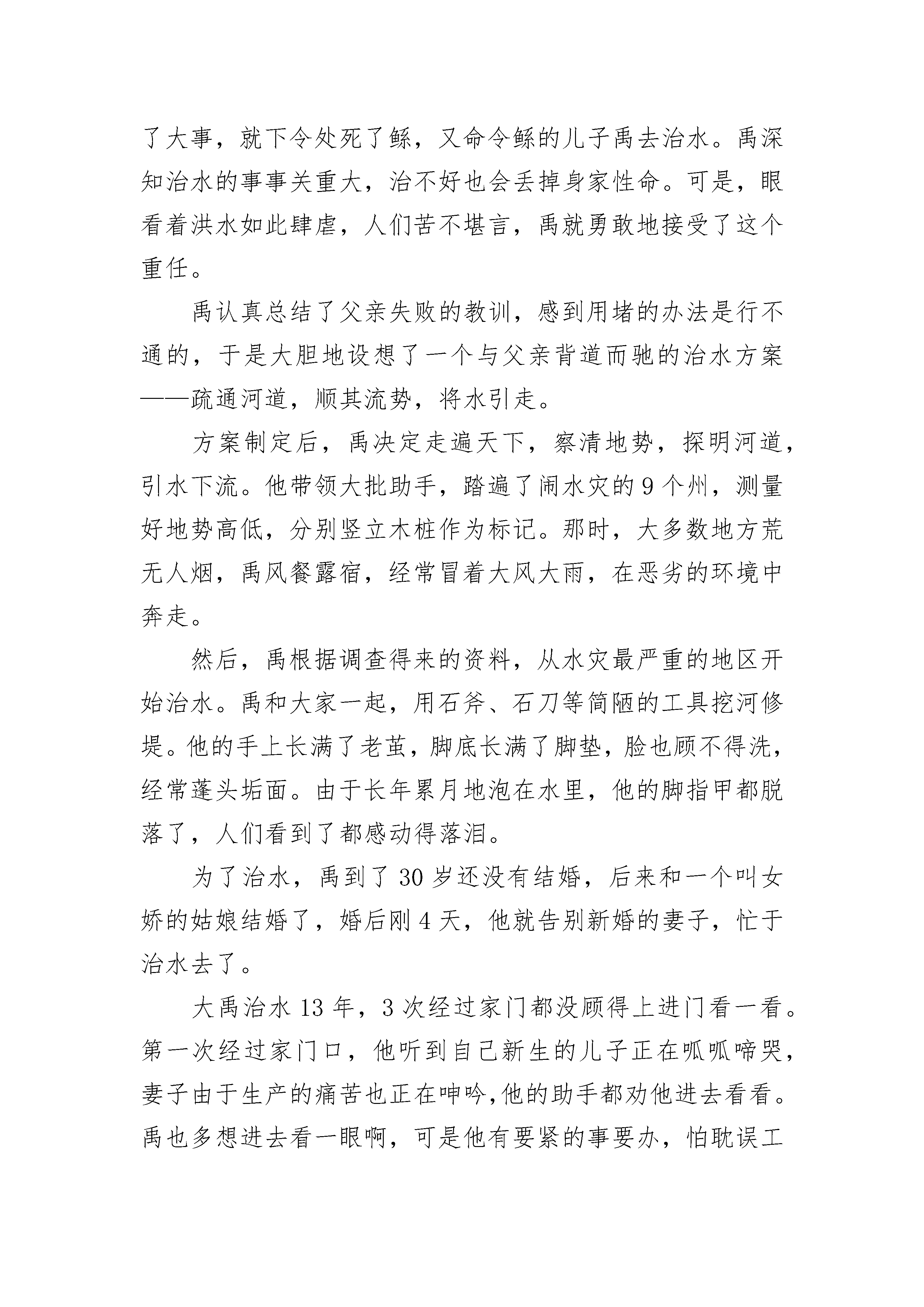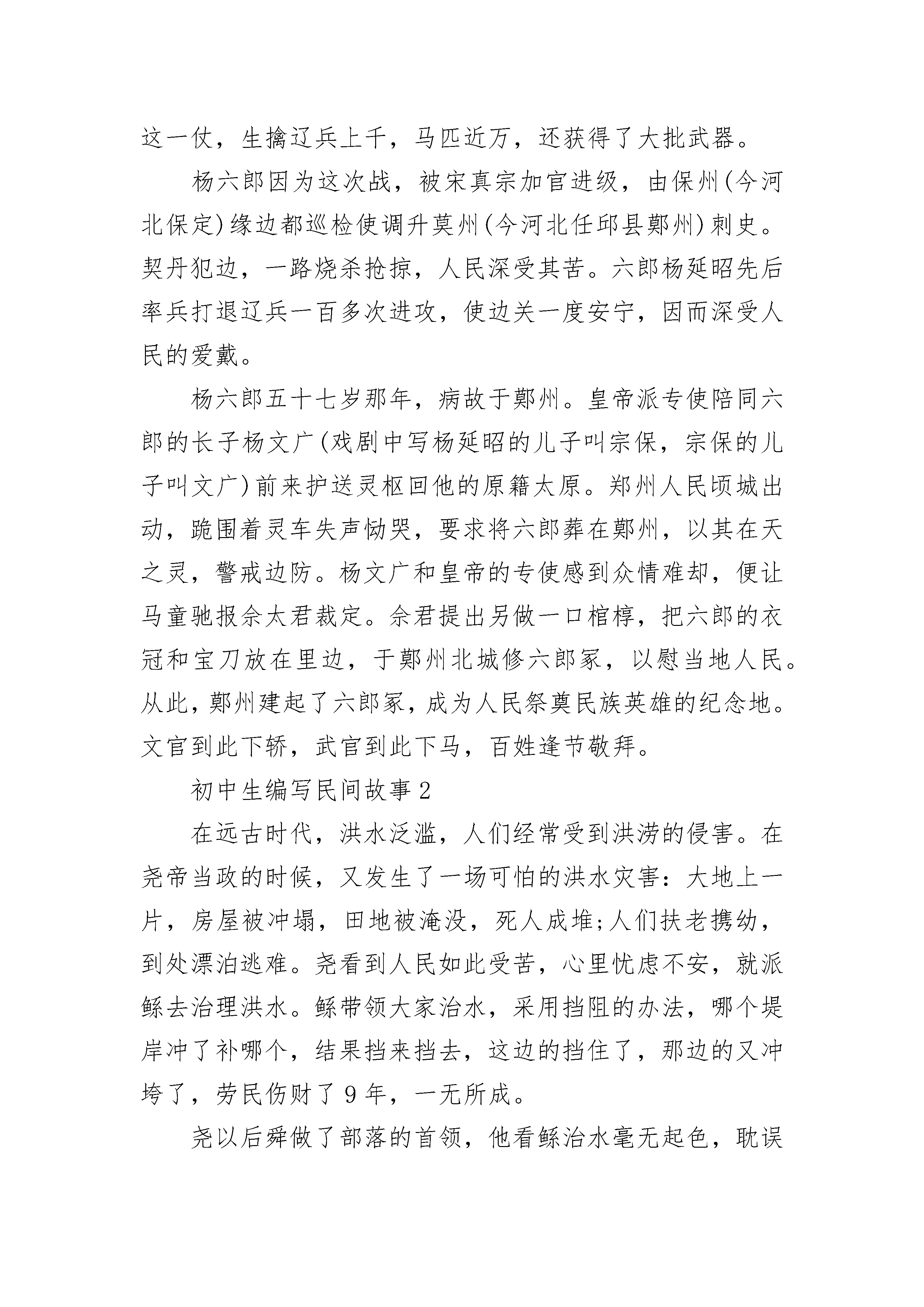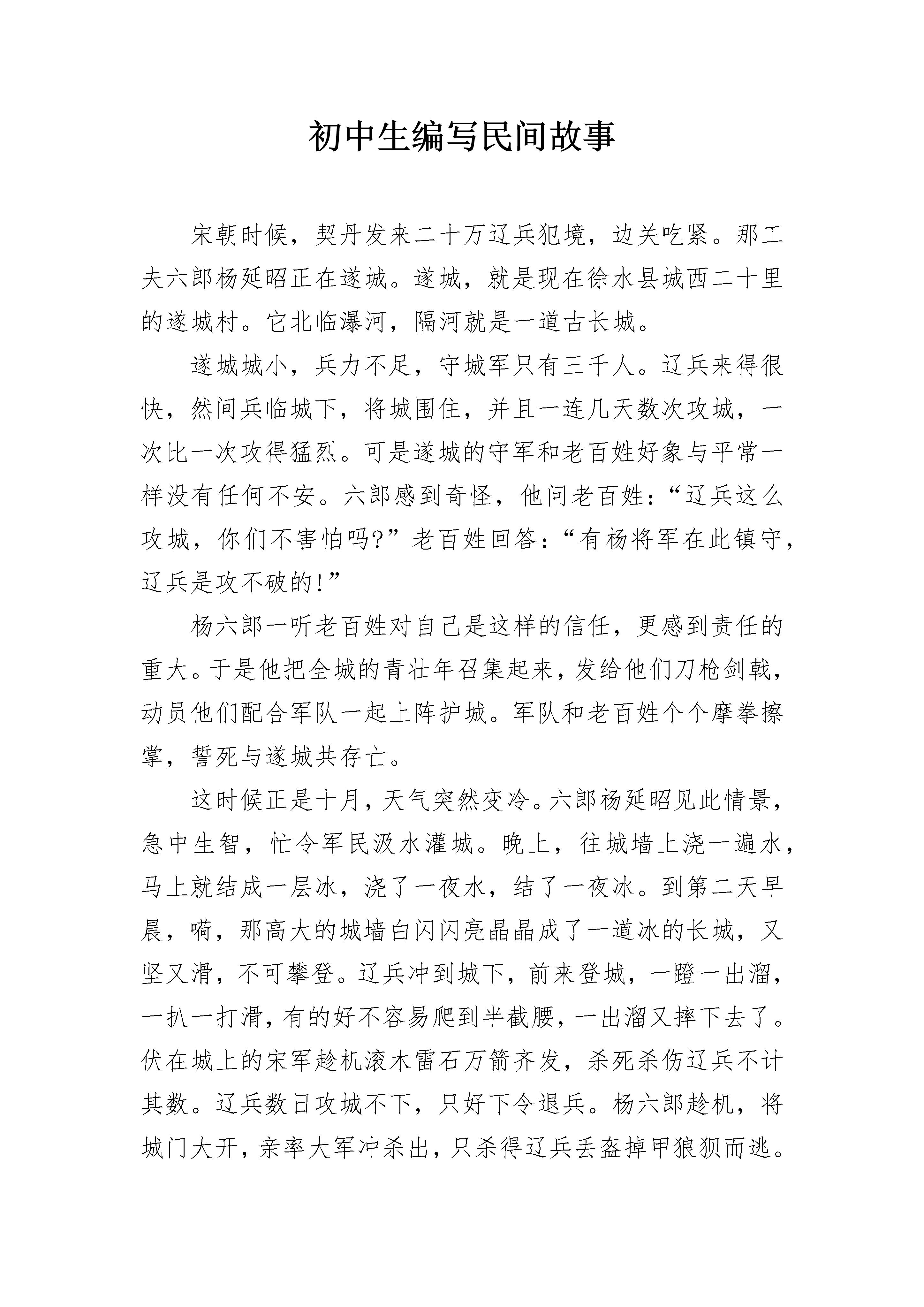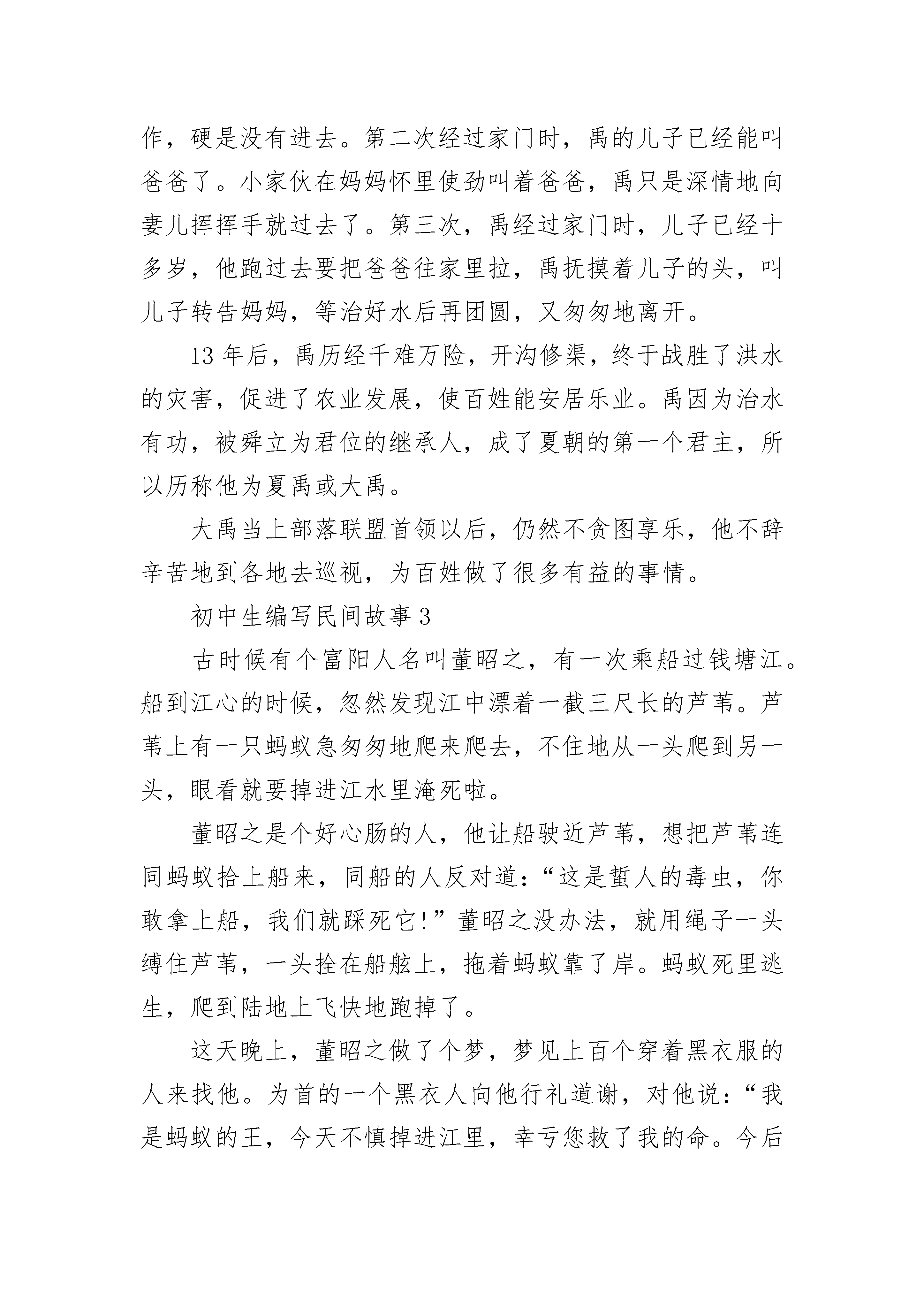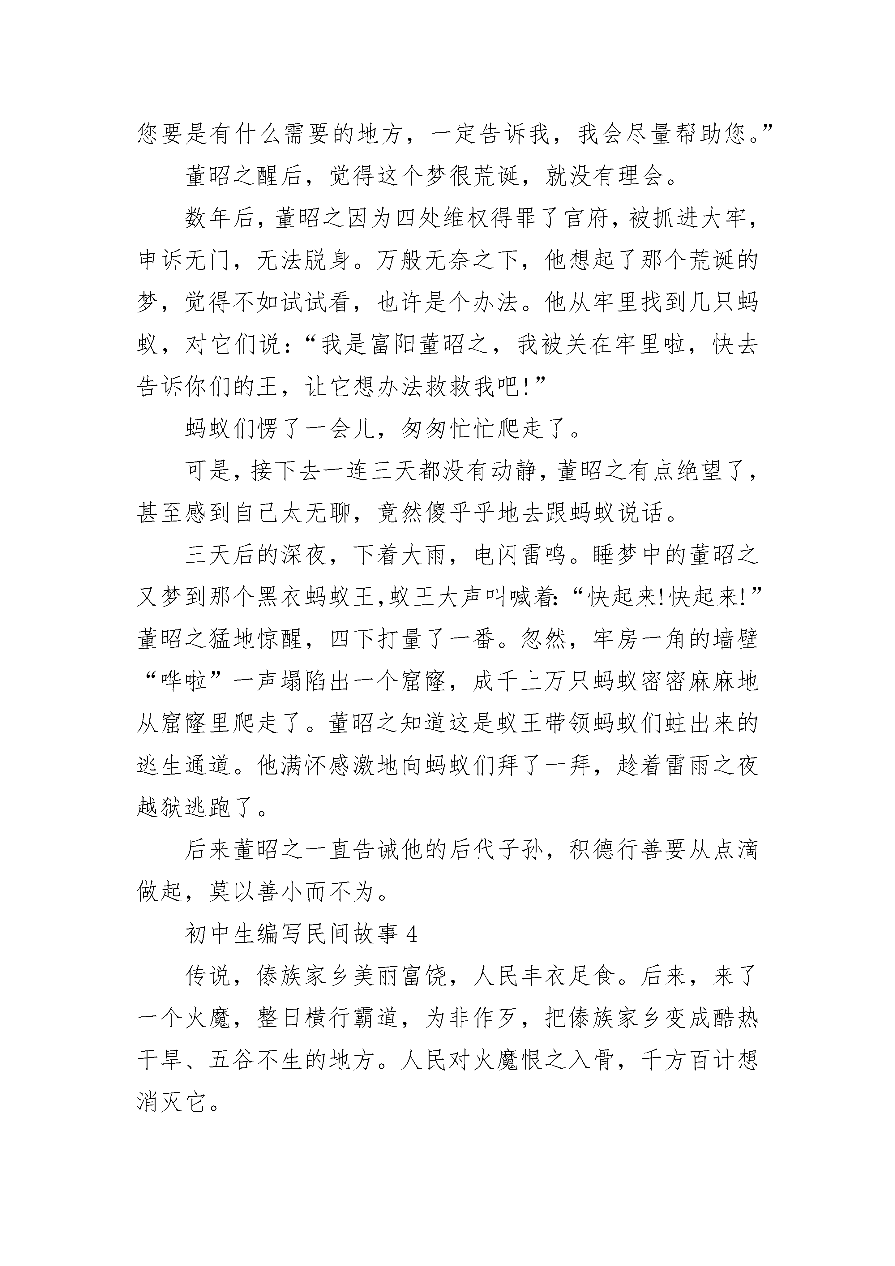 初中生编写民间故事宋朝时候,契丹发来二十万辽兵犯境,边关吃紧。那工夫六郎杨延昭正在遂城。遂城,就是现在徐水县城西二十里的遂城村。它北临瀑河,隔河就是一道古长城。遂城城小,兵力不足,守城军只有三千人。辽兵来得很快,然间兵临城下,将城围住,并且一连几天数次攻城,一次比一次攻得猛烈。可是遂城的守军和老百姓好象与平常一样没有任何不安。六郎感到奇怪,他问老百姓:“辽兵这么攻城,你们不害怕吗?”老百姓回答:“有杨将军在此镇守,辽兵是攻不破的!”杨六郎一听老百姓对自己是这样的信任,更感到责任的重大。于是他把全城的青壮年召集起来,发给他们刀枪剑戟,动员他们配合军队一起上阵护城。军队和老百姓个个摩拳擦掌,誓死与遂城共存亡。这时候正是十月,天气突然变冷。六郎杨延昭见此情景,急中生智,忙令军民汲水灌城。晚上,往城墙上浇一遍水,马上就结成一层冰,浇了一夜水,结了一夜冰。到第二天早晨,嗬,那高大的城墙白闪闪亮晶晶成了一道冰的长城,又坚又滑,不可攀登。辽兵冲到城下,前来登城,一蹬一出溜,一扒一打滑,有的好不容易爬到半截腰,一出溜又摔下去了。伏在城上的宋军趁机滚木雷石万箭齐发,杀死杀伤辽兵不计其数。辽兵数日攻城不下,只好下令退兵。杨六郎趁机,将城门大开,亲率大军冲杀出,只杀得辽兵丢盔掉甲狼狈而逃。这一仗,生擒辽兵上千,马匹近万,还获得了大批武器。杨六郎因为这次战,被宋真宗加官进级,由保州(今河北保定)缘边都巡检使调升莫州(今河北任邱县鄚州)刺史。契丹犯边,一路烧杀抢掠,人民深受其苦。六郎杨延昭先后率兵打退辽兵一百多次进攻,使边关一度安宁,因而深受人民的爱戴。杨六郎五十七岁那年,病故于鄚州。皇帝派专使陪同六郎的长子杨文广(戏剧中写杨延昭的儿子叫宗保,宗保的儿子叫文广)前来护送灵枢回他的原籍太原。郑州人民顷城出动,跪围着灵车失声恸哭,要求将六郎葬在鄚州,以其在天之灵,警戒边防。杨文广和皇帝的专使感到众情难却,便让马童驰报佘太君裁定。佘君提出另做一口棺椁,把六郎的衣冠和宝刀放在里边,于鄚州北城修六郎冢,以慰当地人民。从此,鄚州建起了六郎冢,成为人民祭奠民族英雄的纪念地。文官到此下轿,武官到此下马,百姓逢节敬拜。初中生编写民间故事2在远古时代,洪水泛滥,人们经常受到洪涝的侵害。在尧帝当政的时候,又发生了一场可怕的洪水灾害:大地上一片,房屋被冲塌,田地被淹没,死人成堆;人们扶老携幼,到处漂泊逃难。尧看到人民如此受苦,心里忧虑不安,就派鲧去治理洪水。鲧带领大家治水,采用挡阻的办法,哪个堤岸冲了补哪个,结果挡来挡去,这边的挡住了,那边的又冲垮了,劳民伤财了9年,一无所成。尧以后舜做了部落的首领,他看鲧治水毫无起色,耽误了大事,就下令处死了鲧,又命令鲧的儿子禹去治水。禹深知治水的事事关重大,治不好也会丢掉身家性命。可是,眼看着洪水如此肆虐,人们苦不堪言,禹就勇敢地接受了这个重任。禹认真总结了父亲失败的教训,感到用堵的办法是行不通的,于是大胆地设想了一个与父亲背道而驰的治水方案——疏通河道,顺其流势,将水引走。方案制定后,禹决定走遍天下,察清地势,探明河道,引水下流。他带领大批助手,踏遍了闹水灾的9个州,测量好地势高低,分别竖立木桩作为标记。那时,大多数地方荒无人烟,禹风餐露宿,经常冒着大风大雨,在恶劣的环境中奔走。然后,禹根据调查得来的资料,从水灾最严重的地区开始治水。禹和大家一起,用石斧、石刀等简陋的工具挖河修堤。他的手上长满了老茧,脚底长满了脚垫,脸也顾不得洗,经常蓬头垢面。由于长年累月地泡在水里,他的脚指甲都脱落了,人们看到了都感动得落泪。为了治水,禹到了30岁还没有结婚,后来和一个叫女娇的姑娘结婚了,婚后刚4天,他就告别新婚的妻子,忙于治水去了。大禹治水13年,3次经过家门都没顾得上进门看一看。第一次经过家门口,他听到自己新生的儿子正在呱呱啼哭,妻子由于生产的痛苦也正在呻吟,他的助手都劝他进去看看。禹也多想进去看一眼啊,可是他有要紧的事要办,怕耽误工作,硬是没有进去。第二次经过家门时,禹的儿子已经能叫爸爸了。小家伙在妈妈怀里使劲叫着爸爸,禹只是深情地向妻儿挥挥手就过去了。第三次,禹经过家门时,儿子已经十多岁,他跑过去要把爸爸往家里拉,禹抚摸着儿子的头,叫儿子转告妈妈,等治好水后再团圆,又匆匆地离开。13年后,禹历经千难万险,开沟修渠,终于战胜了洪水的灾害,促进了农业发展,使百姓能安居乐业。禹因为治水有功,被舜立为君位的继承人,成了夏朝的第一个君主,所以历称他为夏禹或大禹。大禹当上部落联盟首领以后,仍然不贪图享乐,他不辞辛苦地到各地去巡视,为百姓做了很多有益的事情。初中生编写民间故事3古时候有个富阳人名叫董昭之,有一次乘船过钱塘江。船到江心的时候,忽然发现江中漂着一截三尺长的芦苇。芦苇上有一只蚂蚁急匆匆地爬来爬去,不住地从一头爬到另一头,眼看就要掉进江水里淹死啦