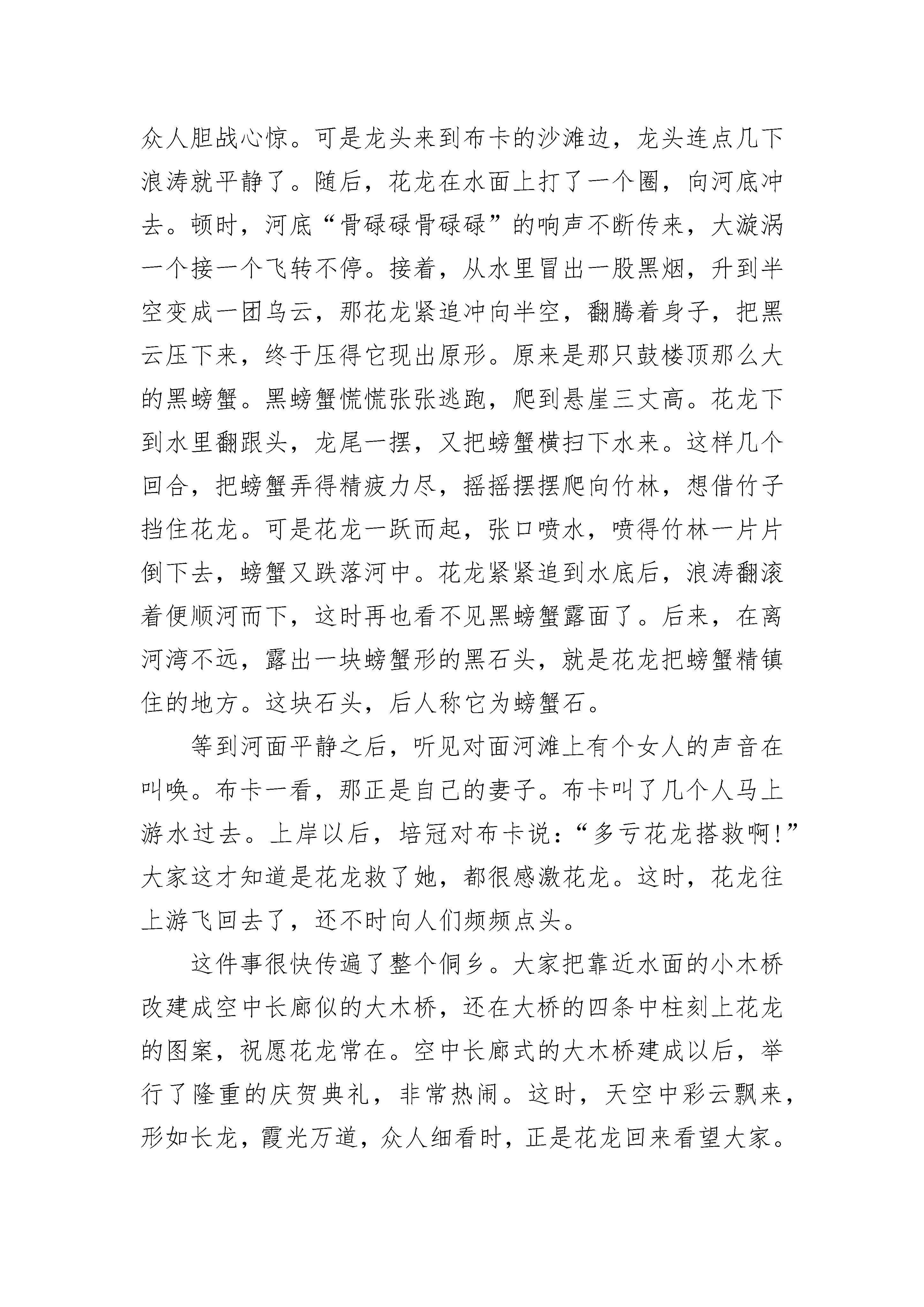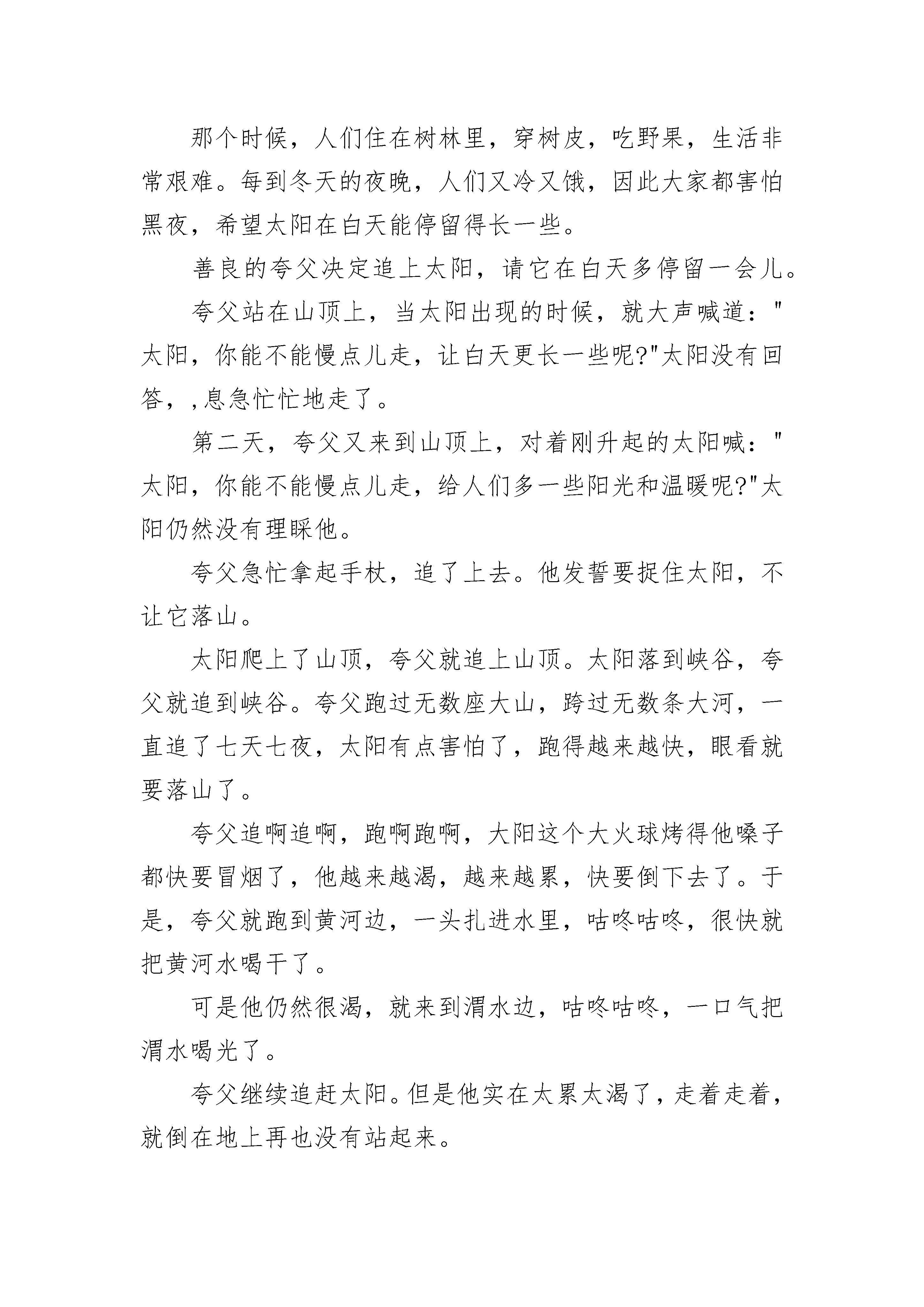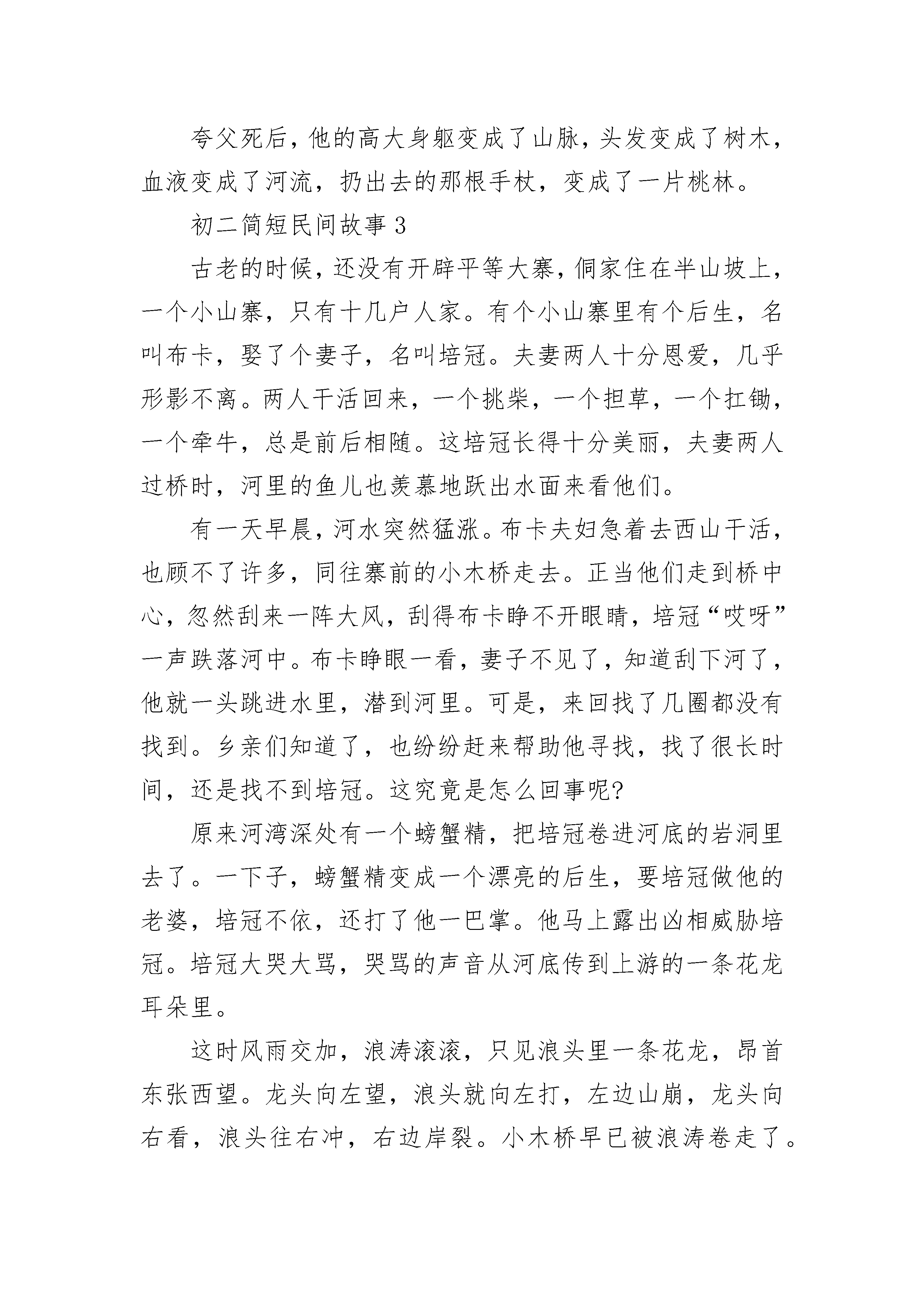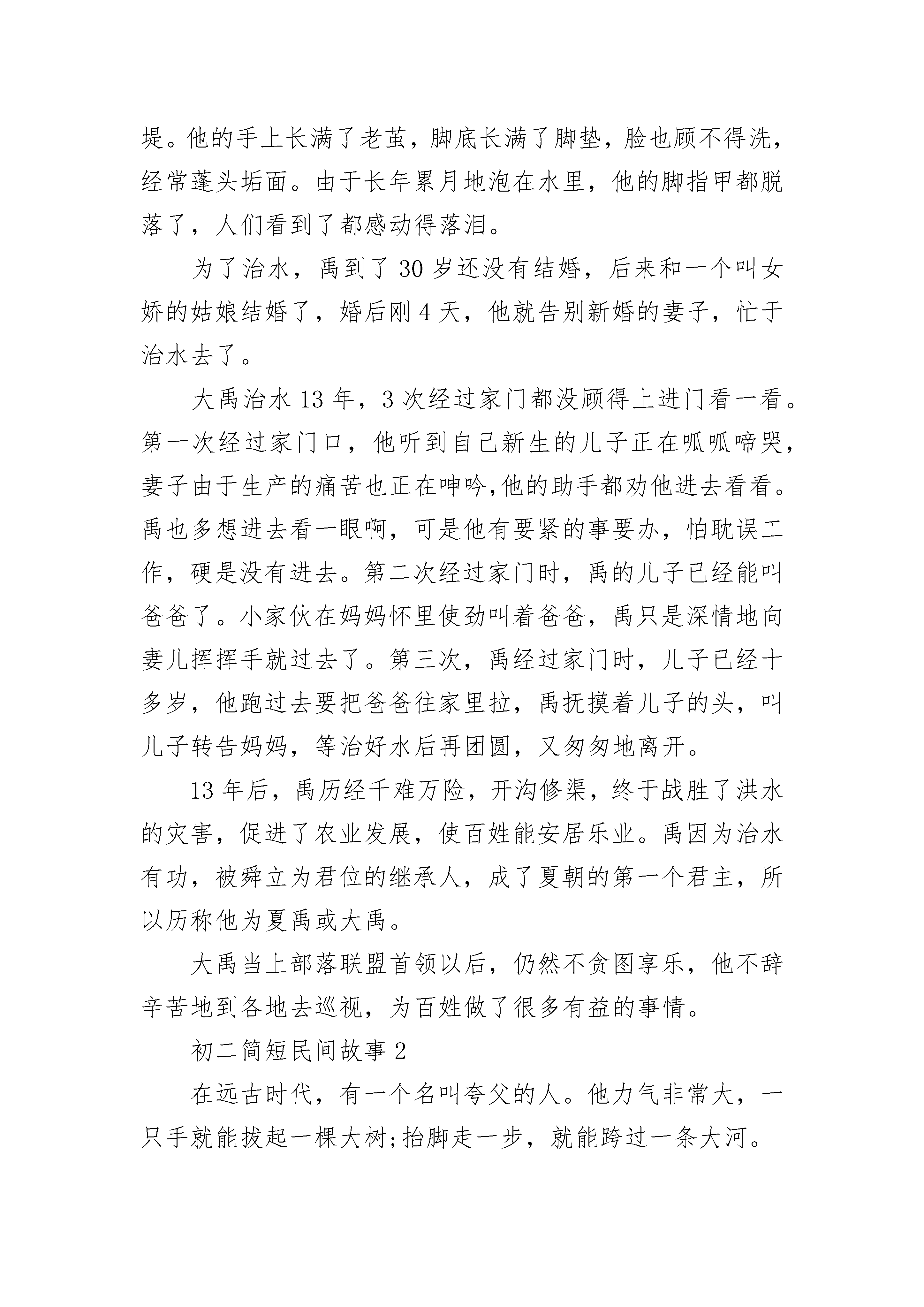 初二简短民间故事在远古时代,洪水泛滥,人们经常受到洪涝的侵害。在尧帝当政的时候,又发生了一场可怕的洪水灾害:大地上一片,房屋被冲塌,田地被淹没,死人成堆;人们扶老携幼,到处漂泊逃难。尧看到人民如此受苦,心里忧虑不安,就派鲧去治理洪水。鲧带领大家治水,采用挡阻的办法,哪个堤岸冲了补哪个,结果挡来挡去,这边的挡住了,那边的又冲垮了,劳民伤财了9年,一无所成。尧以后舜做了部落的首领,他看鲧治水毫无起色,耽误了大事,就下令处死了鲧,又命令鲧的儿子禹去治水。禹深知治水的事事关重大,治不好也会丢掉身家性命。可是,眼看着洪水如此肆虐,人们苦不堪言,禹就勇敢地接受了这个重任。禹认真总结了父亲失败的教训,感到用堵的办法是行不通的,于是大胆地设想了一个与父亲背道而驰的治水方案——疏通河道,顺其流势,将水引走。方案制定后,禹决定走遍天下,察清地势,探明河道,引水下流。他带领大批助手,踏遍了闹水灾的9个州,测量好地势高低,分别竖立木桩作为标记。那时,大多数地方荒无人烟,禹风餐露宿,经常冒着大风大雨,在恶劣的环境中奔走。然后,禹根据调查得来的资料,从水灾最严重的地区开始治水。禹和大家一起,用石斧、石刀等简陋的工具挖河修堤。他的手上长满了老茧,脚底长满了脚垫,脸也顾不得洗,经常蓬头垢面。由于长年累月地泡在水里,他的脚指甲都脱落了,人们看到了都感动得落泪。为了治水,禹到了30岁还没有结婚,后来和一个叫女娇的姑娘结婚了,婚后刚4天,他就告别新婚的妻子,忙于治水去了。大禹治水13年,3次经过家门都没顾得上进门看一看。第一次经过家门口,他听到自己新生的儿子正在呱呱啼哭,妻子由于生产的痛苦也正在呻吟,他的助手都劝他进去看看。禹也多想进去看一眼啊,可是他有要紧的事要办,怕耽误工作,硬是没有进去。第二次经过家门时,禹的儿子已经能叫爸爸了。小家伙在妈妈怀里使劲叫着爸爸,禹只是深情地向妻儿挥挥手就过去了。第三次,禹经过家门时,儿子已经十多岁,他跑过去要把爸爸往家里拉,禹抚摸着儿子的头,叫儿子转告妈妈,等治好水后再团圆,又匆匆地离开。13年后,禹历经千难万险,开沟修渠,终于战胜了洪水的灾害,促进了农业发展,使百姓能安居乐业。禹因为治水有功,被舜立为君位的继承人,成了夏朝的第一个君主,所以历称他为夏禹或大禹。大禹当上部落联盟首领以后,仍然不贪图享乐,他不辞辛苦地到各地去巡视,为百姓做了很多有益的事情。初二简短民间故事2在远古时代,有一个名叫夸父的人。他力气非常大,一只手就能拔起一棵大树;抬脚走一步,就能跨过一条大河。那个时候,人们住在树林里,穿树皮,吃野果,生活非常艰难。每到冬天的夜晚,人们又冷又饿,因此大家都害怕黑夜,希望太阳在白天能停留得长一些。善良的夸父决定追上太阳,请它在白天多停留一会儿。夸父站在山顶上,当太阳出现的时候,就大声喊道:"太阳,你能不能慢点儿走,让白天更长一些呢?"太阳没有回答,,息急忙忙地走了。第二天,夸父又来到山顶上,对着刚升起的太阳喊:"太阳,你能不能慢点儿走,给人们多一些阳光和温暖呢?"太阳仍然没有理睬他。夸父急忙拿起手杖,追了上去。他发誓要捉住太阳,不让它落山。太阳爬上了山顶,夸父就追上山顶。太阳落到峡谷,夸父就追到峡谷。夸父跑过无数座大山,跨过无数条大河,一直追了七天七夜,太阳有点害怕了,跑得越来越快,眼看就要落山了。夸父追啊追啊,跑啊跑啊,大阳这个大火球烤得他嗓子都快要冒烟了,他越来越渴,越来越累,快要倒下去了。于是,夸父就跑到黄河边,一头扎进水里,咕咚咕咚,很快就把黄河水喝干了。可是他仍然很渴,就来到渭水边,咕咚咕咚,一口气把渭水喝光了。夸父继续追赶太阳。但是他实在太累太渴了,走着走着,就倒在地上再也没有站起来。夸父死后,他的高大身躯变成了山脉,头发变成了树木,血液变成了河流,扔出去的那根手杖,变成了一片桃林。初二简短民间故事3古老的时候,还没有开辟平等大寨,侗家住在半山坡上,一个小山寨,只有十几户人家。有个小山寨里有个后生,名叫布卡,娶了个妻子,名叫培冠。夫妻两人十分恩爱,几乎形影不离。两人干活回来,一个挑柴,一个担草,一个扛锄,一个牵牛,总是前后相随。这培冠长得十分美丽,夫妻两人过桥时,河里的鱼儿也羡慕地跃出水面来看他们。有一天早晨,河水突然猛涨。布卡夫妇急着去西山干活,也顾不了许多,同往寨前的小木桥走去。正当他们走到桥中心,忽然刮来一阵大风,刮得布卡睁不开眼睛,培冠“哎呀”一声跌落河中。布卡睁眼一看,妻子不见了,知道刮下河了,他就一头跳进水里,潜到河里。可是,来回找了几圈都没有找到。乡亲们知道了,也纷纷赶来帮助他寻找,找了很长时间,还是找不到培冠。这究竟是怎么回事呢?原来河湾深处有一个螃蟹精,把培冠卷进河底的岩洞里去了。一下子,螃蟹精变成一个漂亮的后生,要培冠做他的老婆,培冠不依,还打了他一巴掌。他马上露出凶相威胁培冠。培冠大哭
