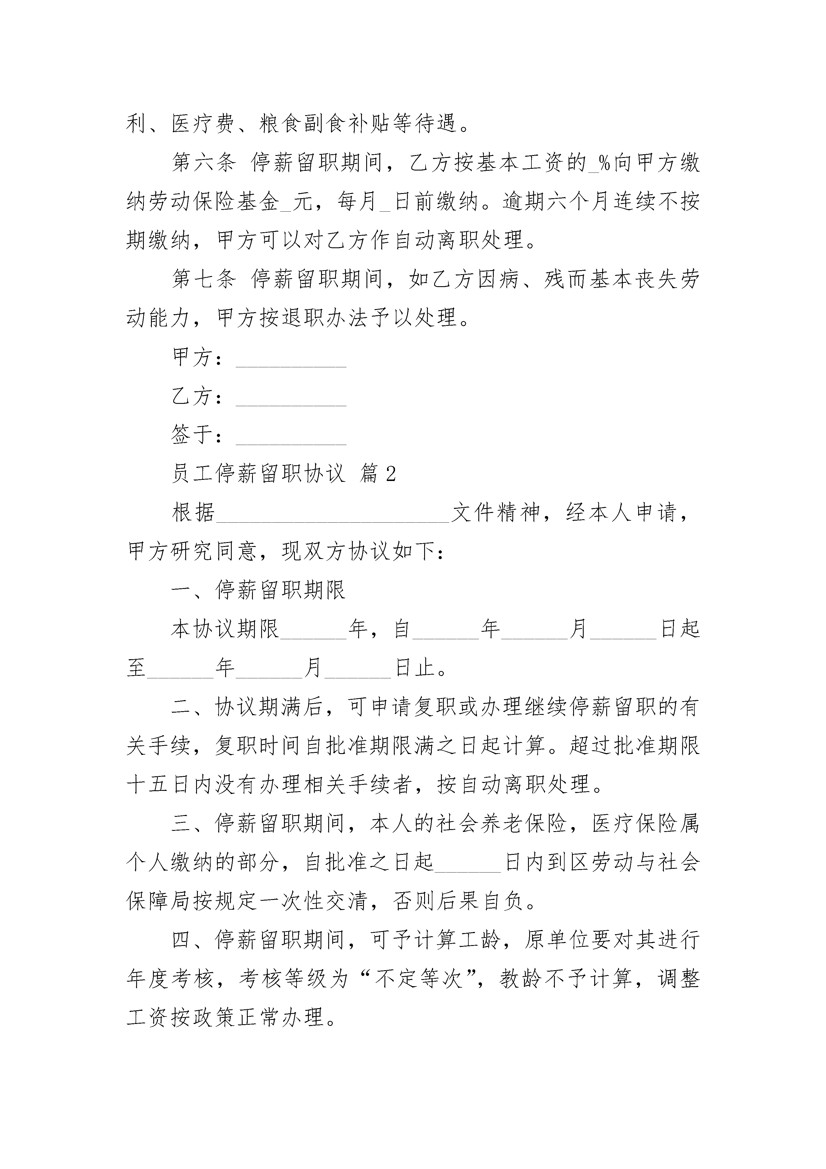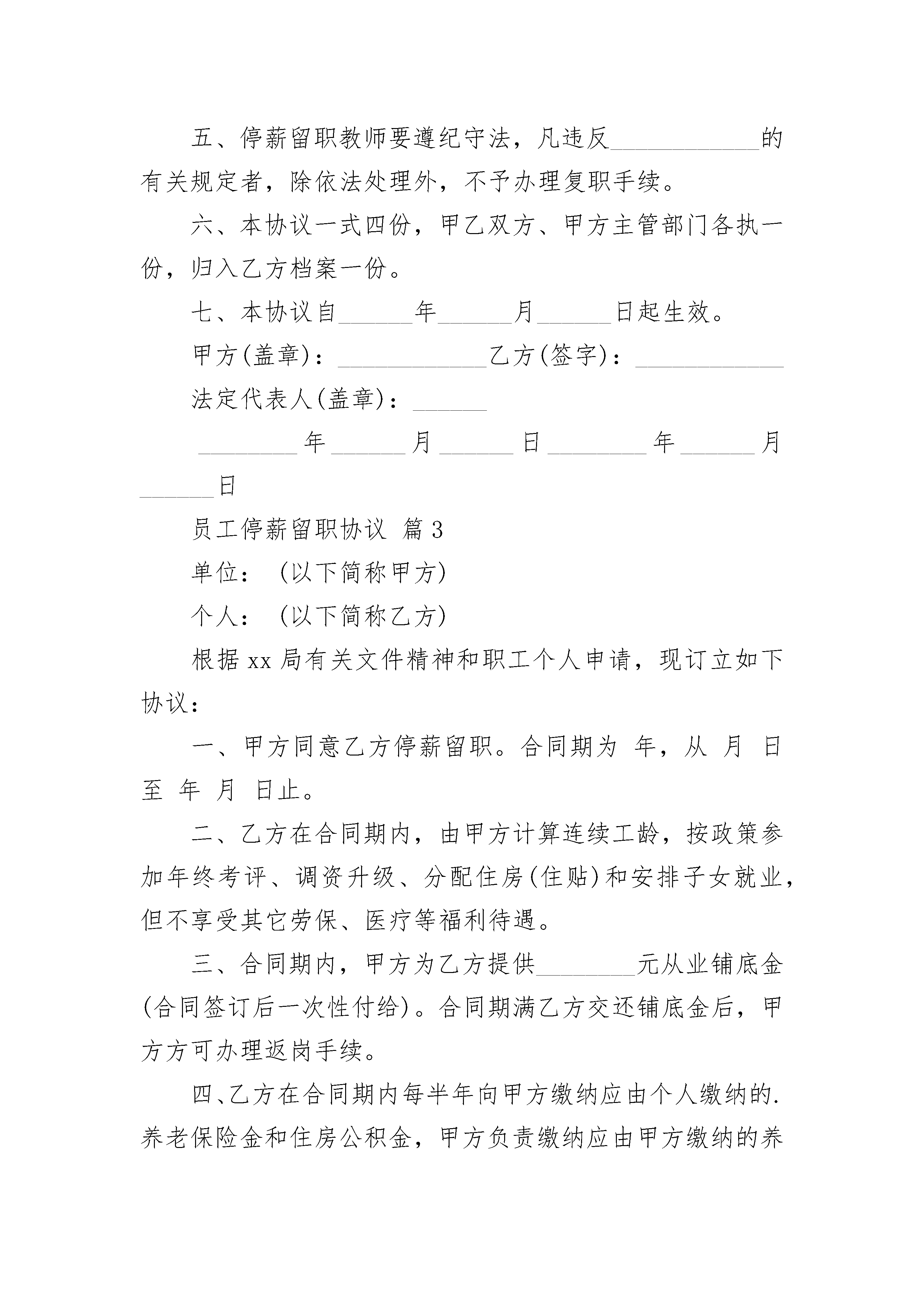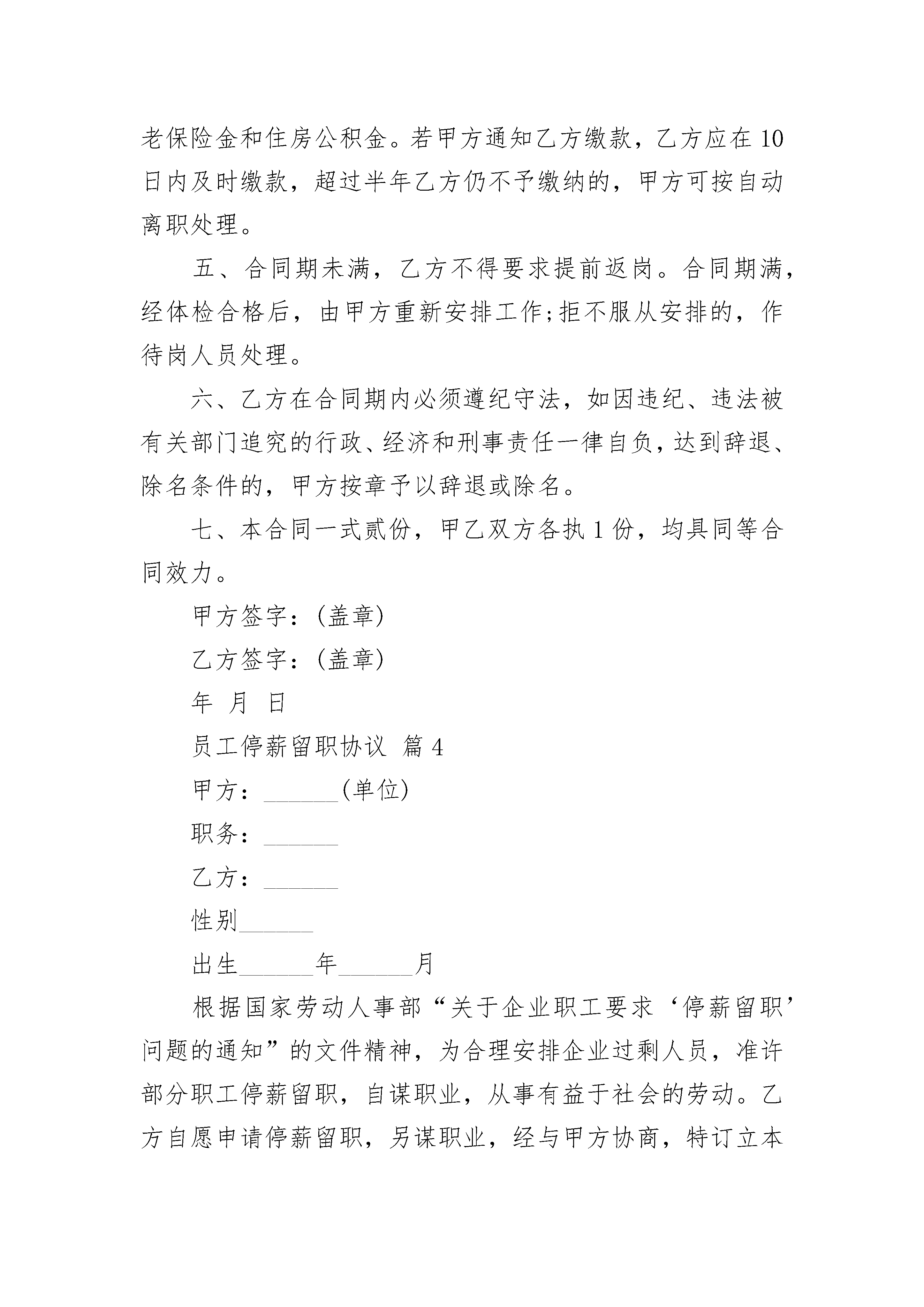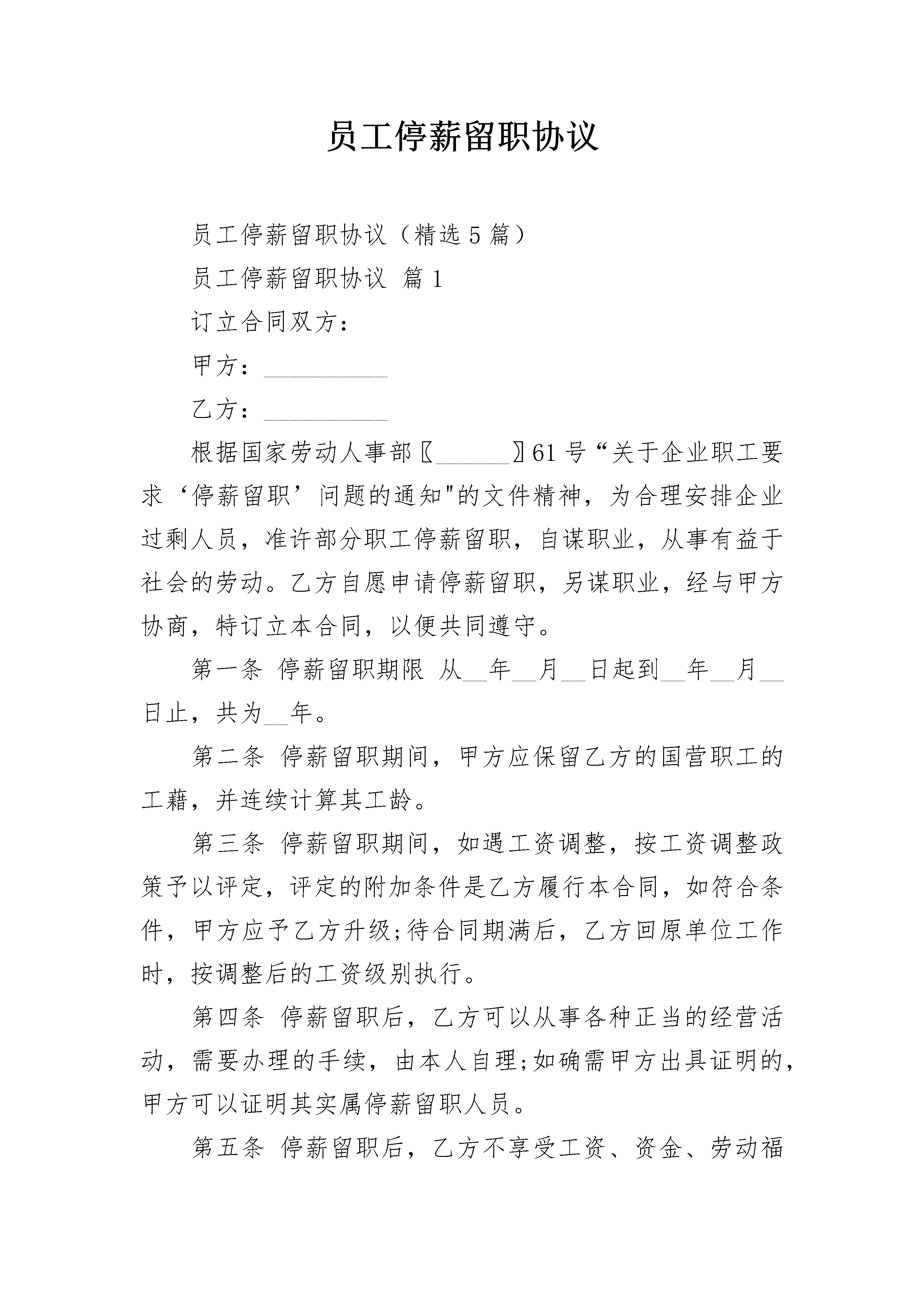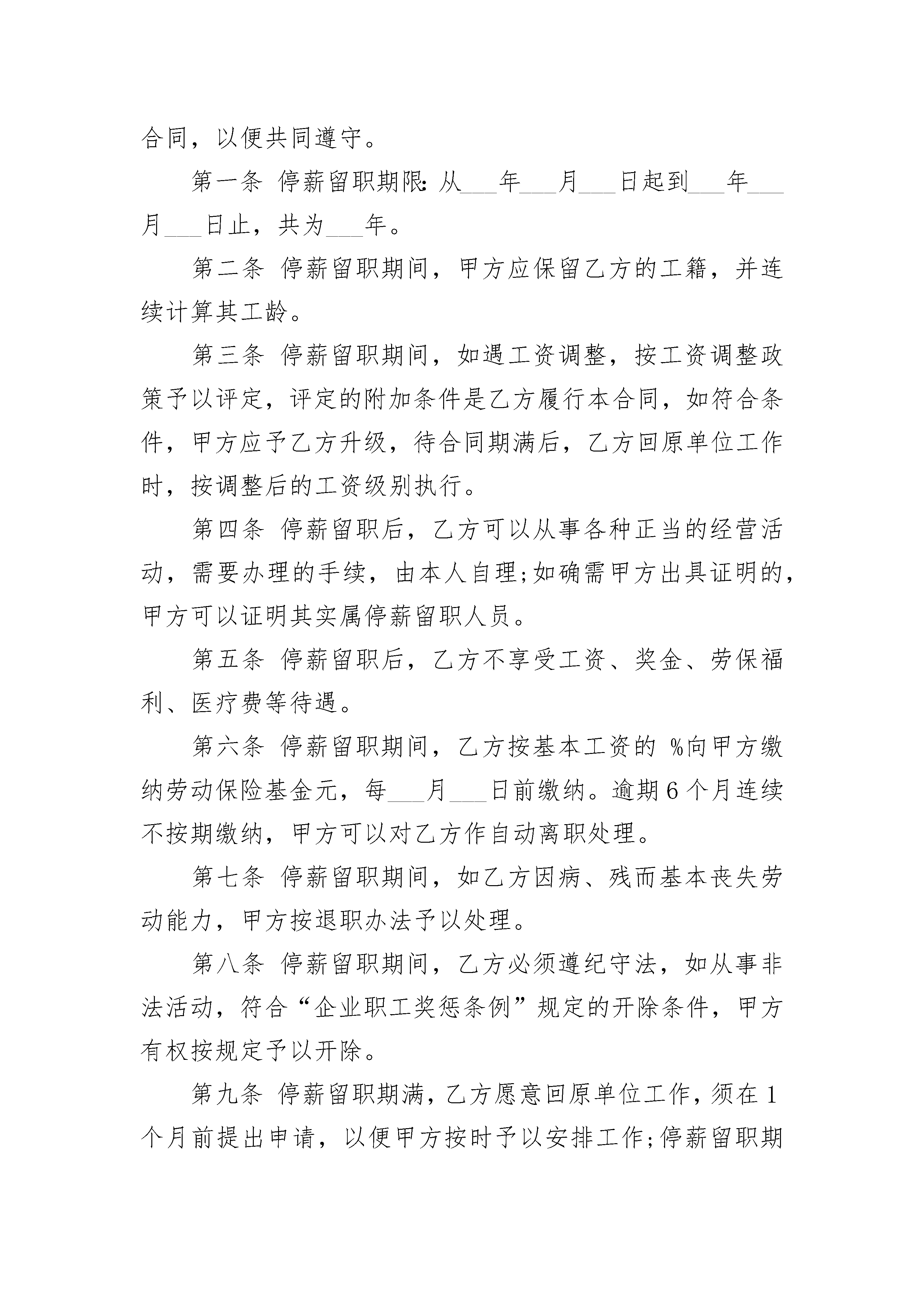 员工停薪留职协议员工停薪留职协议(精选5篇)员工停薪留职协议篇1订立合同双方:甲方:__________乙方:__________根据国家劳动人事部〖______〗61号“关于企业职工要求‘停薪留职’问题的通知"的文件精神,为合理安排企业过剩人员,准许部分职工停薪留职,自谋职业,从事有益于社会的劳动。乙方自愿申请停薪留职,另谋职业,经与甲方协商,特订立本合同,以便共同遵守。第一条停薪留职期限从__年__月__日起到__年__月__日止,共为__年。第二条停薪留职期间,甲方应保留乙方的国营职工的工藉,并连续计算其工龄。第三条停薪留职期间,如遇工资调整,按工资调整政策予以评定,评定的附加条件是乙方履行本合同,如符合条件,甲方应予乙方升级;待合同期满后,乙方回原单位工作时,按调整后的工资级别执行。第四条停薪留职后,乙方可以从事各种正当的经营活动,需要办理的手续,由本人自理;如确需甲方出具证明的,甲方可以证明其实属停薪留职人员。第五条停薪留职后,乙方不享受工资、资金、劳动福利、医疗费、粮食副食补贴等待遇。第六条停薪留职期间,乙方按基本工资的_%向甲方缴纳劳动保险基金_元,每月_日前缴纳。逾期六个月连续不按期缴纳,甲方可以对乙方作自动离职处理。第七条停薪留职期间,如乙方因病、残而基本丧失劳动能力,甲方按退职办法予以处理。甲方:__________乙方:__________签于:__________员工停薪留职协议篇2根据_____________________文件精神,经本人申请,甲方研究同意,现双方协议如下:一、停薪留职期限本协议期限______年,自______年______月______日起至______年______月______日止。二、协议期满后,可申请复职或办理继续停薪留职的有关手续,复职时间自批准期限满之日起计算。超过批准期限十五日内没有办理相关手续者,按自动离职处理。三、停薪留职期间,本人的社会养老保险,医疗保险属个人缴纳的部分,自批准之日起______日内到区劳动与社会保障局按规定一次性交清,否则后果自负。四、停薪留职期间,可予计算工龄,原单位要对其进行年度考核,考核等级为“不定等次”,教龄不予计算,调整工资按政策正常办理。五、停薪留职教师要遵纪守法,凡违反____________的有关规定者,除依法处理外,不予办理复职手续。六、本协议一式四份,甲乙双方、甲方主管部门各执一份,归入乙方档案一份。七、本协议自______年______月______日起生效。甲方(盖章):____________乙方(签字):____________法定代表人(盖章):______________年______月______日________年______月______日员工停薪留职协议篇3单位:(以下简称甲方)个人:(以下简称乙方)根据xx局有关文件精神和职工个人申请,现订立如下协议:一、甲方同意乙方停薪留职。合同期为年,从月日至年月日止。二、乙方在合同期内,由甲方计算连续工龄,按政策参加年终考评、调资升级、分配住房(住贴)和安排子女就业,但不享受其它劳保、医疗等福利待遇。三、合同期内,甲方为乙方提供________元从业铺底金(合同签订后一次性付给)。合同期满乙方交还铺底金后,甲方方可办理返岗手续。四、乙方在合同期内每半年向甲方缴纳应由个人缴纳的.养老保险金和住房公积金,甲方负责缴纳应由甲方缴纳的养老保险金和住房公积金。若甲方通知乙方缴款,乙方应在10日内及时缴款,超过半年乙方仍不予缴纳的,甲方可按自动离职处理。五、合同期未满,乙方不得要求提前返岗。合同期满,经体检合格后,由甲方重新安排工作;拒不服从安排的,作待岗人员处理。六、乙方在合同期内必须遵纪守法,如因违纪、违法被有关部门追究的行政、经济和刑事责任一律自负,达到辞退、除名条件的,甲方按章予以辞退或除名。七、本合同一式贰份,甲乙双方各执1份,均具同等合同效力。甲方签字:(盖章)乙方签字:(盖章)年月日员工停薪留职协议篇4甲方:______(单位)职务:______乙方:______性别______出生______年______月根据国家劳动人事部“关于企业职工要求‘停薪留职’问题的通知”的文件精神,为合理安排企业过剩人员,准许部分职工停薪留职,自谋职业,从事有益于社会的劳动。乙方自愿申请停薪留职,另谋职业,经与甲方协商,特订立本合同,以便共同遵守。第一条停薪留职期限:从___年___月___日起到___年___月___日止,共为___年。第二条停薪留职期间,甲方应保留乙方的工籍,并连续计算其工龄。第三条停薪留职期间,如遇工资调整,按工资调整政策予以评定,评定的附加条件是乙方履行本合同,如符合条件,甲方应予乙方升级,待合同期满后,乙方回原单位工作时,按调整后的工资级别执行。