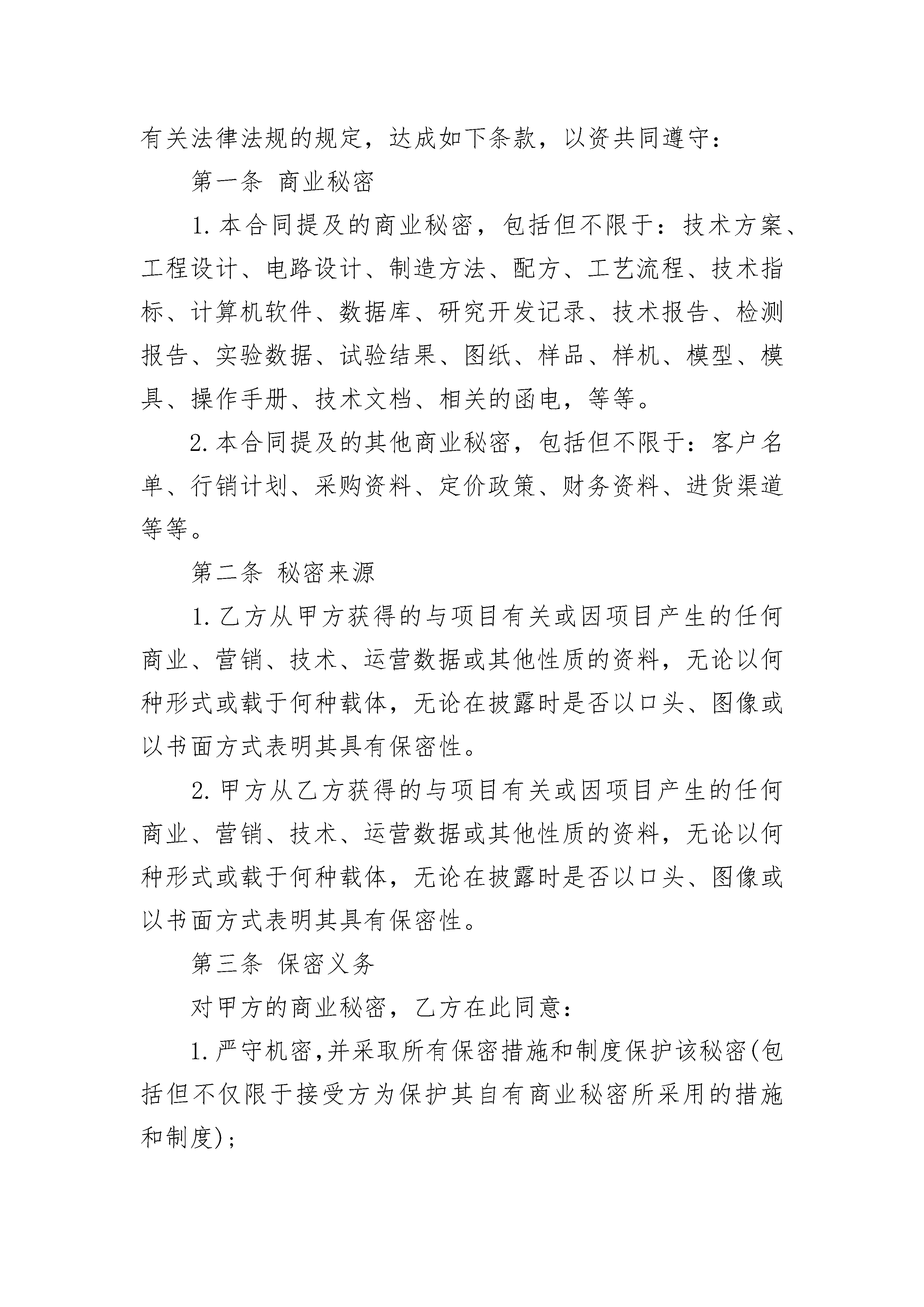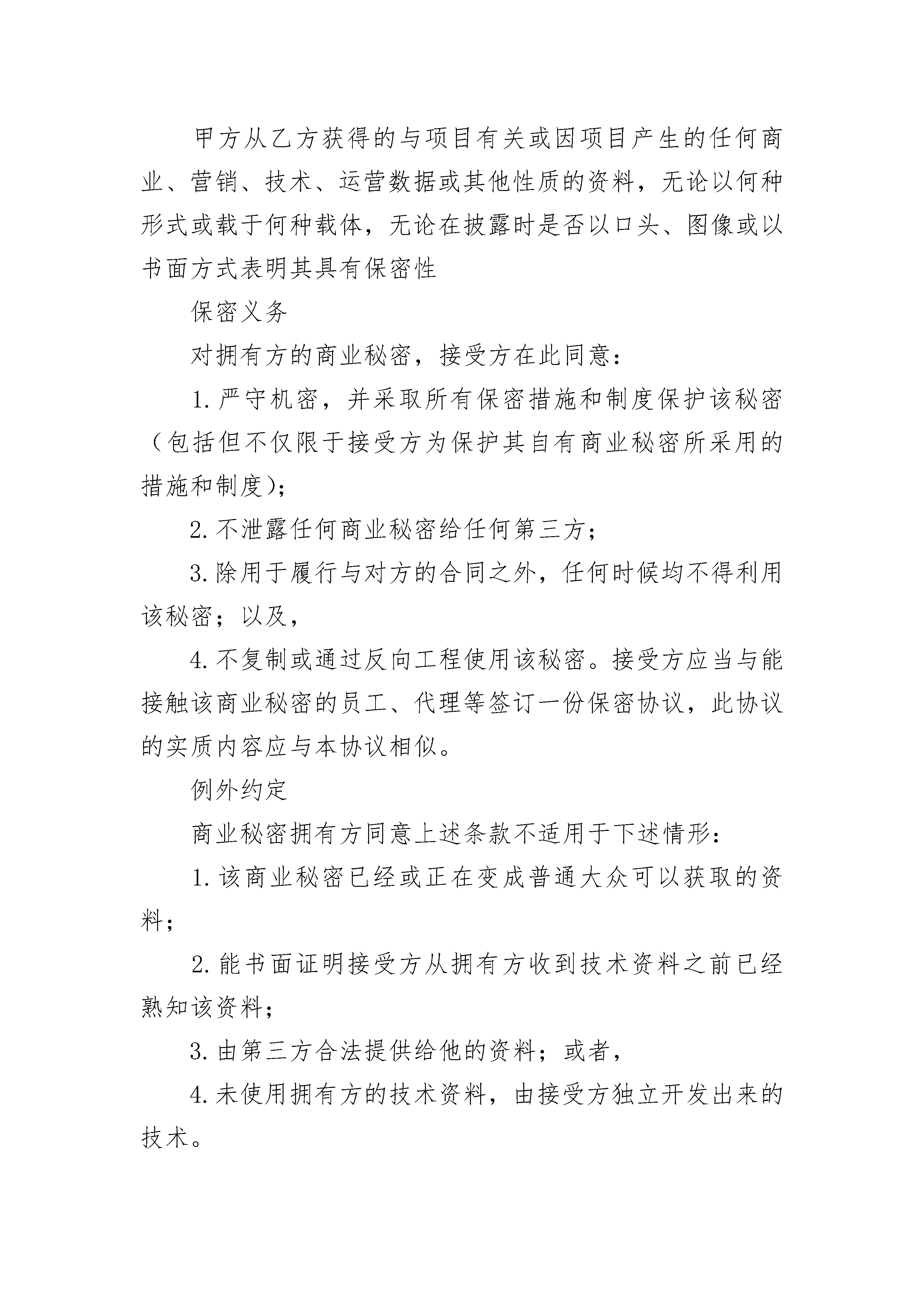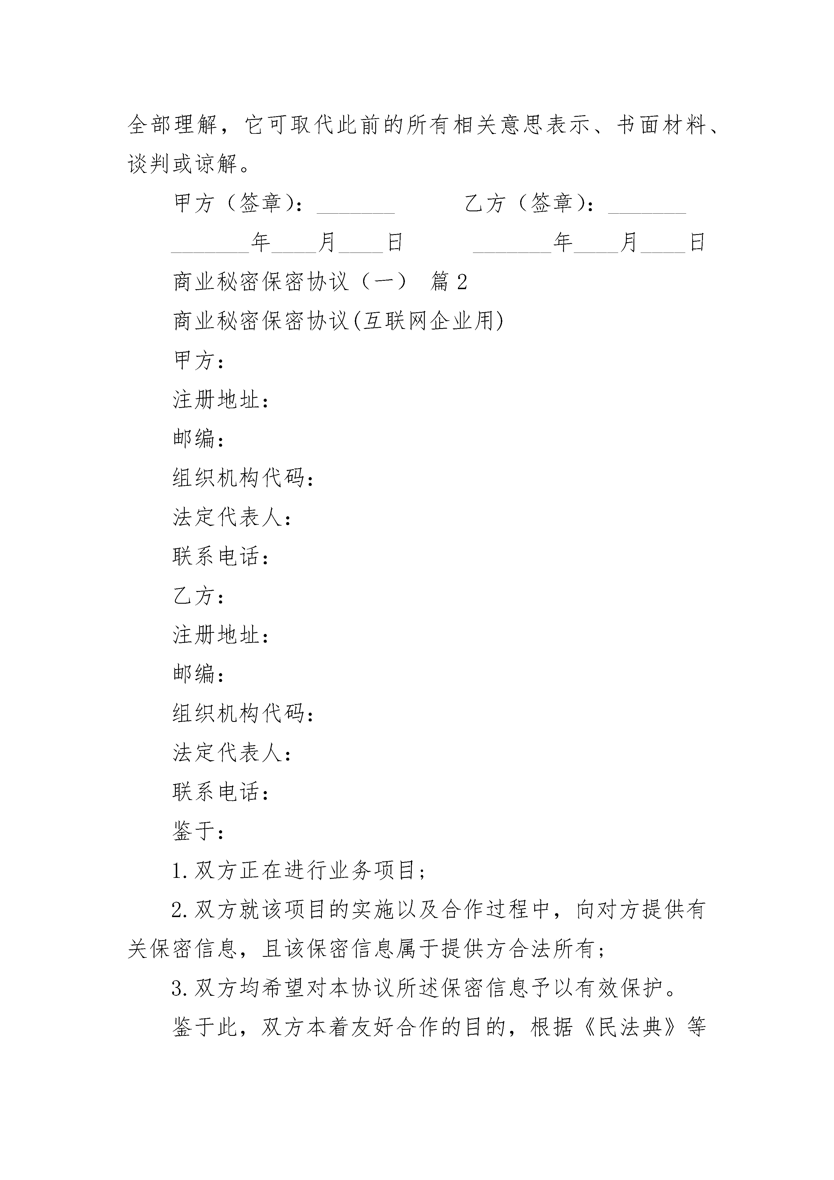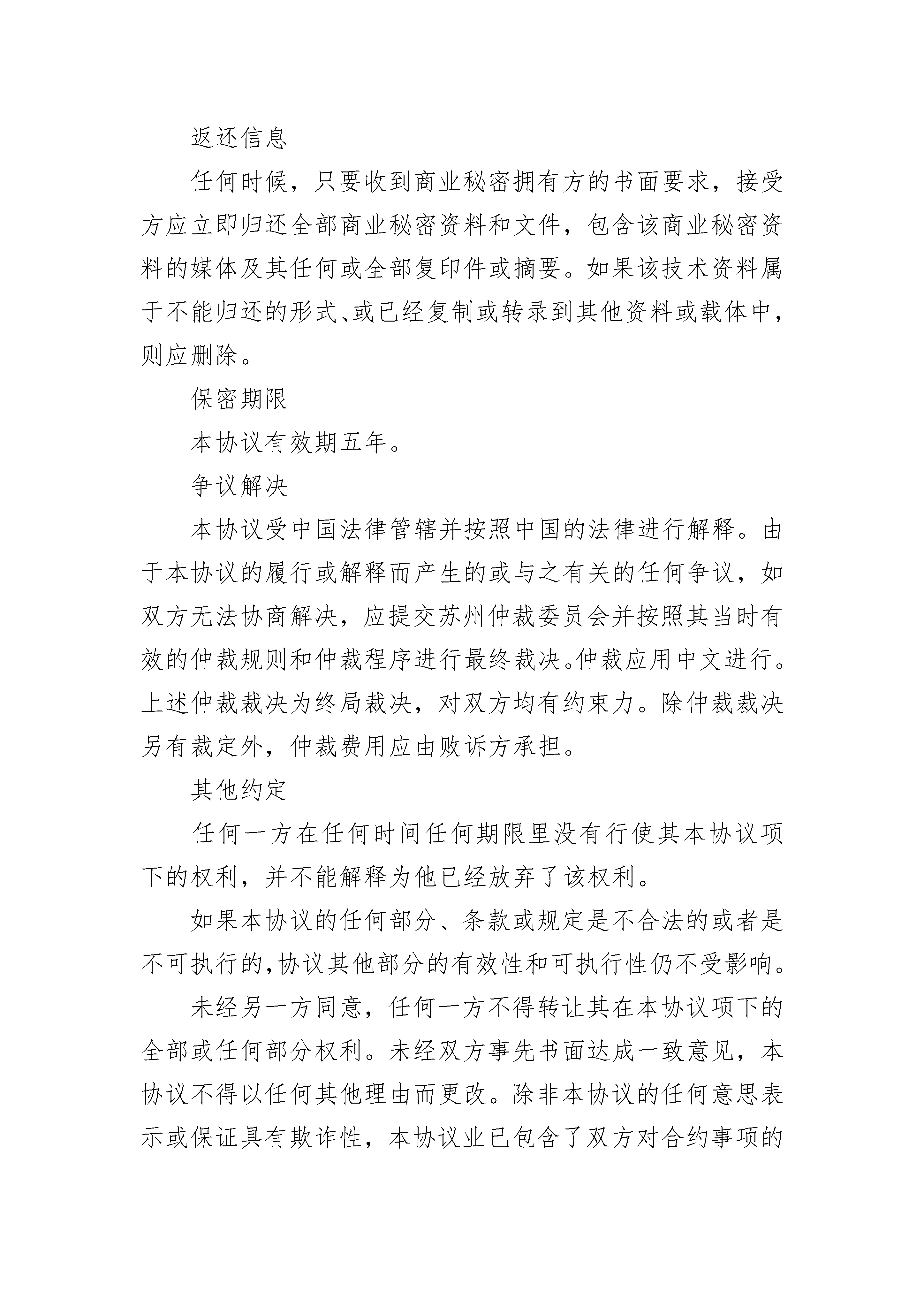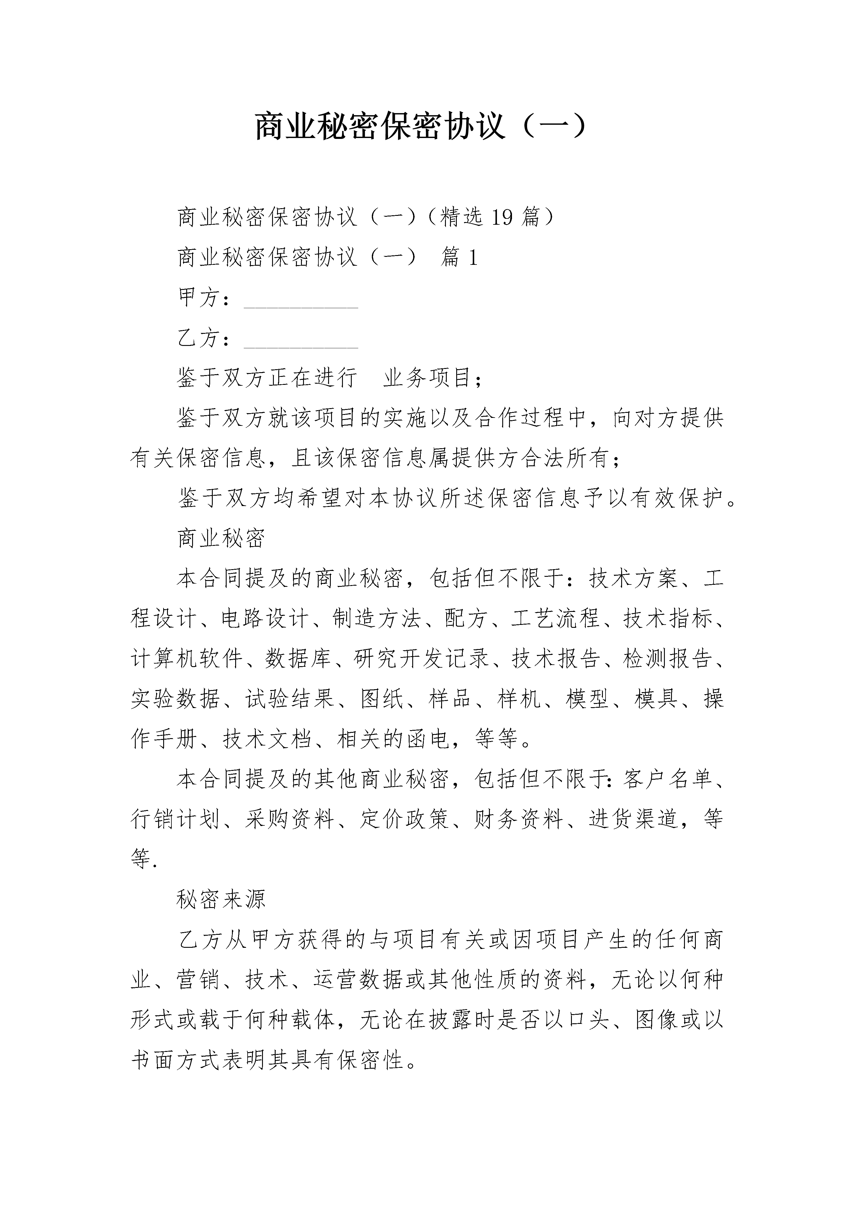 商业秘密保密协议(一)商业秘密保密协议(一)(精选19篇)商业秘密保密协议(一)篇1甲方:__________乙方:__________鉴于双方正在进行业务项目;鉴于双方就该项目的实施以及合作过程中,向对方提供有关保密信息,且该保密信息属提供方合法所有;鉴于双方均希望对本协议所述保密信息予以有效保护。商业秘密本合同提及的商业秘密,包括但不限于:技术方案、工程设计、电路设计、制造方法、配方、工艺流程、技术指标、计算机软件、数据库、研究开发记录、技术报告、检测报告、实验数据、试验结果、图纸、样品、样机、模型、模具、操作手册、技术文档、相关的函电,等等。本合同提及的其他商业秘密,包括但不限于:客户名单、行销计划、采购资料、定价政策、财务资料、进货渠道,等等.秘密来源乙方从甲方获得的与项目有关或因项目产生的任何商业、营销、技术、运营数据或其他性质的资料,无论以何种形式或载于何种载体,无论在披露时是否以口头、图像或以书面方式表明其具有保密性。甲方从乙方获得的与项目有关或因项目产生的任何商业、营销、技术、运营数据或其他性质的资料,无论以何种形式或载于何种载体,无论在披露时是否以口头、图像或以书面方式表明其具有保密性保密义务对拥有方的商业秘密,接受方在此同意:1.严守机密,并采取所有保密措施和制度保护该秘密(包括但不仅限于接受方为保护其自有商业秘密所采用的措施和制度);2.不泄露任何商业秘密给任何第三方;3.除用于履行与对方的合同之外,任何时候均不得利用该秘密;以及,4.不复制或通过反向工程使用该秘密。接受方应当与能接触该商业秘密的员工、代理等签订一份保密协议,此协议的实质内容应与本协议相似。例外约定商业秘密拥有方同意上述条款不适用于下述情形:1.该商业秘密已经或正在变成普通大众可以获取的资料;2.能书面证明接受方从拥有方收到技术资料之前已经熟知该资料;3.由第三方合法提供给他的资料;或者,4.未使用拥有方的技术资料,由接受方独立开发出来的技术。返还信息任何时候,只要收到商业秘密拥有方的书面要求,接受方应立即归还全部商业秘密资料和文件,包含该商业秘密资料的媒体及其任何或全部复印件或摘要。如果该技术资料属于不能归还的形式、或已经复制或转录到其他资料或载体中,则应删除。保密期限本协议有效期五年。争议解决本协议受中国法律管辖并按照中国的法律进行解释。由于本协议的履行或解释而产生的或与之有关的任何争议,如双方无法协商解决,应提交苏州仲裁委员会并按照其当时有效的仲裁规则和仲裁程序进行最终裁决。仲裁应用中文进行。上述仲裁裁决为终局裁决,对双方均有约束力。除仲裁裁决另有裁定外,仲裁费用应由败诉方承担。其他约定任何一方在任何时间任何期限里没有行使其本协议项下的权利,并不能解释为他已经放弃了该权利。如果本协议的任何部分、条款或规定是不合法的或者是不可执行的,协议其他部分的有效性和可执行性仍不受影响。未经另一方同意,任何一方不得转让其在本协议项下的全部或任何部分权利。未经双方事先书面达成一致意见,本协议不得以任何其他理由而更改。除非本协议的任何意思表示或保证具有欺诈性,本协议业已包含了双方对合约事项的全部理解,它可取代此前的所有相关意思表示、书面材料、谈判或谅解。甲方(签章):_______乙方(签章):______________年____月____日_______年____月____日商业秘密保密协议(一)篇2商业秘密保密协议(互联网企业用)甲方:注册地址:邮编:组织机构代码:法定代表人:联系电话:乙方:注册地址:邮编:组织机构代码:法定代表人:联系电话:鉴于:1.双方正在进行业务项目;2.双方就该项目的实施以及合作过程中,向对方提供有关保密信息,且该保密信息属于提供方合法所有;3.双方均希望对本协议所述保密信息予以有效保护。鉴于此,双方本着友好合作的目的,根据《民法典》等有关法律法规的规定,达成如下条款,以资共同遵守:第一条商业秘密1.本合同提及的商业秘密,包括但不限于:技术方案、工程设计、电路设计、制造方法、配方、工艺流程、技术指标、计算机软件、数据库、研究开发记录、技术报告、检测报告、实验数据、试验结果、图纸、样品、样机、模型、模具、操作手册、技术文档、相关的函电,等等。2.本合同提及的其他商业秘密,包括但不限于:客户名单、行销计划、采购资料、定价政策、财务资料、进货渠道等等。第二条秘密来源1.乙方从甲方获得的与项目有关或因项目产生的任何商业、营销、技术、运营数据或其他性质的资料,无论以何种形式或载于何种载体,无论在披露时是否以口头、图像或以书面方式表明其具有保密性。2.甲方从乙方获得的与项目有关或因项目产生的任何商业、营销、技术、运营数据或其他性质的资料,无论以何种形式或载于何种载体,无论在披露时是否以口头、图像或以书面方式表明其