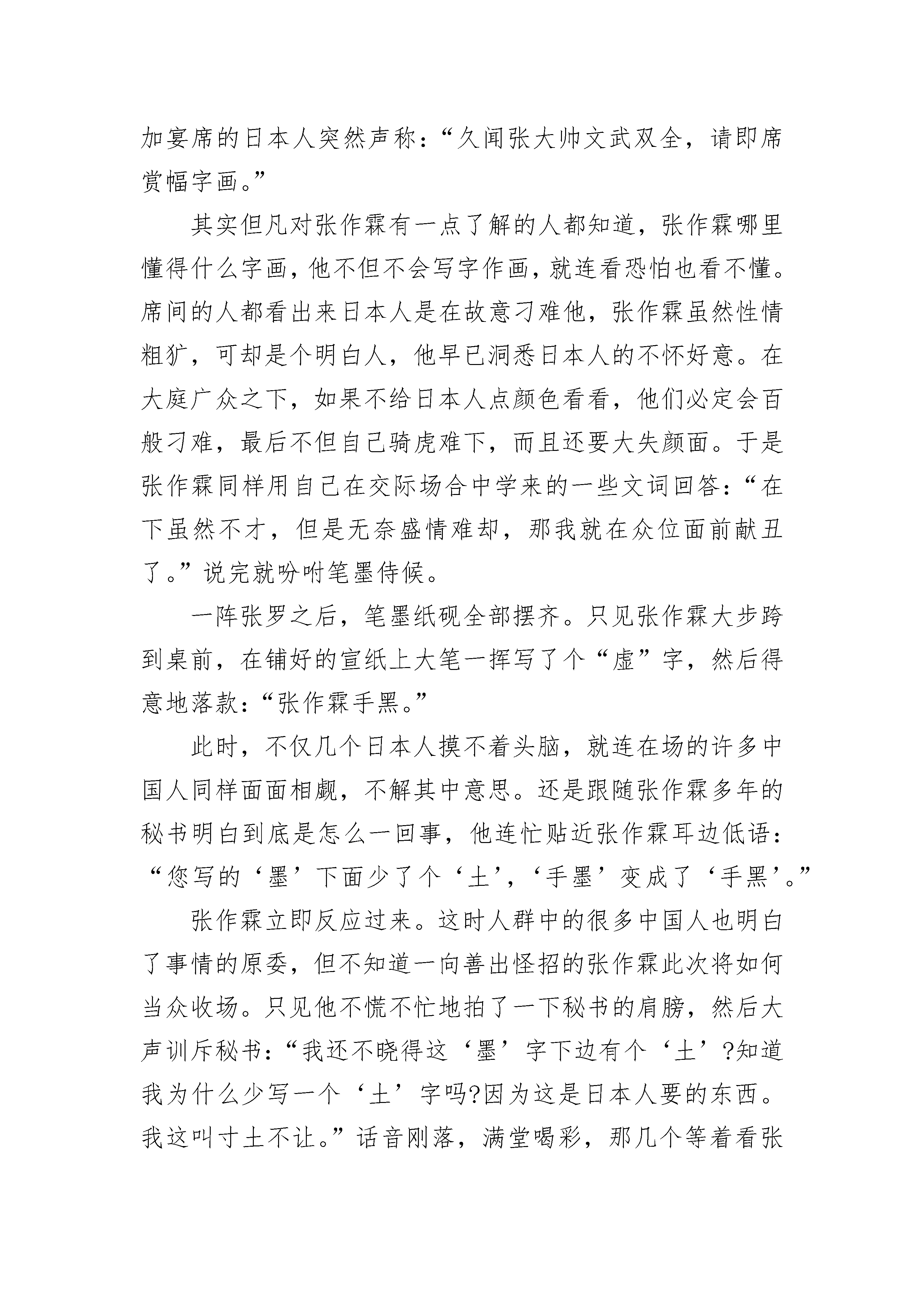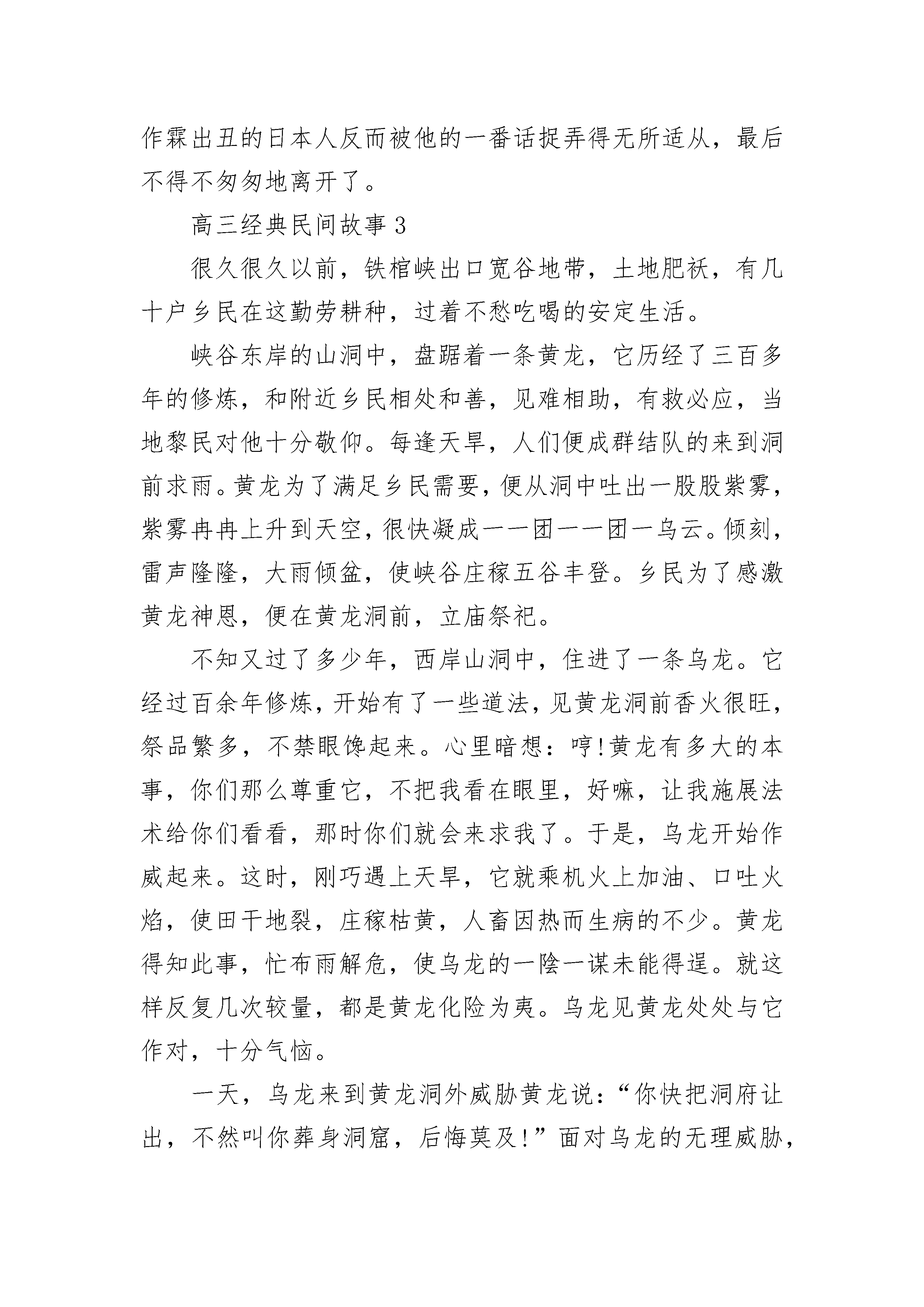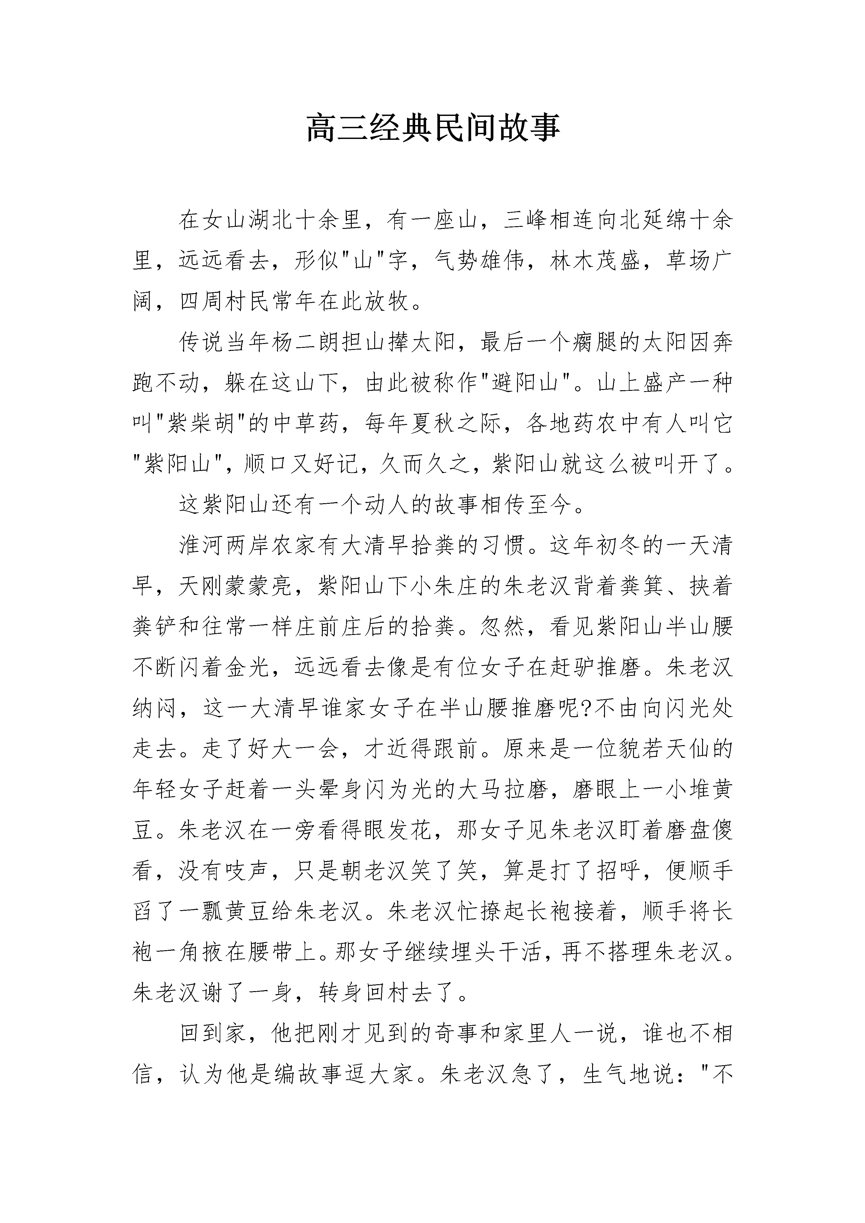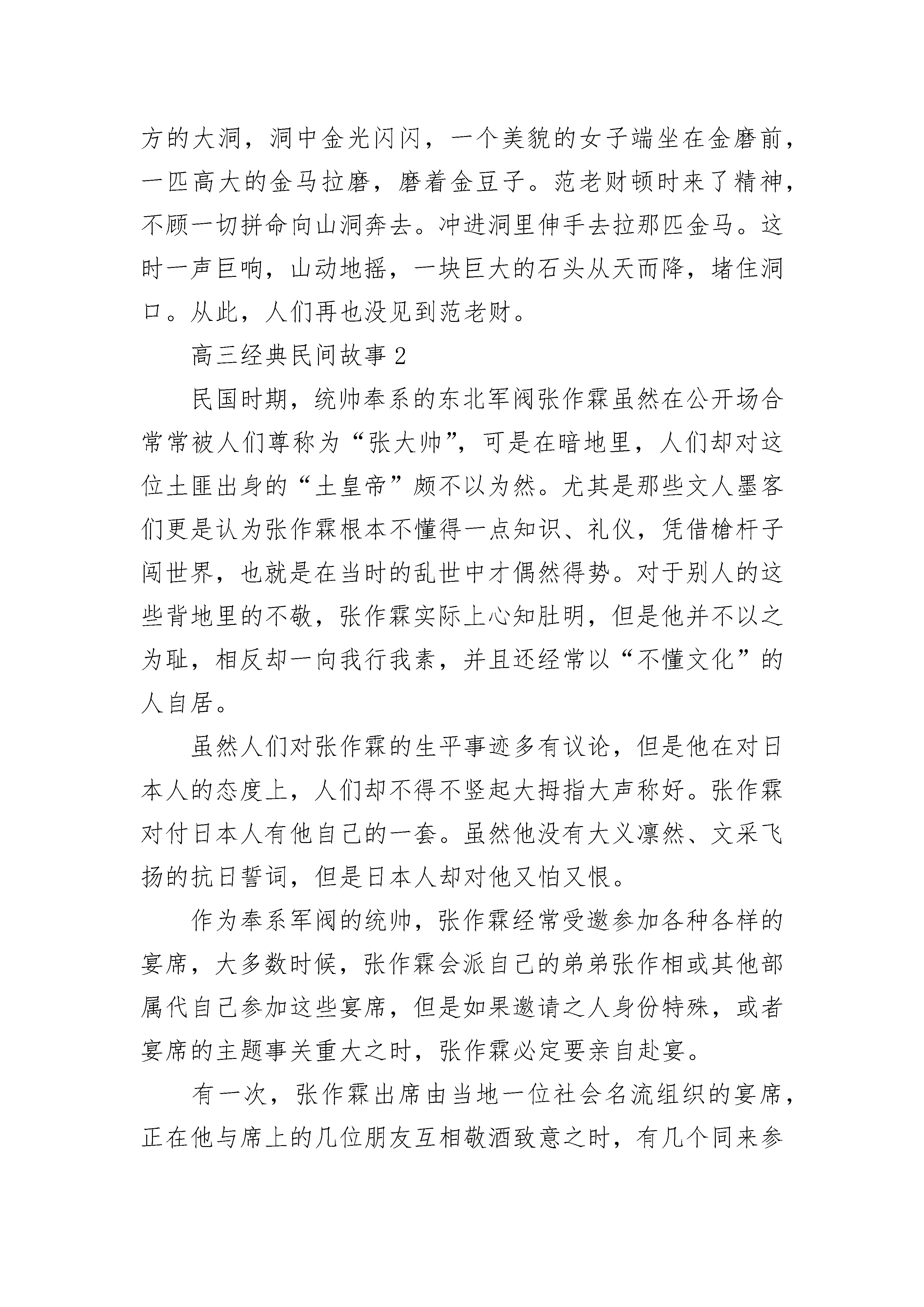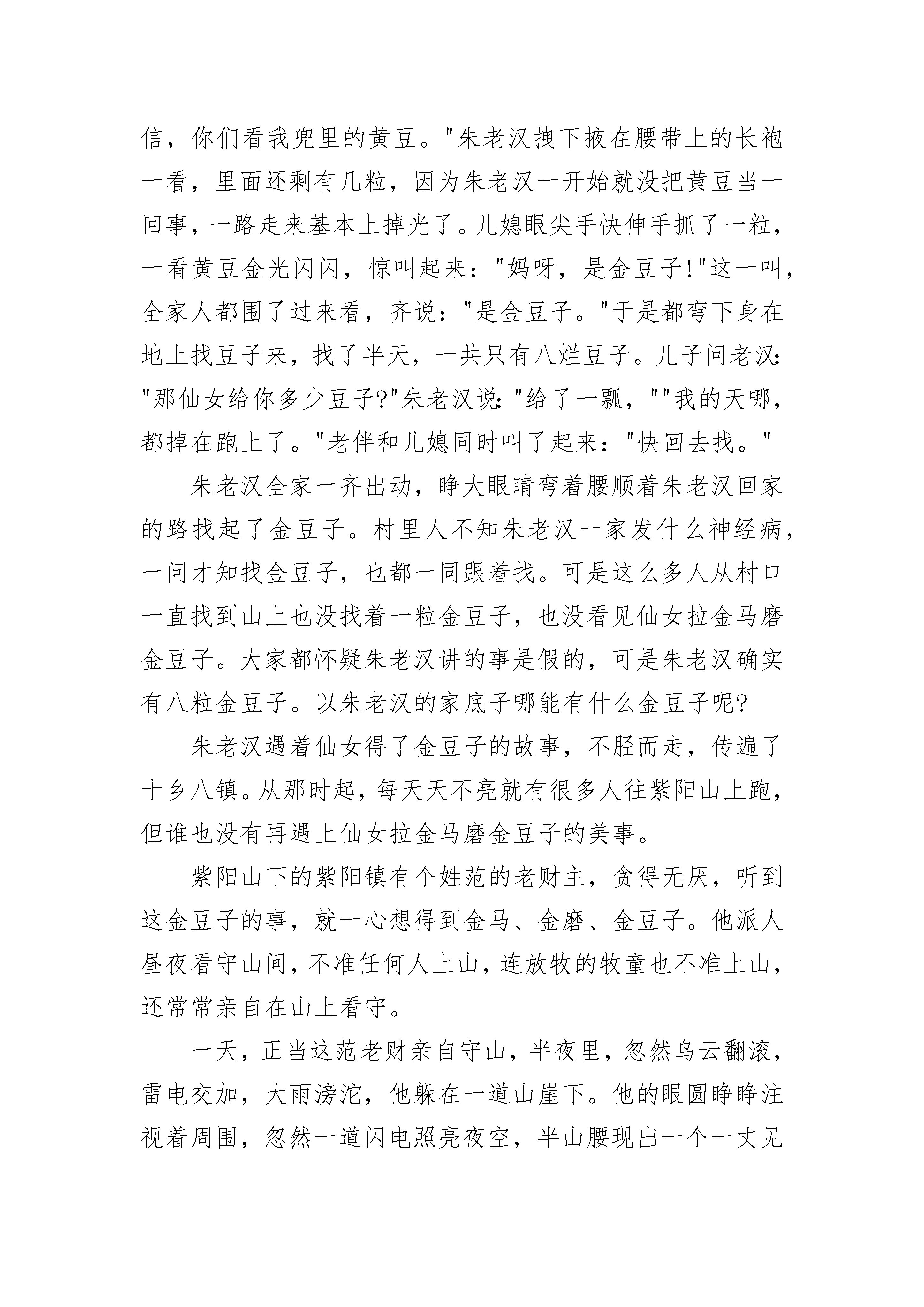 高三经典民间故事在女山湖北十余里,有一座山,三峰相连向北延绵十余里,远远看去,形似"山"字,气势雄伟,林木茂盛,草场广阔,四周村民常年在此放牧。传说当年杨二朗担山撵太阳,最后一个瘸腿的太阳因奔跑不动,躲在这山下,由此被称作"避阳山"。山上盛产一种叫"紫柴胡"的中草药,每年夏秋之际,各地药农中有人叫它"紫阳山",顺口又好记,久而久之,紫阳山就这么被叫开了。这紫阳山还有一个动人的故事相传至今。淮河两岸农家有大清早拾粪的习惯。这年初冬的一天清早,天刚蒙蒙亮,紫阳山下小朱庄的朱老汉背着粪箕、挟着粪铲和往常一样庄前庄后的拾粪。忽然,看见紫阳山半山腰不断闪着金光,远远看去像是有位女子在赶驴推磨。朱老汉纳闷,这一大清早谁家女子在半山腰推磨呢?不由向闪光处走去。走了好大一会,才近得跟前。原来是一位貌若天仙的年轻女子赶着一头晕身闪为光的大马拉磨,磨眼上一小堆黄豆。朱老汉在一旁看得眼发花,那女子见朱老汉盯着磨盘傻看,没有吱声,只是朝老汉笑了笑,算是打了招呼,便顺手舀了一瓢黄豆给朱老汉。朱老汉忙撩起长袍接着,顺手将长袍一角掖在腰带上。那女子继续埋头干活,再不搭理朱老汉。朱老汉谢了一身,转身回村去了。回到家,他把刚才见到的奇事和家里人一说,谁也不相信,认为他是编故事逗大家。朱老汉急了,生气地说:"不信,你们看我兜里的黄豆。"朱老汉拽下掖在腰带上的长袍一看,里面还剩有几粒,因为朱老汉一开始就没把黄豆当一回事,一路走来基本上掉光了。儿媳眼尖手快伸手抓了一粒,一看黄豆金光闪闪,惊叫起来:"妈呀,是金豆子!"这一叫,全家人都围了过来看,齐说:"是金豆子。"于是都弯下身在地上找豆子来,找了半天,一共只有八烂豆子。儿子问老汉:"那仙女给你多少豆子?"朱老汉说:"给了一瓢,""我的天哪,都掉在跑上了。"老伴和儿媳同时叫了起来:"快回去找。"朱老汉全家一齐出动,睁大眼睛弯着腰顺着朱老汉回家的路找起了金豆子。村里人不知朱老汉一家发什么神经病,一问才知找金豆子,也都一同跟着找。可是这么多人从村口一直找到山上也没找着一粒金豆子,也没看见仙女拉金马磨金豆子。大家都怀疑朱老汉讲的事是假的,可是朱老汉确实有八粒金豆子。以朱老汉的家底子哪能有什么金豆子呢?朱老汉遇着仙女得了金豆子的故事,不胫而走,传遍了十乡八镇。从那时起,每天天不亮就有很多人往紫阳山上跑,但谁也没有再遇上仙女拉金马磨金豆子的美事。紫阳山下的紫阳镇有个姓范的老财主,贪得无厌,听到这金豆子的事,就一心想得到金马、金磨、金豆子。他派人昼夜看守山间,不准任何人上山,连放牧的牧童也不准上山,还常常亲自在山上看守。一天,正当这范老财亲自守山,半夜里,忽然乌云翻滚,雷电交加,大雨滂沱,他躲在一道山崖下。他的眼圆睁睁注视着周围,忽然一道闪电照亮夜空,半山腰现出一个一丈见方的大洞,洞中金光闪闪,一个美貌的女子端坐在金磨前,一匹高大的金马拉磨,磨着金豆子。范老财顿时来了精神,不顾一切拼命向山洞奔去。冲进洞里伸手去拉那匹金马。这时一声巨响,山动地摇,一块巨大的石头从天而降,堵住洞口。从此,人们再也没见到范老财。高三经典民间故事2民国时期,统帅奉系的东北军阀张作霖虽然在公开场合常常被人们尊称为“张大帅”,可是在暗地里,人们却对这位土匪出身的“土皇帝”颇不以为然。尤其是那些文人墨客们更是认为张作霖根本不懂得一点知识、礼仪,凭借槍杆子闯世界,也就是在当时的乱世中才偶然得势。对于别人的这些背地里的不敬,张作霖实际上心知肚明,但是他并不以之为耻,相反却一向我行我素,并且还经常以“不懂文化”的人自居。虽然人们对张作霖的生平事迹多有议论,但是他在对日本人的态度上,人们却不得不竖起大拇指大声称好。张作霖对付日本人有他自己的一套。虽然他没有大义凛然、文采飞扬的抗日誓词,但是日本人却对他又怕又恨。作为奉系军阀的统帅,张作霖经常受邀参加各种各样的宴席,大多数时候,张作霖会派自己的弟弟张作相或其他部属代自己参加这些宴席,但是如果邀请之人身份特殊,或者宴席的主题事关重大之时,张作霖必定要亲自赴宴。有一次,张作霖出席由当地一位社会名流组织的宴席,正在他与席上的几位朋友互相敬酒致意之时,有几个同来参加宴席的日本人突然声称:“久闻张大帅文武双全,请即席赏幅字画。”其实但凡对张作霖有一点了解的人都知道,张作霖哪里懂得什么字画,他不但不会写字作画,就连看恐怕也看不懂。席间的人都看出来日本人是在故意刁难他,张作霖虽然性情粗犷,可却是个明白人,他早已洞悉日本人的不怀好意。在大庭广众之下,如果不给日本人点颜色看看,他们必定会百般刁难,最后不但自己骑虎难下,而且还要大失颜面。于是张作霖同样用自己在交际场合中学来的一些文词回答:“在下虽然不才,但是无奈盛情难却,那我就在众位面前献丑了。”说完就吩咐笔墨侍候。一阵张罗之后,笔墨纸砚全部摆齐。只见张作霖大步跨到桌前,在铺好的宣纸上