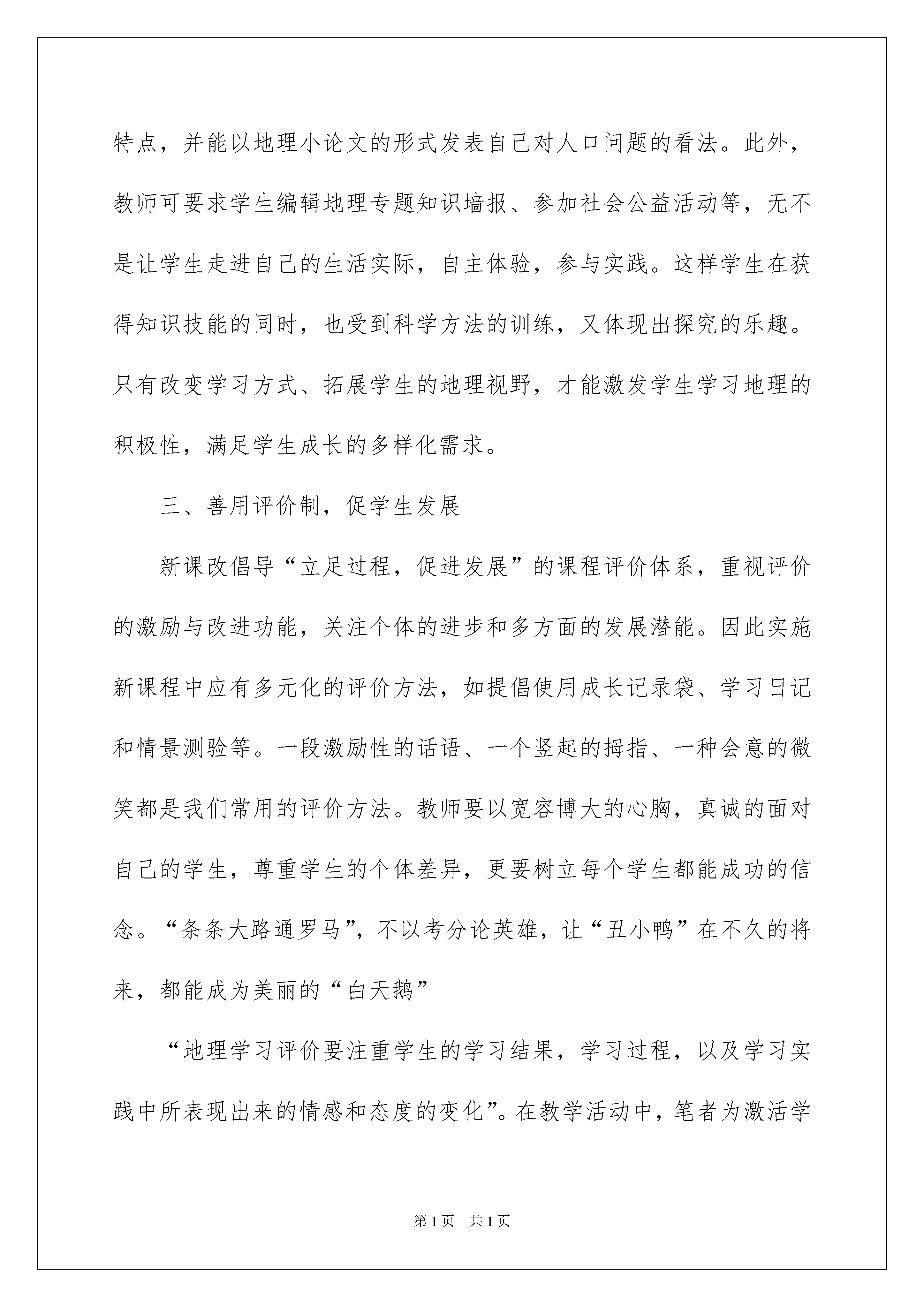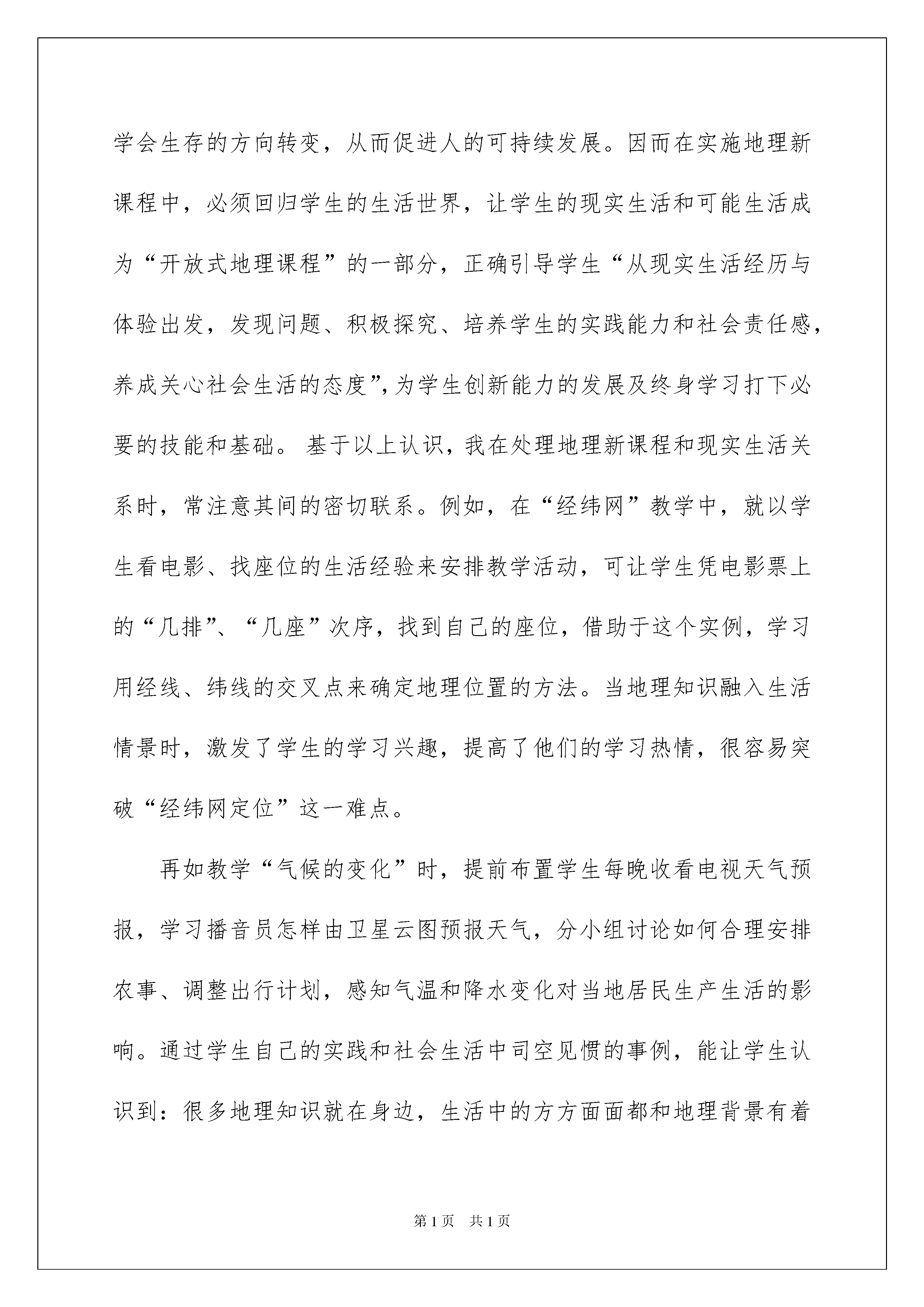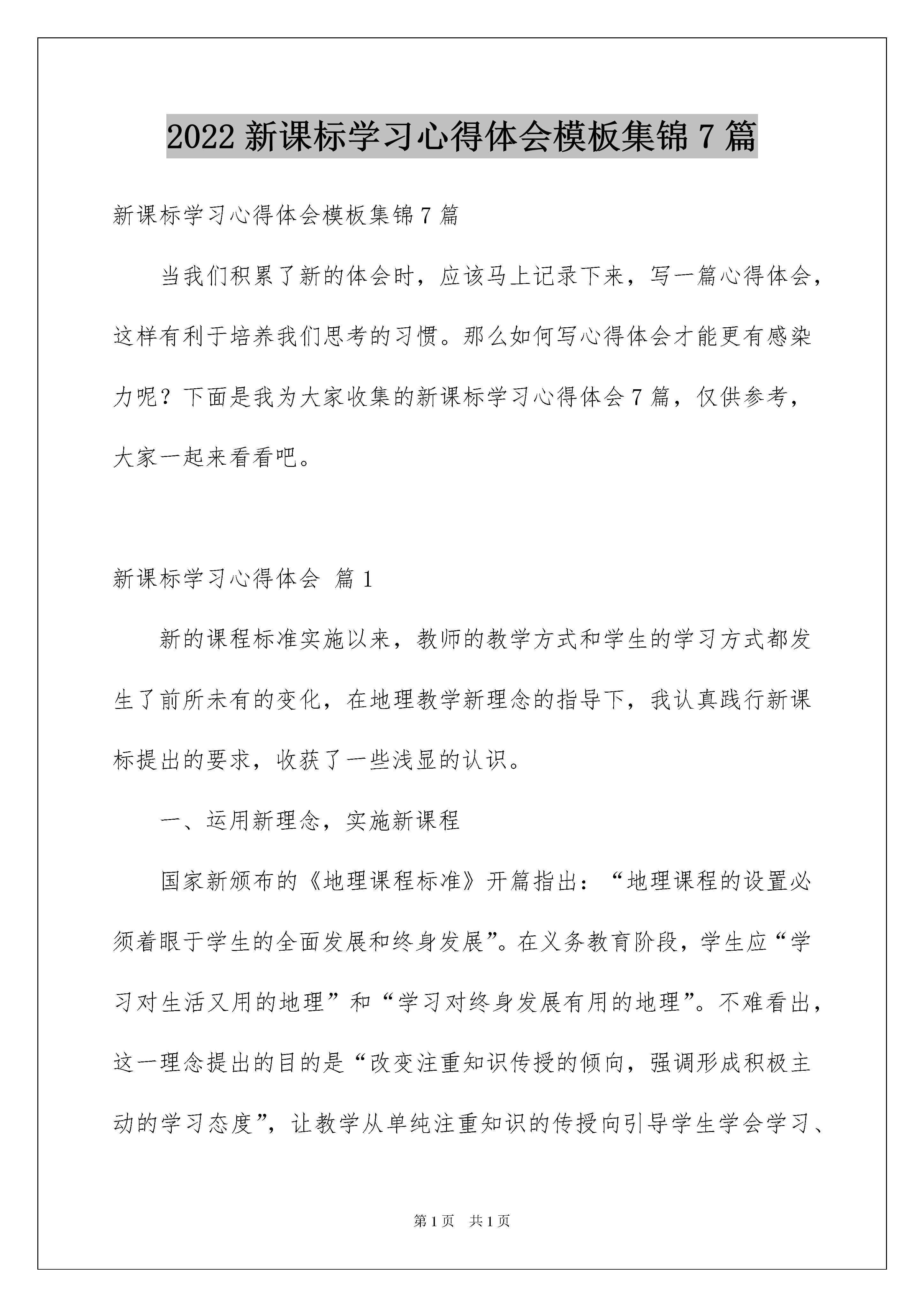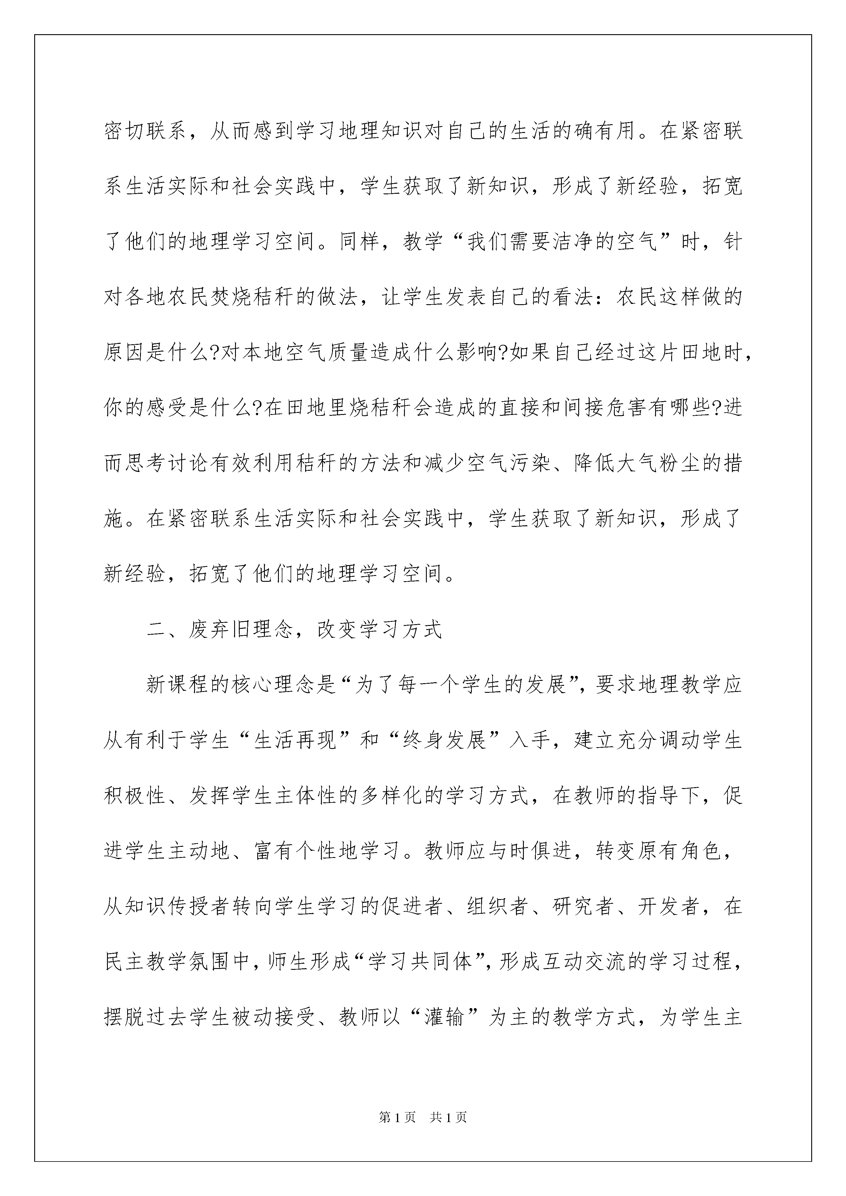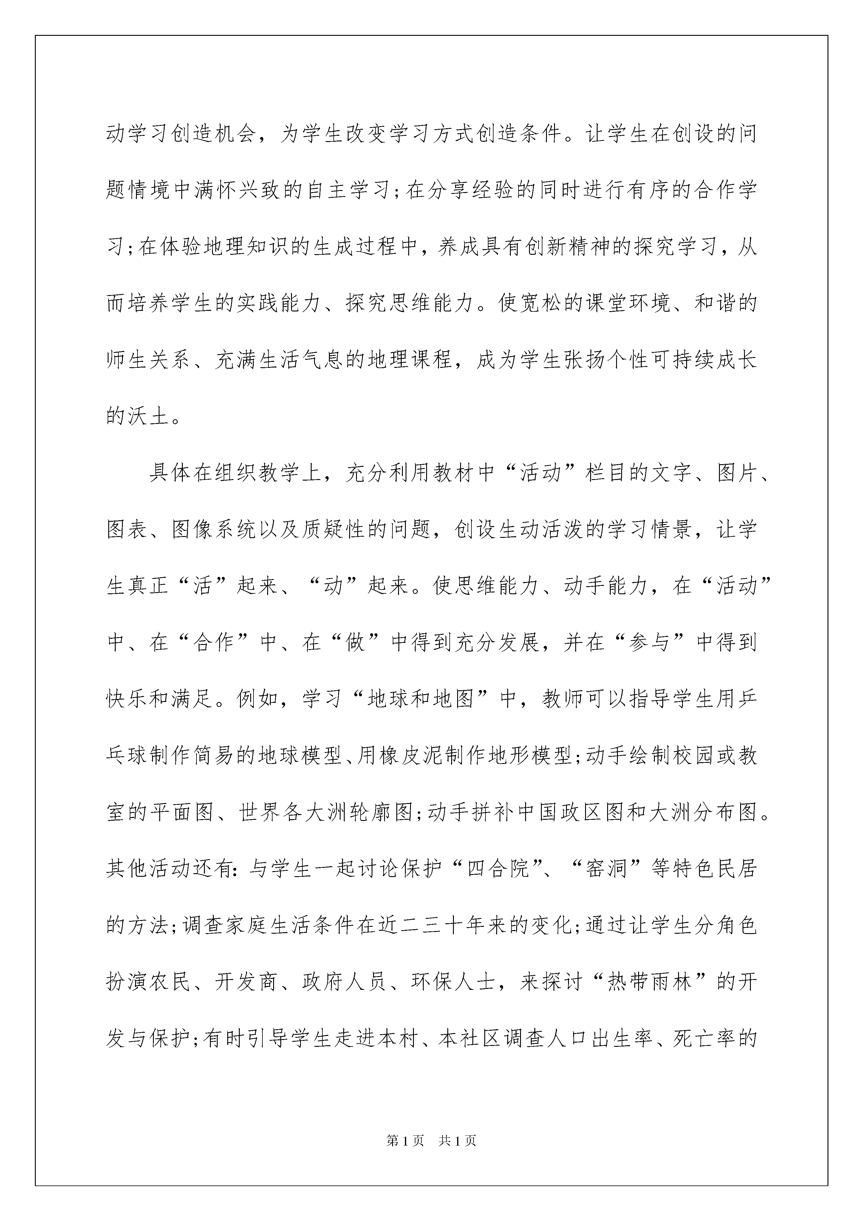 2022新课标学习心得体会模板集锦7篇新课标学习心得体会模板集锦7篇当我们积累了新的体会时,应该马上记录下来,写一篇心得体会,这样有利于培养我们思考的习惯。那么如何写心得体会才能更有感染力呢?下面是我为大家收集的新课标学习心得体会7篇,仅供参考,大家一起来看看吧。新课标学习心得体会篇1新的课程标准实施以来,教师的教学方式和学生的学习方式都发生了前所未有的变化,在地理教学新理念的指导下,我认真践行新课标提出的要求,收获了一些浅显的认识。一、运用新理念,实施新课程国家新颁布的《地理课程标准》开篇指出:“地理课程的设置必须着眼于学生的全面发展和终身发展”。在义务教育阶段,学生应“学习对生活又用的地理”和“学习对终身发展有用的地理”。不难看出,这一理念提出的目的是“改变注重知识传授的倾向,强调形成积极主动的学习态度”,让教学从单纯注重知识的传授向引导学生学会学习、学会生存的方向转变,从而促进人的可持续发展。因而在实施地理新课程中,必须回归学生的生活世界,让学生的现实生活和可能生活成为“开放式地理课程”的一部分,正确引导学生“从现实生活经历与体验出发,发现问题、积极探究、培养学生的实践能力和社会责任感,养成关心社会生活的态度”,为学生创新能力的发展及终身学习打下必要的技能和基础。基于以上认识,我在处理地理新课程和现实生活关系时,常注意其间的密切联系。例如,在“经纬网”教学中,就以学生看电影、找座位的生活经验来安排教学活动,可让学生凭电影票上的“几排”、“几座”次序,找到自己的座位,借助于这个实例,学习用经线、纬线的交叉点来确定地理位置的方法。当地理知识融入生活情景时,激发了学生的学习兴趣,提高了他们的学习热情,很容易突破“经纬网定位”这一难点。再如教学“气候的变化”时,提前布置学生每晚收看电视天气预报,学习播音员怎样由卫星云图预报天气,分小组讨论如何合理安排农事、调整出行计划,感知气温和降水变化对当地居民生产生活的影响。通过学生自己的实践和社会生活中司空见惯的事例,能让学生认识到:很多地理知识就在身边,生活中的方方面面都和地理背景有着密切联系,从而感到学习地理知识对自己的生活的确有用。在紧密联系生活实际和社会实践中,学生获取了新知识,形成了新经验,拓宽了他们的地理学习空间。同样,教学“我们需要洁净的空气”时,针对各地农民焚烧秸秆的做法,让学生发表自己的看法:农民这样做的原因是什么?对本地空气质量造成什么影响?如果自己经过这片田地时,你的感受是什么?在田地里烧秸秆会造成的直接和间接危害有哪些?进而思考讨论有效利用秸秆的方法和减少空气污染、降低大气粉尘的措施。在紧密联系生活实际和社会实践中,学生获取了新知识,形成了新经验,拓宽了他们的地理学习空间。二、废弃旧理念,改变学习方式新课程的核心理念是“为了每一个学生的发展”,要求地理教学应从有利于学生“生活再现”和“终身发展”入手,建立充分调动学生积极性、发挥学生主体性的多样化的学习方式,在教师的指导下,促进学生主动地、富有个性地学习。教师应与时俱进,转变原有角色,从知识传授者转向学生学习的促进者、组织者、研究者、开发者,在民主教学氛围中,师生形成“学习共同体”,形成互动交流的学习过程,摆脱过去学生被动接受、教师以“灌输”为主的教学方式,为学生主动学习创造机会,为学生改变学习方式创造条件。让学生在创设的问题情境中满怀兴致的自主学习;在分享经验的同时进行有序的合作学习;在体验地理知识的生成过程中,养成具有创新精神的探究学习,从而培养学生的实践能力、探究思维能力。使宽松的课堂环境、和谐的师生关系、充满生活气息的地理课程,成为学生张扬个性可持续成长的沃土。具体在组织教学上,充分利用教材中“活动”栏目的文字、图片、图表、图像系统以及质疑性的问题,创设生动活泼的学习情景,让学生真正“活”起来、“动”起来。使思维能力、动手能力,在“活动”中、在“合作”中、在“做”中得到充分发展,并在“参与”中得到快乐和满足。例如,学习“地球和地图”中,教师可以指导学生用乒乓球制作简易的地球模型、用橡皮泥制作地形模型;动手绘制校园或教室的平面图、世界各大洲轮廓图;动手拼补中国政区图和大洲分布图。其他活动还有:与学生一起讨论保护“四合院”、“窑洞”等特色民居的方法;调查家庭生活条件在近二三十年来的变化;通过让学生分角色扮演农民、开发商、政府人员、环保人士,来探讨“热带雨林”的开发与保护;有时引导学生走进本村、本社区调查人口出生率、死亡率的特点,并能以地理小论文的形式发表自己对人口问题的看法。此外,教师可要求学生编辑地理专题知识墙报、参加社会公益活动等,无不是让学生走进自己的