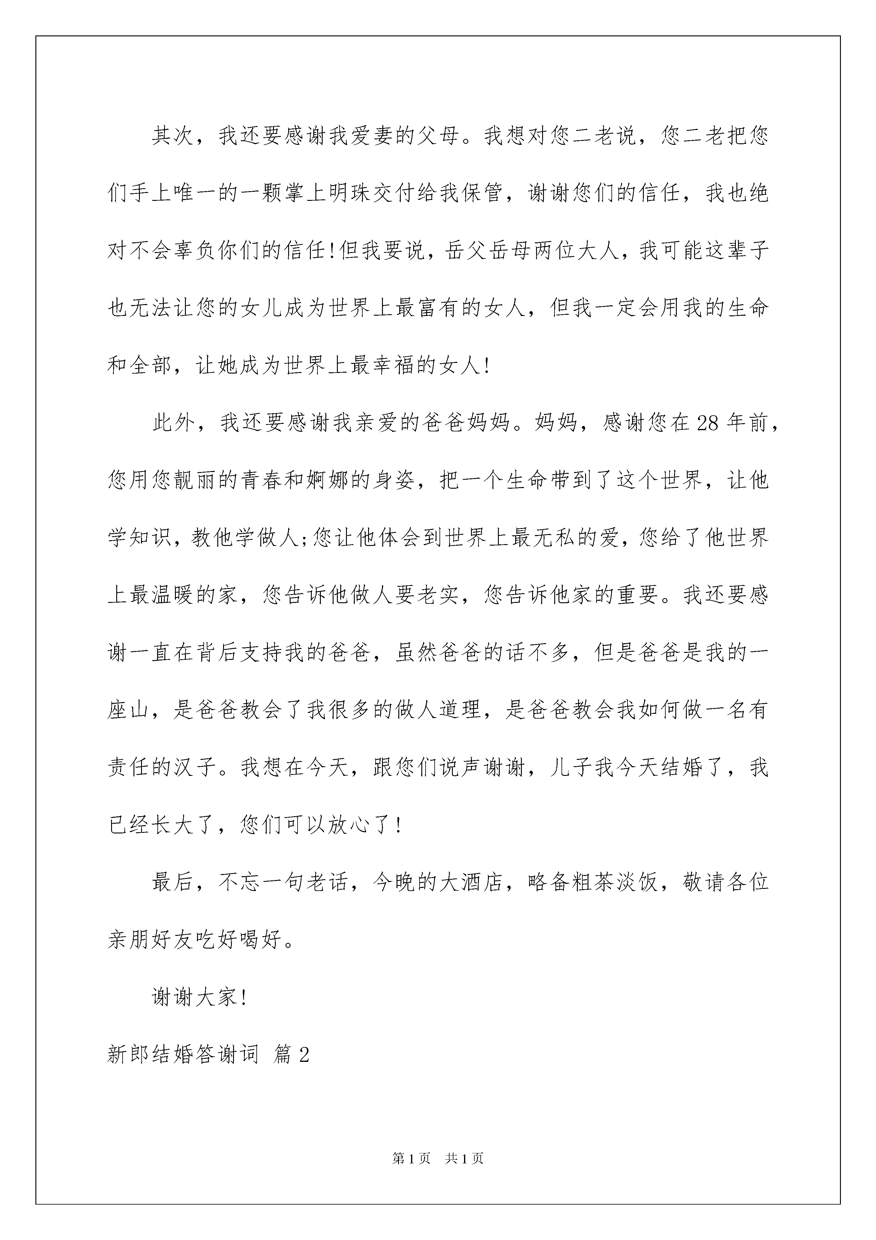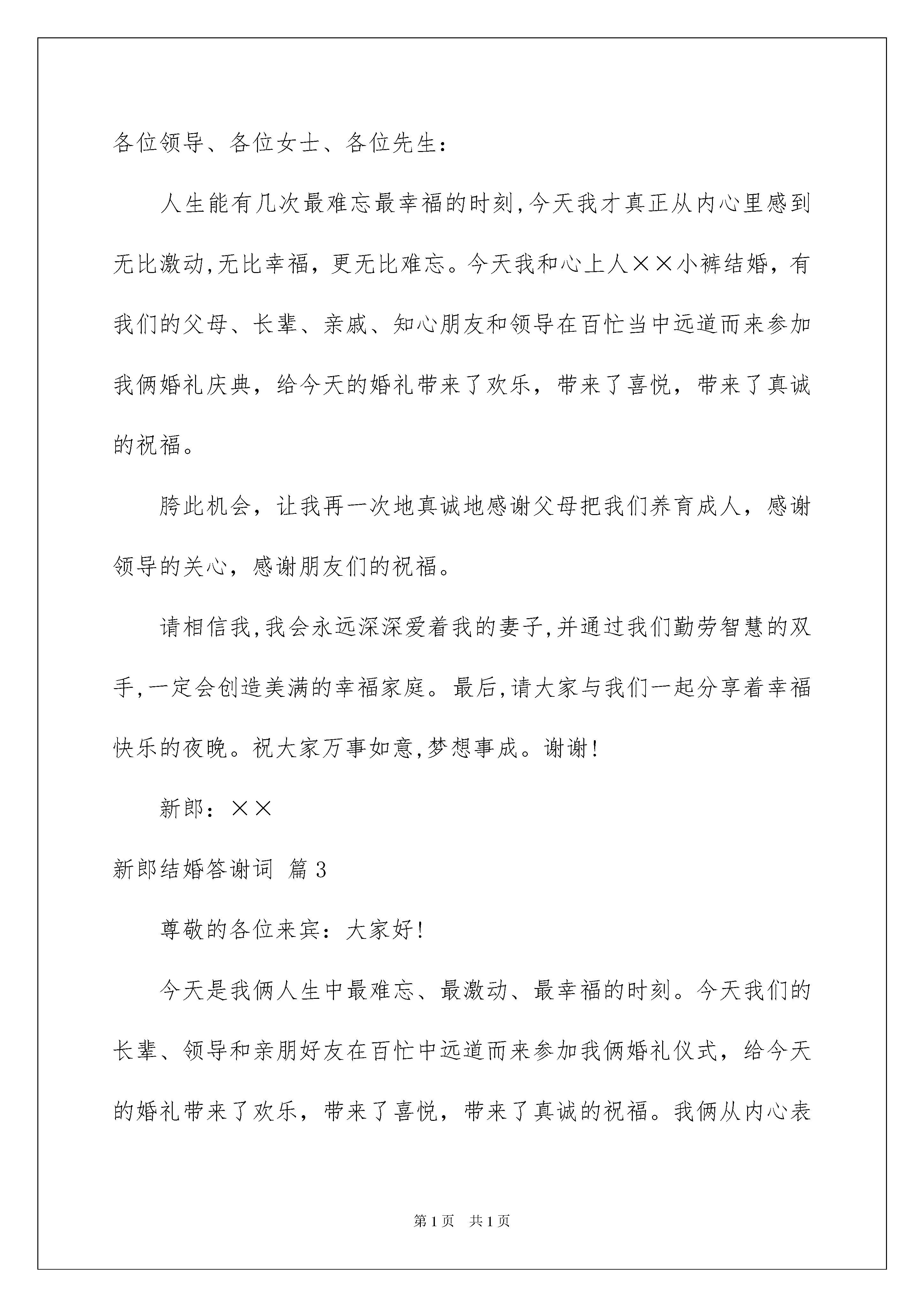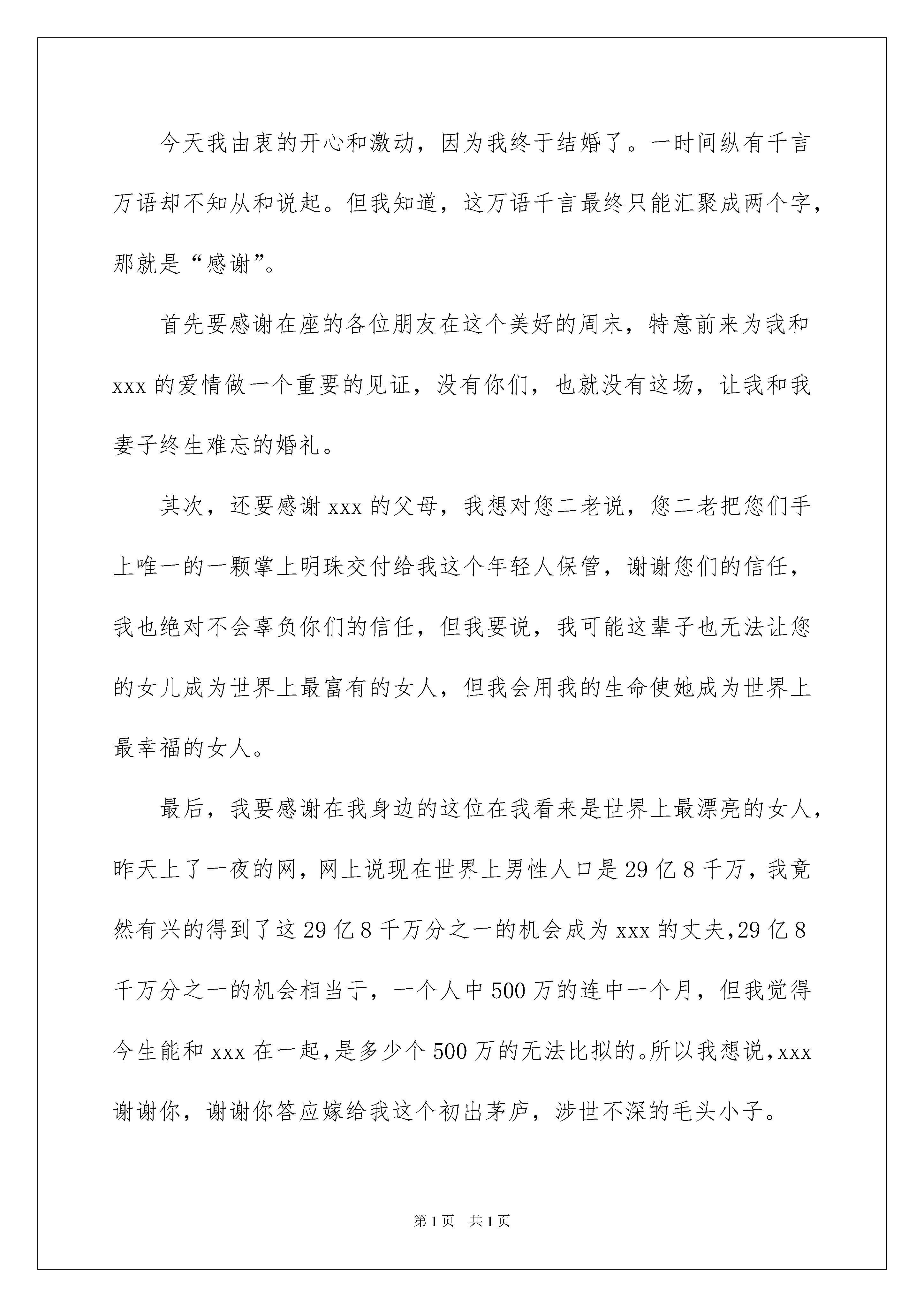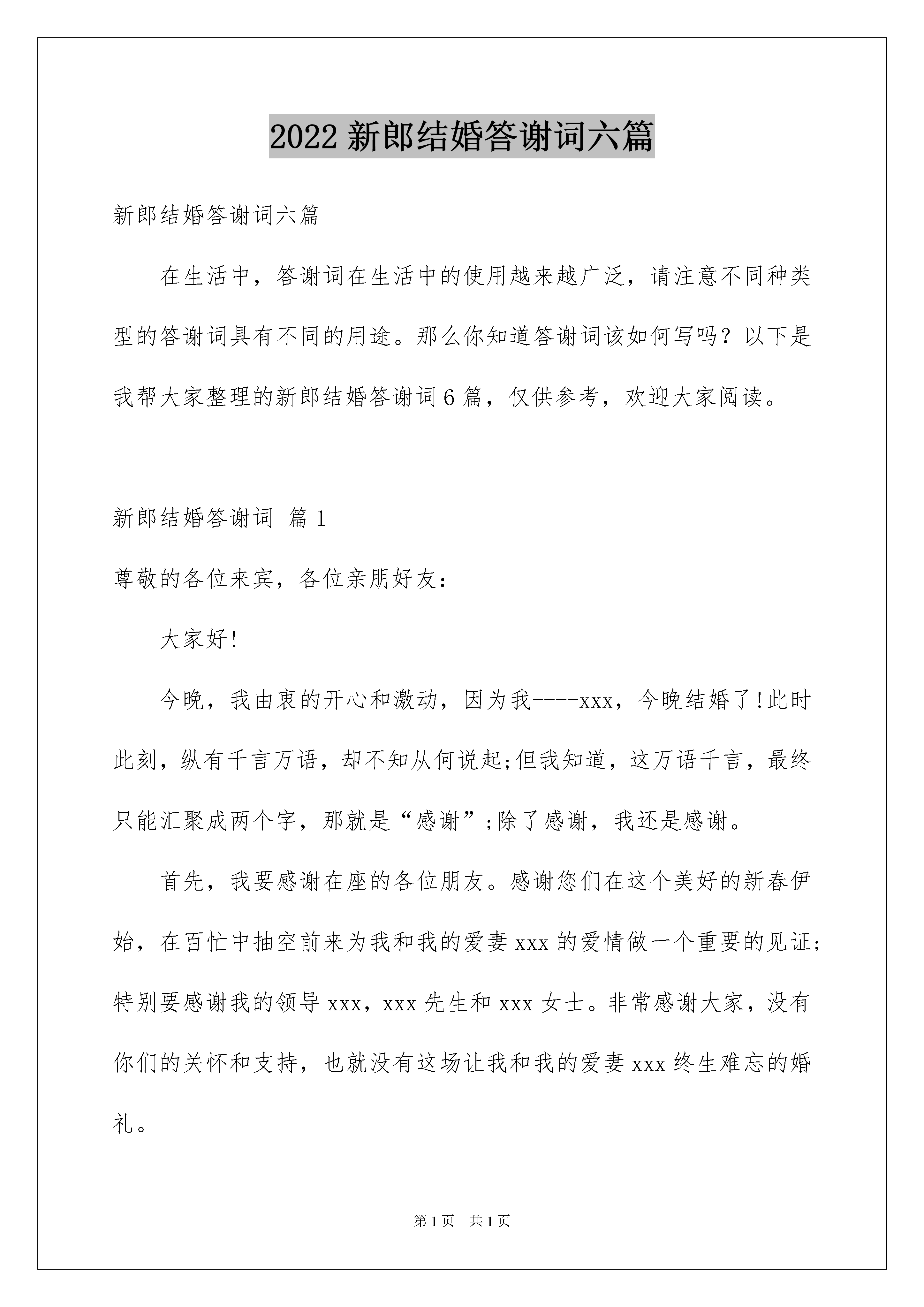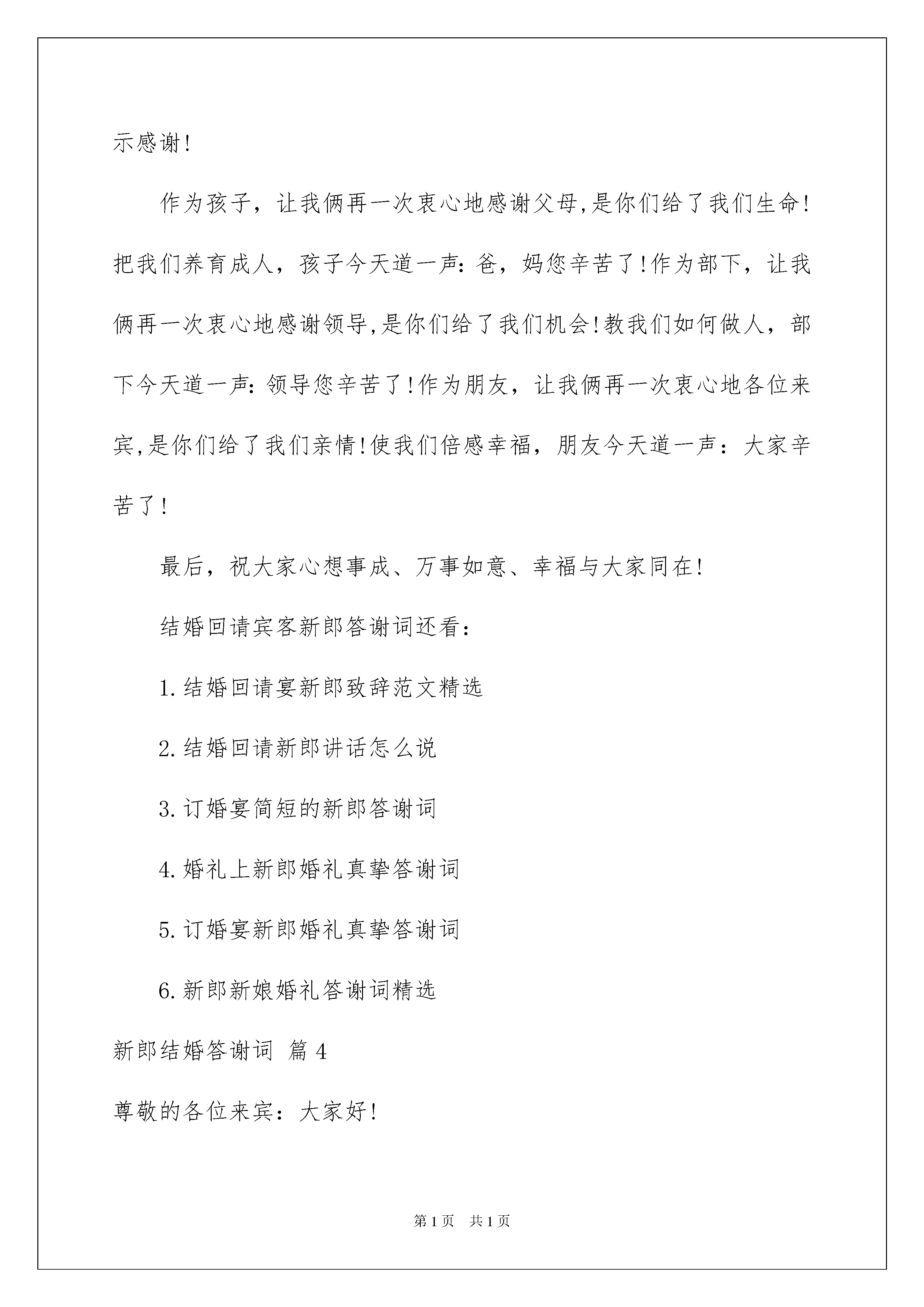 2022新郎结婚答谢词六篇新郎结婚答谢词六篇在生活中,答谢词在生活中的使用越来越广泛,请注意不同种类型的答谢词具有不同的用途。那么你知道答谢词该如何写吗?以下是我帮大家整理的新郎结婚答谢词6篇,仅供参考,欢迎大家阅读。新郎结婚答谢词篇1尊敬的各位来宾,各位亲朋好友:大家好!今晚,我由衷的开心和激动,因为我----xxx,今晚结婚了!此时此刻,纵有千言万语,却不知从何说起;但我知道,这万语千言,最终只能汇聚成两个字,那就是“感谢”;除了感谢,我还是感谢。首先,我要感谢在座的各位朋友。感谢您们在这个美好的新春伊始,在百忙中抽空前来为我和我的爱妻xxx的爱情做一个重要的见证;特别要感谢我的领导xxx,xxx先生和xxx女士。非常感谢大家,没有你们的关怀和支持,也就没有这场让我和我的爱妻xxx终生难忘的婚礼。其次,我还要感谢我爱妻的父母。我想对您二老说,您二老把您们手上唯一的一颗掌上明珠交付给我保管,谢谢您们的信任,我也绝对不会辜负你们的信任!但我要说,岳父岳母两位大人,我可能这辈子也无法让您的女儿成为世界上最富有的女人,但我一定会用我的生命和全部,让她成为世界上最幸福的女人!此外,我还要感谢我亲爱的爸爸妈妈。妈妈,感谢您在28年前,您用您靓丽的青春和婀娜的身姿,把一个生命带到了这个世界,让他学知识,教他学做人;您让他体会到世界上最无私的爱,您给了他世界上最温暖的家,您告诉他做人要老实,您告诉他家的重要。我还要感谢一直在背后支持我的爸爸,虽然爸爸的话不多,但是爸爸是我的一座山,是爸爸教会了我很多的做人道理,是爸爸教会我如何做一名有责任的汉子。我想在今天,跟您们说声谢谢,儿子我今天结婚了,我已经长大了,您们可以放心了!最后,不忘一句老话,今晚的大酒店,略备粗茶淡饭,敬请各位亲朋好友吃好喝好。谢谢大家!新郎结婚答谢词篇2各位领导、各位女士、各位先生:人生能有几次最难忘最幸福的时刻,今天我才真正从内心里感到无比激动,无比幸福,更无比难忘。今天我和心上人××小裤结婚,有我们的父母、长辈、亲戚、知心朋友和领导在百忙当中远道而来参加我俩婚礼庆典,给今天的婚礼带来了欢乐,带来了喜悦,带来了真诚的祝福。胯此机会,让我再一次地真诚地感谢父母把我们养育成人,感谢领导的关心,感谢朋友们的祝福。请相信我,我会永远深深爱着我的妻子,并通过我们勤劳智慧的双手,一定会创造美满的幸福家庭。最后,请大家与我们一起分享着幸福快乐的夜晚。祝大家万事如意,梦想事成。谢谢!新郎:××新郎结婚答谢词篇3尊敬的各位来宾:大家好!今天是我俩人生中最难忘、最激动、最幸福的时刻。今天我们的长辈、领导和亲朋好友在百忙中远道而来参加我俩婚礼仪式,给今天的婚礼带来了欢乐,带来了喜悦,带来了真诚的祝福。我俩从内心表示感谢!作为孩子,让我俩再一次衷心地感谢父母,是你们给了我们生命!把我们养育成人,孩子今天道一声:爸,妈您辛苦了!作为部下,让我俩再一次衷心地感谢领导,是你们给了我们机会!教我们如何做人,部下今天道一声:领导您辛苦了!作为朋友,让我俩再一次衷心地各位来宾,是你们给了我们亲情!使我们倍感幸福,朋友今天道一声:大家辛苦了!最后,祝大家心想事成、万事如意、幸福与大家同在!结婚回请宾客新郎答谢词还看:1.结婚回请宴新郎致辞范文精选2.结婚回请新郎讲话怎么说3.订婚宴简短的新郎答谢词4.婚礼上新郎婚礼真挚答谢词5.订婚宴新郎婚礼真挚答谢词6.新郎新娘婚礼答谢词精选新郎结婚答谢词篇4尊敬的各位来宾:大家好!今天我由衷的开心和激动,因为我终于结婚了。一时间纵有千言万语却不知从和说起。但我知道,这万语千言最终只能汇聚成两个字,那就是“感谢”。首先要感谢在座的各位朋友在这个美好的周末,特意前来为我和xxx的爱情做一个重要的见证,没有你们,也就没有这场,让我和我妻子终生难忘的婚礼。其次,还要感谢xxx的父母,我想对您二老说,您二老把您们手上唯一的一颗掌上明珠交付给我这个年轻人保管,谢谢您们的信任,我也绝对不会辜负你们的信任,但我要说,我可能这辈子也无法让您的女儿成为世界上最富有的女人,但我会用我的生命使她成为世界上最幸福的女人。最后,我要感谢在我身边的这位在我看来是世界上最漂亮的女人,昨天上了一夜的网,网上说现在世界上男性人口是29亿8千万,我竟然有兴的得到了这29亿8千万分之一的机会成为xxx的丈夫,29亿8千万分之一的机会相当于,一个人中500万的连中一个月,但我觉得今生能和xxx在一起,是多少个500万的无法比拟的。所以我想说,xxx谢谢你,谢谢你答应嫁给我这个初出茅庐,涉世不深的毛头小子。但是此时此刻,我的心里却有一丝深深的对你愧疚,因为我