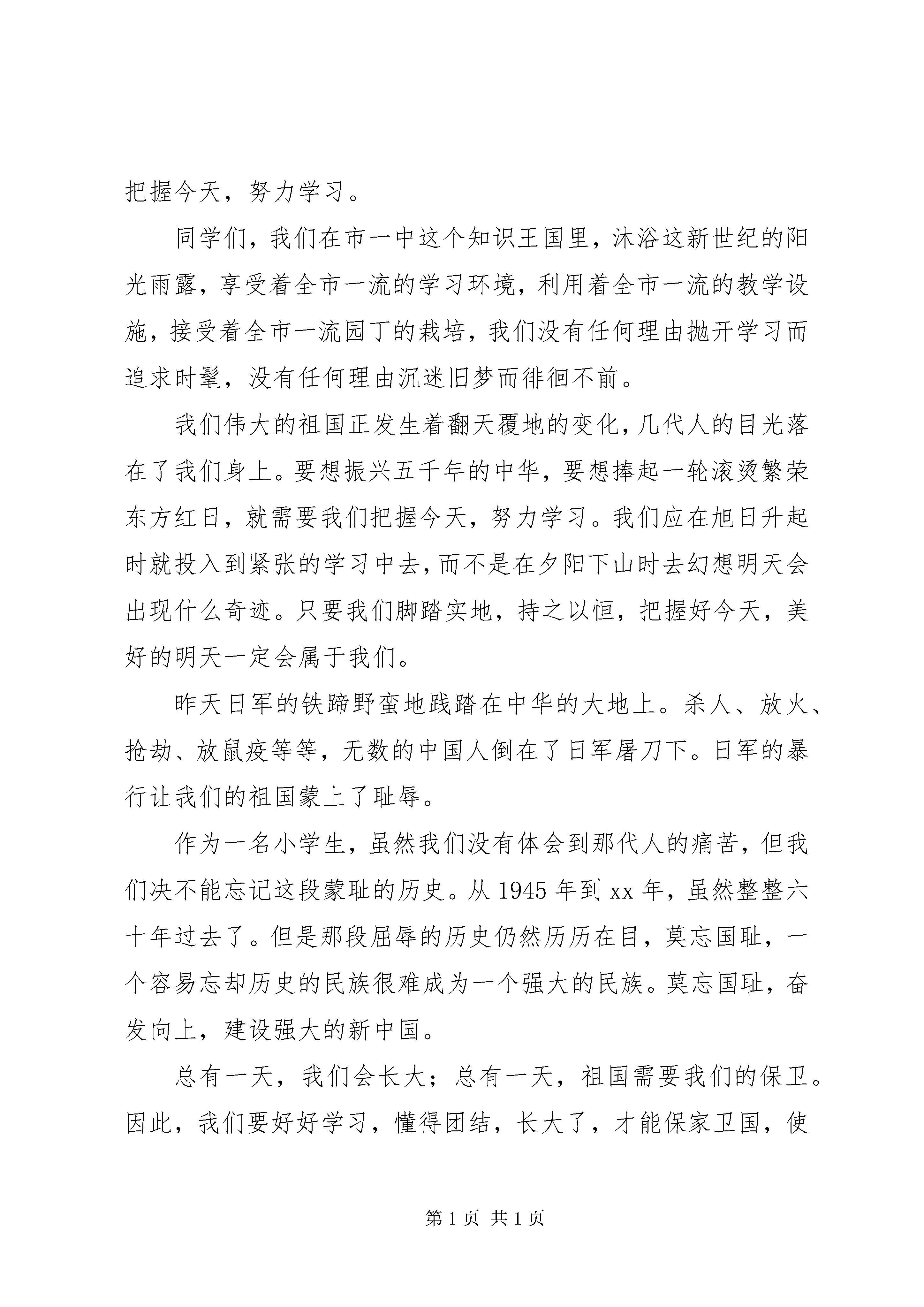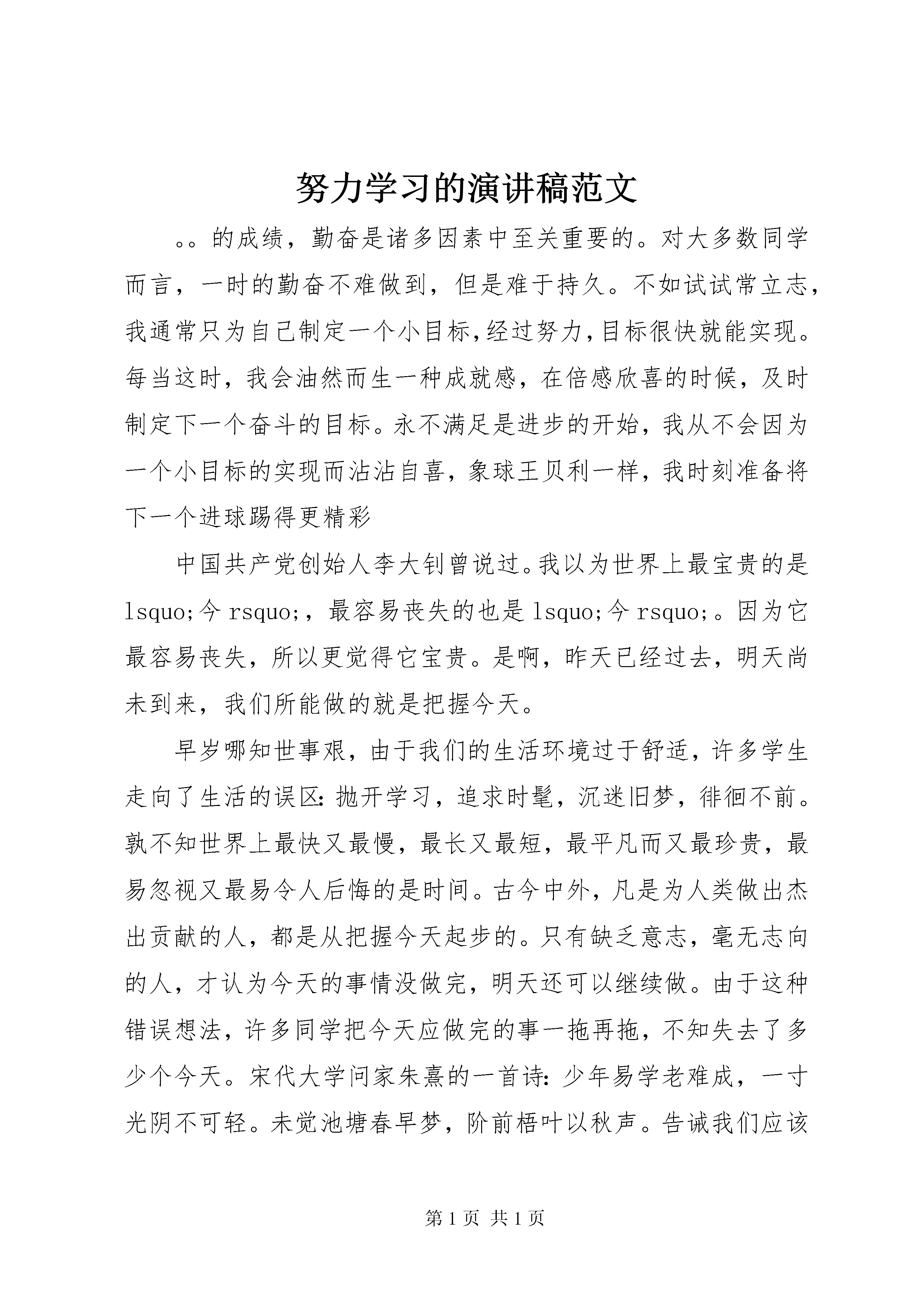 努力学习的演讲稿范文。。的成绩,勤奋是诸多因素中至关重要的。对大多数同学而言,一时的勤奋不难做到,但是难于持久。不如试试常立志,我通常只为自己制定一个小目标,经过努力,目标很快就能实现。每当这时,我会油然而生一种成就感,在倍感欣喜的时候,及时制定下一个奋斗的目标。永不满足是进步的开始,我从不会因为一个小目标的实现而沾沾自喜,象球王贝利一样,我时刻准备将下一个进球踢得更精彩中国共产党创始人李大钊曾说过。我以为世界上最宝贵的是lsquo;今rsquo;,最容易丧失的也是lsquo;今rsquo;。因为它最容易丧失,所以更觉得它宝贵。是啊,昨天已经过去,明天尚未到来,我们所能做的就是把握今天。早岁哪知世事艰,由于我们的生活环境过于舒适,许多学生走向了生活的误区:抛开学习,追求时髦,沉迷旧梦,徘徊不前。孰不知世界上最快又最慢,最长又最短,最平凡而又最珍贵,最易忽视又最易令人后悔的是时间。古今中外,凡是为人类做出杰出贡献的人,都是从把握今天起步的。只有缺乏意志,毫无志向的人,才认为今天的事情没做完,明天还可以继续做。由于这种错误想法,许多同学把今天应做完的事一拖再拖,不知失去了多少个今天。宋代大学问家朱熹的一首诗:少年易学老难成,一寸光阴不可轻。未觉池塘春早梦,阶前梧叶以秋声。告诫我们应该把握今天,努力学习。同学们,我们在市一中这个知识王国里,沐浴这新世纪的阳光雨露,享受着全市一流的学习环境,利用着全市一流的教学设施,接受着全市一流园丁的栽培,我们没有任何理由抛开学习而追求时髦,没有任何理由沉迷旧梦而徘徊不前。我们伟大的祖国正发生着翻天覆地的变化,几代人的目光落在了我们身上。要想振兴五千年的中华,要想捧起一轮滚烫繁荣东方红日,就需要我们把握今天,努力学习。我们应在旭日升起时就投入到紧张的学习中去,而不是在夕阳下山时去幻想明天会出现什么奇迹。只要我们脚踏实地,持之以恒,把握好今天,美好的明天一定会属于我们。昨天日军的铁蹄野蛮地践踏在中华的大地上。杀人、放火、抢劫、放鼠疫等等,无数的中国人倒在了日军屠刀下。日军的暴行让我们的祖国蒙上了耻辱。作为一名小学生,虽然我们没有体会到那代人的痛苦,但我们决不能忘记这段蒙耻的历史。从1945年到xx年,虽然整整六十年过去了。但是那段屈辱的历史仍然历历在目,莫忘国耻,一个容易忘却历史的民族很难成为一个强大的民族。莫忘国耻,奋发向上,建设强大的新中国。总有一天,我们会长大;总有一天,祖国需要我们的保卫。因此,我们要好好学习,懂得团结,长大了,才能保家卫国,使那段蒙耻的历史不在重演。