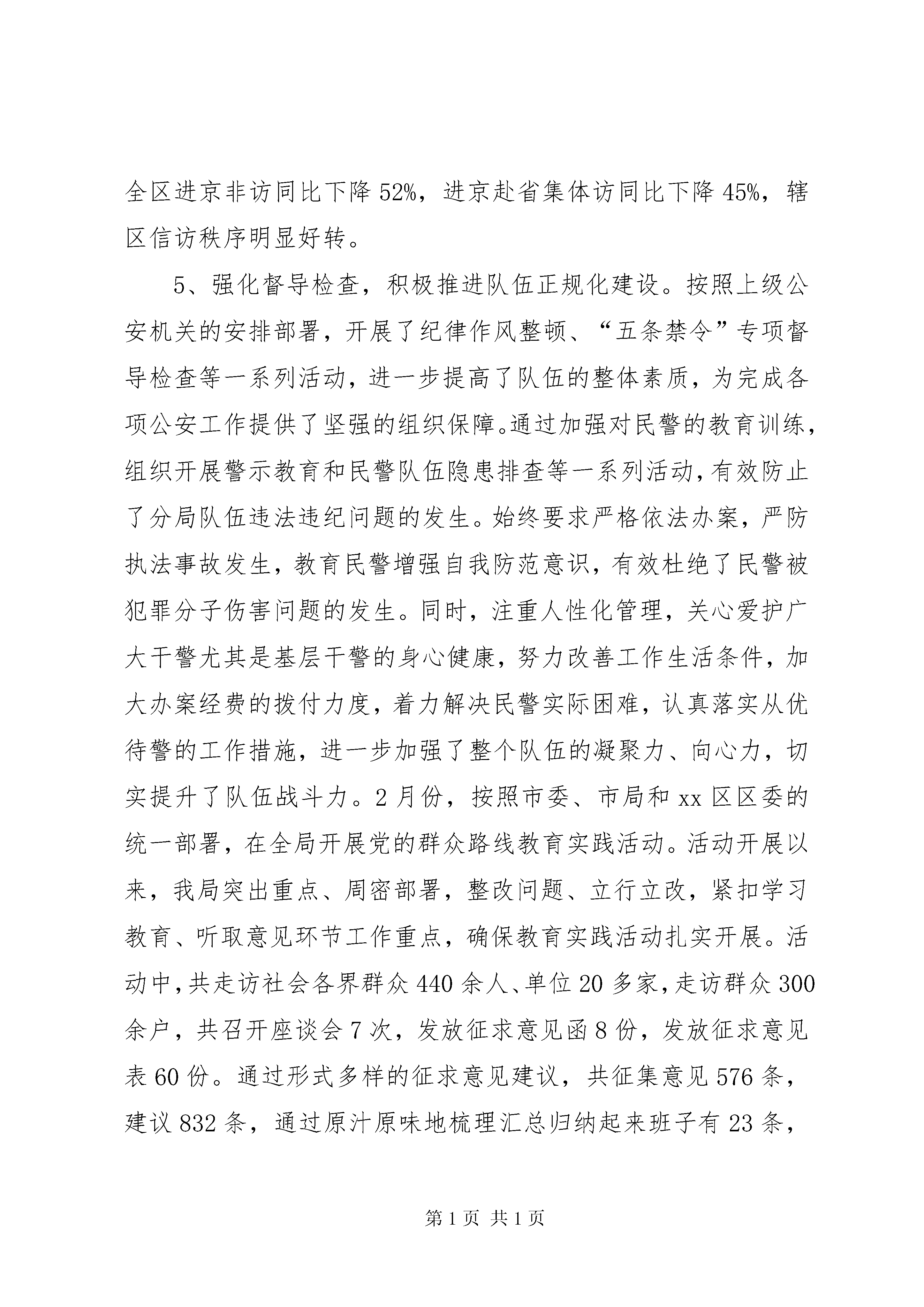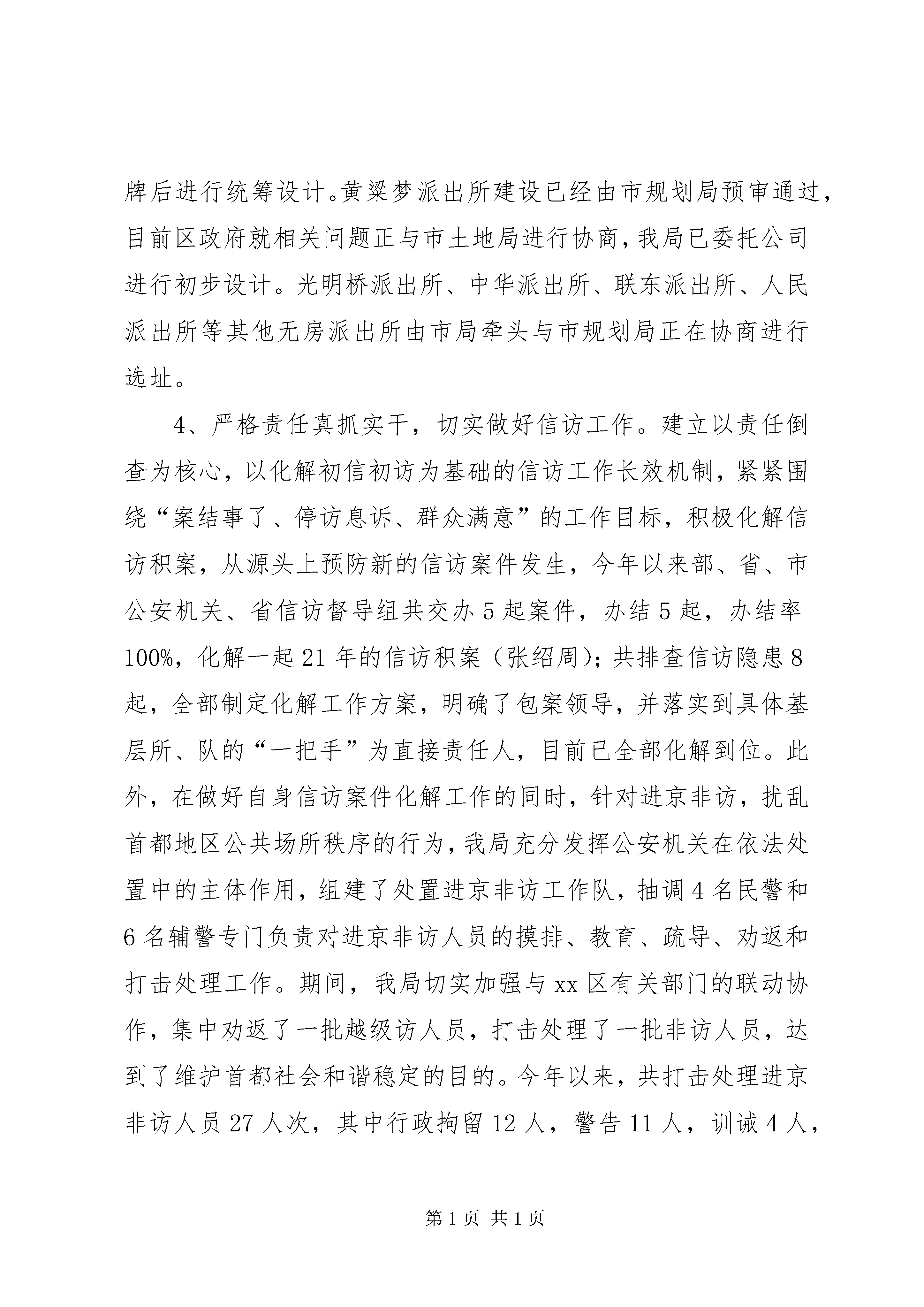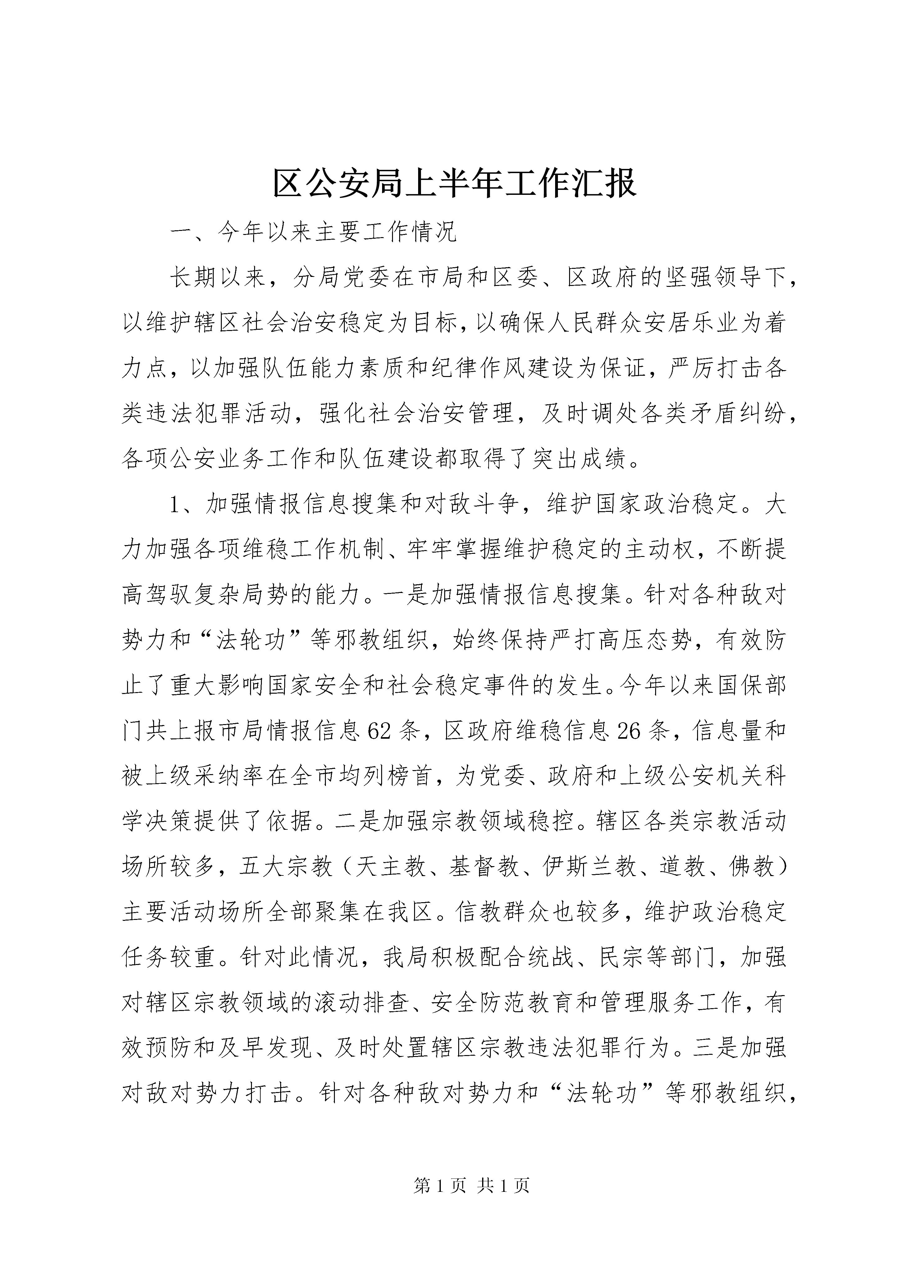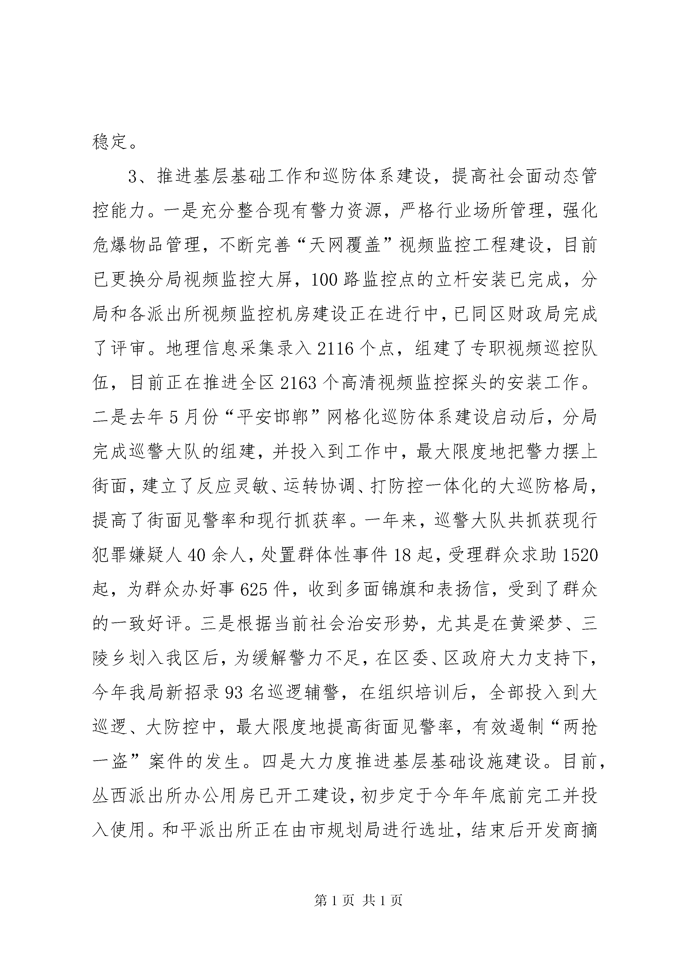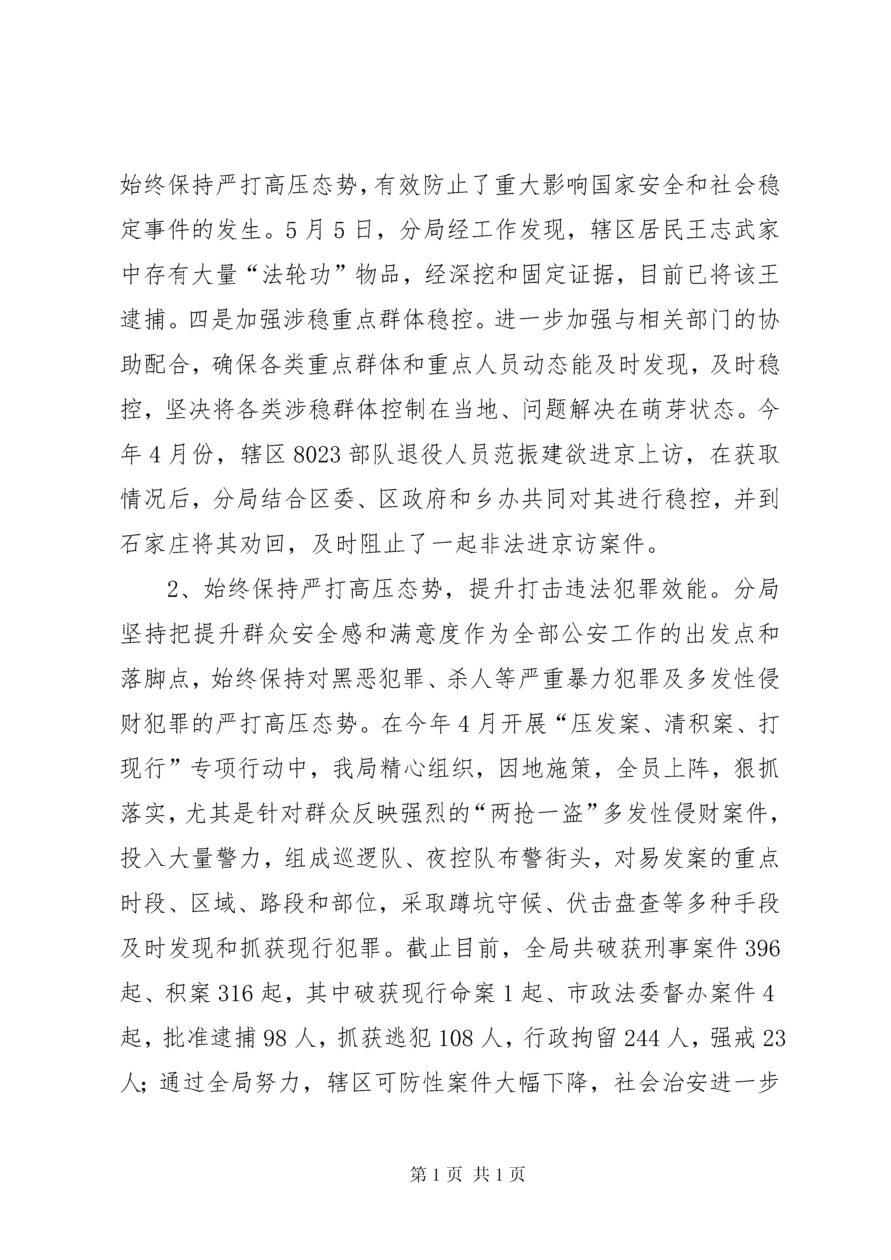 区公安局上半年工作汇报一、今年以来主要工作情况长期以来,分局党委在市局和区委、区政府的坚强领导下,以维护辖区社会治安稳定为目标,以确保人民群众安居乐业为着力点,以加强队伍能力素质和纪律作风建设为保证,严厉打击各类违法犯罪活动,强化社会治安管理,及时调处各类矛盾纠纷,各项公安业务工作和队伍建设都取得了突出成绩。1、加强情报信息搜集和对敌斗争,维护国家政治稳定。大力加强各项维稳工作机制、牢牢掌握维护稳定的主动权,不断提高驾驭复杂局势的能力。一是加强情报信息搜集。针对各种敌对势力和“法轮功”等邪教组织,始终保持严打高压态势,有效防止了重大影响国家安全和社会稳定事件的发生。今年以来国保部门共上报市局情报信息62条,区政府维稳信息26条,信息量和被上级采纳率在全市均列榜首,为党委、政府和上级公安机关科学决策提供了依据。二是加强宗教领域稳控。辖区各类宗教活动场所较多,五大宗教(天主教、基督教、伊斯兰教、道教、佛教)主要活动场所全部聚集在我区。信教群众也较多,维护政治稳定任务较重。针对此情况,我局积极配合统战、民宗等部门,加强对辖区宗教领域的滚动排查、安全防范教育和管理服务工作,有效预防和及早发现、及时处置辖区宗教违法犯罪行为。三是加强对敌对势力打击。针对各种敌对势力和“法轮功”等邪教组织,始终保持严打高压态势,有效防止了重大影响国家安全和社会稳定事件的发生。5月5日,分局经工作发现,辖区居民王志武家中存有大量“法轮功”物品,经深挖和固定证据,目前已将该王逮捕。四是加强涉稳重点群体稳控。进一步加强与相关部门的协助配合,确保各类重点群体和重点人员动态能及时发现,及时稳控,坚决将各类涉稳群体控制在当地、问题解决在萌芽状态。今年4月份,辖区8023部队退役人员范振建欲进京上访,在获取情况后,分局结合区委、区政府和乡办共同对其进行稳控,并到石家庄将其劝回,及时阻止了一起非法进京访案件。2、始终保持严打高压态势,提升打击违法犯罪效能。分局坚持把提升群众安全感和满意度作为全部公安工作的出发点和落脚点,始终保持对黑恶犯罪、杀人等严重暴力犯罪及多发性侵财犯罪的严打高压态势。在今年4月开展“压发案、清积案、打现行”专项行动中,我局精心组织,因地施策,全员上阵,狠抓落实,尤其是针对群众反映强烈的“两抢一盗”多发性侵财案件,投入大量警力,组成巡逻队、夜控队布警街头,对易发案的重点时段、区域、路段和部位,采取蹲坑守候、伏击盘查等多种手段及时发现和抓获现行犯罪。截止目前,全局共破获刑事案件396起、积案316起,其中破获现行命案1起、市政法委督办案件4起,批准逮捕98人,抓获逃犯108人,行政拘留244人,强戒23人;通过全局努力,辖区可防性案件大幅下降,社会治安进一步稳定。3、推进基层基础工作和巡防体系建设,提高社会面动态管控能力。一是充分整合现有警力资源,严格行业场所管理,强化危爆物品管理,不断完善“天网覆盖”视频监控工程建设,目前已更换分局视频监控大屏,100路监控点的立杆安装已完成,分局和各派出所视频监控机房建设正在进行中,已同区财政局完成了评审。地理信息采集录入2116个点,组建了专职视频巡控队伍,目前正在推进全区2163个高清视频监控探头的安装工作。二是去年5月份“平安邯郸”网格化巡防体系建设启动后,分局完成巡警大队的组建,并投入到工作中,最大限度地把警力摆上街面,建立了反应灵敏、运转协调、打防控一体化的大巡防格局,提高了街面见警率和现行抓获率。一年来,巡警大队共抓获现行犯罪嫌疑人40余人,处置群体性事件18起,受理群众求助1520起,为群众办好事625件,收到多面锦旗和表扬信,受到了群众的一致好评。三是根据当前社会治安形势,尤其是在黄梁梦、三陵乡划入我区后,为缓解警力不足,在区委、区政府大力支持下,今年我局新招录93名巡逻辅警,在组织培训后,全部投入到大巡逻、大防控中,最大限度地提高街面见警率,有效遏制“两抢一盗”案件的发生。四是大力度推进基层基础设施建设。目前,丛西派出所办公用房已开工建设,初步定于今年年底前完工并投入使用。和平派出所正在由市规划局进行选址,结束后开发商摘牌后进行统筹设计。黄粱梦派出所建设已经由市规划局预审通过,目前区政府就相关问题正与市土地局进行协商,我局已委托公司进行初步设计。光明桥派出所、中华派出所、联东派出所、人民派出所等其他无房派出所由市局牵头与市规划局正在协商进行选址。4、严格责任真抓实干,切实做好信访工作。建立以责任倒查为核心,以化解初信初访为基础的信访工作长效机制,紧紧围绕“案结事了、停访息诉、群众满意”的工作目标,积极化解信访积案,从源头上预防新的信访案件发生,今年以来部、省、市公安机关、省信访督导组共交办5起案件,办结5起,办结率100%,化解一起21年的信访积案(张绍周);共排查信访隐患