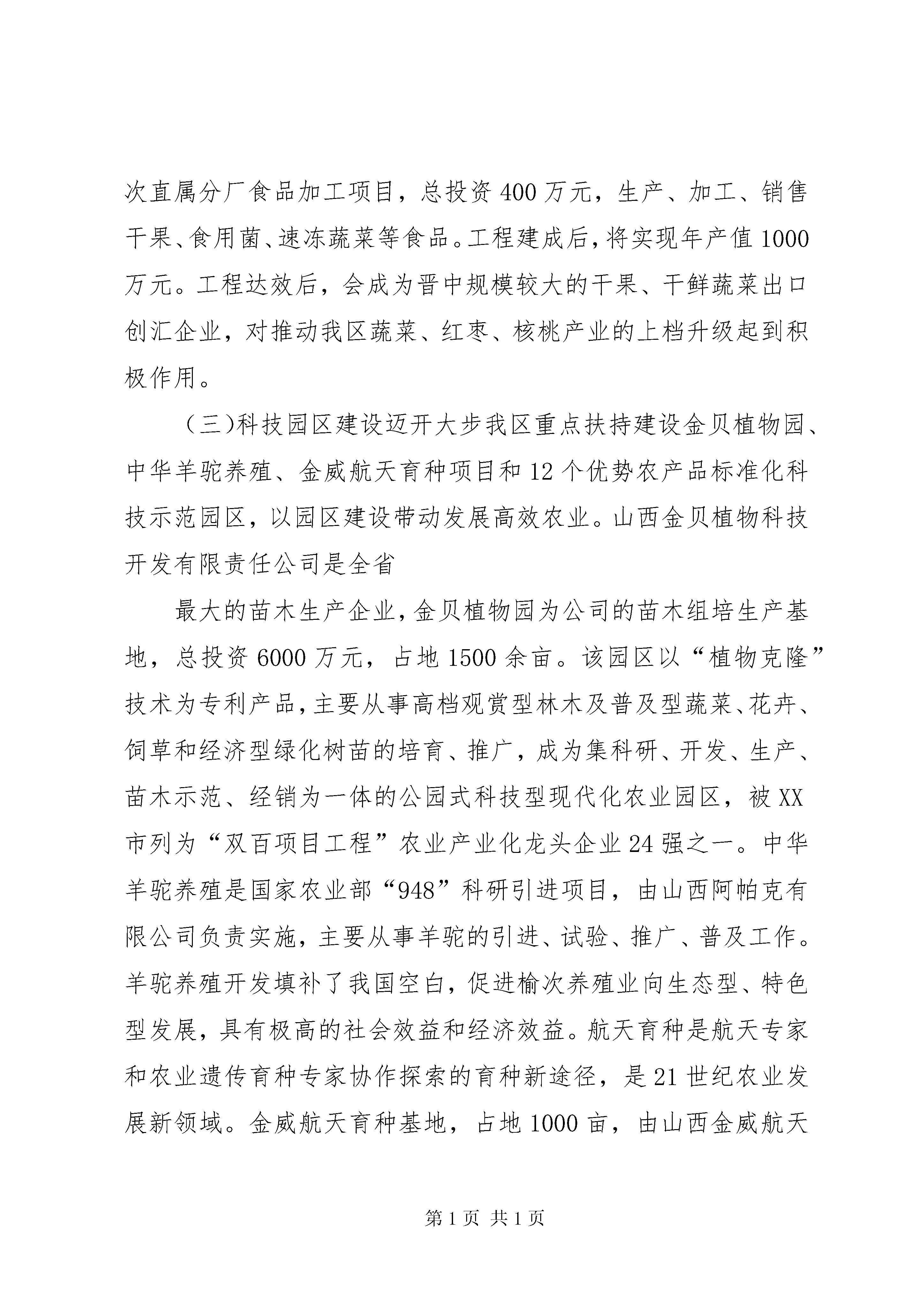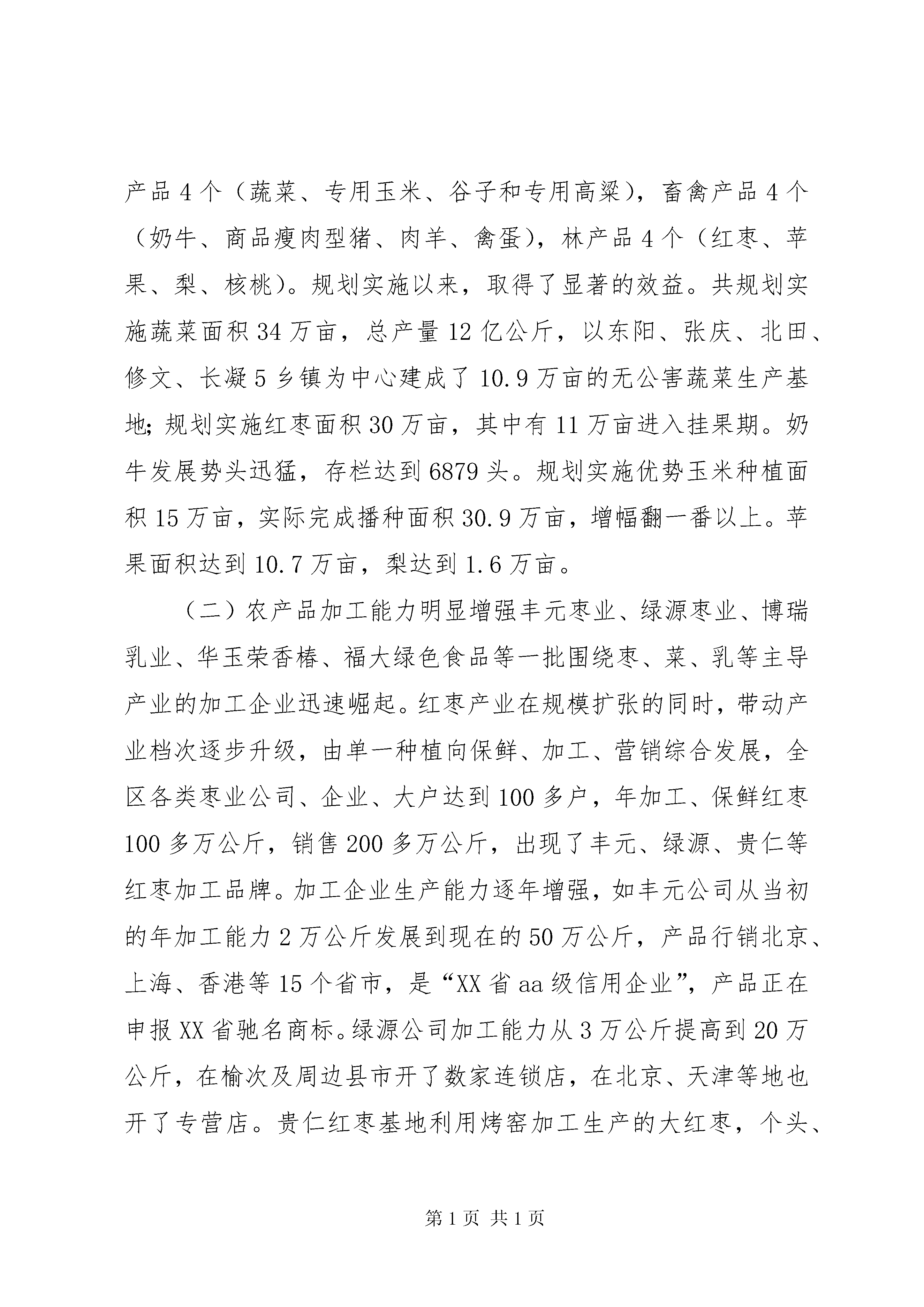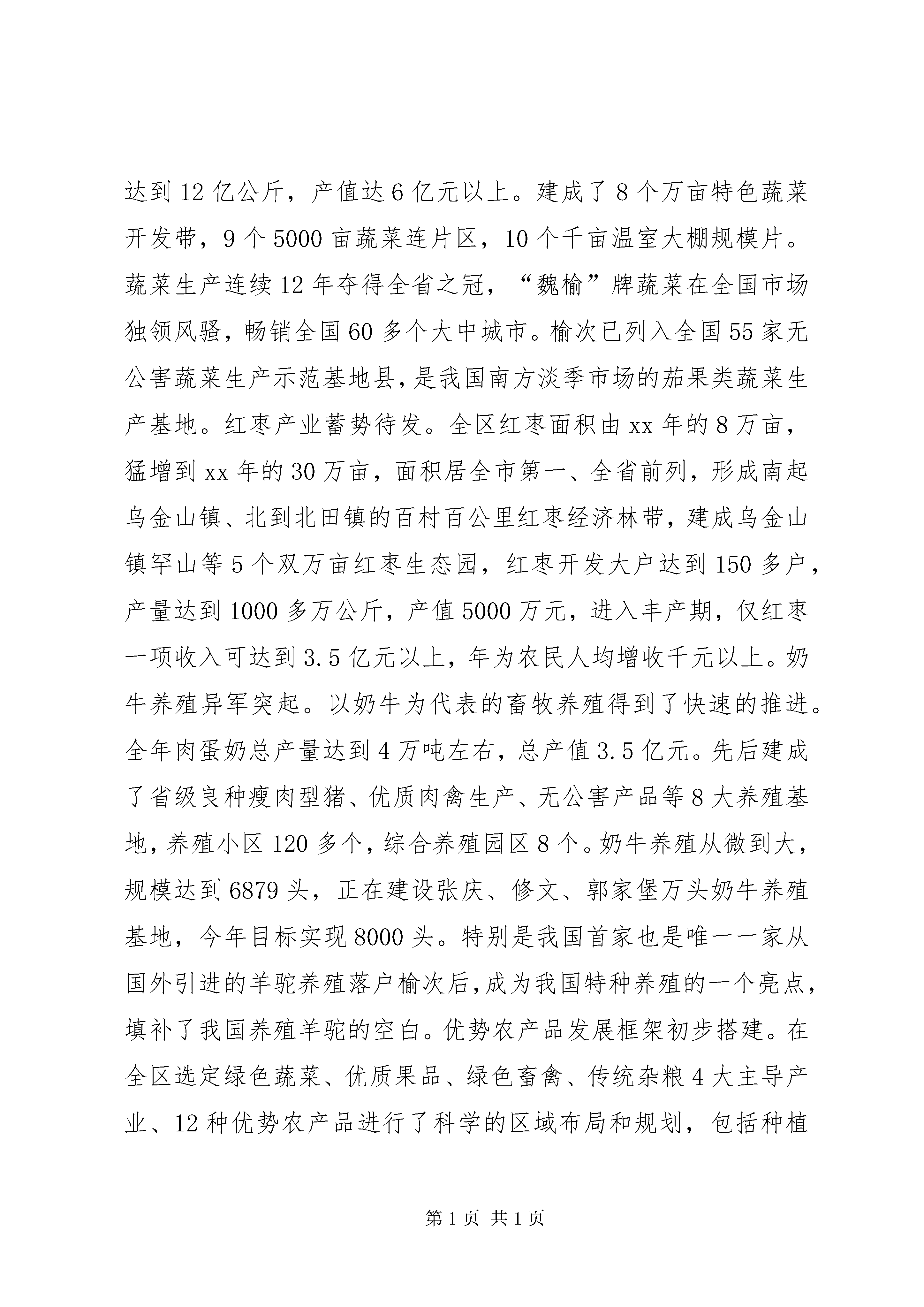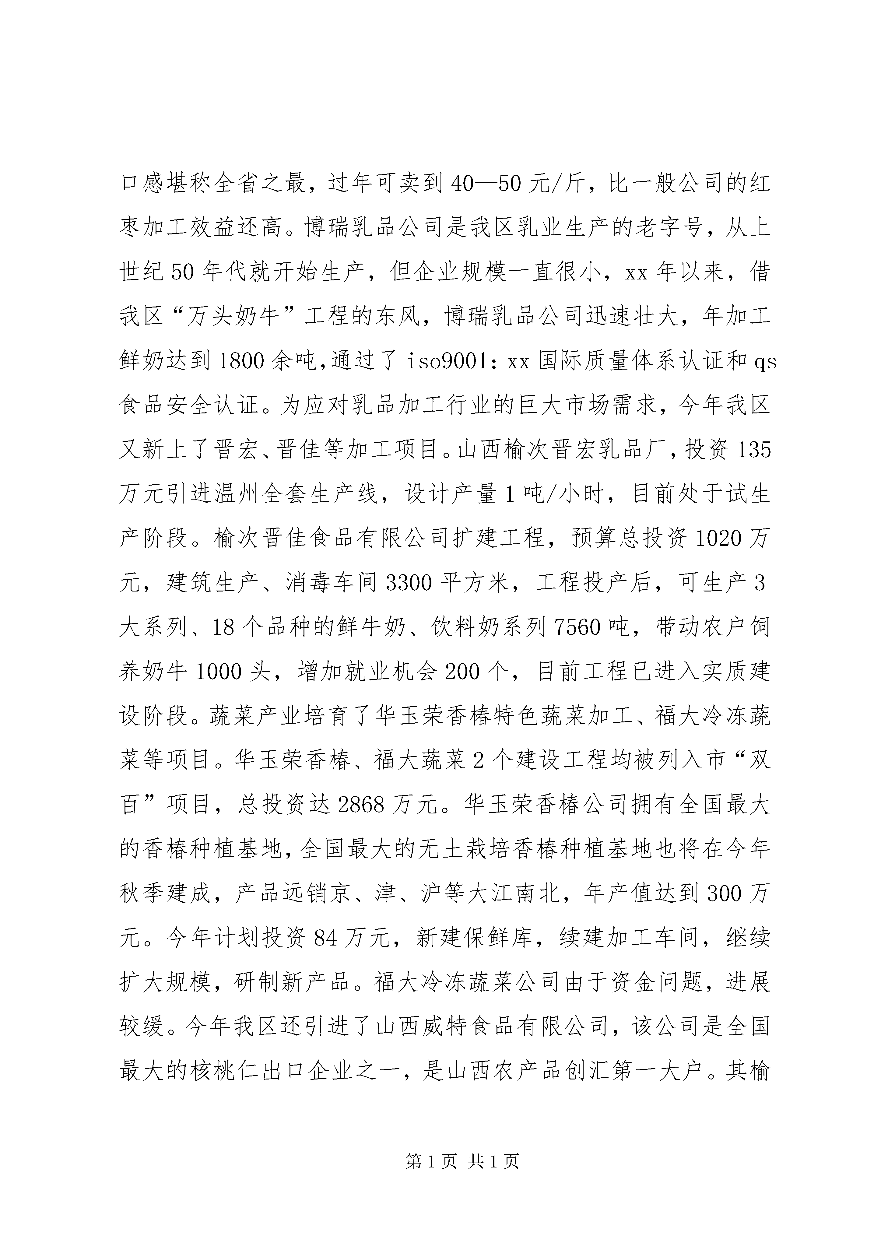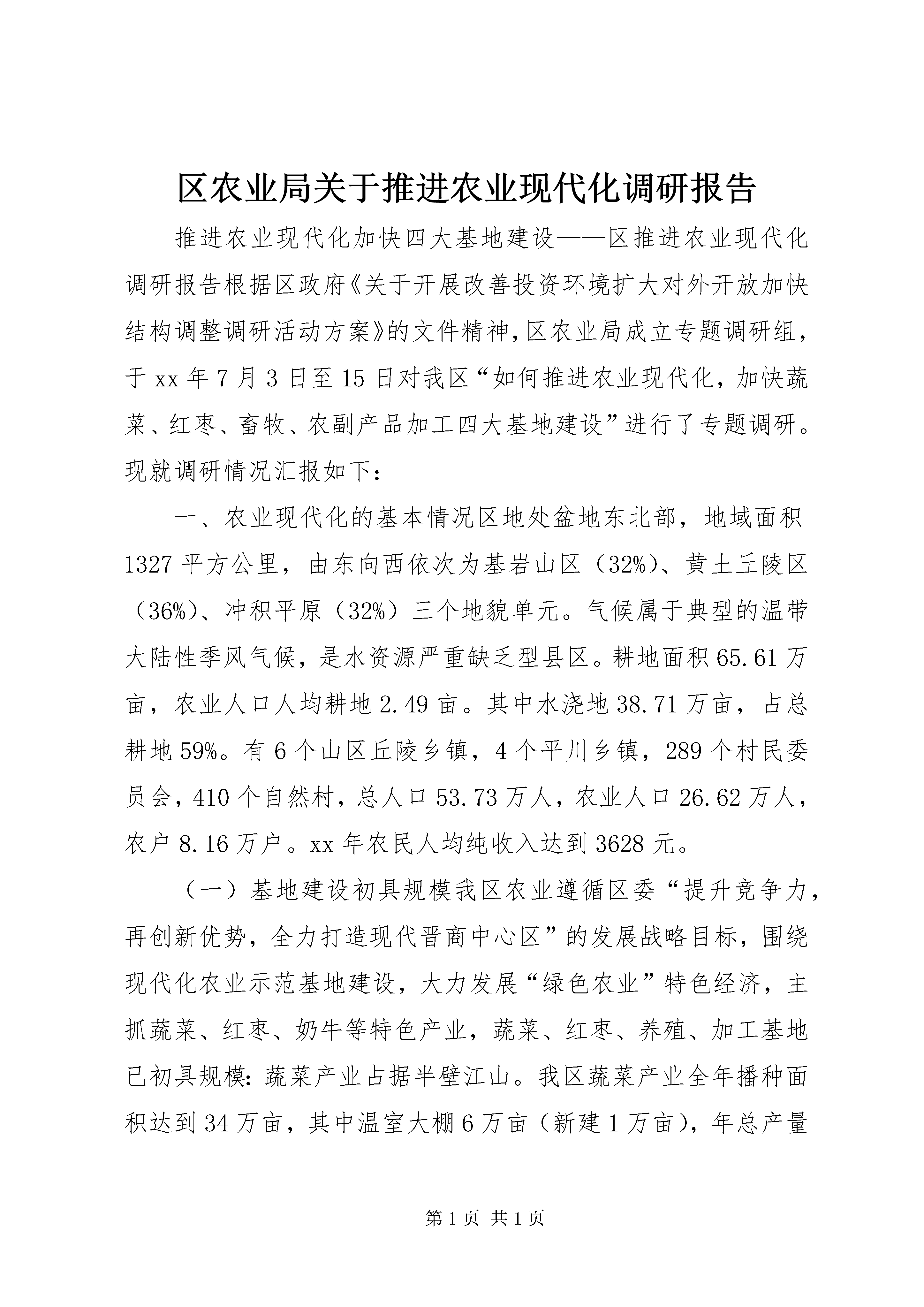 区农业局关于推进农业现代化调研报告推进农业现代化加快四大基地建设——区推进农业现代化调研报告根据区政府《关于开展改善投资环境扩大对外开放加快结构调整调研活动方案》的文件精神,区农业局成立专题调研组,于xx年7月3日至15日对我区“如何推进农业现代化,加快蔬菜、红枣、畜牧、农副产品加工四大基地建设”进行了专题调研。现就调研情况汇报如下:一、农业现代化的基本情况区地处盆地东北部,地域面积1327平方公里,由东向西依次为基岩山区(32%)、黄土丘陵区(36%)、冲积平原(32%)三个地貌单元。气候属于典型的温带大陆性季风气候,是水资源严重缺乏型县区。耕地面积65.61万亩,农业人口人均耕地2.49亩。其中水浇地38.71万亩,占总耕地59%。有6个山区丘陵乡镇,4个平川乡镇,289个村民委员会,410个自然村,总人口53.73万人,农业人口26.62万人,农户8.16万户。xx年农民人均纯收入达到3628元。(一)基地建设初具规模我区农业遵循区委“提升竞争力,再创新优势,全力打造现代晋商中心区”的发展战略目标,围绕现代化农业示范基地建设,大力发展“绿色农业”特色经济,主抓蔬菜、红枣、奶牛等特色产业,蔬菜、红枣、养殖、加工基地已初具规模:蔬菜产业占据半壁江山。我区蔬菜产业全年播种面积达到34万亩,其中温室大棚6万亩(新建1万亩),年总产量达到12亿公斤,产值达6亿元以上。建成了8个万亩特色蔬菜开发带,9个5000亩蔬菜连片区,10个千亩温室大棚规模片。蔬菜生产连续12年夺得全省之冠,“魏榆”牌蔬菜在全国市场独领风骚,畅销全国60多个大中城市。榆次已列入全国55家无公害蔬菜生产示范基地县,是我国南方淡季市场的茄果类蔬菜生产基地。红枣产业蓄势待发。全区红枣面积由xx年的8万亩,猛增到xx年的30万亩,面积居全市第一、全省前列,形成南起乌金山镇、北到北田镇的百村百公里红枣经济林带,建成乌金山镇罕山等5个双万亩红枣生态园,红枣开发大户达到150多户,产量达到1000多万公斤,产值5000万元,进入丰产期,仅红枣一项收入可达到3.5亿元以上,年为农民人均增收千元以上。奶牛养殖异军突起。以奶牛为代表的畜牧养殖得到了快速的推进。全年肉蛋奶总产量达到4万吨左右,总产值3.5亿元。先后建成了省级良种瘦肉型猪、优质肉禽生产、无公害产品等8大养殖基地,养殖小区120多个,综合养殖园区8个。奶牛养殖从微到大,规模达到6879头,正在建设张庆、修文、郭家堡万头奶牛养殖基地,今年目标实现8000头。特别是我国首家也是唯一一家从国外引进的羊驼养殖落户榆次后,成为我国特种养殖的一个亮点,填补了我国养殖羊驼的空白。优势农产品发展框架初步搭建。在全区选定绿色蔬菜、优质果品、绿色畜禽、传统杂粮4大主导产业、12种优势农产品进行了科学的区域布局和规划,包括种植产品4个(蔬菜、专用玉米、谷子和专用高粱),畜禽产品4个(奶牛、商品瘦肉型猪、肉羊、禽蛋),林产品4个(红枣、苹果、梨、核桃)。规划实施以来,取得了显著的效益。共规划实施蔬菜面积34万亩,总产量12亿公斤,以东阳、张庆、北田、修文、长凝5乡镇为中心建成了10.9万亩的无公害蔬菜生产基地;规划实施红枣面积30万亩,其中有11万亩进入挂果期。奶牛发展势头迅猛,存栏达到6879头。规划实施优势玉米种植面积15万亩,实际完成播种面积30.9万亩,增幅翻一番以上。苹果面积达到10.7万亩,梨达到1.6万亩。(二)农产品加工能力明显增强丰元枣业、绿源枣业、博瑞乳业、华玉荣香椿、福大绿色食品等一批围绕枣、菜、乳等主导产业的加工企业迅速崛起。红枣产业在规模扩张的同时,带动产业档次逐步升级,由单一种植向保鲜、加工、营销综合发展,全区各类枣业公司、企业、大户达到100多户,年加工、保鲜红枣100多万公斤,销售200多万公斤,出现了丰元、绿源、贵仁等红枣加工品牌。加工企业生产能力逐年增强,如丰元公司从当初的年加工能力2万公斤发展到现在的50万公斤,产品行销北京、上海、香港等15个省市,是“XX省aa级信用企业”,产品正在申报XX省驰名商标。绿源公司加工能力从3万公斤提高到20万公斤,在榆次及周边县市开了数家连锁店,在北京、天津等地也开了专营店。贵仁红枣基地利用烤窑加工生产的大红枣,个头、口感堪称全省之最,过年可卖到40—50元/斤,比一般公司的红枣加工效益还高。博瑞乳品公司是我区乳业生产的老字号,从上世纪50年代就开始生产,但企业规模一直很小,xx年以来,借我区“万头奶牛”工程的东风,博瑞乳品公司迅速壮大,年加工鲜奶达到1800余吨,通过了iso9001:xx国际质量体系认证和qs食品安全认证。为应对乳品加工行业的巨大市场需求,今年我区又新上了晋宏、晋佳等加工项目。山西榆次晋宏乳品厂,投资135万元引进温州全套生产