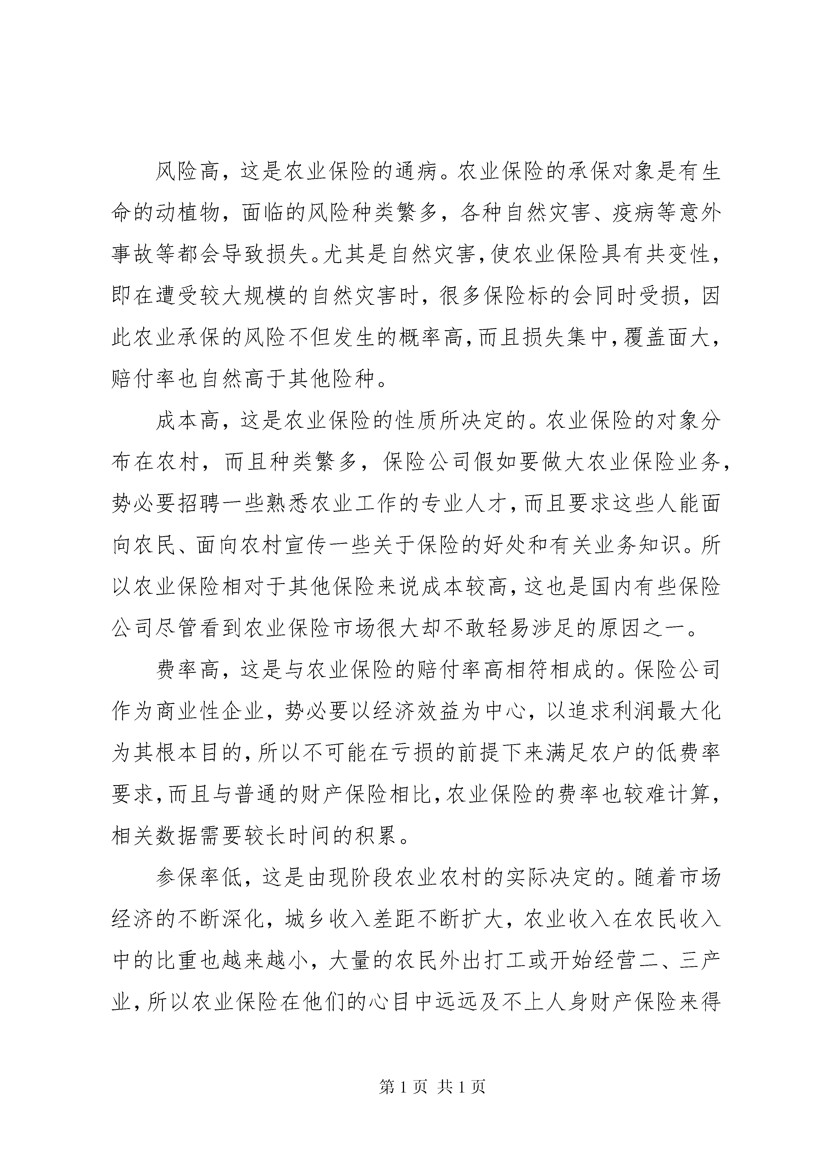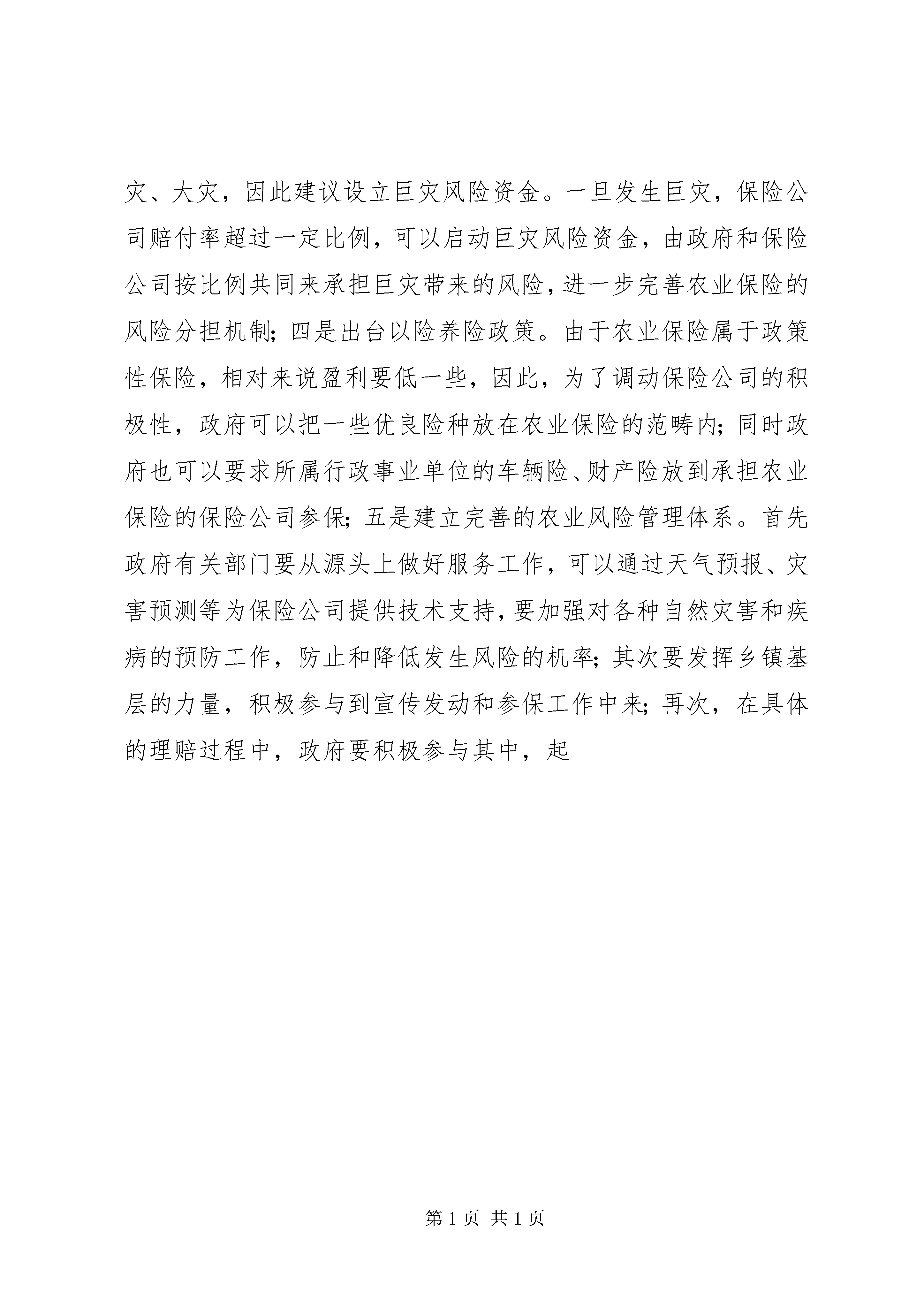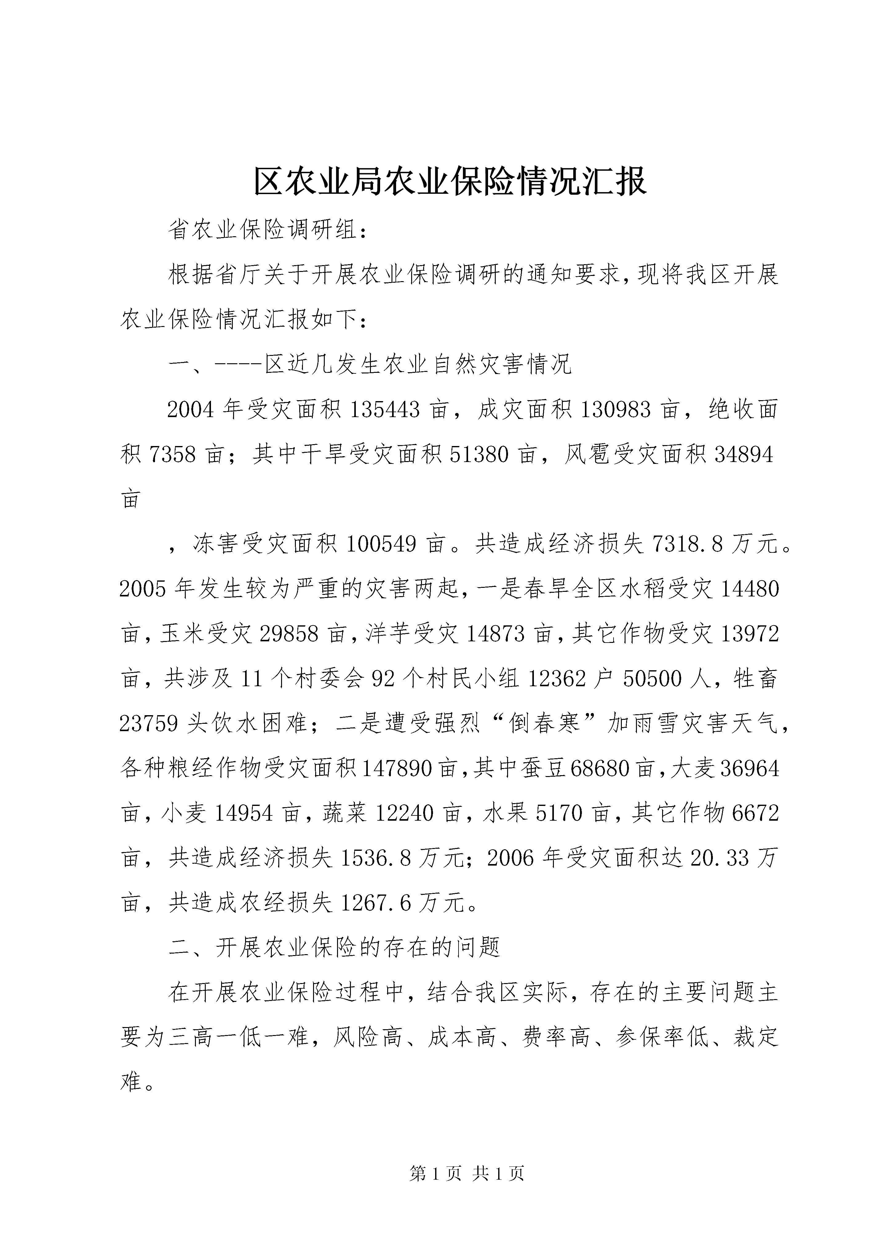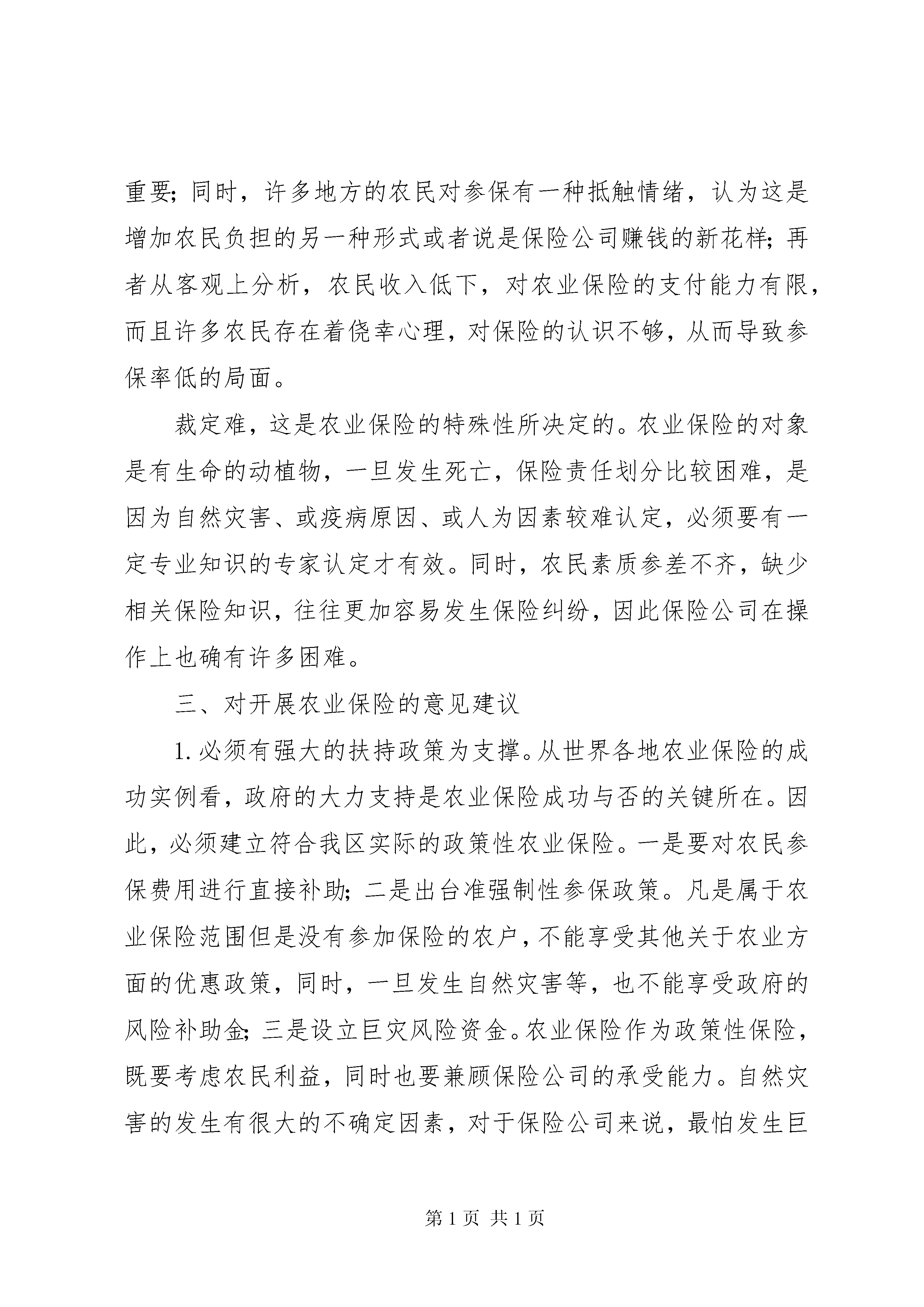 区农业局农业保险情况汇报省农业保险调研组:根据省厅关于开展农业保险调研的通知要求,现将我区开展农业保险情况汇报如下:一、----区近几发生农业自然灾害情况2004年受灾面积135443亩,成灾面积130983亩,绝收面积7358亩;其中干旱受灾面积51380亩,风雹受灾面积34894亩,冻害受灾面积100549亩。共造成经济损失7318.8万元。2005年发生较为严重的灾害两起,一是春旱全区水稻受灾14480亩,玉米受灾29858亩,洋芋受灾14873亩,其它作物受灾13972亩,共涉及11个村委会92个村民小组12362户50500人,牲畜23759头饮水困难;二是遭受强烈“倒春寒”加雨雪灾害天气,各种粮经作物受灾面积147890亩,其中蚕豆68680亩,大麦36964亩,小麦14954亩,蔬菜12240亩,水果5170亩,其它作物6672亩,共造成经济损失1536.8万元;2006年受灾面积达20.33万亩,共造成农经损失1267.6万元。二、开展农业保险的存在的问题在开展农业保险过程中,结合我区实际,存在的主要问题主要为三高一低一难,风险高、成本高、费率高、参保率低、裁定难。风险高,这是农业保险的通病。农业保险的承保对象是有生命的动植物,面临的风险种类繁多,各种自然灾害、疫病等意外事故等都会导致损失。尤其是自然灾害,使农业保险具有共变性,即在遭受较大规模的自然灾害时,很多保险标的会同时受损,因此农业承保的风险不但发生的概率高,而且损失集中,覆盖面大,赔付率也自然高于其他险种。成本高,这是农业保险的性质所决定的。农业保险的对象分布在农村,而且种类繁多,保险公司假如要做大农业保险业务,势必要招聘一些熟悉农业工作的专业人才,而且要求这些人能面向农民、面向农村宣传一些关于保险的好处和有关业务知识。所以农业保险相对于其他保险来说成本较高,这也是国内有些保险公司尽管看到农业保险市场很大却不敢轻易涉足的原因之一。费率高,这是与农业保险的赔付率高相符相成的。保险公司作为商业性企业,势必要以经济效益为中心,以追求利润最大化为其根本目的,所以不可能在亏损的前提下来满足农户的低费率要求,而且与普通的财产保险相比,农业保险的费率也较难计算,相关数据需要较长时间的积累。参保率低,这是由现阶段农业农村的实际决定的。随着市场经济的不断深化,城乡收入差距不断扩大,农业收入在农民收入中的比重也越来越小,大量的农民外出打工或开始经营二、三产业,所以农业保险在他们的心目中远远及不上人身财产保险来得重要;同时,许多地方的农民对参保有一种抵触情绪,认为这是增加农民负担的另一种形式或者说是保险公司赚钱的新花样;再者从客观上分析,农民收入低下,对农业保险的支付能力有限,而且许多农民存在着侥幸心理,对保险的认识不够,从而导致参保率低的局面。裁定难,这是农业保险的特殊性所决定的。农业保险的对象是有生命的动植物,一旦发生死亡,保险责任划分比较困难,是因为自然灾害、或疫病原因、或人为因素较难认定,必须要有一定专业知识的专家认定才有效。同时,农民素质参差不齐,缺少相关保险知识,往往更加容易发生保险纠纷,因此保险公司在操作上也确有许多困难。三、对开展农业保险的意见建议1.必须有强大的扶持政策为支撑。从世界各地农业保险的成功实例看,政府的大力支持是农业保险成功与否的关键所在。因此,必须建立符合我区实际的政策性农业保险。一是要对农民参保费用进行直接补助;二是出台准强制性参保政策。凡是属于农业保险范围但是没有参加保险的农户,不能享受其他关于农业方面的优惠政策,同时,一旦发生自然灾害等,也不能享受政府的风险补助金;三是设立巨灾风险资金。农业保险作为政策性保险,既要考虑农民利益,同时也要兼顾保险公司的承受能力。自然灾害的发生有很大的不确定因素,对于保险公司来说,最怕发生巨灾、大灾,因此建议设立巨灾风险资金。一旦发生巨灾,保险公司赔付率超过一定比例,可以启动巨灾风险资金,由政府和保险公司按比例共同来承担巨灾带来的风险,进一步完善农业保险的风险分担机制;四是出台以险养险政策。由于农业保险属于政策性保险,相对来说盈利要低一些,因此,为了调动保险公司的积极性,政府可以把一些优良险种放在农业保险的范畴内;同时政府也可以要求所属行政事业单位的车辆险、财产险放到承担农业保险的保险公司参保;五是建立完善的农业风险管理体系。首先政府有关部门要从源头上做好服务工作,可以通过天气预报、灾害预测等为保险公司提供技术支持,要加强对各种自然灾害和疾病的预防工作,防止和降低发生风险的机率;其次要发挥乡镇基层的力量,积极参与到宣传发动和参保工作中来;再次,在具体的理赔过程中,政府要积极参与其中,起