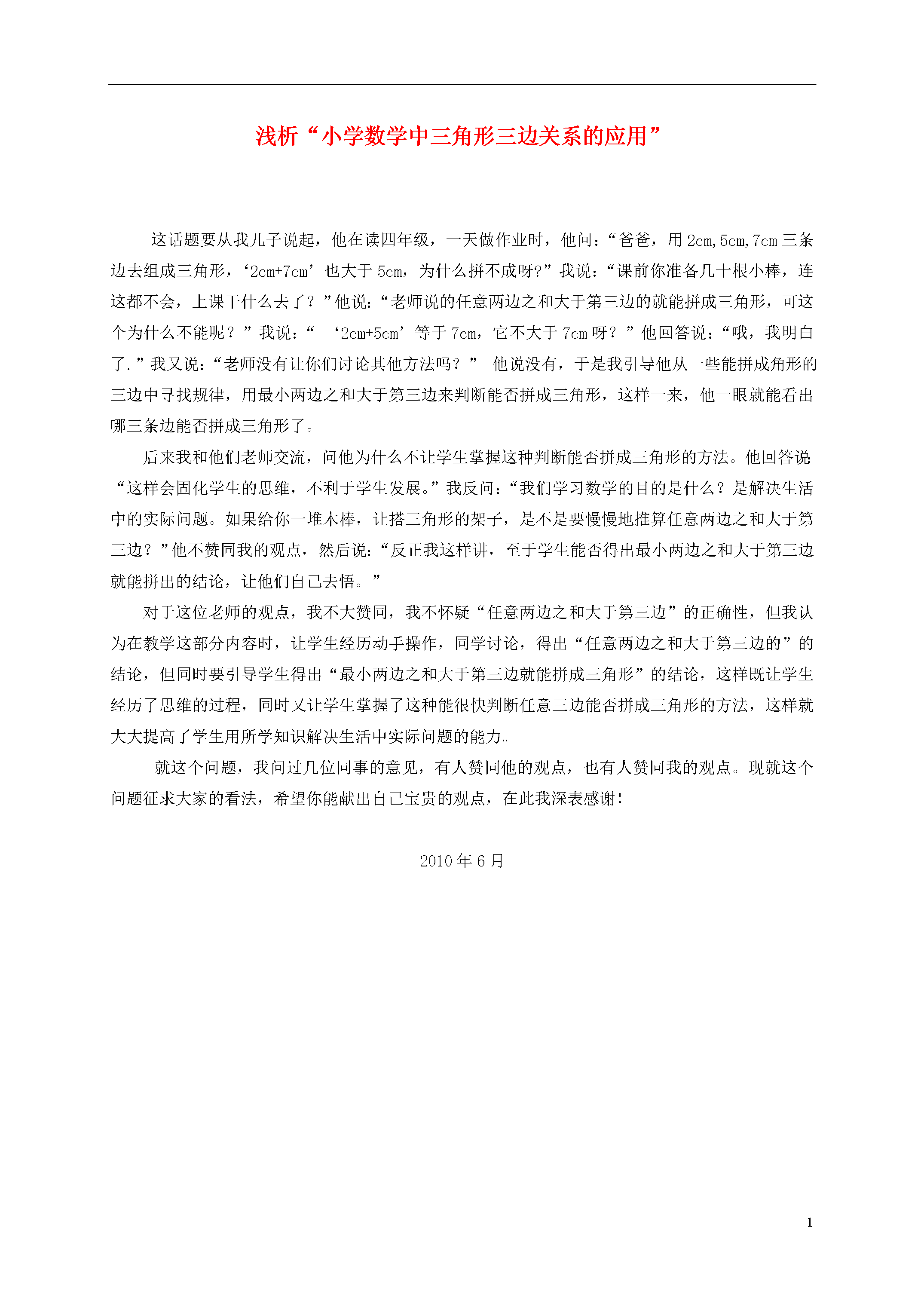 1浅析“小学数学中三角形三边关系的应用”这话题要从我儿子说起,他在读四年级,一天做作业时,他问:“爸爸,用2cm,5cm,7cm三条边去组成三角形,‘2cm+7cm’也大于5cm,为什么拼不成呀?”我说:“课前你准备几十根小棒,连这都不会,上课干什么去了?”他说:“老师说的任意两边之和大于第三边的就能拼成三角形,可这个为什么不能呢?”我说:“‘2cm+5cm’等于7cm,它不大于7cm呀?”他回答说:“哦,我明白了.”我又说:“老师没有让你们讨论其他方法吗?”他说没有,于是我引导他从一些能拼成角形的三边中寻找规律,用最小两边之和大于第三边来判断能否拼成三角形,这样一来,他一眼就能看出哪三条边能否拼成三角形了。后来我和他们老师交流,问他为什么不让学生掌握这种判断能否拼成三角形的方法。他回答说:“这样会固化学生的思维,不利于学生发展。”我反问:“我们学习数学的目的是什么?是解决生活中的实际问题。如果给你一堆木棒,让搭三角形的架子,是不是要慢慢地推算任意两边之和大于第三边?”他不赞同我的观点,然后说:“反正我这样讲,至于学生能否得出最小两边之和大于第三边就能拼出的结论,让他们自己去悟。”对于这位老师的观点,我不大赞同,我不怀疑“任意两边之和大于第三边”的正确性,但我认为在教学这部分内容时,让学生经历动手操作,同学讨论,得出“任意两边之和大于第三边的”的结论,但同时要引导学生得出“最小两边之和大于第三边就能拼成三角形”的结论,这样既让学生经历了思维的过程,同时又让学生掌握了这种能很快判断任意三边能否拼成三角形的方法,这样就大大提高了学生用所学知识解决生活中实际问题的能力。就这个问题,我问过几位同事的意见,有人赞同他的观点,也有人赞同我的观点。现就这个问题征求大家的看法,希望你能献出自己宝贵的观点,在此我深表感谢!2010年6月