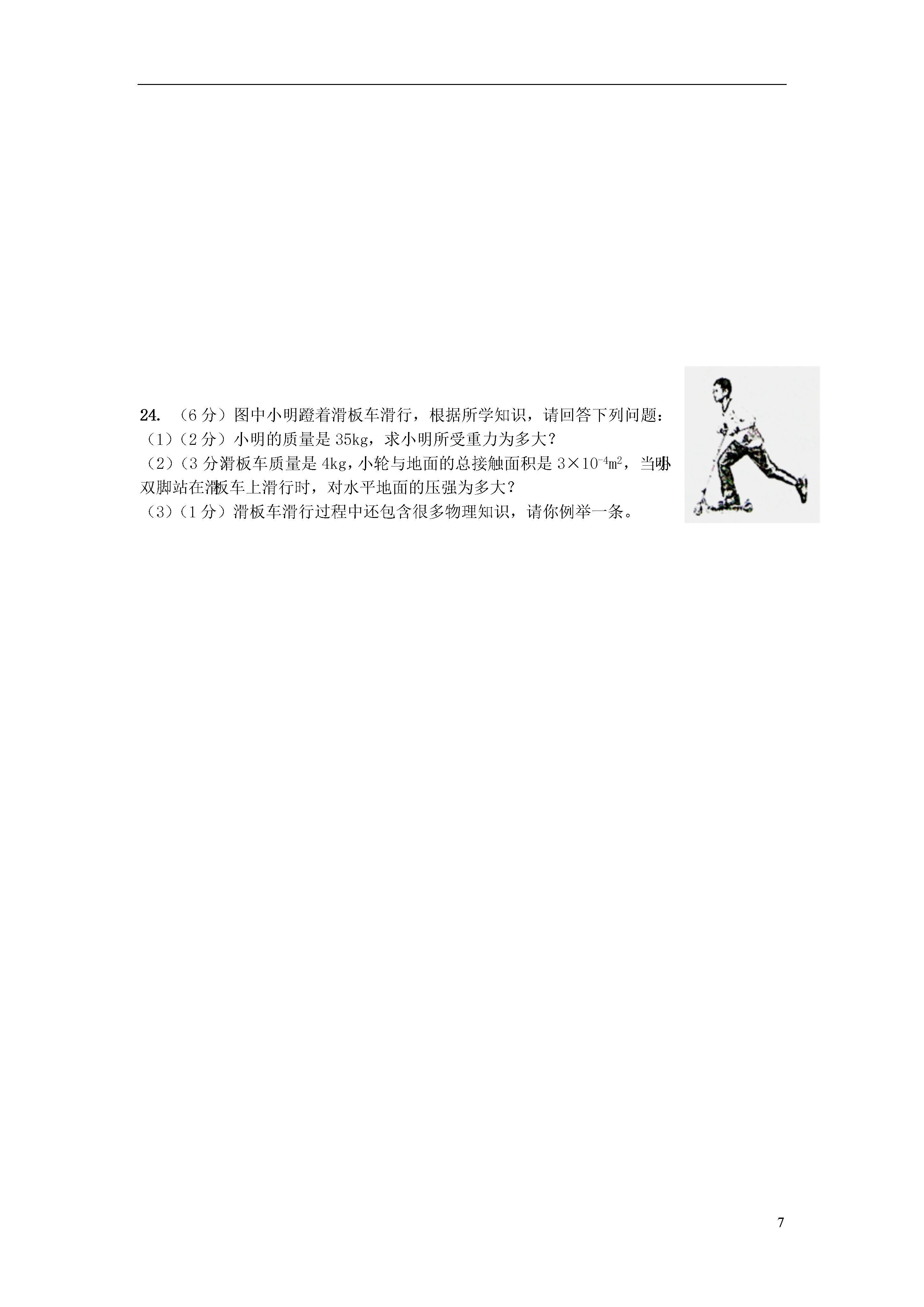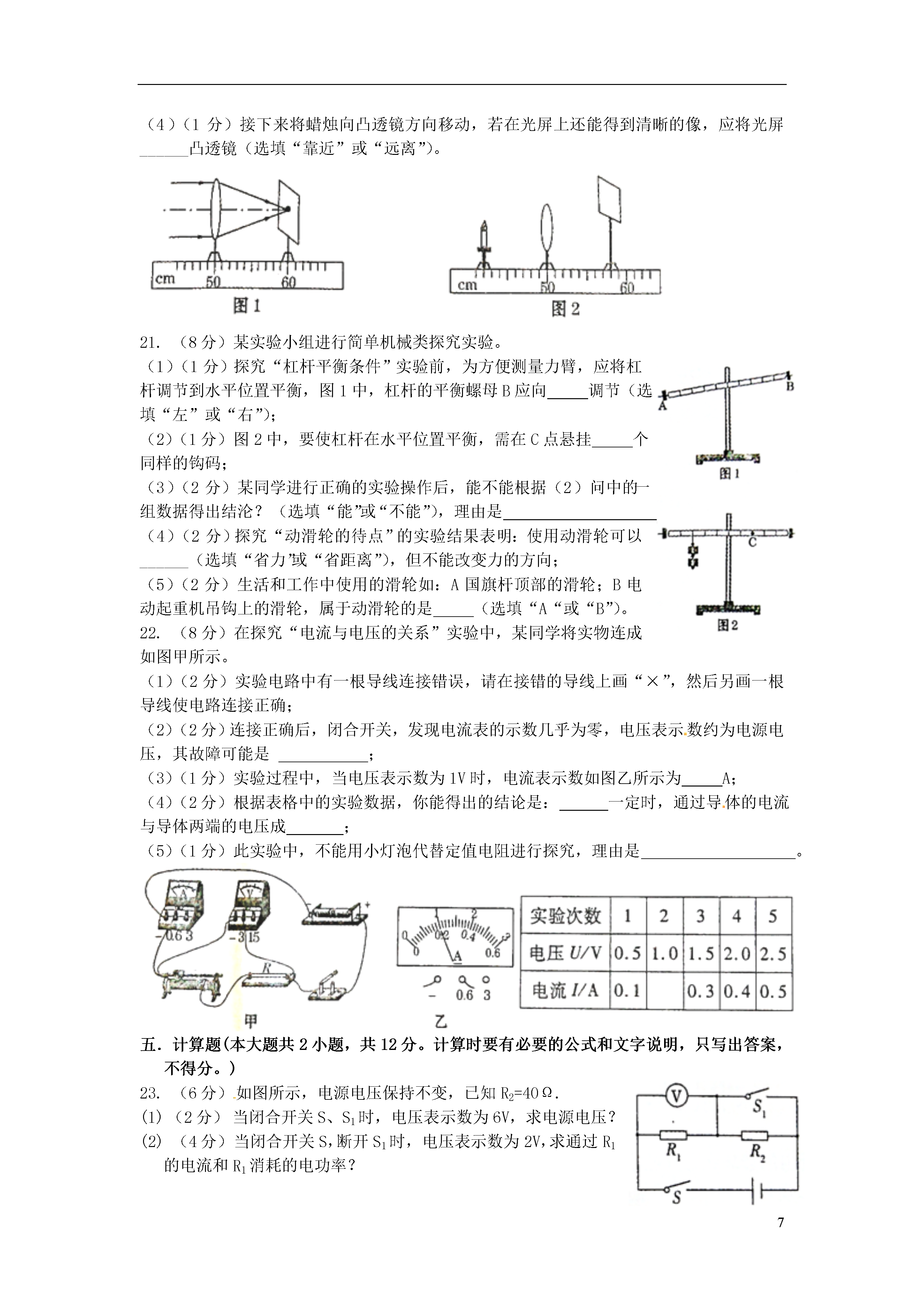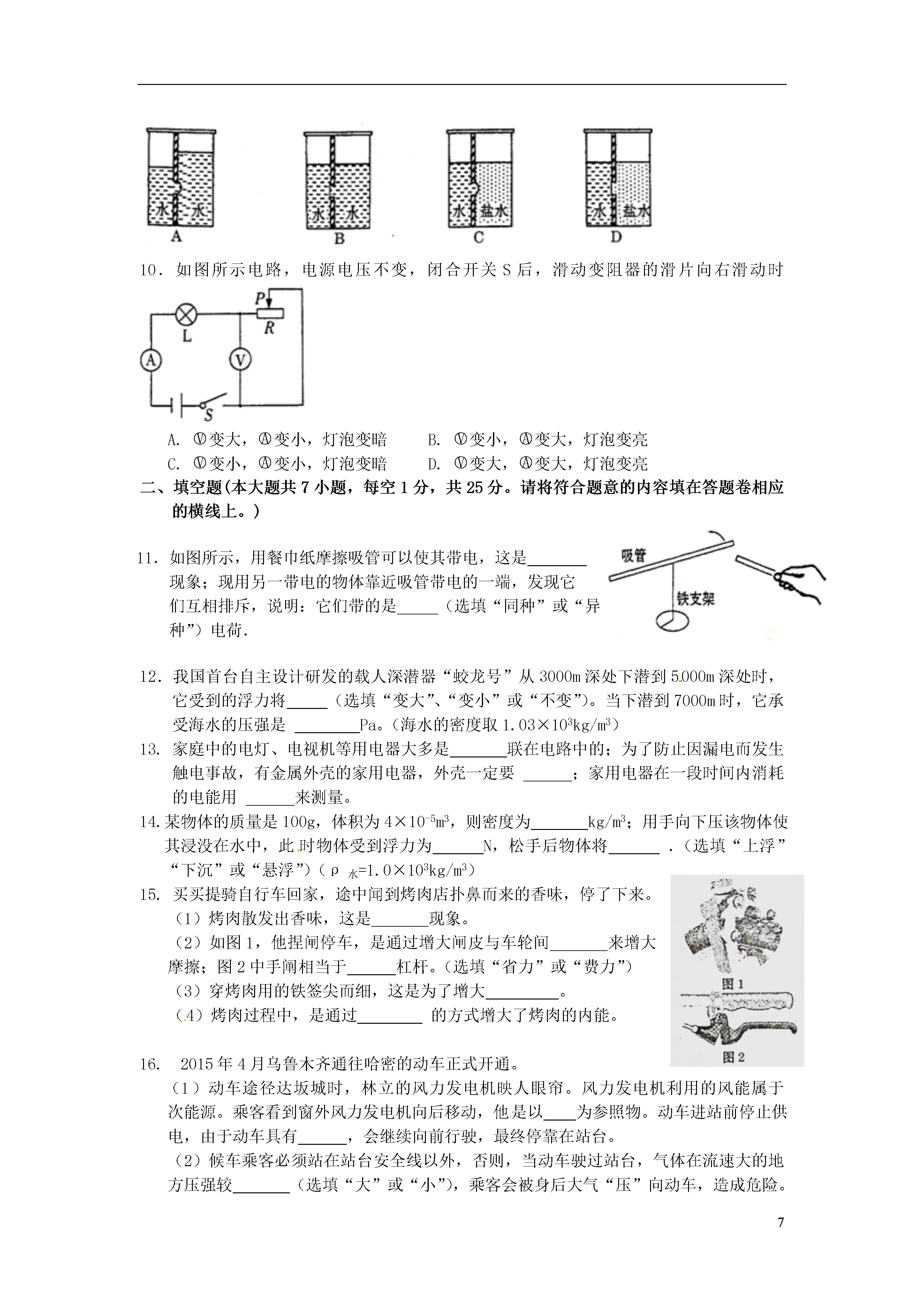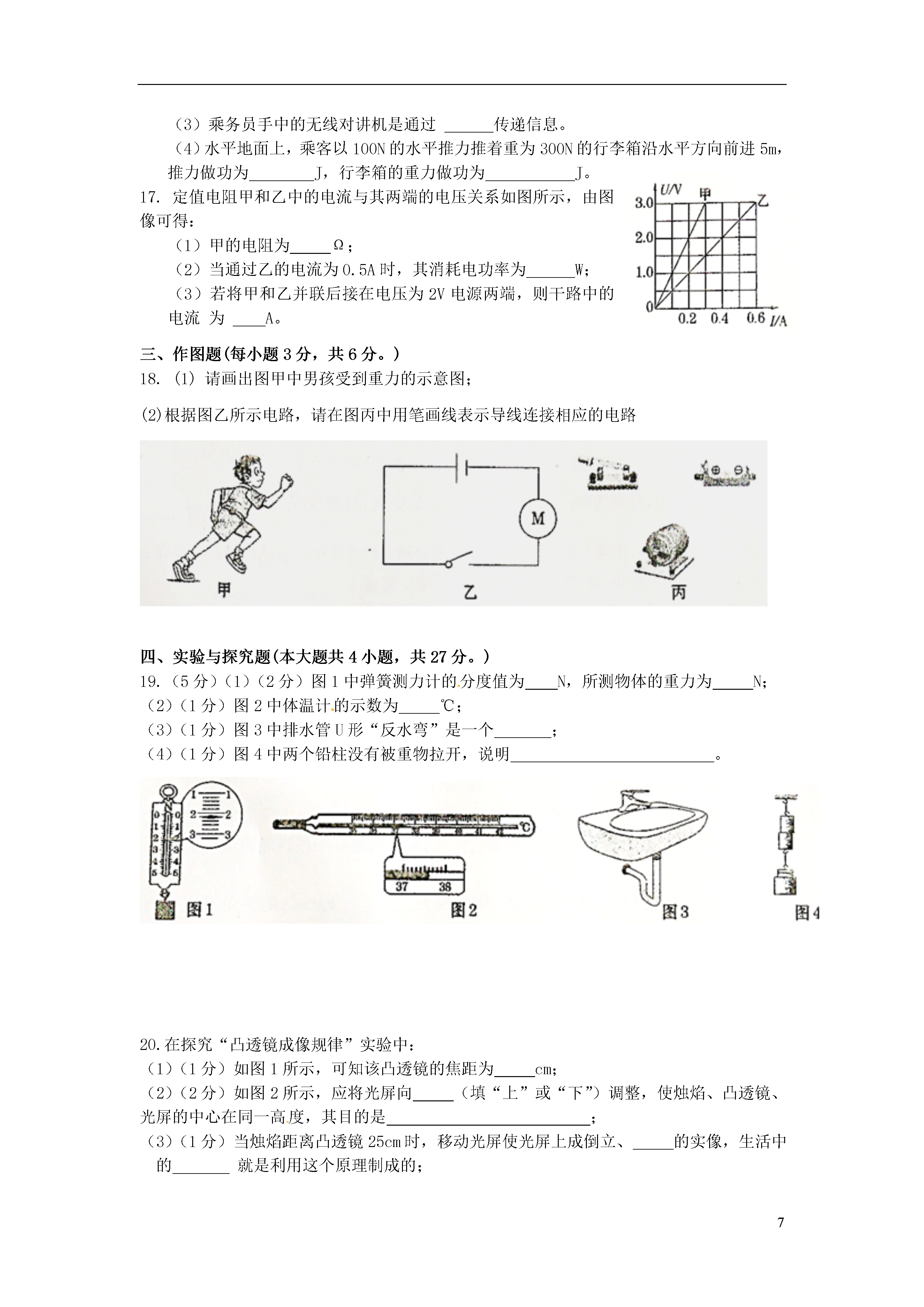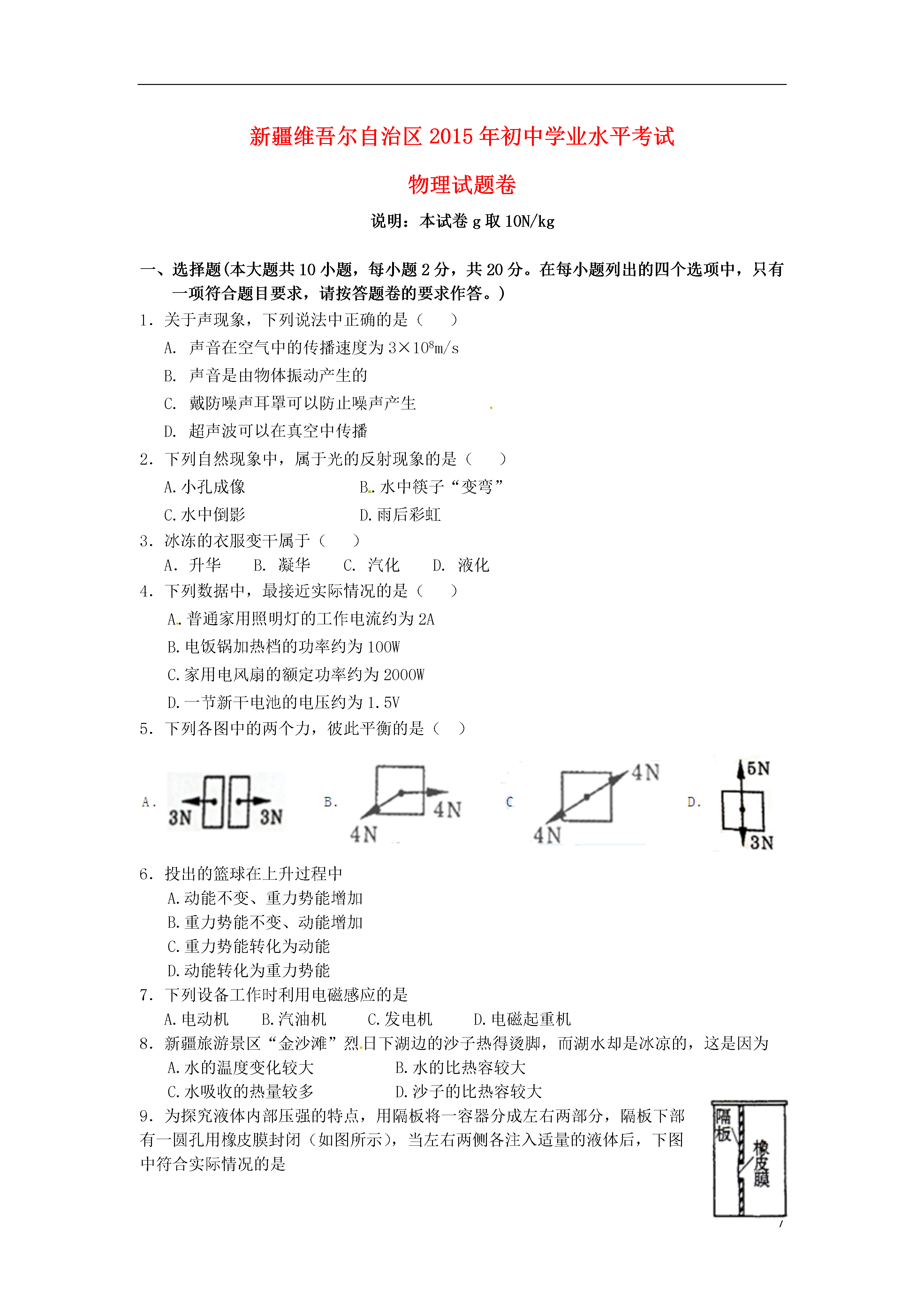 7新疆维吾尔自治区2015年初中学业水平考试物理试题卷说明:本试卷g取10N/kg一、选择题(本大题共10小题,每小题2分,共20分。在每小题列出的四个选项中,只有一项符合题目要求,请按答题卷的要求作答。)1.关于声现象,下列说法中正确的是()A.声音在空气中的传播速度为3×108m/sB.声音是由物体振动产生的C.戴防噪声耳罩可以防止噪声产生D.超声波可以在真空中传播2.下列自然现象中,属于光的反射现象的是()A.小孔成像B.水中筷子“变弯”C.水中倒影D.雨后彩虹3.冰冻的衣服变干属于()A.升华B.凝华C.汽化D.液化4.下列数据中,最接近实际情况的是()A.普通家用照明灯的工作电流约为2AB.电饭锅加热档的功率约为100WC.家用电风扇的额定功率约为2000WD.一节新干电池的电压约为1.5V5.下列各图中的两个力,彼此平衡的是()6.投出的篮球在上升过程中A.动能不变、重力势能增加B.重力势能不变、动能增加C.重力势能转化为动能D.动能转化为重力势能7.下列设备工作时利用电磁感应的是A.电动机B.汽油机C.发电机D.电磁起重机8.新疆旅游景区“金沙滩”烈日下湖边的沙子热得烫脚,而湖水却是冰凉的,这是因为A.水的温度变化较大B.水的比热容较大C.水吸收的热量较多D.沙子的比热容较大9.为探究液体内部压强的特点,用隔板将一容器分成左右两部分,隔板下部有一圆孔用橡皮膜封闭(如图所示),当左右两侧各注入适量的液体后,下图中符合实际情况的是10.如图所示电路,电源电压不变,闭合开关S后,滑动变阻器的滑片向右滑动时A.eq\o\ac(○,V)变大,eq\o\ac(○,A)变小,灯泡变暗B.eq\o\ac(○,V)变小,eq\o\ac(○,A)变大,灯泡变亮C.eq\o\ac(○,V)变小,eq\o\ac(○,A)变小,灯泡变暗D.eq\o\ac(○,V)变大,eq\o\ac(○,A)变大,灯泡变亮二、填空题(本大题共7小题,每空1分,共25分。请将符合题意的内容填在答题卷相应的横线上。)11.如图所示,用餐巾纸摩擦吸管可以使其带电,这是现象;现用另一带电的物体靠近吸管带电的一端,发现它们互相排斥,说明:它们带的是(选填“同种”或“异种”)电荷.12.我国首台自主设计研发的载人深潜器“蛟龙号”从3000m深处下潜到5000m深处时,它受到的浮力将(选填“变大”、“变小”或“不变”)。当下潜到7000m时,它承受海水的压强是Pa。(海水的密度取1.03×103kg/m3)13.家庭中的电灯、电视机等用电器大多是联在电路中的;为了防止因漏电而发生触电事故,有金属外壳的家用电器,外壳一定要;家用电器在一段时间内消耗的电能用来测量。14.某物体的质量是100g,体积为4×10-5m3,则密度为kg/m3;用手向下压该物体使其浸没在水中,此时物体受到浮力为N,松手后物体将.(选填“上浮”“下沉”或“悬浮”)(ρ水=1.0×103kg/m3)15.买买提骑自行车回家,途中闻到烤肉店扑鼻而来的香味,停了下来。(1)烤肉散发出香味,这是现象。(2)如图1,他捏闸停车,是通过增大闸皮与车轮间来增大摩擦;图2中手阐相当于杠杆。(选填“省力”或“费力”)(3)穿烤肉用的铁签尖而细,这是为了增大。(4)烤肉过程中,是通过的方式增大了烤肉的内能。16.2015年4月乌鲁木齐通往哈密的动车正式开通。(1)动车途径达坂城时,林立的风力发电机映人眼帘。风力发电机利用的风能属于次能源。乘客看到窗外风力发电机向后移动,他是以为参照物。动车进站前停止供电,由于动车具有,会继续向前行驶,最终停靠在站台。(2)候车乘客必须站在站台安全线以外,否则,当动车驶过站台,气体在流速大的地方压强较(选填“大”或“小”),乘客会被身后大气“压”向动车,造成危险。(3)乘务员手中的无线对讲机是通过传递信息。(4)水平地面上,乘客以100N的水平推力推着重为300N的行李箱沿水平方向前进5m,推力做功为J,行李箱的重力做功为J。17.定值电阻甲和乙中的电流与其两端的电压关系如图所示,由图像可得:(1)甲的电阻为Ω;(2)当通过乙的电流为0.5A时,其消耗电功率为W;(3)若将甲和乙并联后接在电压为2V电源两端,则干路中的电流为A。三、作图题(每小题3分,共6分。)18.(1)请画出图甲中男孩受到重力的示意图;(2)根据图乙所示电路,请在图丙中用笔画线表示导线连接相应的电路四、实验与探究题(本大题共4小题,共27分。)19.(5分)(1)(2分)图1中弹簧测力计的分度值为N,所测物体的重力为N;(2)(1分)图2中体