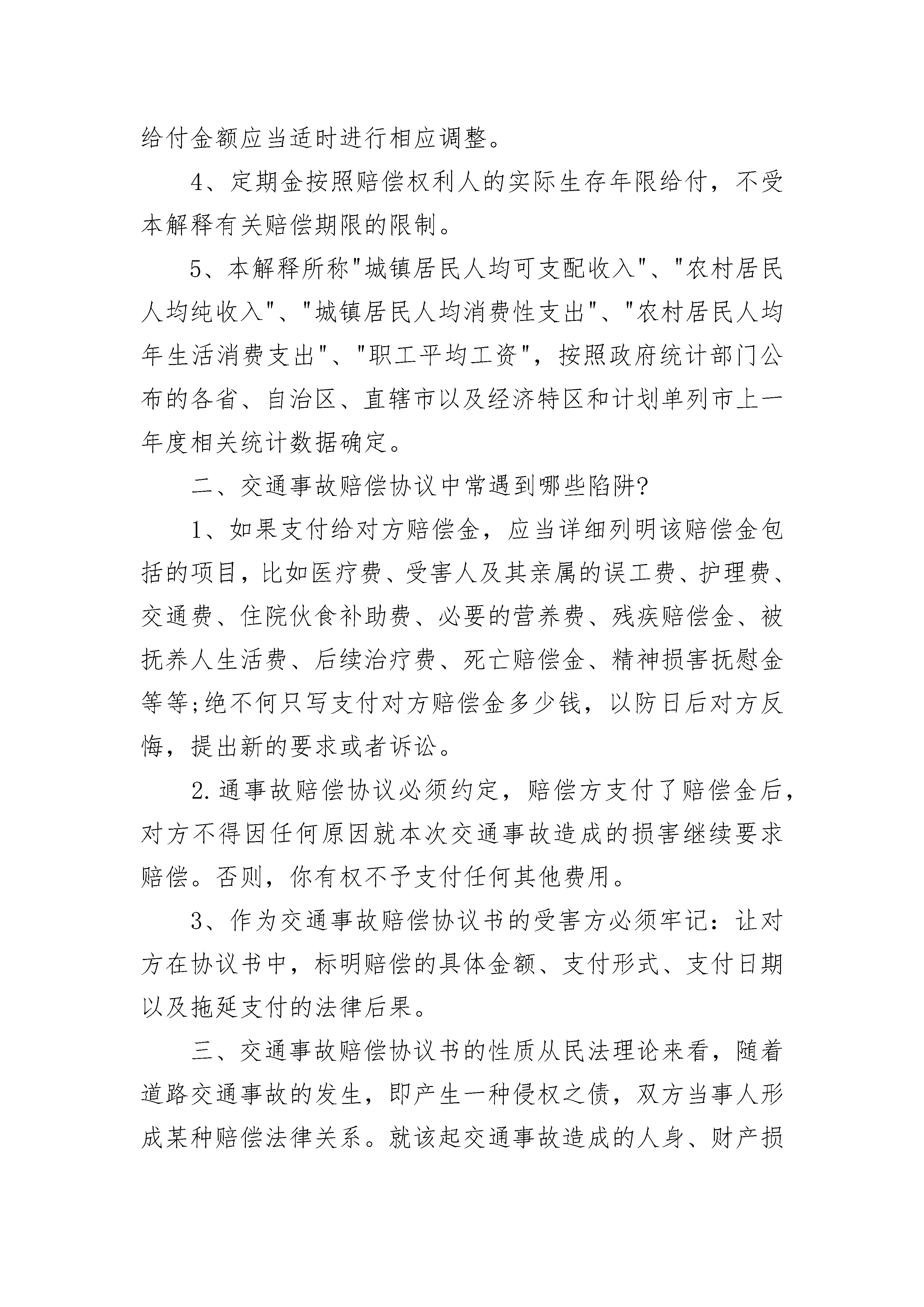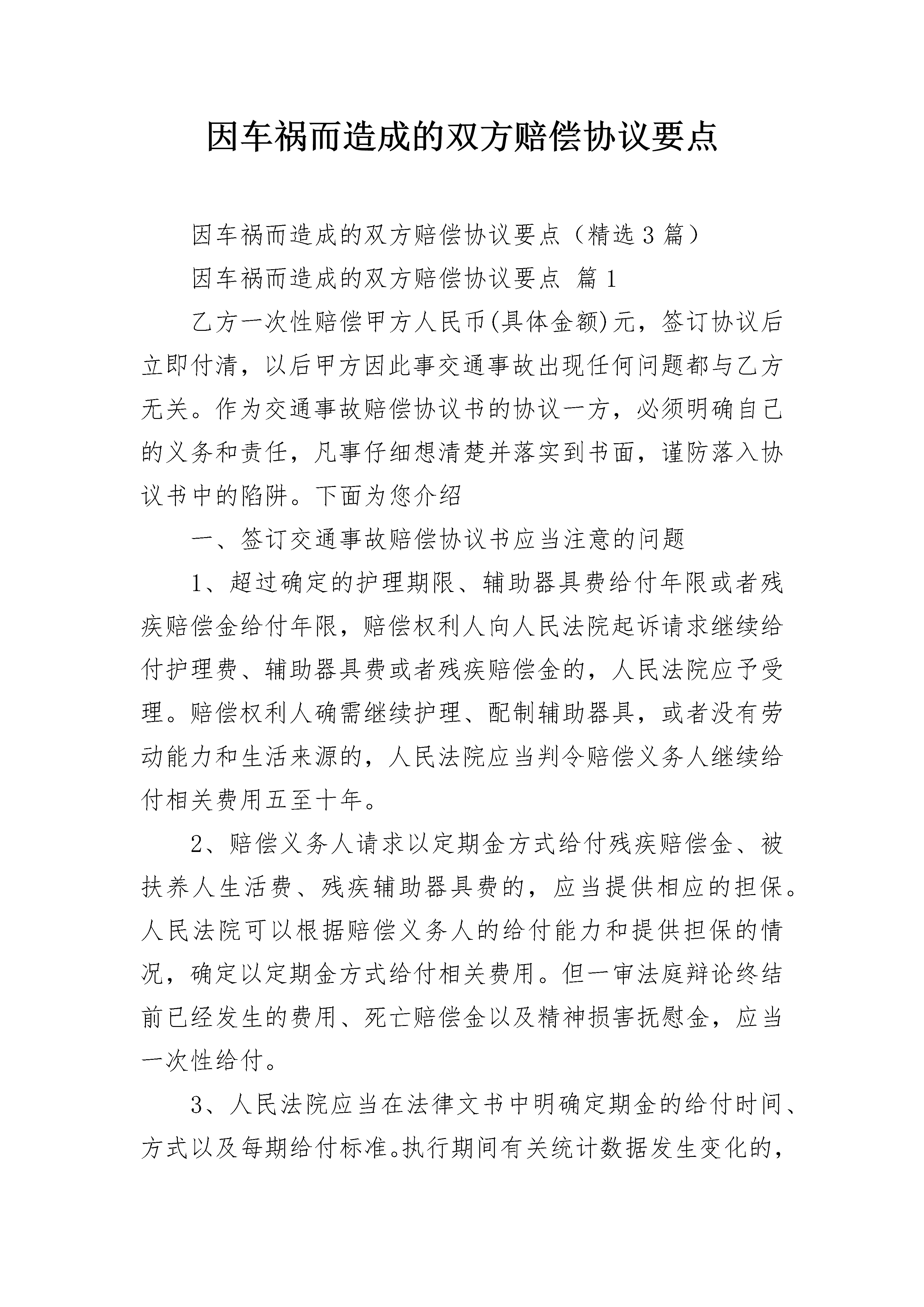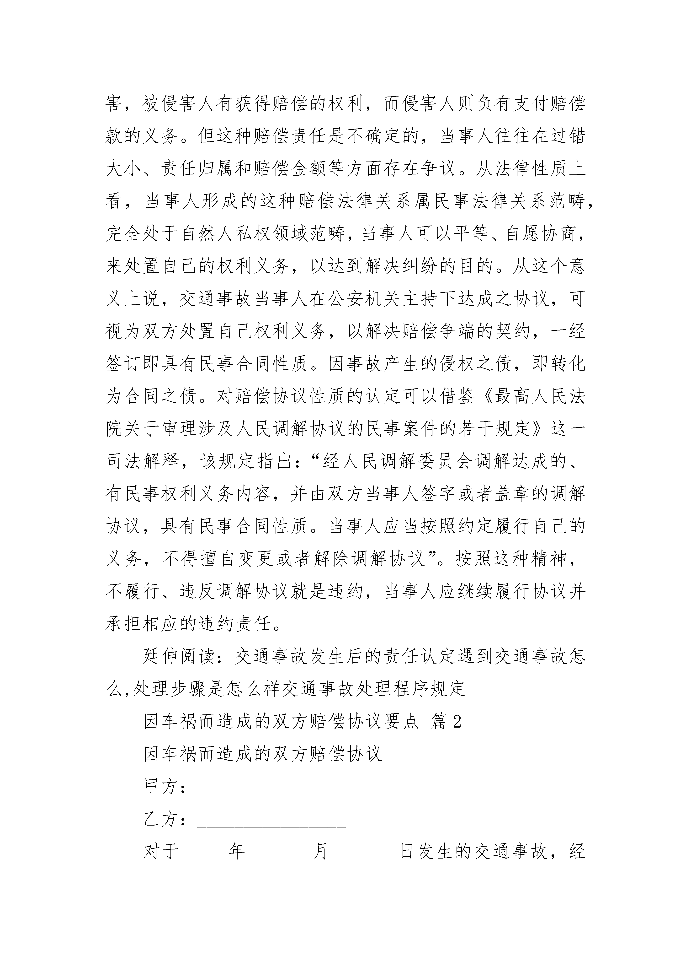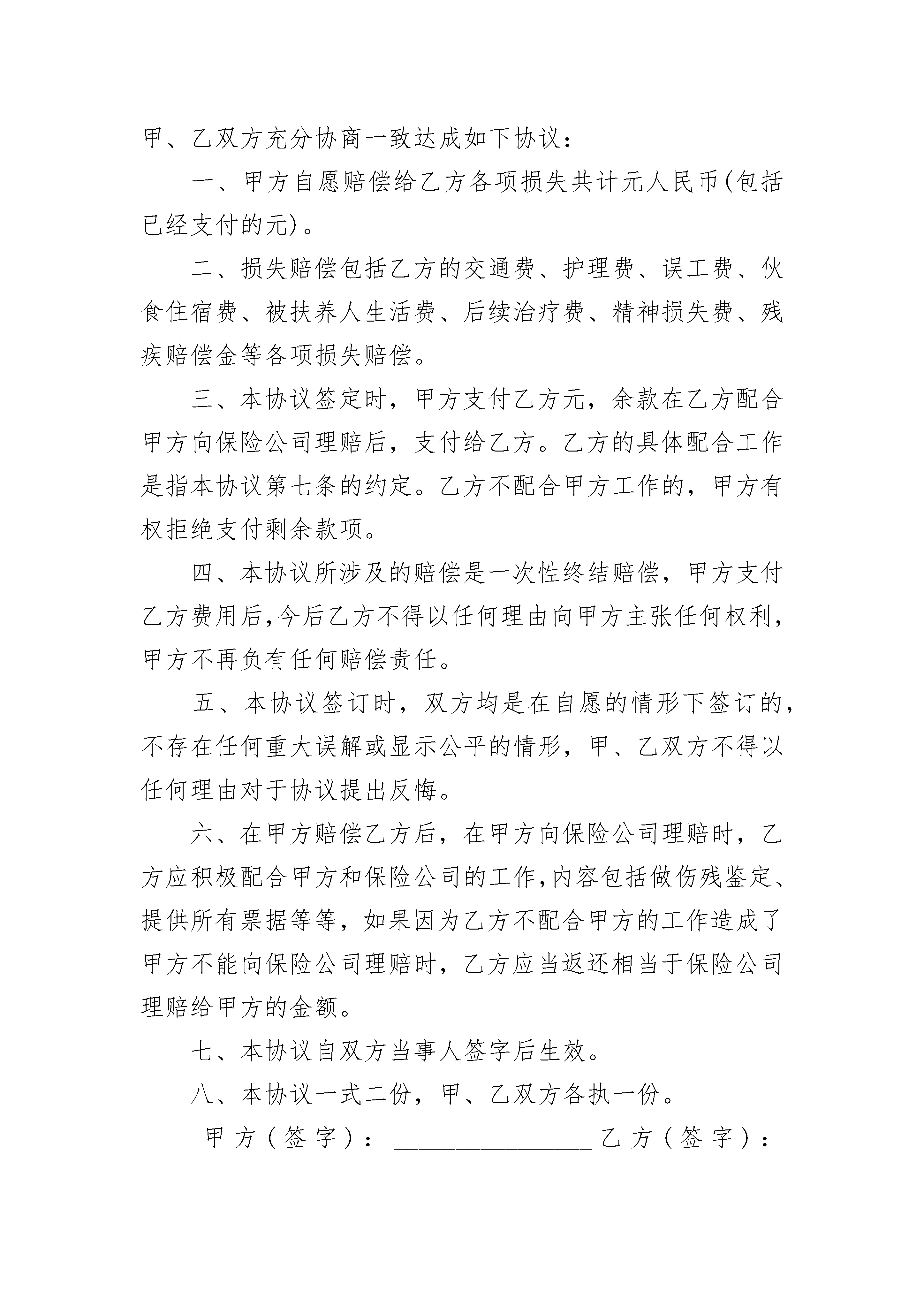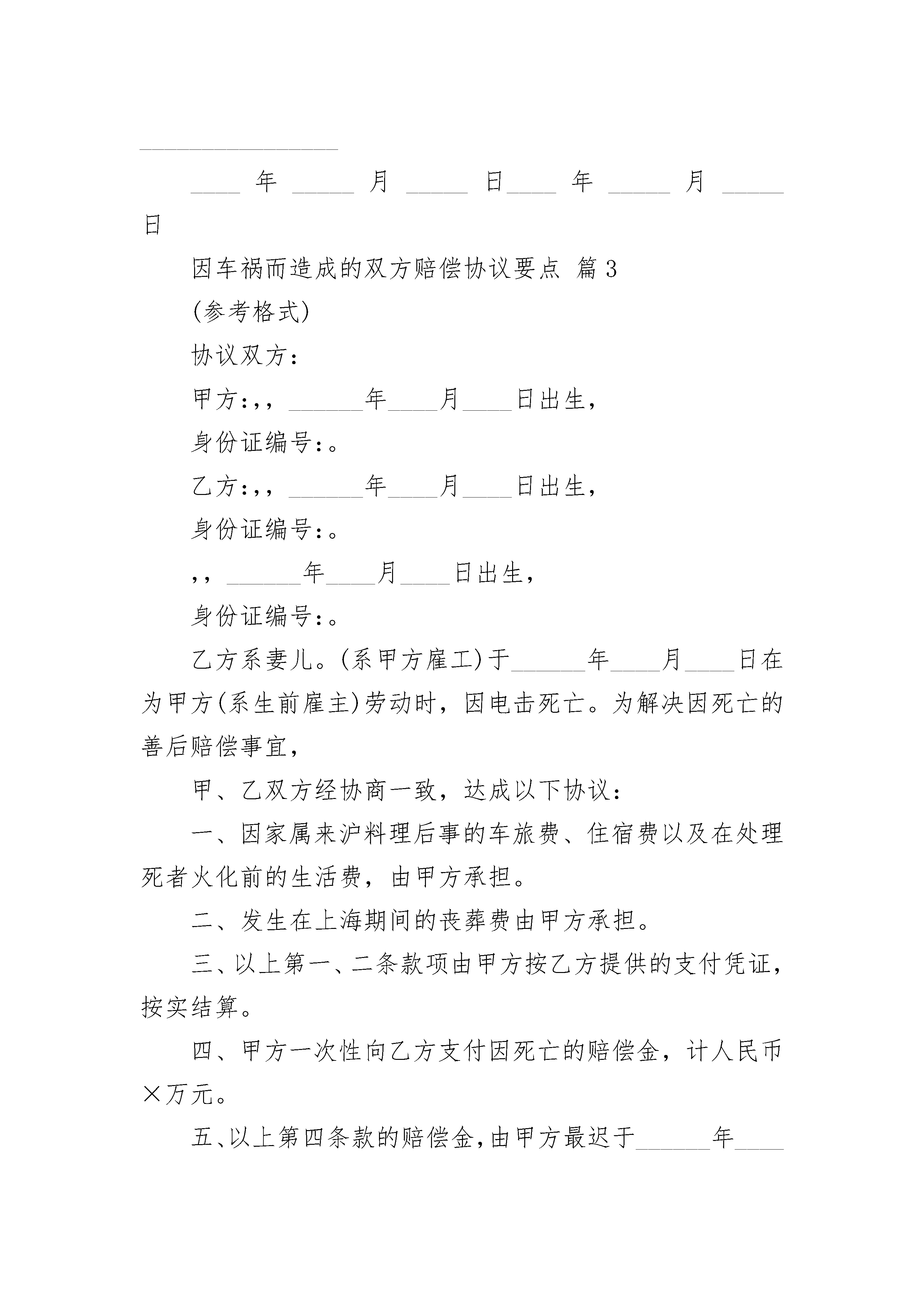因车祸而造成的双方赔偿协议要点因车祸而造成的双方赔偿协议要点(精选3篇)因车祸而造成的双方赔偿协议要点篇1乙方一次性赔偿甲方人民币(具体金额)元,签订协议后立即付清,以后甲方因此事交通事故出现任何问题都与乙方无关。作为交通事故赔偿协议书的协议一方,必须明确自己的义务和责任,凡事仔细想清楚并落实到书面,谨防落入协议书中的陷阱。下面为您介绍一、签订交通事故赔偿协议书应当注意的问题1、超过确定的护理期限、辅助器具费给付年限或者残疾赔偿金给付年限,赔偿权利人向人民法院起诉请求继续给付护理费、辅助器具费或者残疾赔偿金的,人民法院应予受理。赔偿权利人确需继续护理、配制辅助器具,或者没有劳动能力和生活来源的,人民法院应当判令赔偿义务人继续给付相关费用五至十年。2、赔偿义务人请求以定期金方式给付残疾赔偿金、被扶养人生活费、残疾辅助器具费的,应当提供相应的担保。人民法院可以根据赔偿义务人的给付能力和提供担保的情况,确定以定期金方式给付相关费用。但一审法庭辩论终结前已经发生的费用、死亡赔偿金以及精神损害抚慰金,应当一次性给付。3、人民法院应当在法律文书中明确定期金的给付时间、方式以及每期给付标准。执行期间有关统计数据发生变化的,给付金额应当适时进行相应调整。4、定期金按照赔偿权利人的实际生存年限给付,不受本解释有关赔偿期限的限制。5、本解释所称"城镇居民人均可支配收入"、"农村居民人均纯收入"、"城镇居民人均消费性支出"、"农村居民人均年生活消费支出"、"职工平均工资",按照政府统计部门公布的各省、自治区、直辖市以及经济特区和计划单列市上一年度相关统计数据确定。二、交通事故赔偿协议中常遇到哪些陷阱?1、如果支付给对方赔偿金,应当详细列明该赔偿金包括的项目,比如医疗费、受害人及其亲属的误工费、护理费、交通费、住院伙食补助费、必要的营养费、残疾赔偿金、被抚养人生活费、后续治疗费、死亡赔偿金、精神损害抚慰金等等;绝不何只写支付对方赔偿金多少钱,以防日后对方反悔,提出新的要求或者诉讼。2.通事故赔偿协议必须约定,赔偿方支付了赔偿金后,对方不得因任何原因就本次交通事故造成的损害继续要求赔偿。否则,你有权不予支付任何其他费用。3、作为交通事故赔偿协议书的受害方必须牢记:让对方在协议书中,标明赔偿的具体金额、支付形式、支付日期以及拖延支付的法律后果。三、交通事故赔偿协议书的性质从民法理论来看,随着道路交通事故的发生,即产生一种侵权之债,双方当事人形成某种赔偿法律关系。就该起交通事故造成的人身、财产损害,被侵害人有获得赔偿的权利,而侵害人则负有支付赔偿款的义务。但这种赔偿责任是不确定的,当事人往往在过错大小、责任归属和赔偿金额等方面存在争议。从法律性质上看,当事人形成的这种赔偿法律关系属民事法律关系范畴,完全处于自然人私权领域范畴,当事人可以平等、自愿协商,来处置自己的权利义务,以达到解决纠纷的目的。从这个意义上说,交通事故当事人在公安机关主持下达成之协议,可视为双方处置自己权利义务,以解决赔偿争端的契约,一经签订即具有民事合同性质。因事故产生的侵权之债,即转化为合同之债。对赔偿协议性质的认定可以借鉴《最高人民法院关于审理涉及人民调解协议的民事案件的若干规定》这一司法解释,该规定指出:“经人民调解委员会调解达成的、有民事权利义务内容,并由双方当事人签字或者盖章的调解协议,具有民事合同性质。当事人应当按照约定履行自己的义务,不得擅自变更或者解除调解协议”。按照这种精神,不履行、违反调解协议就是违约,当事人应继续履行协议并承担相应的违约责任。延伸阅读:交通事故发生后的责任认定遇到交通事故怎么,处理步骤是怎么样交通事故处理程序规定因车祸而造成的双方赔偿协议要点篇2因车祸而造成的双方赔偿协议甲方:________________乙方:________________对于____年_____月_____日发生的交通事故,经甲、乙双方充分协商一致达成如下协议:一、甲方自愿赔偿给乙方各项损失共计元人民币(包括已经支付的元)。二、损失赔偿包括乙方的交通费、护理费、误工费、伙食住宿费、被扶养人生活费、后续治疗费、精神损失费、残疾赔偿金等各项损失赔偿。三、本协议签定时,甲方支付乙方元,余款在乙方配合甲方向保险公司理赔后,支付给乙方。乙方的具体配合工作是指本协议第七条的约定。乙方不配合甲方工作的,甲方有权拒绝支付剩余款项。四、本协议所涉及的赔偿是一次性终结赔偿,甲方支付乙方费用后,今后乙方不得以任何理由向甲方主张任何权利,甲方不再负有任何赔偿责任。五、本协议签订时,双方均是在自愿的情形下签订的,不存在任何重大误解或显示公平的情形,甲、乙双方不得以任何理由对于协议提出反悔。六、在甲方赔偿乙方后,在甲方向保险公司理赔时,乙方应积极配合甲方和保险公司的工作,内容包括做伤残鉴定、提供所有