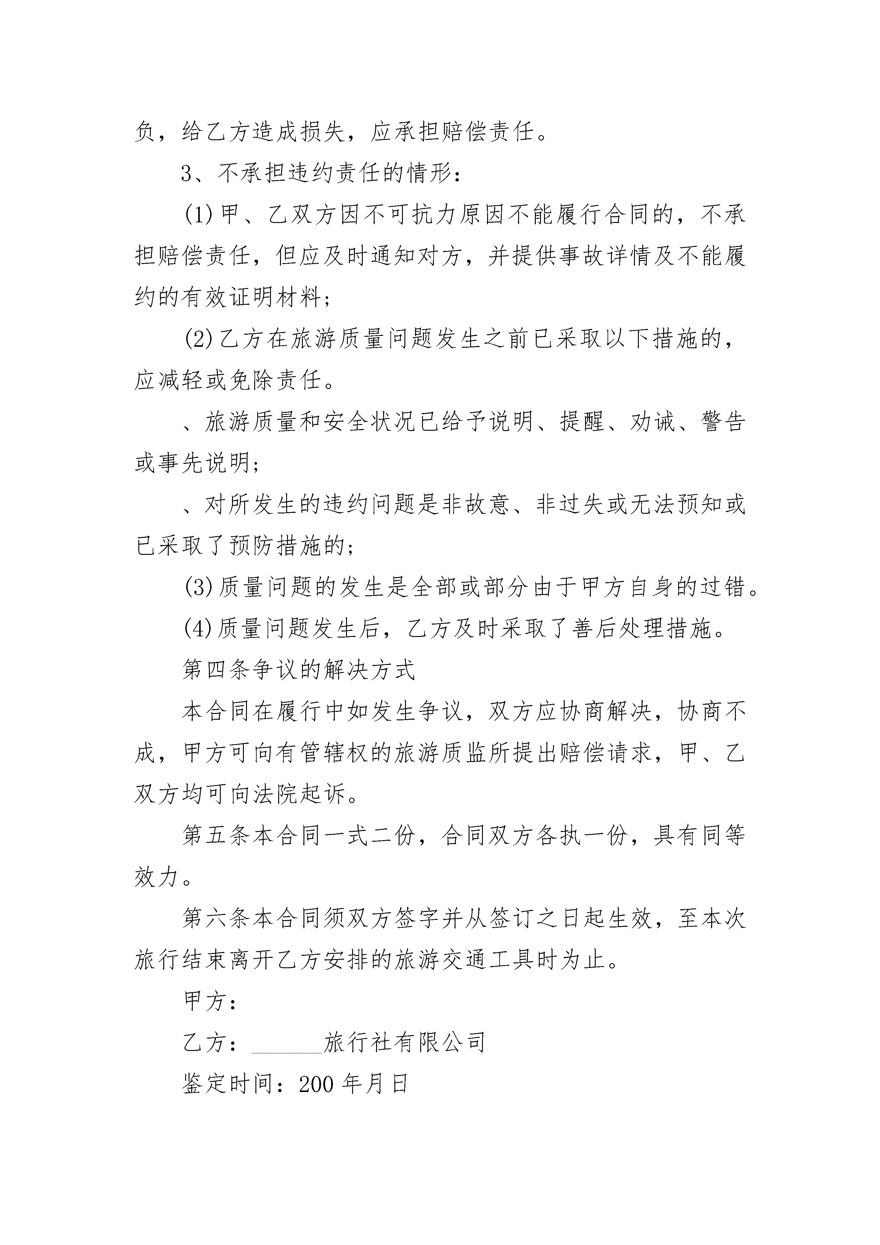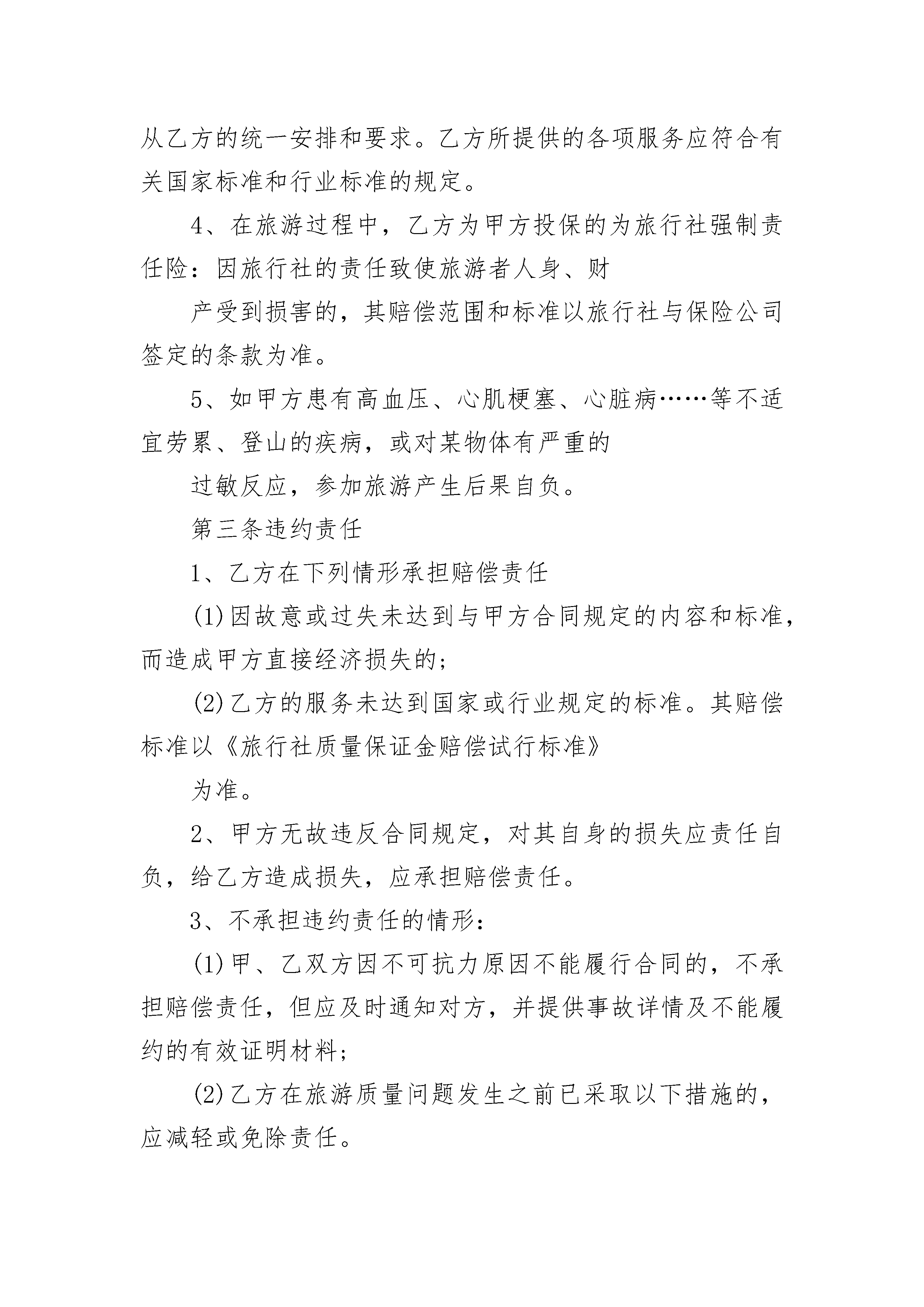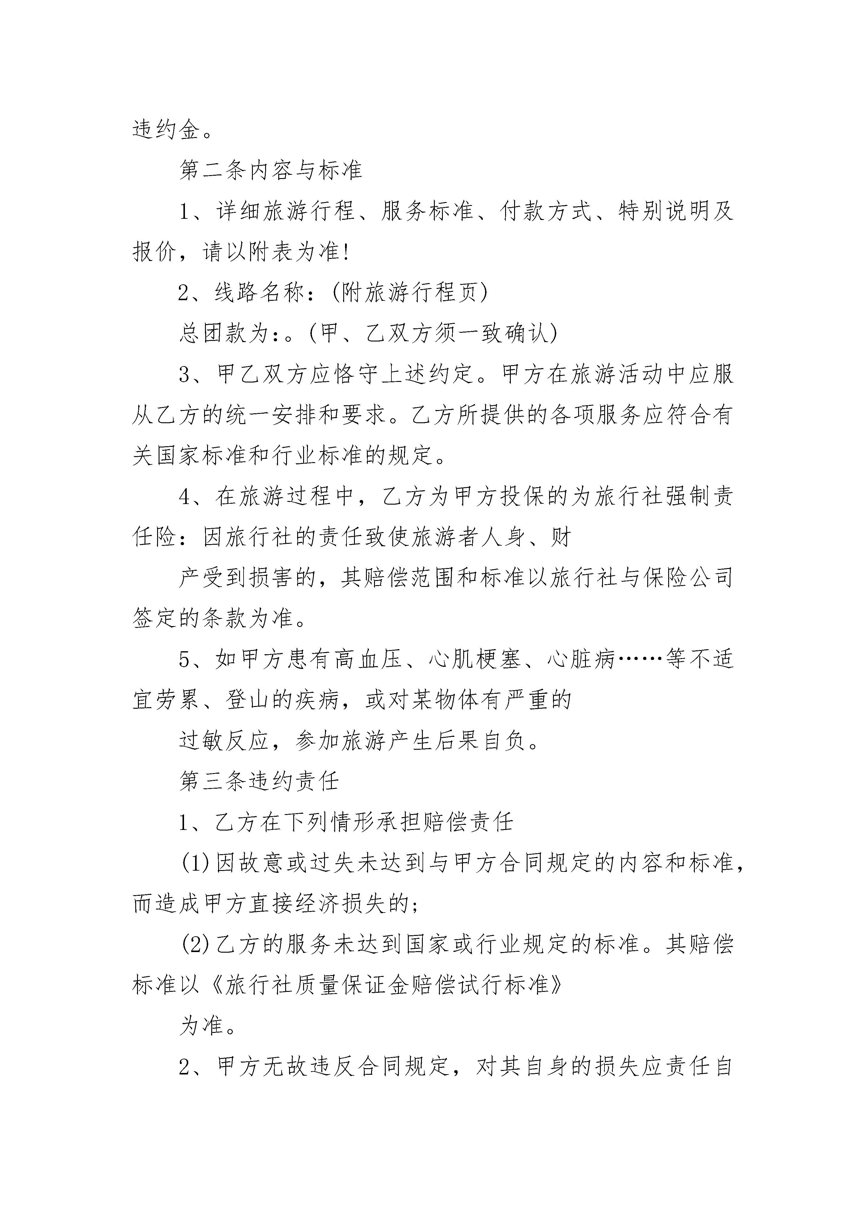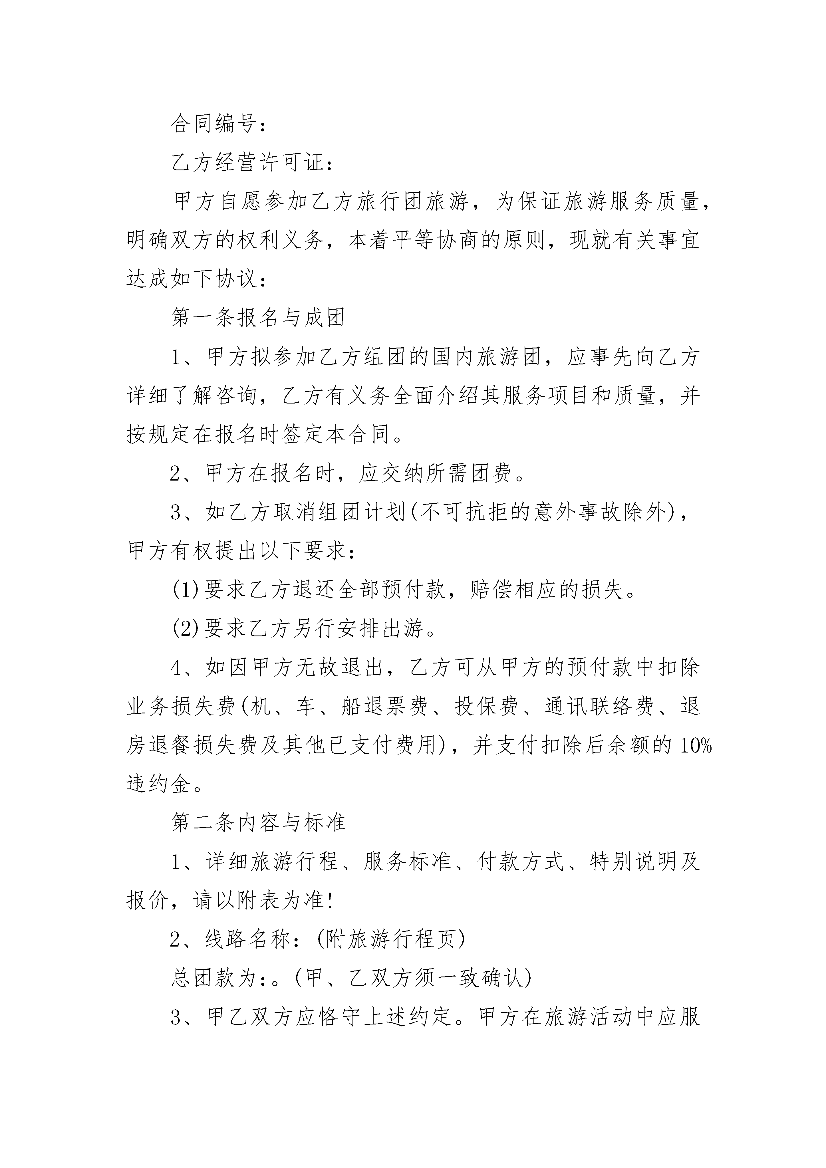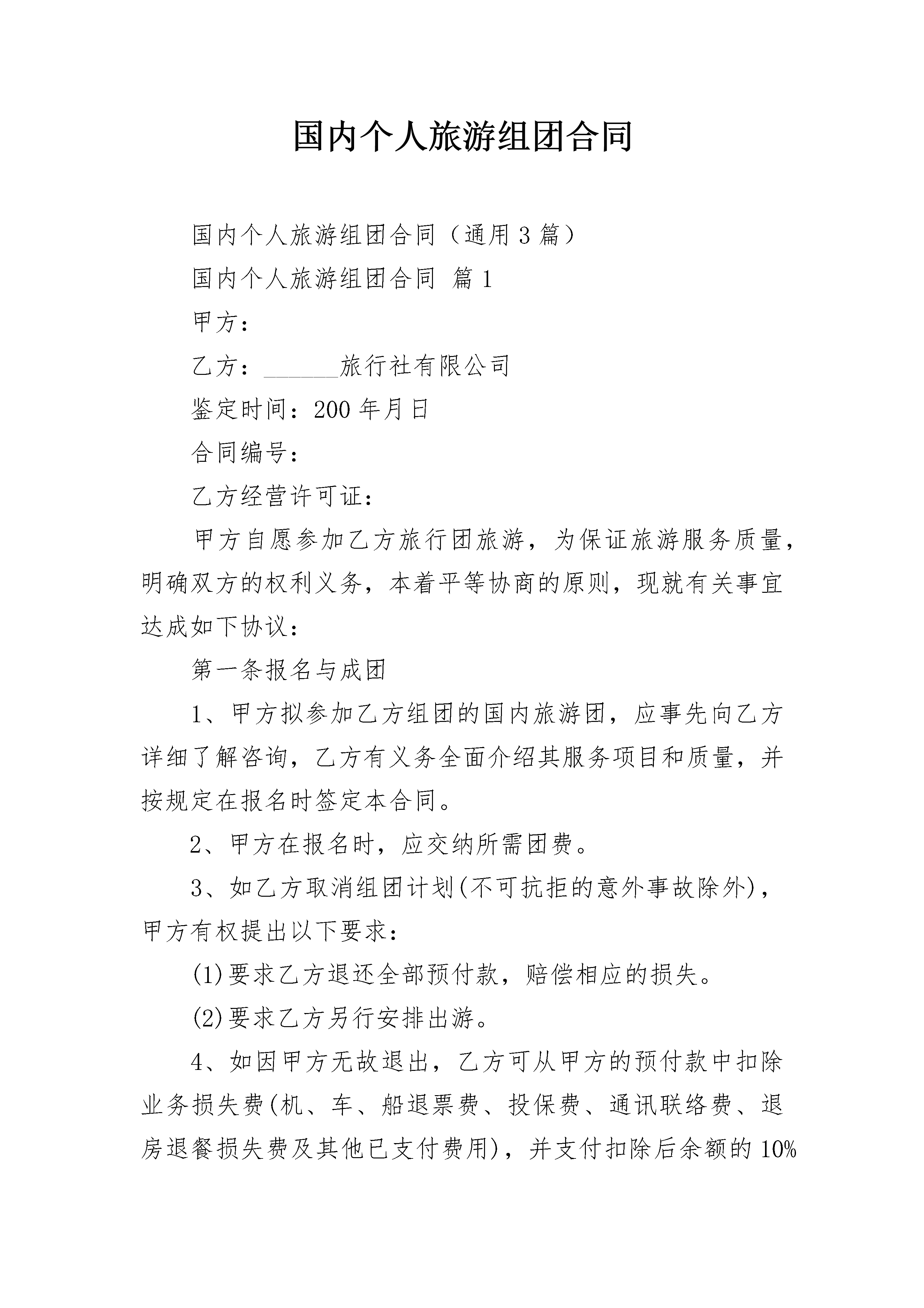 国内个人旅游组团合同国内个人旅游组团合同(通用3篇)国内个人旅游组团合同篇1甲方:乙方:______旅行社有限公司鉴定时间:200年月日合同编号:乙方经营许可证:甲方自愿参加乙方旅行团旅游,为保证旅游服务质量,明确双方的权利义务,本着平等协商的原则,现就有关事宜达成如下协议:第一条报名与成团1、甲方拟参加乙方组团的国内旅游团,应事先向乙方详细了解咨询,乙方有义务全面介绍其服务项目和质量,并按规定在报名时签定本合同。2、甲方在报名时,应交纳所需团费。3、如乙方取消组团计划(不可抗拒的意外事故除外),甲方有权提出以下要求:(1)要求乙方退还全部预付款,赔偿相应的损失。(2)要求乙方另行安排出游。4、如因甲方无故退出,乙方可从甲方的预付款中扣除业务损失费(机、车、船退票费、投保费、通讯联络费、退房退餐损失费及其他已支付费用),并支付扣除后余额的10%违约金。第二条内容与标准1、详细旅游行程、服务标准、付款方式、特别说明及报价,请以附表为准!2、线路名称:(附旅游行程页)总团款为:。(甲、乙双方须一致确认)3、甲乙双方应恪守上述约定。甲方在旅游活动中应服从乙方的统一安排和要求。乙方所提供的各项服务应符合有关国家标准和行业标准的规定。4、在旅游过程中,乙方为甲方投保的为旅行社强制责任险:因旅行社的责任致使旅游者人身、财产受到损害的,其赔偿范围和标准以旅行社与保险公司签定的条款为准。5、如甲方患有高血压、心肌梗塞、心脏病……等不适宜劳累、登山的疾病,或对某物体有严重的过敏反应,参加旅游产生后果自负。第三条违约责任1、乙方在下列情形承担赔偿责任(1)因故意或过失未达到与甲方合同规定的内容和标准,而造成甲方直接经济损失的;(2)乙方的服务未达到国家或行业规定的标准。其赔偿标准以《旅行社质量保证金赔偿试行标准》为准。2、甲方无故违反合同规定,对其自身的损失应责任自负,给乙方造成损失,应承担赔偿责任。3、不承担违约责任的情形:(1)甲、乙双方因不可抗力原因不能履行合同的,不承担赔偿责任,但应及时通知对方,并提供事故详情及不能履约的有效证明材料;(2)乙方在旅游质量问题发生之前已采取以下措施的,应减轻或免除责任。、旅游质量和安全状况已给予说明、提醒、劝诫、警告或事先说明;、对所发生的违约问题是非故意、非过失或无法预知或已采取了预防措施的;(3)质量问题的发生是全部或部分由于甲方自身的过错。(4)质量问题发生后,乙方及时采取了善后处理措施。第四条争议的解决方式本合同在履行中如发生争议,双方应协商解决,协商不成,甲方可向有管辖权的旅游质监所提出赔偿请求,甲、乙双方均可向法院起诉。第五条本合同一式二份,合同双方各执一份,具有同等效力。第六条本合同须双方签字并从签订之日起生效,至本次旅行结束离开乙方安排的旅游交通工具时为止。甲方:乙方:______旅行社有限公司鉴定时间:200年月日合同编号:乙方经营许可证:甲方自愿参加乙方旅行团旅游,为保证旅游服务质量,明确双方的权利义务,本着平等协商的原则,现就有关事宜达成如下协议:第一条报名与成团1、甲方拟参加乙方组团的国内旅游团,应事先向乙方详细了解咨询,乙方有义务全面介绍其服务项目和质量,并按规定在报名时签定本合同。2、甲方在报名时,应交纳所需团费。3、如乙方取消组团计划(不可抗拒的意外事故除外),甲方有权提出以下要求:(1)要求乙方退还全部预付款,赔偿相应的损失。(2)要求乙方另行安排出游。4、如因甲方无故退出,乙方可从甲方的预付款中扣除业务损失费(机、车、船退票费、投保费、通讯联络费、退房退餐损失费及其他已支付费用),并支付扣除后余额的10%违约金。第二条内容与标准1、详细旅游行程、服务标准、付款方式、特别说明及报价,请以附表为准!2、线路名称:(附旅游行程页)总团款为:。(甲、乙双方须一致确认)3、甲乙双方应恪守上述约定。甲方在旅游活动中应服从乙方的统一安排和要求。乙方所提供的各项服务应符合有关国家标准和行业标准的规定。4、在旅游过程中,乙方为甲方投保的为旅行社强制责任险:因旅行社的责任致使旅游者人身、财产受到损害的,其赔偿范围和标准以旅行社与保险公司签定的条款为准。5、如甲方患有高血压、心肌梗塞、心脏病……等不适宜劳累、登山的疾病,或对某物体有严重的过敏反应,参加旅游产生后果自负。第三条违约责任1、乙方在下列情形承担赔偿责任(1)因故意或过失未达到与甲方合同规定的内容和标准,而造成甲方直接经济损失的;(2)乙方的服务未达到国家或行业规定的标准。其赔偿标准以《旅行社质量保证金赔偿试行标准》为准。2、甲方无故违反合同规定,对其自身的损失应责任自负,给乙方造成损失,应承担赔偿责任。3、不承担违约责任的情形:(1)甲、乙双方因不可抗力原因不能履行合同的,不承担赔偿责任,但应及时通知对方,并提供事故详情及不能履