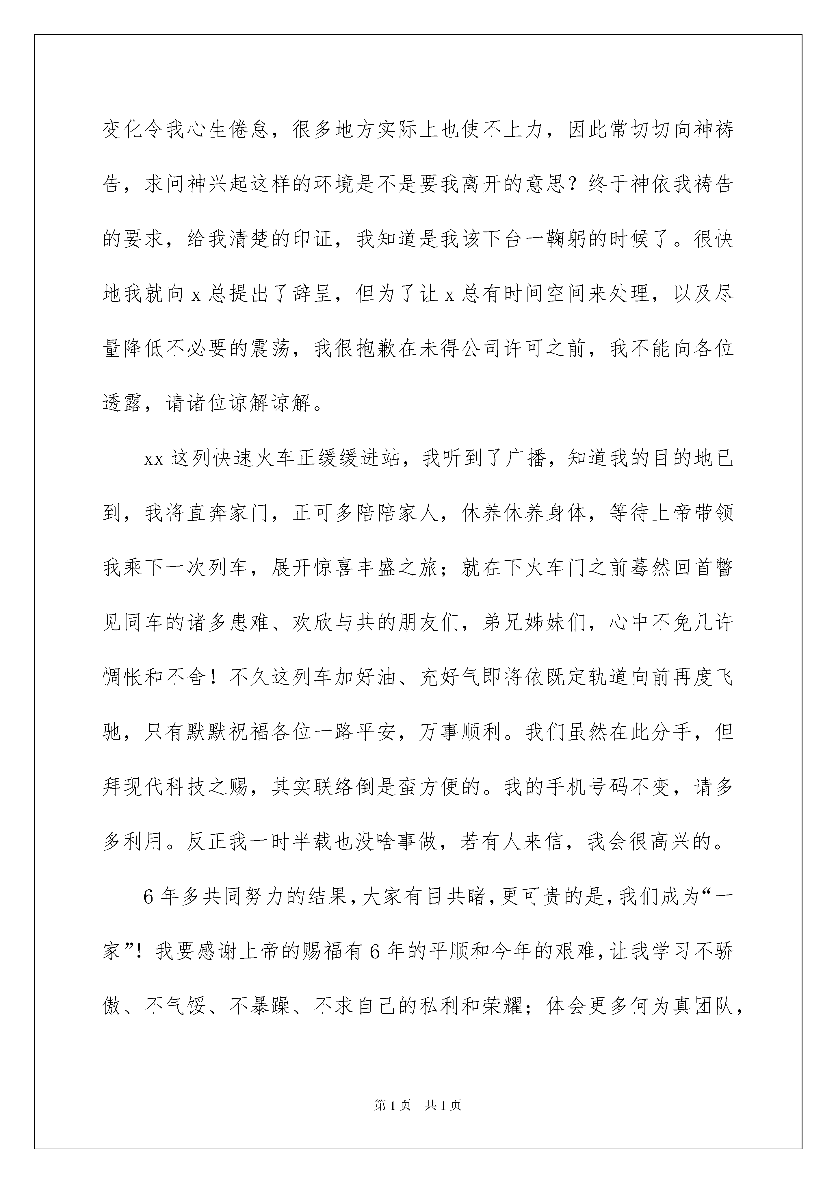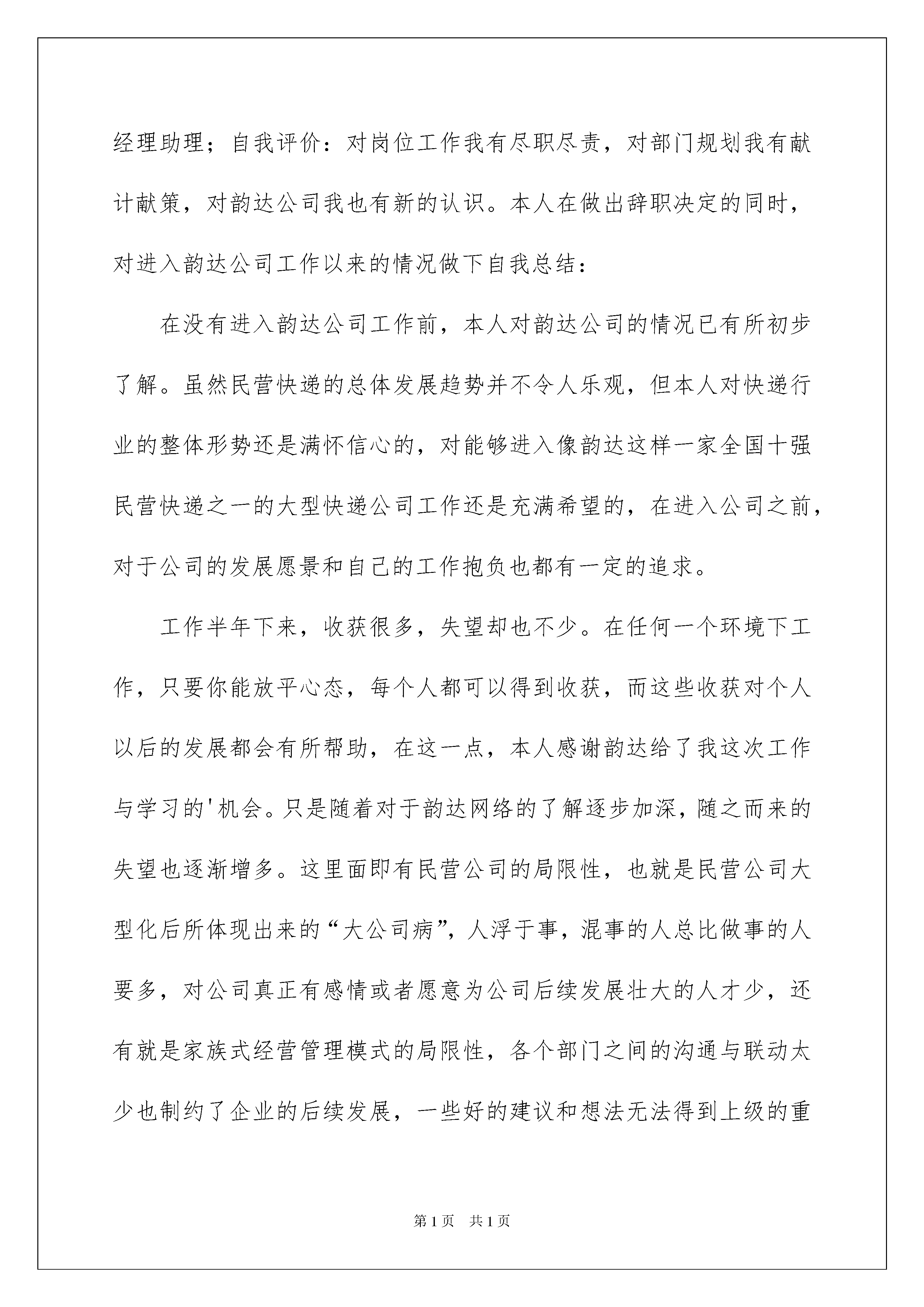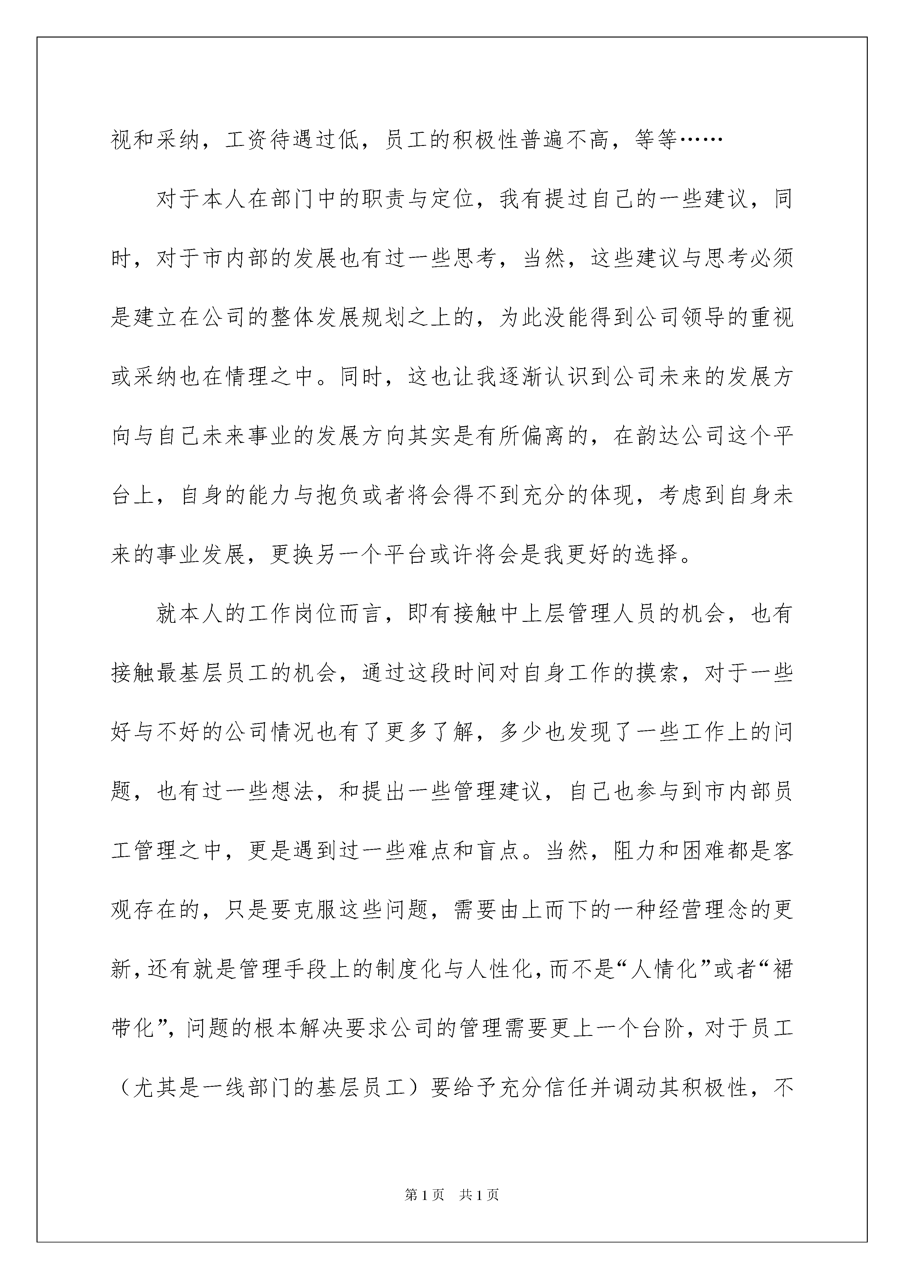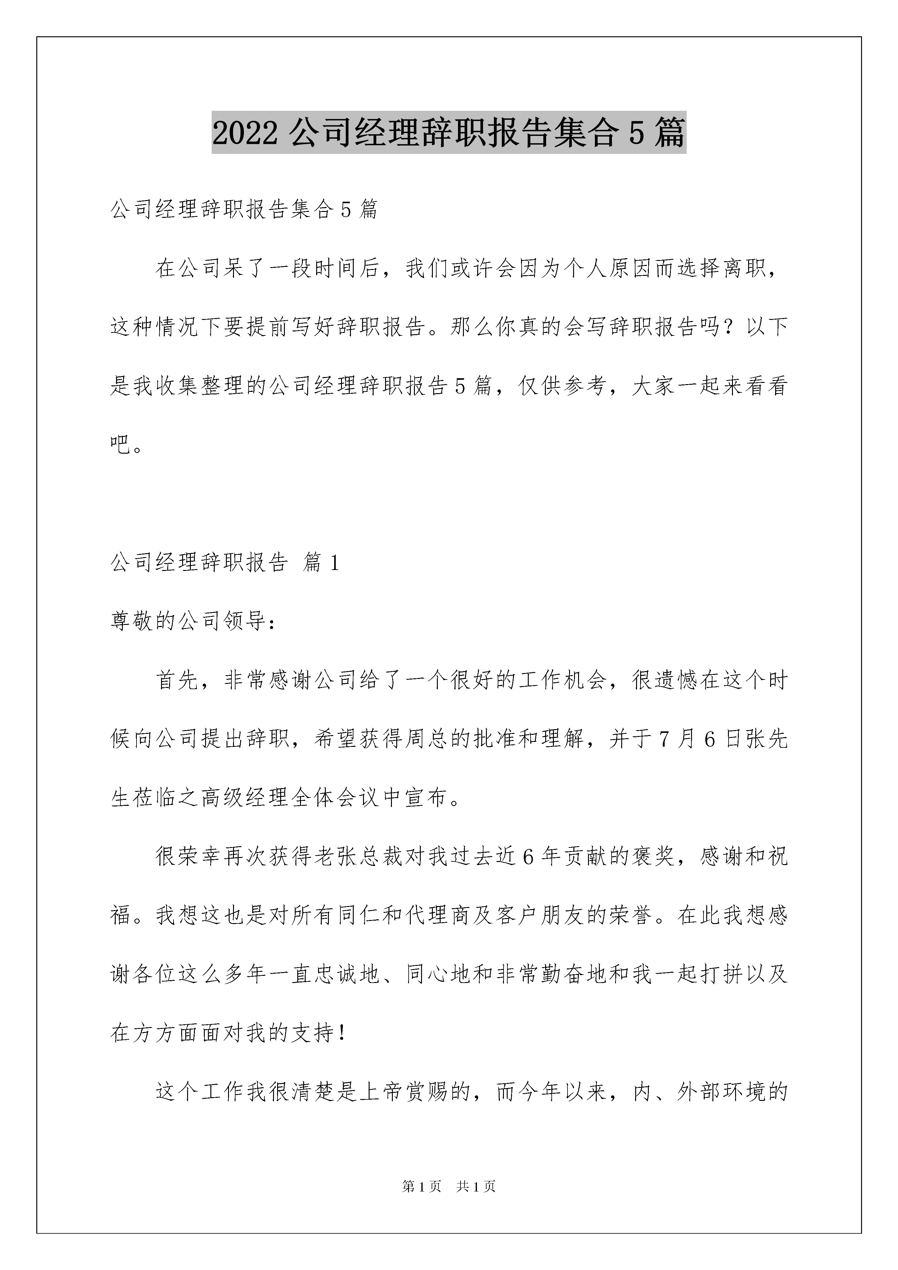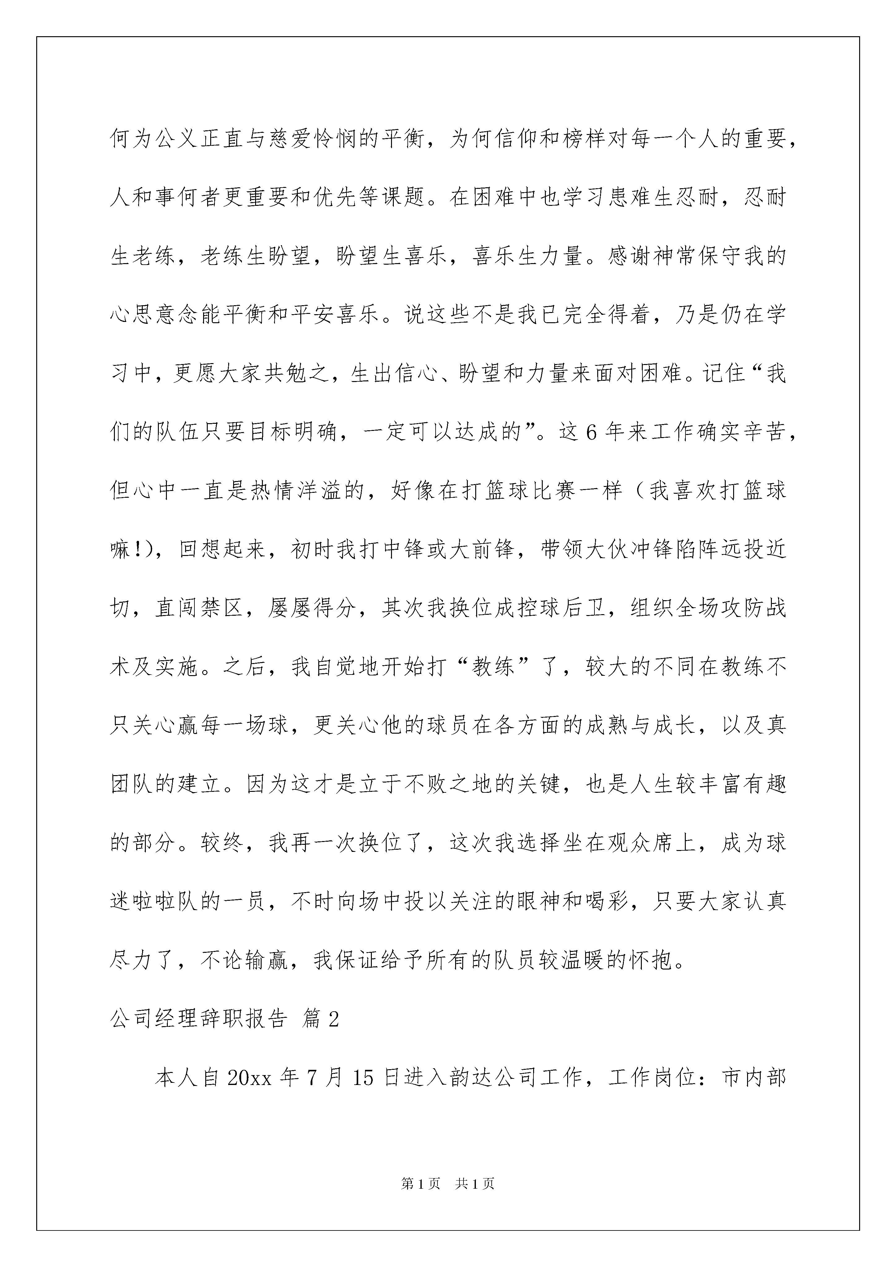 2022公司经理辞职报告集合5篇公司经理辞职报告集合5篇在公司呆了一段时间后,我们或许会因为个人原因而选择离职,这种情况下要提前写好辞职报告。那么你真的会写辞职报告吗?以下是我收集整理的公司经理辞职报告5篇,仅供参考,大家一起来看看吧。公司经理辞职报告篇1尊敬的公司领导:首先,非常感谢公司给了一个很好的工作机会,很遗憾在这个时候向公司提出辞职,希望获得周总的批准和理解,并于7月6日张先生莅临之高级经理全体会议中宣布。很荣幸再次获得老张总裁对我过去近6年贡献的褒奖,感谢和祝福。我想这也是对所有同仁和代理商及客户朋友的荣誉。在此我想感谢各位这么多年一直忠诚地、同心地和非常勤奋地和我一起打拼以及在方方面面对我的支持!这个工作我很清楚是上帝赏赐的,而今年以来,内、外部环境的变化令我心生倦怠,很多地方实际上也使不上力,因此常切切向神祷告,求问神兴起这样的环境是不是要我离开的意思?终于神依我祷告的要求,给我清楚的印证,我知道是我该下台一鞠躬的时候了。很快地我就向x总提出了辞呈,但为了让x总有时间空间来处理,以及尽量降低不必要的震荡,我很抱歉在未得公司许可之前,我不能向各位透露,请诸位谅解谅解。xx这列快速火车正缓缓进站,我听到了广播,知道我的目的地已到,我将直奔家门,正可多陪陪家人,休养休养身体,等待上帝带领我乘下一次列车,展开惊喜丰盛之旅;就在下火车门之前蓦然回首瞥见同车的诸多患难、欢欣与共的朋友们,弟兄姊妹们,心中不免几许惆怅和不舍!不久这列车加好油、充好气即将依既定轨道向前再度飞驰,只有默默祝福各位一路平安,万事顺利。我们虽然在此分手,但拜现代科技之赐,其实联络倒是蛮方便的。我的手机号码不变,请多多利用。反正我一时半载也没啥事做,若有人来信,我会很高兴的。6年多共同努力的结果,大家有目共睹,更可贵的是,我们成为“一家”!我要感谢上帝的赐福有6年的平顺和今年的艰难,让我学习不骄傲、不气馁、不暴躁、不求自己的私利和荣耀;体会更多何为真团队,何为公义正直与慈爱怜悯的平衡,为何信仰和榜样对每一个人的重要,人和事何者更重要和优先等课题。在困难中也学习患难生忍耐,忍耐生老练,老练生盼望,盼望生喜乐,喜乐生力量。感谢神常保守我的心思意念能平衡和平安喜乐。说这些不是我已完全得着,乃是仍在学习中,更愿大家共勉之,生出信心、盼望和力量来面对困难。记住“我们的队伍只要目标明确,一定可以达成的”。这6年来工作确实辛苦,但心中一直是热情洋溢的,好像在打篮球比赛一样(我喜欢打篮球嘛!),回想起来,初时我打中锋或大前锋,带领大伙冲锋陷阵远投近切,直闯禁区,屡屡得分,其次我换位成控球后卫,组织全场攻防战术及实施。之后,我自觉地开始打“教练”了,较大的不同在教练不只关心赢每一场球,更关心他的球员在各方面的成熟与成长,以及真团队的建立。因为这才是立于不败之地的关键,也是人生较丰富有趣的部分。较终,我再一次换位了,这次我选择坐在观众席上,成为球迷啦啦队的一员,不时向场中投以关注的眼神和喝彩,只要大家认真尽力了,不论输赢,我保证给予所有的队员较温暖的怀抱。公司经理辞职报告篇2本人自20xx年7月15日进入韵达公司工作,工作岗位:市内部经理助理;自我评价:对岗位工作我有尽职尽责,对部门规划我有献计献策,对韵达公司我也有新的认识。本人在做出辞职决定的同时,对进入韵达公司工作以来的情况做下自我总结:在没有进入韵达公司工作前,本人对韵达公司的情况已有所初步了解。虽然民营快递的总体发展趋势并不令人乐观,但本人对快递行业的整体形势还是满怀信心的,对能够进入像韵达这样一家全国十强民营快递之一的大型快递公司工作还是充满希望的,在进入公司之前,对于公司的发展愿景和自己的工作抱负也都有一定的追求。工作半年下来,收获很多,失望却也不少。在任何一个环境下工作,只要你能放平心态,每个人都可以得到收获,而这些收获对个人以后的发展都会有所帮助,在这一点,本人感谢韵达给了我这次工作与学习的'机会。只是随着对于韵达网络的了解逐步加深,随之而来的失望也逐渐增多。这里面即有民营公司的局限性,也就是民营公司大型化后所体现出来的“大公司病”,人浮于事,混事的人总比做事的人要多,对公司真正有感情或者愿意为公司后续发展壮大的人才少,还有就是家族式经营管理模式的局限性,各个部门之间的沟通与联动太少也制约了企业的后续发展,一些好的建议和想法无法得到上级的重视和采纳,工资待遇过低,员工的积极性普遍不高,等等……对于本人在部门中的职责与定位,我有提过自己的一些建议,同时,对于市内部的发展也有过一些思考,当然,这些建议与思考必须是建立在公司的整体发展规划之上的,为此没能得