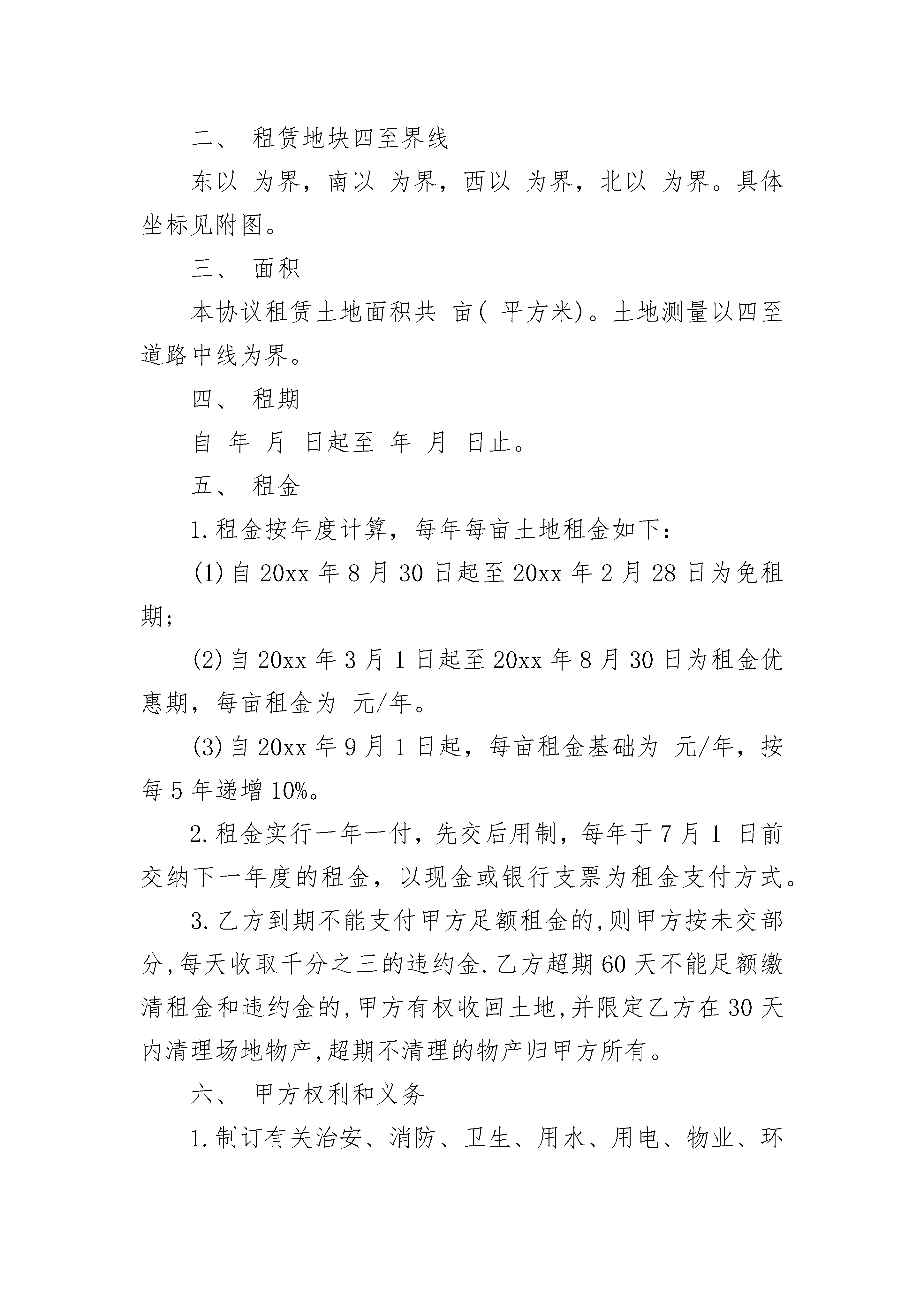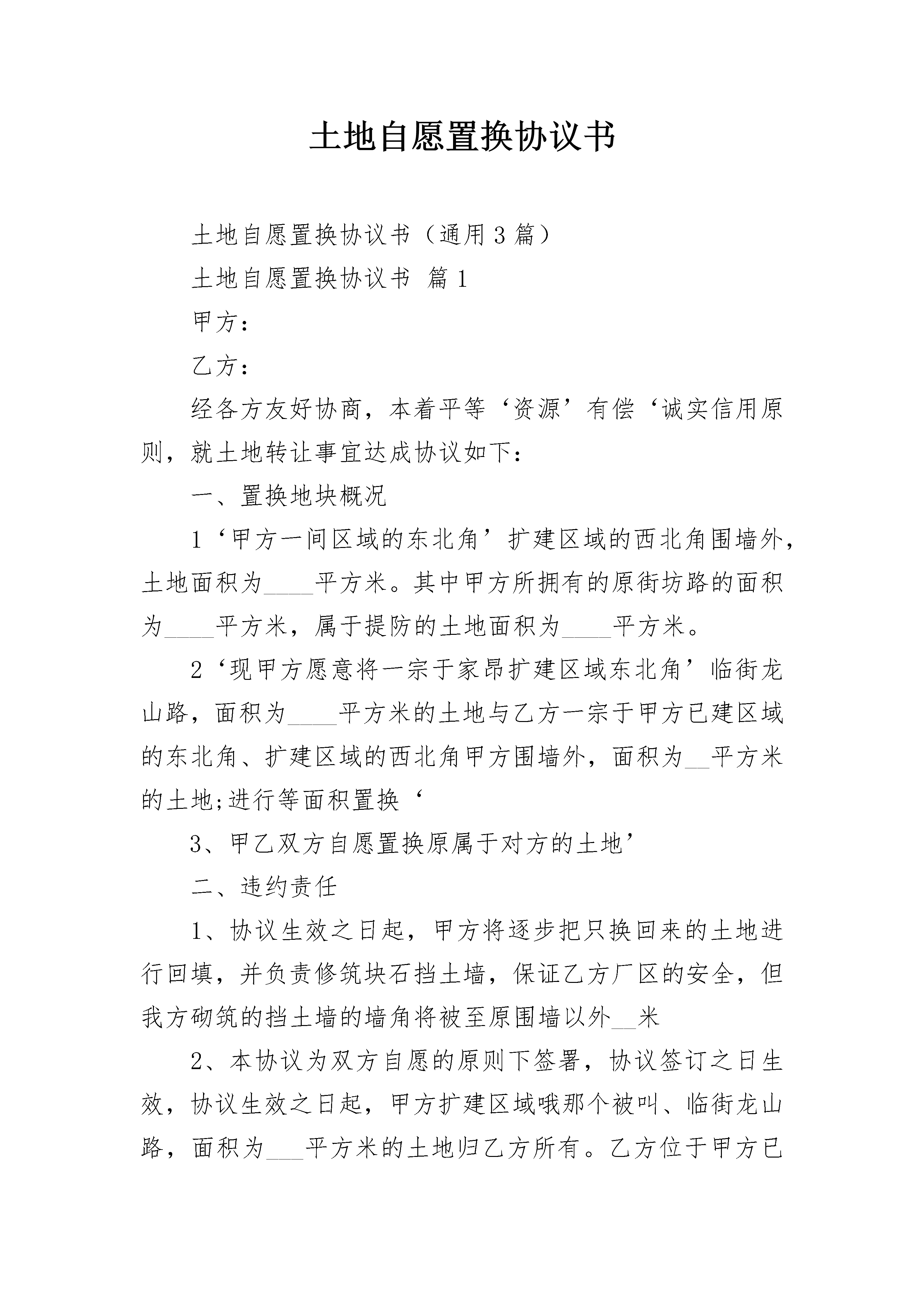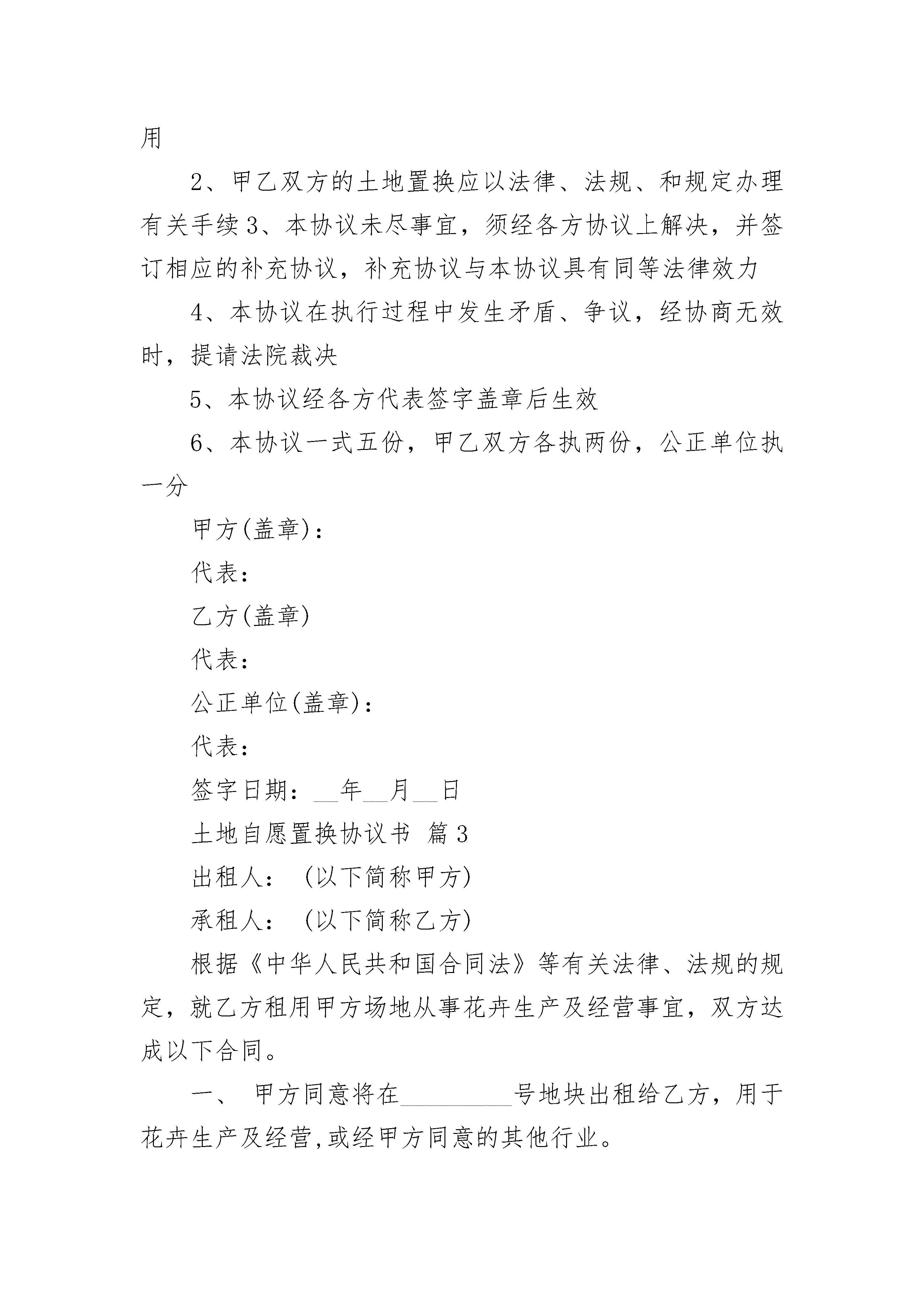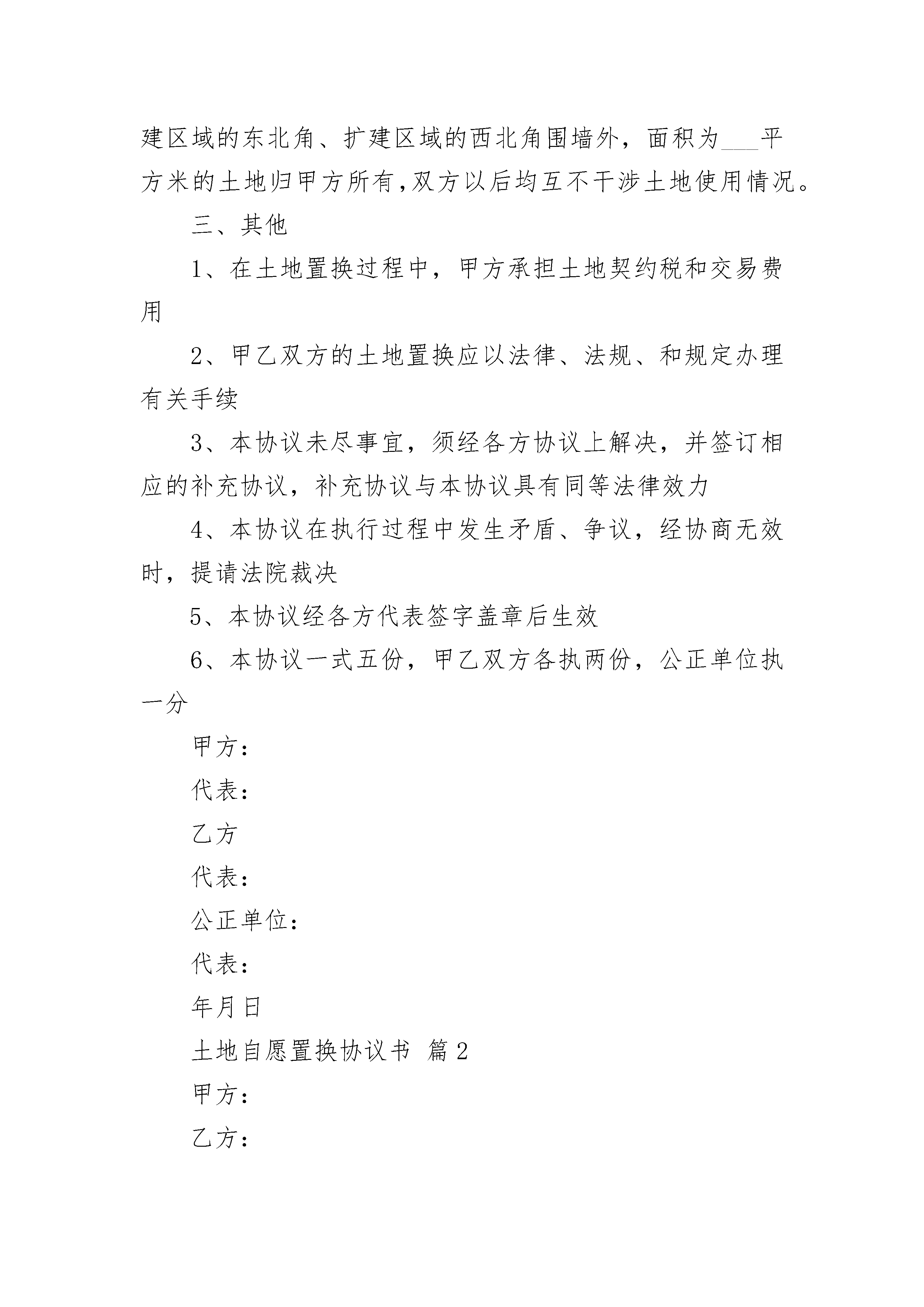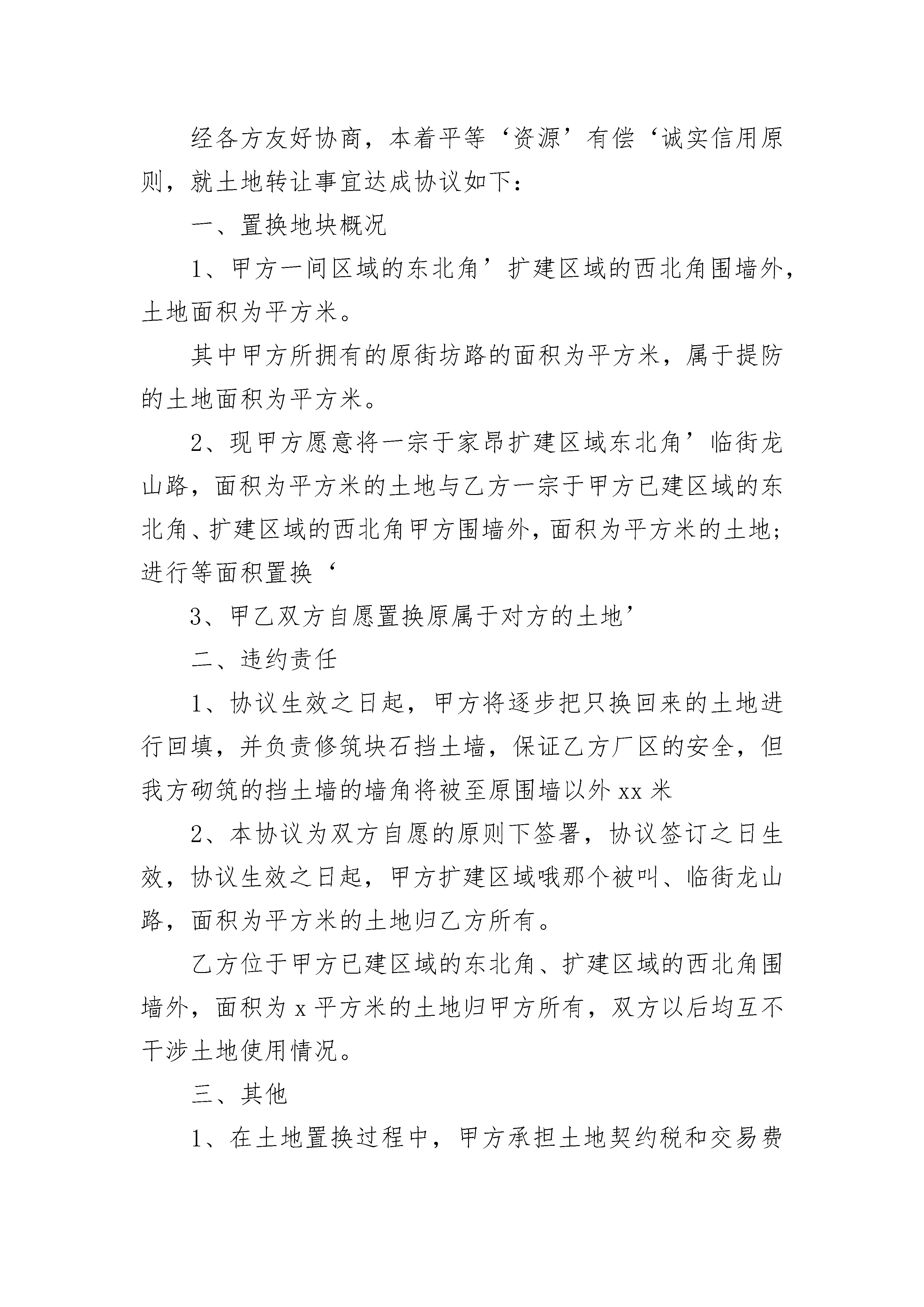 土地自愿置换协议书土地自愿置换协议书(通用3篇)土地自愿置换协议书篇1甲方:乙方:经各方友好协商,本着平等‘资源’有偿‘诚实信用原则,就土地转让事宜达成协议如下:一、置换地块概况1‘甲方一间区域的东北角’扩建区域的西北角围墙外,土地面积为____平方米。其中甲方所拥有的原街坊路的面积为____平方米,属于提防的土地面积为____平方米。2‘现甲方愿意将一宗于家昂扩建区域东北角’临街龙山路,面积为____平方米的土地与乙方一宗于甲方已建区域的东北角、扩建区域的西北角甲方围墙外,面积为__平方米的土地;进行等面积置换‘3、甲乙双方自愿置换原属于对方的土地’二、违约责任1、协议生效之日起,甲方将逐步把只换回来的土地进行回填,并负责修筑块石挡土墙,保证乙方厂区的安全,但我方砌筑的挡土墙的墙角将被至原围墙以外__米2、本协议为双方自愿的原则下签署,协议签订之日生效,协议生效之日起,甲方扩建区域哦那个被叫、临街龙山路,面积为___平方米的土地归乙方所有。乙方位于甲方已建区域的东北角、扩建区域的西北角围墙外,面积为___平方米的土地归甲方所有,双方以后均互不干涉土地使用情况。三、其他1、在土地置换过程中,甲方承担土地契约税和交易费用2、甲乙双方的土地置换应以法律、法规、和规定办理有关手续3、本协议未尽事宜,须经各方协议上解决,并签订相应的补充协议,补充协议与本协议具有同等法律效力4、本协议在执行过程中发生矛盾、争议,经协商无效时,提请法院裁决5、本协议经各方代表签字盖章后生效6、本协议一式五份,甲乙双方各执两份,公正单位执一分甲方:代表:乙方代表:公正单位:代表:年月日土地自愿置换协议书篇2甲方:乙方:经各方友好协商,本着平等‘资源’有偿‘诚实信用原则,就土地转让事宜达成协议如下:一、置换地块概况1、甲方一间区域的东北角’扩建区域的西北角围墙外,土地面积为平方米。其中甲方所拥有的原街坊路的面积为平方米,属于提防的土地面积为平方米。2、现甲方愿意将一宗于家昂扩建区域东北角’临街龙山路,面积为平方米的土地与乙方一宗于甲方已建区域的东北角、扩建区域的西北角甲方围墙外,面积为平方米的土地;进行等面积置换‘3、甲乙双方自愿置换原属于对方的土地’二、违约责任1、协议生效之日起,甲方将逐步把只换回来的土地进行回填,并负责修筑块石挡土墙,保证乙方厂区的安全,但我方砌筑的挡土墙的墙角将被至原围墙以外xx米2、本协议为双方自愿的原则下签署,协议签订之日生效,协议生效之日起,甲方扩建区域哦那个被叫、临街龙山路,面积为平方米的土地归乙方所有。乙方位于甲方已建区域的东北角、扩建区域的西北角围墙外,面积为x平方米的土地归甲方所有,双方以后均互不干涉土地使用情况。三、其他1、在土地置换过程中,甲方承担土地契约税和交易费用2、甲乙双方的土地置换应以法律、法规、和规定办理有关手续3、本协议未尽事宜,须经各方协议上解决,并签订相应的补充协议,补充协议与本协议具有同等法律效力4、本协议在执行过程中发生矛盾、争议,经协商无效时,提请法院裁决5、本协议经各方代表签字盖章后生效6、本协议一式五份,甲乙双方各执两份,公正单位执一分甲方(盖章):代表:乙方(盖章)代表:公正单位(盖章):代表:签字日期:__年__月__日土地自愿置换协议书篇3出租人:(以下简称甲方)承租人:(以下简称乙方)根据《中华人民共和国合同法》等有关法律、法规的规定,就乙方租用甲方场地从事花卉生产及经营事宜,双方达成以下合同。一、甲方同意将在_________号地块出租给乙方,用于花卉生产及经营,或经甲方同意的其他行业。二、租赁地块四至界线东以为界,南以为界,西以为界,北以为界。具体坐标见附图。三、面积本协议租赁土地面积共亩(平方米)。土地测量以四至道路中线为界。四、租期自年月日起至年月日止。五、租金1.租金按年度计算,每年每亩土地租金如下:(1)自20xx年8月30日起至20xx年2月28日为免租期;(2)自20xx年3月1日起至20xx年8月30日为租金优惠期,每亩租金为元/年。(3)自20xx年9月1日起,每亩租金基础为元/年,按每5年递增10%。2.租金实行一年一付,先交后用制,每年于7月1日前交纳下一年度的租金,以现金或银行支票为租金支付方式。3.乙方到期不能支付甲方足额租金的,则甲方按未交部分,每天收取千分之三的违约金.乙方超期60天不能足额缴清租金和违约金的,甲方有权收回土地,并限定乙方在30天内清理场地物产,超期不清理的物产归甲方所有。六、甲方权利和义务1.制订有关治安、消防、卫生、用水、用电、物业、环保、经营管理等内容的各项规章制度并负责监督实施。这些规章制度作为本合同的附件,双方共同遵守。2.协助各级行政管理机关对违反有关规定的乙方进行监督、教育、整顿,直至单方解除合同。3.按约定为乙方提供