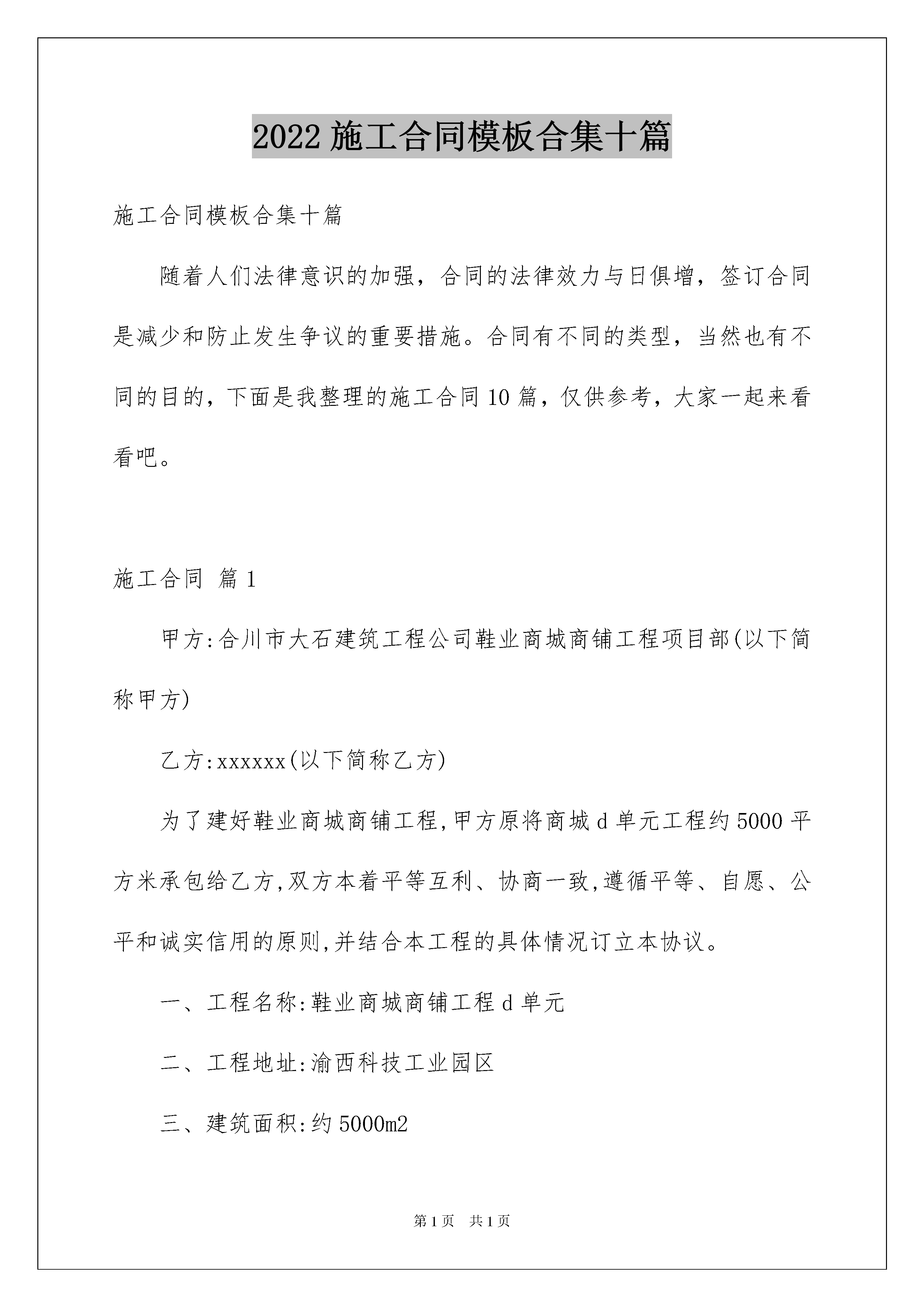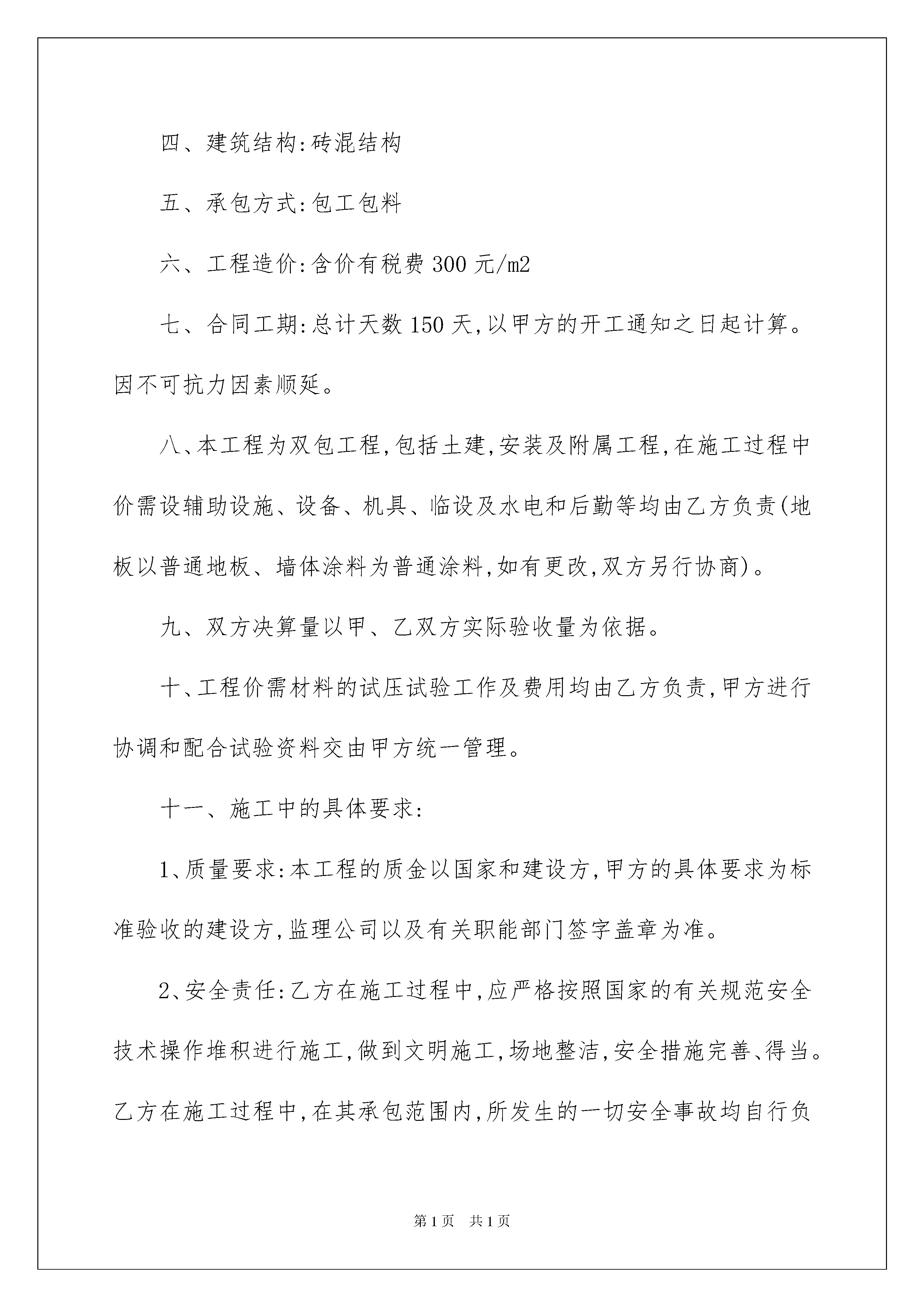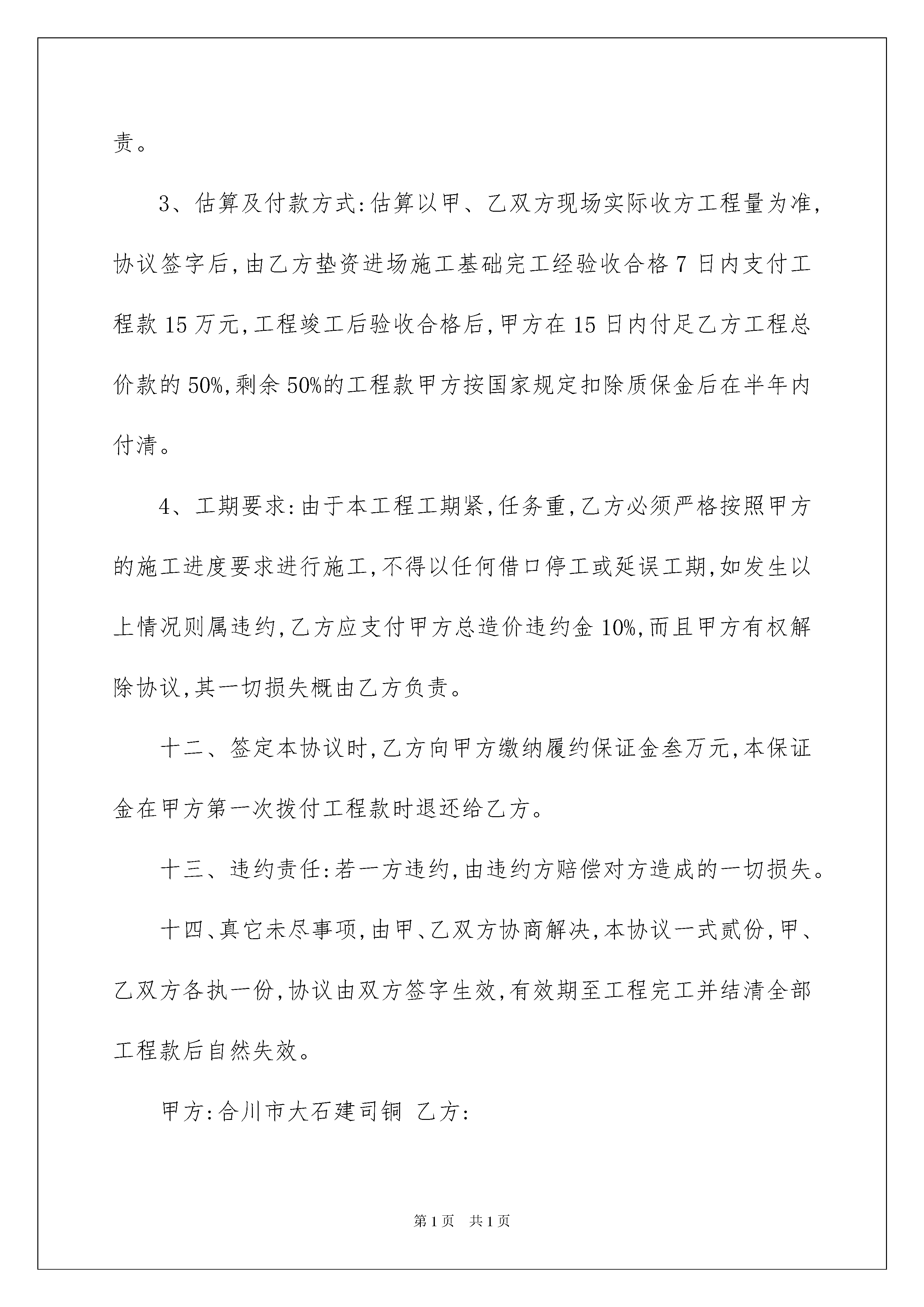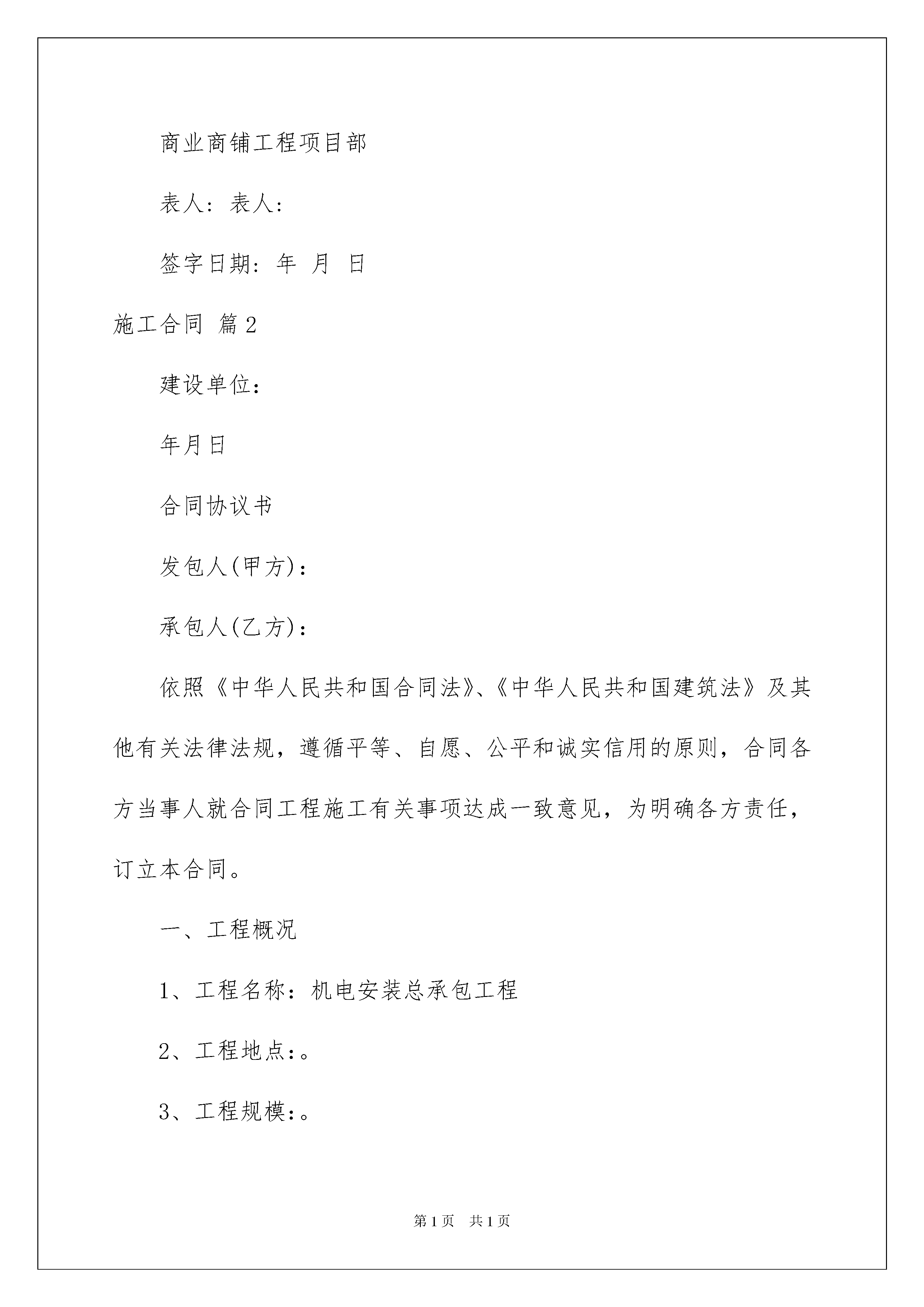 2022施工合同模板合集十篇施工合同模板合集十篇随着人们法律意识的加强,合同的法律效力与日俱增,签订合同是减少和防止发生争议的重要措施。合同有不同的类型,当然也有不同的目的,下面是我整理的施工合同10篇,仅供参考,大家一起来看看吧。施工合同篇1甲方:合川市大石建筑工程公司鞋业商城商铺工程项目部(以下简称甲方)乙方:xxxxxx(以下简称乙方)为了建好鞋业商城商铺工程,甲方原将商城d单元工程约5000平方米承包给乙方,双方本着平等互利、协商一致,遵循平等、自愿、公平和诚实信用的原则,并结合本工程的具体情况订立本协议。一、工程名称:鞋业商城商铺工程d单元二、工程地址:渝西科技工业园区三、建筑面积:约5000m2四、建筑结构:砖混结构五、承包方式:包工包料六、工程造价:含价有税费300元/m2七、合同工期:总计天数150天,以甲方的开工通知之日起计算。因不可抗力因素顺延。八、本工程为双包工程,包括土建,安装及附属工程,在施工过程中价需设辅助设施、设备、机具、临设及水电和后勤等均由乙方负责(地板以普通地板、墙体涂料为普通涂料,如有更改,双方另行协商)。九、双方决算量以甲、乙双方实际验收量为依据。十、工程价需材料的试压试验工作及费用均由乙方负责,甲方进行协调和配合试验资料交由甲方统一管理。十一、施工中的具体要求:1、质量要求:本工程的质金以国家和建设方,甲方的具体要求为标准验收的建设方,监理公司以及有关职能部门签字盖章为准。2、安全责任:乙方在施工过程中,应严格按照国家的有关规范安全技术操作堆积进行施工,做到文明施工,场地整洁,安全措施完善、得当。乙方在施工过程中,在其承包范围内,所发生的一切安全事故均自行负责。3、估算及付款方式:估算以甲、乙双方现场实际收方工程量为准,协议签字后,由乙方垫资进场施工基础完工经验收合格7日内支付工程款15万元,工程竣工后验收合格后,甲方在15日内付足乙方工程总价款的50%,剩余50%的工程款甲方按国家规定扣除质保金后在半年内付清。4、工期要求:由于本工程工期紧,任务重,乙方必须严格按照甲方的施工进度要求进行施工,不得以任何借口停工或延误工期,如发生以上情况则属违约,乙方应支付甲方总造价违约金10%,而且甲方有权解除协议,其一切损失概由乙方负责。十二、签定本协议时,乙方向甲方缴纳履约保证金叁万元,本保证金在甲方第一次拨付工程款时退还给乙方。十三、违约责任:若一方违约,由违约方赔偿对方造成的一切损失。十四、真它未尽事项,由甲、乙双方协商解决,本协议一式贰份,甲、乙双方各执一份,协议由双方签字生效,有效期至工程完工并结清全部工程款后自然失效。甲方:合川市大石建司铜乙方:商业商铺工程项目部表人:表人:签字日期:年月日施工合同篇2建设单位:年月日合同协议书发包人(甲方):承包人(乙方):依照《中华人民共和国合同法》、《中华人民共和国建筑法》及其他有关法律法规,遵循平等、自愿、公平和诚实信用的原则,合同各方当事人就合同工程施工有关事项达成一致意见,为明确各方责任,订立本合同。一、工程概况1、工程名称:机电安装总承包工程2、工程地点:。3、工程规模:。二、工程承包方式和范围1.承包方式:根据招投标文件、招标图纸、国家施工规范和验收标准的要求及其它有关资料,并结合施工现场环境状况,按工程量清单固定综合单价总价包干。包括但不限于包工包料、包质量、包机械、包管理费、包工期、包安全、包文明施工措施、包环境保护、包设备调试、包机电总承包工程管理、包与土建总承包配合管理、包措施费、包施工组织设计(各专项方案)中采取的技术措施、工艺方法等费用、包税金、包利润、包风险、包各种材料检测费及包完工后的场地清理与余渣、废弃物、余泥外运费用、包竣工验收合格、并综合考虑甲供材料设备采保与运输、装卸费用等一切风险因素。2.承包范围:招标文件、附件及甲方要求完成《电气、给排水、消防、通风空调专业工程》施工图所有内容,包括电气安装工程、给排水安装工程、通风空调安装工程、喷淋灭火系统、室内消防栓工程、火灾自动报警工程、气体灭火工程、安装工程总承包管理,安装工程各专业管线三維空间设计、留洞图设计及预留、预埋件等的协调管理工作,服从和配合协助土建总承包等项目管理.具体工作范围包括但不限于以下内容:2.1强电系统:2.1.1配电室低压柜系统图暂为方案图,从配电室低压柜出线的电缆及母线槽暂按方案图以单项工程计量报价,该部分按实结算。2.1.2自低压电房外墙开始,至所有动力配电箱(含消防动力配电箱、双电源切换箱)、照明配电箱(含应急照明配电箱)安装、电缆敷设均由机电施工单位施工。包括所有提供给其它机电系统