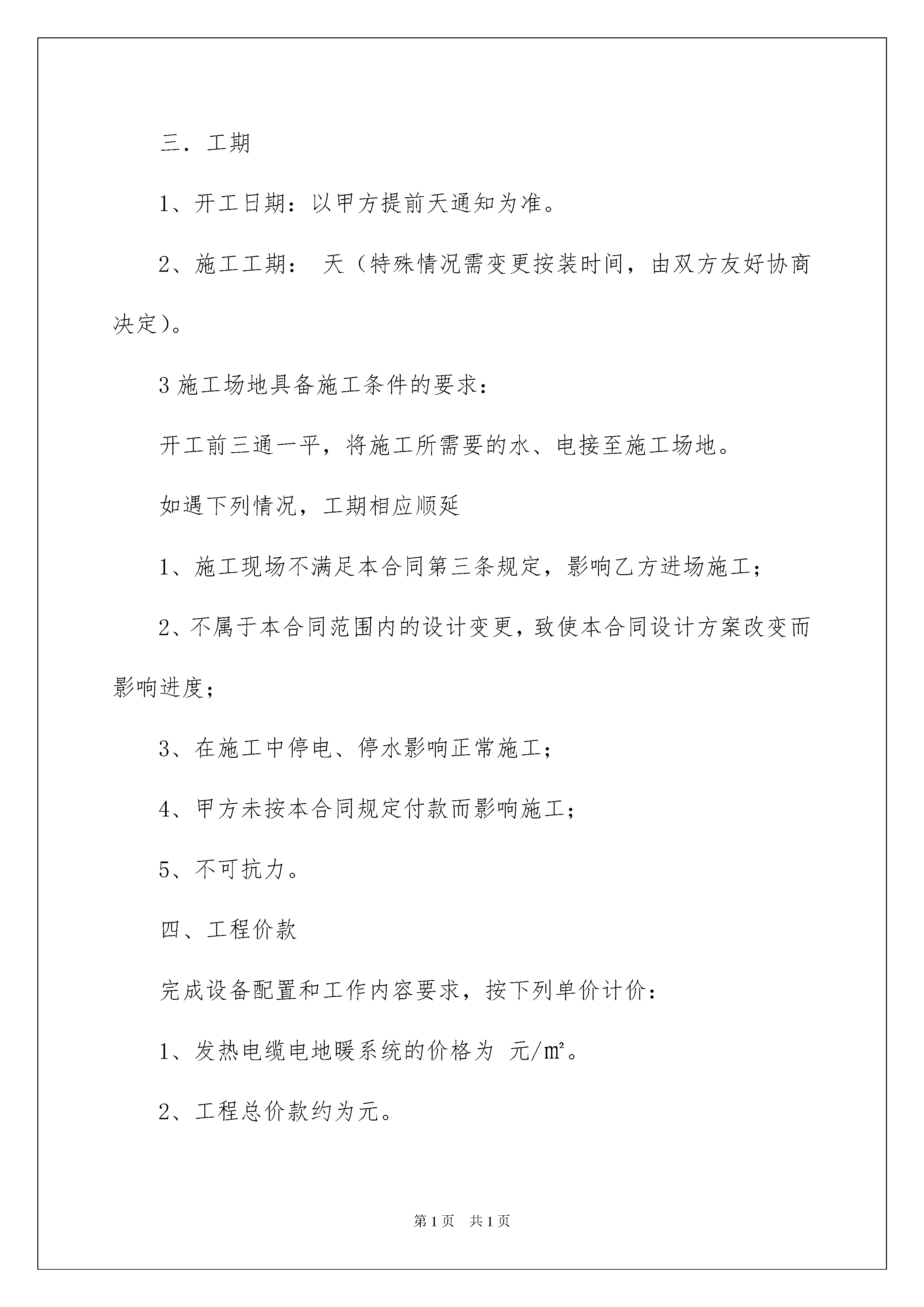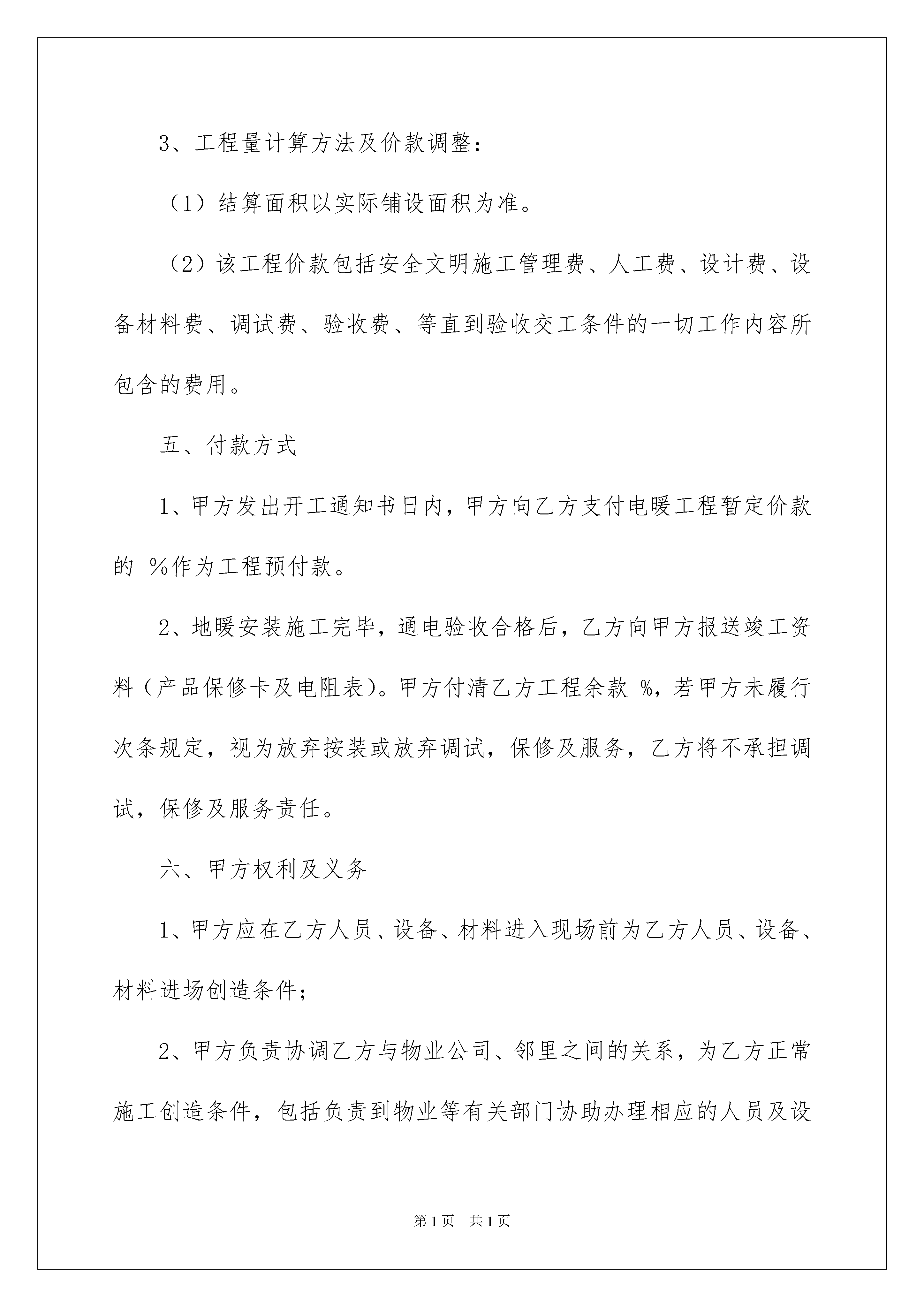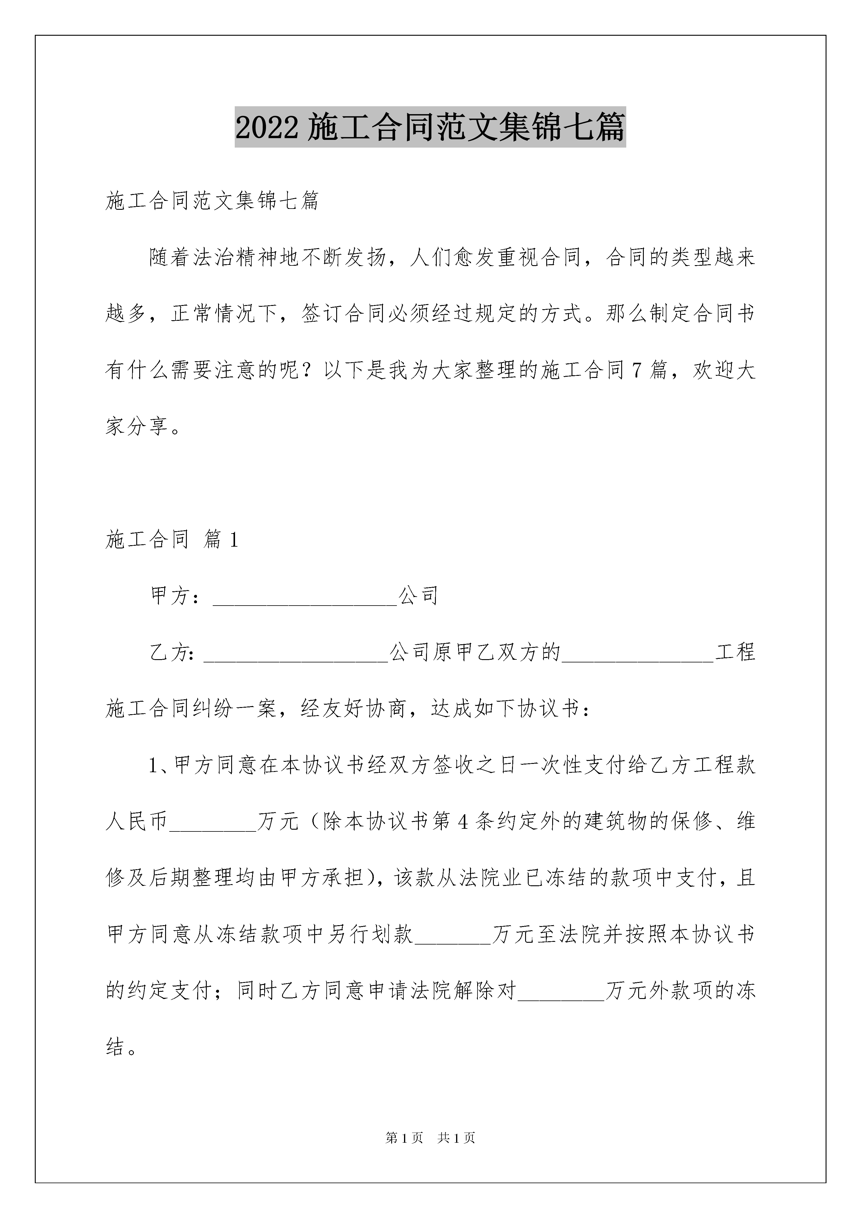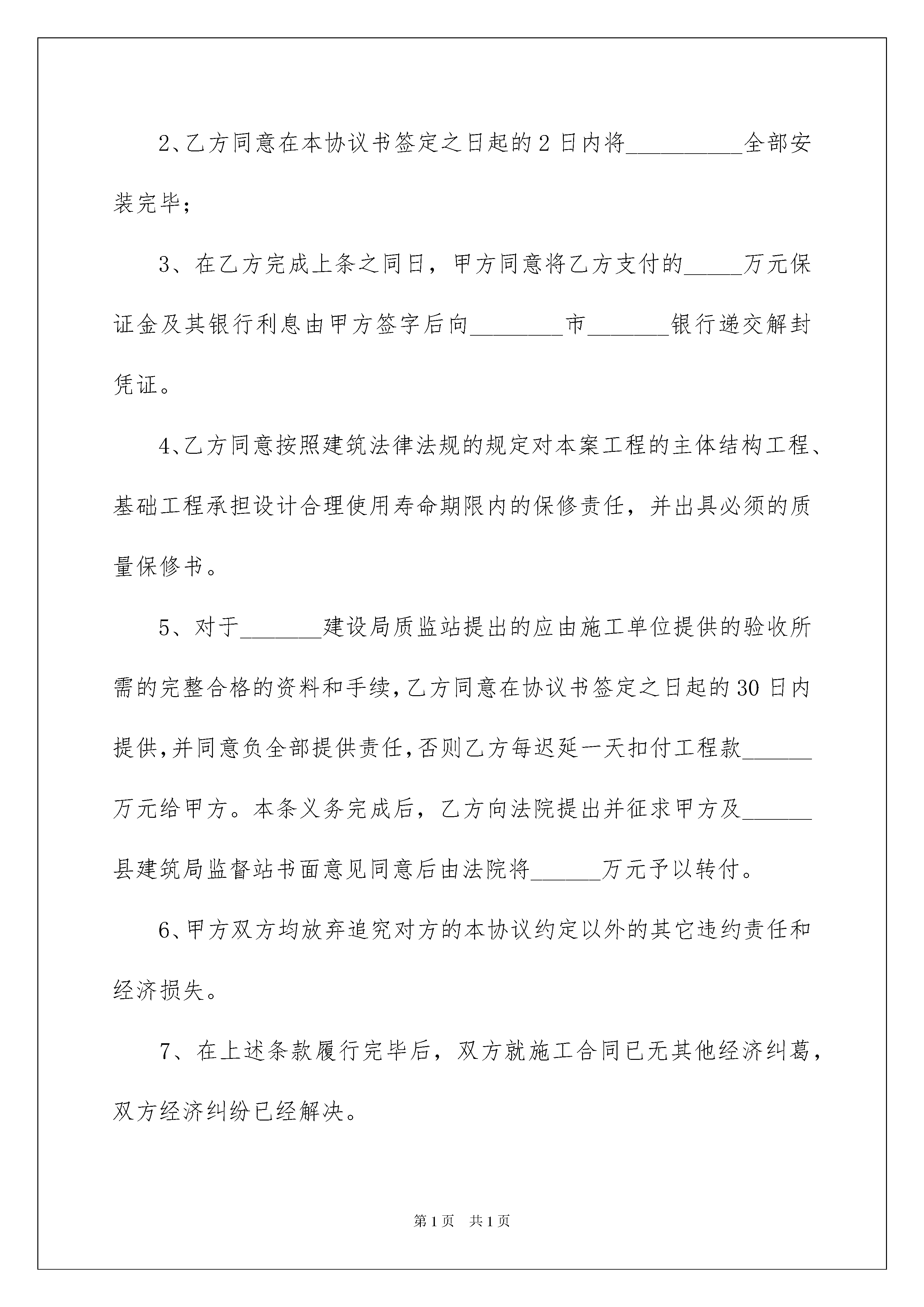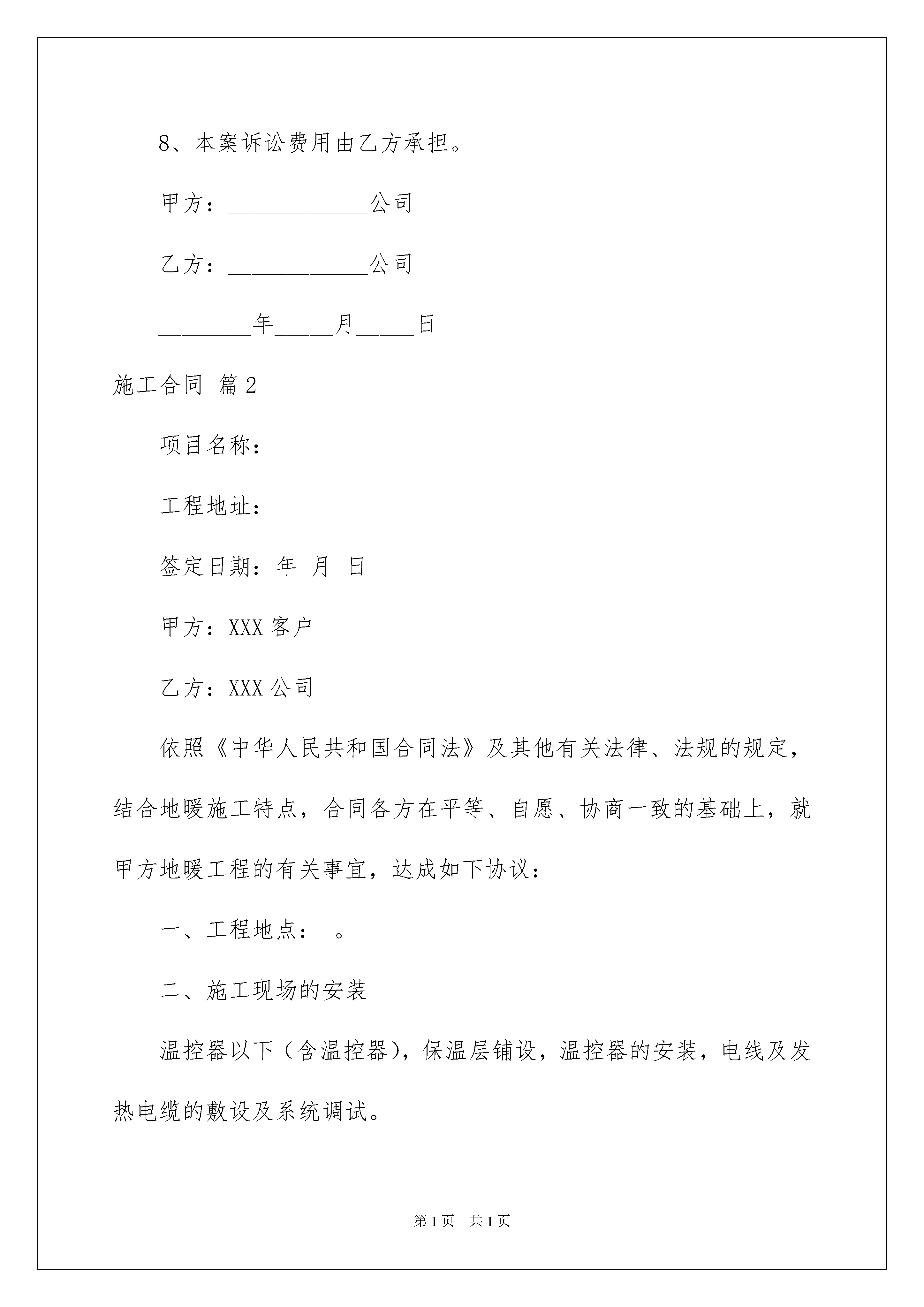 2022施工合同范文集锦七篇施工合同范文集锦七篇随着法治精神地不断发扬,人们愈发重视合同,合同的类型越来越多,正常情况下,签订合同必须经过规定的方式。那么制定合同书有什么需要注意的呢?以下是我为大家整理的施工合同7篇,欢迎大家分享。施工合同篇1甲方:_________________公司乙方:_________________公司原甲乙双方的______________工程施工合同纠纷一案,经友好协商,达成如下协议书:1、甲方同意在本协议书经双方签收之日一次性支付给乙方工程款人民币________万元(除本协议书第4条约定外的建筑物的保修、维修及后期整理均由甲方承担),该款从法院业已冻结的款项中支付,且甲方同意从冻结款项中另行划款_______万元至法院并按照本协议书的约定支付;同时乙方同意申请法院解除对________万元外款项的冻结。2、乙方同意在本协议书签定之日起的2日内将__________全部安装完毕;3、在乙方完成上条之同日,甲方同意将乙方支付的_____万元保证金及其银行利息由甲方签字后向________市_______银行递交解封凭证。4、乙方同意按照建筑法律法规的规定对本案工程的主体结构工程、基础工程承担设计合理使用寿命期限内的保修责任,并出具必须的质量保修书。5、对于_______建设局质监站提出的应由施工单位提供的验收所需的完整合格的资料和手续,乙方同意在协议书签定之日起的30日内提供,并同意负全部提供责任,否则乙方每迟延一天扣付工程款______万元给甲方。本条义务完成后,乙方向法院提出并征求甲方及______县建筑局监督站书面意见同意后由法院将______万元予以转付。6、甲方双方均放弃追究对方的本协议约定以外的其它违约责任和经济损失。7、在上述条款履行完毕后,双方就施工合同已无其他经济纠葛,双方经济纠纷已经解决。8、本案诉讼费用由乙方承担。甲方:____________公司乙方:____________公司________年_____月_____日施工合同篇2项目名称:工程地址:签定日期:年月日甲方:XXX客户乙方:XXX公司依照《中华人民共和国合同法》及其他有关法律、法规的规定,结合地暖施工特点,合同各方在平等、自愿、协商一致的基础上,就甲方地暖工程的有关事宜,达成如下协议:一、工程地点:。二、施工现场的安装温控器以下(含温控器),保温层铺设,温控器的安装,电线及发热电缆的敷设及系统调试。三.工期1、开工日期:以甲方提前天通知为准。2、施工工期:天(特殊情况需变更按装时间,由双方友好协商决定)。3施工场地具备施工条件的要求:开工前三通一平,将施工所需要的水、电接至施工场地。如遇下列情况,工期相应顺延1、施工现场不满足本合同第三条规定,影响乙方进场施工;2、不属于本合同范围内的设计变更,致使本合同设计方案改变而影响进度;3、在施工中停电、停水影响正常施工;4、甲方未按本合同规定付款而影响施工;5、不可抗力。四、工程价款完成设备配置和工作内容要求,按下列单价计价:1、发热电缆电地暖系统的价格为元/㎡。2、工程总价款约为元。3、工程量计算方法及价款调整:(1)结算面积以实际铺设面积为准。(2)该工程价款包括安全文明施工管理费、人工费、设计费、设备材料费、调试费、验收费、等直到验收交工条件的一切工作内容所包含的费用。五、付款方式1、甲方发出开工通知书日内,甲方向乙方支付电暖工程暂定价款的%作为工程预付款。2、地暖安装施工完毕,通电验收合格后,乙方向甲方报送竣工资料(产品保修卡及电阻表)。甲方付清乙方工程余款%,若甲方未履行次条规定,视为放弃按装或放弃调试,保修及服务,乙方将不承担调试,保修及服务责任。六、甲方权利及义务1、甲方应在乙方人员、设备、材料进入现场前为乙方人员、设备、材料进场创造条件;2、甲方负责协调乙方与物业公司、邻里之间的关系,为乙方正常施工创造条件,包括负责到物业等有关部门协助办理相应的人员及设备出入证、开工及验收审批手续等;3、甲方应协助乙方与装修方进行现场技术交底;4、乙方提供的设备、材料及工艺与合同规定不符的,甲方有权利要求更换、重做、减少价款或赔偿损失;5、甲方有权要求乙方派人参加地板采暖系统第一年使用的运行调试,但应提前3天以上通知乙方。七、乙方权利及义务1、乙方应在施工进场前向甲方出具完整工程设计资料,并经甲方书面认可;2、乙方在施工中应严格执行安全施工操作规范、防火规定、施工及质量标准;3、乙方在接到甲方地板采暖系统第一年投入使用的运行调试书面通知后,应按时派人参加系统运行调试;八、工程质量本工程质量必须达到国家相关标准