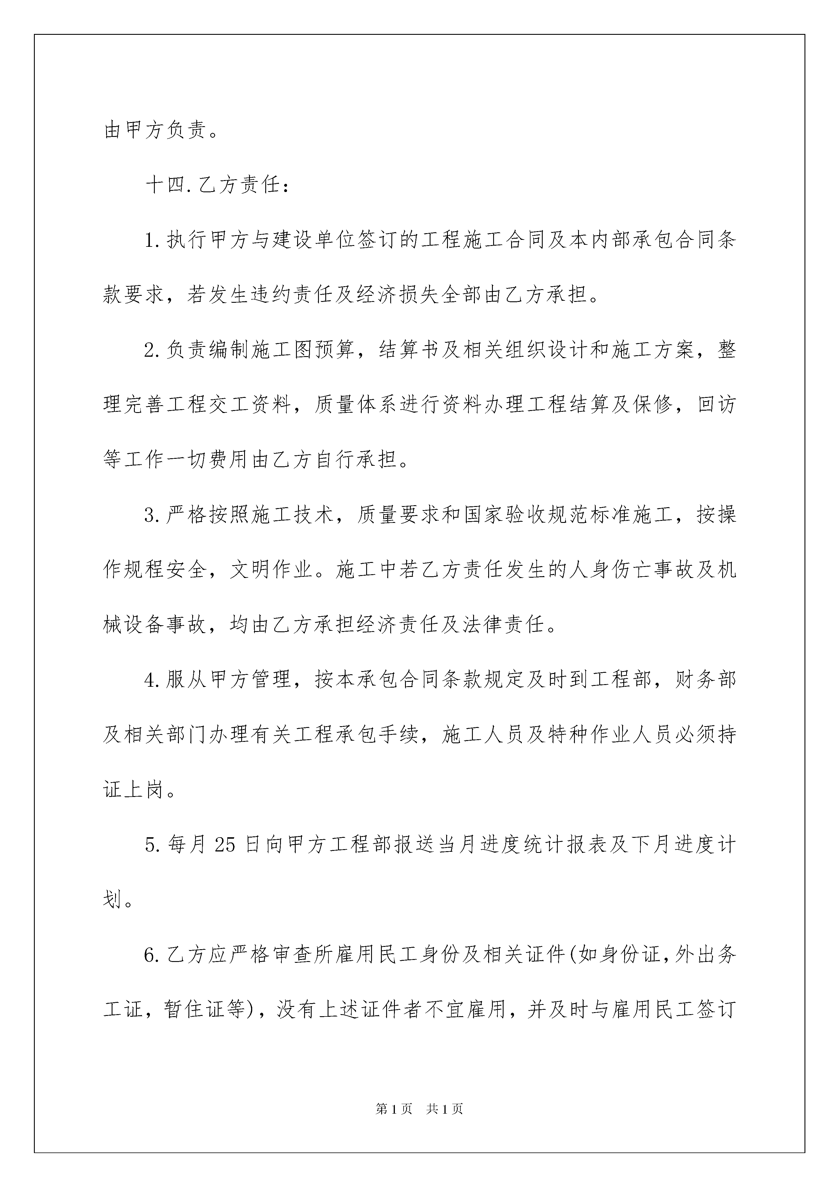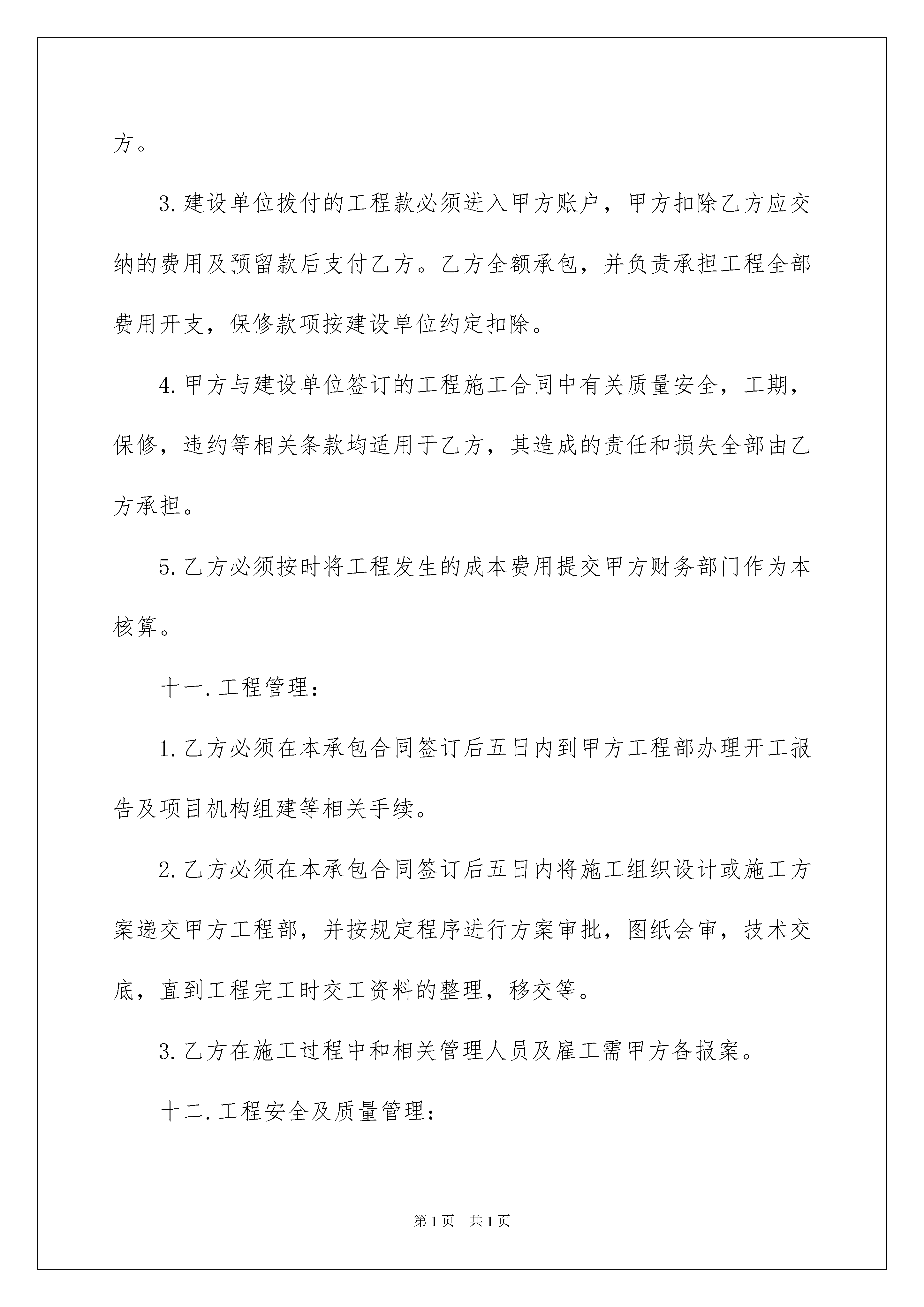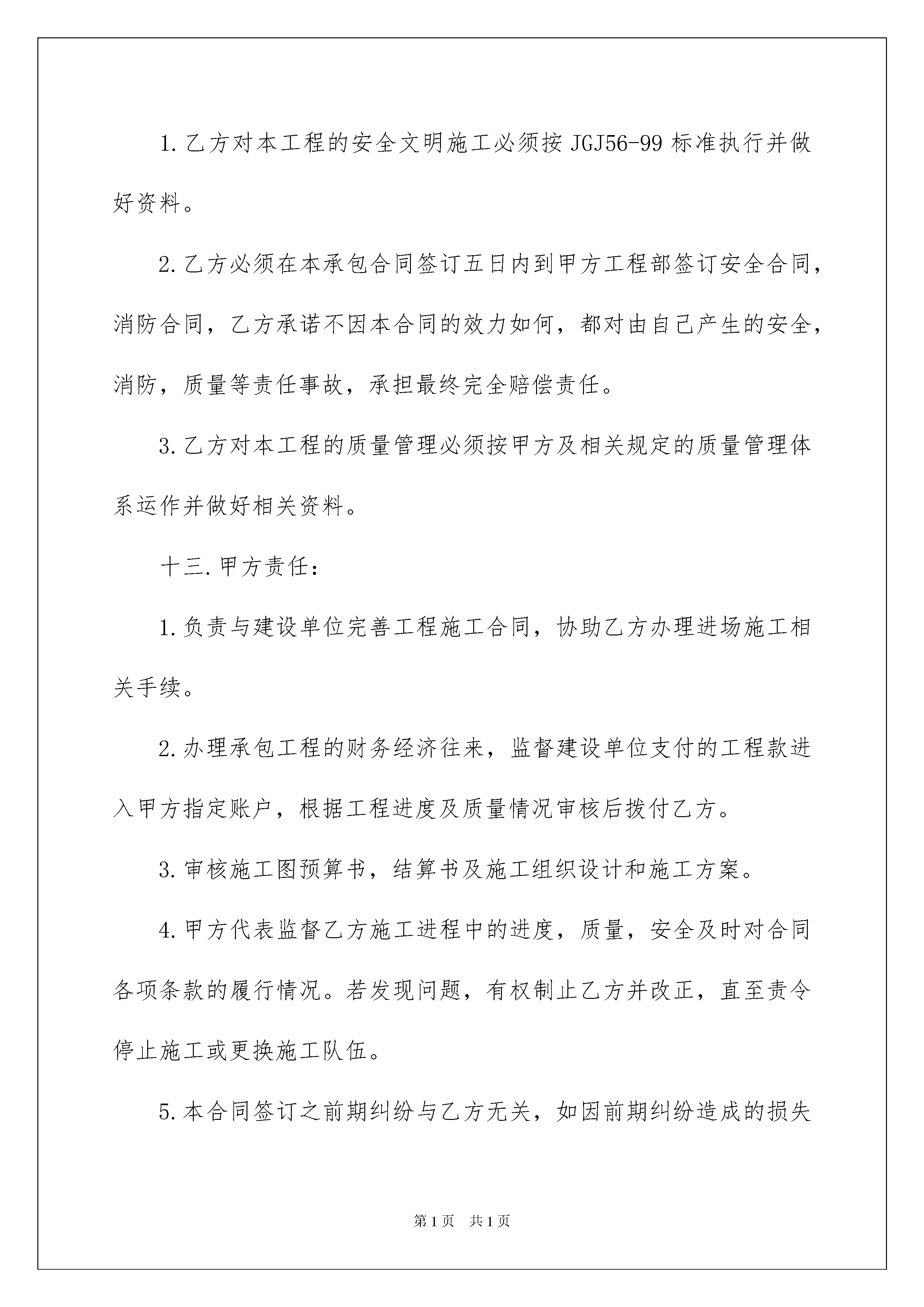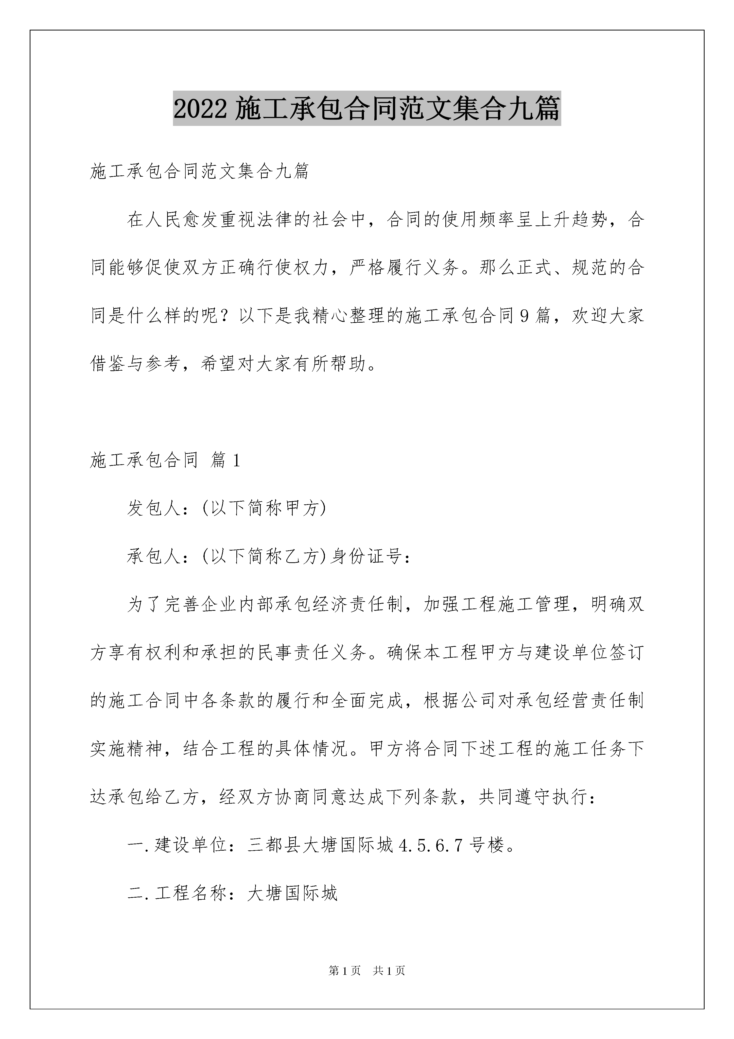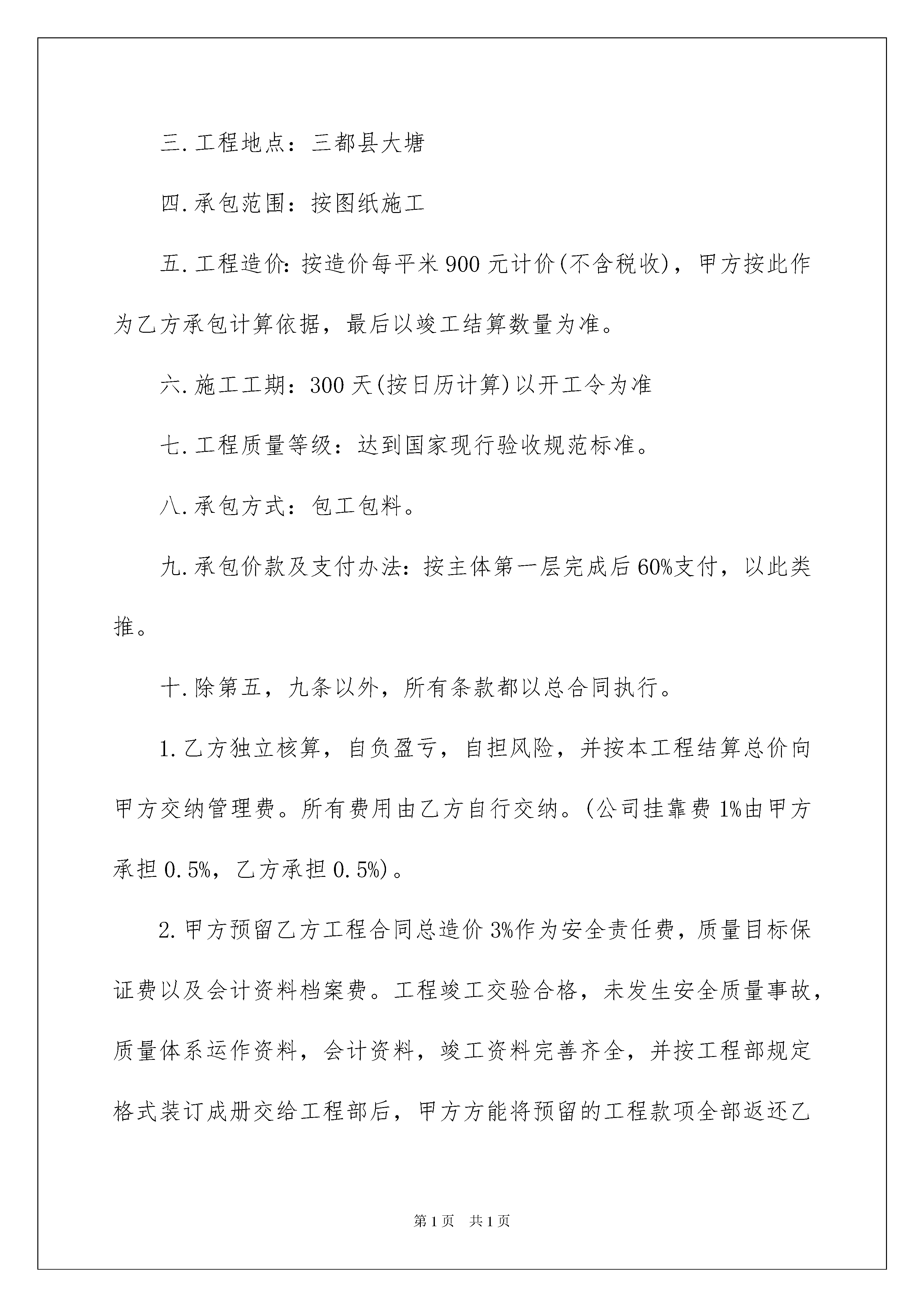 2022施工承包合同范文集合九篇施工承包合同范文集合九篇在人民愈发重视法律的社会中,合同的使用频率呈上升趋势,合同能够促使双方正确行使权力,严格履行义务。那么正式、规范的合同是什么样的呢?以下是我精心整理的施工承包合同9篇,欢迎大家借鉴与参考,希望对大家有所帮助。施工承包合同篇1发包人:(以下简称甲方)承包人:(以下简称乙方)身份证号:为了完善企业内部承包经济责任制,加强工程施工管理,明确双方享有权利和承担的民事责任义务。确保本工程甲方与建设单位签订的施工合同中各条款的履行和全面完成,根据公司对承包经营责任制实施精神,结合工程的具体情况。甲方将合同下述工程的施工任务下达承包给乙方,经双方协商同意达成下列条款,共同遵守执行:一.建设单位:三都县大塘国际城4.5.6.7号楼。二.工程名称:大塘国际城三.工程地点:三都县大塘四.承包范围:按图纸施工五.工程造价:按造价每平米900元计价(不含税收),甲方按此作为乙方承包计算依据,最后以竣工结算数量为准。六.施工工期:300天(按日历计算)以开工令为准七.工程质量等级:达到国家现行验收规范标准。八.承包方式:包工包料。九.承包价款及支付办法:按主体第一层完成后60%支付,以此类推。十.除第五,九条以外,所有条款都以总合同执行。1.乙方独立核算,自负盈亏,自担风险,并按本工程结算总价向甲方交纳管理费。所有费用由乙方自行交纳。(公司挂靠费1%由甲方承担0.5%,乙方承担0.5%)。2.甲方预留乙方工程合同总造价3%作为安全责任费,质量目标保证费以及会计资料档案费。工程竣工交验合格,未发生安全质量事故,质量体系运作资料,会计资料,竣工资料完善齐全,并按工程部规定格式装订成册交给工程部后,甲方方能将预留的工程款项全部返还乙方。3.建设单位拨付的工程款必须进入甲方账户,甲方扣除乙方应交纳的费用及预留款后支付乙方。乙方全额承包,并负责承担工程全部费用开支,保修款项按建设单位约定扣除。4.甲方与建设单位签订的工程施工合同中有关质量安全,工期,保修,违约等相关条款均适用于乙方,其造成的责任和损失全部由乙方承担。5.乙方必须按时将工程发生的成本费用提交甲方财务部门作为本核算。十一.工程管理:1.乙方必须在本承包合同签订后五日内到甲方工程部办理开工报告及项目机构组建等相关手续。2.乙方必须在本承包合同签订后五日内将施工组织设计或施工方案递交甲方工程部,并按规定程序进行方案审批,图纸会审,技术交底,直到工程完工时交工资料的整理,移交等。3.乙方在施工过程中和相关管理人员及雇工需甲方备报案。十二.工程安全及质量管理:1.乙方对本工程的安全文明施工必须按JGJ56-99标准执行并做好资料。2.乙方必须在本承包合同签订五日内到甲方工程部签订安全合同,消防合同,乙方承诺不因本合同的效力如何,都对由自己产生的安全,消防,质量等责任事故,承担最终完全赔偿责任。3.乙方对本工程的质量管理必须按甲方及相关规定的质量管理体系运作并做好相关资料。十三.甲方责任:1.负责与建设单位完善工程施工合同,协助乙方办理进场施工相关手续。2.办理承包工程的财务经济往来,监督建设单位支付的工程款进入甲方指定账户,根据工程进度及质量情况审核后拨付乙方。3.审核施工图预算书,结算书及施工组织设计和施工方案。4.甲方代表监督乙方施工进程中的进度,质量,安全及时对合同各项条款的履行情况。若发现问题,有权制止乙方并改正,直至责令停止施工或更换施工队伍。5.本合同签订之前期纠纷与乙方无关,如因前期纠纷造成的损失由甲方负责。十四.乙方责任:1.执行甲方与建设单位签订的工程施工合同及本内部承包合同条款要求,若发生违约责任及经济损失全部由乙方承担。2.负责编制施工图预算,结算书及相关组织设计和施工方案,整理完善工程交工资料,质量体系进行资料办理工程结算及保修,回访等工作一切费用由乙方自行承担。3.严格按照施工技术,质量要求和国家验收规范标准施工,按操作规程安全,文明作业。施工中若乙方责任发生的人身伤亡事故及机械设备事故,均由乙方承担经济责任及法律责任。4.服从甲方管理,按本承包合同条款规定及时到工程部,财务部及相关部门办理有关工程承包手续,施工人员及特种作业人员必须持证上岗。5.每月25日向甲方工程部报送当月进度统计报表及下月进度计划。6.乙方应严格审查所雇用民工身份及相关证件(如身份证,外出务工证,暂住证等),没有上述证件者不宜雇用,并及时与雇用民工签订劳动合同,并送劳动鉴定部门鉴定后将合同书及时向公司相关部门备案。否则由此引起的一切责任后果由甲方承担。7.乙方应及时支付所雇民工工资,并且保证每月按时
