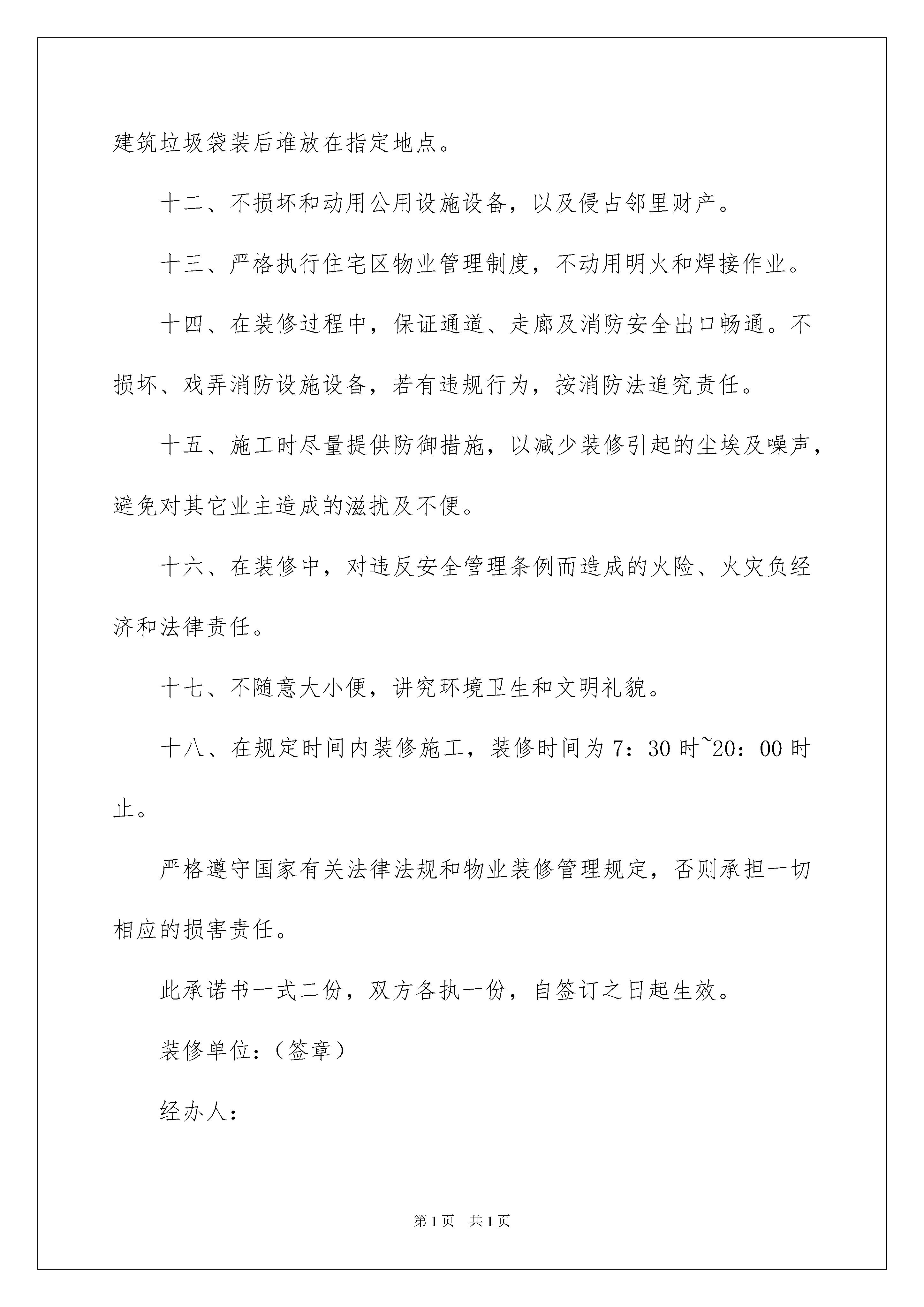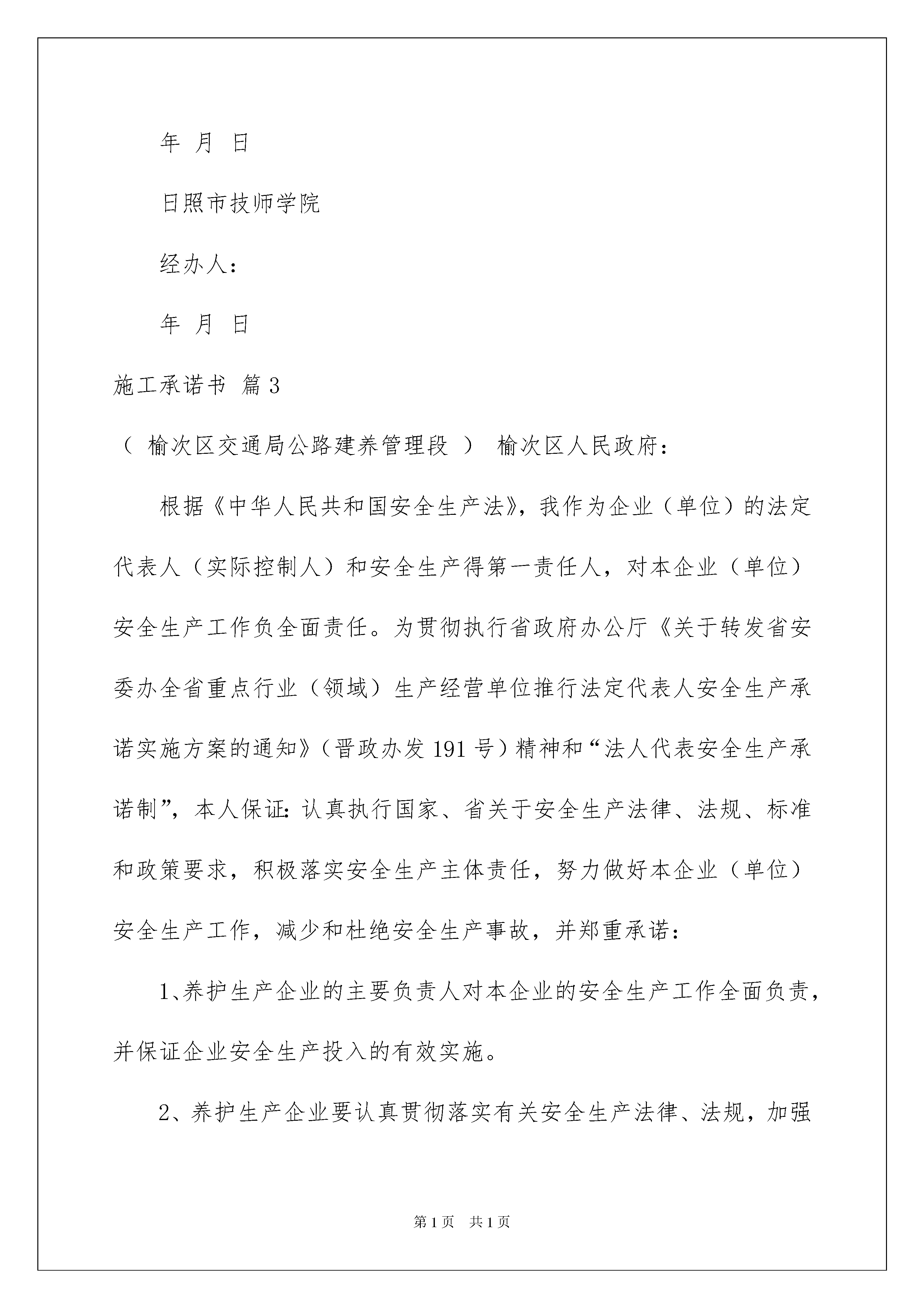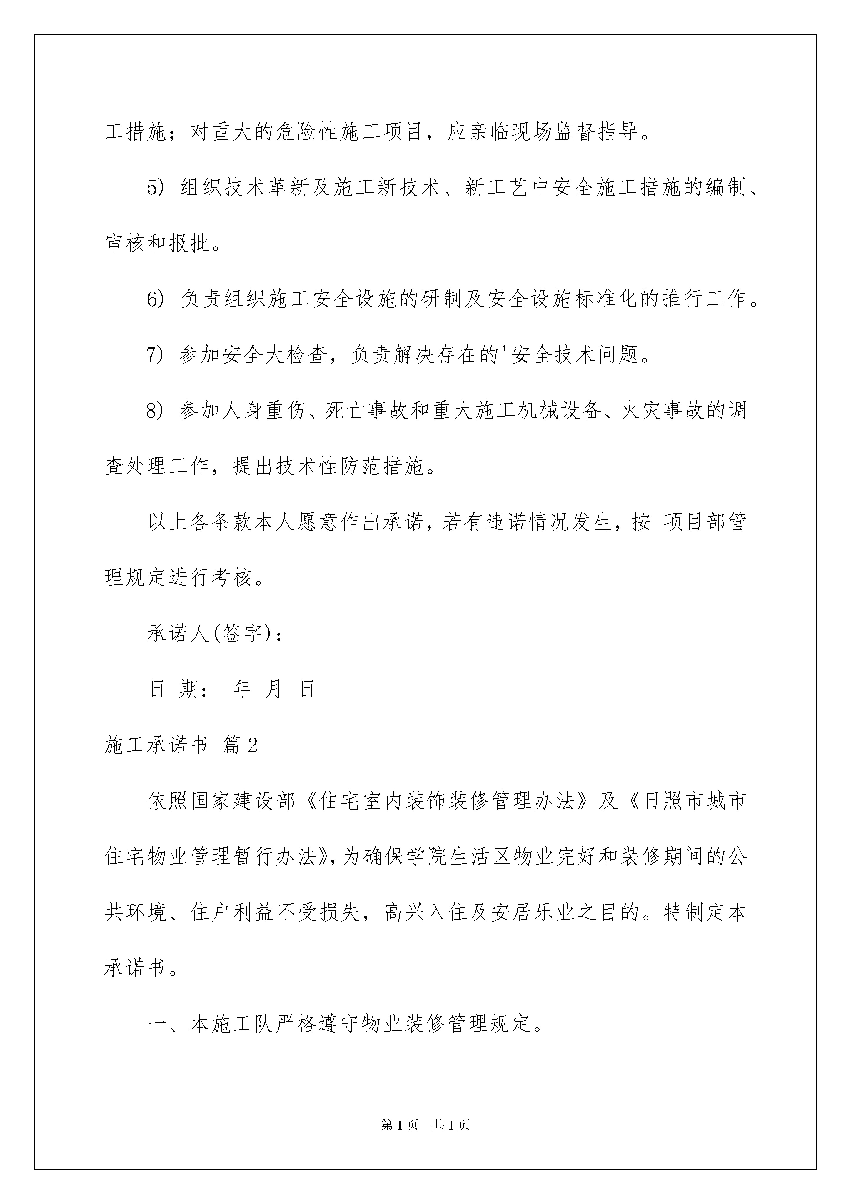 2022施工承诺书四篇施工承诺书四篇在日新月异的现代社会中,承诺书的使用频率越来越高,承诺书由标题、启语、正文、结语、署名、日期六部分组成。怎么写承诺书才能避免踩雷呢?下面是我精心整理的施工承诺书4篇,仅供参考,大家一起来看看吧。施工承诺书篇1项目部:兹有处职工,担任本工程项目总工职务,为确保工程能安全、优质、高效、按期完成,特向项目部做出以下承诺:1)对项目部安全技术和环境保护技术工作负领导责任。2)组织编制项目部年度安全技术措施计划。3)组织安全工作规程、规定的学习与考试,负责组织安全技术教育工作。4)负责组织编制项目管理实施规划中的安全文明施工措施和环境保护措施,负责组织编制和审批程序中规定的重大施工项目安全施工措施;对重大的危险性施工项目,应亲临现场监督指导。5)组织技术革新及施工新技术、新工艺中安全施工措施的编制、审核和报批。6)负责组织施工安全设施的研制及安全设施标准化的推行工作。7)参加安全大检查,负责解决存在的'安全技术问题。8)参加人身重伤、死亡事故和重大施工机械设备、火灾事故的调查处理工作,提出技术性防范措施。以上各条款本人愿意作出承诺,若有违诺情况发生,按项目部管理规定进行考核。承诺人(签字):日期:年月日施工承诺书篇2依照国家建设部《住宅室内装饰装修管理办法》及《日照市城市住宅物业管理暂行办法》,为确保学院生活区物业完好和装修期间的公共环境、住户利益不受损失,高兴入住及安居乐业之目的。特制定本承诺书。一、本施工队严格遵守物业装修管理规定。二、装修必须遵守按图施工的原则,严格按照技术质量标准施工,不偷工减料,所用的材料不以次充好,不弄虚作假,不野蛮施工,确保装修工程质量。三、不擅自改变房屋的结构及公共管道走向,不变更原设计用途。四、对房屋的内外承重墙、非承重墙、梁、柱、顶及阳台不凿、不拆。不迁拆、更改公用设施位置或改装任何排水及污水管道、电信、智能盒端口、有线电视接口等。五、房屋外立面上不擅自安装晒衣架、花架、雨棚等有损观瞻的设施设备。屋外不安装卫星接受器,不擅自安装太阳能热水器。六、不改变外立面的颜色、形状及户门、窗。七、内置式防盗栅栏按物管处统一规格安装。八、所有装修工程只限在户内进行,不在楼道等公共部位搅拌泥沙,从事装修作业。九、不往公共管道(屋内下水道)倾倒垃圾、泥沙、易燃易爆、有毒和有害物质。十、不在园区内游荡、喧哗、酗酒、。十一、每日清理户内建筑废料,以保持清洁并减少火灾可能性,建筑垃圾袋装后堆放在指定地点。十二、不损坏和动用公用设施设备,以及侵占邻里财产。十三、严格执行住宅区物业管理制度,不动用明火和焊接作业。十四、在装修过程中,保证通道、走廊及消防安全出口畅通。不损坏、戏弄消防设施设备,若有违规行为,按消防法追究责任。十五、施工时尽量提供防御措施,以减少装修引起的尘埃及噪声,避免对其它业主造成的滋扰及不便。十六、在装修中,对违反安全管理条例而造成的火险、火灾负经济和法律责任。十七、不随意大小便,讲究环境卫生和文明礼貌。十八、在规定时间内装修施工,装修时间为7:30时~20:00时止。严格遵守国家有关法律法规和物业装修管理规定,否则承担一切相应的损害责任。此承诺书一式二份,双方各执一份,自签订之日起生效。装修单位:(签章)经办人:年月日日照市技师学院经办人:年月日施工承诺书篇3(榆次区交通局公路建养管理段)榆次区人民政府:根据《中华人民共和国安全生产法》,我作为企业(单位)的法定代表人(实际控制人)和安全生产得第一责任人,对本企业(单位)安全生产工作负全面责任。为贯彻执行省政府办公厅《关于转发省安委办全省重点行业(领域)生产经营单位推行法定代表人安全生产承诺实施方案的通知》(晋政办发191号)精神和“法人代表安全生产承诺制”,本人保证:认真执行国家、省关于安全生产法律、法规、标准和政策要求,积极落实安全生产主体责任,努力做好本企业(单位)安全生产工作,减少和杜绝安全生产事故,并郑重承诺:1、养护生产企业的主要负责人对本企业的安全生产工作全面负责,并保证企业安全生产投入的有效实施。2、养护生产企业要认真贯彻落实有关安全生产法律、法规,加强安全生产管理,建立健全安全生产责任的制度,完善安全生产条件,确保安全生产。3、养护生产企业要坚持“管生产必须管安全”的原则,在安排生产经营活动的同时,布置安全生产工作,并落实人员和责任。4、生产作业人员必须经安全培训教育,熟知本工种的各项安全技术操作规程,经考试合格后方准上岗操作;从事特殊工种作业人员,须经市安监局专业培训,获得合格证书后,方准持证上岗。5、严格执行安全生产目标管理,同时应采取多种形式,加
