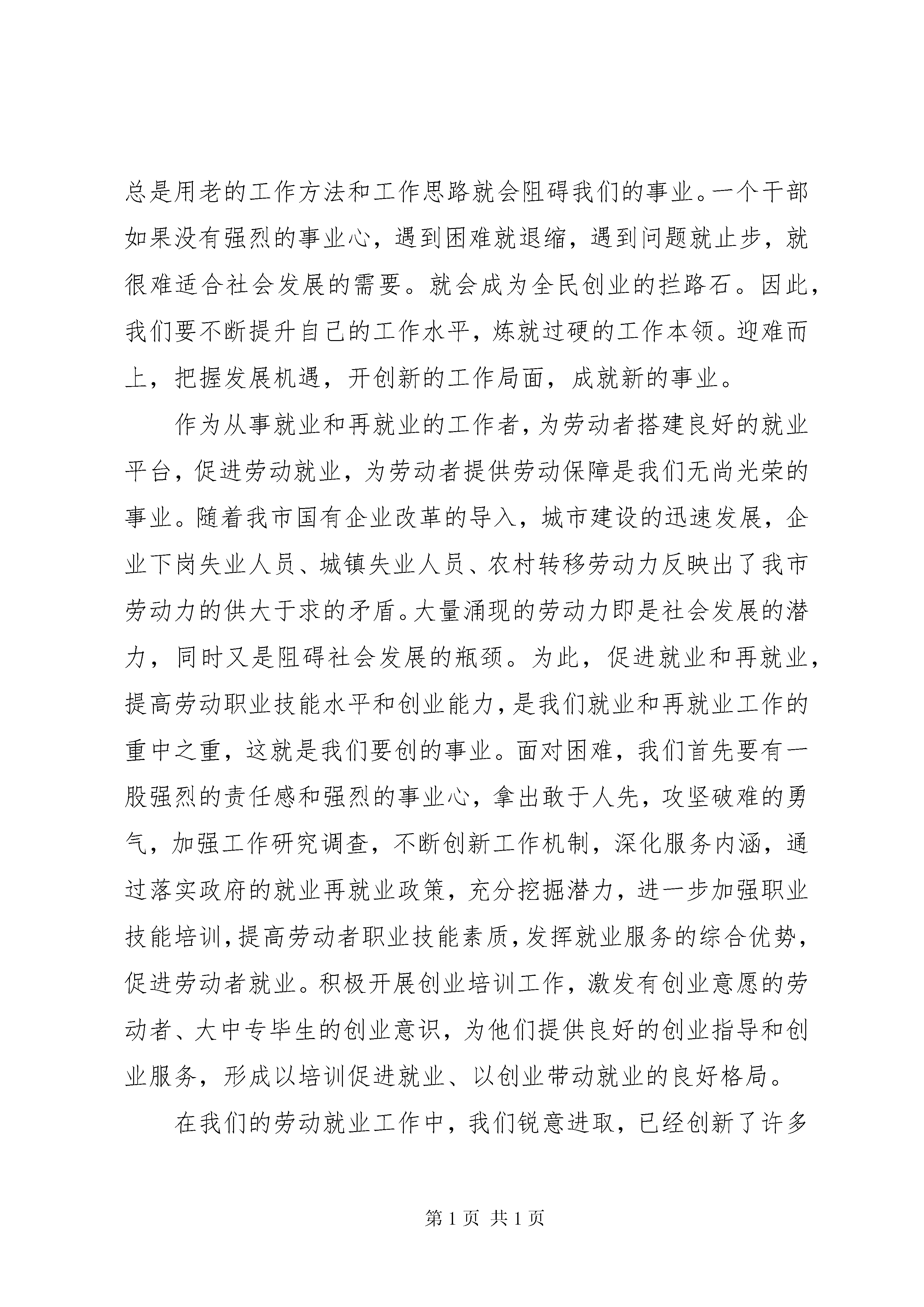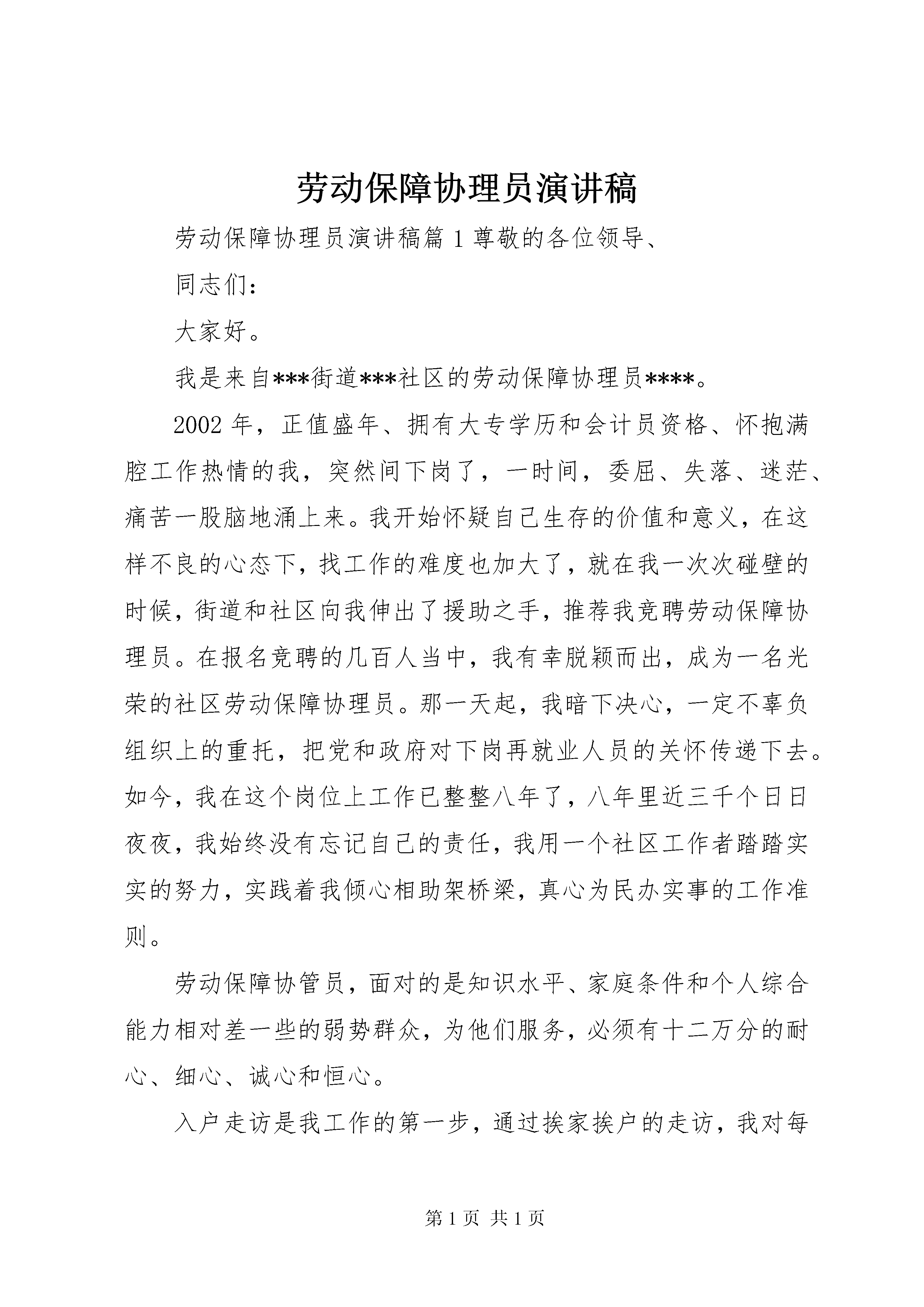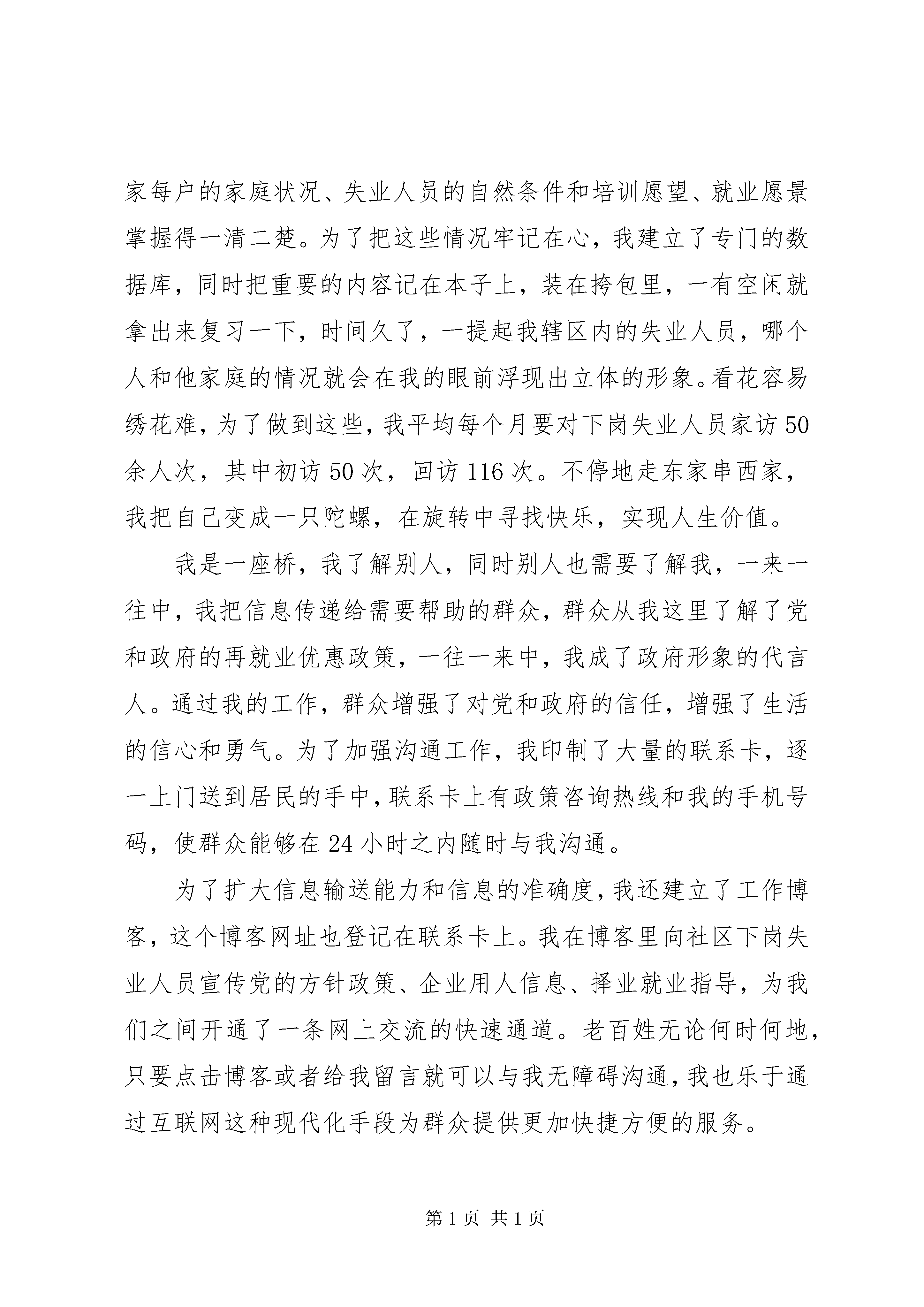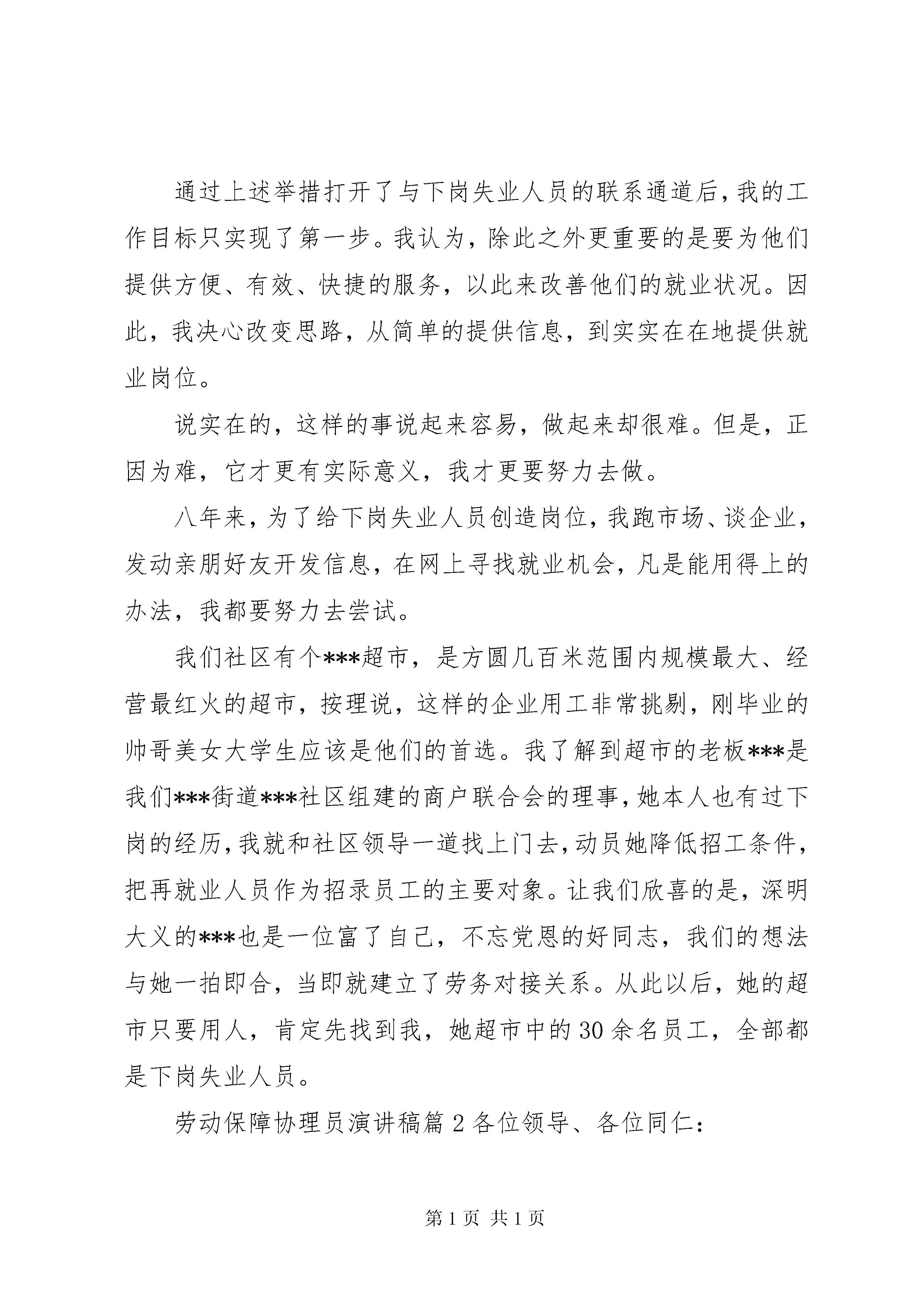 劳动保障协理员演讲稿劳动保障协理员演讲稿篇1尊敬的各位领导、同志们:大家好。我是来自***街道***社区的劳动保障协理员****。2002年,正值盛年、拥有大专学历和会计员资格、怀抱满腔工作热情的我,突然间下岗了,一时间,委屈、失落、迷茫、痛苦一股脑地涌上来。我开始怀疑自己生存的价值和意义,在这样不良的心态下,找工作的难度也加大了,就在我一次次碰壁的时候,街道和社区向我伸出了援助之手,推荐我竞聘劳动保障协理员。在报名竞聘的几百人当中,我有幸脱颖而出,成为一名光荣的社区劳动保障协理员。那一天起,我暗下决心,一定不辜负组织上的重托,把党和政府对下岗再就业人员的关怀传递下去。如今,我在这个岗位上工作已整整八年了,八年里近三千个日日夜夜,我始终没有忘记自己的责任,我用一个社区工作者踏踏实实的努力,实践着我倾心相助架桥梁,真心为民办实事的工作准则。劳动保障协管员,面对的是知识水平、家庭条件和个人综合能力相对差一些的弱势群众,为他们服务,必须有十二万分的耐心、细心、诚心和恒心。入户走访是我工作的第一步,通过挨家挨户的走访,我对每家每户的家庭状况、失业人员的自然条件和培训愿望、就业愿景掌握得一清二楚。为了把这些情况牢记在心,我建立了专门的数据库,同时把重要的内容记在本子上,装在挎包里,一有空闲就拿出来复习一下,时间久了,一提起我辖区内的失业人员,哪个人和他家庭的情况就会在我的眼前浮现出立体的形象。看花容易绣花难,为了做到这些,我平均每个月要对下岗失业人员家访50余人次,其中初访50次,回访116次。不停地走东家串西家,我把自己变成一只陀螺,在旋转中寻找快乐,实现人生价值。我是一座桥,我了解别人,同时别人也需要了解我,一来一往中,我把信息传递给需要帮助的群众,群众从我这里了解了党和政府的再就业优惠政策,一往一来中,我成了政府形象的代言人。通过我的工作,群众增强了对党和政府的信任,增强了生活的信心和勇气。为了加强沟通工作,我印制了大量的联系卡,逐一上门送到居民的手中,联系卡上有政策咨询热线和我的手机号码,使群众能够在24小时之内随时与我沟通。为了扩大信息输送能力和信息的准确度,我还建立了工作博客,这个博客网址也登记在联系卡上。我在博客里向社区下岗失业人员宣传党的方针政策、企业用人信息、择业就业指导,为我们之间开通了一条网上交流的快速通道。老百姓无论何时何地,只要点击博客或者给我留言就可以与我无障碍沟通,我也乐于通过互联网这种现代化手段为群众提供更加快捷方便的服务。通过上述举措打开了与下岗失业人员的联系通道后,我的工作目标只实现了第一步。我认为,除此之外更重要的是要为他们提供方便、有效、快捷的服务,以此来改善他们的就业状况。因此,我决心改变思路,从简单的提供信息,到实实在在地提供就业岗位。说实在的,这样的事说起来容易,做起来却很难。但是,正因为难,它才更有实际意义,我才更要努力去做。八年来,为了给下岗失业人员创造岗位,我跑市场、谈企业,发动亲朋好友开发信息,在网上寻找就业机会,凡是能用得上的办法,我都要努力去尝试。我们社区有个***超市,是方圆几百米范围内规模最大、经营最红火的超市,按理说,这样的企业用工非常挑剔,刚毕业的帅哥美女大学生应该是他们的首选。我了解到超市的老板***是我们***街道***社区组建的商户联合会的理事,她本人也有过下岗的经历,我就和社区领导一道找上门去,动员她降低招工条件,把再就业人员作为招录员工的主要对象。让我们欣喜的是,深明大义的***也是一位富了自己,不忘党恩的好同志,我们的想法与她一拍即合,当即就建立了劳务对接关系。从此以后,她的超市只要用人,肯定先找到我,她超市中的30余名员工,全部都是下岗失业人员。劳动保障协理员演讲稿篇2各位领导、各位同仁:今天我演讲的题目是。立足本职创新业、争当社会经济发展排头兵。无数历史经验告诉我们,创业和创新是国家振兴、民族崛起的巨大的推动力。在社会经济发展的大好环境下,市委市政府审时度势,抓住机遇,及时推出了开创和谐创业、全民创业、富民新市的发展战略。为我们市吹响了全民创业的号角,全市上下掀起了一股百姓创家业、能人创企业、干部创事业的热潮。在这股全民创业,建设和谐社会的热潮中,作为政府的工作人员,应身体力行,奋发图强,为全民创业推波助澜。百姓创家业,能人创企业的关键是干部创事业。干部创什么事业呢。全民创业离不开良好、开放的政策环境,这就是干部要创的事业。具体地讲,干部要创的事业就是要为全民创业搭建好创业的平台,制定好有利于社会经济发展的政策措施,为全民创业提供优质的服务。干部创事业的立足点在本质工作岗位上,离开了本职工作就偏离了为党为人民服务的核心。即是创业就不可能一足而就。我们应该从一点一滴做起,放下架子,以做人民公仆的良好心态,勤干实干,脚踏实地,不怕困难