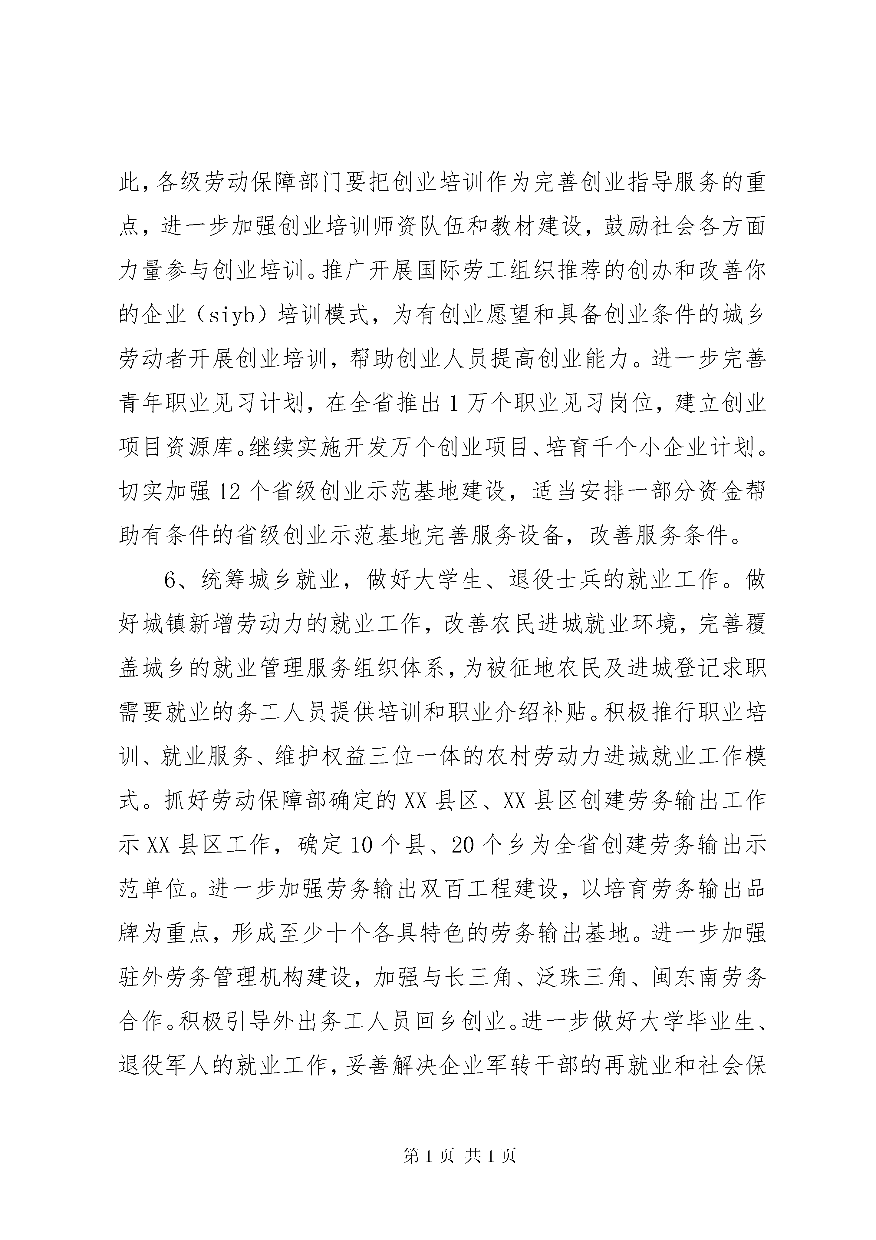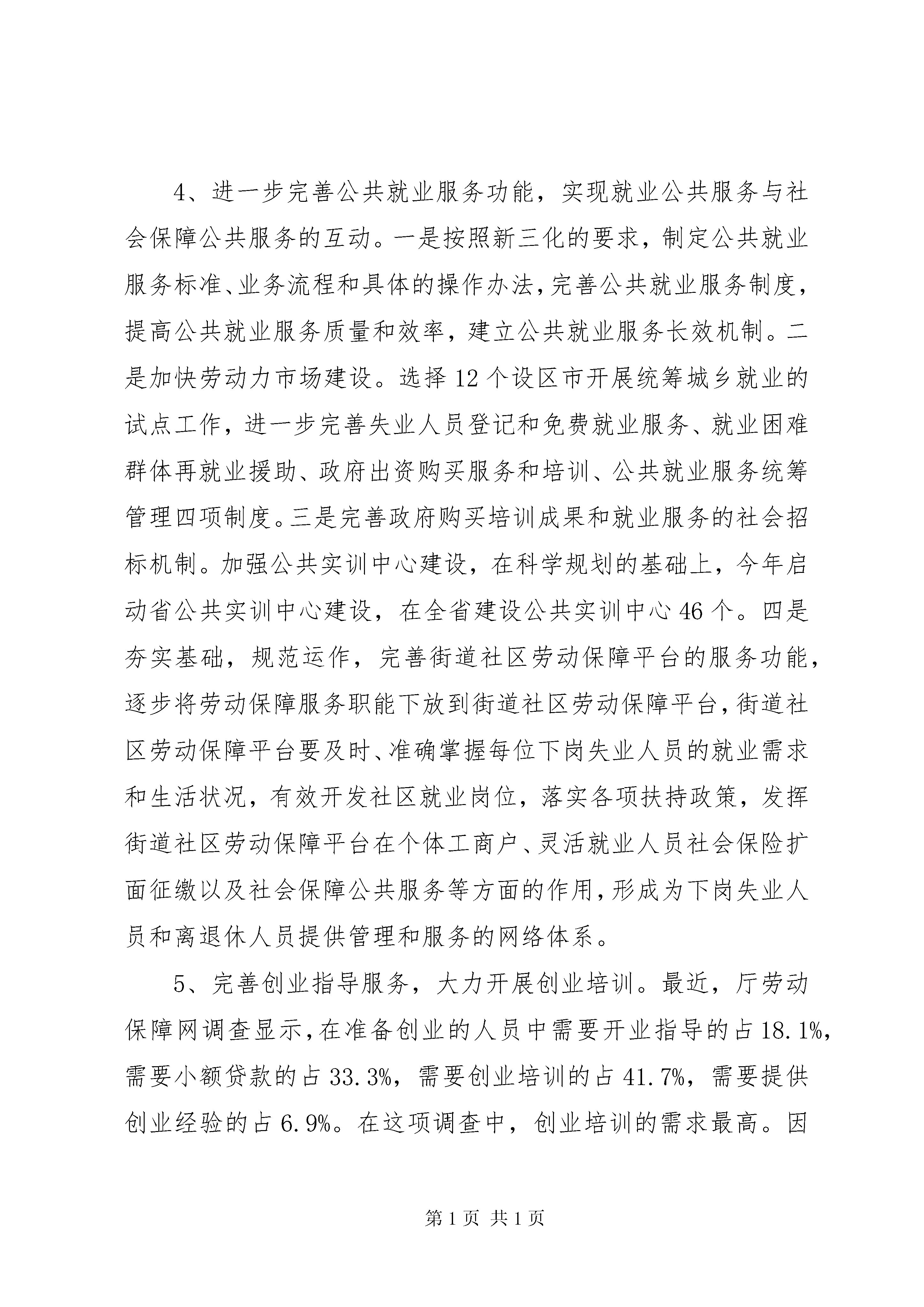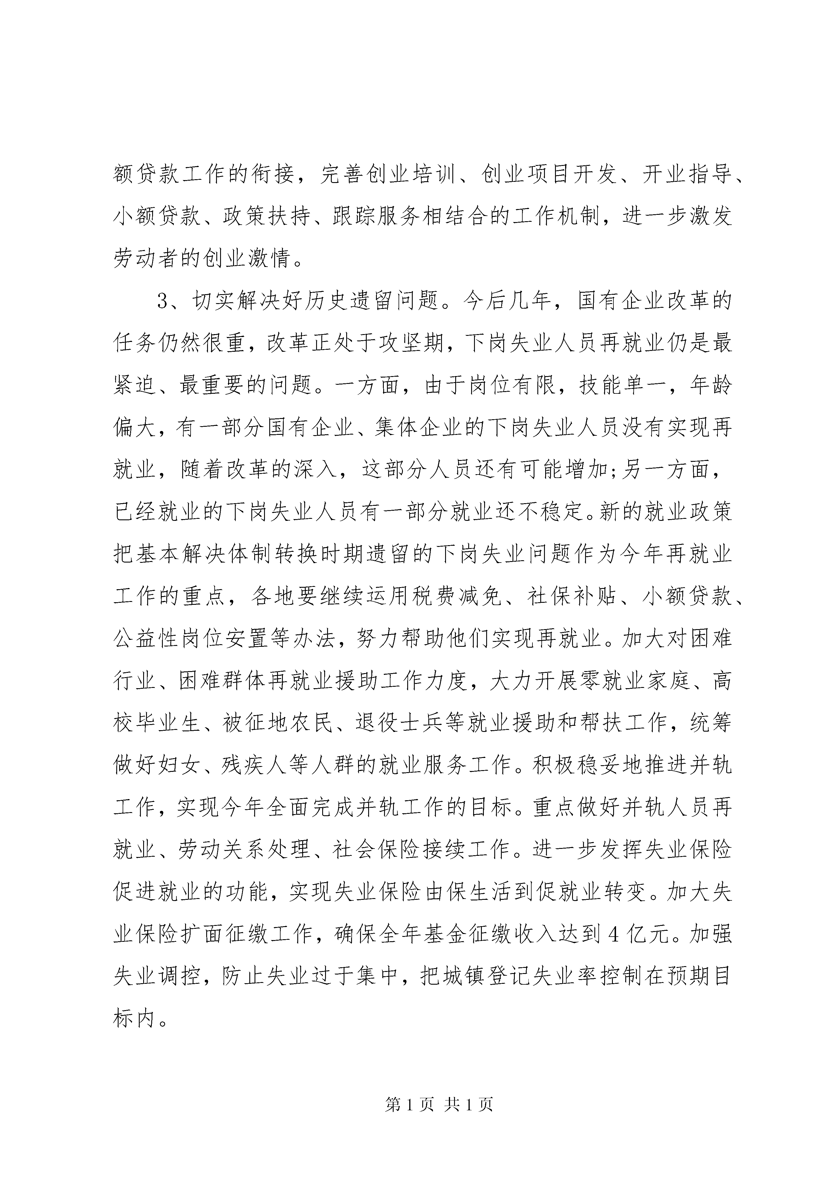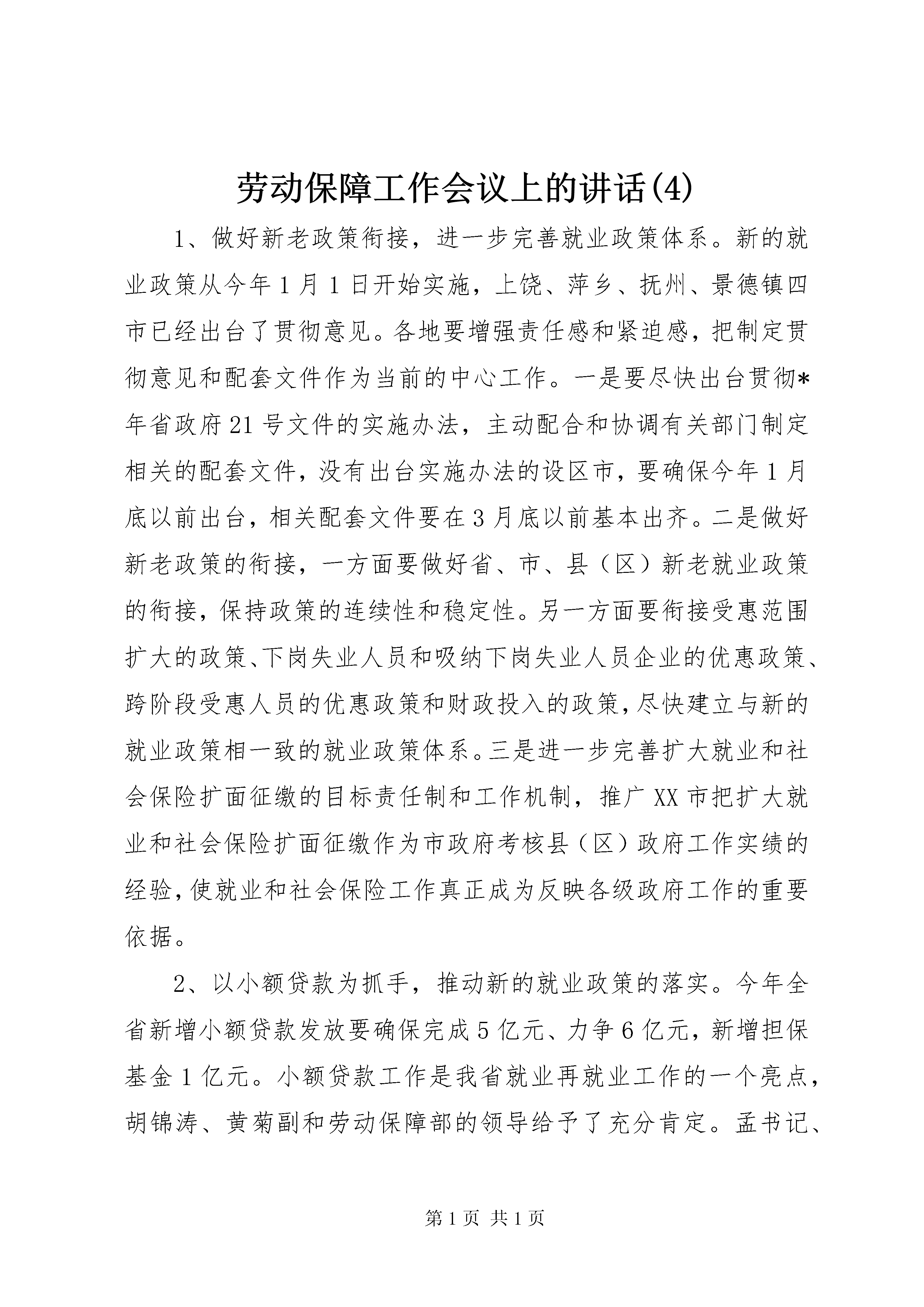 劳动保障工作会议上的讲话(4)1、做好新老政策衔接,进一步完善就业政策体系。新的就业政策从今年1月1日开始实施,上饶、萍乡、抚州、景德镇四市已经出台了贯彻意见。各地要增强责任感和紧迫感,把制定贯彻意见和配套文件作为当前的中心工作。一是要尽快出台贯彻*年省政府21号文件的实施办法,主动配合和协调有关部门制定相关的配套文件,没有出台实施办法的设区市,要确保今年1月底以前出台,相关配套文件要在3月底以前基本出齐。二是做好新老政策的衔接,一方面要做好省、市、县(区)新老就业政策的衔接,保持政策的连续性和稳定性。另一方面要衔接受惠范围扩大的政策、下岗失业人员和吸纳下岗失业人员企业的优惠政策、跨阶段受惠人员的优惠政策和财政投入的政策,尽快建立与新的就业政策相一致的就业政策体系。三是进一步完善扩大就业和社会保险扩面征缴的目标责任制和工作机制,推广XX市把扩大就业和社会保险扩面征缴作为市政府考核县(区)政府工作实绩的经验,使就业和社会保险工作真正成为反映各级政府工作的重要依据。2、以小额贷款为抓手,推动新的就业政策的落实。今年全省新增小额贷款发放要确保完成5亿元、力争6亿元,新增担保基金1亿元。小额贷款工作是我省就业再就业工作的一个亮点,胡锦涛、黄菊副和劳动保障部的领导给予了充分肯定。孟书记、黄省长、彭宏松副书记、熊盛文省长助理高度重视,实践证明小额贷款既有利于扩大就业,也有利于推动百姓创家业,具有带动就业的倍增效应。同志们务必从讲政治的高度,进一步重视和加强小额贷款工作;务必从推动百姓创家业的角度,完善小额贷款政策措施;务必从推动新政策的落实上,把小额贷款工作作为实施积极就业政策的重要内容。一是要按照省政府21号文件要求进一步扩大小额贷款范围,提高贷款额度,使小额贷款这项优惠政策惠及更多的创业者。二是要落实担保资金,各地要按照省政府办公厅下达的《全省*年担保基金安排和小额贷款工作目标计划》,协调有关部门安排担保基金,做好任务的分解和督促检查工作。三是要按照省劳动保障厅、省财政厅《关于培育创业主体,强化创业服务,推动全民创业的指导意见》推动全民创业的30条措施,重点在完善创业资金支持体系、加快培育创业主体,完善扶持政策、创新创业服务机制,建立创业指导载体、加大创业培育力度,落实和完善创业人员参保及其他社会保险政策等方面取得进展。四是要完善小额贷款组织管理,建立和完善省、市、县三级小额贷款担保中心的组织体系,进一步落实机构、编制和工作经费等,使小额贷款担保中心更好地适应工作任务的要求。五是要大力推进信用社区建设,确保今年信用社区达到100个以上,简化担保贷款手续,抓好贷、用、还三个环节,完善防范风险的工作机制,建立失信惩戒制度。六是要更好地做好创业与小额贷款工作的衔接,完善创业培训、创业项目开发、开业指导、小额贷款、政策扶持、跟踪服务相结合的工作机制,进一步激发劳动者的创业激情。3、切实解决好历史遗留问题。今后几年,国有企业改革的任务仍然很重,改革正处于攻坚期,下岗失业人员再就业仍是最紧迫、最重要的问题。一方面,由于岗位有限,技能单一,年龄偏大,有一部分国有企业、集体企业的下岗失业人员没有实现再就业,随着改革的深入,这部分人员还有可能增加;另一方面,已经就业的下岗失业人员有一部分就业还不稳定。新的就业政策把基本解决体制转换时期遗留的下岗失业问题作为今年再就业工作的重点,各地要继续运用税费减免、社保补贴、小额贷款、公益性岗位安置等办法,努力帮助他们实现再就业。加大对困难行业、困难群体再就业援助工作力度,大力开展零就业家庭、高校毕业生、被征地农民、退役士兵等就业援助和帮扶工作,统筹做好妇女、残疾人等人群的就业服务工作。积极稳妥地推进并轨工作,实现今年全面完成并轨工作的目标。重点做好并轨人员再就业、劳动关系处理、社会保险接续工作。进一步发挥失业保险促进就业的功能,实现失业保险由保生活到促就业转变。加大失业保险扩面征缴工作,确保全年基金征缴收入达到4亿元。加强失业调控,防止失业过于集中,把城镇登记失业率控制在预期目标内。4、进一步完善公共就业服务功能,实现就业公共服务与社会保障公共服务的互动。一是按照新三化的要求,制定公共就业服务标准、业务流程和具体的操作办法,完善公共就业服务制度,提高公共就业服务质量和效率,建立公共就业服务长效机制。二是加快劳动力市场建设。选择12个设区市开展统筹城乡就业的试点工作,进一步完善失业人员登记和免费就业服务、就业困难群体再就业援助、政府出资购买服务和培训、公共就业服务统筹管理四项制度。三是完善政府购买培训成果和就业服务的社会招标机制。加强公共实训中心建设,在科学规划的基础上,今年启动省公共实训中心建设,在全省建设公共实训中心46个。四是夯实基础,规范运作,完善街道社区劳动保障平台的服务功能,逐步
