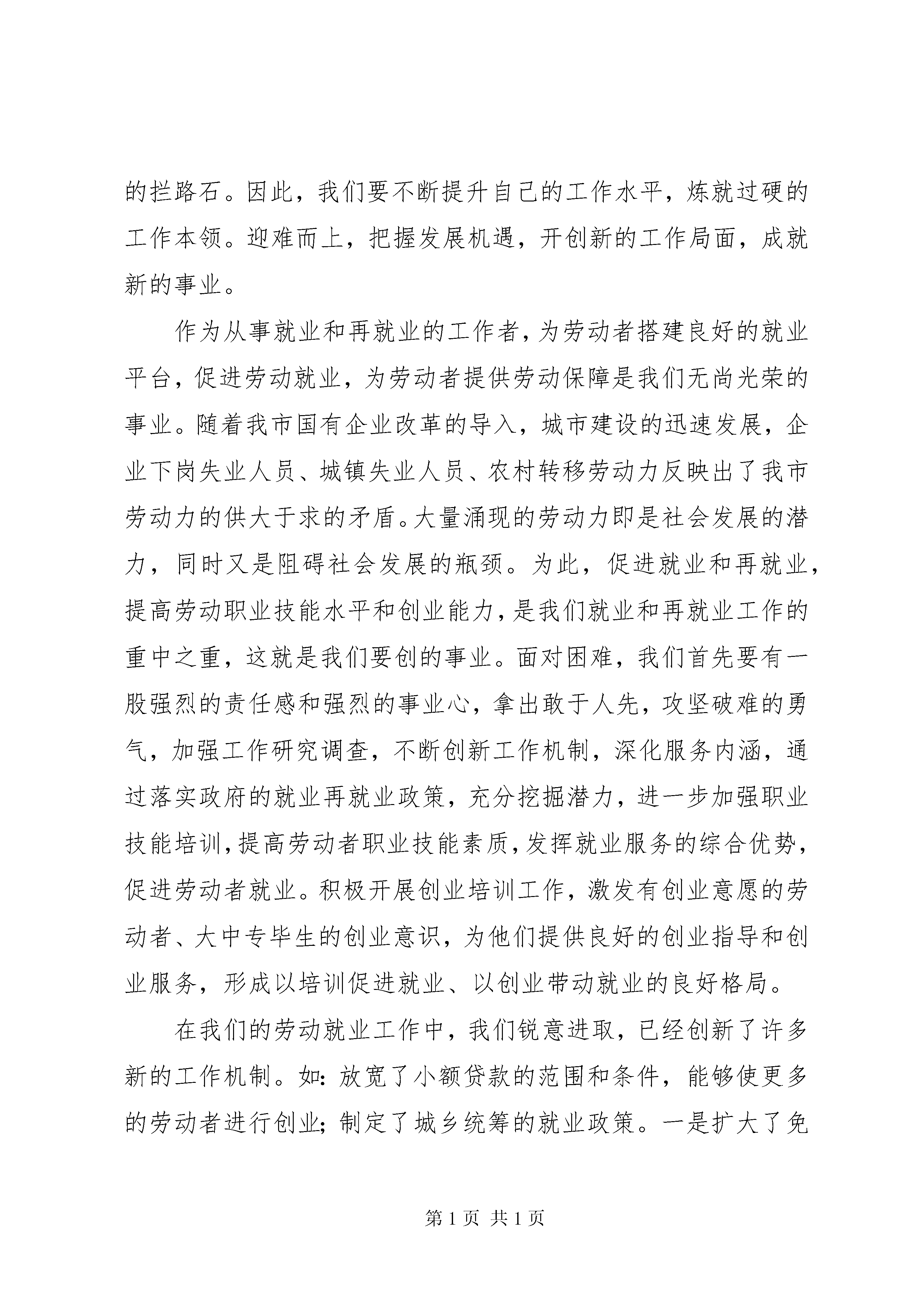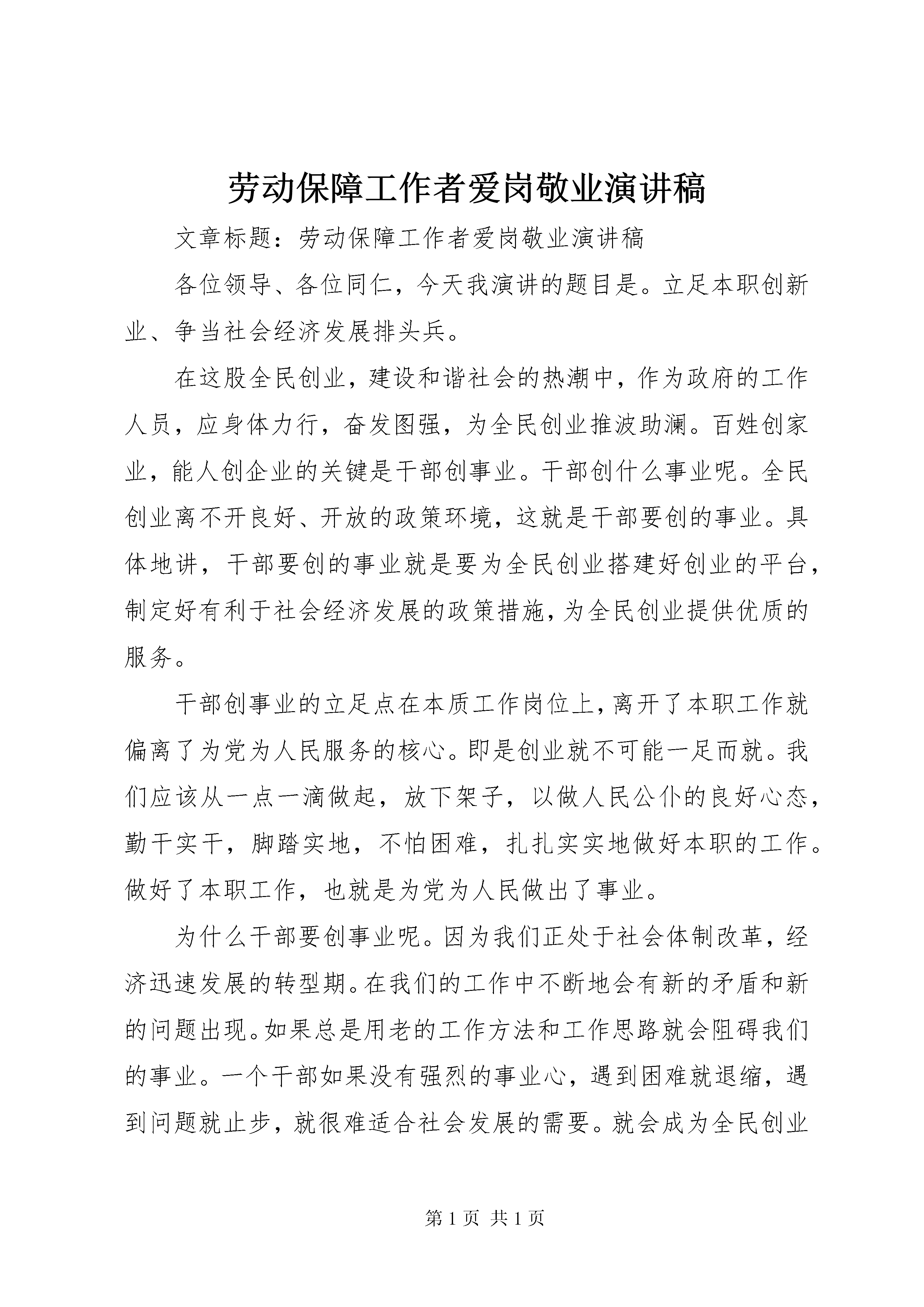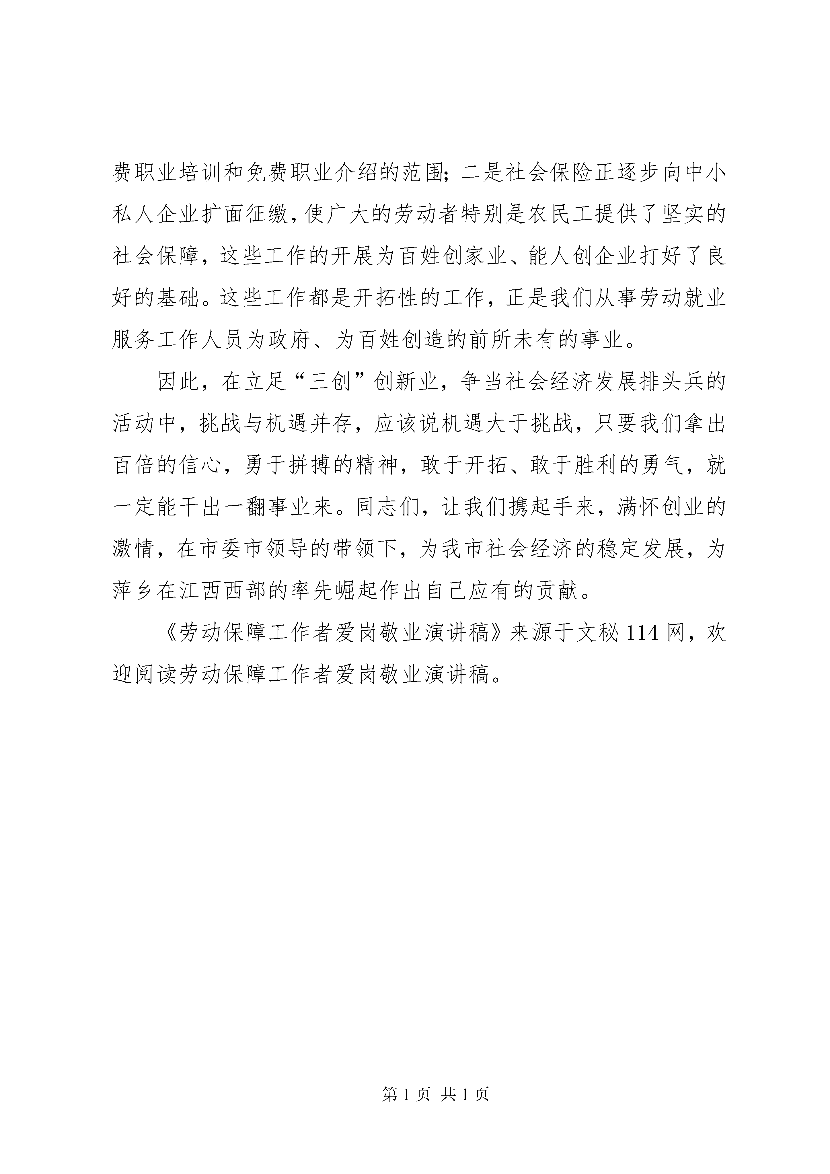 劳动保障工作者爱岗敬业演讲稿文章标题:劳动保障工作者爱岗敬业演讲稿各位领导、各位同仁,今天我演讲的题目是。立足本职创新业、争当社会经济发展排头兵。在这股全民创业,建设和谐社会的热潮中,作为政府的工作人员,应身体力行,奋发图强,为全民创业推波助澜。百姓创家业,能人创企业的关键是干部创事业。干部创什么事业呢。全民创业离不开良好、开放的政策环境,这就是干部要创的事业。具体地讲,干部要创的事业就是要为全民创业搭建好创业的平台,制定好有利于社会经济发展的政策措施,为全民创业提供优质的服务。干部创事业的立足点在本质工作岗位上,离开了本职工作就偏离了为党为人民服务的核心。即是创业就不可能一足而就。我们应该从一点一滴做起,放下架子,以做人民公仆的良好心态,勤干实干,脚踏实地,不怕困难,扎扎实实地做好本职的工作。做好了本职工作,也就是为党为人民做出了事业。为什么干部要创事业呢。因为我们正处于社会体制改革,经济迅速发展的转型期。在我们的工作中不断地会有新的矛盾和新的问题出现。如果总是用老的工作方法和工作思路就会阻碍我们的事业。一个干部如果没有强烈的事业心,遇到困难就退缩,遇到问题就止步,就很难适合社会发展的需要。就会成为全民创业的拦路石。因此,我们要不断提升自己的工作水平,炼就过硬的工作本领。迎难而上,把握发展机遇,开创新的工作局面,成就新的事业。作为从事就业和再就业的工作者,为劳动者搭建良好的就业平台,促进劳动就业,为劳动者提供劳动保障是我们无尚光荣的事业。随着我市国有企业改革的导入,城市建设的迅速发展,企业下岗失业人员、城镇失业人员、农村转移劳动力反映出了我市劳动力的供大于求的矛盾。大量涌现的劳动力即是社会发展的潜力,同时又是阻碍社会发展的瓶颈。为此,促进就业和再就业,提高劳动职业技能水平和创业能力,是我们就业和再就业工作的重中之重,这就是我们要创的事业。面对困难,我们首先要有一股强烈的责任感和强烈的事业心,拿出敢于人先,攻坚破难的勇气,加强工作研究调查,不断创新工作机制,深化服务内涵,通过落实政府的就业再就业政策,充分挖掘潜力,进一步加强职业技能培训,提高劳动者职业技能素质,发挥就业服务的综合优势,促进劳动者就业。积极开展创业培训工作,激发有创业意愿的劳动者、大中专毕生的创业意识,为他们提供良好的创业指导和创业服务,形成以培训促进就业、以创业带动就业的良好格局。在我们的劳动就业工作中,我们锐意进取,已经创新了许多新的工作机制。如:放宽了小额贷款的范围和条件,能够使更多的劳动者进行创业;制定了城乡统筹的就业政策。一是扩大了免费职业培训和免费职业介绍的范围;二是社会保险正逐步向中小私人企业扩面征缴,使广大的劳动者特别是农民工提供了坚实的社会保障,这些工作的开展为百姓创家业、能人创企业打好了良好的基础。这些工作都是开拓性的工作,正是我们从事劳动就业服务工作人员为政府、为百姓创造的前所未有的事业。因此,在立足“三创”创新业,争当社会经济发展排头兵的活动中,挑战与机遇并存,应该说机遇大于挑战,只要我们拿出百倍的信心,勇于拼搏的精神,敢于开拓、敢于胜利的勇气,就一定能干出一翻事业来。同志们,让我们携起手来,满怀创业的激情,在市委市领导的带领下,为我市社会经济的稳定发展,为萍乡在江西西部的率先崛起作出自己应有的贡献。《劳动保障工作者爱岗敬业演讲稿》来源于文秘114网,欢迎阅读劳动保障工作者爱岗敬业演讲稿。