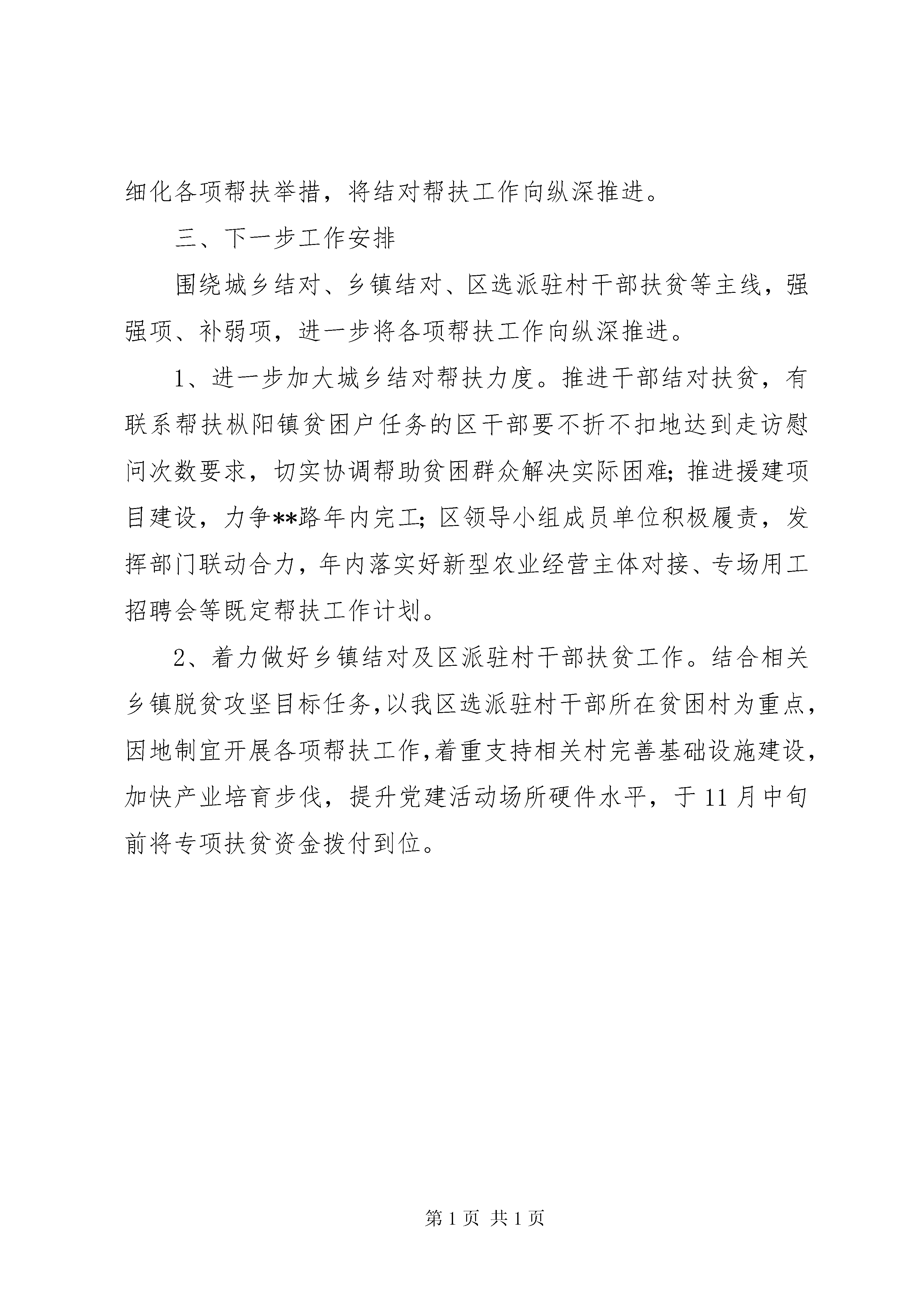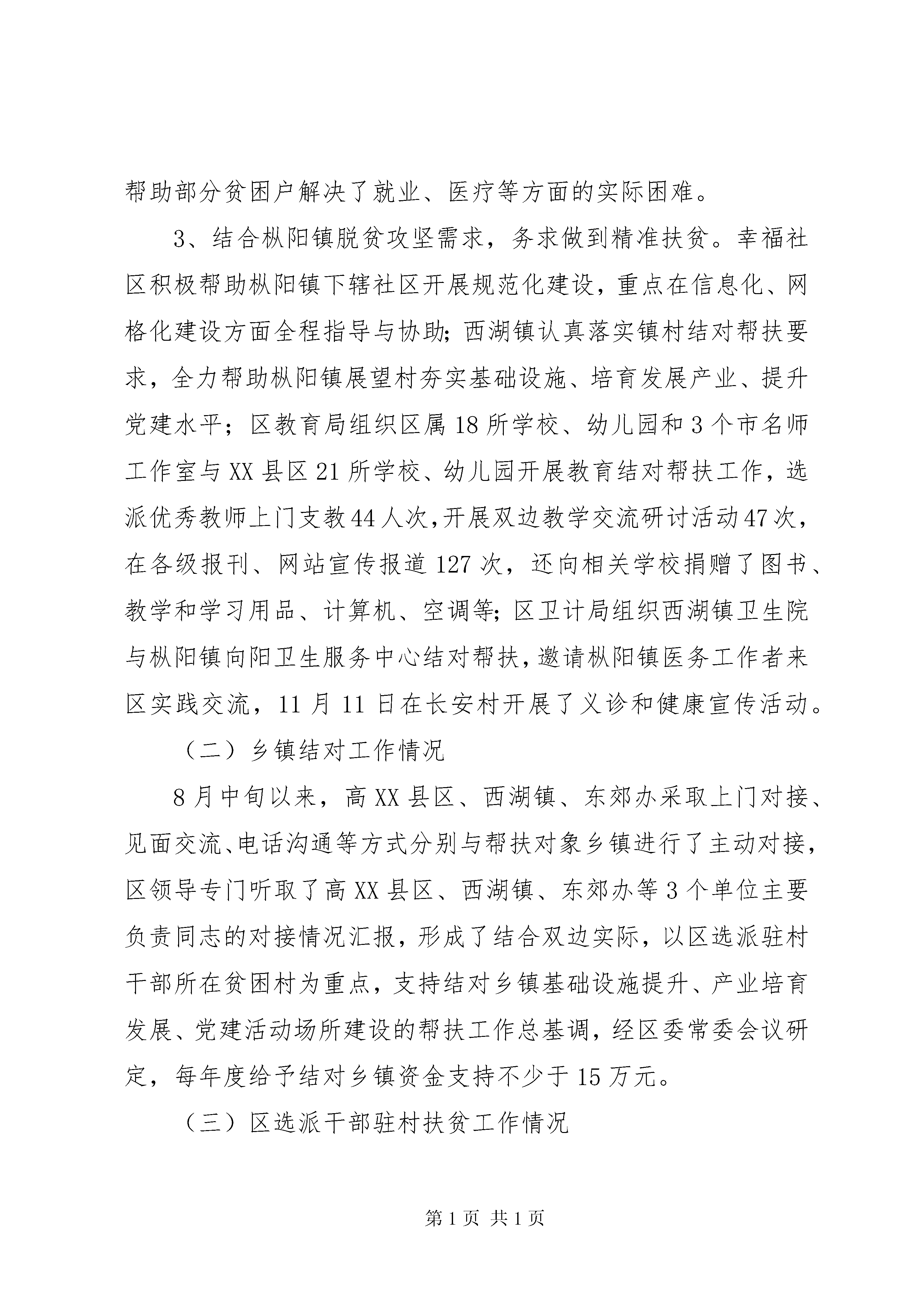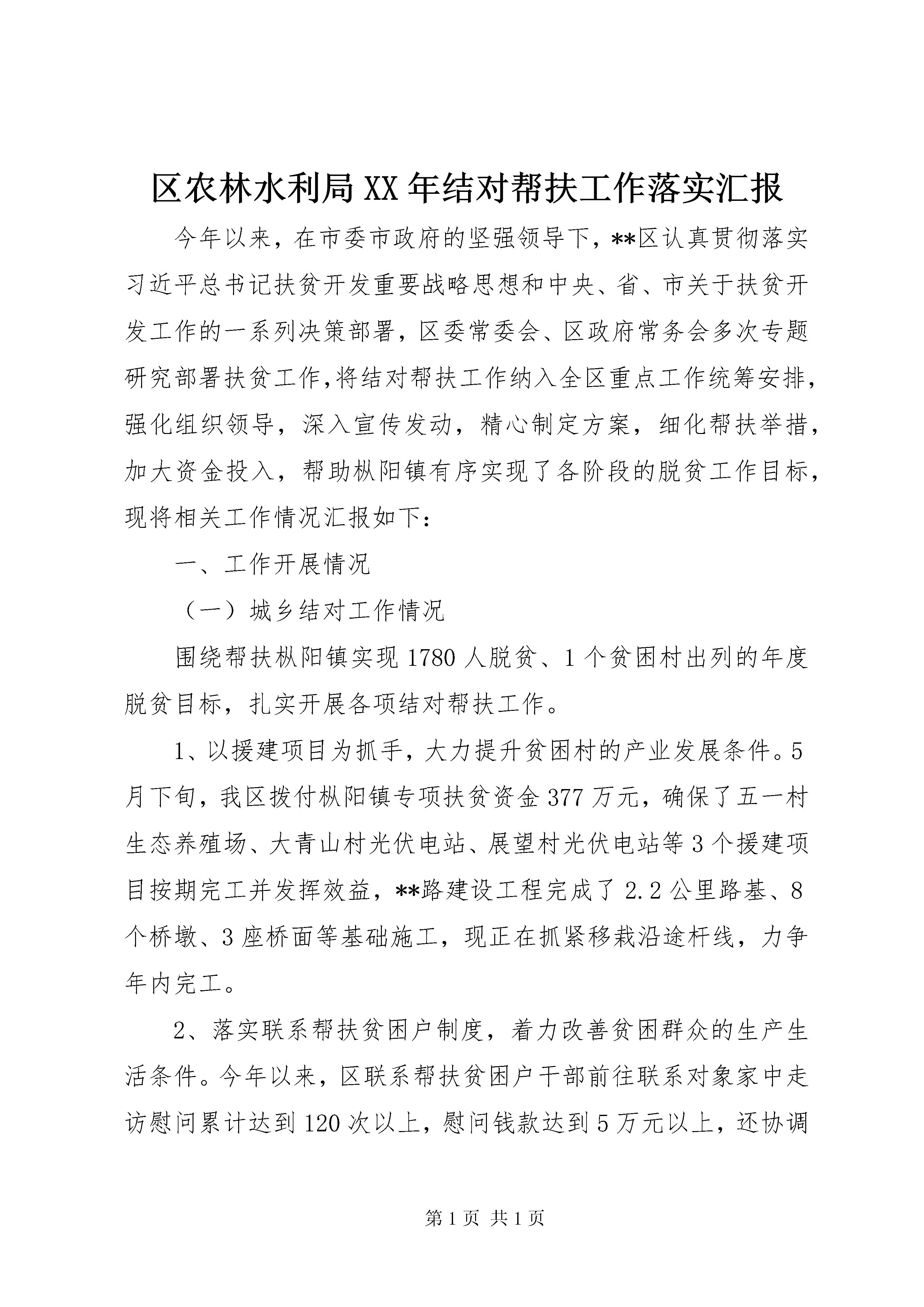 区农林水利局XX年结对帮扶工作落实汇报今年以来,在市委市政府的坚强领导下,**区认真贯彻落实习近平总书记扶贫开发重要战略思想和中央、省、市关于扶贫开发工作的一系列决策部署,区委常委会、区政府常务会多次专题研究部署扶贫工作,将结对帮扶工作纳入全区重点工作统筹安排,强化组织领导,深入宣传发动,精心制定方案,细化帮扶举措,加大资金投入,帮助枞阳镇有序实现了各阶段的脱贫工作目标,现将相关工作情况汇报如下:一、工作开展情况(一)城乡结对工作情况围绕帮扶枞阳镇实现1780人脱贫、1个贫困村出列的年度脱贫目标,扎实开展各项结对帮扶工作。1、以援建项目为抓手,大力提升贫困村的产业发展条件。5月下旬,我区拨付枞阳镇专项扶贫资金377万元,确保了五一村生态养殖场、大青山村光伏电站、展望村光伏电站等3个援建项目按期完工并发挥效益,**路建设工程完成了2.2公里路基、8个桥墩、3座桥面等基础施工,现正在抓紧移栽沿途杆线,力争年内完工。2、落实联系帮扶贫困户制度,着力改善贫困群众的生产生活条件。今年以来,区联系帮扶贫困户干部前往联系对象家中走访慰问累计达到120次以上,慰问钱款达到5万元以上,还协调帮助部分贫困户解决了就业、医疗等方面的实际困难。3、结合枞阳镇脱贫攻坚需求,务求做到精准扶贫。幸福社区积极帮助枞阳镇下辖社区开展规范化建设,重点在信息化、网格化建设方面全程指导与协助;西湖镇认真落实镇村结对帮扶要求,全力帮助枞阳镇展望村夯实基础设施、培育发展产业、提升党建水平;区教育局组织区属18所学校、幼儿园和3个市名师工作室与XX县区21所学校、幼儿园开展教育结对帮扶工作,选派优秀教师上门支教44人次,开展双边教学交流研讨活动47次,在各级报刊、网站宣传报道127次,还向相关学校捐赠了图书、教学和学习用品、计算机、空调等;区卫计局组织西湖镇卫生院与枞阳镇向阳卫生服务中心结对帮扶,邀请枞阳镇医务工作者来区实践交流,11月11日在长安村开展了义诊和健康宣传活动。(二)乡镇结对工作情况8月中旬以来,高XX县区、西湖镇、东郊办采取上门对接、见面交流、电话沟通等方式分别与帮扶对象乡镇进行了主动对接,区领导专门听取了高XX县区、西湖镇、东郊办等3个单位主要负责同志的对接情况汇报,形成了结合双边实际,以区选派驻村干部所在贫困村为重点,支持结对乡镇基础设施提升、产业培育发展、党建活动场所建设的帮扶工作总基调,经区委常委会议研定,每年度给予结对乡镇资金支持不少于15万元。(三)区选派干部驻村扶贫工作情况区主要领导高度重视区选派干部驻村扶贫工作,区主要领导亲自就解决驻村干部生活方面的后顾之忧问题作了专门批示,并跟踪督办;查文彪书记、王保中区长等区领导先后多次前往罗墩、龙井、展望等区选派干部所驻村调研慰问,详细了解了相关村的基本情况、脱贫需求,并作出了具体帮扶要求。区扶贫办按照区领导指示精神,及时为驻村干部及时购置配备了电脑、空调、电瓶车、床铺、桌椅等工作、生活用品,并积极导协助驻村干部制定工作计划,督促协同区相关部门予以帮助支持。区选派干部驻村后,随即通过召开座谈会、上门入户走访等方式,深入调研了解村情、民情,并结合实际,与村两委班子共同研定了工作计划并付诸实施,充分利用政策和资源,精准施策,因户施策,驻村帮扶工作取得了实际成效,得到了XX县区各级的高度肯定,区选派干部多次(区人大副主任殷明根5月、7月,区政协副主席张林7月)获得XX县区委命名的“月度之星”称号。二、主要存在问题我区结对帮扶工作在区委、区政府的坚强领导和区相关部门的共同努力下取得了明显成效,得到了市委、市政府及XX县区各级乃至广大贫困群众的充分肯定,但对照各级精准扶贫工作的最新要求,我们的结对帮扶工作还存在联系不够紧密、形式过于单调、措施有待深入、宣传有待加强、个别援建项目进展滞后薄弱环节,需要在下一步工作中有针对性的加以改进,进一步深化、细化各项帮扶举措,将结对帮扶工作向纵深推进。三、下一步工作安排围绕城乡结对、乡镇结对、区选派驻村干部扶贫等主线,强强项、补弱项,进一步将各项帮扶工作向纵深推进。1、进一步加大城乡结对帮扶力度。推进干部结对扶贫,有联系帮扶枞阳镇贫困户任务的区干部要不折不扣地达到走访慰问次数要求,切实协调帮助贫困群众解决实际困难;推进援建项目建设,力争**路年内完工;区领导小组成员单位积极履责,发挥部门联动合力,年内落实好新型农业经营主体对接、专场用工招聘会等既定帮扶工作计划。2、着力做好乡镇结对及区派驻村干部扶贫工作。结合相关乡镇脱贫攻坚目标任务,以我区选派驻村干部所在贫困村为重点,因地制宜开展各项帮扶工作,着重支持相关村完善基础设施建设,加快产业培育步伐,提升党建活动场所硬件水平,于11月中旬前将专项扶贫资金拨付到位。