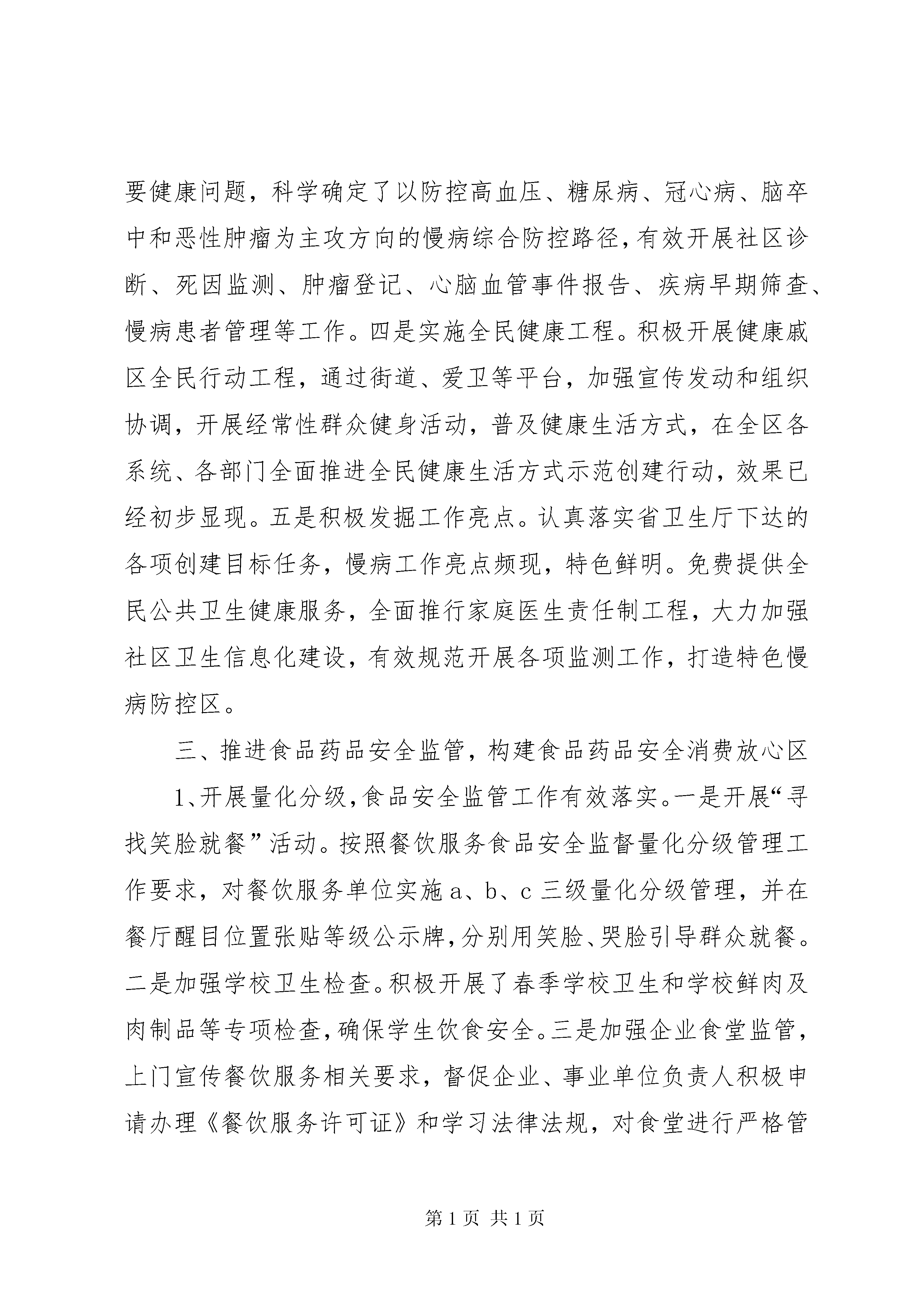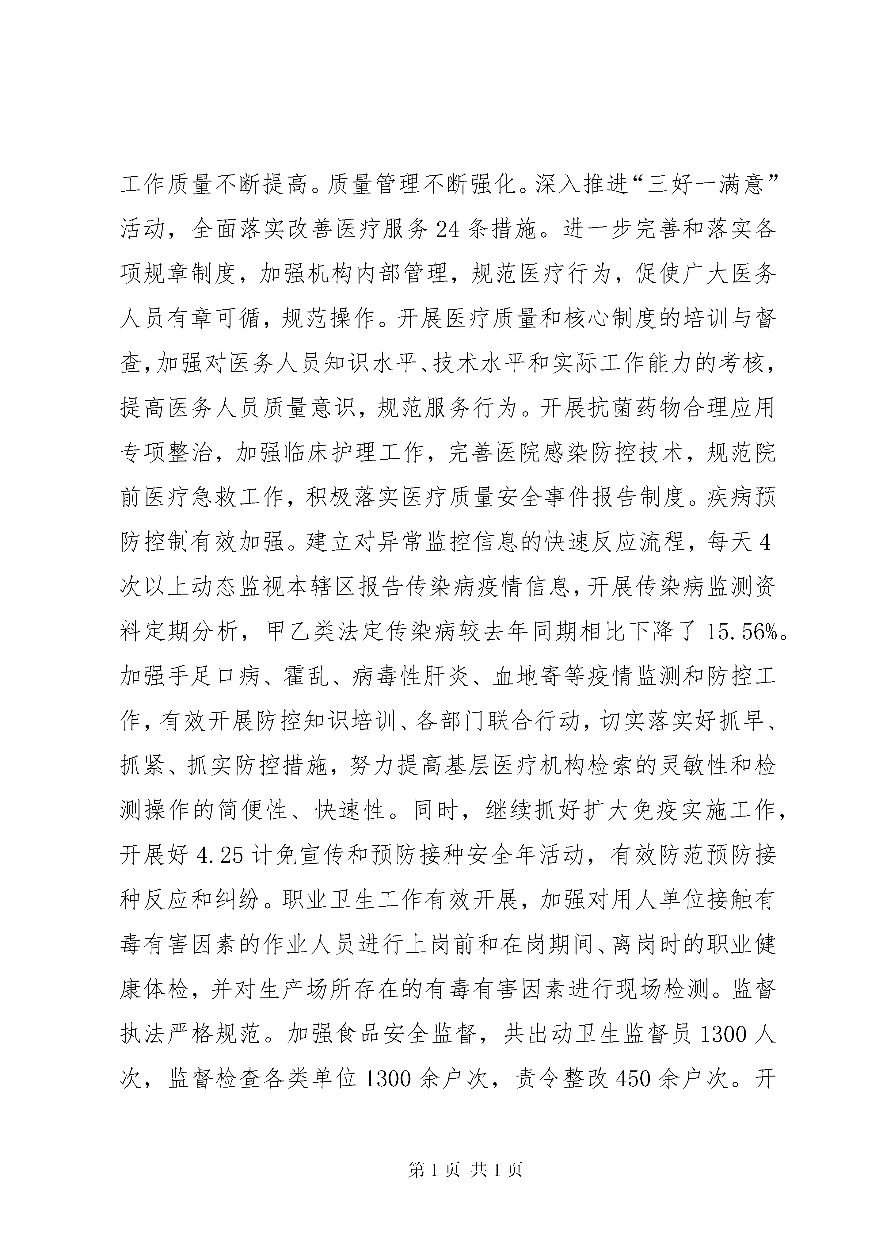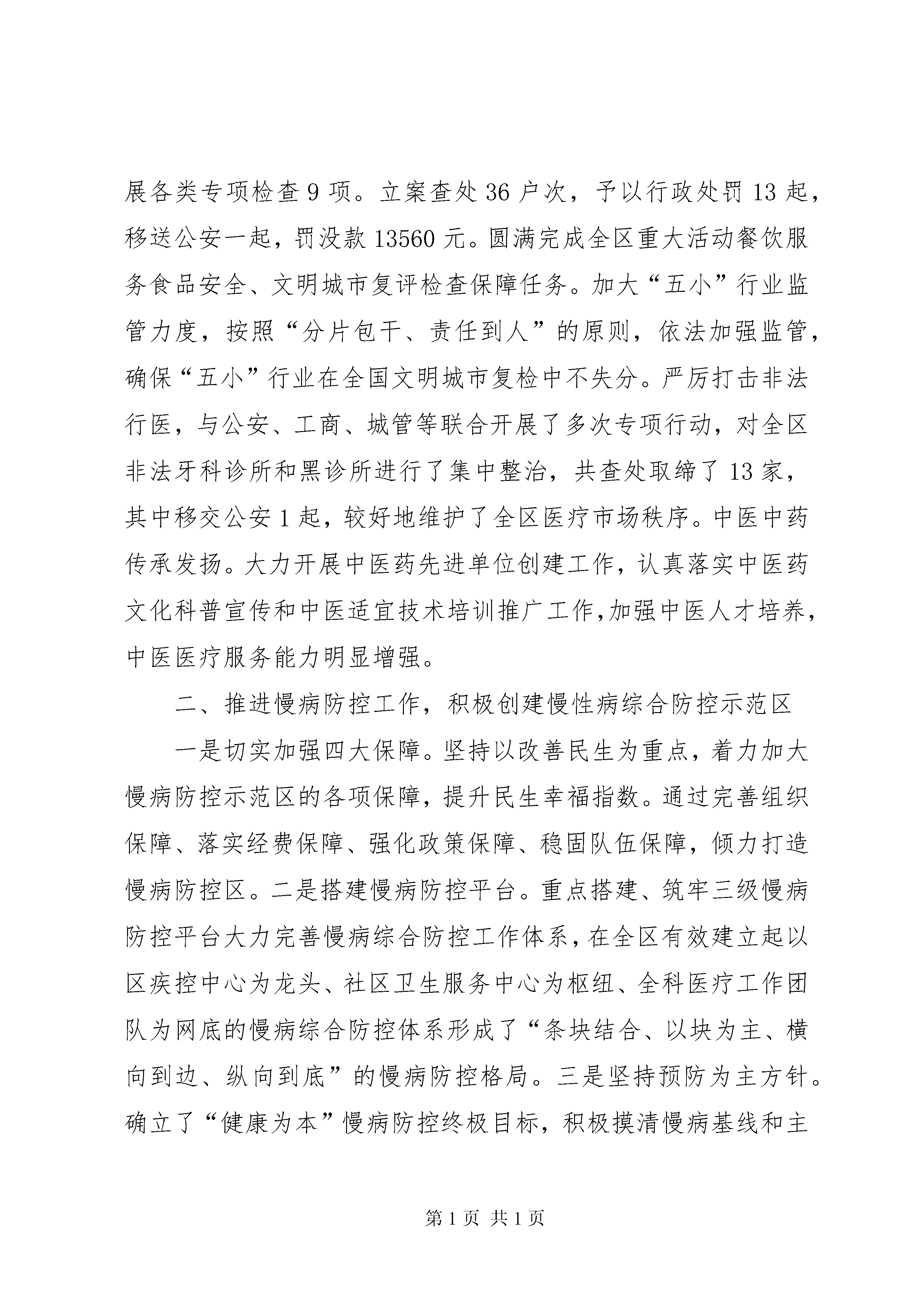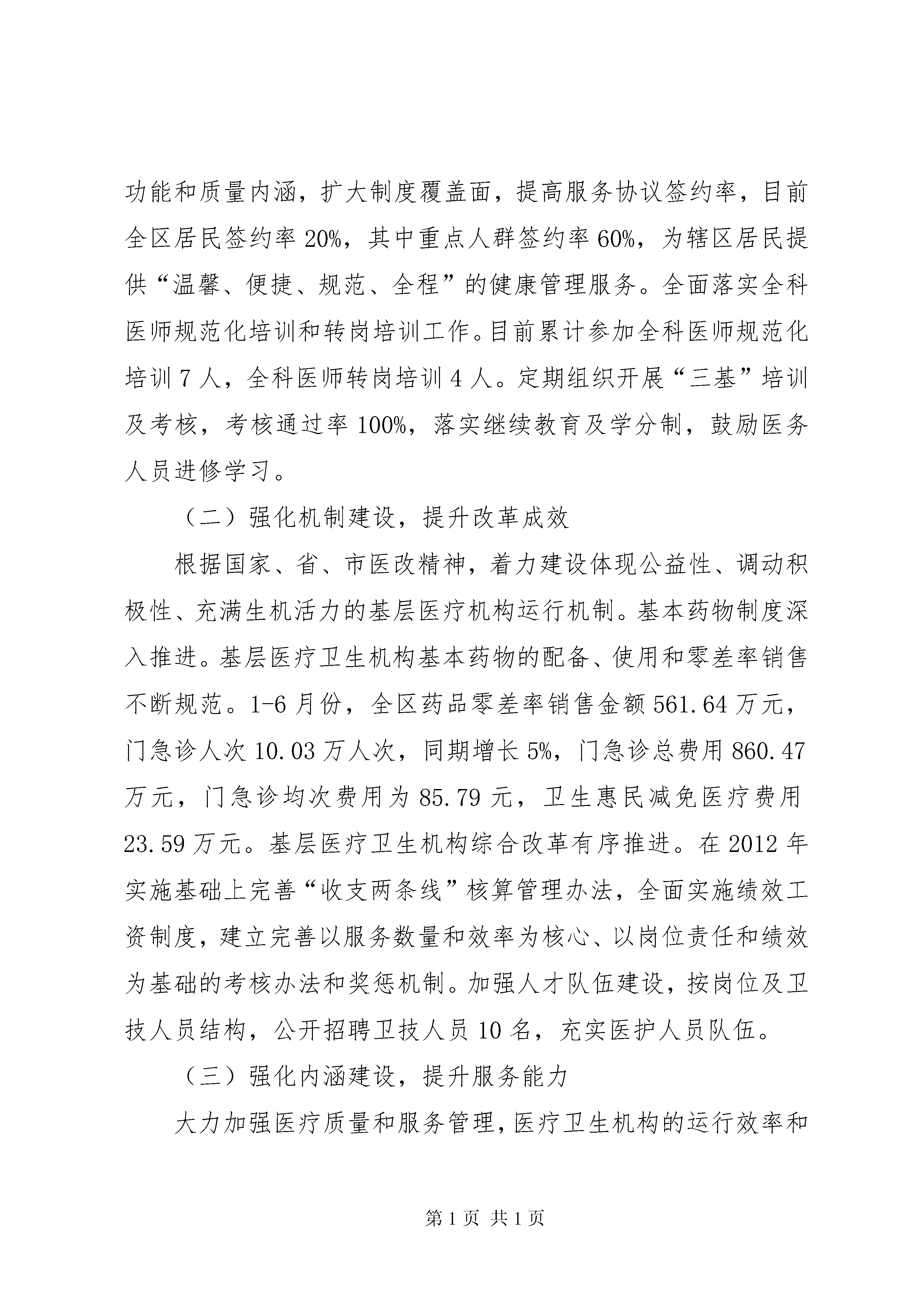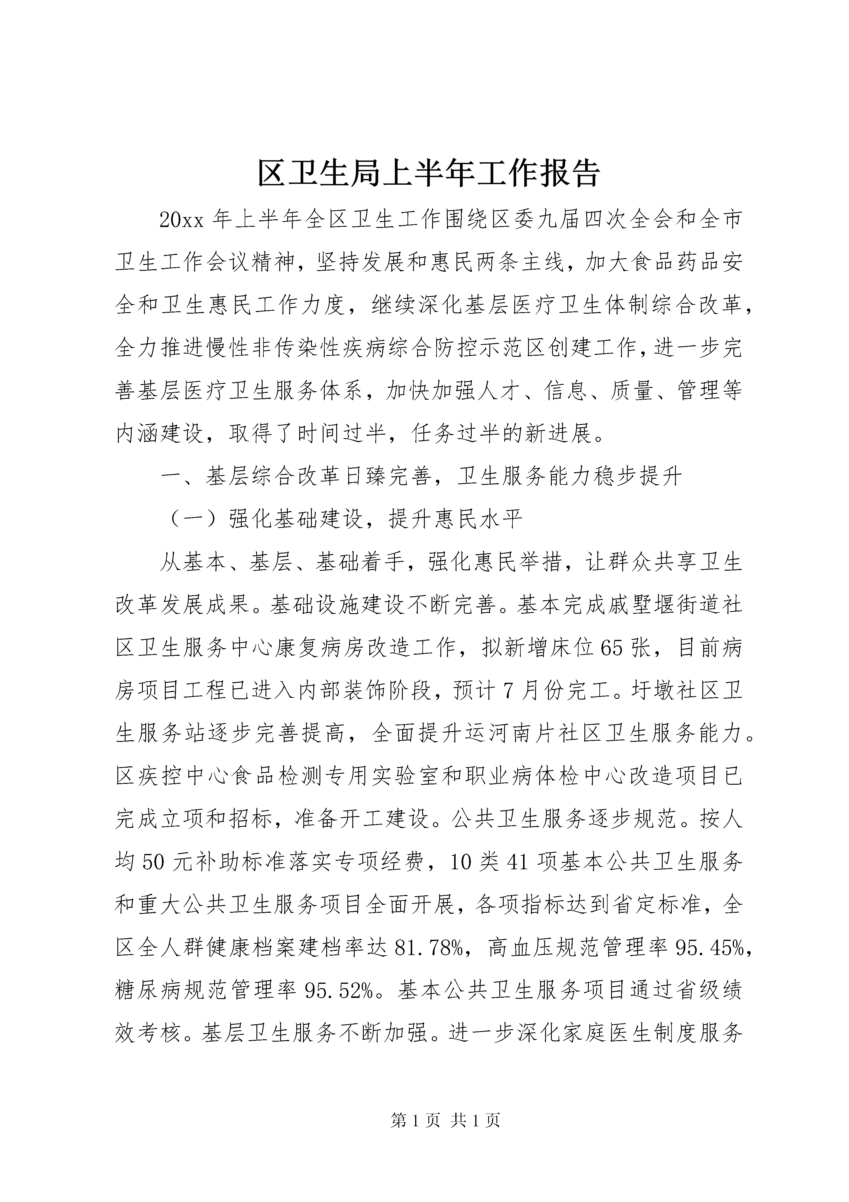 区卫生局上半年工作报告20xx年上半年全区卫生工作围绕区委九届四次全会和全市卫生工作会议精神,坚持发展和惠民两条主线,加大食品药品安全和卫生惠民工作力度,继续深化基层医疗卫生体制综合改革,全力推进慢性非传染性疾病综合防控示范区创建工作,进一步完善基层医疗卫生服务体系,加快加强人才、信息、质量、管理等内涵建设,取得了时间过半,任务过半的新进展。一、基层综合改革日臻完善,卫生服务能力稳步提升(一)强化基础建设,提升惠民水平从基本、基层、基础着手,强化惠民举措,让群众共享卫生改革发展成果。基础设施建设不断完善。基本完成戚墅堰街道社区卫生服务中心康复病房改造工作,拟新增床位65张,目前病房项目工程已进入内部装饰阶段,预计7月份完工。圩墩社区卫生服务站逐步完善提高,全面提升运河南片社区卫生服务能力。区疾控中心食品检测专用实验室和职业病体检中心改造项目已完成立项和招标,准备开工建设。公共卫生服务逐步规范。按人均50元补助标准落实专项经费,10类41项基本公共卫生服务和重大公共卫生服务项目全面开展,各项指标达到省定标准,全区全人群健康档案建档率达81.78%,高血压规范管理率95.45%,糖尿病规范管理率95.52%。基本公共卫生服务项目通过省级绩效考核。基层卫生服务不断加强。进一步深化家庭医生制度服务功能和质量内涵,扩大制度覆盖面,提高服务协议签约率,目前全区居民签约率20%,其中重点人群签约率60%,为辖区居民提供“温馨、便捷、规范、全程”的健康管理服务。全面落实全科医师规范化培训和转岗培训工作。目前累计参加全科医师规范化培训7人,全科医师转岗培训4人。定期组织开展“三基”培训及考核,考核通过率100%,落实继续教育及学分制,鼓励医务人员进修学习。(二)强化机制建设,提升改革成效根据国家、省、市医改精神,着力建设体现公益性、调动积极性、充满生机活力的基层医疗机构运行机制。基本药物制度深入推进。基层医疗卫生机构基本药物的配备、使用和零差率销售不断规范。1-6月份,全区药品零差率销售金额561.64万元,门急诊人次10.03万人次,同期增长5%,门急诊总费用860.47万元,门急诊均次费用为85.79元,卫生惠民减免医疗费用23.59万元。基层医疗卫生机构综合改革有序推进。在2012年实施基础上完善“收支两条线”核算管理办法,全面实施绩效工资制度,建立完善以服务数量和效率为核心、以岗位责任和绩效为基础的考核办法和奖惩机制。加强人才队伍建设,按岗位及卫技人员结构,公开招聘卫技人员10名,充实医护人员队伍。(三)强化内涵建设,提升服务能力大力加强医疗质量和服务管理,医疗卫生机构的运行效率和工作质量不断提高。质量管理不断强化。深入推进“三好一满意”活动,全面落实改善医疗服务24条措施。进一步完善和落实各项规章制度,加强机构内部管理,规范医疗行为,促使广大医务人员有章可循,规范操作。开展医疗质量和核心制度的培训与督查,加强对医务人员知识水平、技术水平和实际工作能力的考核,提高医务人员质量意识,规范服务行为。开展抗菌药物合理应用专项整治,加强临床护理工作,完善医院感染防控技术,规范院前医疗急救工作,积极落实医疗质量安全事件报告制度。疾病预防控制有效加强。建立对异常监控信息的快速反应流程,每天4次以上动态监视本辖区报告传染病疫情信息,开展传染病监测资料定期分析,甲乙类法定传染病较去年同期相比下降了15.56%。加强手足口病、霍乱、病毒性肝炎、血地寄等疫情监测和防控工作,有效开展防控知识培训、各部门联合行动,切实落实好抓早、抓紧、抓实防控措施,努力提高基层医疗机构检索的灵敏性和检测操作的简便性、快速性。同时,继续抓好扩大免疫实施工作,开展好4.25计免宣传和预防接种安全年活动,有效防范预防接种反应和纠纷。职业卫生工作有效开展,加强对用人单位接触有毒有害因素的作业人员进行上岗前和在岗期间、离岗时的职业健康体检,并对生产场所存在的有毒有害因素进行现场检测。监督执法严格规范。加强食品安全监督,共出动卫生监督员1300人次,监督检查各类单位1300余户次,责令整改450余户次。开展各类专项检查9项。立案查处36户次,予以行政处罚13起,移送公安一起,罚没款13560元。圆满完成全区重大活动餐饮服务食品安全、文明城市复评检查保障任务。加大“五小”行业监管力度,按照“分片包干、责任到人”的原则,依法加强监管,确保“五小”行业在全国文明城市复检中不失分。严厉打击非法行医,与公安、工商、城管等联合开展了多次专项行动,对全区非法牙科诊所和黑诊所进行了集中整治,共查处取缔了13家,其中移交公安1起,较好地维护了全区医疗市场秩序。中医中药传承发扬。大力开展中医药先进单位创建工作,认真落实中医药文化科普宣传和中医适宜技术培训推广工作,加强中医人才培养,